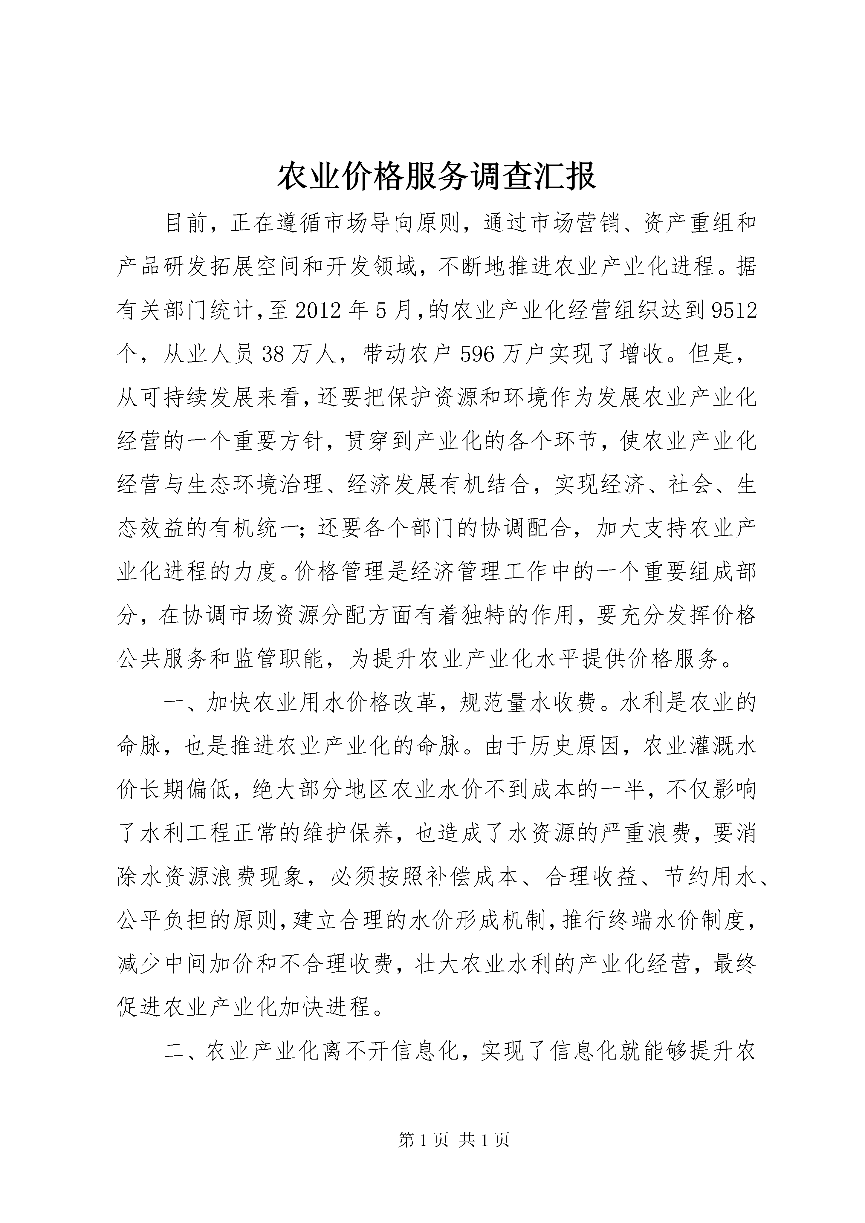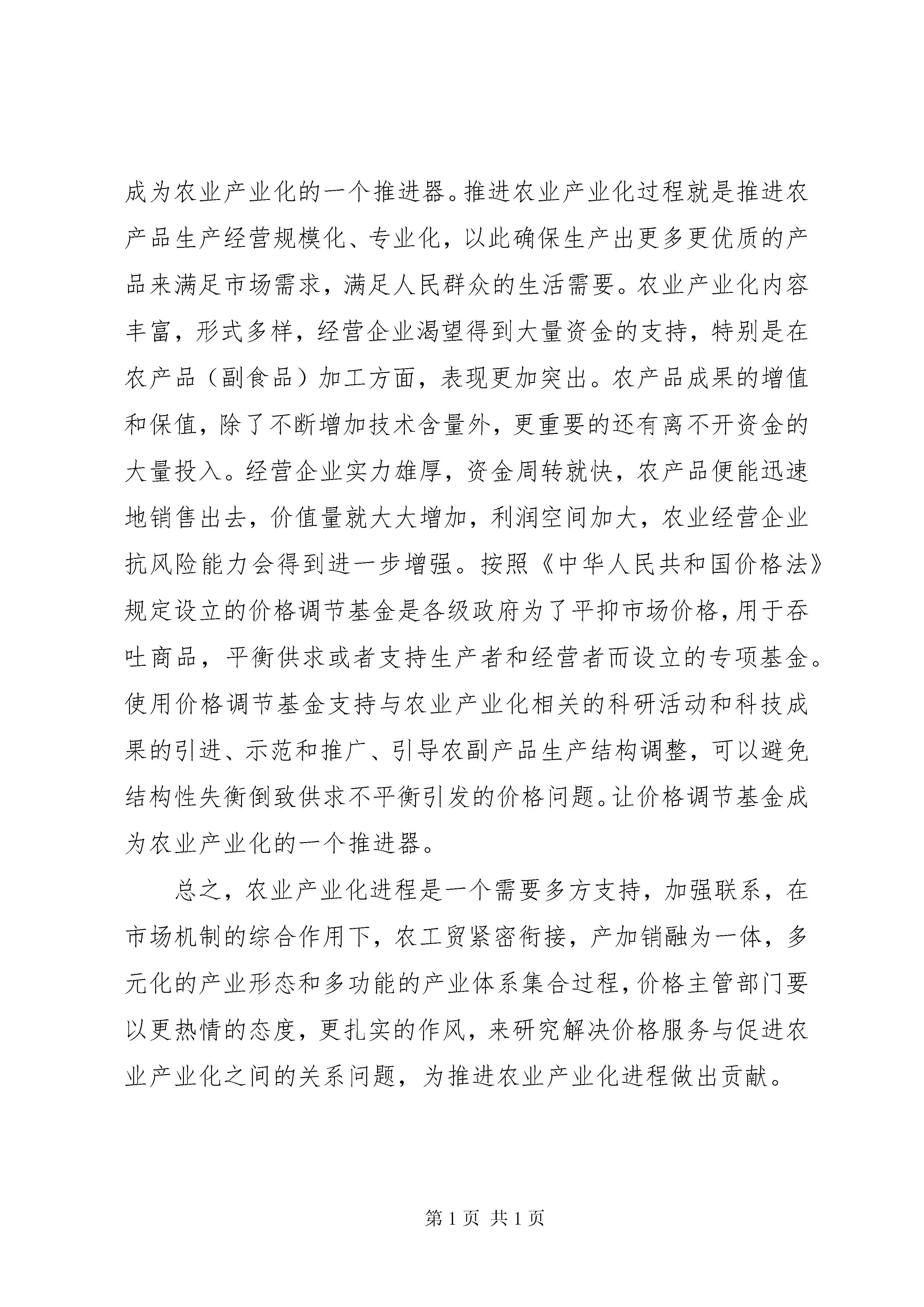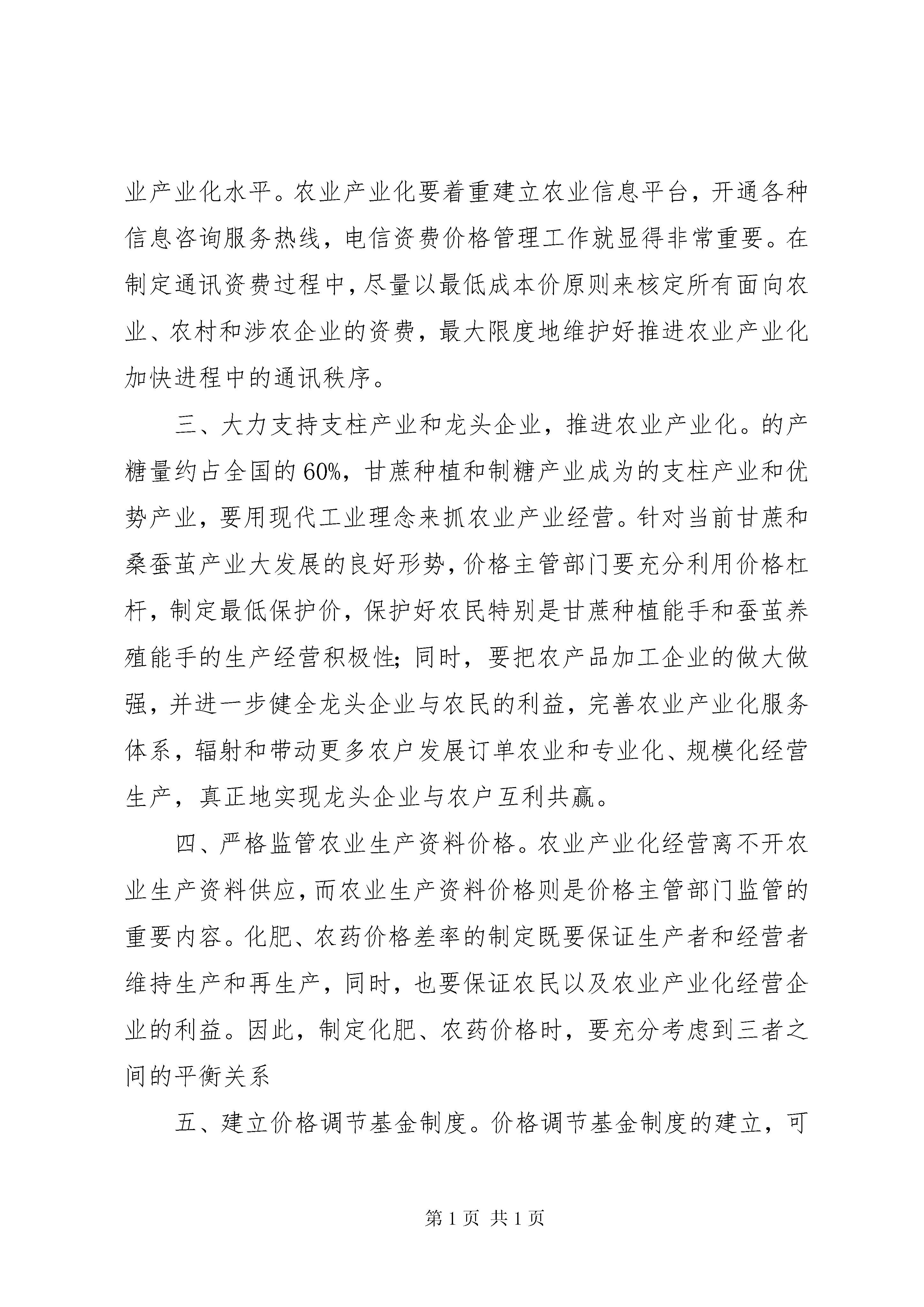 农业价格服务调查汇报目前,正在遵循市场导向原则,通过市场营销、资产重组和产品研发拓展空间和开发领域,不断地推进农业产业化进程。据有关部门统计,至2012年5月,的农业产业化经营组织达到9512个,从业人员38万人,带动农户596万户实现了增收。但是,从可持续发展来看,还要把保护资源和环境作为发展农业产业化经营的一个重要方针,贯穿到产业化的各个环节,使农业产业化经营与生态环境治理、经济发展有机结合,实现经济、社会、生态效益的有机统一;还要各个部门的协调配合,加大支持农业产业化进程的力度。价格管理是经济管理工作中的一个重要组成部分,在协调市场资源分配方面有着独特的作用,要充分发挥价格公共服务和监管职能,为提升农业产业化水平提供价格服务。一、加快农业用水价格改革,规范量水收费。水利是农业的命脉,也是推进农业产业化的命脉。由于历史原因,农业灌溉水价长期偏低,绝大部分地区农业水价不到成本的一半,不仅影响了水利工程正常的维护保养,也造成了水资源的严重浪费,要消除水资源浪费现象,必须按照补偿成本、合理收益、节约用水、公平负担的原则,建立合理的水价形成机制,推行终端水价制度,减少中间加价和不合理收费,壮大农业水利的产业化经营,最终促进农业产业化加快进程。二、农业产业化离不开信息化,实现了信息化就能够提升农业产业化水平。农业产业化要着重建立农业信息平台,开通各种信息咨询服务热线,电信资费价格管理工作就显得非常重要。在制定通讯资费过程中,尽量以最低成本价原则来核定所有面向农业、农村和涉农企业的资费,最大限度地维护好推进农业产业化加快进程中的通讯秩序。三、大力支持支柱产业和龙头企业,推进农业产业化。的产糖量约占全国的60%,甘蔗种植和制糖产业成为的支柱产业和优势产业,要用现代工业理念来抓农业产业经营。针对当前甘蔗和桑蚕茧产业大发展的良好形势,价格主管部门要充分利用价格杠杆,制定最低保护价,保护好农民特别是甘蔗种植能手和蚕茧养殖能手的生产经营积极性;同时,要把农产品加工企业的做大做强,并进一步健全龙头企业与农民的利益,完善农业产业化服务体系,辐射和带动更多农户发展订单农业和专业化、规模化经营生产,真正地实现龙头企业与农户互利共赢。四、严格监管农业生产资料价格。农业产业化经营离不开农业生产资料供应,而农业生产资料价格则是价格主管部门监管的重要内容。化肥、农药价格差率的制定既要保证生产者和经营者维持生产和再生产,同时,也要保证农民以及农业产业化经营企业的利益。因此,制定化肥、农药价格时,要充分考虑到三者之间的平衡关系五、建立价格调节基金制度。价格调节基金制度的建立,可成为农业产业化的一个推进器。推进农业产业化过程就是推进农产品生产经营规模化、专业化,以此确保生产出更多更优质的产品来满足市场需求,满足人民群众的生活需要。农业产业化内容丰富,形式多样,经营企业渴望得到大量资金的支持,特别是在农产品(副食品)加工方面,表现更加突出。农产品成果的增值和保值,除了不断增加技术含量外,更重要的还有离不开资金的大量投入。经营企业实力雄厚,资金周转就快,农产品便能迅速地销售出去,价值量就大大增加,利润空间加大,农业经营企业抗风险能力会得到进一步增强。按照《中华人民共和国价格法》规定设立的价格调节基金是各级政府为了平抑市场价格,用于吞吐商品,平衡供求或者支持生产者和经营者而设立的专项基金。使用价格调节基金支持与农业产业化相关的科研活动和科技成果的引进、示范和推广、引导农副产品生产结构调整,可以避免结构性失衡倒致供求不平衡引发的价格问题。让价格调节基金成为农业产业化的一个推进器。总之,农业产业化进程是一个需要多方支持,加强联系,在市场机制的综合作用下,农工贸紧密衔接,产加销融为一体,多元化的产业形态和多功能的产业体系集合过程,价格主管部门要以更热情的态度,更扎实的作风,来研究解决价格服务与促进农业产业化之间的关系问题,为推进农业产业化进程做出贡献。