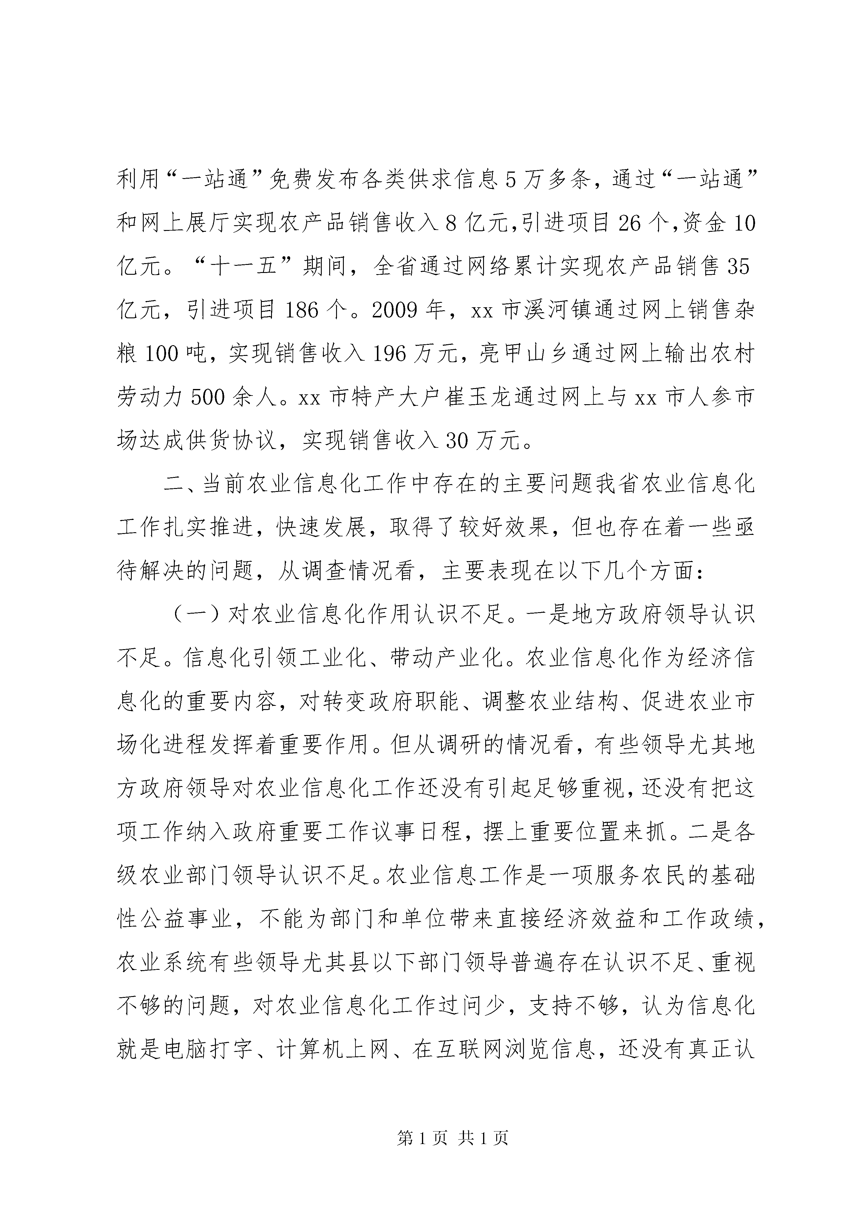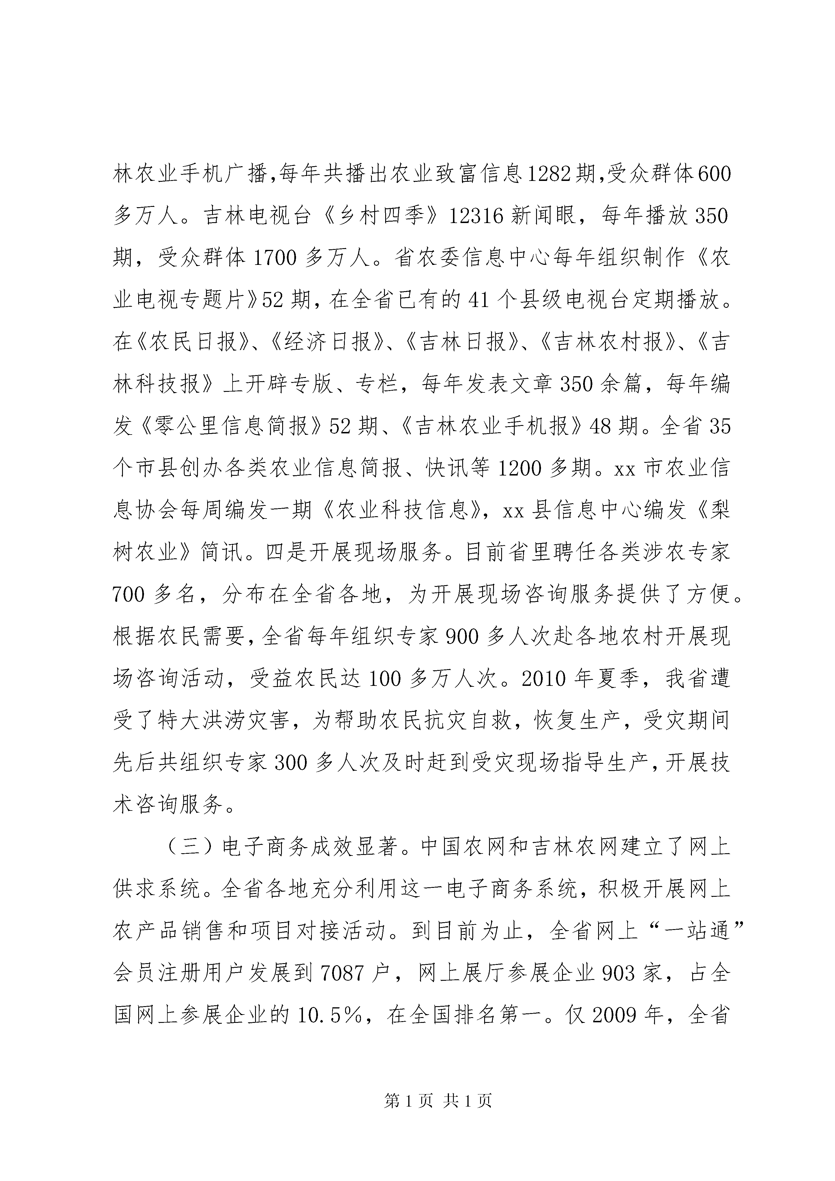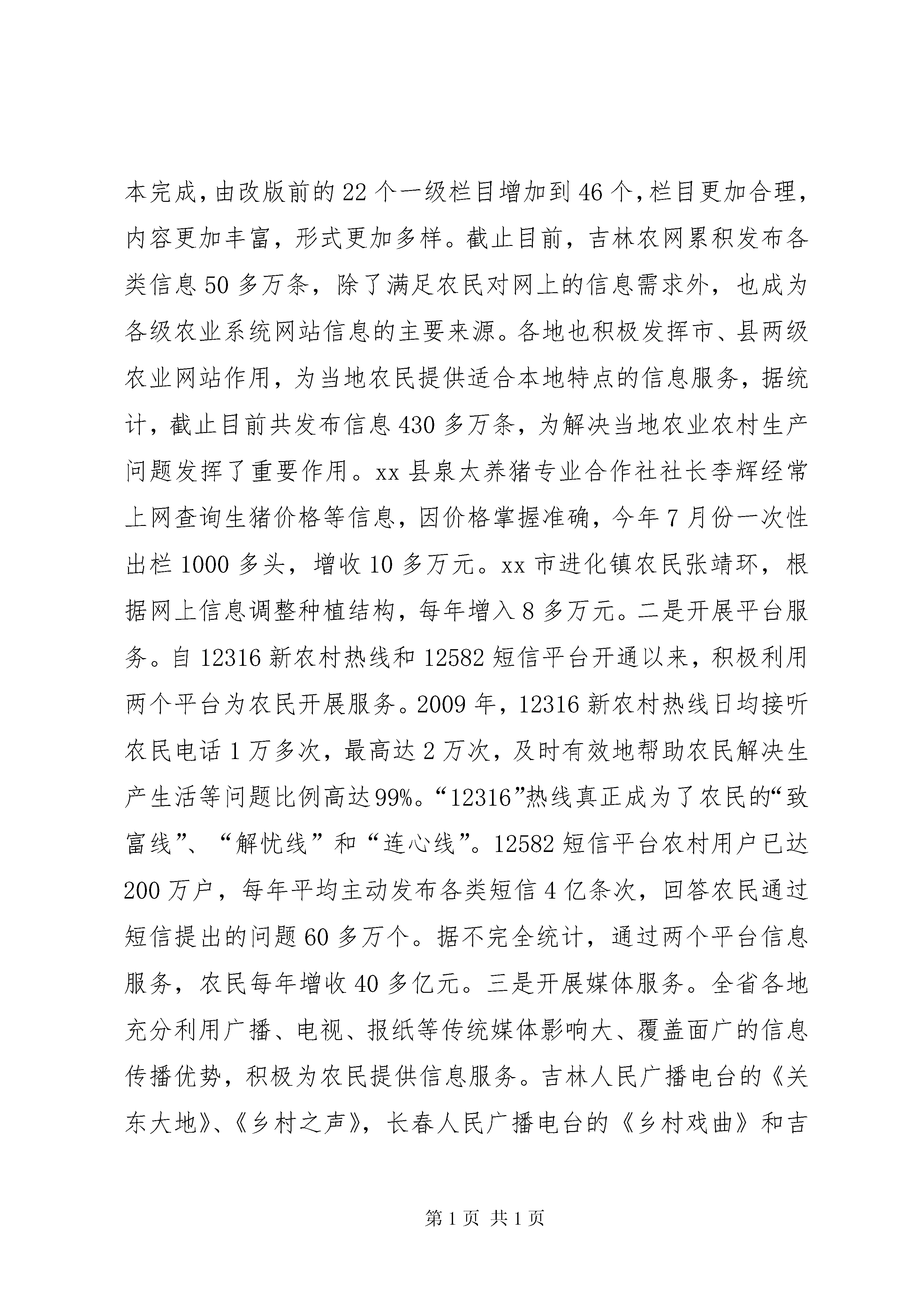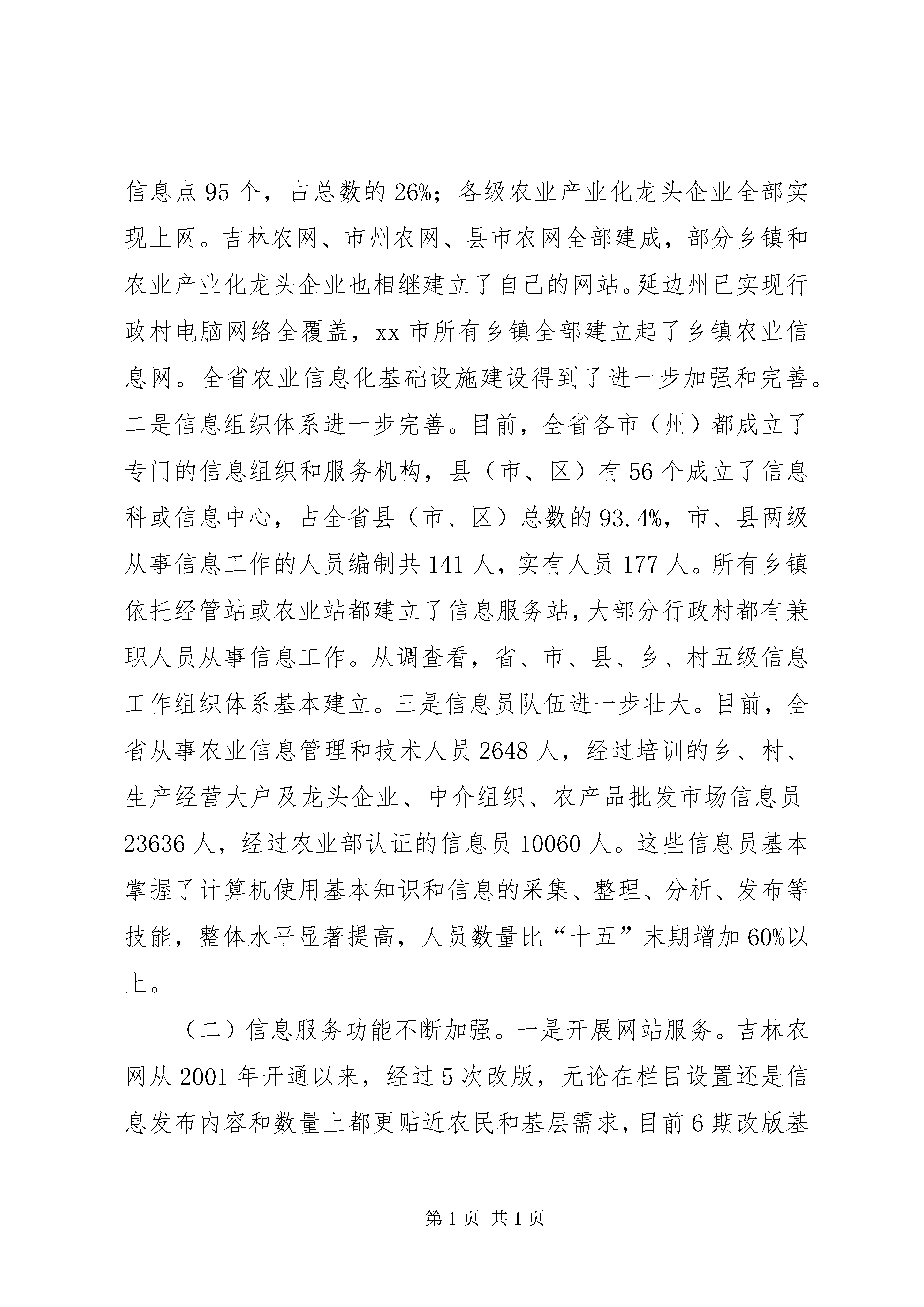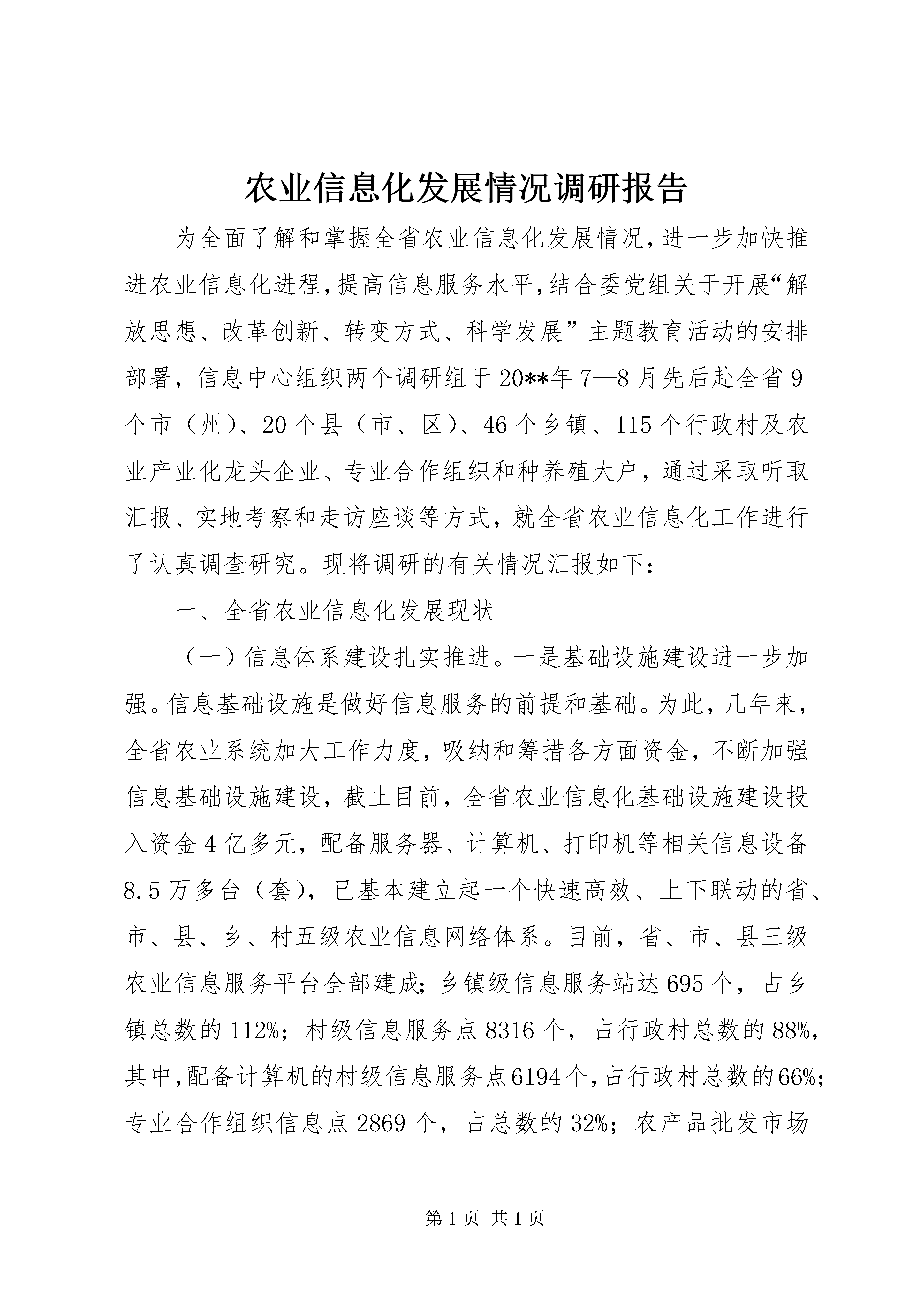 农业信息化发展情况调研报告为全面了解和掌握全省农业信息化发展情况,进一步加快推进农业信息化进程,提高信息服务水平,结合委党组关于开展“解放思想、改革创新、转变方式、科学发展”主题教育活动的安排部署,信息中心组织两个调研组于20**年7—8月先后赴全省9个市(州)、20个县(市、区)、46个乡镇、115个行政村及农业产业化龙头企业、专业合作组织和种养殖大户,通过采取听取汇报、实地考察和走访座谈等方式,就全省农业信息化工作进行了认真调查研究。现将调研的有关情况汇报如下:一、全省农业信息化发展现状(一)信息体系建设扎实推进。一是基础设施建设进一步加强。信息基础设施是做好信息服务的前提和基础。为此,几年来,全省农业系统加大工作力度,吸纳和筹措各方面资金,不断加强信息基础设施建设,截止目前,全省农业信息化基础设施建设投入资金4亿多元,配备服务器、计算机、打印机等相关信息设备8.5万多台(套),已基本建立起一个快速高效、上下联动的省、市、县、乡、村五级农业信息网络体系。目前,省、市、县三级农业信息服务平台全部建成;乡镇级信息服务站达695个,占乡镇总数的112%;村级信息服务点8316个,占行政村总数的88%,其中,配备计算机的村级信息服务点6194个,占行政村总数的66%;专业合作组织信息点2869个,占总数的32%;农产品批发市场信息点95个,占总数的26%;各级农业产业化龙头企业全部实现上网。吉林农网、市州农网、县市农网全部建成,部分乡镇和农业产业化龙头企业也相继建立了自己的网站。延边州已实现行政村电脑网络全覆盖,xx市所有乡镇全部建立起了乡镇农业信息网。全省农业信息化基础设施建设得到了进一步加强和完善。二是信息组织体系进一步完善。目前,全省各市(州)都成立了专门的信息组织和服务机构,县(市、区)有56个成立了信息科或信息中心,占全省县(市、区)总数的93.4%,市、县两级从事信息工作的人员编制共141人,实有人员177人。所有乡镇依托经管站或农业站都建立了信息服务站,大部分行政村都有兼职人员从事信息工作。从调查看,省、市、县、乡、村五级信息工作组织体系基本建立。三是信息员队伍进一步壮大。目前,全省从事农业信息管理和技术人员2648人,经过培训的乡、村、生产经营大户及龙头企业、中介组织、农产品批发市场信息员23636人,经过农业部认证的信息员10060人。这些信息员基本掌握了计算机使用基本知识和信息的采集、整理、分析、发布等技能,整体水平显著提高,人员数量比“十五”末期增加60%以上。(二)信息服务功能不断加强。一是开展网站服务。吉林农网从2001年开通以来,经过5次改版,无论在栏目设置还是信息发布内容和数量上都更贴近农民和基层需求,目前6期改版基本完成,由改版前的22个一级栏目增加到46个,栏目更加合理,内容更加丰富,形式更加多样。截止目前,吉林农网累积发布各类信息50多万条,除了满足农民对网上的信息需求外,也成为各级农业系统网站信息的主要来源。各地也积极发挥市、县两级农业网站作用,为当地农民提供适合本地特点的信息服务,据统计,截止目前共发布信息430多万条,为解决当地农业农村生产问题发挥了重要作用。xx县泉太养猪专业合作社社长李辉经常上网查询生猪价格等信息,因价格掌握准确,今年7月份一次性出栏1000多头,增收10多万元。xx市进化镇农民张靖环,根据网上信息调整种植结构,每年增入8多万元。二是开展平台服务。自12316新农村热线和12582短信平台开通以来,积极利用两个平台为农民开展服务。2009年,12316新农村热线日均接听农民电话1万多次,最高达2万次,及时有效地帮助农民解决生产生活等问题比例高达99%。“12316”热线真正成为了农民的“致富线”、“解忧线”和“连心线”。12582短信平台农村用户已达200万户,每年平均主动发布各类短信4亿条次,回答农民通过短信提出的问题60多万个。据不完全统计,通过两个平台信息服务,农民每年增收40多亿元。三是开展媒体服务。全省各地充分利用广播、电视、报纸等传统媒体影响大、覆盖面广的信息传播优势,积极为农民提供信息服务。吉林人民广播电台的《关东大地》、《乡村之声》,长春人民广播电台的《乡村戏曲》和吉林农业手机广播,每年共播出农业致富信息1282期,受众群体600多万人。吉林电视台《乡村四季》12316新闻眼,每年播放350期,受众群体1700多万人。省农委信息中心每年组织制作《农业电视专题片》52期,在全省已有的41个县级电视台定期播放。在《农民日报》、《经济日报》、《吉林日报》、《吉林农村报》、《吉林科技报》上开辟专版、专栏,每年发表文章350余篇,每年编发《零公里信息简报》52期、《吉林农业手机报》48期。全省35个市县创办各类农业信息简报、快讯等1200