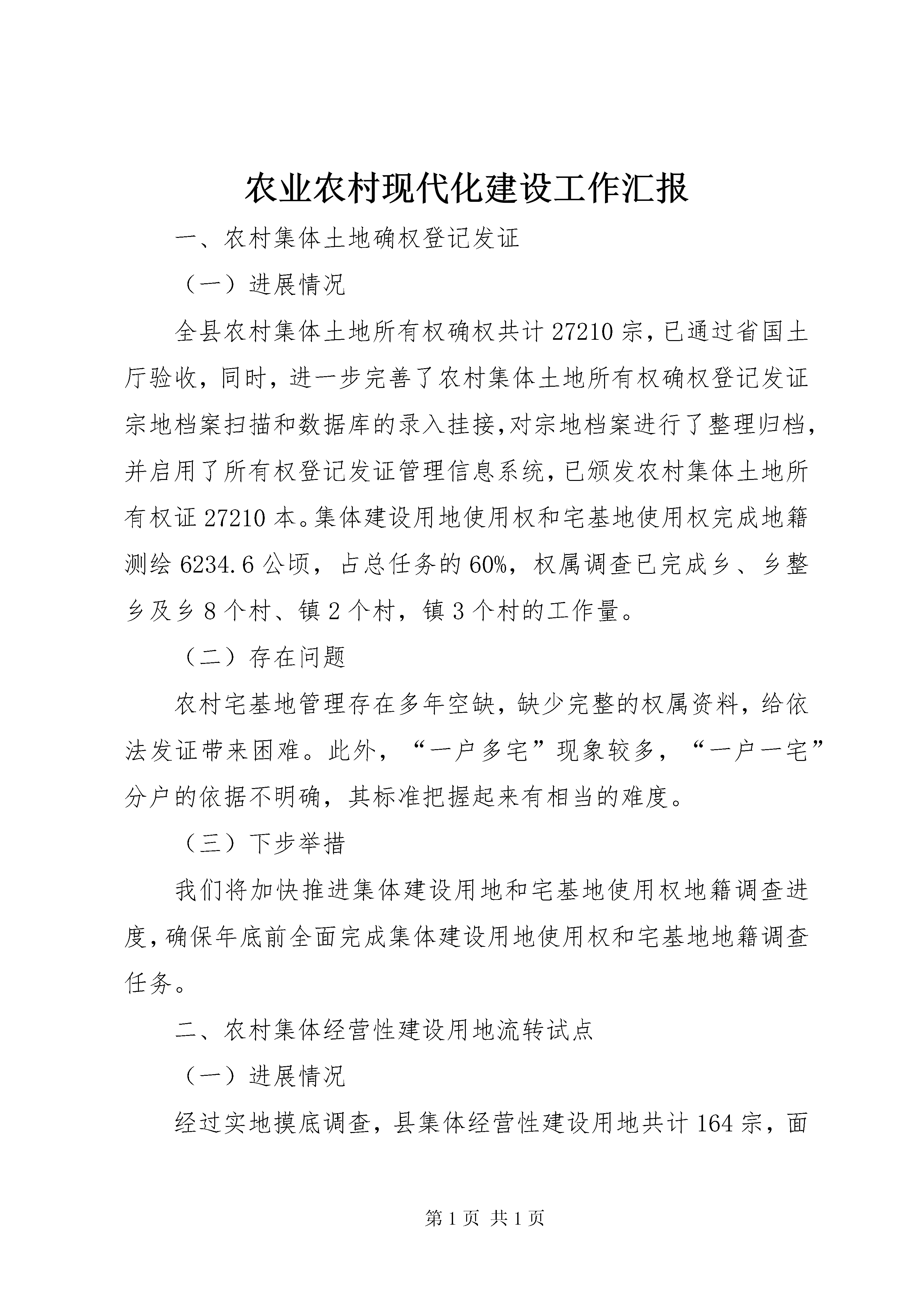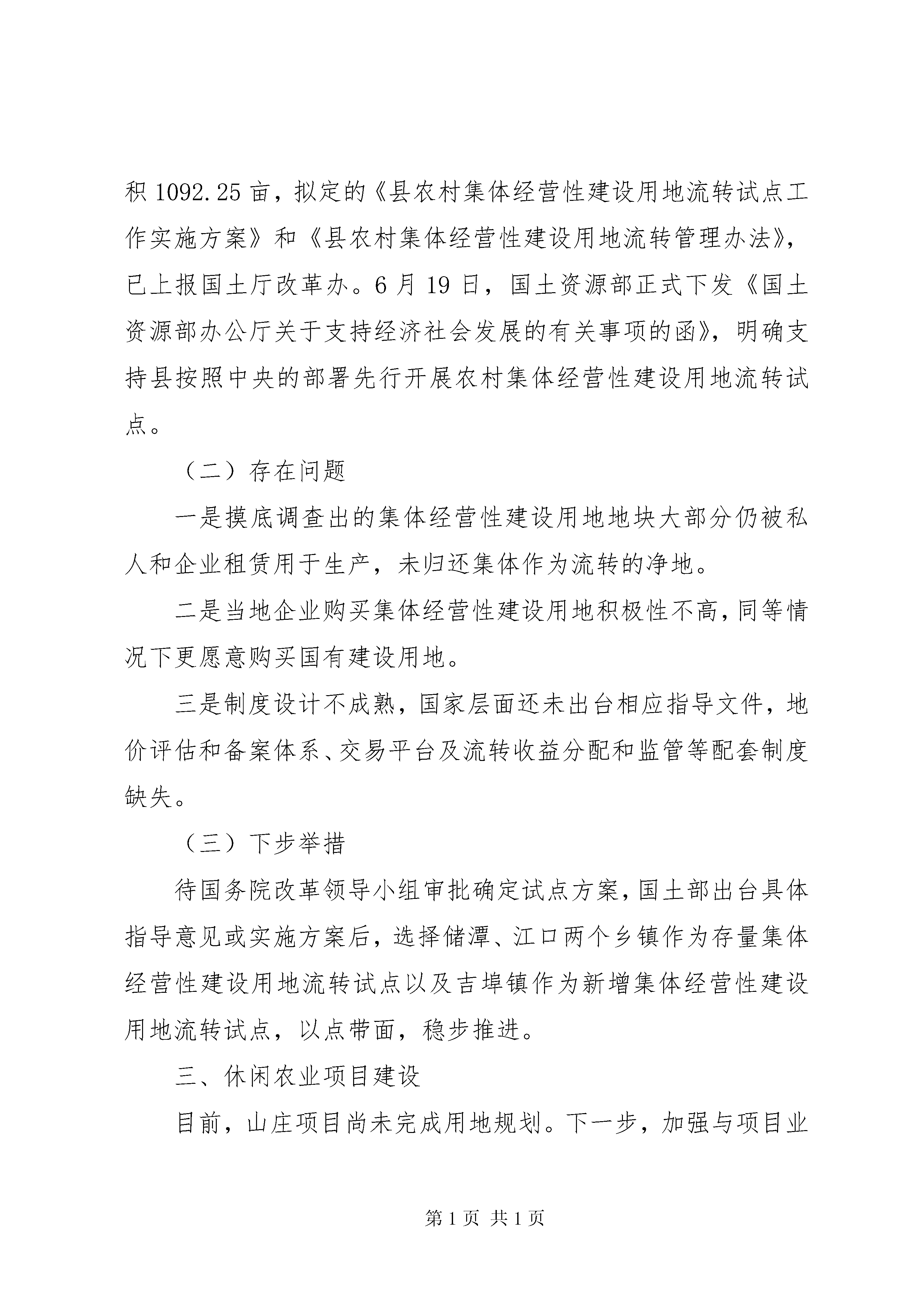 农业农村现代化建设工作汇报一、农村集体土地确权登记发证(一)进展情况全县农村集体土地所有权确权共计27210宗,已通过省国土厅验收,同时,进一步完善了农村集体土地所有权确权登记发证宗地档案扫描和数据库的录入挂接,对宗地档案进行了整理归档,并启用了所有权登记发证管理信息系统,已颁发农村集体土地所有权证27210本。集体建设用地使用权和宅基地使用权完成地籍测绘6234.6公顷,占总任务的60%,权属调查已完成乡、乡整乡及乡8个村、镇2个村,镇3个村的工作量。(二)存在问题农村宅基地管理存在多年空缺,缺少完整的权属资料,给依法发证带来困难。此外,“一户多宅”现象较多,“一户一宅”分户的依据不明确,其标准把握起来有相当的难度。(三)下步举措我们将加快推进集体建设用地和宅基地使用权地籍调查进度,确保年底前全面完成集体建设用地使用权和宅基地地籍调查任务。二、农村集体经营性建设用地流转试点(一)进展情况经过实地摸底调查,县集体经营性建设用地共计164宗,面积1092.25亩,拟定的《县农村集体经营性建设用地流转试点工作实施方案》和《县农村集体经营性建设用地流转管理办法》,已上报国土厅改革办。6月19日,国土资源部正式下发《国土资源部办公厅关于支持经济社会发展的有关事项的函》,明确支持县按照中央的部署先行开展农村集体经营性建设用地流转试点。(二)存在问题一是摸底调查出的集体经营性建设用地地块大部分仍被私人和企业租赁用于生产,未归还集体作为流转的净地。二是当地企业购买集体经营性建设用地积极性不高,同等情况下更愿意购买国有建设用地。三是制度设计不成熟,国家层面还未出台相应指导文件,地价评估和备案体系、交易平台及流转收益分配和监管等配套制度缺失。(三)下步举措待国务院改革领导小组审批确定试点方案,国土部出台具体指导意见或实施方案后,选择储潭、江口两个乡镇作为存量集体经营性建设用地流转试点以及吉埠镇作为新增集体经营性建设用地流转试点,以点带面,稳步推进。三、休闲农业项目建设目前,山庄项目尚未完成用地规划。下一步,加强与项目业主对接,尽快确定项目用地规划,以便开展土地报批和供应工作。