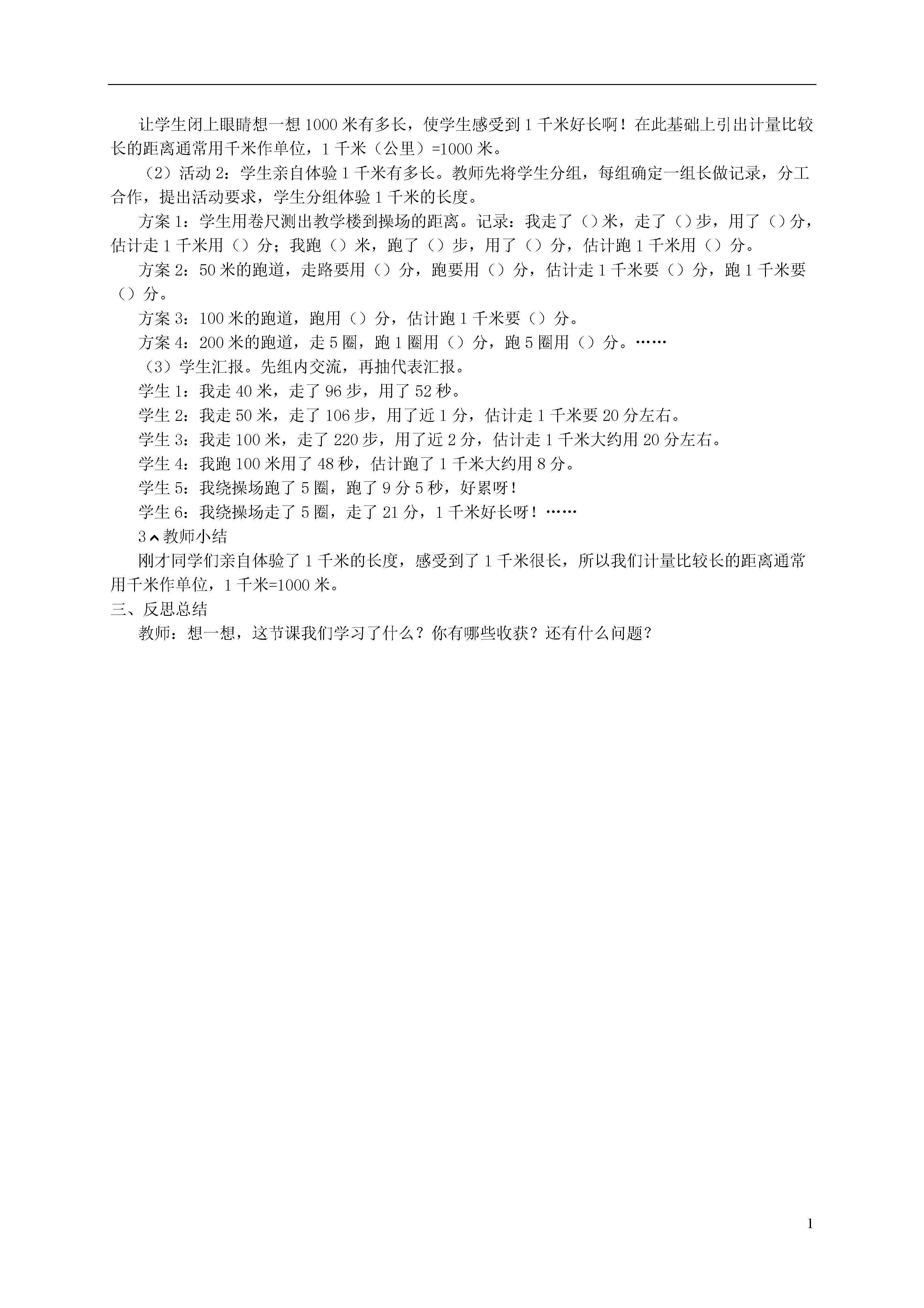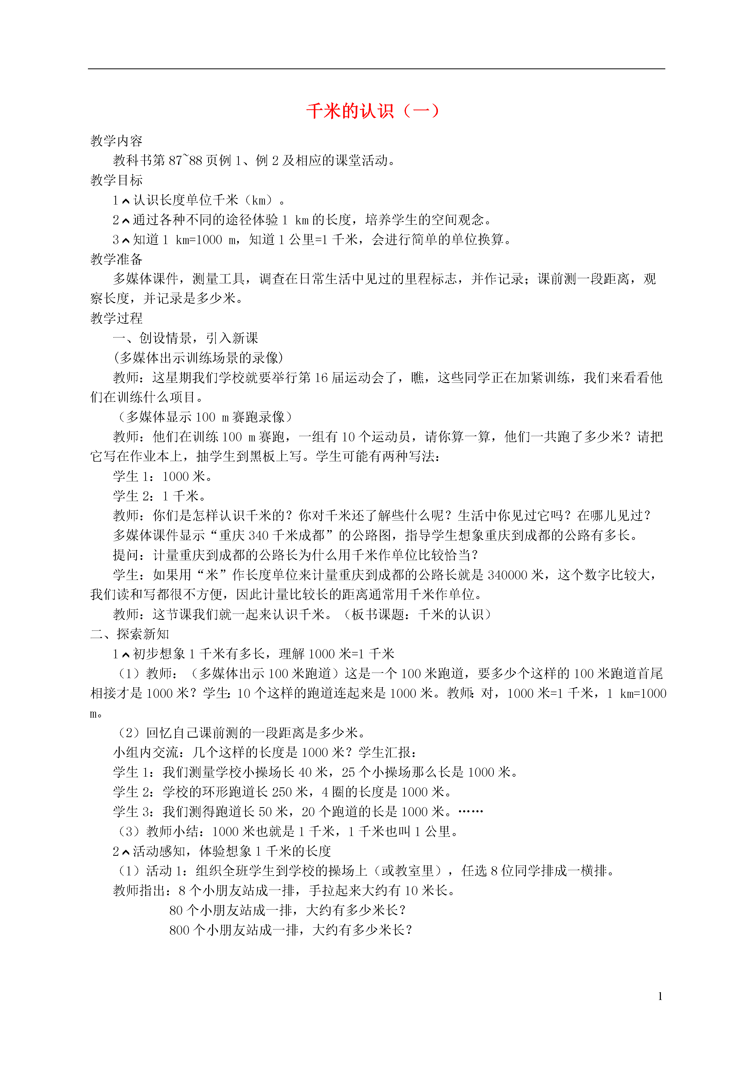 1千米的认识(一)教学内容教科书第87~88页例1、例2及相应的课堂活动。教学目标1认识长度单位千米(km)。2通过各种不同的途径体验1km的长度,培养学生的空间观念。3知道1km=1000m,知道1公里=1千米,会进行简单的单位换算。教学准备多媒体课件,测量工具,调查在日常生活中见过的里程标志,并作记录;课前测一段距离,观察长度,并记录是多少米。教学过程一、创设情景,引入新课(多媒体出示训练场景的录像)教师:这星期我们学校就要举行第16届运动会了,瞧,这些同学正在加紧训练,我们来看看他们在训练什么项目。(多媒体显示100m赛跑录像)教师:他们在训练100m赛跑,一组有10个运动员,请你算一算,他们一共跑了多少米?请把它写在作业本上,抽学生到黑板上写。学生可能有两种写法:学生1:1000米。学生2:1千米。教师:你们是怎样认识千米的?你对千米还了解些什么呢?生活中你见过它吗?在哪儿见过?多媒体课件显示“重庆340千米成都”的公路图,指导学生想象重庆到成都的公路有多长。提问:计量重庆到成都的公路长为什么用千米作单位比较恰当?学生:如果用“米”作长度单位来计量重庆到成都的公路长就是340000米,这个数字比较大,我们读和写都很不方便,因此计量比较长的距离通常用千米作单位。教师:这节课我们就一起来认识千米。(板书课题:千米的认识)二、探索新知1初步想象1千米有多长,理解1000米=1千米(1)教师:(多媒体出示100米跑道)这是一个100米跑道,要多少个这样的100米跑道首尾相接才是1000米?学生:10个这样的跑道连起来是1000米。教师:对,1000米=1千米,1km=1000m。(2)回忆自己课前测的一段距离是多少米。小组内交流:几个这样的长度是1000米?学生汇报:学生1:我们测量学校小操场长40米,25个小操场那么长是1000米。学生2:学校的环形跑道长250米,4圈的长度是1000米。学生3:我们测得跑道长50米,20个跑道的长是1000米。……(3)教师小结:1000米也就是1千米,1千米也叫1公里。2活动感知,体验想象1千米的长度(1)活动1:组织全班学生到学校的操场上(或教室里),任选8位同学排成一横排。教师指出:8个小朋友站成一排,手拉起来大约有10米长。80个小朋友站成一排,大约有多少米长?800个小朋友站成一排,大约有多少米长?让学生闭上眼睛想一想1000米有多长,使学生感受到1千米好长啊!在此基础上引出计量比较长的距离通常用千米作单位,1千米(公里)=1000米。(2)活动2:学生亲自体验1千米有多长。教师先将学生分组,每组确定一组长做记录,分工合作,提出活动要求,学生分组体验1千米的长度。方案1:学生用卷尺测出教学楼到操场的距离。记录:我走了()米,走了()步,用了()分,估计走1千米用()分;我跑()米,跑了()步,用了()分,估计跑1千米用()分。方案2:50米的跑道,走路要用()分,跑要用()分,估计走1千米要()分,跑1千米要()分。方案3:100米的跑道,跑用()分,估计跑1千米要()分。方案4:200米的跑道,走5圈,跑1圈用()分,跑5圈用()分。……(3)学生汇报。先组内交流,再抽代表汇报。学生1:我走40米,走了96步,用了52秒。学生2:我走50米,走了106步,用了近1分,估计走1千米要20分左右。学生3:我走100米,走了220步,用了近2分,估计走1千米大约用20分左右。学生4:我跑100米用了48秒,估计跑了1千米大约用8分。学生5:我绕操场跑了5圈,跑了9分5秒,好累呀!学生6:我绕操场走了5圈,走了21分,1千米好长呀!……3教师小结刚才同学们亲自体验了1千米的长度,感受到了1千米很长,所以我们计量比较长的距离通常用千米作单位,1千米=1000米。三、反思总结教师:想一想,这节课我们学习了什么?你有哪些收获?还有什么问题?