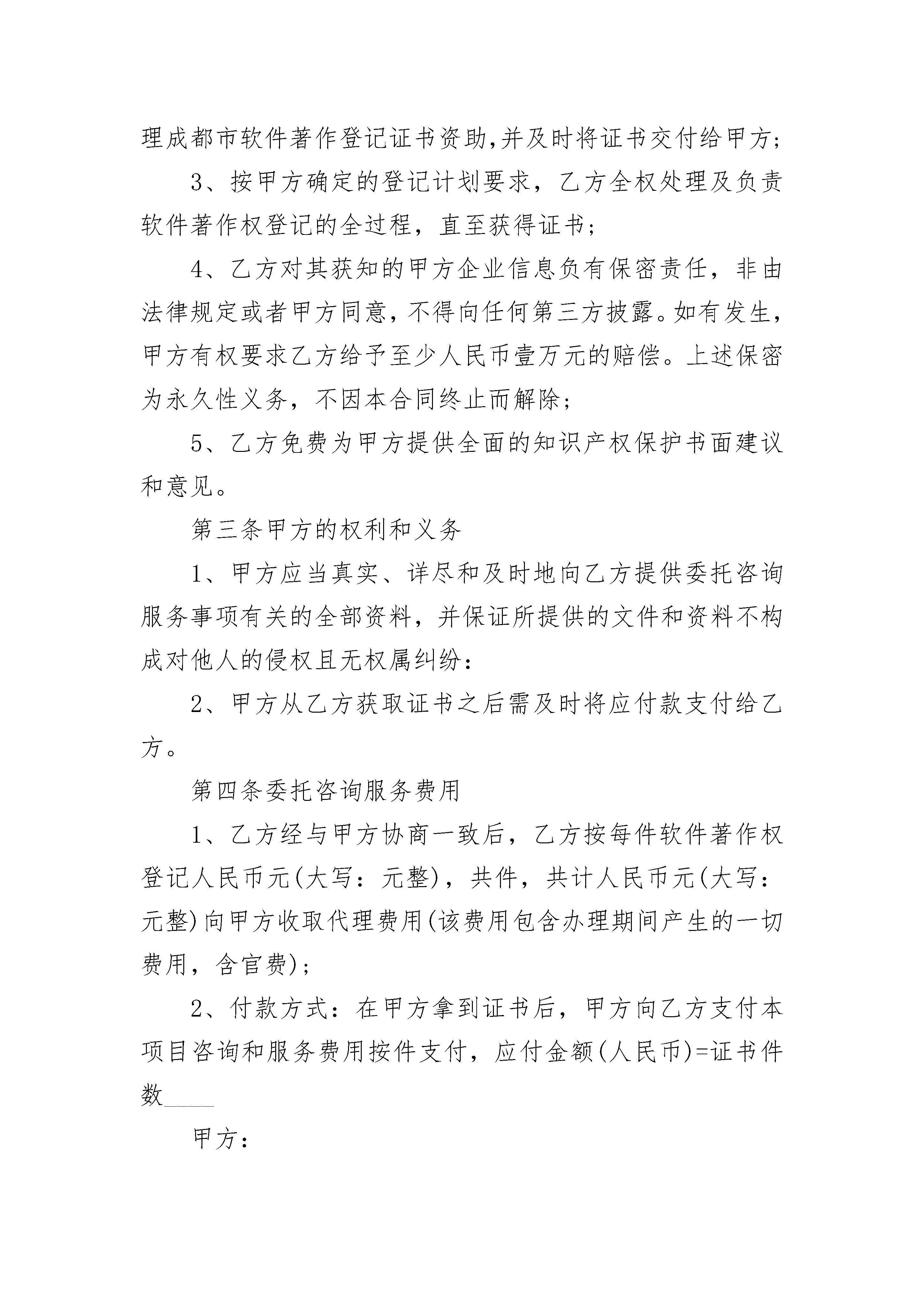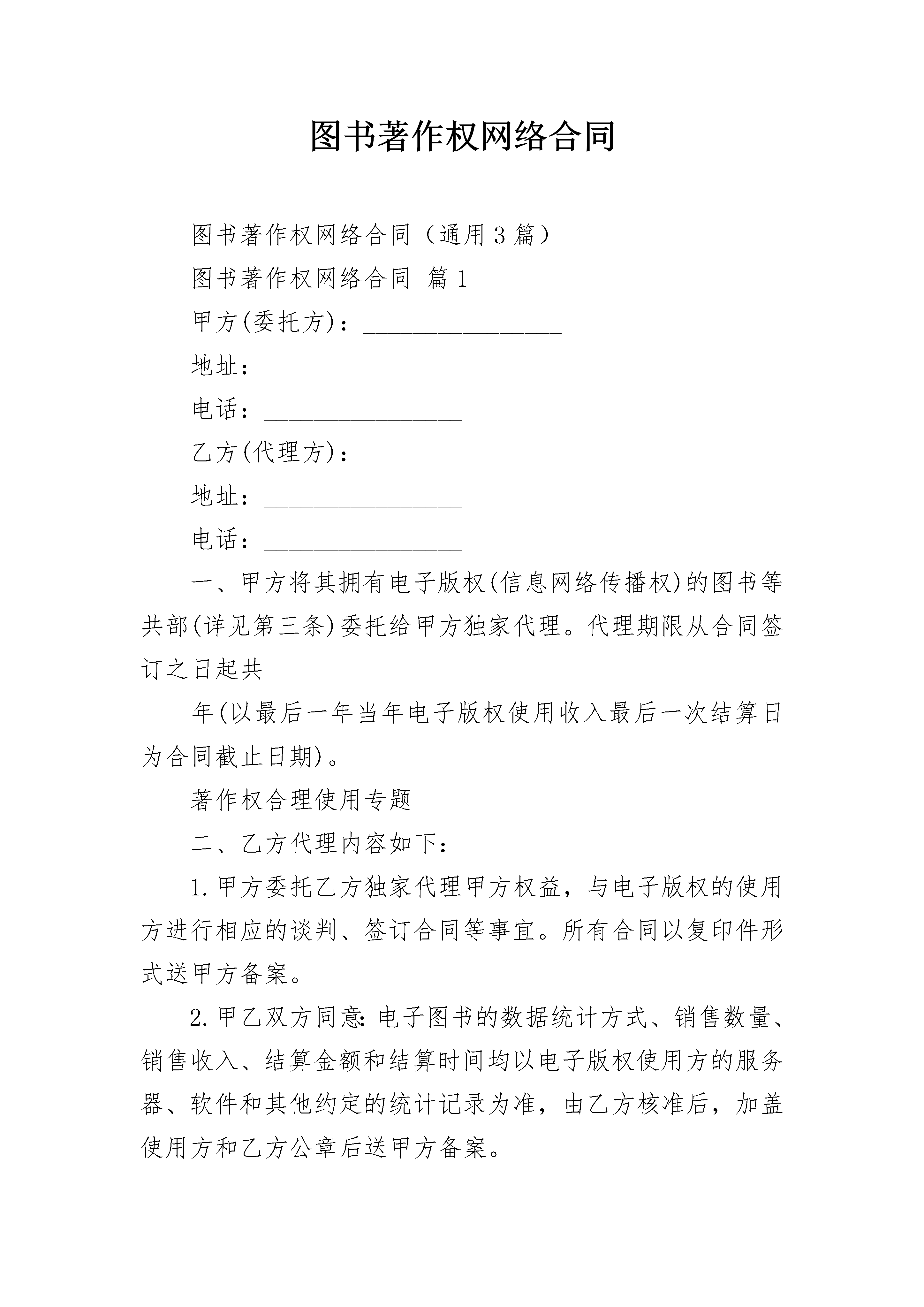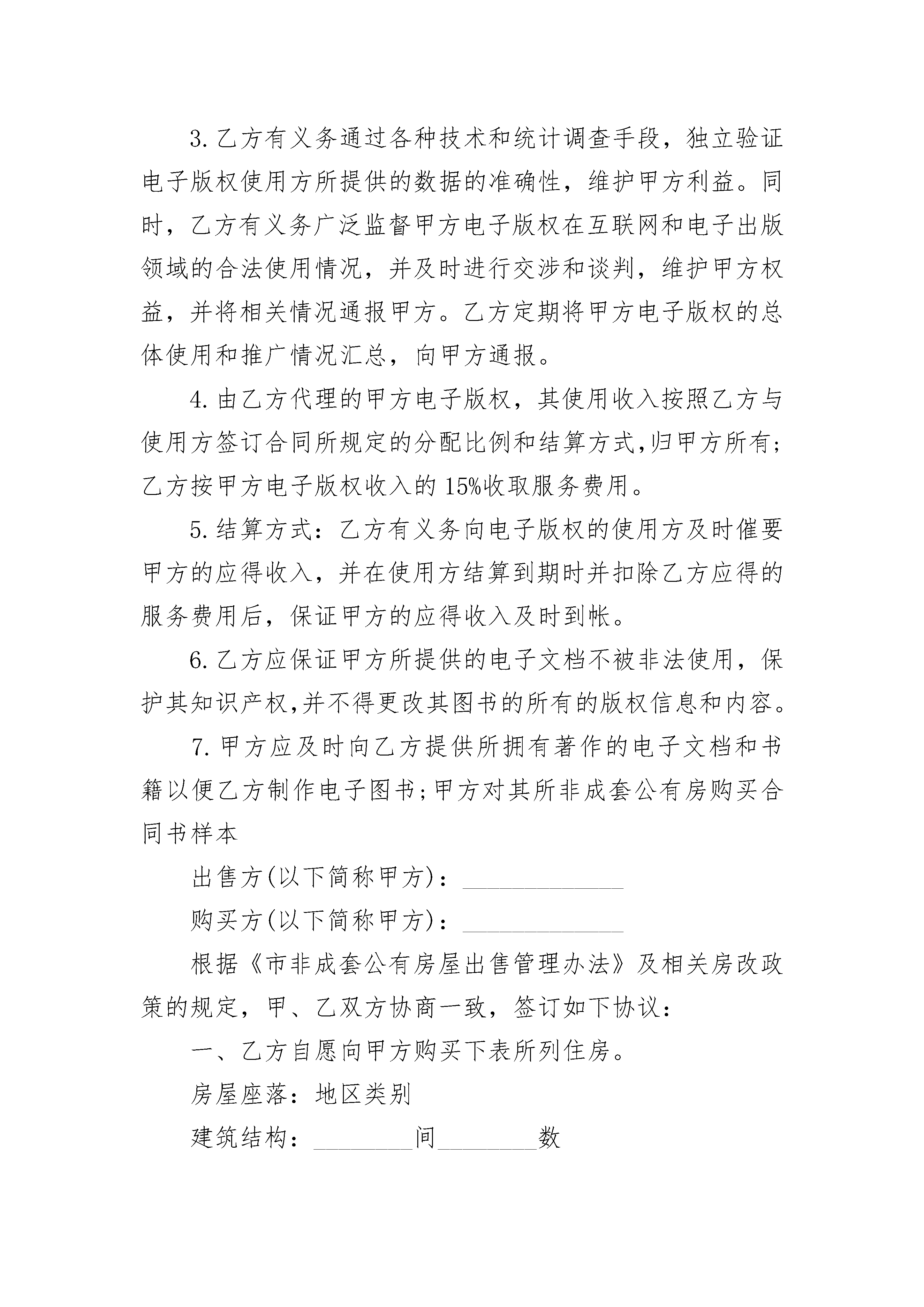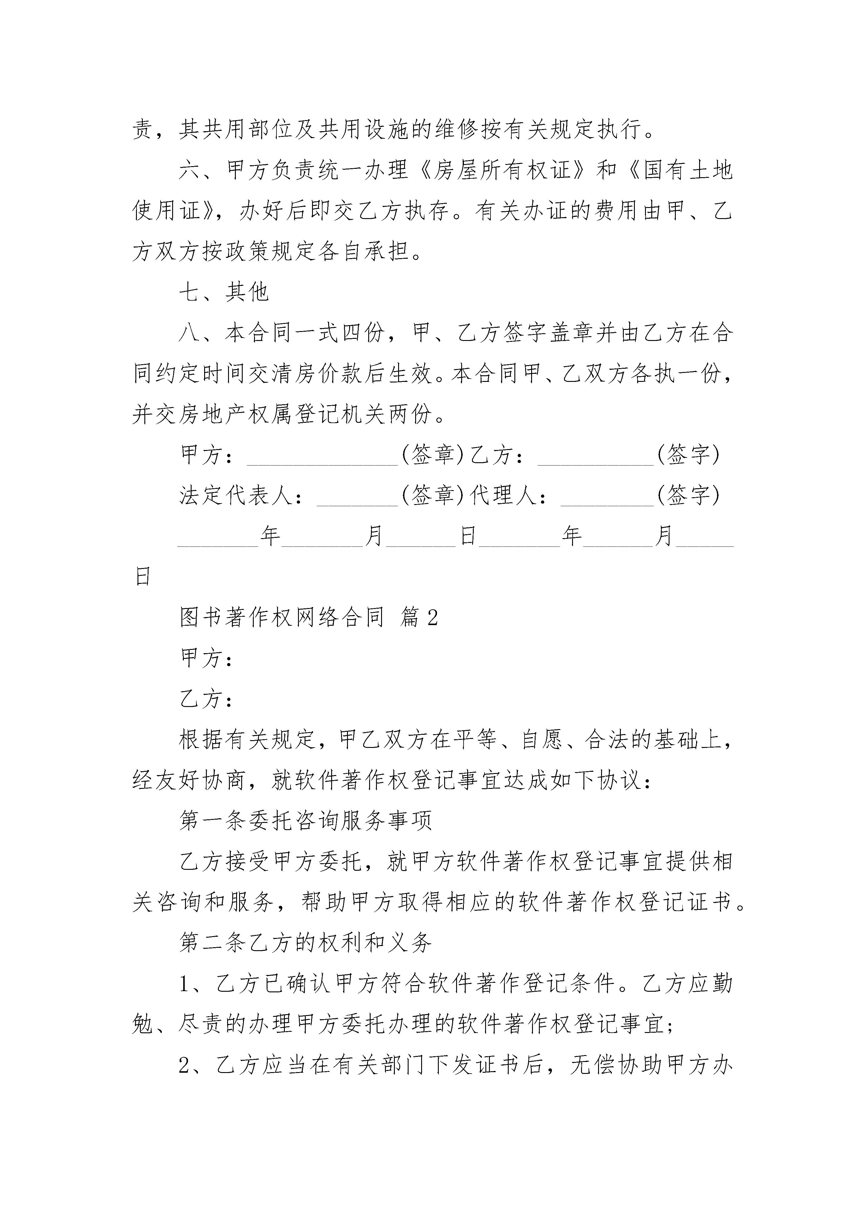 图书著作权网络合同图书著作权网络合同(通用3篇)图书著作权网络合同篇1甲方(委托方):________________地址:________________电话:________________乙方(代理方):________________地址:________________电话:________________一、甲方将其拥有电子版权(信息网络传播权)的图书等共部(详见第三条)委托给甲方独家代理。代理期限从合同签订之日起共年(以最后一年当年电子版权使用收入最后一次结算日为合同截止日期)。著作权合理使用专题二、乙方代理内容如下:1.甲方委托乙方独家代理甲方权益,与电子版权的使用方进行相应的谈判、签订合同等事宜。所有合同以复印件形式送甲方备案。2.甲乙双方同意:电子图书的数据统计方式、销售数量、销售收入、结算金额和结算时间均以电子版权使用方的服务器、软件和其他约定的统计记录为准,由乙方核准后,加盖使用方和乙方公章后送甲方备案。3.乙方有义务通过各种技术和统计调查手段,独立验证电子版权使用方所提供的数据的准确性,维护甲方利益。同时,乙方有义务广泛监督甲方电子版权在互联网和电子出版领域的合法使用情况,并及时进行交涉和谈判,维护甲方权益,并将相关情况通报甲方。乙方定期将甲方电子版权的总体使用和推广情况汇总,向甲方通报。4.由乙方代理的甲方电子版权,其使用收入按照乙方与使用方签订合同所规定的分配比例和结算方式,归甲方所有;乙方按甲方电子版权收入的15%收取服务费用。5.结算方式:乙方有义务向电子版权的使用方及时催要甲方的应得收入,并在使用方结算到期时并扣除乙方应得的服务费用后,保证甲方的应得收入及时到帐。6.乙方应保证甲方所提供的电子文档不被非法使用,保护其知识产权,并不得更改其图书的所有的版权信息和内容。7.甲方应及时向乙方提供所拥有著作的电子文档和书籍以便乙方制作电子图书;甲方对其所非成套公有房购买合同书样本出售方(以下简称甲方):_____________购买方(以下简称甲方):_____________根据《市非成套公有房屋出售管理办法》及相关房改政策的规定,甲、乙双方协商一致,签订如下协议:一、乙方自愿向甲方购买下表所列住房。房屋座落:地区类别建筑结构:________间________数建筑面积:其中分摊面积配套情况二、甲方同意乙方按以下第_____种方式购买乙方在购房面积控制标准之内的面积。超面积_____平方米按该房地区类别成本价______元/平方米购买,超面积_____平方米按该房地区的市场价_______元/平方米购买。1、以经评估的价格______元/平方米,并享受工龄折扣购买(其中年工龄__年)。2、以经评估的价格______元/平方米购买,不享受工龄折扣。3、以该住房所在地区类别成本价的18%购买。三、乙方按以上方式购买该住房应付房价款______元(大写:___拾___万___仟___佰___拾____元____角____分)。此款由乙方在______年_____月_____日一次性付给甲方,甲方于乙方缴款次月起停收住房租金。甲方提取房价款的30%计_____元建立住房公共维修基金,其余部分金额______元为甲方的售房收入,住房公共维修基金及售房收入均应由甲方专项交存住房资金管理机构在银行开设的专户。四、乙方购买该房后拥有完全产权,按照《市房改住房再交易管理办法》的规定可依法进入市场交易,在补交土地使用权出让金和按规定交纳税费后,收入归乙方所有。五、乙方所购住房户内及自用设施的维修由乙方自行负责,其共用部位及共用设施的维修按有关规定执行。六、甲方负责统一办理《房屋所有权证》和《国有土地使用证》,办好后即交乙方执存。有关办证的费用由甲、乙方双方按政策规定各自承担。七、其他八、本合同一式四份,甲、乙方签字盖章并由乙方在合同约定时间交清房价款后生效。本合同甲、乙双方各执一份,并交房地产权属登记机关两份。甲方:_____________(签章)乙方:__________(签字)法定代表人:_______(签章)代理人:________(签字)_______年_______月______日_______年______月_____日图书著作权网络合同篇2甲方:乙方:根据有关规定,甲乙双方在平等、自愿、合法的基础上,经友好协商,就软件著作权登记事宜达成如下协议:第一条委托咨询服务事项乙方接受甲方委托,就甲方软件著作权登记事宜提供相关咨询和服务,帮助甲方取得相应的软件著作权登记证书。第二条乙方的权利和义务1、乙方已确认甲方符合软件著作登记条件。乙方应勤勉、尽责的办理甲方委托办理的软件著作权登记事宜;2、乙方应当在有关部门下发证书后,无偿协助甲方办理成都市软件著作登记证书资助,并及时将证书交付给甲方;3、按甲方确定