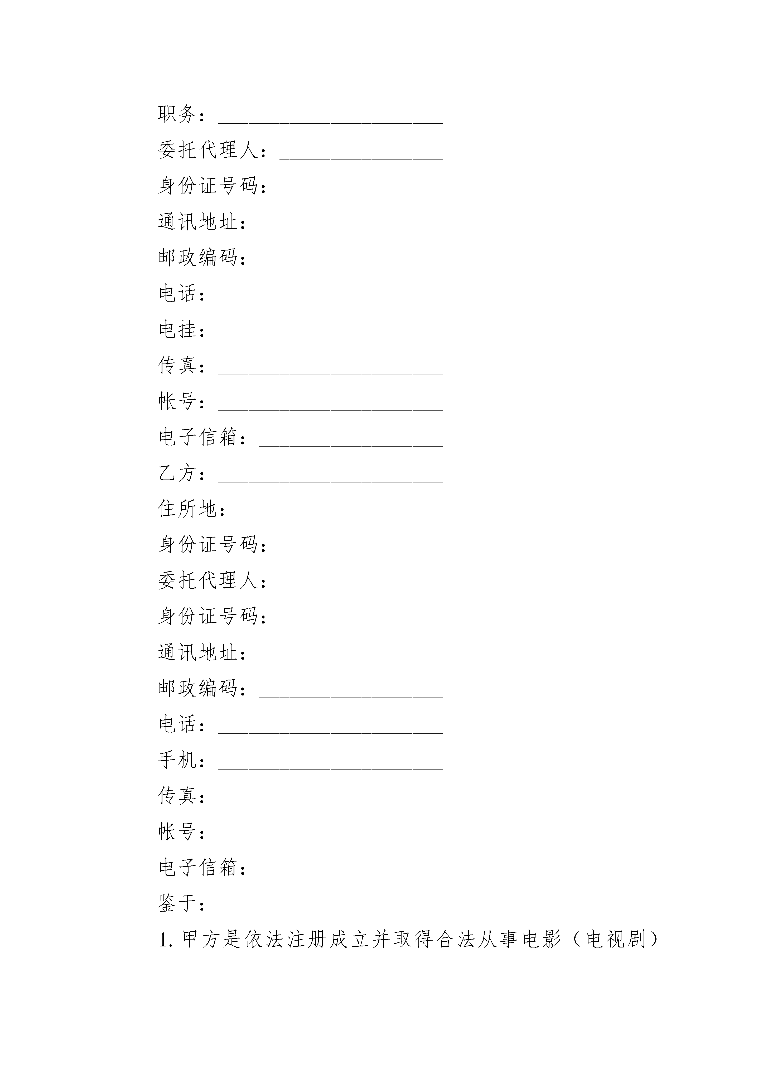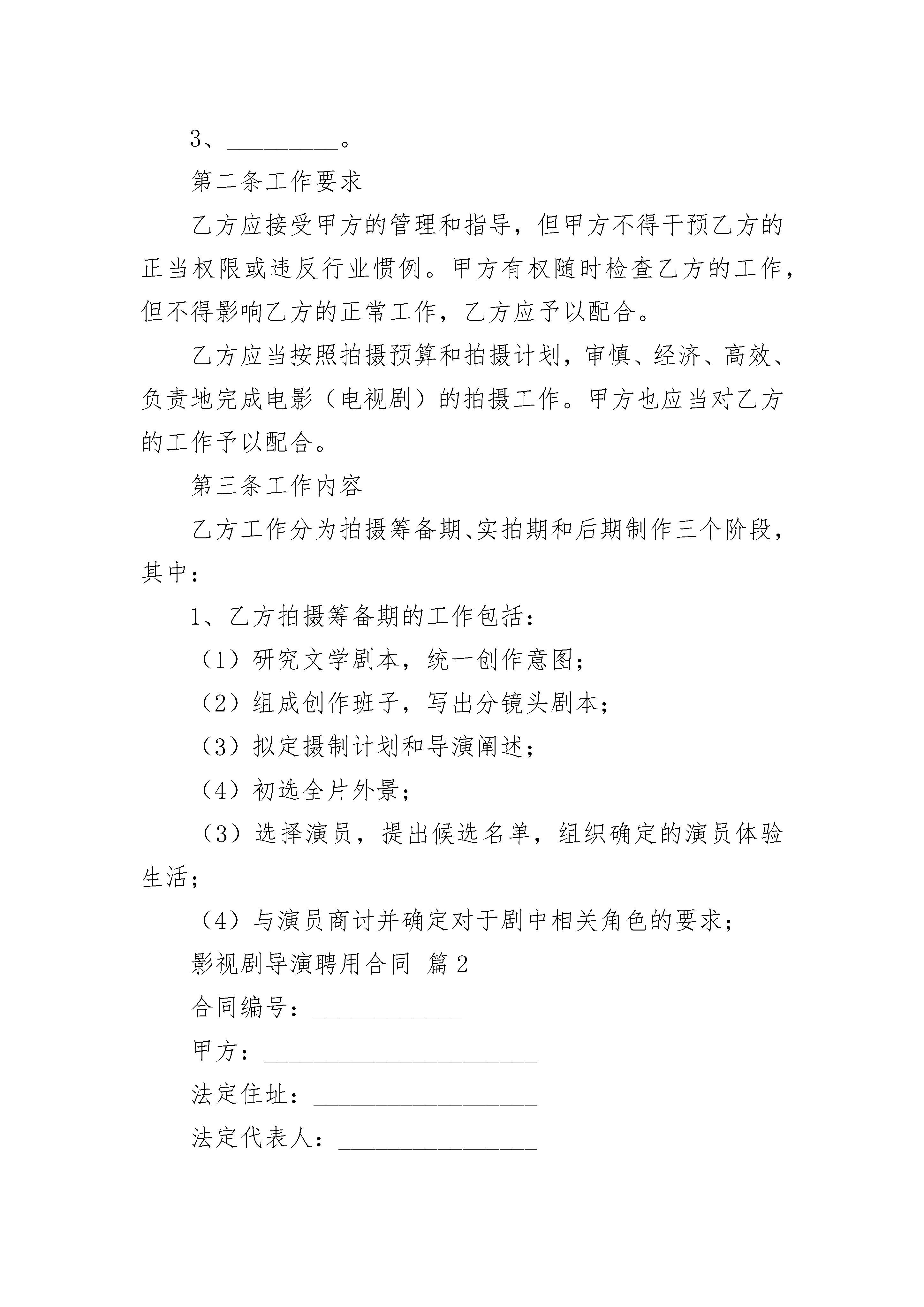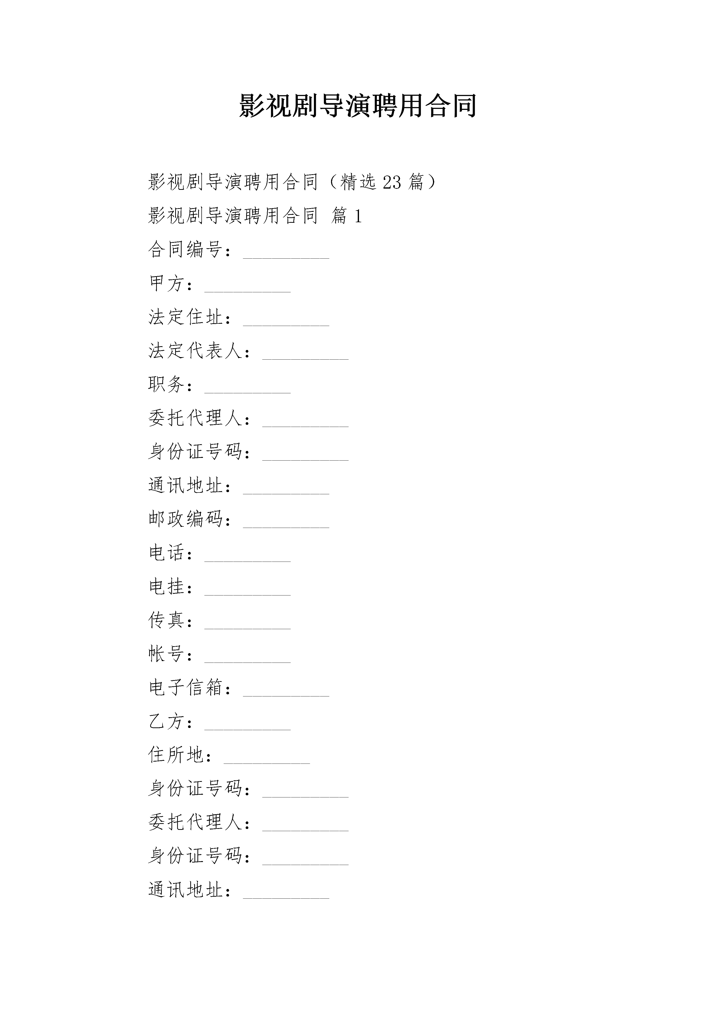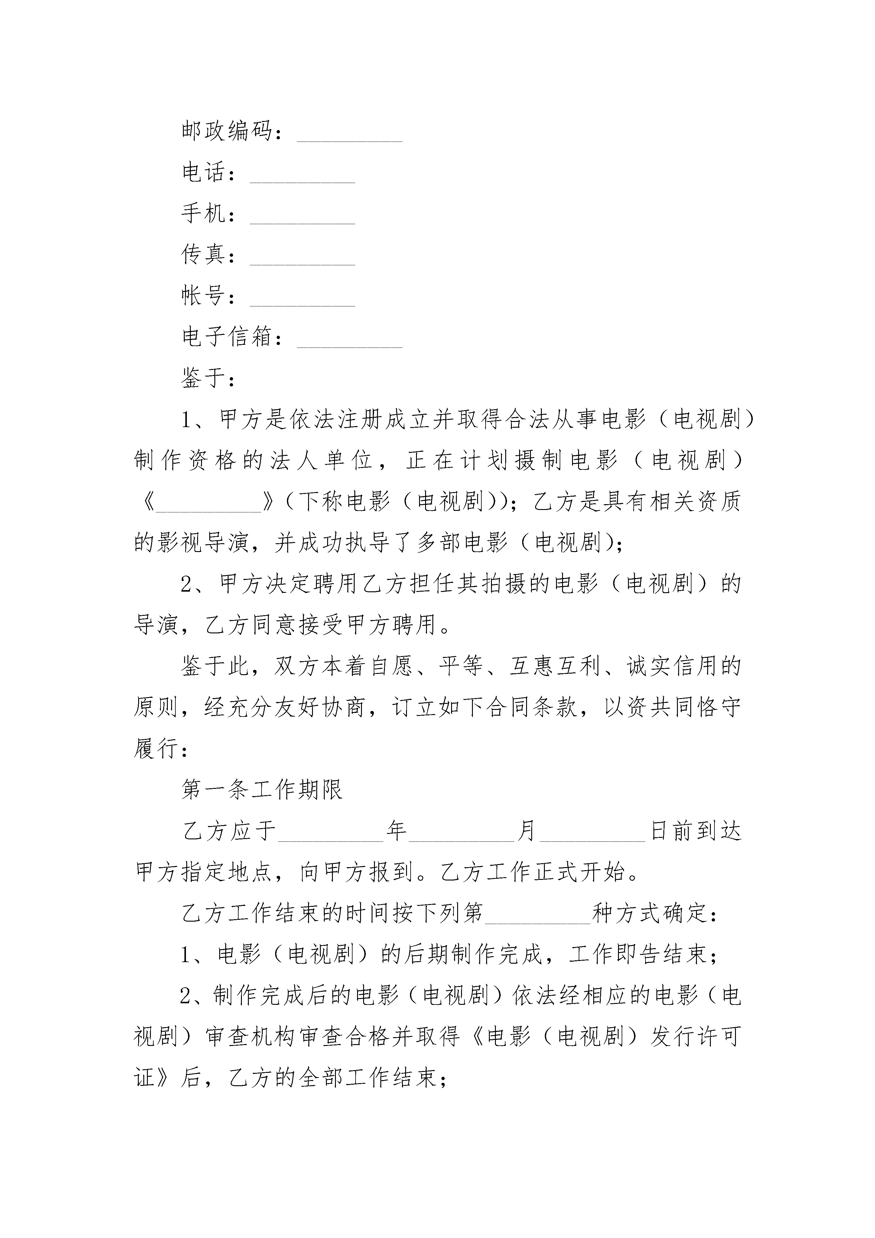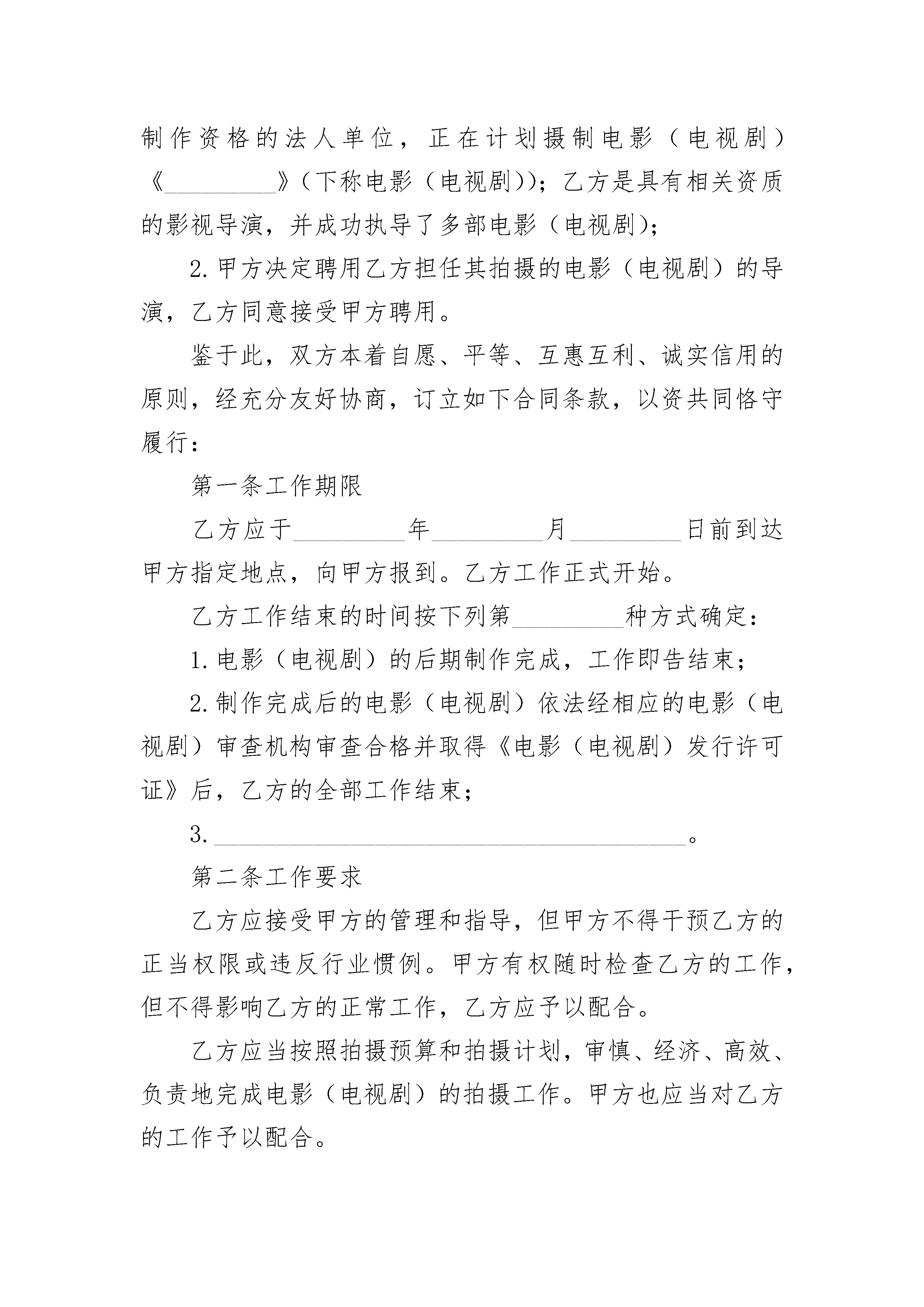 影视剧导演聘用合同影视剧导演聘用合同(精选23篇)影视剧导演聘用合同篇1合同编号:_________甲方:_________法定住址:_________法定代表人:_________职务:_________委托代理人:_________身份证号码:_________通讯地址:_________邮政编码:_________电话:_________电挂:_________传真:_________帐号:_________电子信箱:_________乙方:_________住所地:_________身份证号码:_________委托代理人:_________身份证号码:_________通讯地址:_________邮政编码:_________电话:_________手机:_________传真:_________帐号:_________电子信箱:_________鉴于:1、甲方是依法注册成立并取得合法从事电影(电视剧)制作资格的法人单位,正在计划摄制电影(电视剧)《_________》(下称电影(电视剧));乙方是具有相关资质的影视导演,并成功执导了多部电影(电视剧);2、甲方决定聘用乙方担任其拍摄的电影(电视剧)的导演,乙方同意接受甲方聘用。鉴于此,双方本着自愿、平等、互惠互利、诚实信用的原则,经充分友好协商,订立如下合同条款,以资共同恪守履行:第一条工作期限乙方应于_________年_________月_________日前到达甲方指定地点,向甲方报到。乙方工作正式开始。乙方工作结束的时间按下列第_________种方式确定:1、电影(电视剧)的后期制作完成,工作即告结束;2、制作完成后的电影(电视剧)依法经相应的电影(电视剧)审查机构审查合格并取得《电影(电视剧)发行许可证》后,乙方的全部工作结束;3、_________。第二条工作要求乙方应接受甲方的管理和指导,但甲方不得干预乙方的正当权限或违反行业惯例。甲方有权随时检查乙方的工作,但不得影响乙方的正常工作,乙方应予以配合。乙方应当按照拍摄预算和拍摄计划,审慎、经济、高效、负责地完成电影(电视剧)的拍摄工作。甲方也应当对乙方的工作予以配合。第三条工作内容乙方工作分为拍摄筹备期、实拍期和后期制作三个阶段,其中:1、乙方拍摄筹备期的工作包括:(1)研究文学剧本,统一创作意图;(2)组成创作班子,写出分镜头剧本;(3)拟定摄制计划和导演阐述;(4)初选全片外景;(3)选择演员,提出候选名单,组织确定的演员体验生活;(4)与演员商讨并确定对于剧中相关角色的要求;影视剧导演聘用合同篇2合同编号:____________甲方:______________________法定住址:__________________法定代表人:________________职务:______________________委托代理人:________________身份证号码:________________通讯地址:__________________邮政编码:__________________电话:______________________电挂:______________________传真:______________________帐号:______________________电子信箱:__________________乙方:______________________住所地:____________________身份证号码:________________委托代理人:________________身份证号码:________________通讯地址:__________________邮政编码:__________________电话:______________________手机:______________________传真:______________________帐号:______________________电子信箱:___________________鉴于:1.甲方是依法注册成立并取得合法从事电影(电视剧)制作资格的法人单位,正在计划摄制电影(电视剧)《_________》(下称电影(电视剧));乙方是具有相关资质的影视导演,并成功执导了多部电影(电视剧);2.甲方决定聘用乙方担任其拍摄的电影(电视剧)的导演,乙方同意接受甲方聘用。鉴于此,双方本着自愿、平等、互惠互利、诚实信用的原则,经充分友好协商,订立如下合同条款,以资共同恪守履行:第一条工作期限乙方应于_________年_________月_________日前到达甲方指定地点,向甲方报到。乙方工作正式开始。乙方工作结束的时间按下列第_________种方式确定:1.电影(电视剧)的后期制作完成