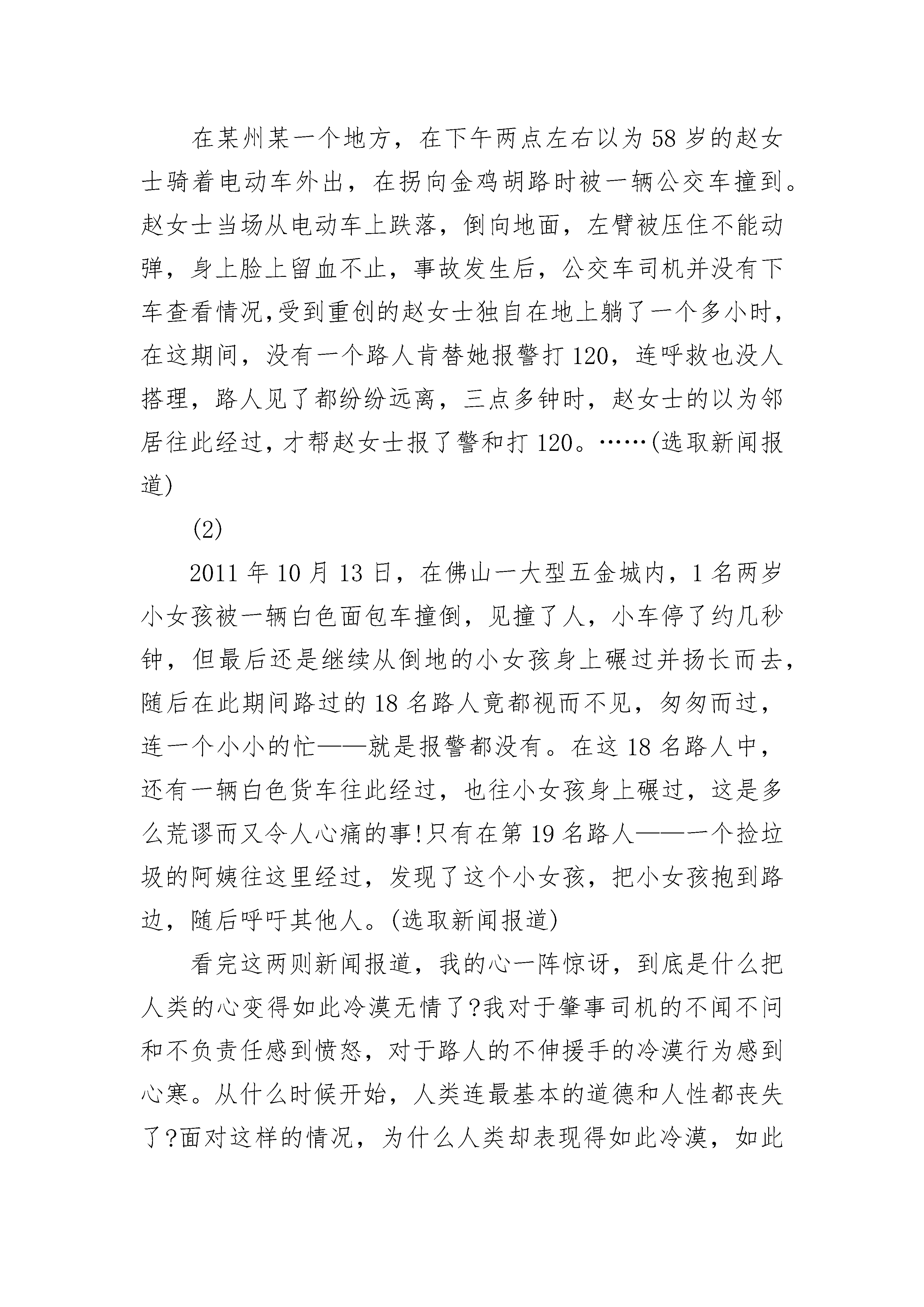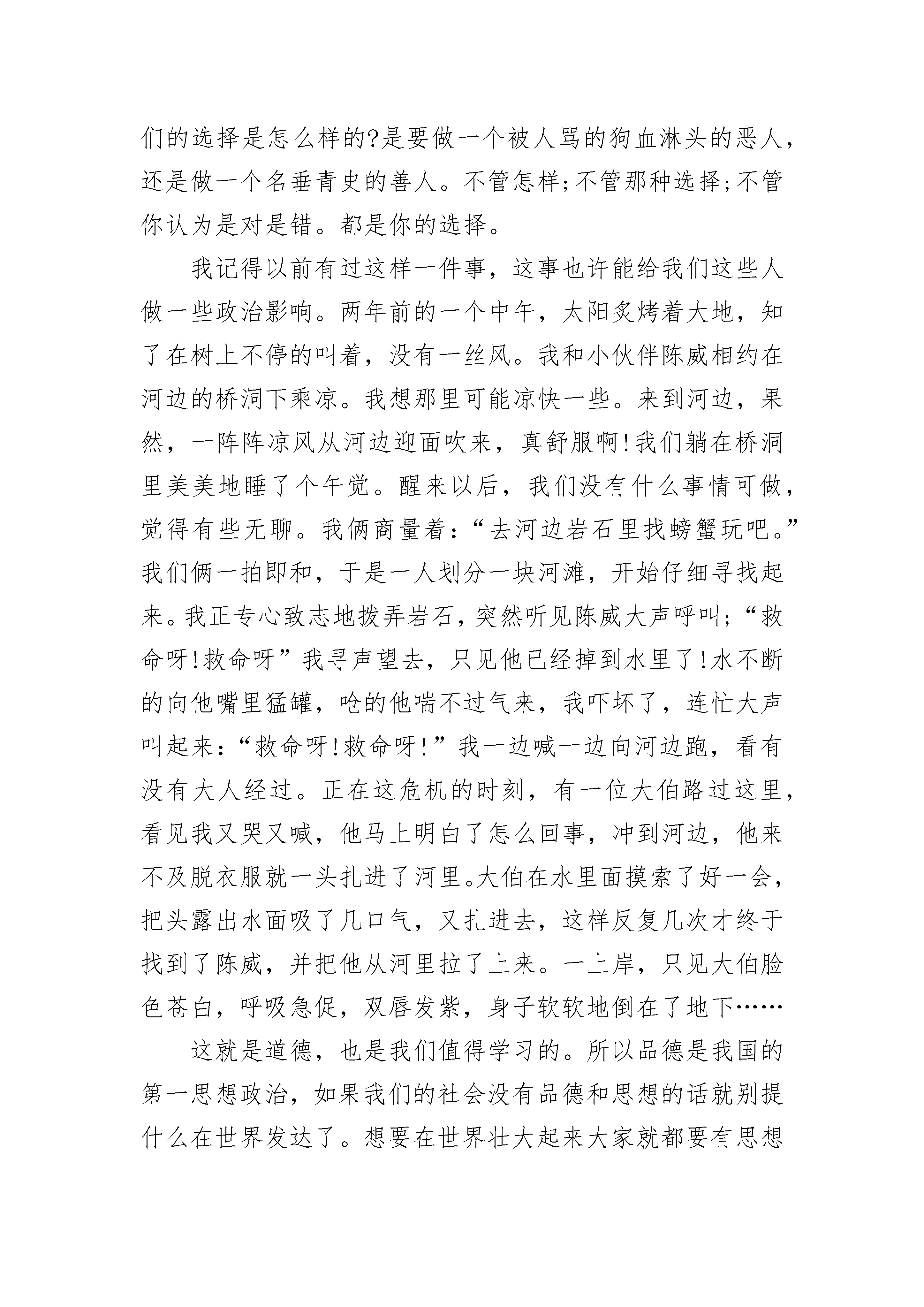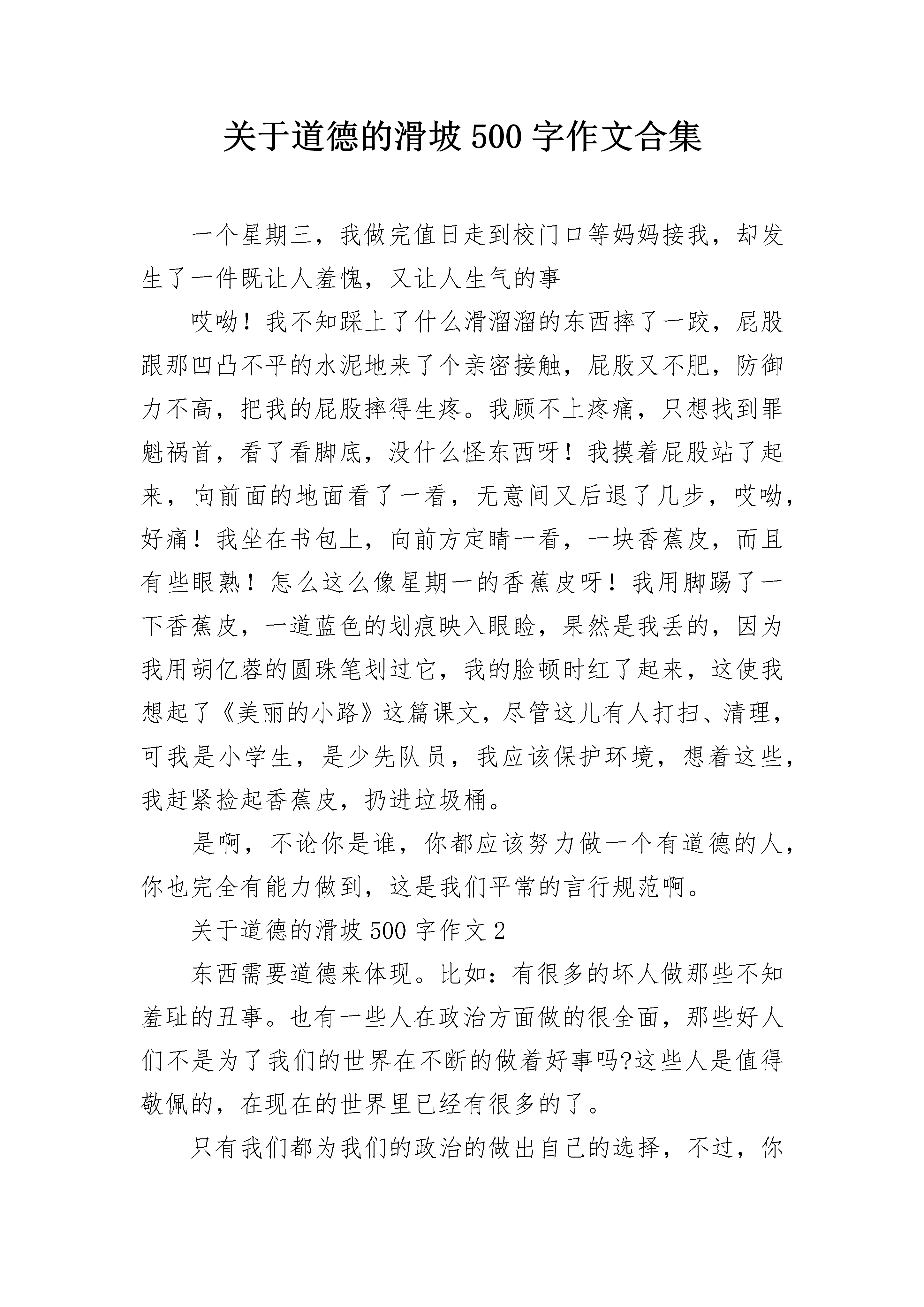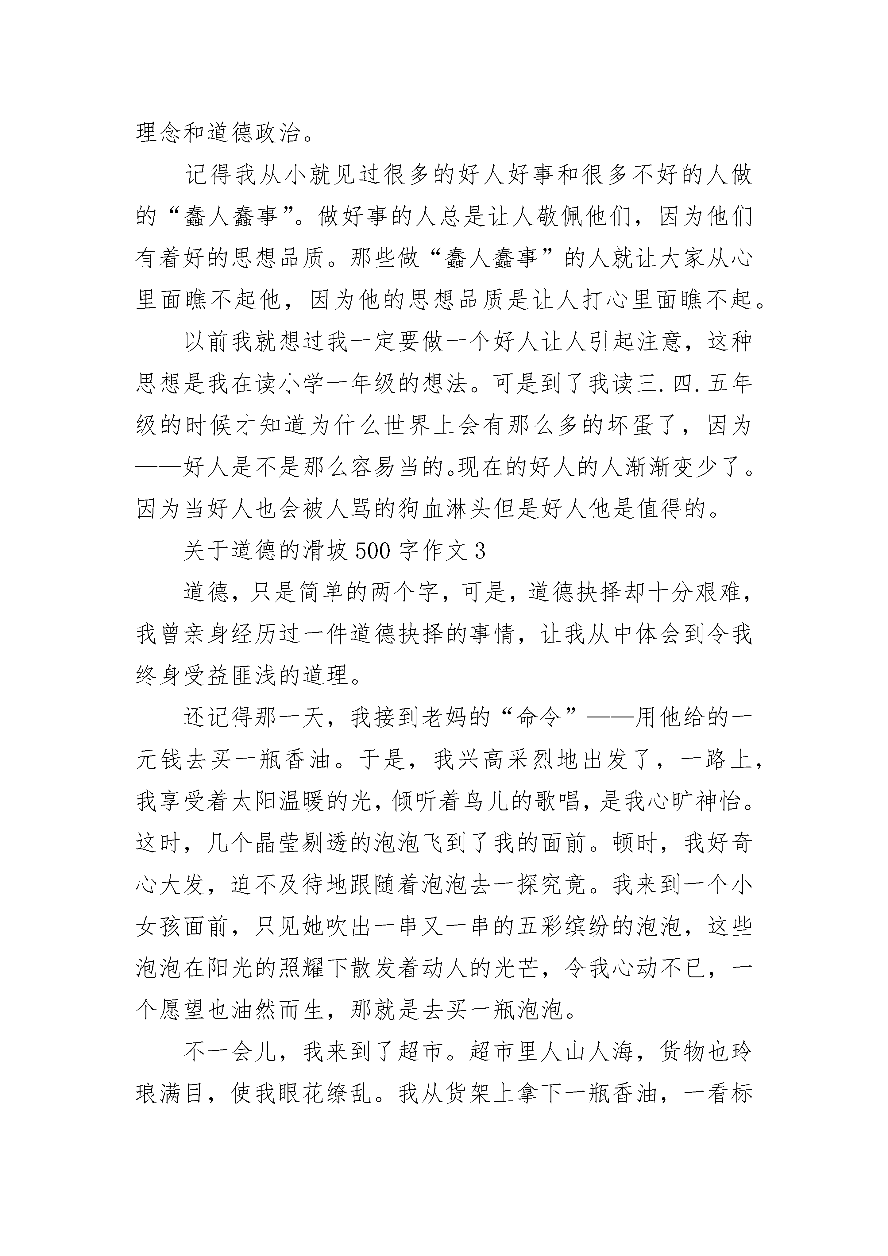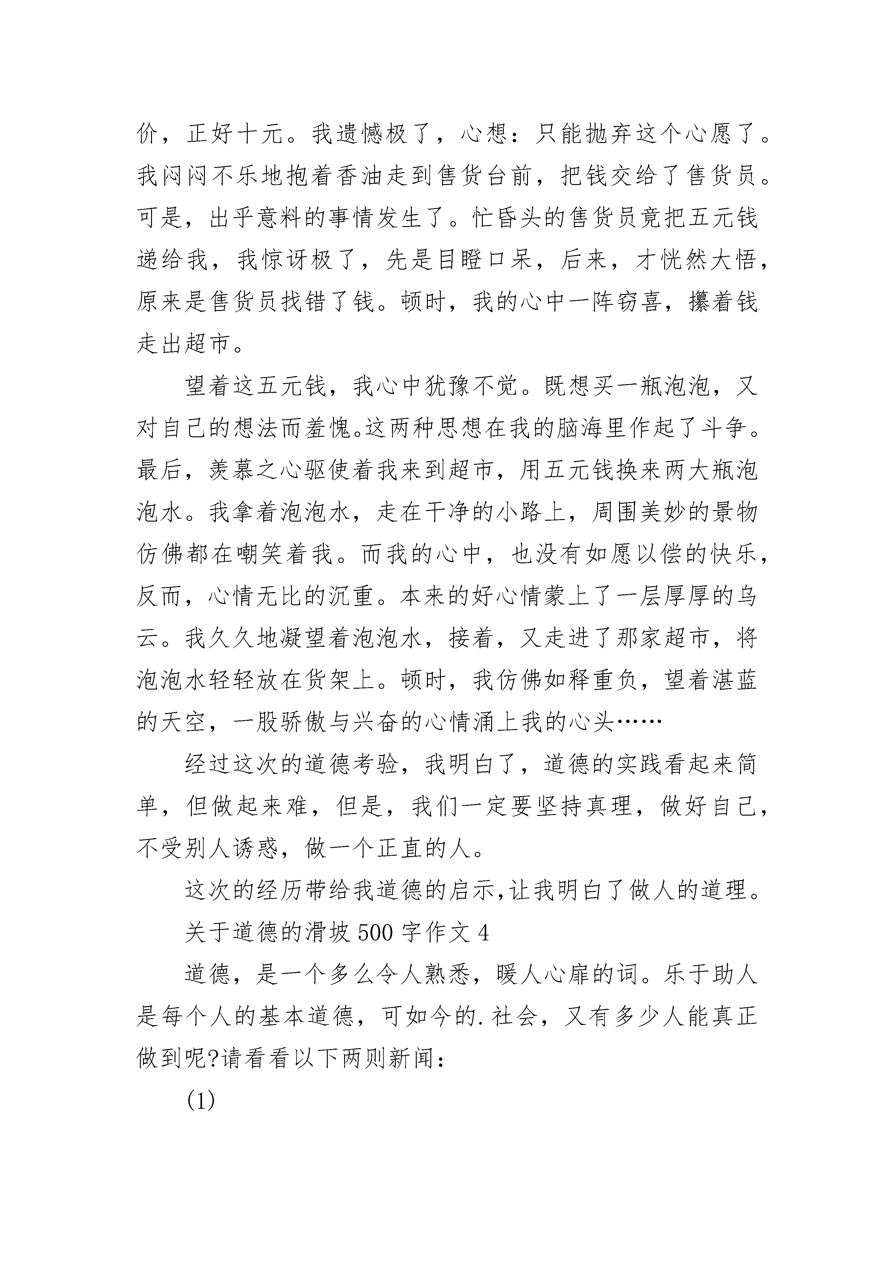 关于道德的滑坡500字作文合集一个星期三,我做完值日走到校门口等妈妈接我,却发生了一件既让人羞愧,又让人生气的事哎呦!我不知踩上了什么滑溜溜的东西摔了一跤,屁股跟那凹凸不平的水泥地来了个亲密接触,屁股又不肥,防御力不高,把我的屁股摔得生疼。我顾不上疼痛,只想找到罪魁祸首,看了看脚底,没什么怪东西呀!我摸着屁股站了起来,向前面的地面看了一看,无意间又后退了几步,哎呦,好痛!我坐在书包上,向前方定睛一看,一块香蕉皮,而且有些眼熟!怎么这么像星期一的香蕉皮呀!我用脚踢了一下香蕉皮,一道蓝色的划痕映入眼睑,果然是我丢的,因为我用胡亿蓉的圆珠笔划过它,我的脸顿时红了起来,这使我想起了《美丽的小路》这篇课文,尽管这儿有人打扫、清理,可我是小学生,是少先队员,我应该保护环境,想着这些,我赶紧捡起香蕉皮,扔进垃圾桶。是啊,不论你是谁,你都应该努力做一个有道德的人,你也完全有能力做到,这是我们平常的言行规范啊。关于道德的滑坡500字作文2东西需要道德来体现。比如:有很多的坏人做那些不知羞耻的丑事。也有一些人在政治方面做的很全面,那些好人们不是为了我们的世界在不断的做着好事吗?这些人是值得敬佩的,在现在的世界里已经有很多的了。只有我们都为我们的政治的做出自己的选择,不过,你们的选择是怎么样的?是要做一个被人骂的狗血淋头的恶人,还是做一个名垂青史的善人。不管怎样;不管那种选择;不管你认为是对是错。都是你的选择。我记得以前有过这样一件事,这事也许能给我们这些人做一些政治影响。两年前的一个中午,太阳炙烤着大地,知了在树上不停的叫着,没有一丝风。我和小伙伴陈威相约在河边的桥洞下乘凉。我想那里可能凉快一些。来到河边,果然,一阵阵凉风从河边迎面吹来,真舒服啊!我们躺在桥洞里美美地睡了个午觉。醒来以后,我们没有什么事情可做,觉得有些无聊。我俩商量着:“去河边岩石里找螃蟹玩吧。”我们俩一拍即和,于是一人划分一块河滩,开始仔细寻找起来。我正专心致志地拨弄岩石,突然听见陈威大声呼叫;“救命呀!救命呀”我寻声望去,只见他已经掉到水里了!水不断的向他嘴里猛罐,呛的他喘不过气来,我吓坏了,连忙大声叫起来:“救命呀!救命呀!”我一边喊一边向河边跑,看有没有大人经过。正在这危机的时刻,有一位大伯路过这里,看见我又哭又喊,他马上明白了怎么回事,冲到河边,他来不及脱衣服就一头扎进了河里。大伯在水里面摸索了好一会,把头露出水面吸了几口气,又扎进去,这样反复几次才终于找到了陈威,并把他从河里拉了上来。一上岸,只见大伯脸色苍白,呼吸急促,双唇发紫,身子软软地倒在了地下……这就是道德,也是我们值得学习的。所以品德是我国的第一思想政治,如果我们的社会没有品德和思想的话就别提什么在世界发达了。想要在世界壮大起来大家就都要有思想理念和道德政治。记得我从小就见过很多的好人好事和很多不好的人做的“蠢人蠢事”。做好事的人总是让人敬佩他们,因为他们有着好的思想品质。那些做“蠢人蠢事”的人就让大家从心里面瞧不起他,因为他的思想品质是让人打心里面瞧不起。以前我就想过我一定要做一个好人让人引起注意,这种思想是我在读小学一年级的想法。可是到了我读三.四.五年级的时候才知道为什么世界上会有那么多的坏蛋了,因为——好人是不是那么容易当的。现在的好人的人渐渐变少了。因为当好人也会被人骂的狗血淋头但是好人他是值得的。关于道德的滑坡500字作文3道德,只是简单的两个字,可是,道德抉择却十分艰难,我曾亲身经历过一件道德抉择的事情,让我从中体会到令我终身受益匪浅的道理。还记得那一天,我接到老妈的“命令”——用他给的一元钱去买一瓶香油。于是,我兴高采烈地出发了,一路上,我享受着太阳温暖的光,倾听着鸟儿的歌唱,是我心旷神怡。这时,几个晶莹剔透的泡泡飞到了我的面前。顿时,我好奇心大发,迫不及待地跟随着泡泡去一探究竟。我来到一个小女孩面前,只见她吹出一串又一串的五彩缤纷的泡泡,这些泡泡在阳光的照耀下散发着动人的光芒,令我心动不已,一个愿望也油然而生,那就是去买一瓶泡泡。不一会儿,我来到了超市。超市里人山人海,货物也玲琅满目,使我眼花缭乱。我从货架上拿下一瓶香油,一看标价,正好十元。我遗憾极了,心想:只能抛弃这个心愿了。我闷闷不乐地抱着香油走到售货台前,把钱交给了售货员。可是,出乎意料的事情发生了。忙昏头的售货员竟把五元钱递给我,我惊讶极了,先是目瞪口呆,后来,才恍然大悟,原来是售货员找错了钱。顿时,我的心中一阵窃喜,攥着钱走出超市。望着这五元钱,我心中犹豫不觉。既想买一瓶泡泡,又对自己的想法而羞愧。这两种思想在我的脑海里作起了斗争。最后,羡慕之心驱使着我来到超市,用五元钱换来两大瓶泡泡水。我拿着泡泡水,走在干净的小路上,周围美妙的景物仿佛都在嘲笑着我。而我的心中,也没有如愿以偿的快乐,反而,心情无比的沉重。本来的好心情蒙上了一
