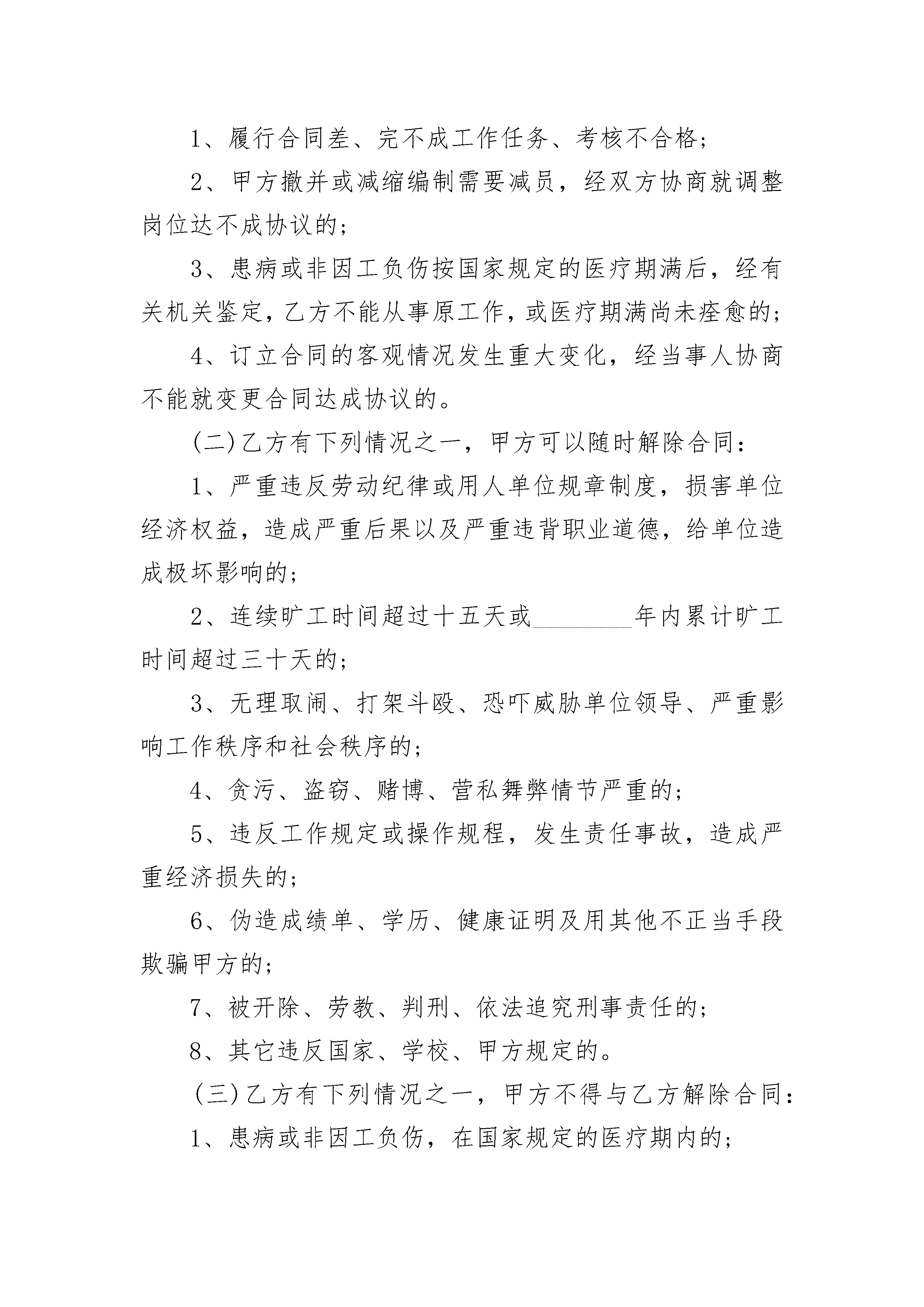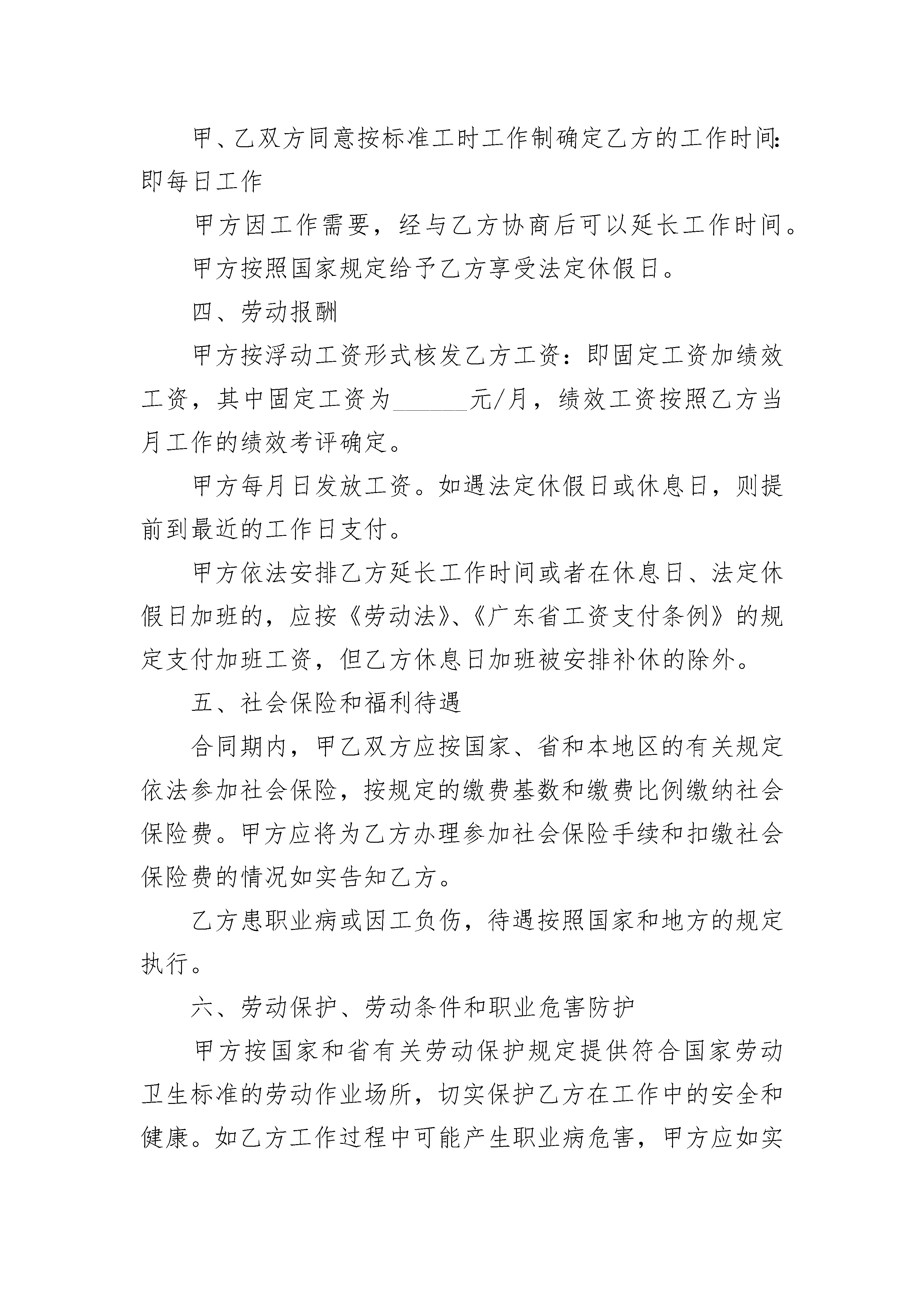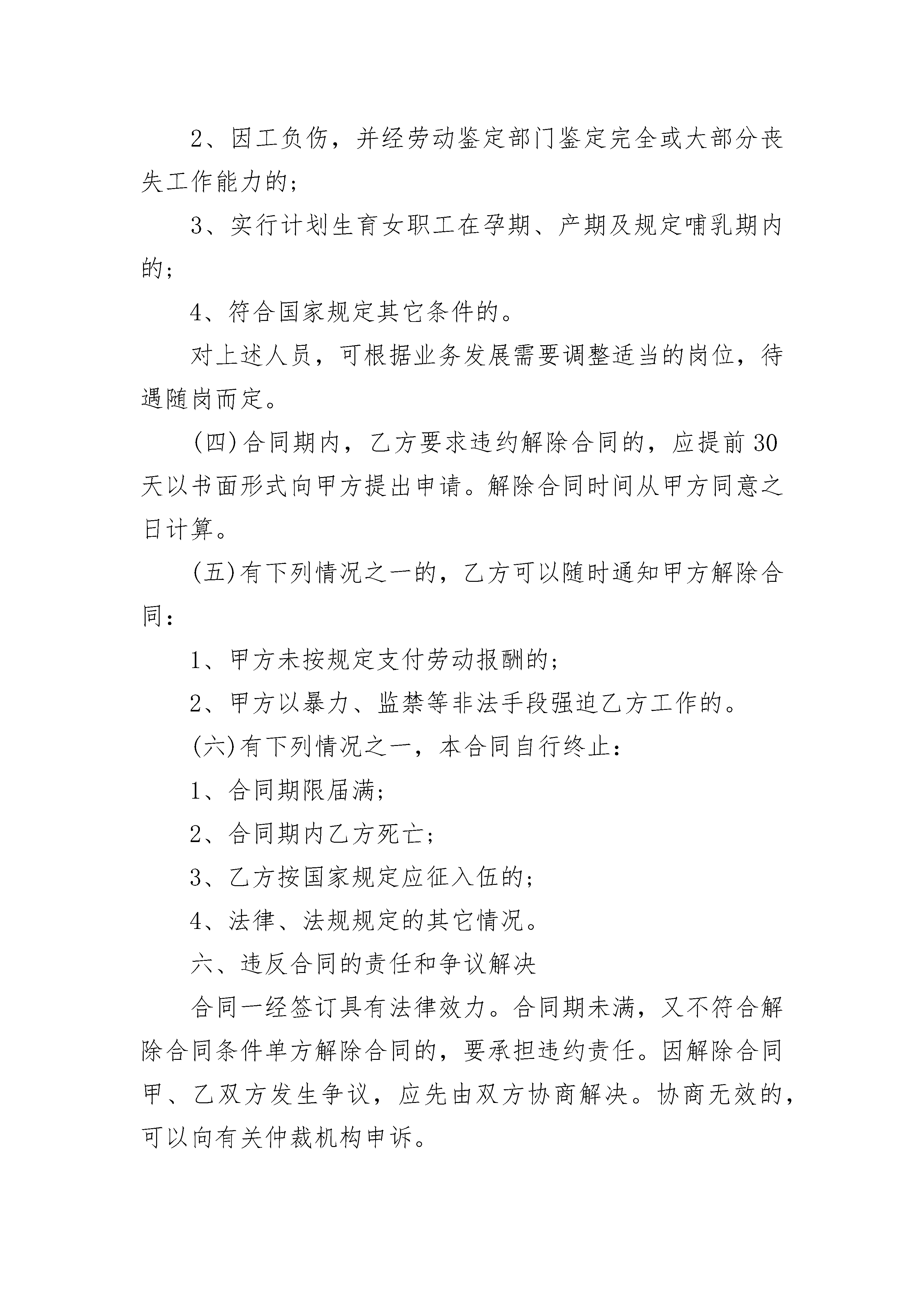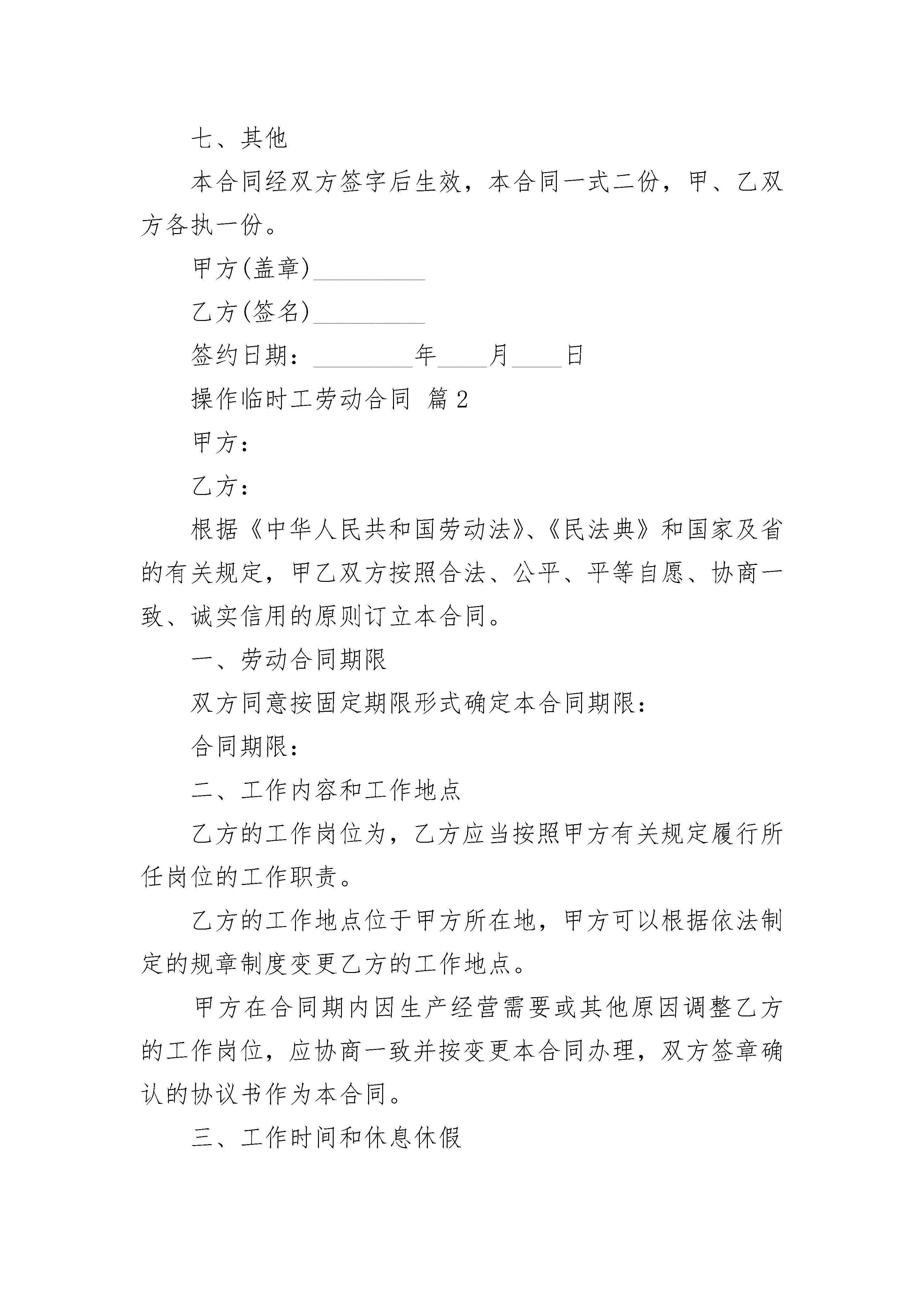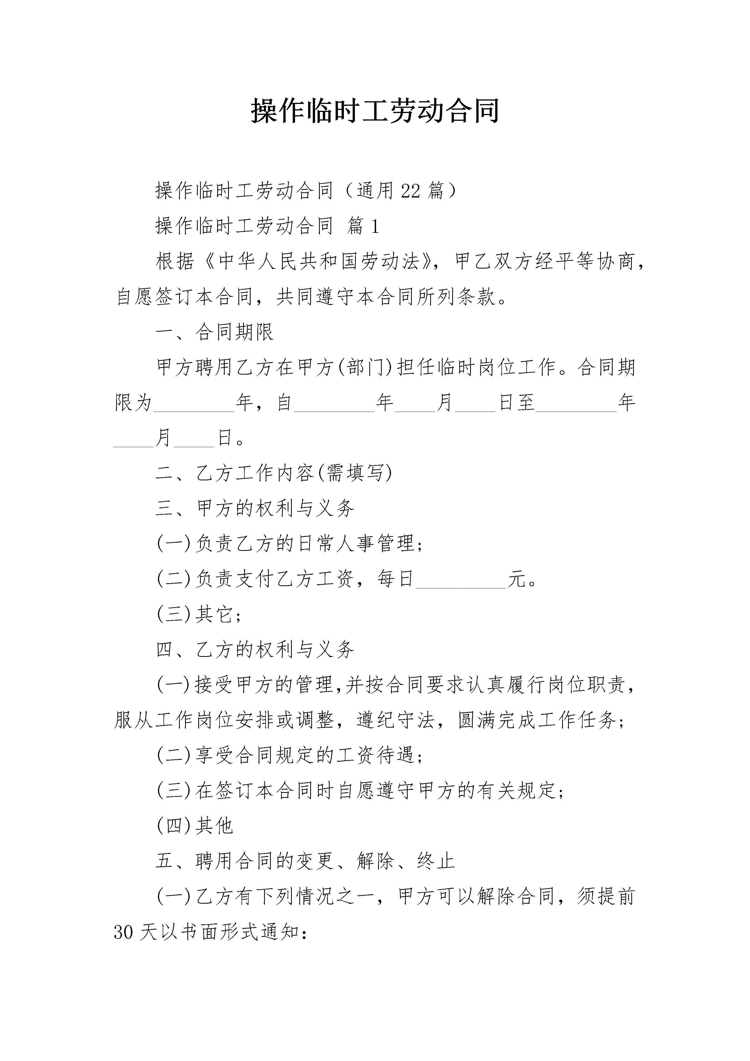 操作临时工劳动合同操作临时工劳动合同(通用22篇)操作临时工劳动合同篇1根据《中华人民共和国劳动法》,甲乙双方经平等协商,自愿签订本合同,共同遵守本合同所列条款。一、合同期限甲方聘用乙方在甲方(部门)担任临时岗位工作。合同期限为________年,自________年____月____日至________年____月____日。二、乙方工作内容(需填写)三、甲方的权利与义务(一)负责乙方的日常人事管理;(二)负责支付乙方工资,每日_________元。(三)其它;四、乙方的权利与义务(一)接受甲方的管理,并按合同要求认真履行岗位职责,服从工作岗位安排或调整,遵纪守法,圆满完成工作任务;(二)享受合同规定的工资待遇;(三)在签订本合同时自愿遵守甲方的有关规定;(四)其他五、聘用合同的变更、解除、终止(一)乙方有下列情况之一,甲方可以解除合同,须提前30天以书面形式通知:1、履行合同差、完不成工作任务、考核不合格;2、甲方撤并或减缩编制需要减员,经双方协商就调整岗位达不成协议的;3、患病或非因工负伤按国家规定的医疗期满后,经有关机关鉴定,乙方不能从事原工作,或医疗期满尚未痊愈的;4、订立合同的客观情况发生重大变化,经当事人协商不能就变更合同达成协议的。(二)乙方有下列情况之一,甲方可以随时解除合同:1、严重违反劳动纪律或用人单位规章制度,损害单位经济权益,造成严重后果以及严重违背职业道德,给单位造成极坏影响的;2、连续旷工时间超过十五天或________年内累计旷工时间超过三十天的;3、无理取闹、打架斗殴、恐吓威胁单位领导、严重影响工作秩序和社会秩序的;4、贪污、盗窃、赌博、营私舞弊情节严重的;5、违反工作规定或操作规程,发生责任事故,造成严重经济损失的;6、伪造成绩单、学历、健康证明及用其他不正当手段欺骗甲方的;7、被开除、劳教、判刑、依法追究刑事责任的;8、其它违反国家、学校、甲方规定的。(三)乙方有下列情况之一,甲方不得与乙方解除合同:1、患病或非因工负伤,在国家规定的医疗期内的;2、因工负伤,并经劳动鉴定部门鉴定完全或大部分丧失工作能力的;3、实行计划生育女职工在孕期、产期及规定哺乳期内的;4、符合国家规定其它条件的。对上述人员,可根据业务发展需要调整适当的岗位,待遇随岗而定。(四)合同期内,乙方要求违约解除合同的,应提前30天以书面形式向甲方提出申请。解除合同时间从甲方同意之日计算。(五)有下列情况之一的,乙方可以随时通知甲方解除合同:1、甲方未按规定支付劳动报酬的;2、甲方以暴力、监禁等非法手段强迫乙方工作的。(六)有下列情况之一,本合同自行终止:1、合同期限届满;2、合同期内乙方死亡;3、乙方按国家规定应征入伍的;4、法律、法规规定的其它情况。六、违反合同的责任和争议解决合同一经签订具有法律效力。合同期未满,又不符合解除合同条件单方解除合同的,要承担违约责任。因解除合同甲、乙双方发生争议,应先由双方协商解决。协商无效的,可以向有关仲裁机构申诉。七、其他本合同经双方签字后生效,本合同一式二份,甲、乙双方各执一份。甲方(盖章)_________乙方(签名)_________签约日期:________年____月____日操作临时工劳动合同篇2甲方:乙方:根据《中华人民共和国劳动法》、《民法典》和国家及省的有关规定,甲乙双方按照合法、公平、平等自愿、协商一致、诚实信用的原则订立本合同。一、劳动合同期限双方同意按固定期限形式确定本合同期限:合同期限:二、工作内容和工作地点乙方的工作岗位为,乙方应当按照甲方有关规定履行所任岗位的工作职责。乙方的工作地点位于甲方所在地,甲方可以根据依法制定的规章制度变更乙方的工作地点。甲方在合同期内因生产经营需要或其他原因调整乙方的工作岗位,应协商一致并按变更本合同办理,双方签章确认的协议书作为本合同。三、工作时间和休息休假甲、乙双方同意按标准工时工作制确定乙方的工作时间:即每日工作甲方因工作需要,经与乙方协商后可以延长工作时间。甲方按照国家规定给予乙方享受法定休假日。四、劳动报酬甲方按浮动工资形式核发乙方工资:即固定工资加绩效工资,其中固定工资为______元/月,绩效工资按照乙方当月工作的绩效考评确定。甲方每月日发放工资。如遇法定休假日或休息日,则提前到最近的工作日支付。甲方依法安排乙方延长工作时间或者在休息日、法定休假日加班的,应按《劳动法》、《广东省工资支付条例》的规定支付加班工资,但乙方休息日加班被安排补休的除外。五、社会保险和福利待遇合同期内,甲乙双方应按国家、省和本地区的有关规定依法参加社会保险,按规定的缴费基数和缴费比例缴纳社会保险费。甲方应将为乙方办理参加社会保险手续和扣缴社会保险费的情况如实告知乙方。乙方患职业病或因工负伤,待遇按照国家和地方的规定执行。六、劳动保护、劳动
