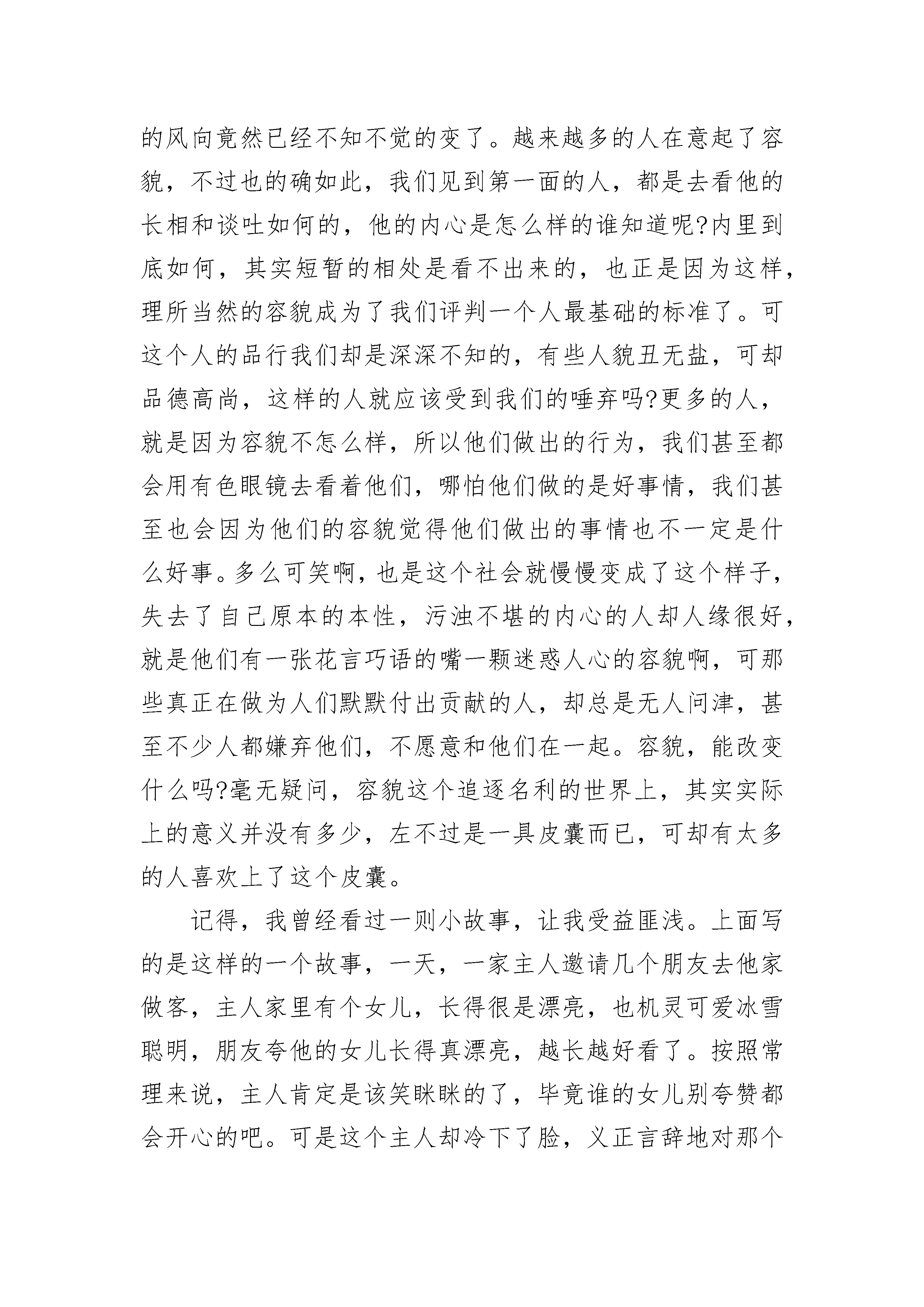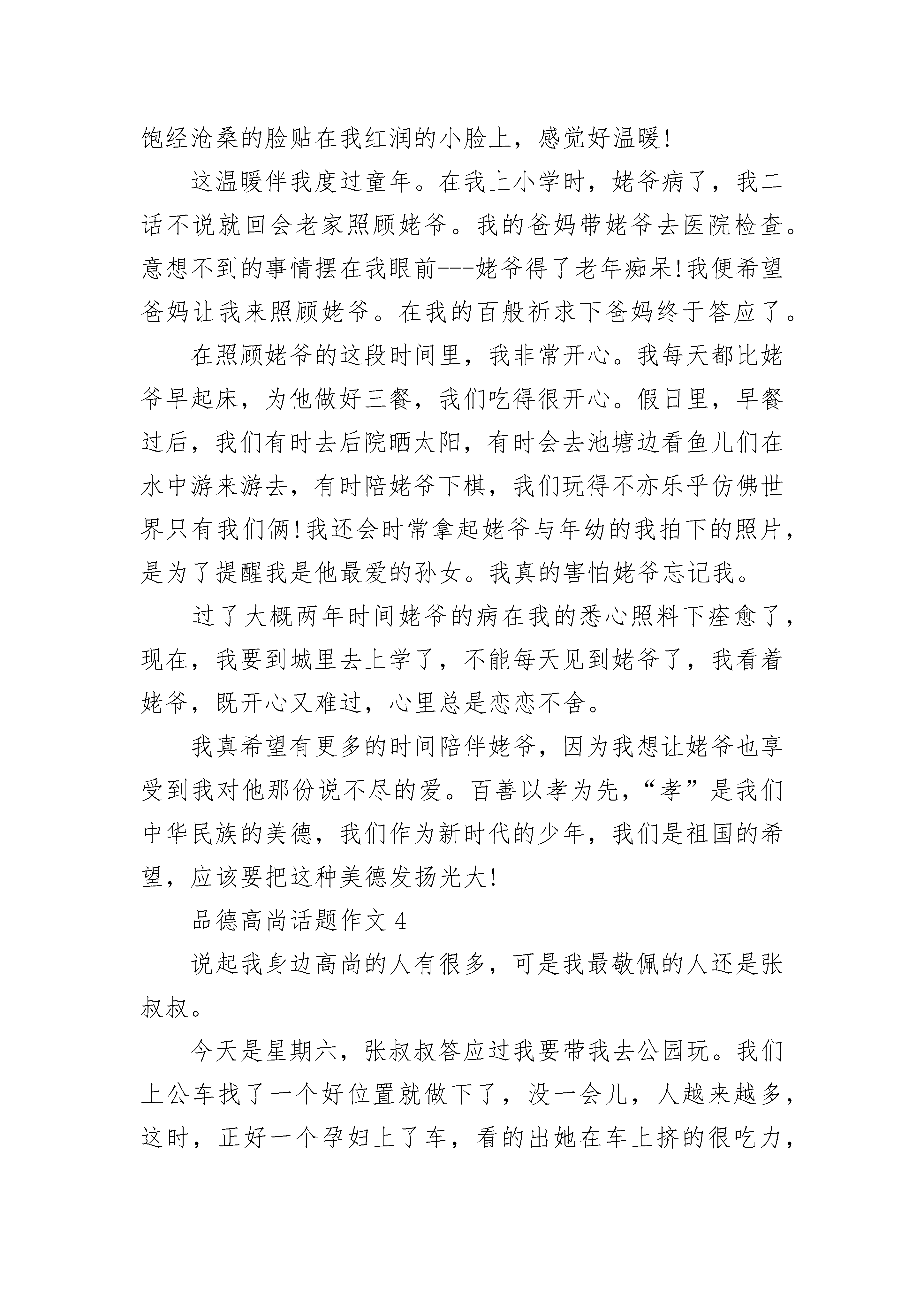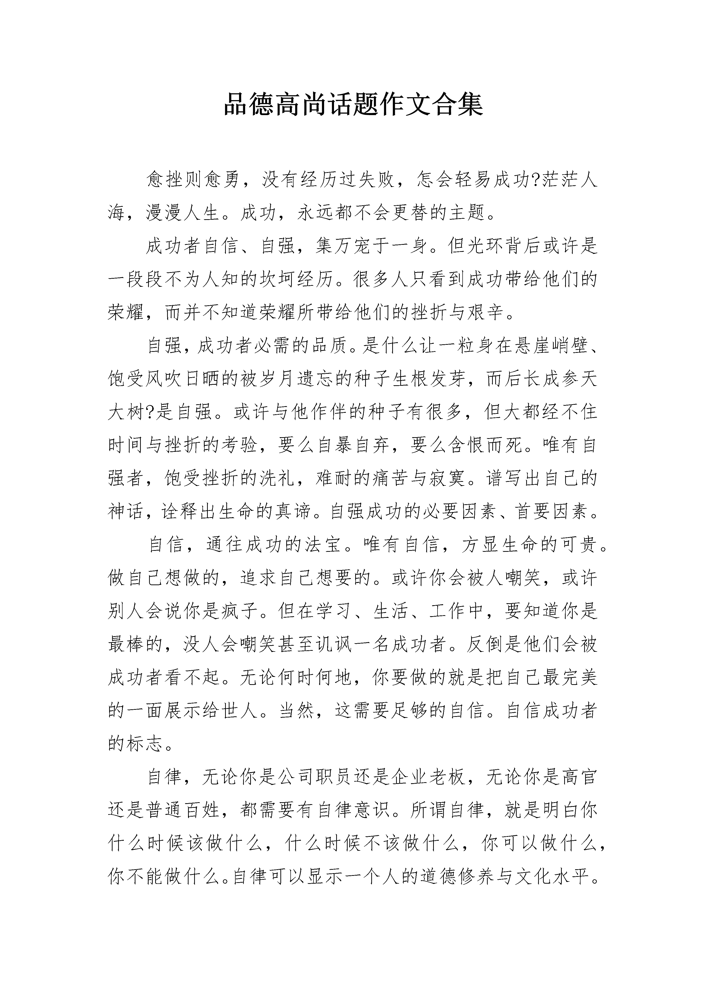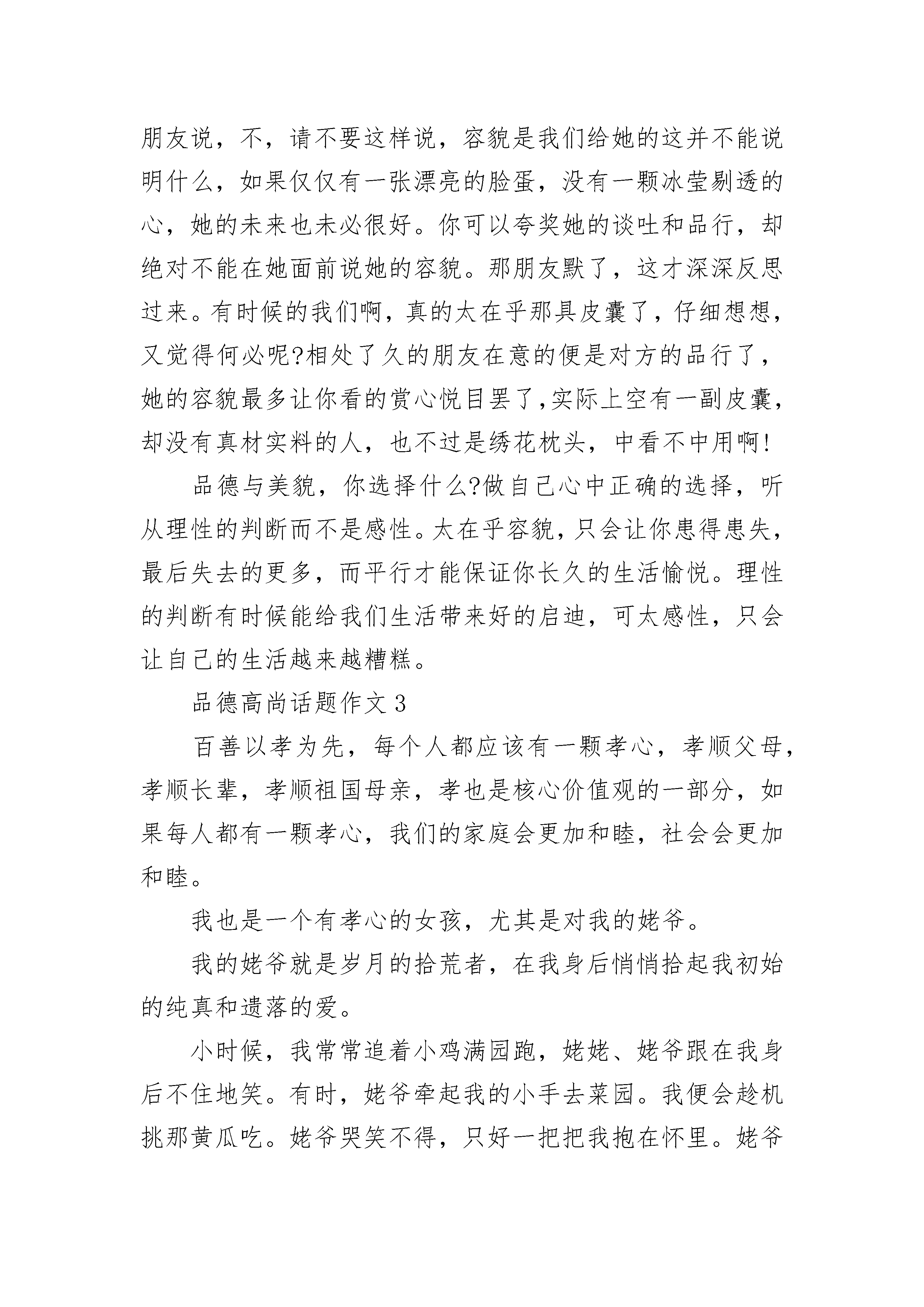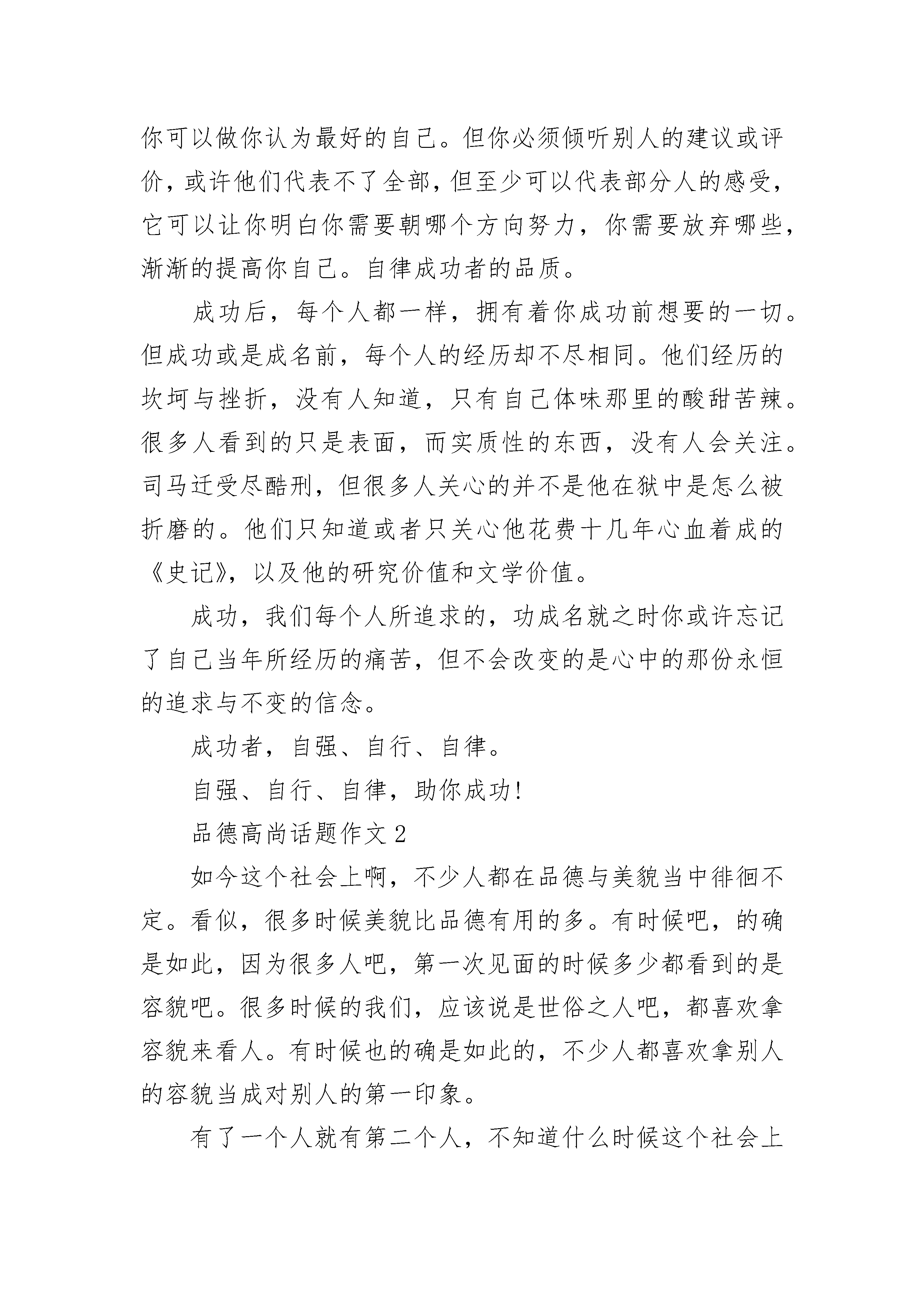 品德高尚话题作文合集愈挫则愈勇,没有经历过失败,怎会轻易成功?茫茫人海,漫漫人生。成功,永远都不会更替的主题。成功者自信、自强,集万宠于一身。但光环背后或许是一段段不为人知的坎坷经历。很多人只看到成功带给他们的荣耀,而并不知道荣耀所带给他们的挫折与艰辛。自强,成功者必需的品质。是什么让一粒身在悬崖峭壁、饱受风吹日晒的被岁月遗忘的种子生根发芽,而后长成参天大树?是自强。或许与他作伴的种子有很多,但大都经不住时间与挫折的考验,要么自暴自弃,要么含恨而死。唯有自强者,饱受挫折的洗礼,难耐的痛苦与寂寞。谱写出自己的神话,诠释出生命的真谛。自强成功的必要因素、首要因素。自信,通往成功的法宝。唯有自信,方显生命的可贵。做自己想做的,追求自己想要的。或许你会被人嘲笑,或许别人会说你是疯子。但在学习、生活、工作中,要知道你是最棒的,没人会嘲笑甚至讥讽一名成功者。反倒是他们会被成功者看不起。无论何时何地,你要做的就是把自己最完美的一面展示给世人。当然,这需要足够的自信。自信成功者的标志。自律,无论你是公司职员还是企业老板,无论你是高官还是普通百姓,都需要有自律意识。所谓自律,就是明白你什么时候该做什么,什么时候不该做什么,你可以做什么,你不能做什么。自律可以显示一个人的道德修养与文化水平。你可以做你认为最好的自己。但你必须倾听别人的建议或评价,或许他们代表不了全部,但至少可以代表部分人的感受,它可以让你明白你需要朝哪个方向努力,你需要放弃哪些,渐渐的提高你自己。自律成功者的品质。成功后,每个人都一样,拥有着你成功前想要的一切。但成功或是成名前,每个人的经历却不尽相同。他们经历的坎坷与挫折,没有人知道,只有自己体味那里的酸甜苦辣。很多人看到的只是表面,而实质性的东西,没有人会关注。司马迁受尽酷刑,但很多人关心的并不是他在狱中是怎么被折磨的。他们只知道或者只关心他花费十几年心血着成的《史记》,以及他的研究价值和文学价值。成功,我们每个人所追求的,功成名就之时你或许忘记了自己当年所经历的痛苦,但不会改变的是心中的那份永恒的追求与不变的信念。成功者,自强、自行、自律。自强、自行、自律,助你成功!品德高尚话题作文2如今这个社会上啊,不少人都在品德与美貌当中徘徊不定。看似,很多时候美貌比品德有用的多。有时候吧,的确是如此,因为很多人吧,第一次见面的时候多少都看到的是容貌吧。很多时候的我们,应该说是世俗之人吧,都喜欢拿容貌来看人。有时候也的确是如此的,不少人都喜欢拿别人的容貌当成对别人的第一印象。有了一个人就有第二个人,不知道什么时候这个社会上的风向竟然已经不知不觉的变了。越来越多的人在意起了容貌,不过也的确如此,我们见到第一面的人,都是去看他的长相和谈吐如何的,他的内心是怎么样的谁知道呢?内里到底如何,其实短暂的相处是看不出来的,也正是因为这样,理所当然的容貌成为了我们评判一个人最基础的标准了。可这个人的品行我们却是深深不知的,有些人貌丑无盐,可却品德高尚,这样的人就应该受到我们的唾弃吗?更多的人,就是因为容貌不怎么样,所以他们做出的行为,我们甚至都会用有色眼镜去看着他们,哪怕他们做的是好事情,我们甚至也会因为他们的容貌觉得他们做出的事情也不一定是什么好事。多么可笑啊,也是这个社会就慢慢变成了这个样子,失去了自己原本的本性,污浊不堪的内心的人却人缘很好,就是他们有一张花言巧语的嘴一颗迷惑人心的容貌啊,可那些真正在做为人们默默付出贡献的人,却总是无人问津,甚至不少人都嫌弃他们,不愿意和他们在一起。容貌,能改变什么吗?毫无疑问,容貌这个追逐名利的世界上,其实实际上的意义并没有多少,左不过是一具皮囊而已,可却有太多的人喜欢上了这个皮囊。记得,我曾经看过一则小故事,让我受益匪浅。上面写的是这样的一个故事,一天,一家主人邀请几个朋友去他家做客,主人家里有个女儿,长得很是漂亮,也机灵可爱冰雪聪明,朋友夸他的女儿长得真漂亮,越长越好看了。按照常理来说,主人肯定是该笑眯眯的了,毕竟谁的女儿别夸赞都会开心的吧。可是这个主人却冷下了脸,义正言辞地对那个朋友说,不,请不要这样说,容貌是我们给她的这并不能说明什么,如果仅仅有一张漂亮的脸蛋,没有一颗冰莹剔透的心,她的未来也未必很好。你可以夸奖她的谈吐和品行,却绝对不能在她面前说她的容貌。那朋友默了,这才深深反思过来。有时候的我们啊,真的太在乎那具皮囊了,仔细想想,又觉得何必呢?相处了久的朋友在意的便是对方的品行了,她的容貌最多让你看的赏心悦目罢了,实际上空有一副皮囊,却没有真材实料的人,也不过是绣花枕头,中看不中用啊!品德与美貌,你选择什么?做自己心中正确的选择,听从理性的判断而不是感性。太在乎容貌,只会让你患得患失,最后失去的更多,而平行才能保证你长久的生活愉悦。理性的判断有时候能给我们生活带来好的启迪,可太感性,只会让自己
