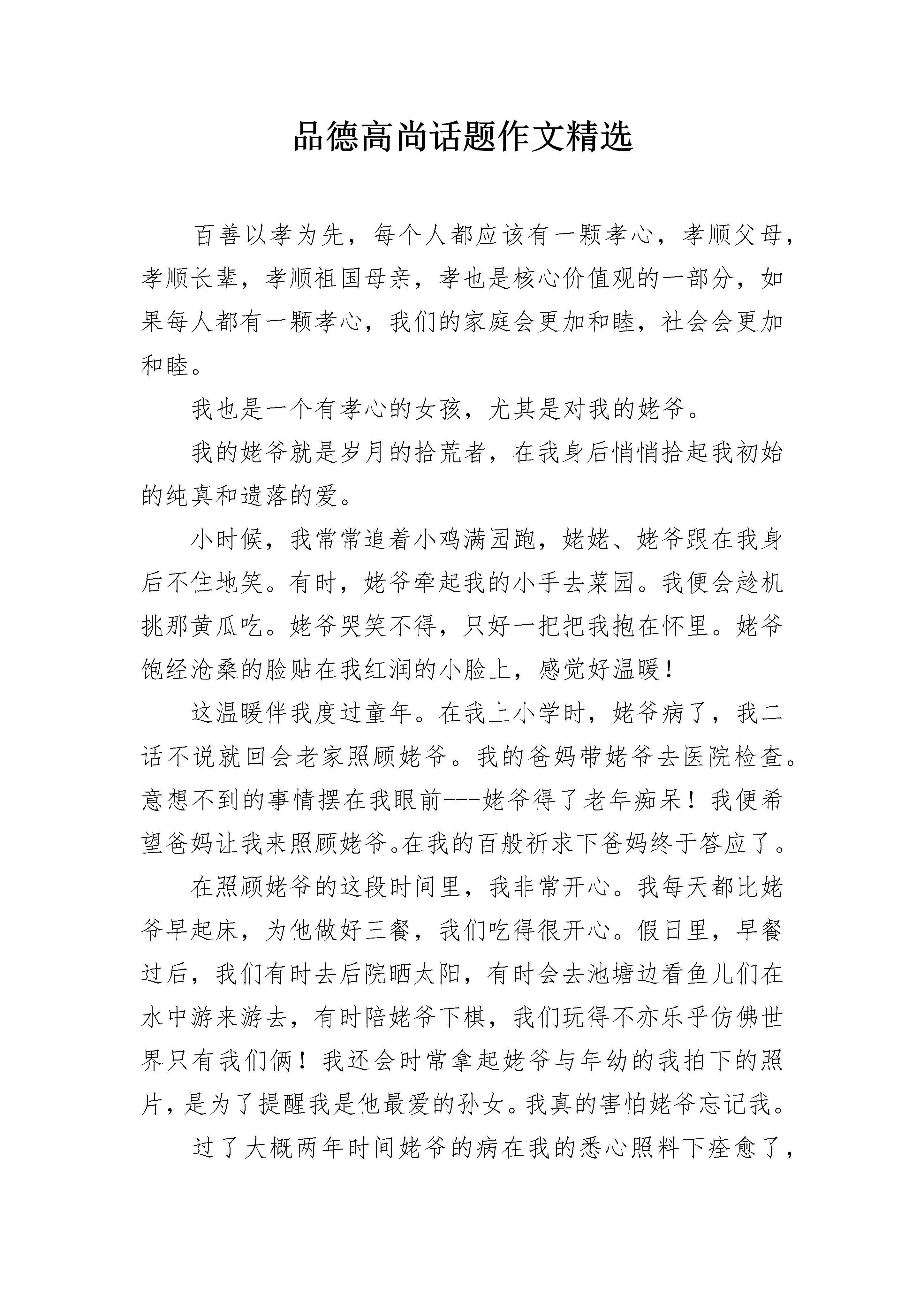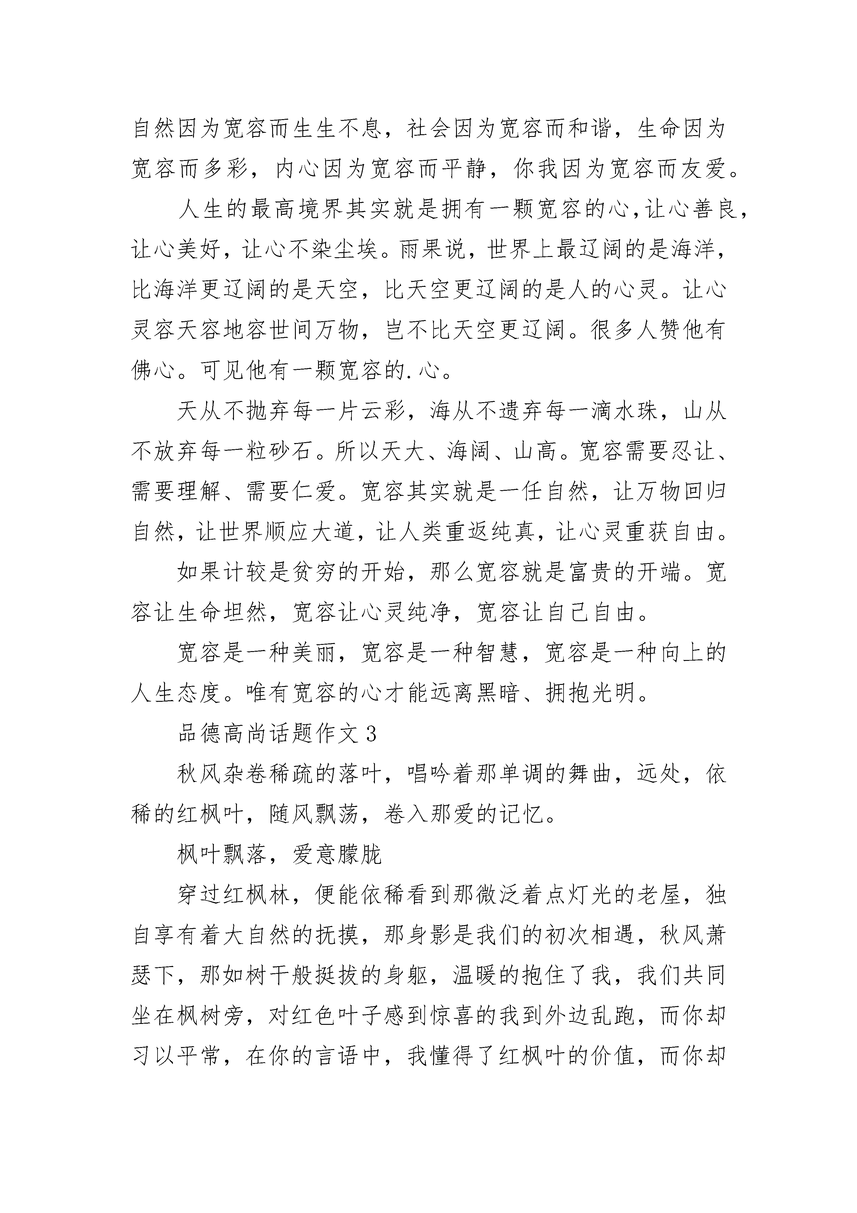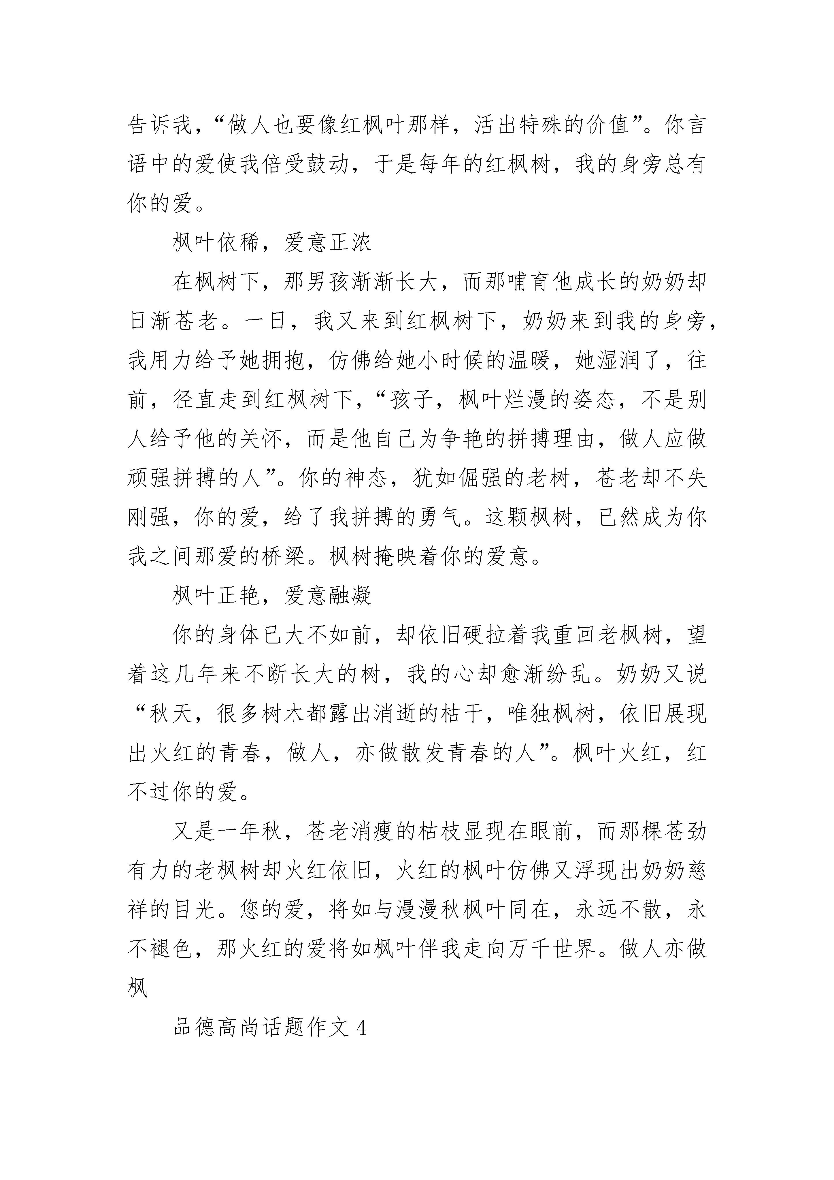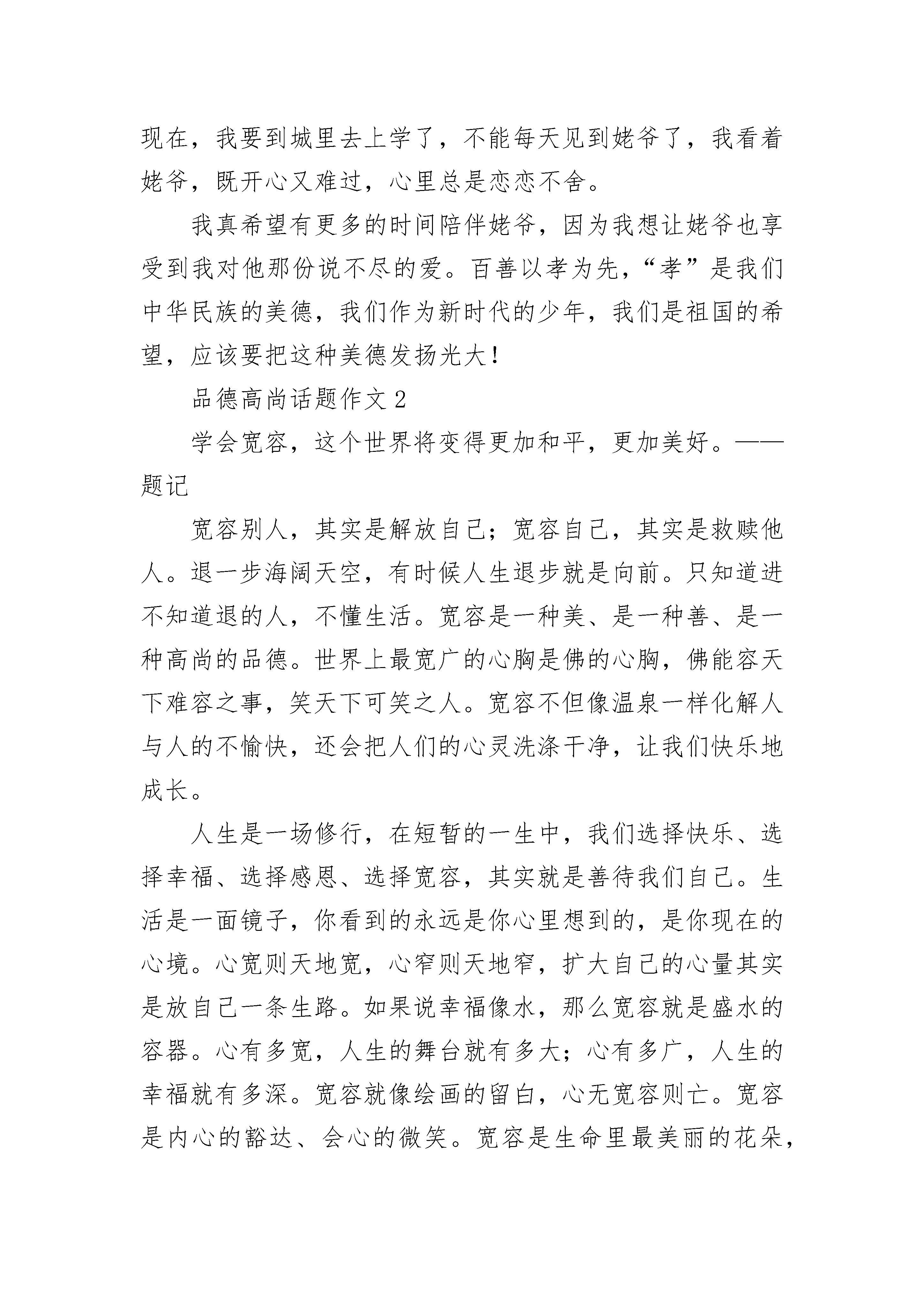 品德高尚话题作文精选百善以孝为先,每个人都应该有一颗孝心,孝顺父母,孝顺长辈,孝顺祖国母亲,孝也是核心价值观的一部分,如果每人都有一颗孝心,我们的家庭会更加和睦,社会会更加和睦。我也是一个有孝心的女孩,尤其是对我的姥爷。我的姥爷就是岁月的拾荒者,在我身后悄悄拾起我初始的纯真和遗落的爱。小时候,我常常追着小鸡满园跑,姥姥、姥爷跟在我身后不住地笑。有时,姥爷牵起我的小手去菜园。我便会趁机挑那黄瓜吃。姥爷哭笑不得,只好一把把我抱在怀里。姥爷饱经沧桑的脸贴在我红润的小脸上,感觉好温暖!这温暖伴我度过童年。在我上小学时,姥爷病了,我二话不说就回会老家照顾姥爷。我的爸妈带姥爷去医院检查。意想不到的事情摆在我眼前---姥爷得了老年痴呆!我便希望爸妈让我来照顾姥爷。在我的百般祈求下爸妈终于答应了。在照顾姥爷的这段时间里,我非常开心。我每天都比姥爷早起床,为他做好三餐,我们吃得很开心。假日里,早餐过后,我们有时去后院晒太阳,有时会去池塘边看鱼儿们在水中游来游去,有时陪姥爷下棋,我们玩得不亦乐乎仿佛世界只有我们俩!我还会时常拿起姥爷与年幼的我拍下的照片,是为了提醒我是他最爱的孙女。我真的害怕姥爷忘记我。过了大概两年时间姥爷的病在我的悉心照料下痊愈了,现在,我要到城里去上学了,不能每天见到姥爷了,我看着姥爷,既开心又难过,心里总是恋恋不舍。我真希望有更多的时间陪伴姥爷,因为我想让姥爷也享受到我对他那份说不尽的爱。百善以孝为先,“孝”是我们中华民族的美德,我们作为新时代的少年,我们是祖国的希望,应该要把这种美德发扬光大!品德高尚话题作文2学会宽容,这个世界将变得更加和平,更加美好。——题记宽容别人,其实是解放自己;宽容自己,其实是救赎他人。退一步海阔天空,有时候人生退步就是向前。只知道进不知道退的人,不懂生活。宽容是一种美、是一种善、是一种高尚的品德。世界上最宽广的心胸是佛的心胸,佛能容天下难容之事,笑天下可笑之人。宽容不但像温泉一样化解人与人的不愉快,还会把人们的心灵洗涤干净,让我们快乐地成长。人生是一场修行,在短暂的一生中,我们选择快乐、选择幸福、选择感恩、选择宽容,其实就是善待我们自己。生活是一面镜子,你看到的永远是你心里想到的,是你现在的心境。心宽则天地宽,心窄则天地窄,扩大自己的心量其实是放自己一条生路。如果说幸福像水,那么宽容就是盛水的容器。心有多宽,人生的舞台就有多大;心有多广,人生的幸福就有多深。宽容就像绘画的留白,心无宽容则亡。宽容是内心的豁达、会心的微笑。宽容是生命里最美丽的花朵,自然因为宽容而生生不息,社会因为宽容而和谐,生命因为宽容而多彩,内心因为宽容而平静,你我因为宽容而友爱。人生的最高境界其实就是拥有一颗宽容的心,让心善良,让心美好,让心不染尘埃。雨果说,世界上最辽阔的是海洋,比海洋更辽阔的是天空,比天空更辽阔的是人的心灵。让心灵容天容地容世间万物,岂不比天空更辽阔。很多人赞他有佛心。可见他有一颗宽容的.心。天从不抛弃每一片云彩,海从不遗弃每一滴水珠,山从不放弃每一粒砂石。所以天大、海阔、山高。宽容需要忍让、需要理解、需要仁爱。宽容其实就是一任自然,让万物回归自然,让世界顺应大道,让人类重返纯真,让心灵重获自由。如果计较是贫穷的开始,那么宽容就是富贵的开端。宽容让生命坦然,宽容让心灵纯净,宽容让自己自由。宽容是一种美丽,宽容是一种智慧,宽容是一种向上的人生态度。唯有宽容的心才能远离黑暗、拥抱光明。品德高尚话题作文3秋风杂卷稀疏的落叶,唱吟着那单调的舞曲,远处,依稀的红枫叶,随风飘荡,卷入那爱的记忆。枫叶飘落,爱意朦胧穿过红枫林,便能依稀看到那微泛着点灯光的老屋,独自享有着大自然的抚摸,那身影是我们的初次相遇,秋风萧瑟下,那如树干般挺拔的身躯,温暖的抱住了我,我们共同坐在枫树旁,对红色叶子感到惊喜的我到外边乱跑,而你却习以平常,在你的言语中,我懂得了红枫叶的价值,而你却告诉我,“做人也要像红枫叶那样,活出特殊的价值”。你言语中的爱使我倍受鼓动,于是每年的红枫树,我的身旁总有你的爱。枫叶依稀,爱意正浓在枫树下,那男孩渐渐长大,而那哺育他成长的奶奶却日渐苍老。一日,我又来到红枫树下,奶奶来到我的身旁,我用力给予她拥抱,仿佛给她小时候的温暖,她湿润了,往前,径直走到红枫树下,“孩子,枫叶烂漫的姿态,不是别人给予他的关怀,而是他自己为争艳的拼搏理由,做人应做顽强拼搏的人”。你的神态,犹如倔强的老树,苍老却不失刚强,你的爱,给了我拼搏的勇气。这颗枫树,已然成为你我之间那爱的桥梁。枫树掩映着你的爱意。枫叶正艳,爱意融凝你的身体已大不如前,却依旧硬拉着我重回老枫树,望着这几年来不断长大的树,我的心却愈渐纷乱。奶奶又说“秋天,很多树木都露出消逝的枯干,唯独枫树,依旧展现出火红的青春,做人,亦做散发青春的人”。枫叶火红,红不过你的爱。又是