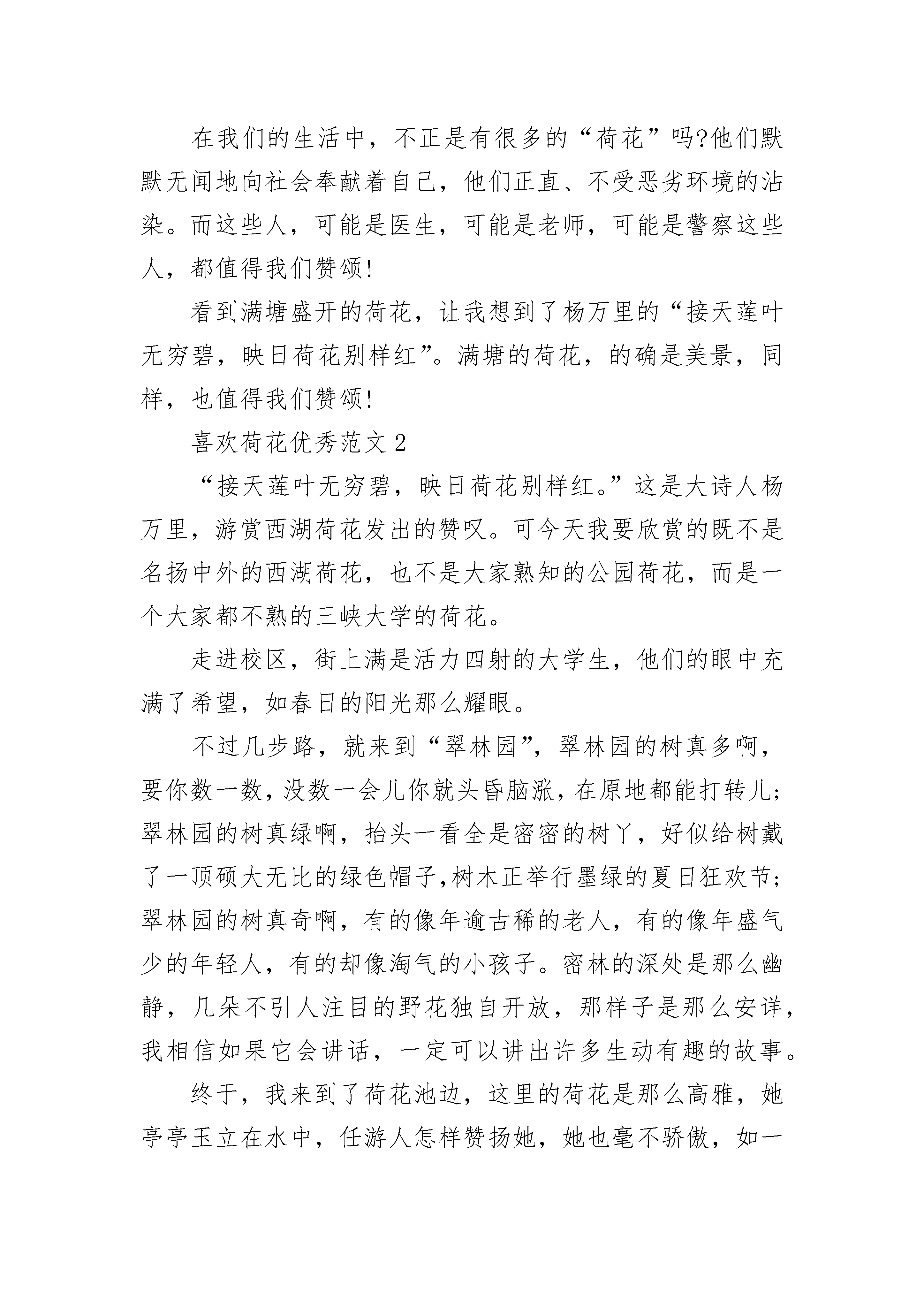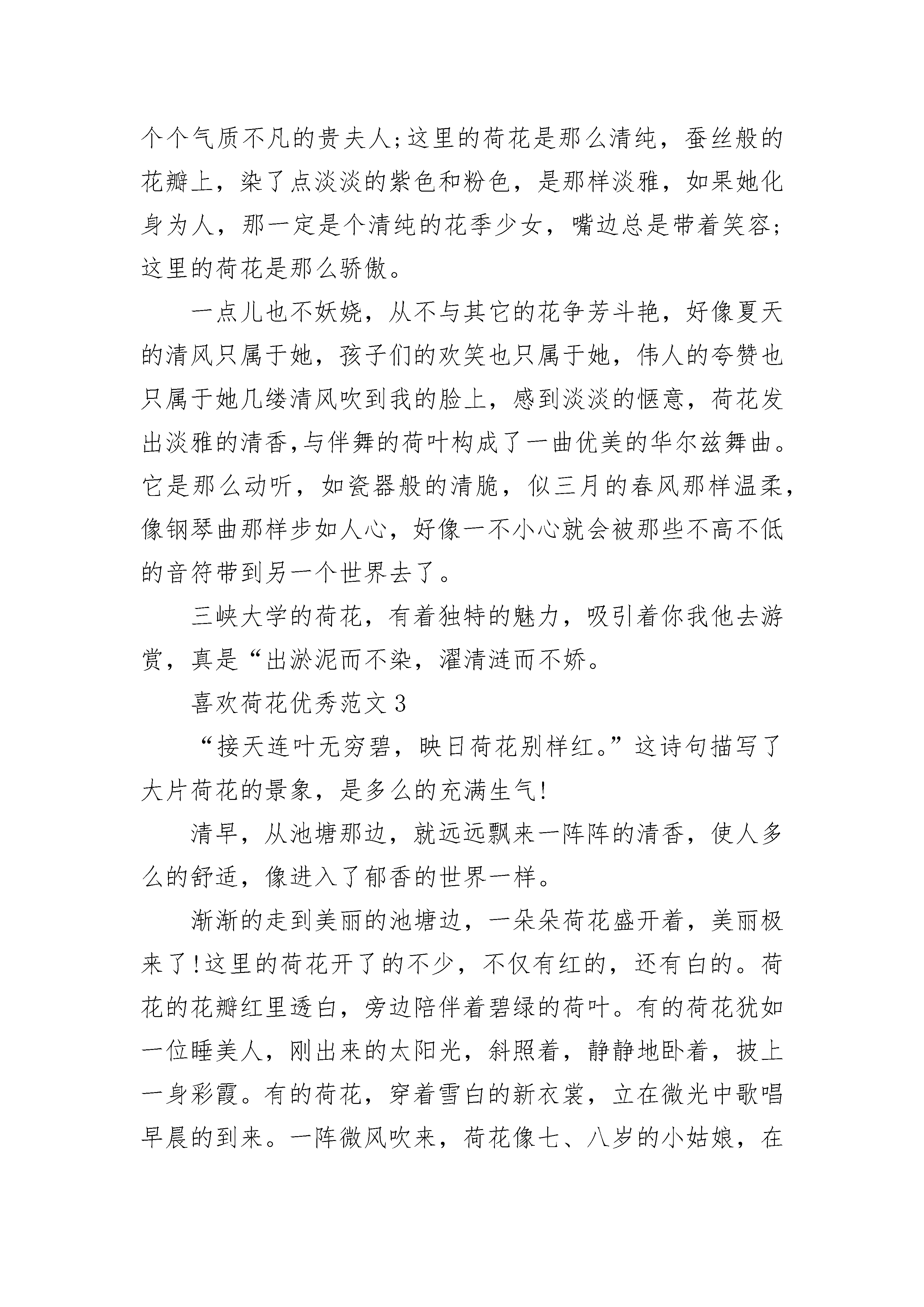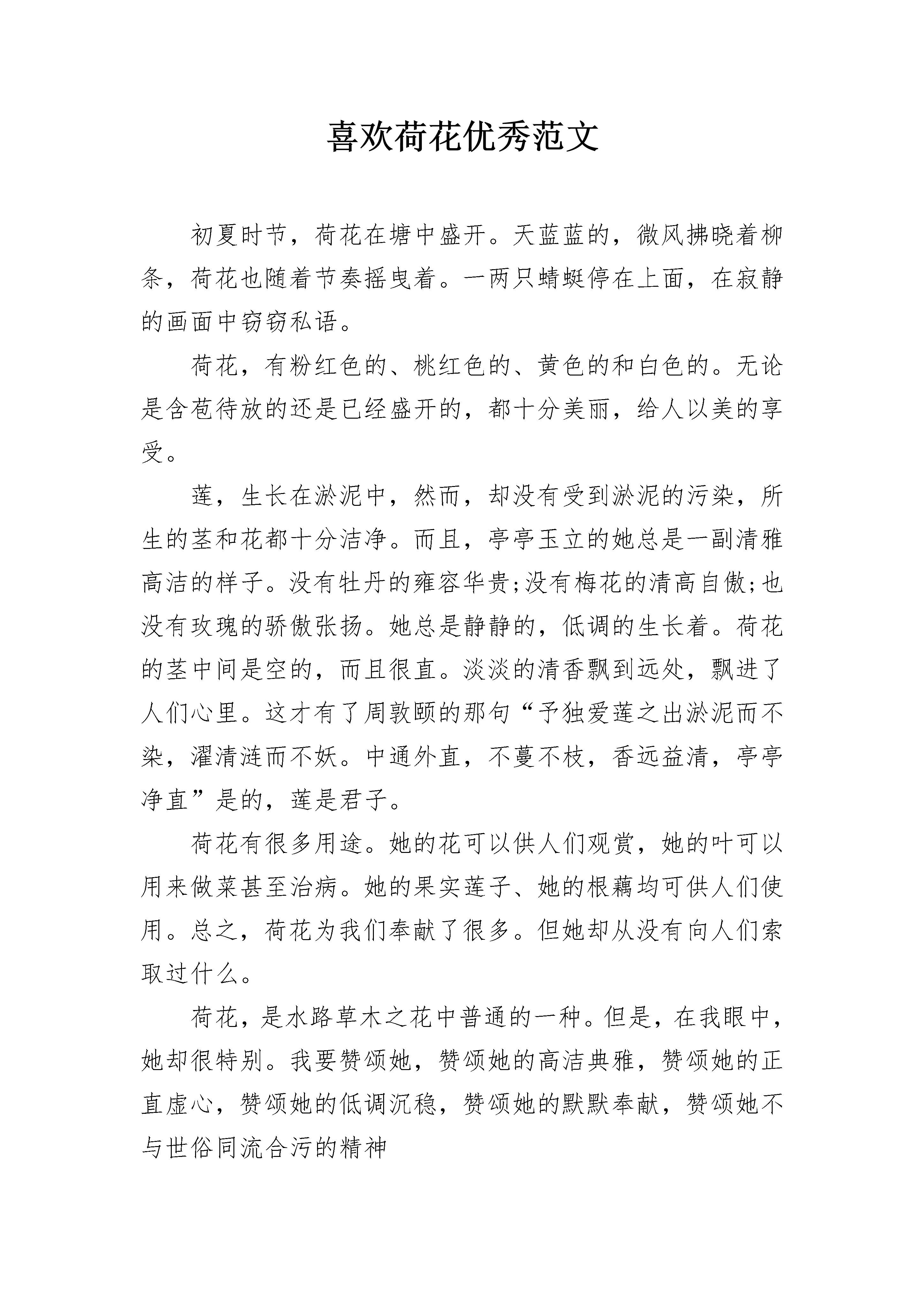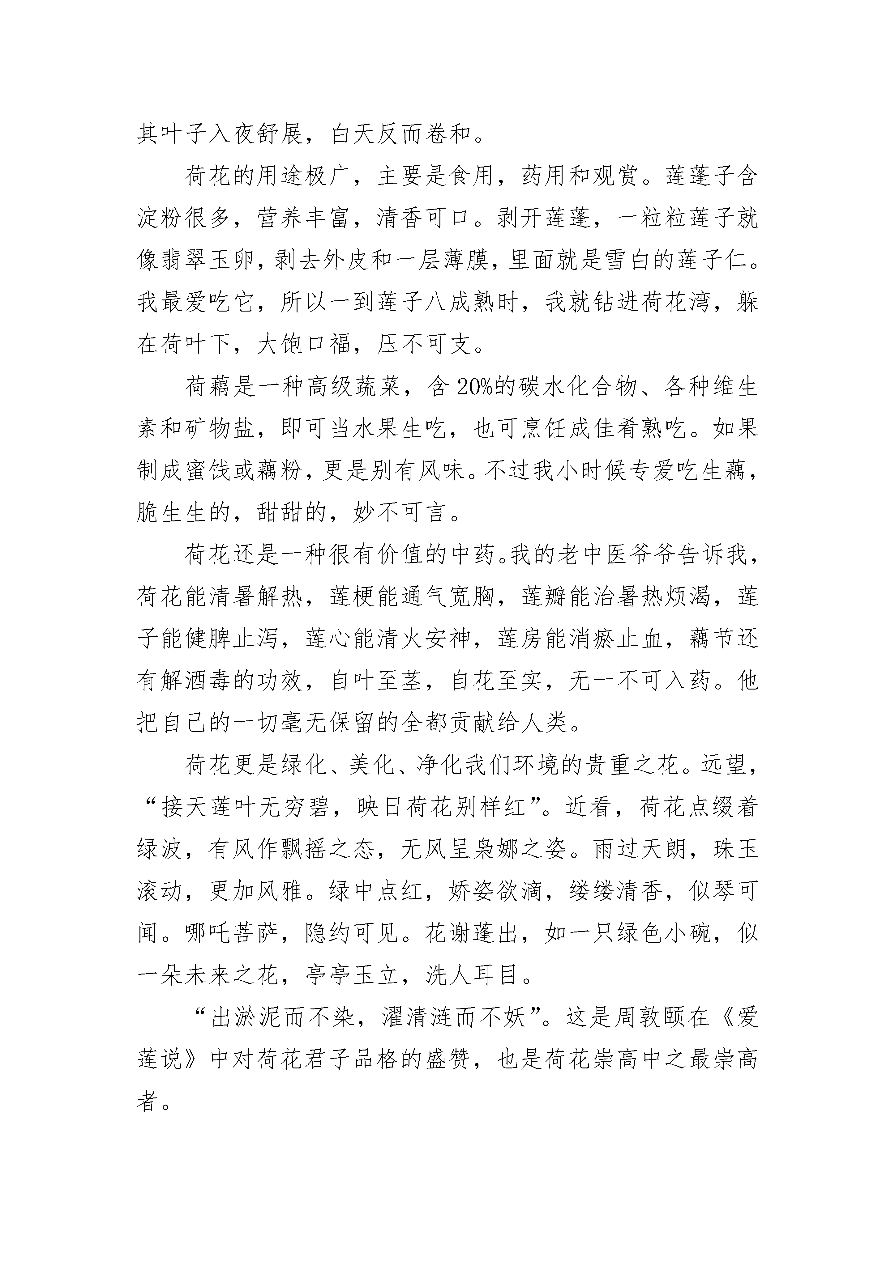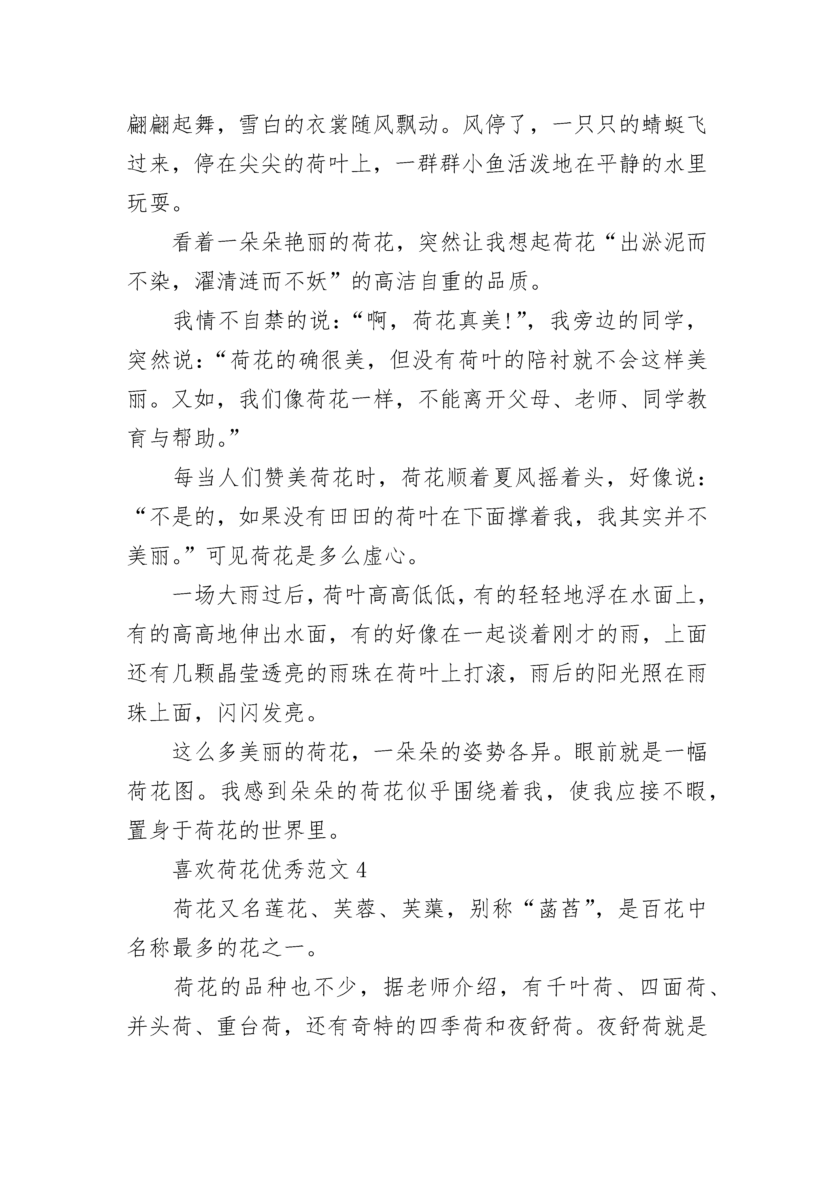 喜欢荷花优秀范文初夏时节,荷花在塘中盛开。天蓝蓝的,微风拂晓着柳条,荷花也随着节奏摇曳着。一两只蜻蜓停在上面,在寂静的画面中窃窃私语。荷花,有粉红色的、桃红色的、黄色的和白色的。无论是含苞待放的还是已经盛开的,都十分美丽,给人以美的享受。莲,生长在淤泥中,然而,却没有受到淤泥的污染,所生的茎和花都十分洁净。而且,亭亭玉立的她总是一副清雅高洁的样子。没有牡丹的雍容华贵;没有梅花的清高自傲;也没有玫瑰的骄傲张扬。她总是静静的,低调的生长着。荷花的茎中间是空的,而且很直。淡淡的清香飘到远处,飘进了人们心里。这才有了周敦颐的那句“予独爱莲之出淤泥而不染,濯清涟而不妖。中通外直,不蔓不枝,香远益清,亭亭净直”是的,莲是君子。荷花有很多用途。她的花可以供人们观赏,她的叶可以用来做菜甚至治病。她的果实莲子、她的根藕均可供人们使用。总之,荷花为我们奉献了很多。但她却从没有向人们索取过什么。荷花,是水路草木之花中普通的一种。但是,在我眼中,她却很特别。我要赞颂她,赞颂她的高洁典雅,赞颂她的正直虚心,赞颂她的低调沉稳,赞颂她的默默奉献,赞颂她不与世俗同流合污的精神在我们的生活中,不正是有很多的“荷花”吗?他们默默无闻地向社会奉献着自己,他们正直、不受恶劣环境的沾染。而这些人,可能是医生,可能是老师,可能是警察这些人,都值得我们赞颂!看到满塘盛开的荷花,让我想到了杨万里的“接天莲叶无穷碧,映日荷花别样红”。满塘的荷花,的确是美景,同样,也值得我们赞颂!喜欢荷花优秀范文2“接天莲叶无穷碧,映日荷花别样红。”这是大诗人杨万里,游赏西湖荷花发出的赞叹。可今天我要欣赏的既不是名扬中外的西湖荷花,也不是大家熟知的公园荷花,而是一个大家都不熟的三峡大学的荷花。走进校区,街上满是活力四射的大学生,他们的眼中充满了希望,如春日的阳光那么耀眼。不过几步路,就来到“翠林园”,翠林园的树真多啊,要你数一数,没数一会儿你就头昏脑涨,在原地都能打转儿;翠林园的树真绿啊,抬头一看全是密密的树丫,好似给树戴了一顶硕大无比的绿色帽子,树木正举行墨绿的夏日狂欢节;翠林园的树真奇啊,有的像年逾古稀的老人,有的像年盛气少的年轻人,有的却像淘气的小孩子。密林的深处是那么幽静,几朵不引人注目的野花独自开放,那样子是那么安详,我相信如果它会讲话,一定可以讲出许多生动有趣的故事。终于,我来到了荷花池边,这里的荷花是那么高雅,她亭亭玉立在水中,任游人怎样赞扬她,她也毫不骄傲,如一个个气质不凡的贵夫人;这里的荷花是那么清纯,蚕丝般的花瓣上,染了点淡淡的紫色和粉色,是那样淡雅,如果她化身为人,那一定是个清纯的花季少女,嘴边总是带着笑容;这里的荷花是那么骄傲。一点儿也不妖娆,从不与其它的花争芳斗艳,好像夏天的清风只属于她,孩子们的欢笑也只属于她,伟人的夸赞也只属于她几缕清风吹到我的脸上,感到淡淡的惬意,荷花发出淡雅的清香,与伴舞的荷叶构成了一曲优美的华尔兹舞曲。它是那么动听,如瓷器般的清脆,似三月的春风那样温柔,像钢琴曲那样步如人心,好像一不小心就会被那些不高不低的音符带到另一个世界去了。三峡大学的荷花,有着独特的魅力,吸引着你我他去游赏,真是“出淤泥而不染,濯清涟而不娇。喜欢荷花优秀范文3“接天连叶无穷碧,映日荷花别样红。”这诗句描写了大片荷花的景象,是多么的充满生气!清早,从池塘那边,就远远飘来一阵阵的清香,使人多么的舒适,像进入了郁香的世界一样。渐渐的走到美丽的池塘边,一朵朵荷花盛开着,美丽极来了!这里的荷花开了的不少,不仅有红的,还有白的。荷花的花瓣红里透白,旁边陪伴着碧绿的荷叶。有的荷花犹如一位睡美人,刚出来的太阳光,斜照着,静静地卧着,披上一身彩霞。有的荷花,穿着雪白的新衣裳,立在微光中歌唱早晨的到来。一阵微风吹来,荷花像七、八岁的小姑娘,在翩翩起舞,雪白的衣裳随风飘动。风停了,一只只的蜻蜓飞过来,停在尖尖的荷叶上,一群群小鱼活泼地在平静的水里玩耍。看着一朵朵艳丽的荷花,突然让我想起荷花“出淤泥而不染,濯清涟而不妖”的高洁自重的品质。我情不自禁的说:“啊,荷花真美!”,我旁边的同学,突然说:“荷花的确很美,但没有荷叶的陪衬就不会这样美丽。又如,我们像荷花一样,不能离开父母、老师、同学教育与帮助。”每当人们赞美荷花时,荷花顺着夏风摇着头,好像说:“不是的,如果没有田田的荷叶在下面撑着我,我其实并不美丽。”可见荷花是多么虚心。一场大雨过后,荷叶高高低低,有的轻轻地浮在水面上,有的高高地伸出水面,有的好像在一起谈着刚才的雨,上面还有几颗晶莹透亮的雨珠在荷叶上打滚,雨后的阳光照在雨珠上面,闪闪发亮。这么多美丽的荷花,一朵朵的姿势各异。眼前就是一幅荷花图。我感到朵朵的荷花似乎围绕着我,使我应接不暇,置身于荷花的世界里。喜欢荷花优秀范文4荷花又名莲花、芙蓉、芙蕖,别称“菡萏”,是百花中名称最多的花