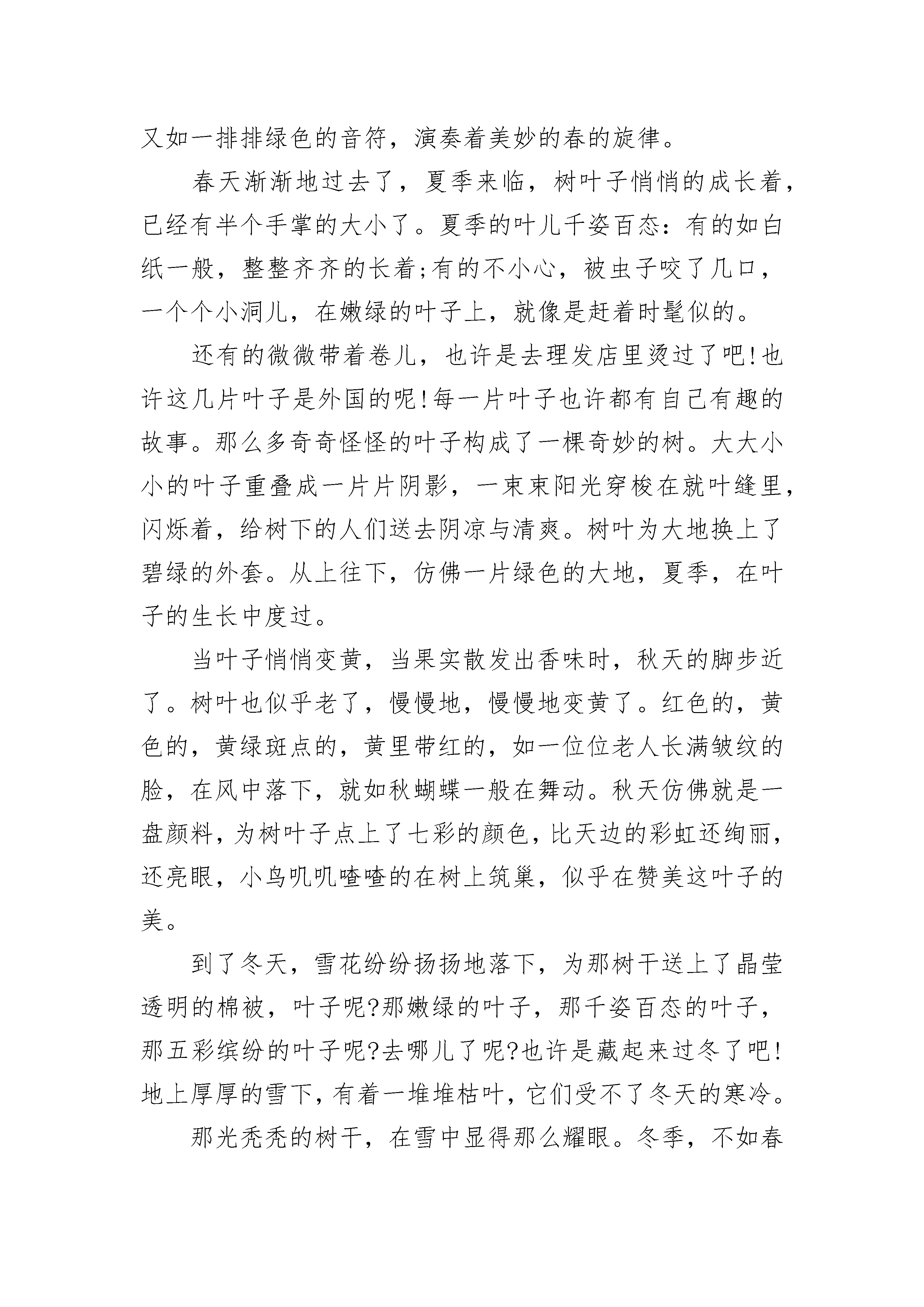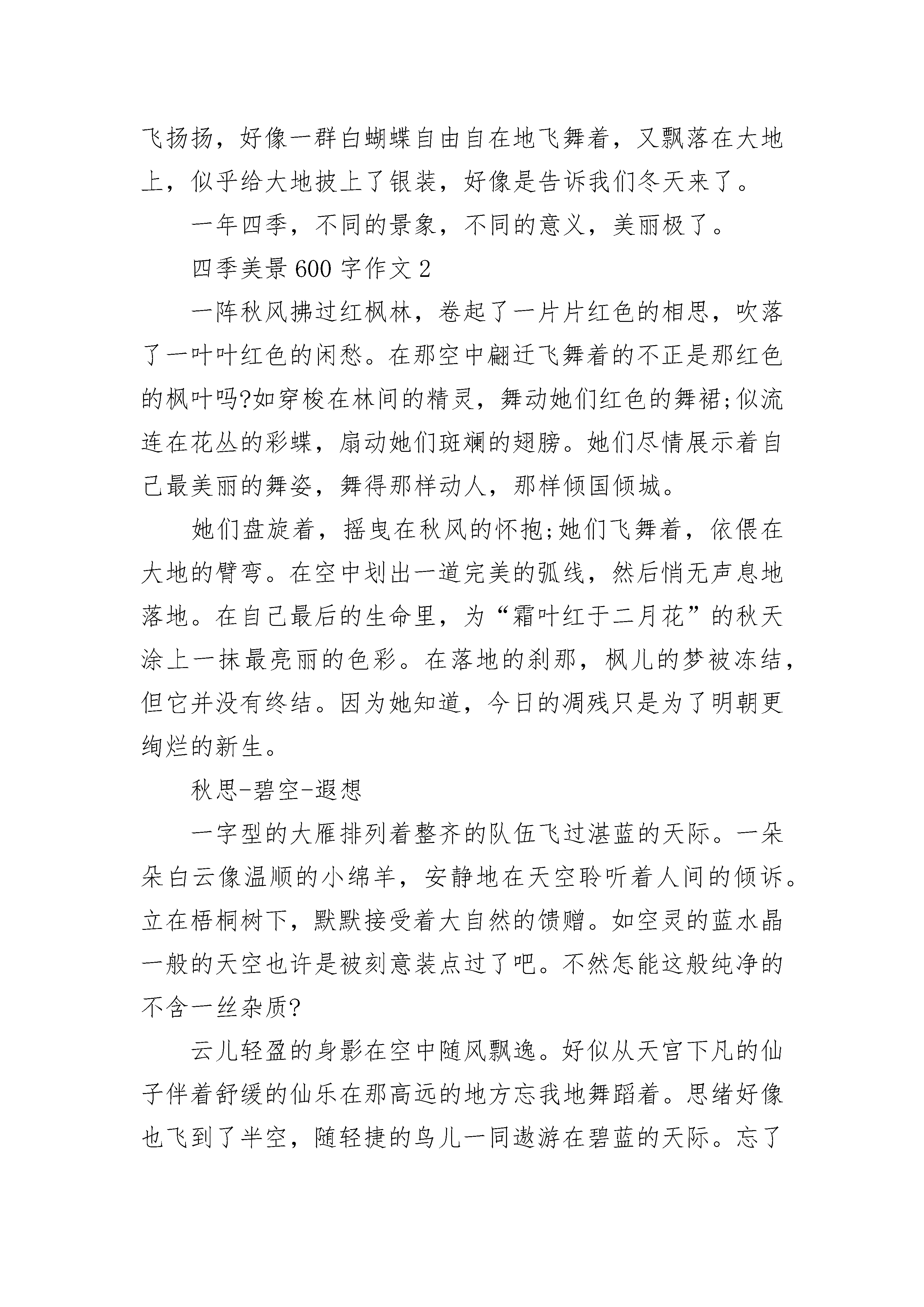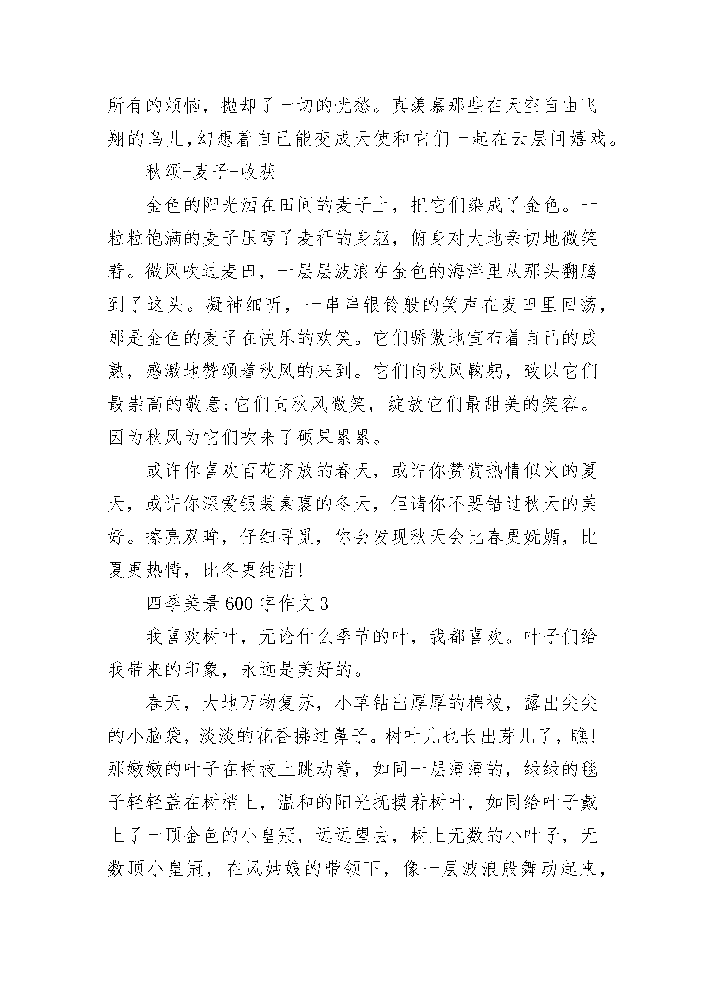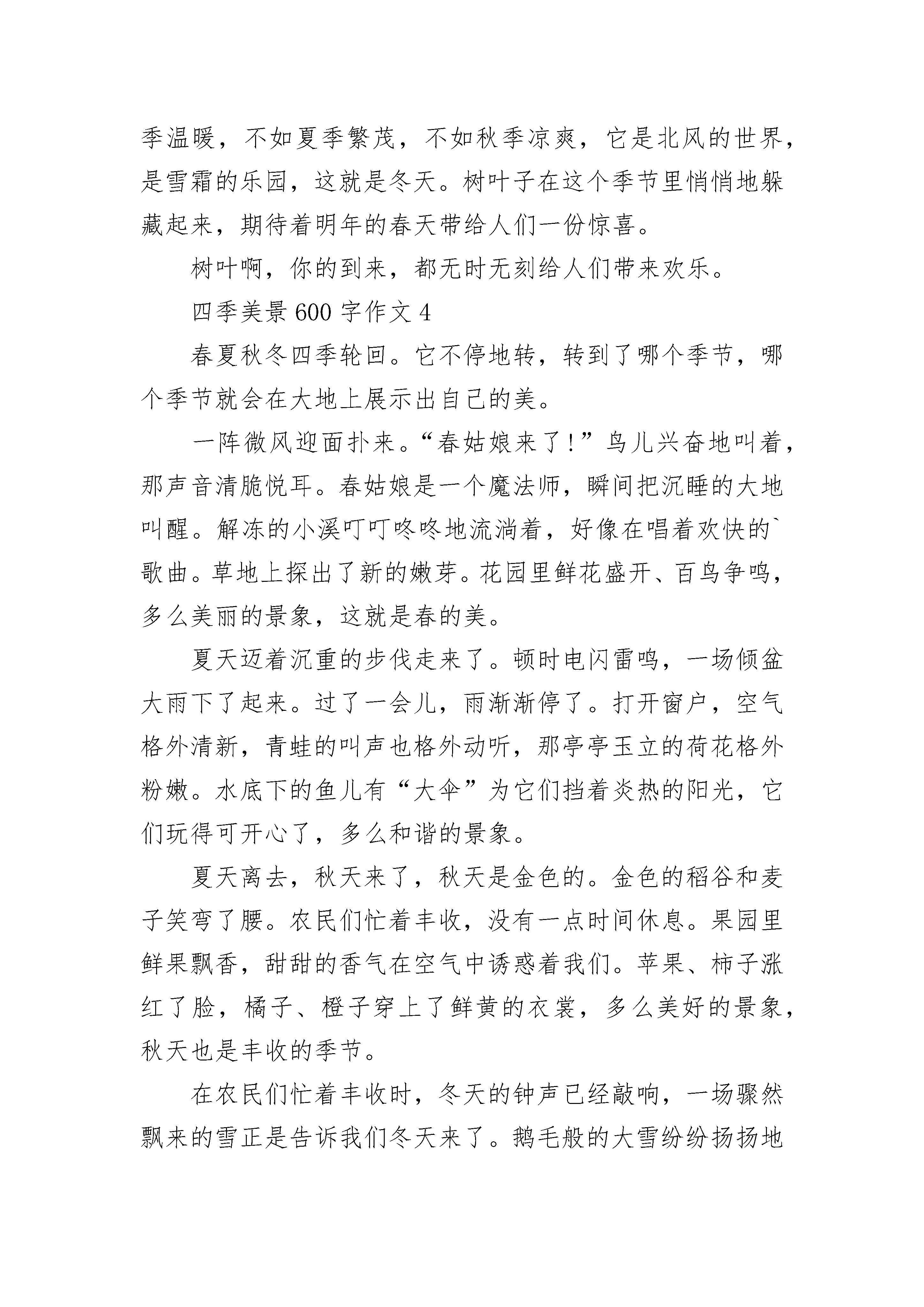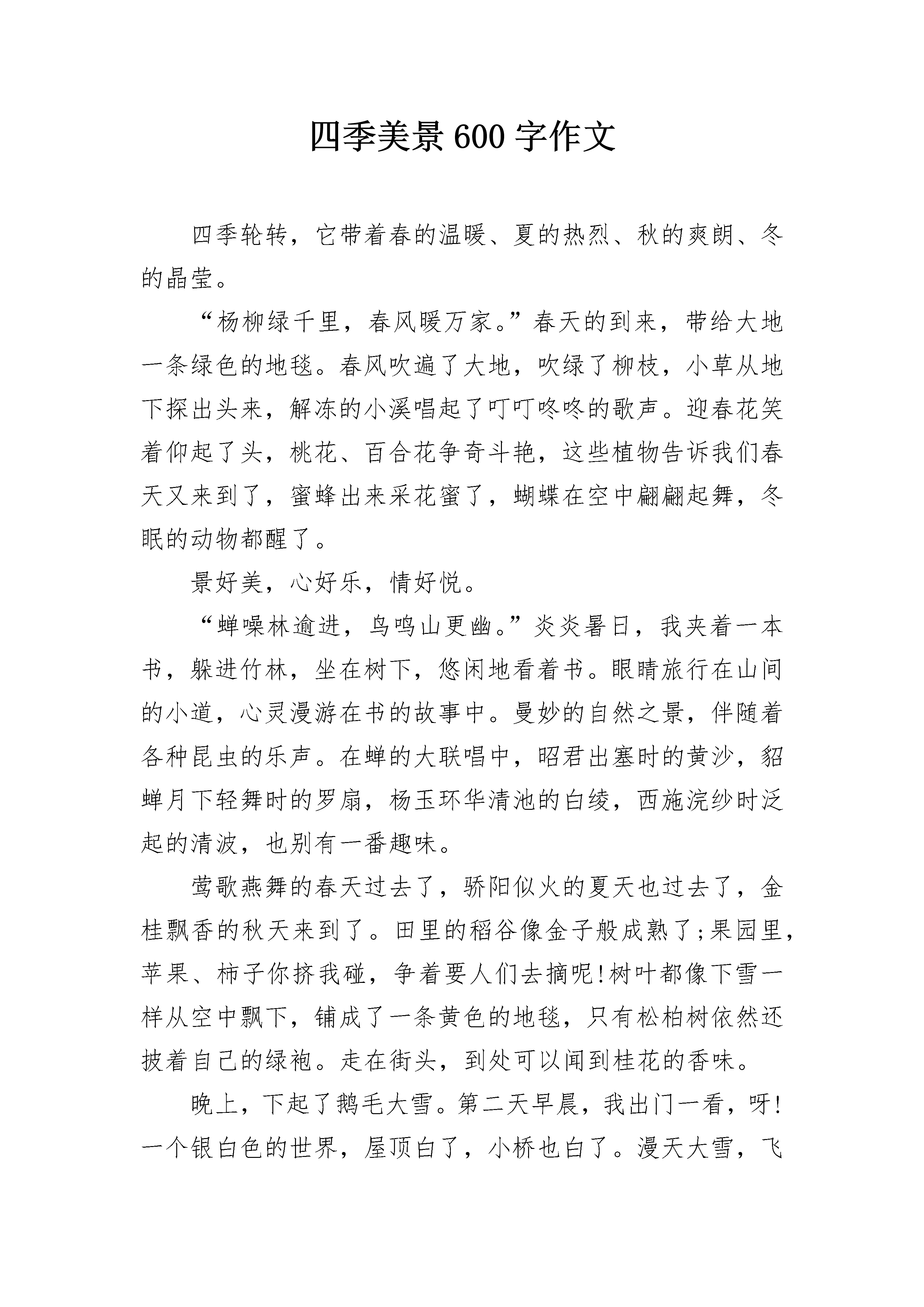 四季美景600字作文四季轮转,它带着春的温暖、夏的热烈、秋的爽朗、冬的晶莹。“杨柳绿千里,春风暖万家。”春天的到来,带给大地一条绿色的地毯。春风吹遍了大地,吹绿了柳枝,小草从地下探出头来,解冻的小溪唱起了叮叮咚咚的歌声。迎春花笑着仰起了头,桃花、百合花争奇斗艳,这些植物告诉我们春天又来到了,蜜蜂出来采花蜜了,蝴蝶在空中翩翩起舞,冬眠的动物都醒了。景好美,心好乐,情好悦。“蝉噪林逾进,鸟鸣山更幽。”炎炎暑日,我夹着一本书,躲进竹林,坐在树下,悠闲地看着书。眼睛旅行在山间的小道,心灵漫游在书的故事中。曼妙的自然之景,伴随着各种昆虫的乐声。在蝉的大联唱中,昭君出塞时的黄沙,貂蝉月下轻舞时的罗扇,杨玉环华清池的白绫,西施浣纱时泛起的清波,也别有一番趣味。莺歌燕舞的春天过去了,骄阳似火的夏天也过去了,金桂飘香的秋天来到了。田里的稻谷像金子般成熟了;果园里,苹果、柿子你挤我碰,争着要人们去摘呢!树叶都像下雪一样从空中飘下,铺成了一条黄色的地毯,只有松柏树依然还披着自己的绿袍。走在街头,到处可以闻到桂花的香味。晚上,下起了鹅毛大雪。第二天早晨,我出门一看,呀!一个银白色的世界,屋顶白了,小桥也白了。漫天大雪,飞飞扬扬,好像一群白蝴蝶自由自在地飞舞着,又飘落在大地上,似乎给大地披上了银装,好像是告诉我们冬天来了。一年四季,不同的景象,不同的意义,美丽极了。四季美景600字作文2一阵秋风拂过红枫林,卷起了一片片红色的相思,吹落了一叶叶红色的闲愁。在那空中翩迁飞舞着的不正是那红色的枫叶吗?如穿梭在林间的精灵,舞动她们红色的舞裙;似流连在花丛的彩蝶,扇动她们斑斓的翅膀。她们尽情展示着自己最美丽的舞姿,舞得那样动人,那样倾国倾城。她们盘旋着,摇曳在秋风的怀抱;她们飞舞着,依偎在大地的臂弯。在空中划出一道完美的弧线,然后悄无声息地落地。在自己最后的生命里,为“霜叶红于二月花”的秋天涂上一抹最亮丽的色彩。在落地的刹那,枫儿的梦被冻结,但它并没有终结。因为她知道,今日的凋残只是为了明朝更绚烂的新生。秋思-碧空-遐想一字型的大雁排列着整齐的队伍飞过湛蓝的天际。一朵朵白云像温顺的小绵羊,安静地在天空聆听着人间的倾诉。立在梧桐树下,默默接受着大自然的馈赠。如空灵的蓝水晶一般的天空也许是被刻意装点过了吧。不然怎能这般纯净的不含一丝杂质?云儿轻盈的身影在空中随风飘逸。好似从天宫下凡的仙子伴着舒缓的仙乐在那高远的地方忘我地舞蹈着。思绪好像也飞到了半空,随轻捷的鸟儿一同遨游在碧蓝的天际。忘了所有的烦恼,抛却了一切的忧愁。真羡慕那些在天空自由飞翔的鸟儿,幻想着自己能变成天使和它们一起在云层间嬉戏。秋颂-麦子-收获金色的阳光洒在田间的麦子上,把它们染成了金色。一粒粒饱满的麦子压弯了麦秆的身躯,俯身对大地亲切地微笑着。微风吹过麦田,一层层波浪在金色的海洋里从那头翻腾到了这头。凝神细听,一串串银铃般的笑声在麦田里回荡,那是金色的麦子在快乐的欢笑。它们骄傲地宣布着自己的成熟,感激地赞颂着秋风的来到。它们向秋风鞠躬,致以它们最崇高的敬意;它们向秋风微笑,绽放它们最甜美的笑容。因为秋风为它们吹来了硕果累累。或许你喜欢百花齐放的春天,或许你赞赏热情似火的夏天,或许你深爱银装素裹的冬天,但请你不要错过秋天的美好。擦亮双眸,仔细寻觅,你会发现秋天会比春更妩媚,比夏更热情,比冬更纯洁!四季美景600字作文3我喜欢树叶,无论什么季节的叶,我都喜欢。叶子们给我带来的印象,永远是美好的。春天,大地万物复苏,小草钻出厚厚的棉被,露出尖尖的小脑袋,淡淡的花香拂过鼻子。树叶儿也长出芽儿了,瞧!那嫩嫩的叶子在树枝上跳动着,如同一层薄薄的,绿绿的毯子轻轻盖在树梢上,温和的阳光抚摸着树叶,如同给叶子戴上了一顶金色的小皇冠,远远望去,树上无数的小叶子,无数顶小皇冠,在风姑娘的带领下,像一层波浪般舞动起来,又如一排排绿色的音符,演奏着美妙的春的旋律。春天渐渐地过去了,夏季来临,树叶子悄悄的成长着,已经有半个手掌的大小了。夏季的叶儿千姿百态:有的如白纸一般,整整齐齐的长着;有的不小心,被虫子咬了几口,一个个小洞儿,在嫩绿的叶子上,就像是赶着时髦似的。还有的微微带着卷儿,也许是去理发店里烫过了吧!也许这几片叶子是外国的呢!每一片叶子也许都有自己有趣的故事。那么多奇奇怪怪的叶子构成了一棵奇妙的树。大大小小的叶子重叠成一片片阴影,一束束阳光穿梭在就叶缝里,闪烁着,给树下的人们送去阴凉与清爽。树叶为大地换上了碧绿的外套。从上往下,仿佛一片绿色的大地,夏季,在叶子的生长中度过。当叶子悄悄变黄,当果实散发出香味时,秋天的脚步近了。树叶也似乎老了,慢慢地,慢慢地变黄了。红色的,黄色的,黄绿斑点的,黄里带红的,如一位位老人长满皱纹的脸,在风中落下,就如秋蝴蝶一般在舞动。秋天仿佛就是一盘颜料,为树叶子点上了七彩的颜色,比天边的彩