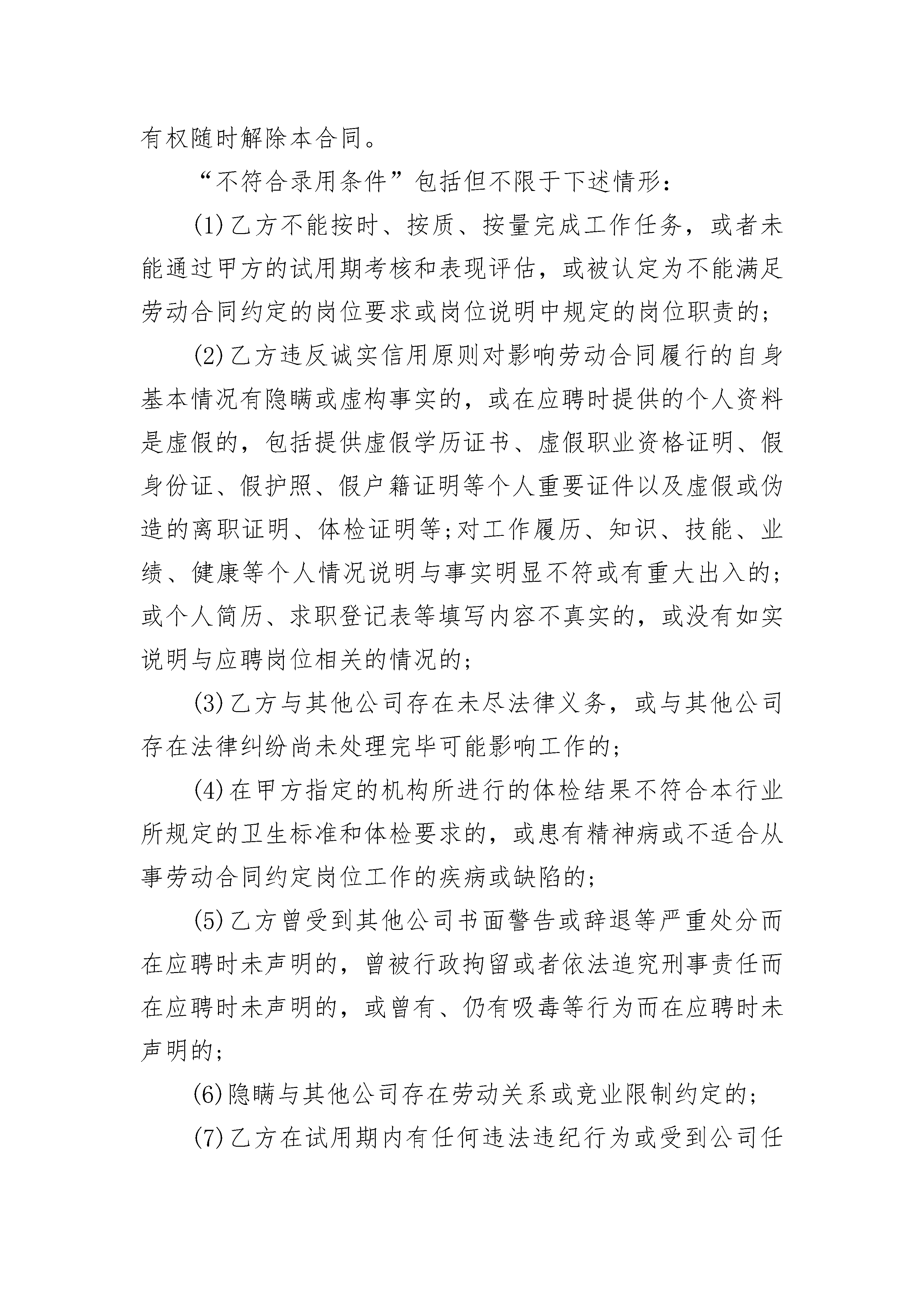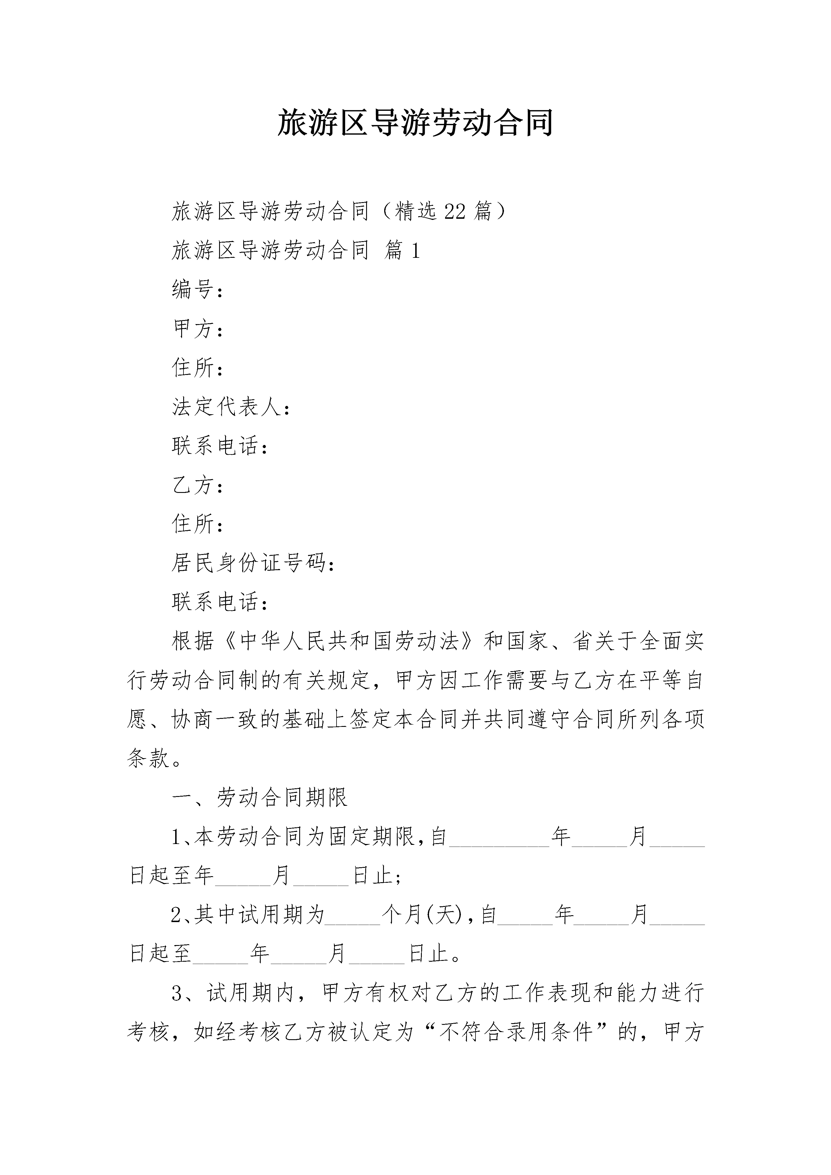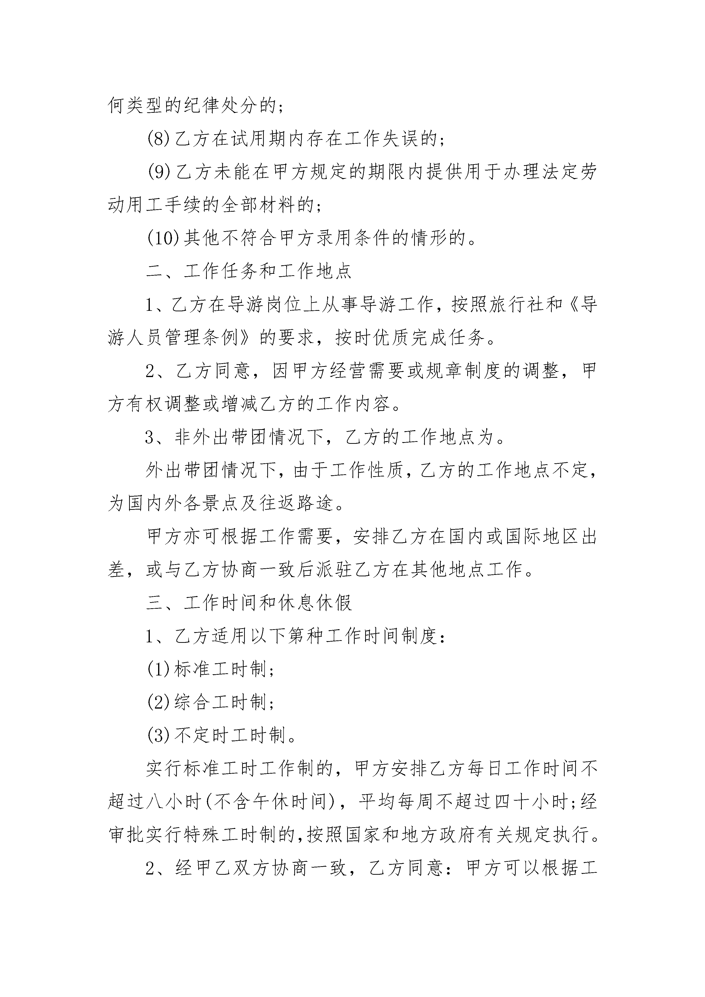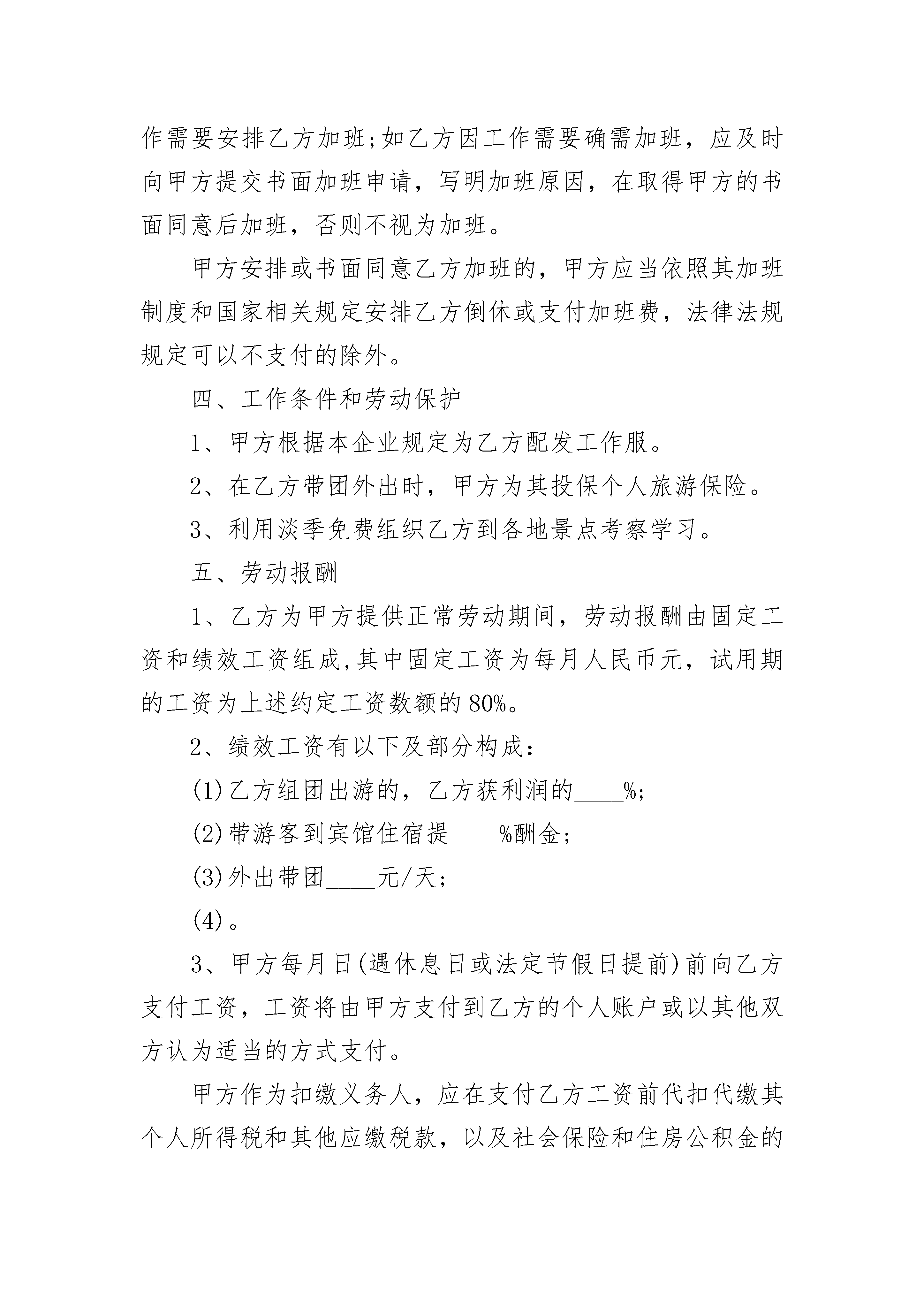 旅游区导游劳动合同旅游区导游劳动合同(精选22篇)旅游区导游劳动合同篇1编号:甲方:住所:法定代表人:联系电话:乙方:住所:居民身份证号码:联系电话:根据《中华人民共和国劳动法》和国家、省关于全面实行劳动合同制的有关规定,甲方因工作需要与乙方在平等自愿、协商一致的基础上签定本合同并共同遵守合同所列各项条款。一、劳动合同期限1、本劳动合同为固定期限,自_________年_____月_____日起至年_____月_____日止;2、其中试用期为_____个月(天),自_____年_____月_____日起至_____年_____月_____日止。3、试用期内,甲方有权对乙方的工作表现和能力进行考核,如经考核乙方被认定为“不符合录用条件”的,甲方有权随时解除本合同。“不符合录用条件”包括但不限于下述情形:(1)乙方不能按时、按质、按量完成工作任务,或者未能通过甲方的试用期考核和表现评估,或被认定为不能满足劳动合同约定的岗位要求或岗位说明中规定的岗位职责的;(2)乙方违反诚实信用原则对影响劳动合同履行的自身基本情况有隐瞒或虚构事实的,或在应聘时提供的个人资料是虚假的,包括提供虚假学历证书、虚假职业资格证明、假身份证、假护照、假户籍证明等个人重要证件以及虚假或伪造的离职证明、体检证明等;对工作履历、知识、技能、业绩、健康等个人情况说明与事实明显不符或有重大出入的;或个人简历、求职登记表等填写内容不真实的,或没有如实说明与应聘岗位相关的情况的;(3)乙方与其他公司存在未尽法律义务,或与其他公司存在法律纠纷尚未处理完毕可能影响工作的;(4)在甲方指定的机构所进行的体检结果不符合本行业所规定的卫生标准和体检要求的,或患有精神病或不适合从事劳动合同约定岗位工作的疾病或缺陷的;(5)乙方曾受到其他公司书面警告或辞退等严重处分而在应聘时未声明的,曾被行政拘留或者依法追究刑事责任而在应聘时未声明的,或曾有、仍有吸毒等行为而在应聘时未声明的;(6)隐瞒与其他公司存在劳动关系或竞业限制约定的;(7)乙方在试用期内有任何违法违纪行为或受到公司任何类型的纪律处分的;(8)乙方在试用期内存在工作失误的;(9)乙方未能在甲方规定的期限内提供用于办理法定劳动用工手续的全部材料的;(10)其他不符合甲方录用条件的情形的。二、工作任务和工作地点1、乙方在导游岗位上从事导游工作,按照旅行社和《导游人员管理条例》的要求,按时优质完成任务。2、乙方同意,因甲方经营需要或规章制度的调整,甲方有权调整或增减乙方的工作内容。3、非外出带团情况下,乙方的工作地点为。外出带团情况下,由于工作性质,乙方的工作地点不定,为国内外各景点及往返路途。甲方亦可根据工作需要,安排乙方在国内或国际地区出差,或与乙方协商一致后派驻乙方在其他地点工作。三、工作时间和休息休假1、乙方适用以下第种工作时间制度:(1)标准工时制;(2)综合工时制;(3)不定时工时制。实行标准工时工作制的,甲方安排乙方每日工作时间不超过八小时(不含午休时间),平均每周不超过四十小时;经审批实行特殊工时制的,按照国家和地方政府有关规定执行。2、经甲乙双方协商一致,乙方同意:甲方可以根据工作需要安排乙方加班;如乙方因工作需要确需加班,应及时向甲方提交书面加班申请,写明加班原因,在取得甲方的书面同意后加班,否则不视为加班。甲方安排或书面同意乙方加班的,甲方应当依照其加班制度和国家相关规定安排乙方倒休或支付加班费,法律法规规定可以不支付的除外。四、工作条件和劳动保护1、甲方根据本企业规定为乙方配发工作服。2、在乙方带团外出时,甲方为其投保个人旅游保险。3、利用淡季免费组织乙方到各地景点考察学习。五、劳动报酬1、乙方为甲方提供正常劳动期间,劳动报酬由固定工资和绩效工资组成,其中固定工资为每月人民币元,试用期的工资为上述约定工资数额的80%。2、绩效工资有以下及部分构成:(1)乙方组团出游的,乙方获利润的____%;(2)带游客到宾馆住宿提____%酬金;(3)外出带团____元/天;(4)。3、甲方每月日(遇休息日或法定节假日提前)前向乙方支付工资,工资将由甲方支付到乙方的个人账户或以其他双方认为适当的方式支付。甲方作为扣缴义务人,应在支付乙方工资前代扣代缴其个人所得税和其他应缴税款,以及社会保险和住房公积金的个人应缴部分。六、承诺与保证乙方在此向甲方作出承诺并保证如下:1、乙方在录用过程中向甲方提供的与本合同直接相关的基本情况与信息真实有效,在本合同中的陈述及保证亦是真实、准确和完整的。如有违反,将视为严重违反甲方规章制度,甲方有权立即解除本合同;2、本合同存续期内,乙方将根据本合同所定条款和条件为甲方工作并尽其最大努力确保完成甲方委派的工作,不从事损害甲方利益的活动,不利用其在甲方的职务或职权直接或间接地为个人牟取私利;3、