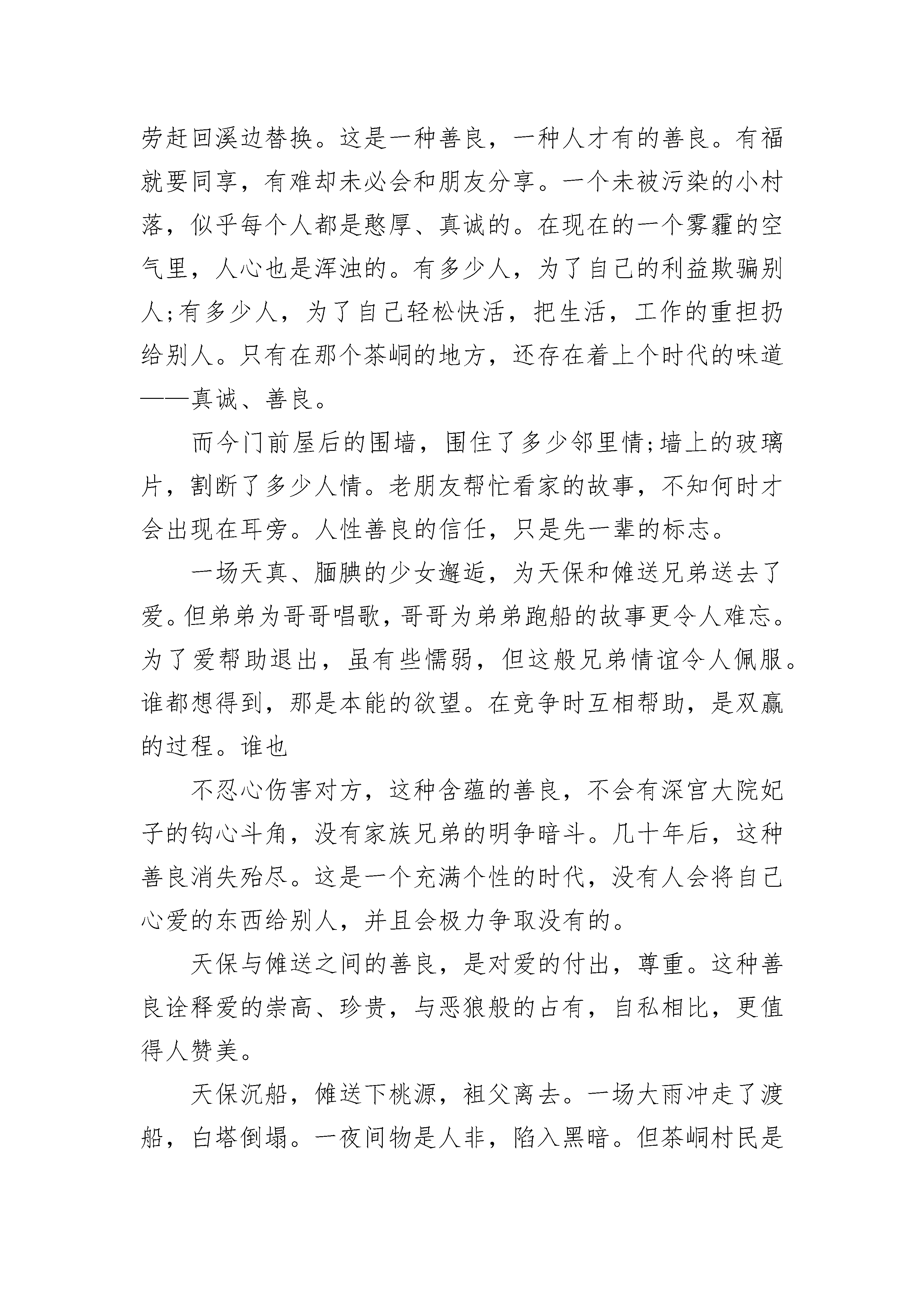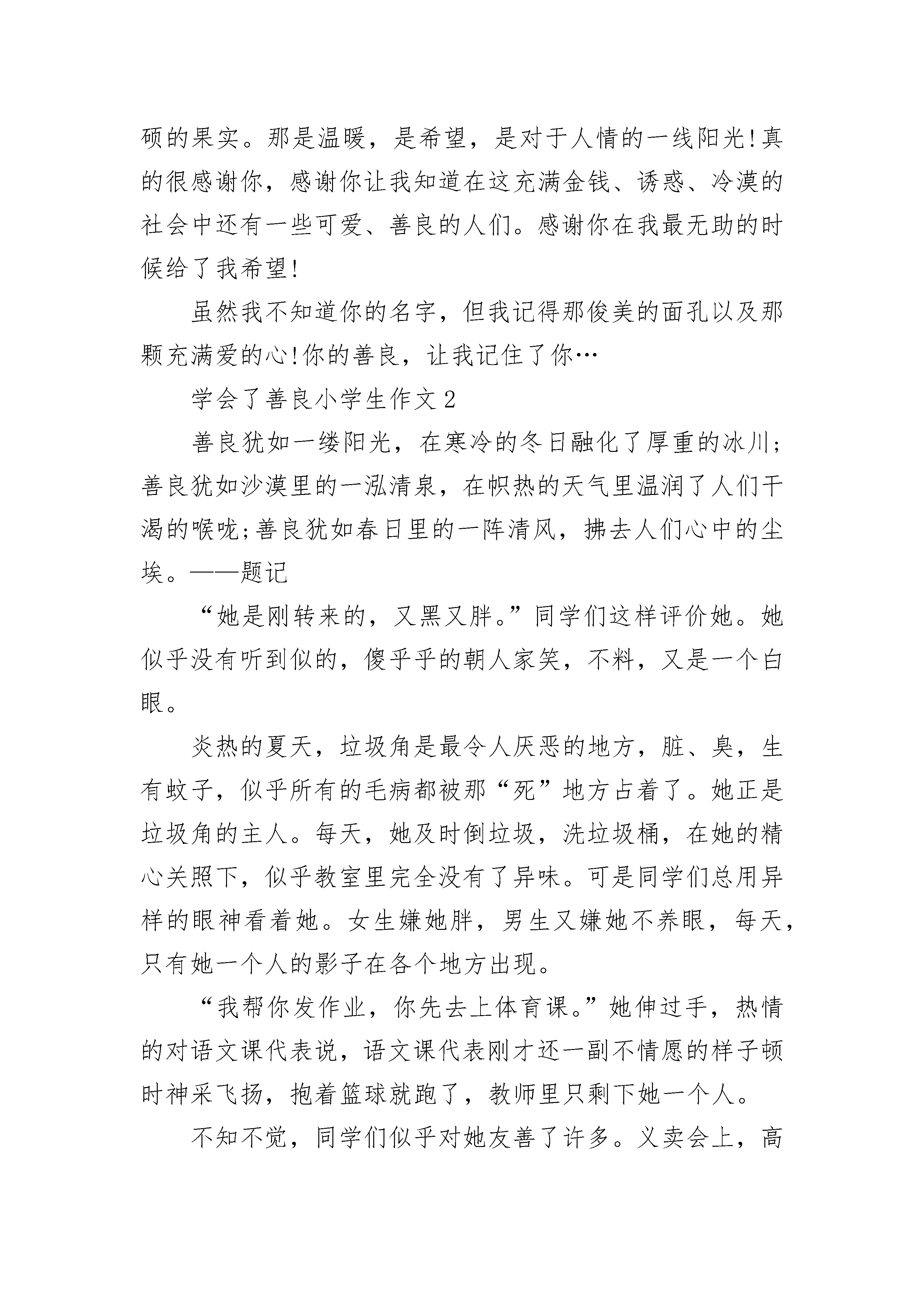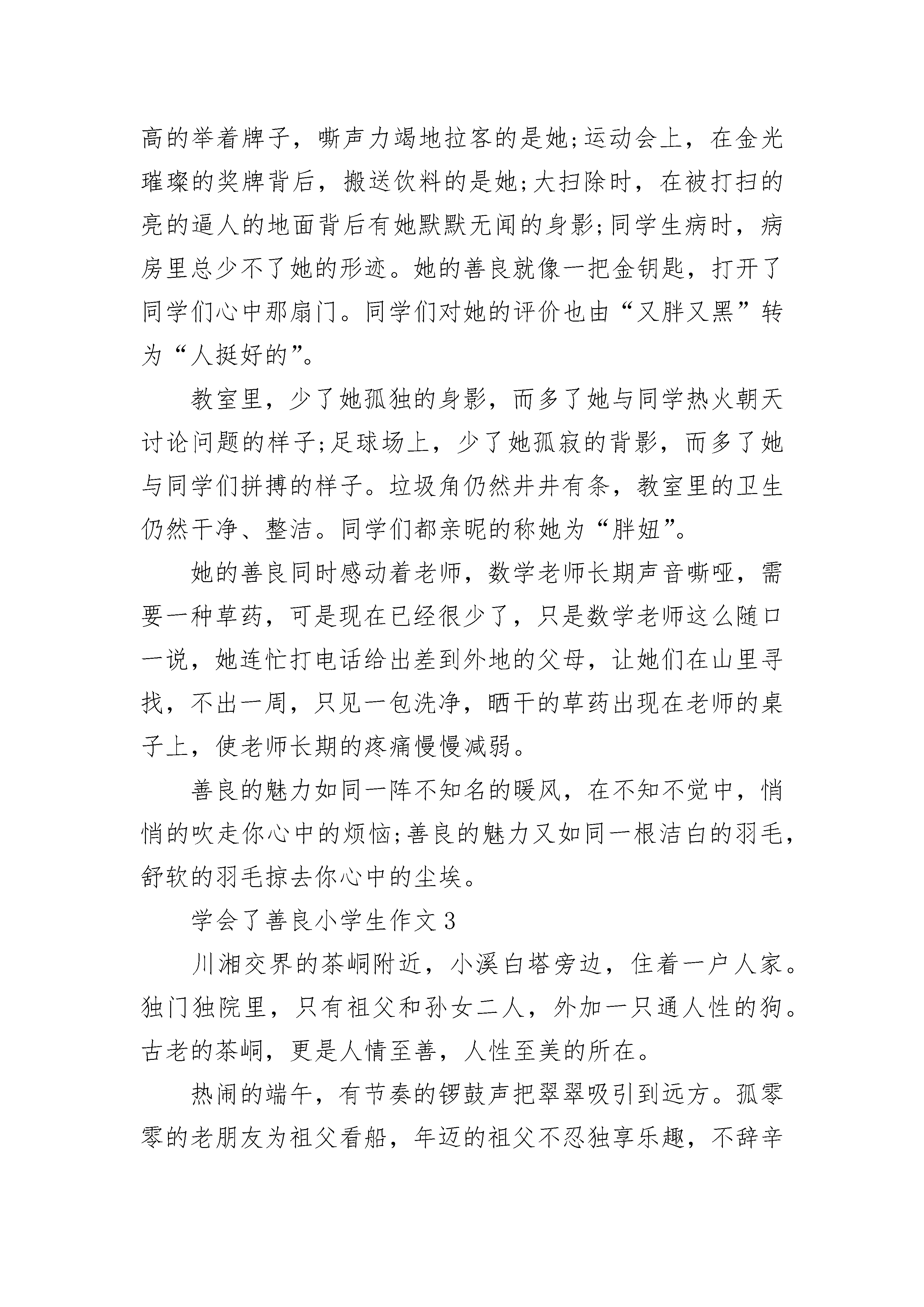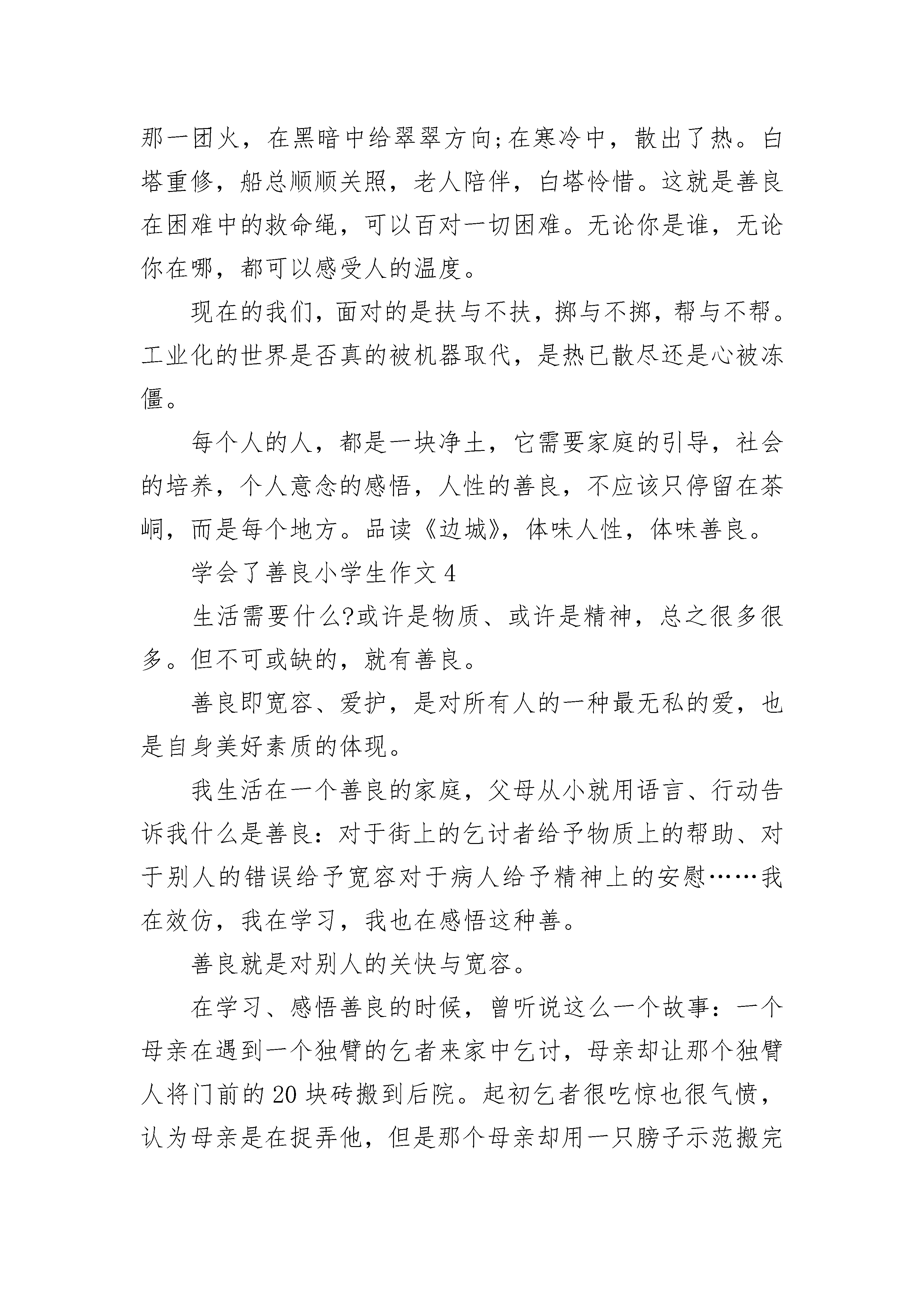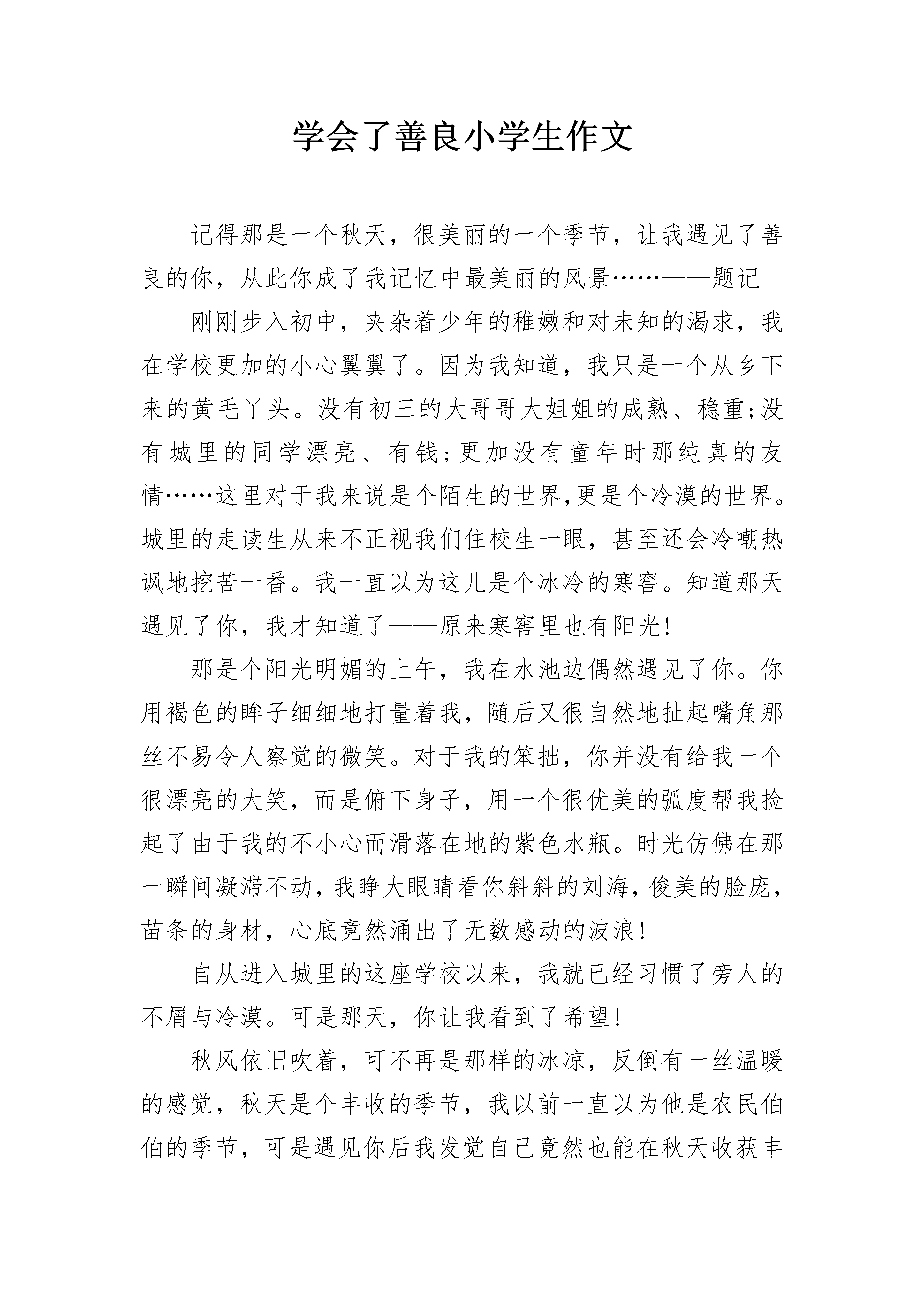 学会了善良小学生作文记得那是一个秋天,很美丽的一个季节,让我遇见了善良的你,从此你成了我记忆中最美丽的风景……——题记刚刚步入初中,夹杂着少年的稚嫩和对未知的渴求,我在学校更加的小心翼翼了。因为我知道,我只是一个从乡下来的黄毛丫头。没有初三的大哥哥大姐姐的成熟、稳重;没有城里的同学漂亮、有钱;更加没有童年时那纯真的友情……这里对于我来说是个陌生的世界,更是个冷漠的世界。城里的走读生从来不正视我们住校生一眼,甚至还会冷嘲热讽地挖苦一番。我一直以为这儿是个冰冷的寒窖。知道那天遇见了你,我才知道了——原来寒窖里也有阳光!那是个阳光明媚的上午,我在水池边偶然遇见了你。你用褐色的眸子细细地打量着我,随后又很自然地扯起嘴角那丝不易令人察觉的微笑。对于我的笨拙,你并没有给我一个很漂亮的大笑,而是俯下身子,用一个很优美的弧度帮我捡起了由于我的不小心而滑落在地的紫色水瓶。时光仿佛在那一瞬间凝滞不动,我睁大眼睛看你斜斜的刘海,俊美的脸庞,苗条的身材,心底竟然涌出了无数感动的波浪!自从进入城里的这座学校以来,我就已经习惯了旁人的不屑与冷漠。可是那天,你让我看到了希望!秋风依旧吹着,可不再是那样的冰凉,反倒有一丝温暖的感觉,秋天是个丰收的季节,我以前一直以为他是农民伯伯的季节,可是遇见你后我发觉自己竟然也能在秋天收获丰硕的果实。那是温暖,是希望,是对于人情的一线阳光!真的很感谢你,感谢你让我知道在这充满金钱、诱惑、冷漠的社会中还有一些可爱、善良的人们。感谢你在我最无助的时候给了我希望!虽然我不知道你的名字,但我记得那俊美的面孔以及那颗充满爱的心!你的善良,让我记住了你…学会了善良小学生作文2善良犹如一缕阳光,在寒冷的冬日融化了厚重的冰川;善良犹如沙漠里的一泓清泉,在帜热的天气里温润了人们干渴的喉咙;善良犹如春日里的一阵清风,拂去人们心中的尘埃。——题记“她是刚转来的,又黑又胖。”同学们这样评价她。她似乎没有听到似的,傻乎乎的朝人家笑,不料,又是一个白眼。炎热的夏天,垃圾角是最令人厌恶的地方,脏、臭,生有蚊子,似乎所有的毛病都被那“死”地方占着了。她正是垃圾角的主人。每天,她及时倒垃圾,洗垃圾桶,在她的精心关照下,似乎教室里完全没有了异味。可是同学们总用异样的眼神看着她。女生嫌她胖,男生又嫌她不养眼,每天,只有她一个人的影子在各个地方出现。“我帮你发作业,你先去上体育课。”她伸过手,热情的对语文课代表说,语文课代表刚才还一副不情愿的样子顿时神采飞扬,抱着篮球就跑了,教师里只剩下她一个人。不知不觉,同学们似乎对她友善了许多。义卖会上,高高的举着牌子,嘶声力竭地拉客的是她;运动会上,在金光璀璨的奖牌背后,搬送饮料的是她;大扫除时,在被打扫的亮的逼人的地面背后有她默默无闻的身影;同学生病时,病房里总少不了她的形迹。她的善良就像一把金钥匙,打开了同学们心中那扇门。同学们对她的评价也由“又胖又黑”转为“人挺好的”。教室里,少了她孤独的身影,而多了她与同学热火朝天讨论问题的样子;足球场上,少了她孤寂的背影,而多了她与同学们拼搏的样子。垃圾角仍然井井有条,教室里的卫生仍然干净、整洁。同学们都亲昵的称她为“胖妞”。她的善良同时感动着老师,数学老师长期声音嘶哑,需要一种草药,可是现在已经很少了,只是数学老师这么随口一说,她连忙打电话给出差到外地的父母,让她们在山里寻找,不出一周,只见一包洗净,晒干的草药出现在老师的桌子上,使老师长期的疼痛慢慢减弱。善良的魅力如同一阵不知名的暖风,在不知不觉中,悄悄的吹走你心中的烦恼;善良的魅力又如同一根洁白的羽毛,舒软的羽毛掠去你心中的尘埃。学会了善良小学生作文3川湘交界的茶峒附近,小溪白塔旁边,住着一户人家。独门独院里,只有祖父和孙女二人,外加一只通人性的狗。古老的茶峒,更是人情至善,人性至美的所在。热闹的端午,有节奏的锣鼓声把翠翠吸引到远方。孤零零的老朋友为祖父看船,年迈的祖父不忍独享乐趣,不辞辛劳赶回溪边替换。这是一种善良,一种人才有的善良。有福就要同享,有难却未必会和朋友分享。一个未被污染的小村落,似乎每个人都是憨厚、真诚的。在现在的一个雾霾的空气里,人心也是浑浊的。有多少人,为了自己的利益欺骗别人;有多少人,为了自己轻松快活,把生活,工作的重担扔给别人。只有在那个茶峒的地方,还存在着上个时代的味道——真诚、善良。而今门前屋后的围墙,围住了多少邻里情;墙上的玻璃片,割断了多少人情。老朋友帮忙看家的故事,不知何时才会出现在耳旁。人性善良的信任,只是先一辈的标志。一场天真、腼腆的少女邂逅,为天保和傩送兄弟送去了爱。但弟弟为哥哥唱歌,哥哥为弟弟跑船的故事更令人难忘。为了爱帮助退出,虽有些懦弱,但这般兄弟情谊令人佩服。谁都想得到,那是本能的欲望。在竞争时互相帮助,是双赢的过程。谁也不忍心伤害对方,这种含蕴的善良,不会有深宫大院妃子的
