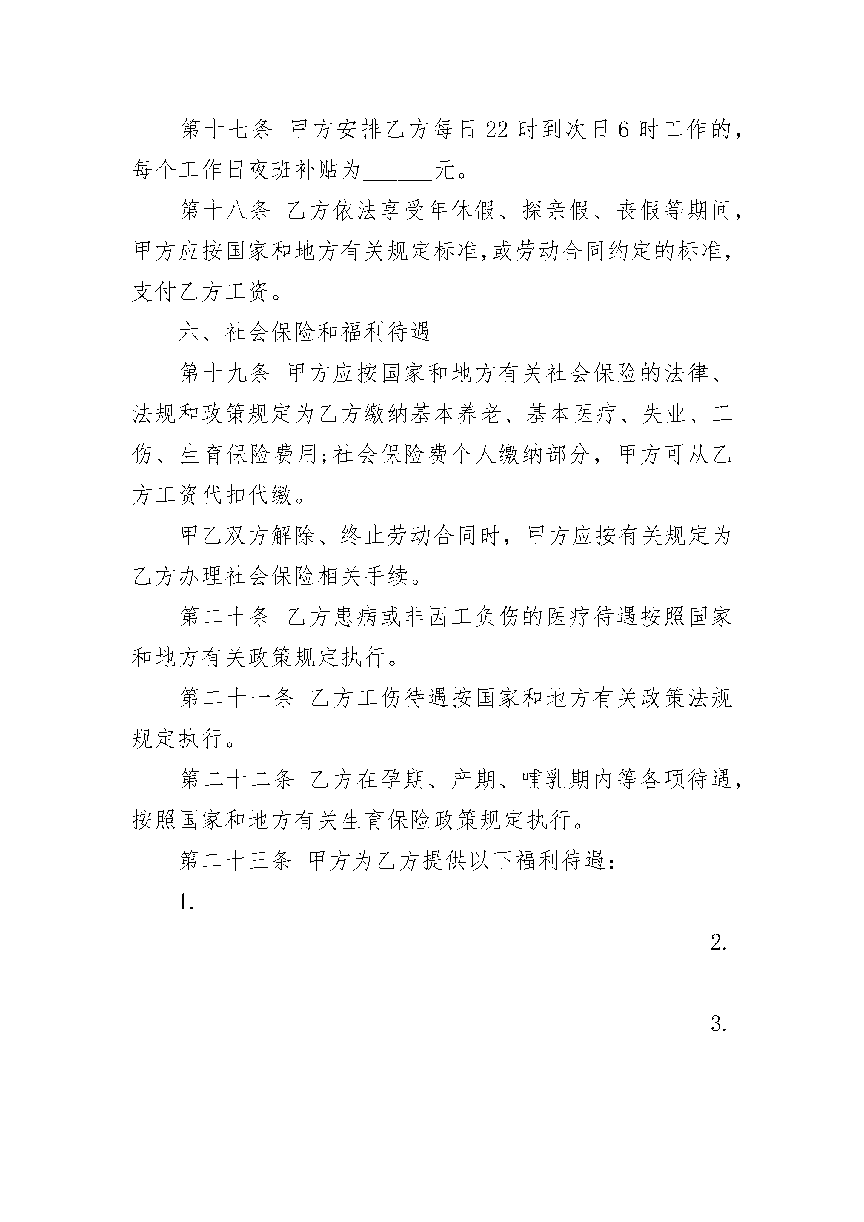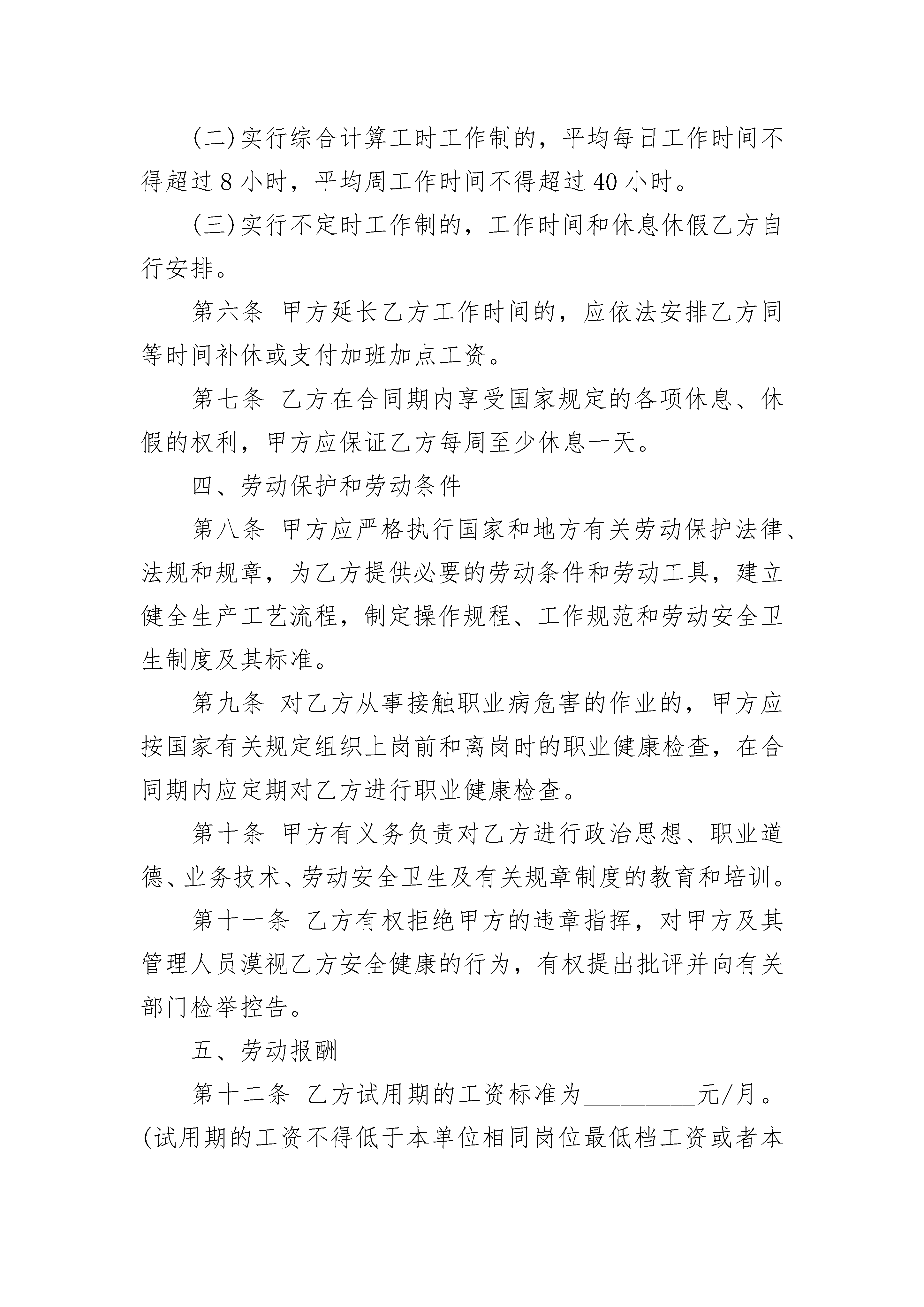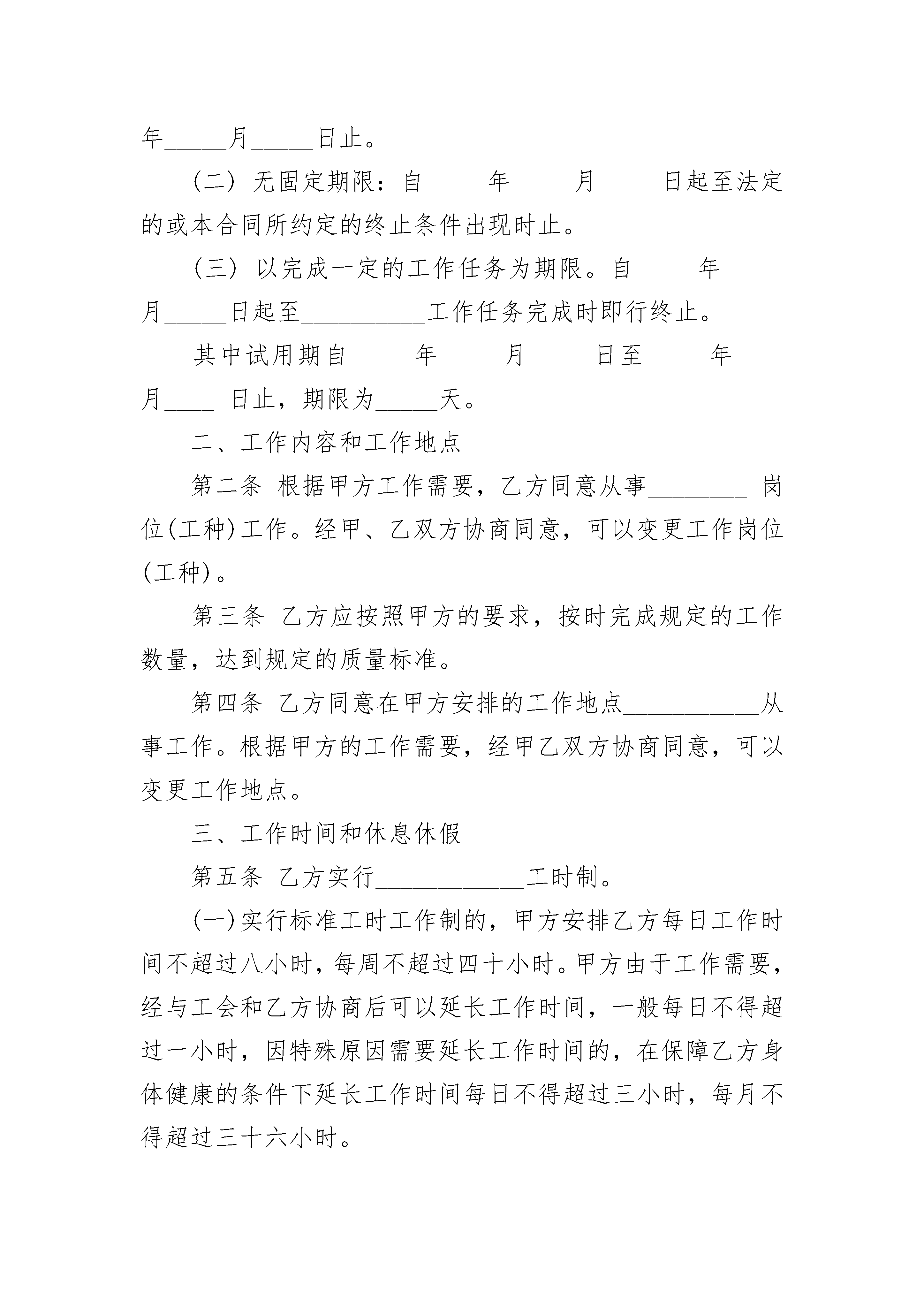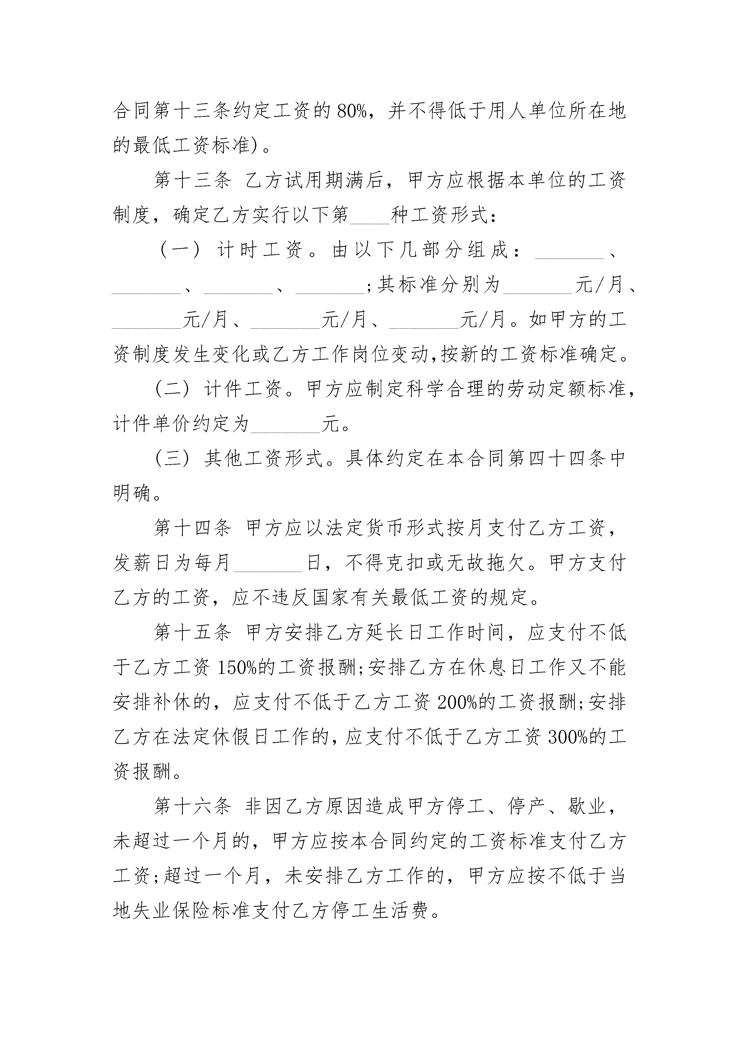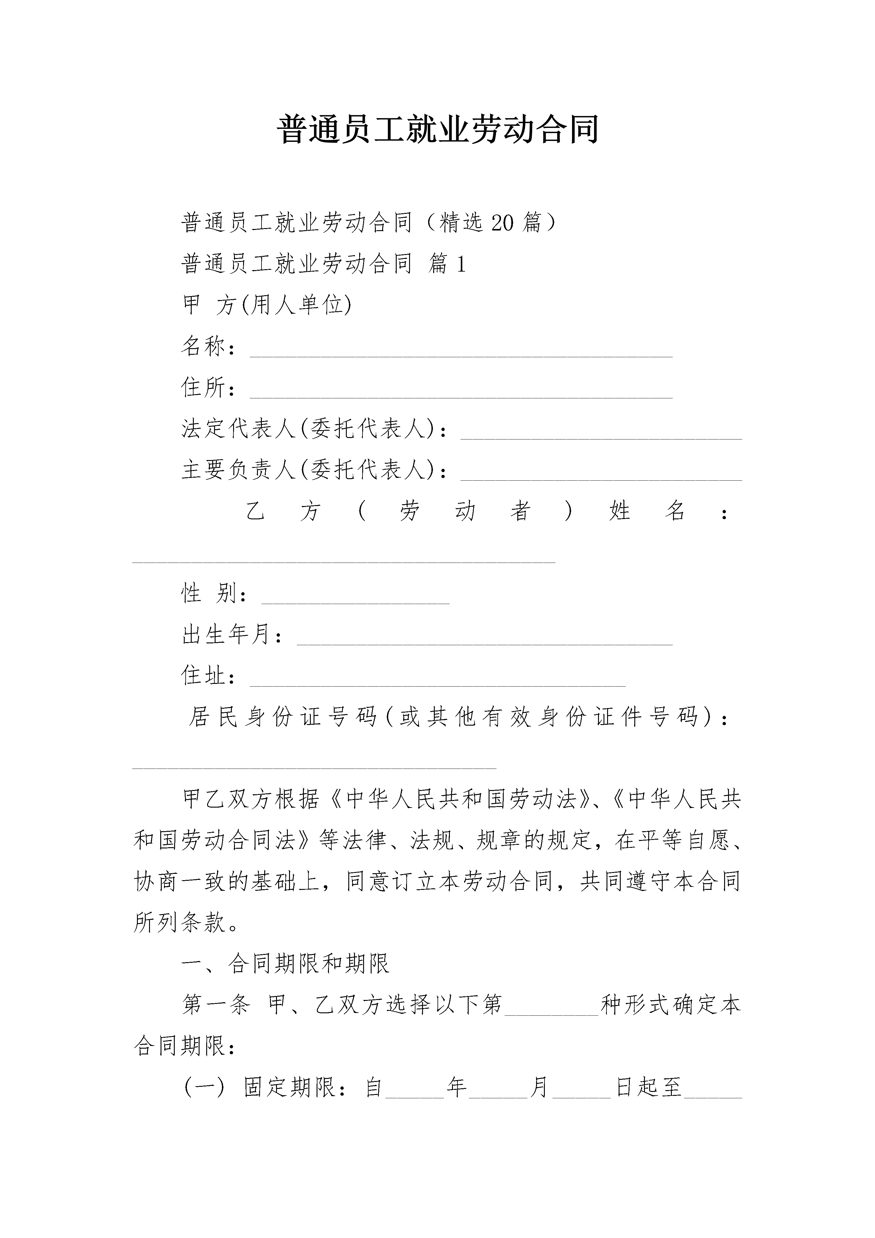 普通员工就业劳动合同普通员工就业劳动合同(精选20篇)普通员工就业劳动合同篇1甲方(用人单位)名称:____________________________________住所:____________________________________法定代表人(委托代表人):________________________主要负责人(委托代表人):________________________乙方(劳动者)姓名:____________________________________性别:________________出生年月:________________________________住址:________________________________居民身份证号码(或其他有效身份证件号码):_______________________________甲乙双方根据《中华人民共和国劳动法》、《中华人民共和国劳动合同法》等法律、法规、规章的规定,在平等自愿、协商一致的基础上,同意订立本劳动合同,共同遵守本合同所列条款。一、合同期限和期限第一条甲、乙双方选择以下第________种形式确定本合同期限:(一)固定期限:自_____年_____月_____日起至_____年_____月_____日止。(二)无固定期限:自_____年_____月_____日起至法定的或本合同所约定的终止条件出现时止。(三)以完成一定的工作任务为期限。自_____年_____月_____日起至__________工作任务完成时即行终止。其中试用期自____年____月____日至____年____月____日止,期限为_____天。二、工作内容和工作地点第二条根据甲方工作需要,乙方同意从事________岗位(工种)工作。经甲、乙双方协商同意,可以变更工作岗位(工种)。第三条乙方应按照甲方的要求,按时完成规定的工作数量,达到规定的质量标准。第四条乙方同意在甲方安排的工作地点___________从事工作。根据甲方的工作需要,经甲乙双方协商同意,可以变更工作地点。三、工作时间和休息休假第五条乙方实行____________工时制。(一)实行标准工时工作制的,甲方安排乙方每日工作时间不超过八小时,每周不超过四十小时。甲方由于工作需要,经与工会和乙方协商后可以延长工作时间,一般每日不得超过一小时,因特殊原因需要延长工作时间的,在保障乙方身体健康的条件下延长工作时间每日不得超过三小时,每月不得超过三十六小时。(二)实行综合计算工时工作制的,平均每日工作时间不得超过8小时,平均周工作时间不得超过40小时。(三)实行不定时工作制的,工作时间和休息休假乙方自行安排。第六条甲方延长乙方工作时间的,应依法安排乙方同等时间补休或支付加班加点工资。第七条乙方在合同期内享受国家规定的各项休息、休假的权利,甲方应保证乙方每周至少休息一天。四、劳动保护和劳动条件第八条甲方应严格执行国家和地方有关劳动保护法律、法规和规章,为乙方提供必要的劳动条件和劳动工具,建立健全生产工艺流程,制定操作规程、工作规范和劳动安全卫生制度及其标准。第九条对乙方从事接触职业病危害的作业的,甲方应按国家有关规定组织上岗前和离岗时的职业健康检查,在合同期内应定期对乙方进行职业健康检查。第十条甲方有义务负责对乙方进行政治思想、职业道德、业务技术、劳动安全卫生及有关规章制度的教育和培训。第十一条乙方有权拒绝甲方的违章指挥,对甲方及其管理人员漠视乙方安全健康的行为,有权提出批评并向有关部门检举控告。五、劳动报酬第十二条乙方试用期的工资标准为_________元/月。(试用期的工资不得低于本单位相同岗位最低档工资或者本合同第十三条约定工资的80%,并不得低于用人单位所在地的最低工资标准)。第十三条乙方试用期满后,甲方应根据本单位的工资制度,确定乙方实行以下第____种工资形式:(一)计时工资。由以下几部分组成:_______、_______、_______、_______;其标准分别为_______元/月、_______元/月、_______元/月、_______元/月。如甲方的工资制度发生变化或乙方工作岗位变动,按新的工资标准确定。(二)计件工资。甲方应制定科学合理的劳动定额标准,计件单价约定为_______元。(三)其他工资形式。具体约定在本合同第四十四条中明确。第十四条甲方应以法定货币形式按月支付乙方工资,发薪日为每月_______日,不得克扣或无故拖欠。甲方支付乙方的工资,应不违反国家有关最低工资的规定。第十五条甲方安排乙方延长日工作时间,应支付不低于乙方工资150%的工资报酬;安排乙方在休息日工作又不能安排补休的,应支付不低于乙方工资200%的工资报酬;安排乙方在法定休假日工作的,应支付不低