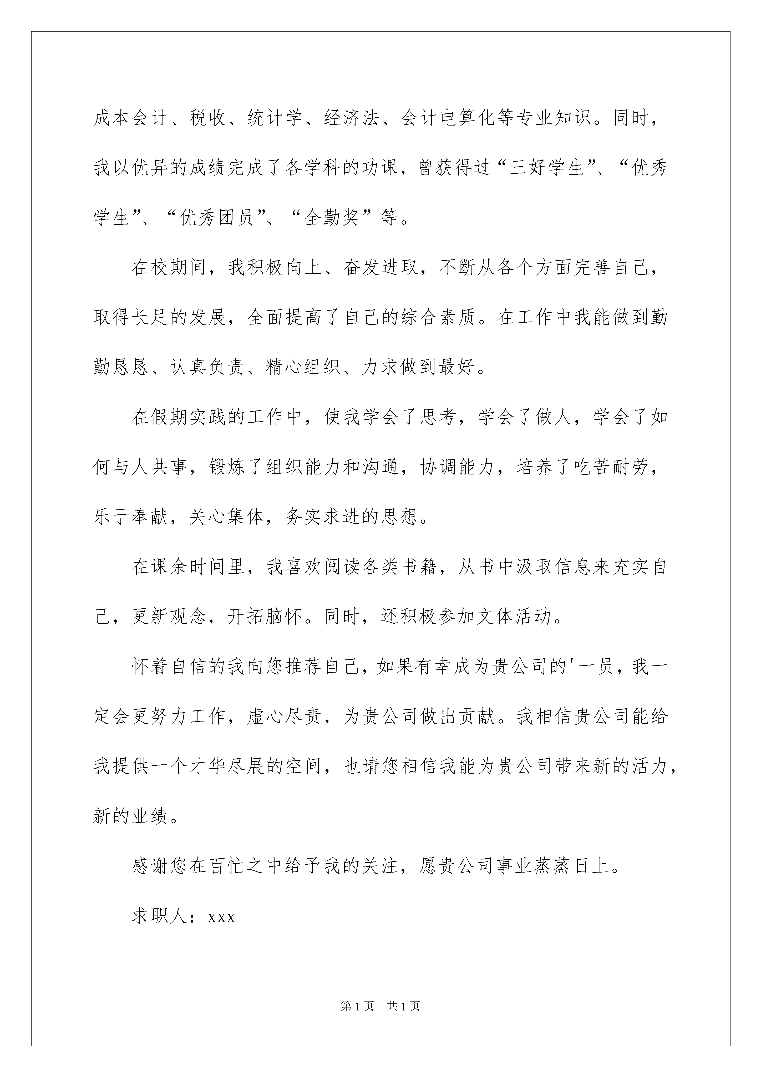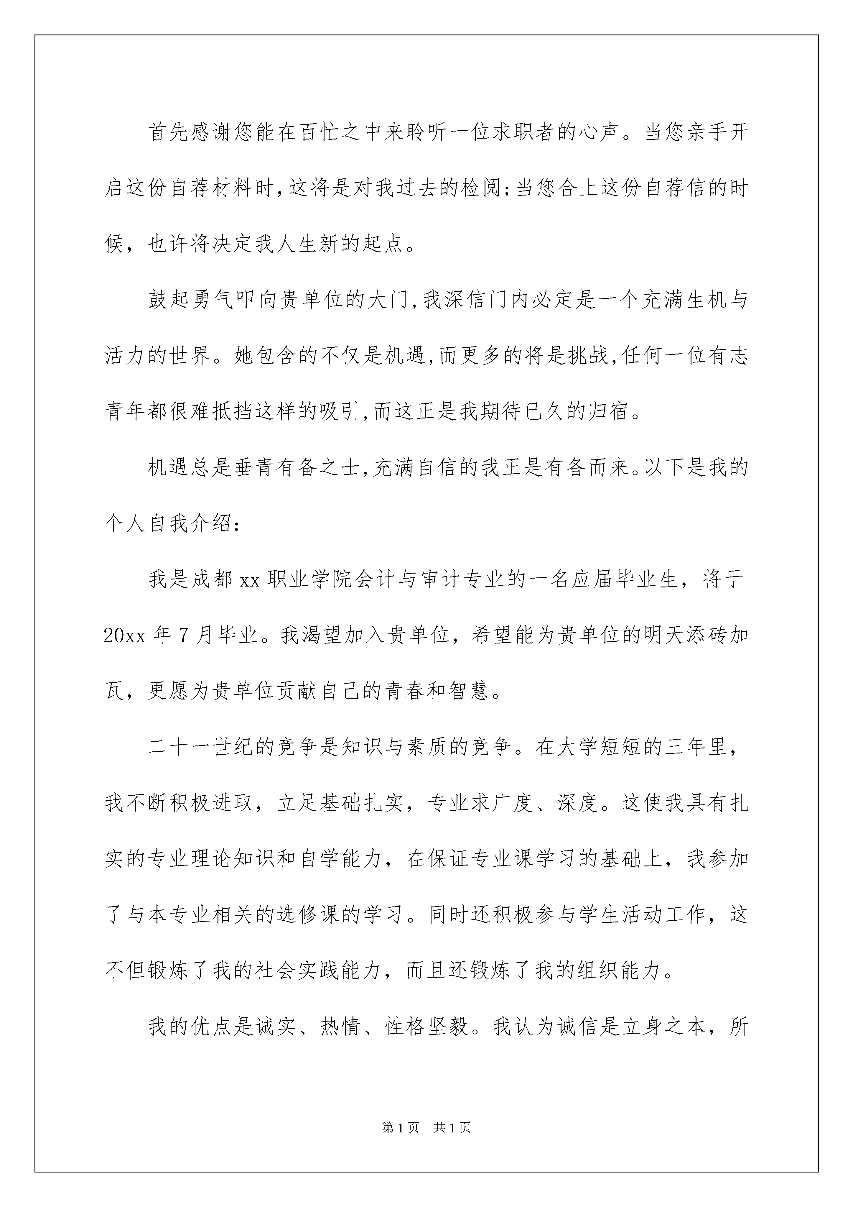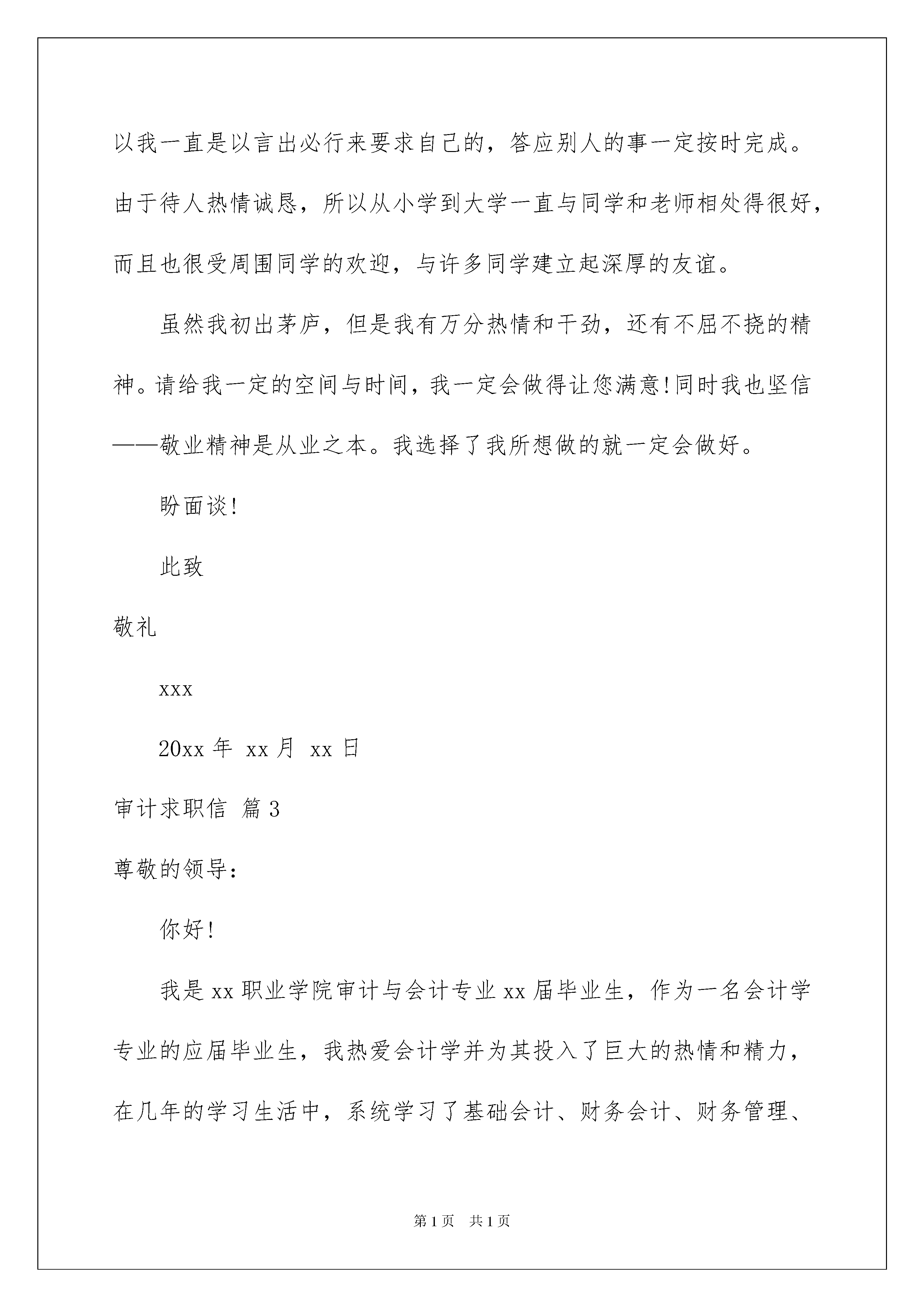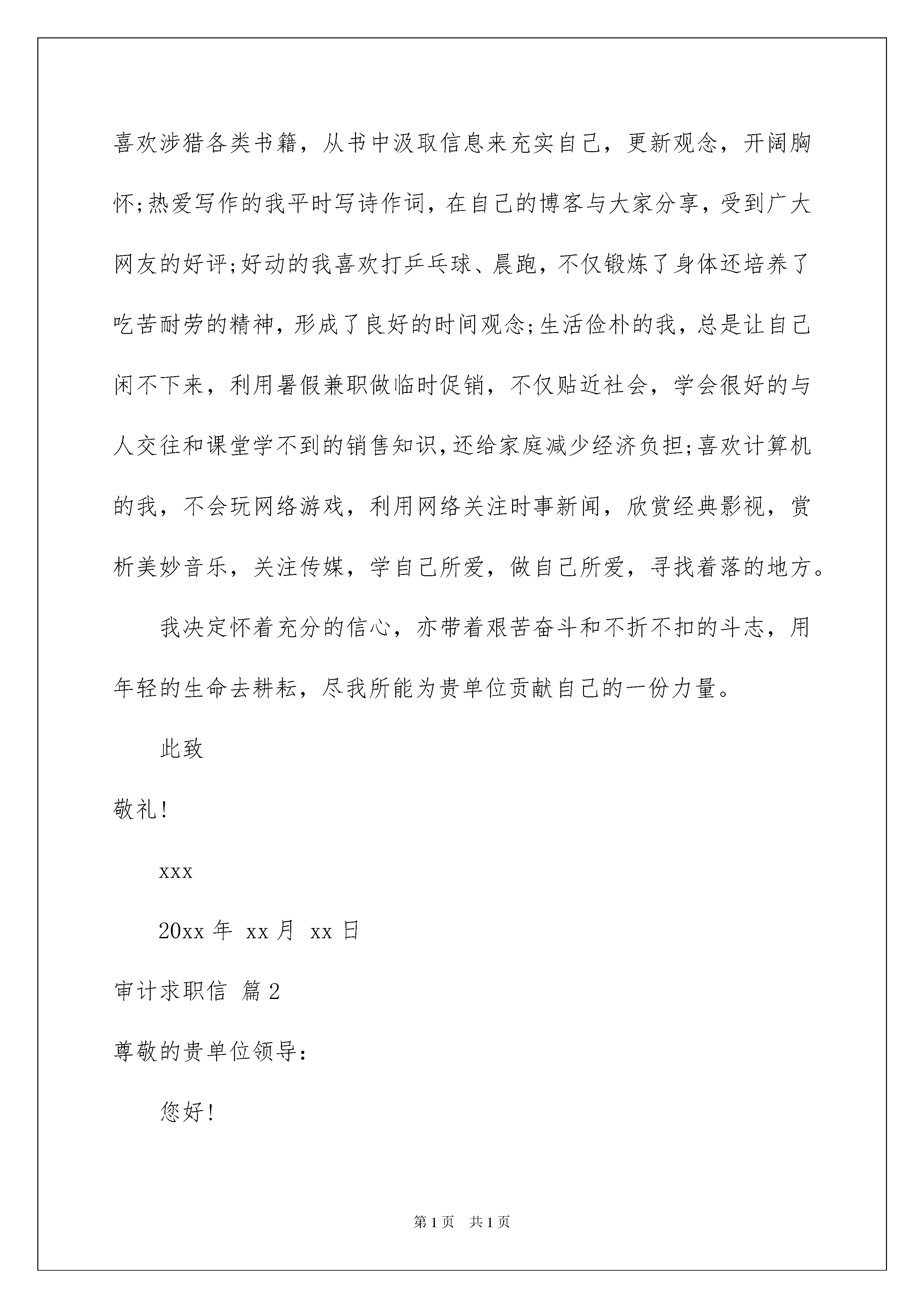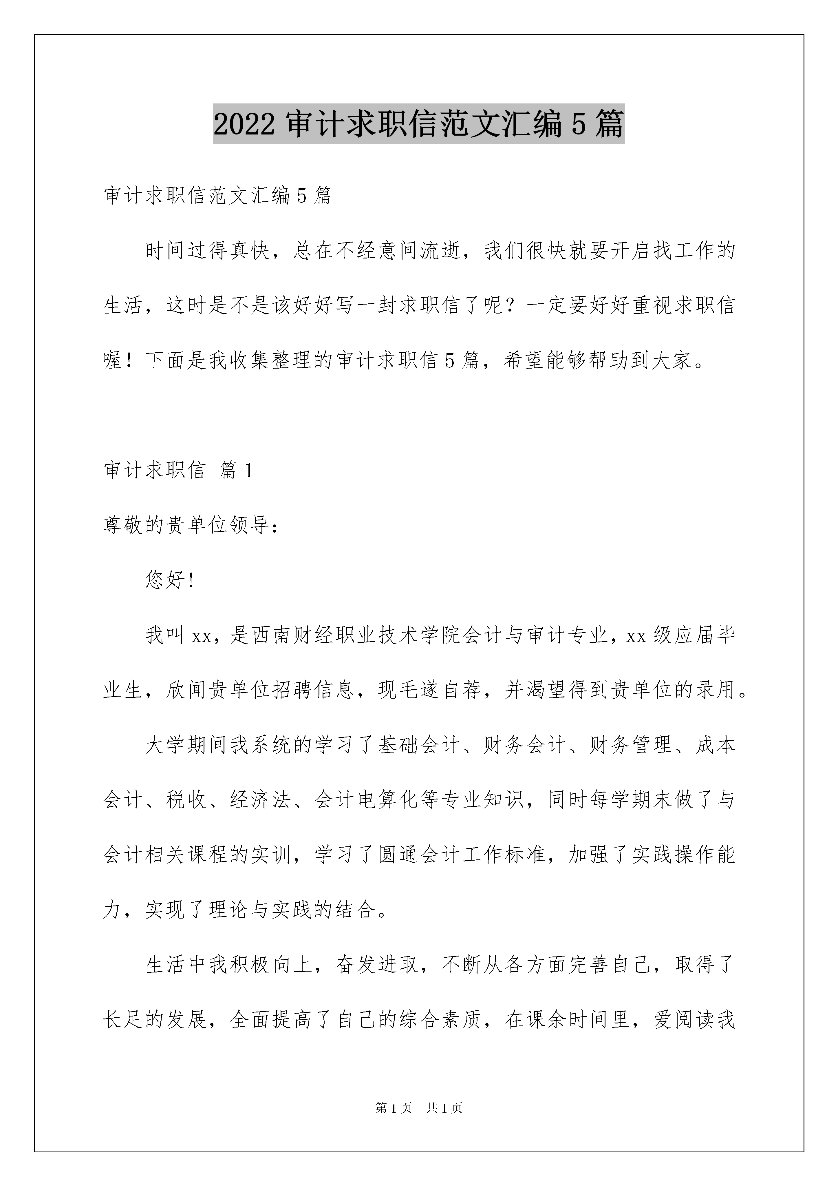 2022审计求职信范文汇编5篇审计求职信范文汇编5篇时间过得真快,总在不经意间流逝,我们很快就要开启找工作的生活,这时是不是该好好写一封求职信了呢?一定要好好重视求职信喔!下面是我收集整理的审计求职信5篇,希望能够帮助到大家。审计求职信篇1尊敬的贵单位领导:您好!我叫xx,是西南财经职业技术学院会计与审计专业,xx级应届毕业生,欣闻贵单位招聘信息,现毛遂自荐,并渴望得到贵单位的录用。大学期间我系统的学习了基础会计、财务会计、财务管理、成本会计、税收、经济法、会计电算化等专业知识,同时每学期末做了与会计相关课程的实训,学习了圆通会计工作标准,加强了实践操作能力,实现了理论与实践的结合。生活中我积极向上,奋发进取,不断从各方面完善自己,取得了长足的发展,全面提高了自己的综合素质,在课余时间里,爱阅读我喜欢涉猎各类书籍,从书中汲取信息来充实自己,更新观念,开阔胸怀;热爱写作的我平时写诗作词,在自己的博客与大家分享,受到广大网友的好评;好动的我喜欢打乒乓球、晨跑,不仅锻炼了身体还培养了吃苦耐劳的精神,形成了良好的时间观念;生活俭朴的我,总是让自己闲不下来,利用暑假兼职做临时促销,不仅贴近社会,学会很好的与人交往和课堂学不到的销售知识,还给家庭减少经济负担;喜欢计算机的我,不会玩网络游戏,利用网络关注时事新闻,欣赏经典影视,赏析美妙音乐,关注传媒,学自己所爱,做自己所爱,寻找着落的地方。我决定怀着充分的信心,亦带着艰苦奋斗和不折不扣的斗志,用年轻的生命去耕耘,尽我所能为贵单位贡献自己的一份力量。此致敬礼!xxx20xx年xx月xx日审计求职信篇2尊敬的贵单位领导:您好!首先感谢您能在百忙之中来聆听一位求职者的心声。当您亲手开启这份自荐材料时,这将是对我过去的检阅;当您合上这份自荐信的时候,也许将决定我人生新的起点。鼓起勇气叩向贵单位的大门,我深信门内必定是一个充满生机与活力的世界。她包含的不仅是机遇,而更多的将是挑战,任何一位有志青年都很难抵挡这样的吸引,而这正是我期待已久的归宿。机遇总是垂青有备之士,充满自信的我正是有备而来。以下是我的个人自我介绍:我是成都xx职业学院会计与审计专业的一名应届毕业生,将于20xx年7月毕业。我渴望加入贵单位,希望能为贵单位的明天添砖加瓦,更愿为贵单位贡献自己的青春和智慧。二十一世纪的竞争是知识与素质的竞争。在大学短短的三年里,我不断积极进取,立足基础扎实,专业求广度、深度。这使我具有扎实的专业理论知识和自学能力,在保证专业课学习的基础上,我参加了与本专业相关的选修课的学习。同时还积极参与学生活动工作,这不但锻炼了我的社会实践能力,而且还锻炼了我的组织能力。我的优点是诚实、热情、性格坚毅。我认为诚信是立身之本,所以我一直是以言出必行来要求自己的,答应别人的事一定按时完成。由于待人热情诚恳,所以从小学到大学一直与同学和老师相处得很好,而且也很受周围同学的欢迎,与许多同学建立起深厚的友谊。虽然我初出茅庐,但是我有万分热情和干劲,还有不屈不挠的精神。请给我一定的空间与时间,我一定会做得让您满意!同时我也坚信——敬业精神是从业之本。我选择了我所想做的就一定会做好。盼面谈!此致敬礼xxx20xx年xx月xx日审计求职信篇3尊敬的领导:你好!我是xx职业学院审计与会计专业xx届毕业生,作为一名会计学专业的应届毕业生,我热爱会计学并为其投入了巨大的热情和精力,在几年的学习生活中,系统学习了基础会计、财务会计、财务管理、成本会计、税收、统计学、经济法、会计电算化等专业知识。同时,我以优异的成绩完成了各学科的功课,曾获得过“三好学生”、“优秀学生”、“优秀团员”、“全勤奖”等。在校期间,我积极向上、奋发进取,不断从各个方面完善自己,取得长足的发展,全面提高了自己的综合素质。在工作中我能做到勤勤恳恳、认真负责、精心组织、力求做到最好。在假期实践的工作中,使我学会了思考,学会了做人,学会了如何与人共事,锻炼了组织能力和沟通,协调能力,培养了吃苦耐劳,乐于奉献,关心集体,务实求进的思想。在课余时间里,我喜欢阅读各类书籍,从书中汲取信息来充实自己,更新观念,开拓脑怀。同时,还积极参加文体活动。怀着自信的我向您推荐自己,如果有幸成为贵公司的'一员,我一定会更努力工作,虚心尽责,为贵公司做出贡献。我相信贵公司能给我提供一个才华尽展的空间,也请您相信我能为贵公司带来新的活力,新的业绩。感谢您在百忙之中给予我的关注,愿贵公司事业蒸蒸日上。求职人:xxx20xx年xx月xx日审计求职信篇4尊敬的领导:您好!首先向您表达我诚挚的谢意,感谢您在百忙之中来看我的求职信。我就读于黑龙江工程学