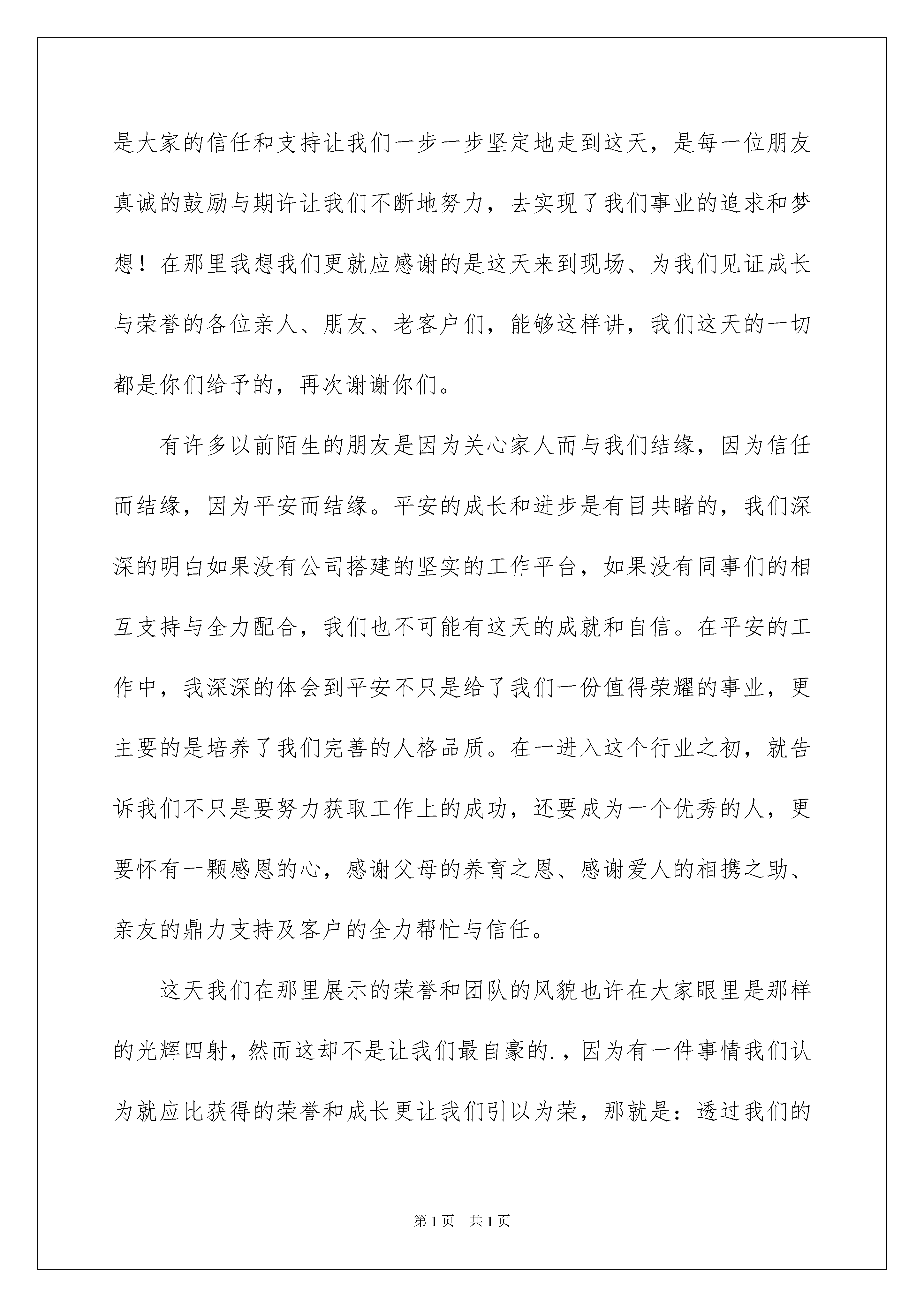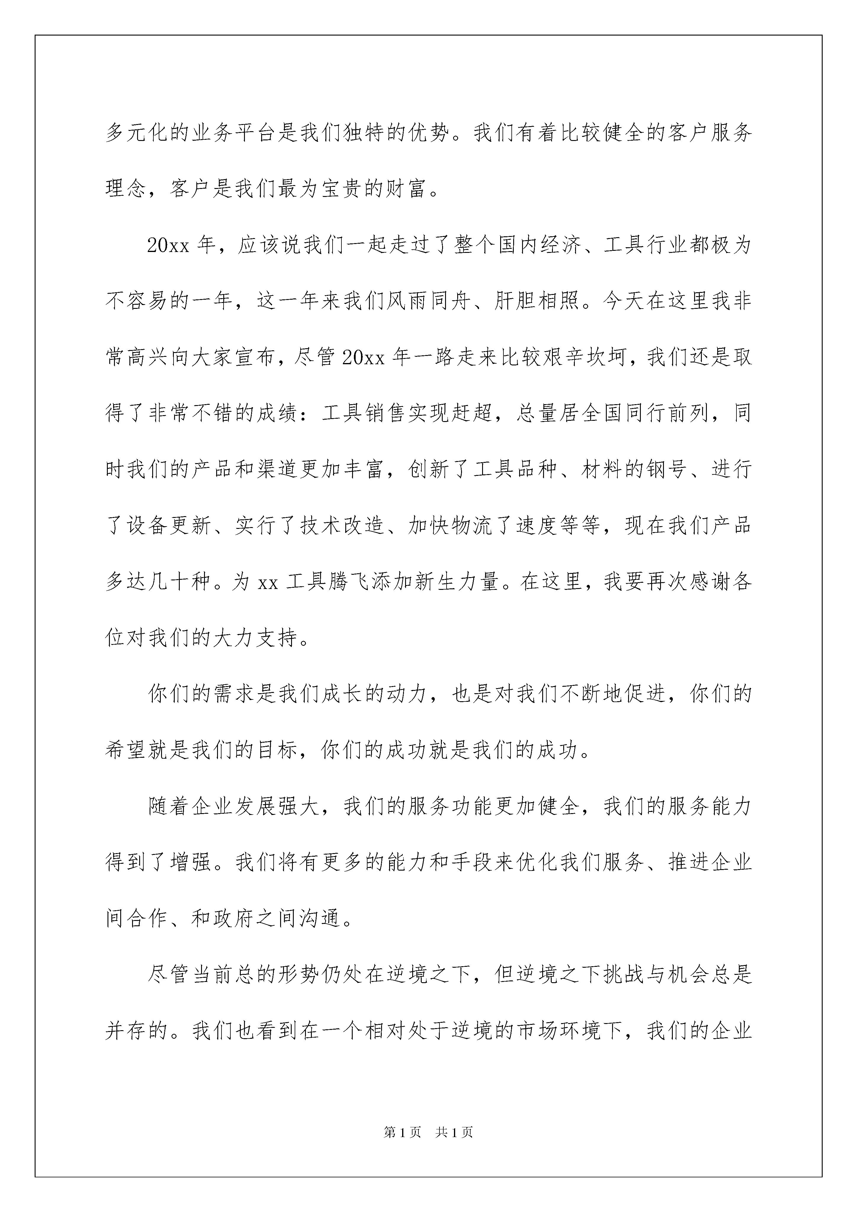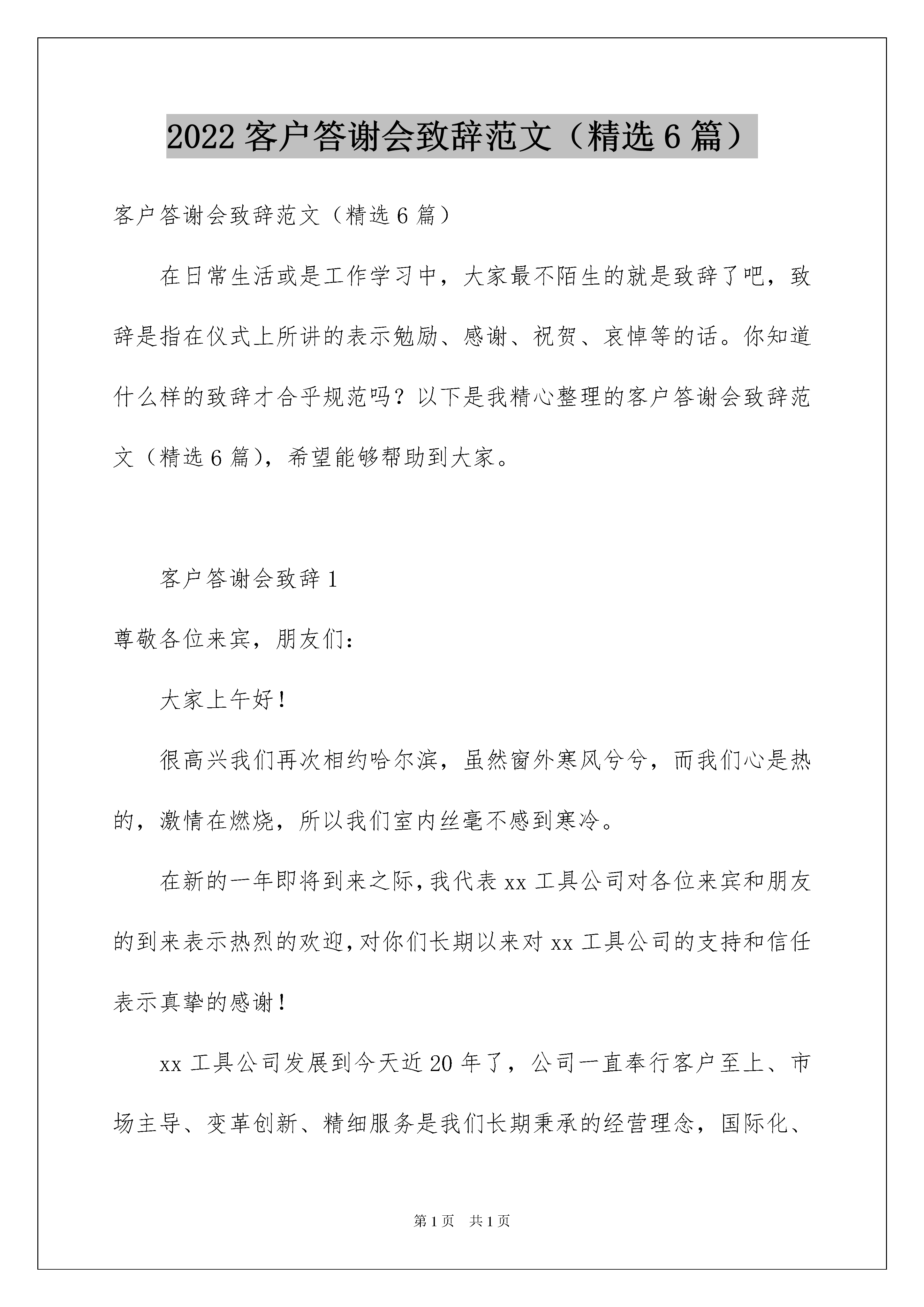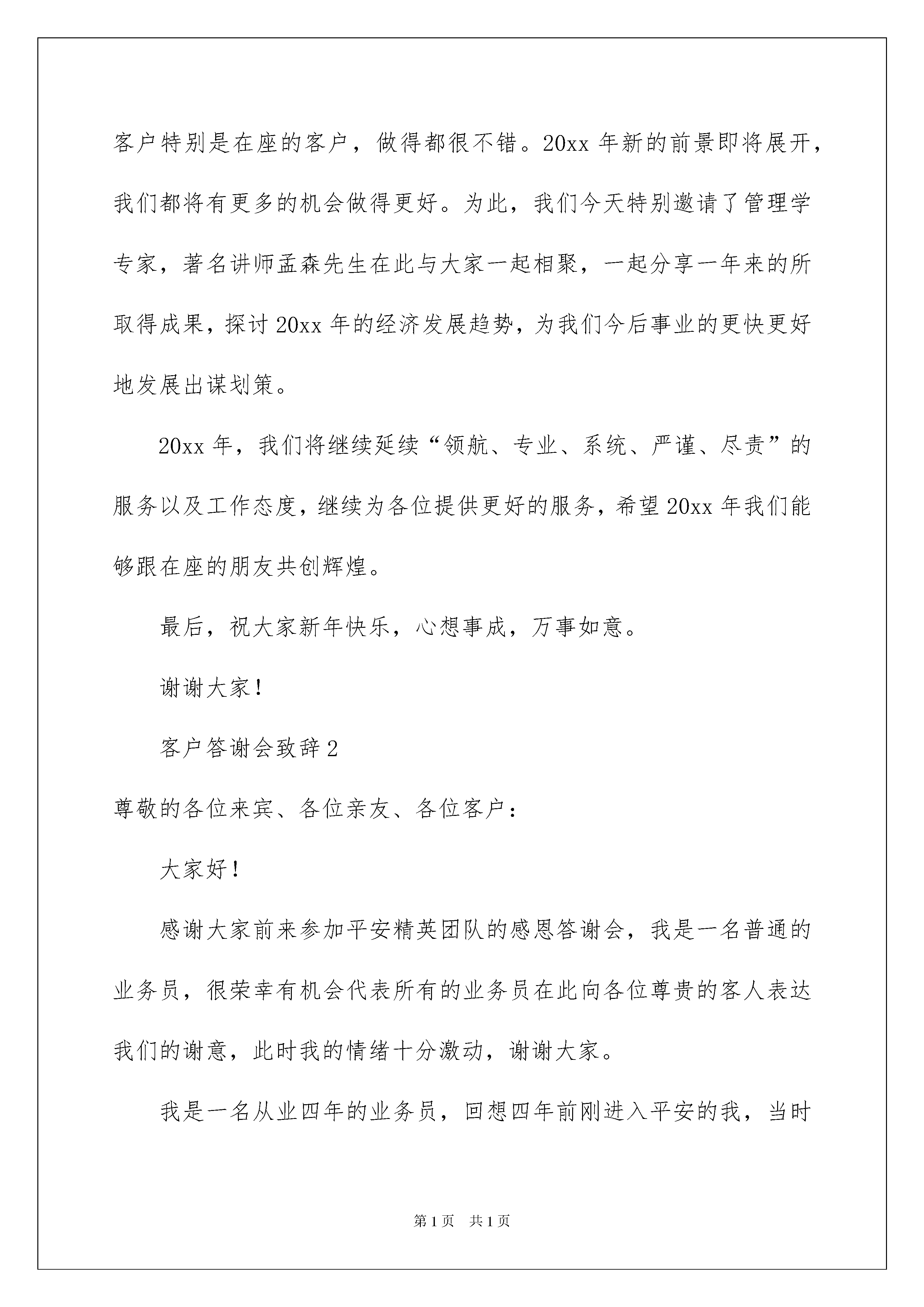2022客户答谢会致辞范文(精选6篇)客户答谢会致辞范文(精选6篇)在日常生活或是工作学习中,大家最不陌生的就是致辞了吧,致辞是指在仪式上所讲的表示勉励、感谢、祝贺、哀悼等的话。你知道什么样的致辞才合乎规范吗?以下是我精心整理的客户答谢会致辞范文(精选6篇),希望能够帮助到大家。客户答谢会致辞1尊敬各位来宾,朋友们:大家上午好!很高兴我们再次相约哈尔滨,虽然窗外寒风兮兮,而我们心是热的,激情在燃烧,所以我们室内丝毫不感到寒冷。在新的一年即将到来之际,我代表xx工具公司对各位来宾和朋友的到来表示热烈的欢迎,对你们长期以来对xx工具公司的支持和信任表示真挚的感谢!xx工具公司发展到今天近20年了,公司一直奉行客户至上、市场主导、变革创新、精细服务是我们长期秉承的经营理念,国际化、多元化的业务平台是我们独特的优势。我们有着比较健全的客户服务理念,客户是我们最为宝贵的财富。20xx年,应该说我们一起走过了整个国内经济、工具行业都极为不容易的一年,这一年来我们风雨同舟、肝胆相照。今天在这里我非常高兴向大家宣布,尽管20xx年一路走来比较艰辛坎坷,我们还是取得了非常不错的成绩:工具销售实现赶超,总量居全国同行前列,同时我们的产品和渠道更加丰富,创新了工具品种、材料的钢号、进行了设备更新、实行了技术改造、加快物流了速度等等,现在我们产品多达几十种。为xx工具腾飞添加新生力量。在这里,我要再次感谢各位对我们的大力支持。你们的需求是我们成长的动力,也是对我们不断地促进,你们的希望就是我们的目标,你们的成功就是我们的成功。随着企业发展强大,我们的服务功能更加健全,我们的服务能力得到了增强。我们将有更多的能力和手段来优化我们服务、推进企业间合作、和政府之间沟通。尽管当前总的形势仍处在逆境之下,但逆境之下挑战与机会总是并存的。我们也看到在一个相对处于逆境的市场环境下,我们的企业客户特别是在座的客户,做得都很不错。20xx年新的前景即将展开,我们都将有更多的机会做得更好。为此,我们今天特别邀请了管理学专家,著名讲师孟森先生在此与大家一起相聚,一起分享一年来的所取得成果,探讨20xx年的经济发展趋势,为我们今后事业的更快更好地发展出谋划策。20xx年,我们将继续延续“领航、专业、系统、严谨、尽责”的服务以及工作态度,继续为各位提供更好的服务,希望20xx年我们能够跟在座的朋友共创辉煌。最后,祝大家新年快乐,心想事成,万事如意。谢谢大家!客户答谢会致辞2尊敬的各位来宾、各位亲友、各位客户:大家好!感谢大家前来参加平安精英团队的感恩答谢会,我是一名普通的业务员,很荣幸有机会代表所有的业务员在此向各位尊贵的客人表达我们的谢意,此时我的情绪十分激动,谢谢大家。我是一名从业四年的业务员,回想四年前刚进入平安的我,当时在选取这个职业的时侯,我并不明白自己能在这个未曾接触的行业中走多远,也不明白这个行业能带给我怎样的经历。是我年过花甲的母亲给予我肯定的信心,她说做保险很好,能够帮忙人做好事。她和父亲工资并不高,但在十几年前就已经各自买了一份人寿保险,当时他们想的是将来有国家给的退休金是能够自己养老,再买份保险是预备到就算百年归老的时候也不给子女带来经济上的负担。听了这些话我很感动,因为我朴实的父亲和母亲从不会把“爱”这个字说出来,而他们超前的保险意识让我感觉到这份亲情深入心髓,体贴而温暖,而且我明白,这也是我要强的父母在表示他们永久拥有不一般的自尊。虽然我也已经做了母亲,但我真的觉得沉浸在老父母的这份爱中我很幸福,所以我也很想向我的父母说声谢谢,谢谢他们无微不致的爱和关怀。也因为对他们的爱理解,我选取了这个职业,并且十分喜欢这个职业。我们每一个保险业务员在进入保险业时,最初的工作的都可能遇到很多困难,很多人曾怀疑过自己是否适合这个行业,也可能以前经历过迷茫,但我们谁都会忘不了自己签下的第一张保单,忘不了每一个客户信任的眼光,忘不了每一个客户家庭中那些让我们感动的关爱,是大家的信任和支持让我们一步一步坚定地走到这天,是每一位朋友真诚的鼓励与期许让我们不断地努力,去实现了我们事业的追求和梦想!在那里我想我们更就应感谢的是这天来到现场、为我们见证成长与荣誉的各位亲人、朋友、老客户们,能够这样讲,我们这天的一切都是你们给予的,再次谢谢你们。有许多以前陌生的朋友是因为关心家人而与我们结缘,因为信任而结缘,因为平安而结缘。平安的成长和进步是有目共睹的,我们深深的明白如果没有公司搭建的坚实的工作平台,如果没有同事们的相互支持与全力配合,我们也不可能有这天的成就和自信。在平安的工作中,我深深的体会到平安不只是给了我们一份值得荣耀