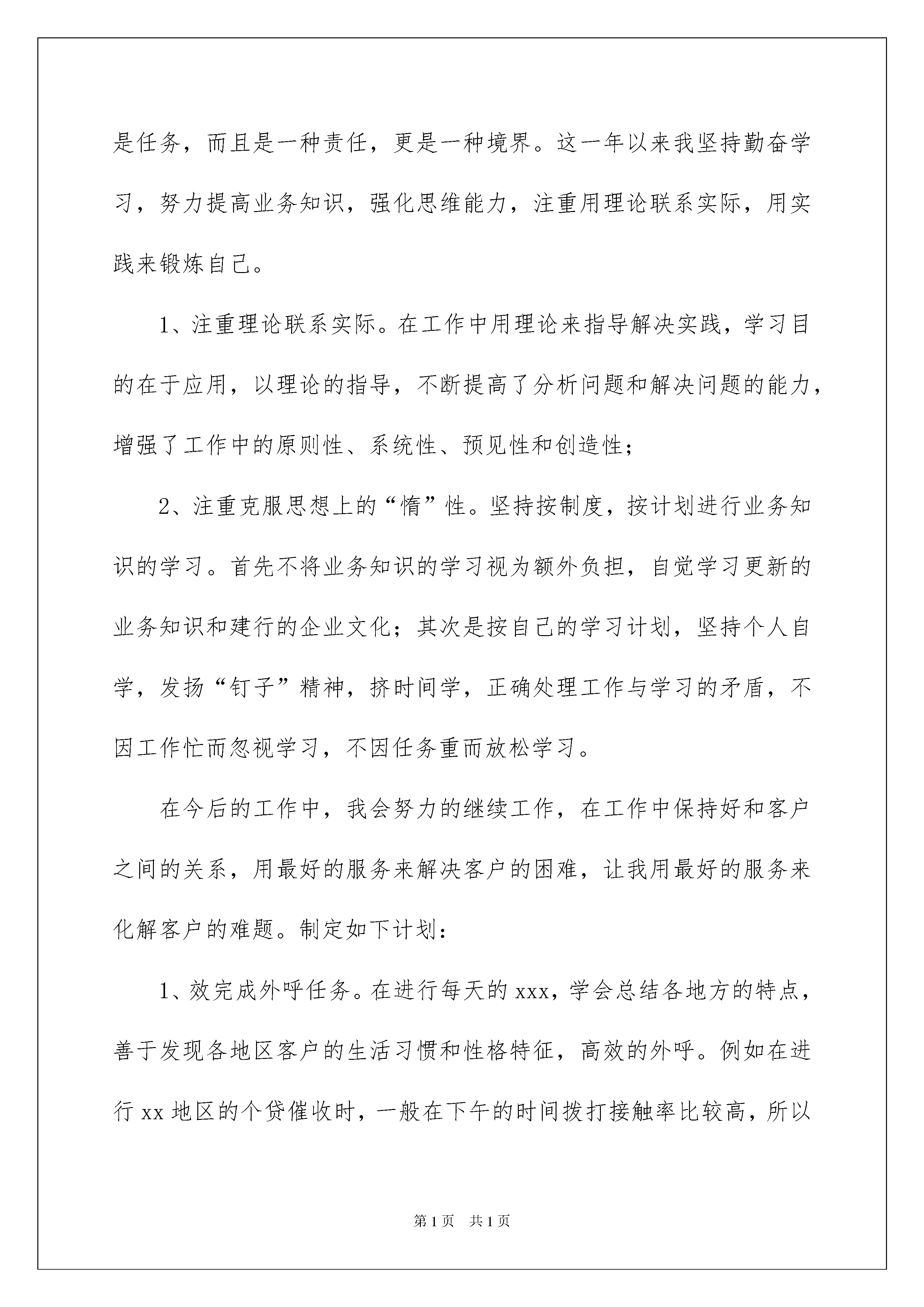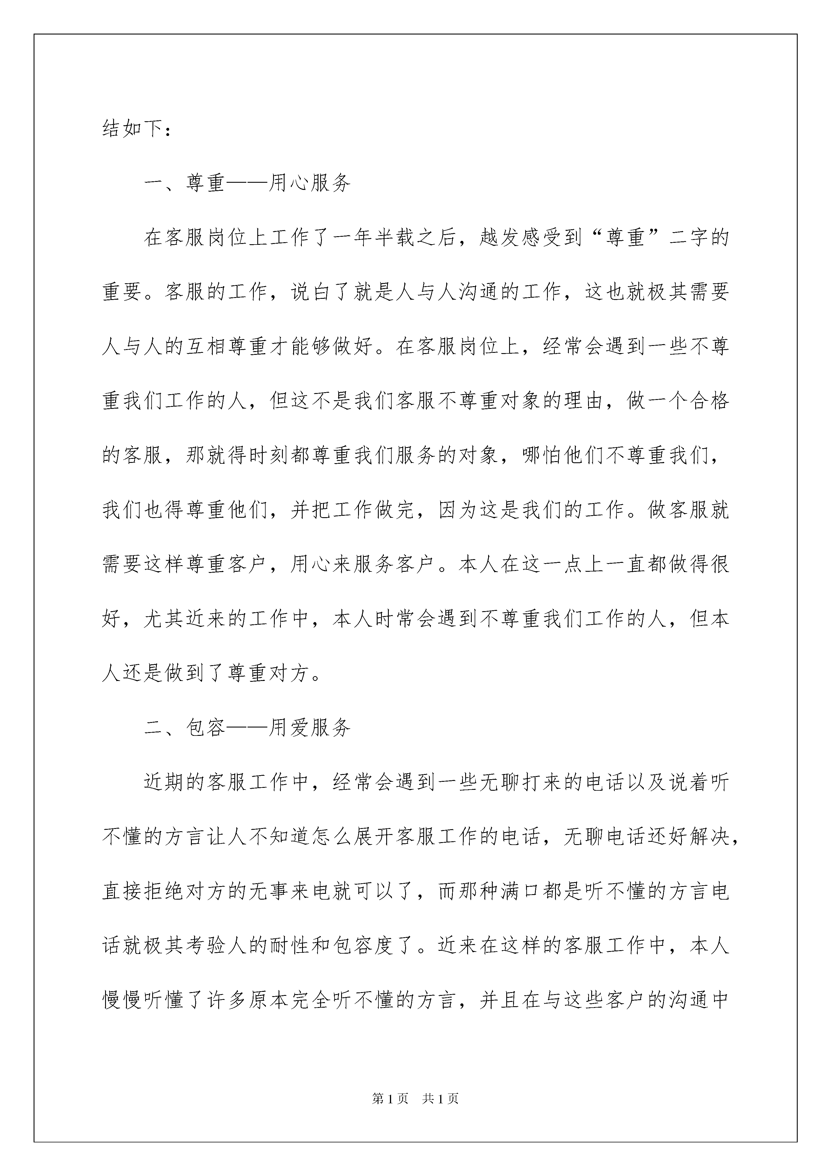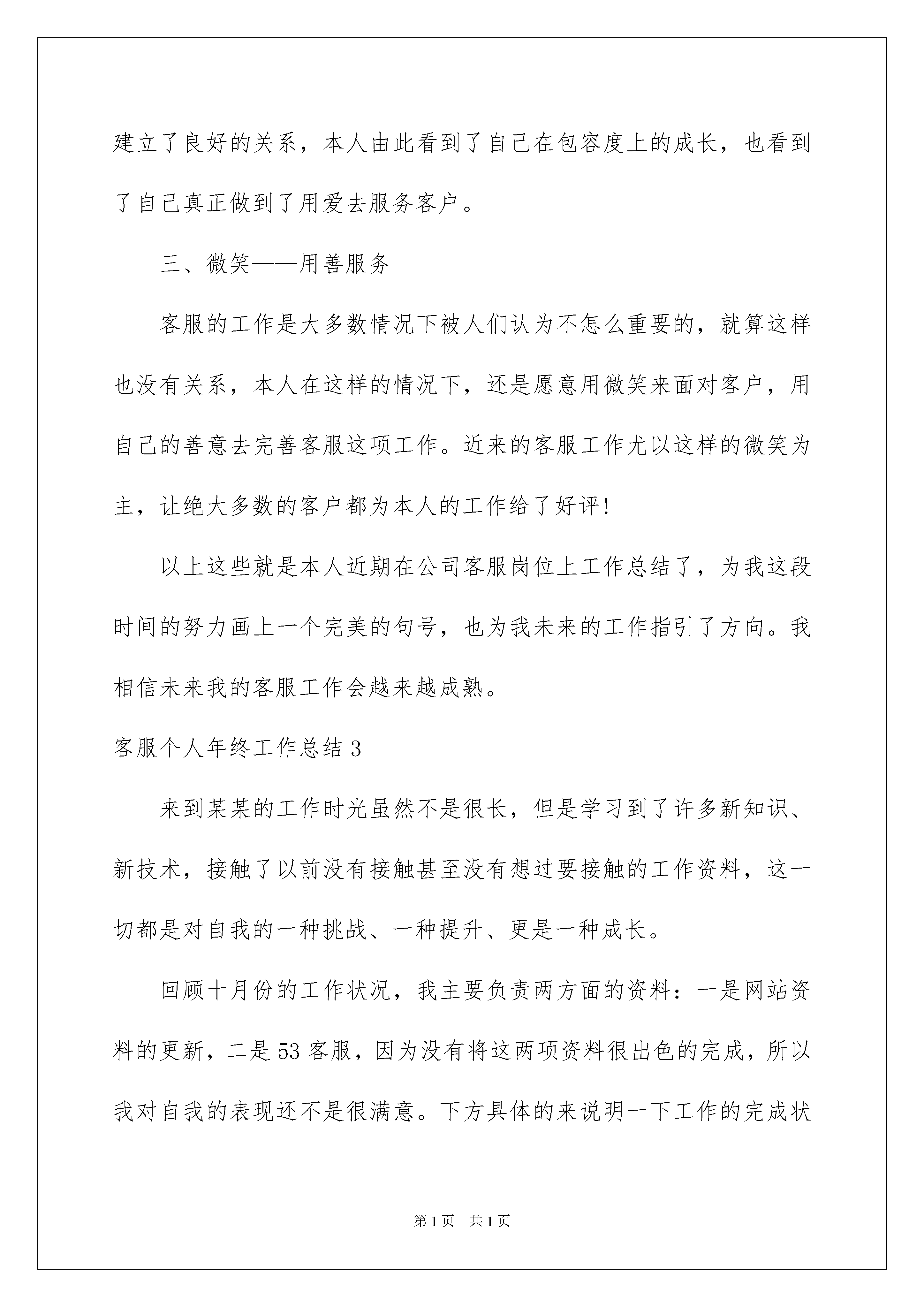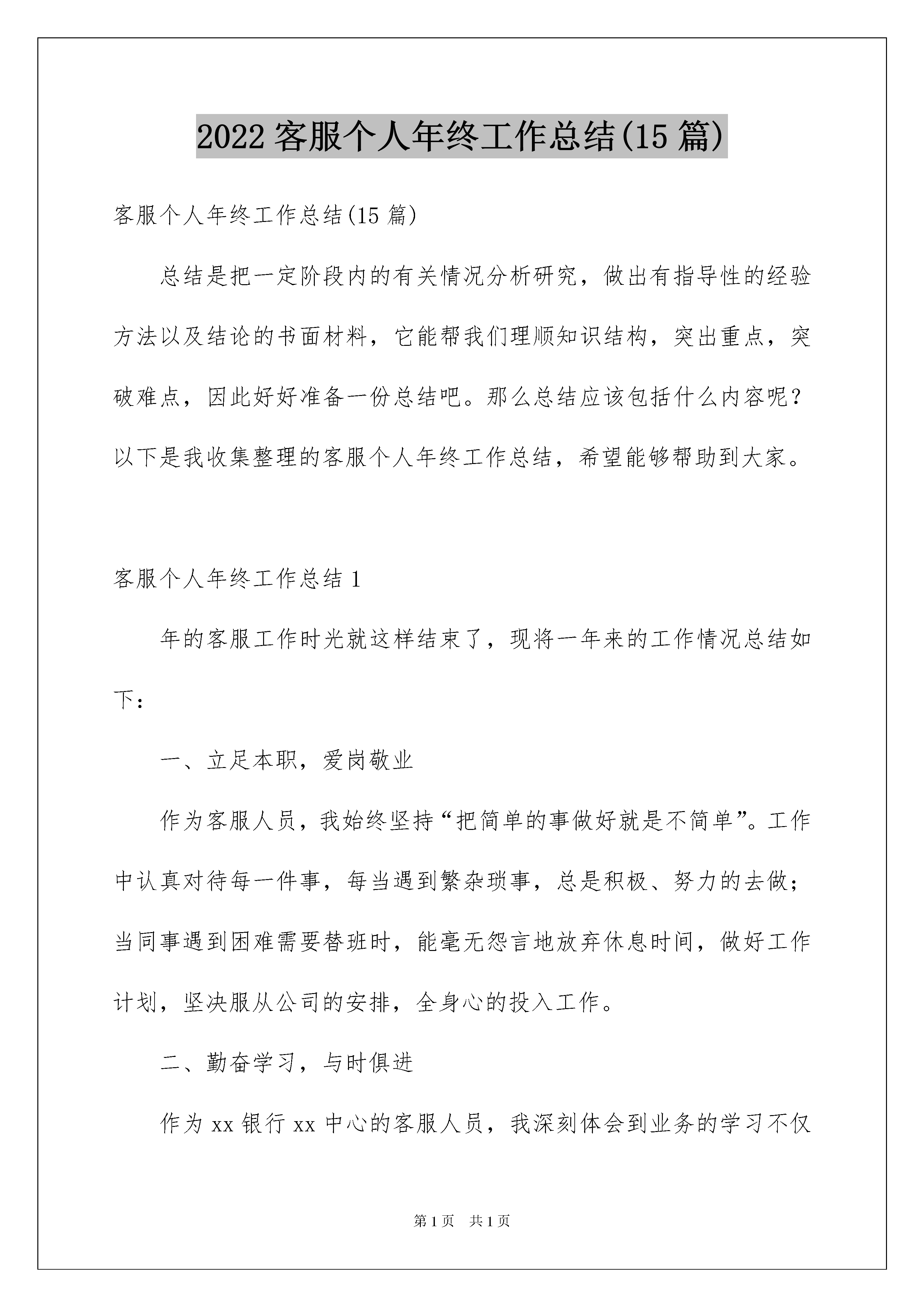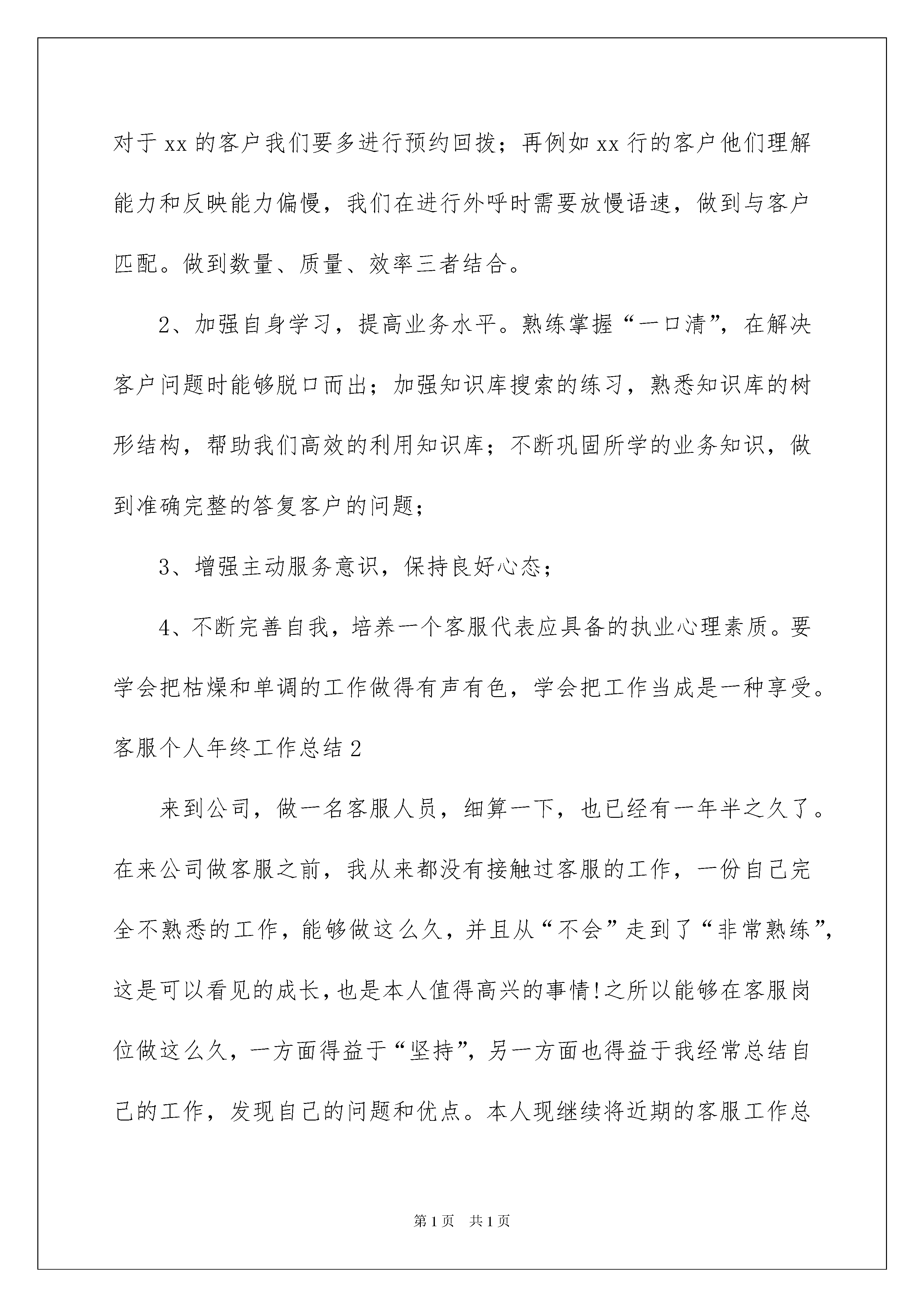2022客服个人年终工作总结(15篇)客服个人年终工作总结(15篇)总结是把一定阶段内的有关情况分析研究,做出有指导性的经验方法以及结论的书面材料,它能帮我们理顺知识结构,突出重点,突破难点,因此好好准备一份总结吧。那么总结应该包括什么内容呢?以下是我收集整理的客服个人年终工作总结,希望能够帮助到大家。客服个人年终工作总结1年的客服工作时光就这样结束了,现将一年来的工作情况总结如下:一、立足本职,爱岗敬业作为客服人员,我始终坚持“把简单的事做好就是不简单”。工作中认真对待每一件事,每当遇到繁杂琐事,总是积极、努力的去做;当同事遇到困难需要替班时,能毫无怨言地放弃休息时间,做好工作计划,坚决服从公司的安排,全身心的投入工作。二、勤奋学习,与时俱进作为xx银行xx中心的客服人员,我深刻体会到业务的学习不仅是任务,而且是一种责任,更是一种境界。这一年以来我坚持勤奋学习,努力提高业务知识,强化思维能力,注重用理论联系实际,用实践来锻炼自己。1、注重理论联系实际。在工作中用理论来指导解决实践,学习目的在于应用,以理论的指导,不断提高了分析问题和解决问题的能力,增强了工作中的原则性、系统性、预见性和创造性;2、注重克服思想上的“惰”性。坚持按制度,按计划进行业务知识的学习。首先不将业务知识的学习视为额外负担,自觉学习更新的业务知识和建行的企业文化;其次是按自己的学习计划,坚持个人自学,发扬“钉子”精神,挤时间学,正确处理工作与学习的矛盾,不因工作忙而忽视学习,不因任务重而放松学习。在今后的工作中,我会努力的继续工作,在工作中保持好和客户之间的关系,用最好的服务来解决客户的困难,让我用最好的服务来化解客户的难题。制定如下计划:1、效完成外呼任务。在进行每天的xxx,学会总结各地方的特点,善于发现各地区客户的生活习惯和性格特征,高效的外呼。例如在进行xx地区的个贷催收时,一般在下午的时间拨打接触率比较高,所以对于xx的客户我们要多进行预约回拨;再例如xx行的客户他们理解能力和反映能力偏慢,我们在进行外呼时需要放慢语速,做到与客户匹配。做到数量、质量、效率三者结合。2、加强自身学习,提高业务水平。熟练掌握“一口清”,在解决客户问题时能够脱口而出;加强知识库搜索的练习,熟悉知识库的树形结构,帮助我们高效的利用知识库;不断巩固所学的业务知识,做到准确完整的答复客户的问题;3、增强主动服务意识,保持良好心态;4、不断完善自我,培养一个客服代表应具备的执业心理素质。要学会把枯燥和单调的工作做得有声有色,学会把工作当成是一种享受。客服个人年终工作总结2来到公司,做一名客服人员,细算一下,也已经有一年半之久了。在来公司做客服之前,我从来都没有接触过客服的工作,一份自己完全不熟悉的工作,能够做这么久,并且从“不会”走到了“非常熟练”,这是可以看见的成长,也是本人值得高兴的事情!之所以能够在客服岗位做这么久,一方面得益于“坚持”,另一方面也得益于我经常总结自己的工作,发现自己的问题和优点。本人现继续将近期的客服工作总结如下:一、尊重——用心服务在客服岗位上工作了一年半载之后,越发感受到“尊重”二字的重要。客服的工作,说白了就是人与人沟通的工作,这也就极其需要人与人的互相尊重才能够做好。在客服岗位上,经常会遇到一些不尊重我们工作的人,但这不是我们客服不尊重对象的理由,做一个合格的客服,那就得时刻都尊重我们服务的对象,哪怕他们不尊重我们,我们也得尊重他们,并把工作做完,因为这是我们的工作。做客服就需要这样尊重客户,用心来服务客户。本人在这一点上一直都做得很好,尤其近来的工作中,本人时常会遇到不尊重我们工作的人,但本人还是做到了尊重对方。二、包容——用爱服务近期的客服工作中,经常会遇到一些无聊打来的电话以及说着听不懂的方言让人不知道怎么展开客服工作的电话,无聊电话还好解决,直接拒绝对方的无事来电就可以了,而那种满口都是听不懂的方言电话就极其考验人的耐性和包容度了。近来在这样的客服工作中,本人慢慢听懂了许多原本完全听不懂的方言,并且在与这些客户的沟通中建立了良好的关系,本人由此看到了自己在包容度上的成长,也看到了自己真正做到了用爱去服务客户。三、微笑——用善服务客服的工作是大多数情况下被人们认为不怎么重要的,就算这样也没有关系,本人在这样的情况下,还是愿意用微笑来面对客户,用自己的善意去完善客服这项工作。近来的客服工作尤以这样的微笑为主,让绝大多数的客户都为本人的工作给了好评!以上这些就是本人近期在公司客服岗位上工作总结了,为我这段时间的努力画上一个完美的句号,也为我未来的工作指引了方向。我相信未来我的客服工作会