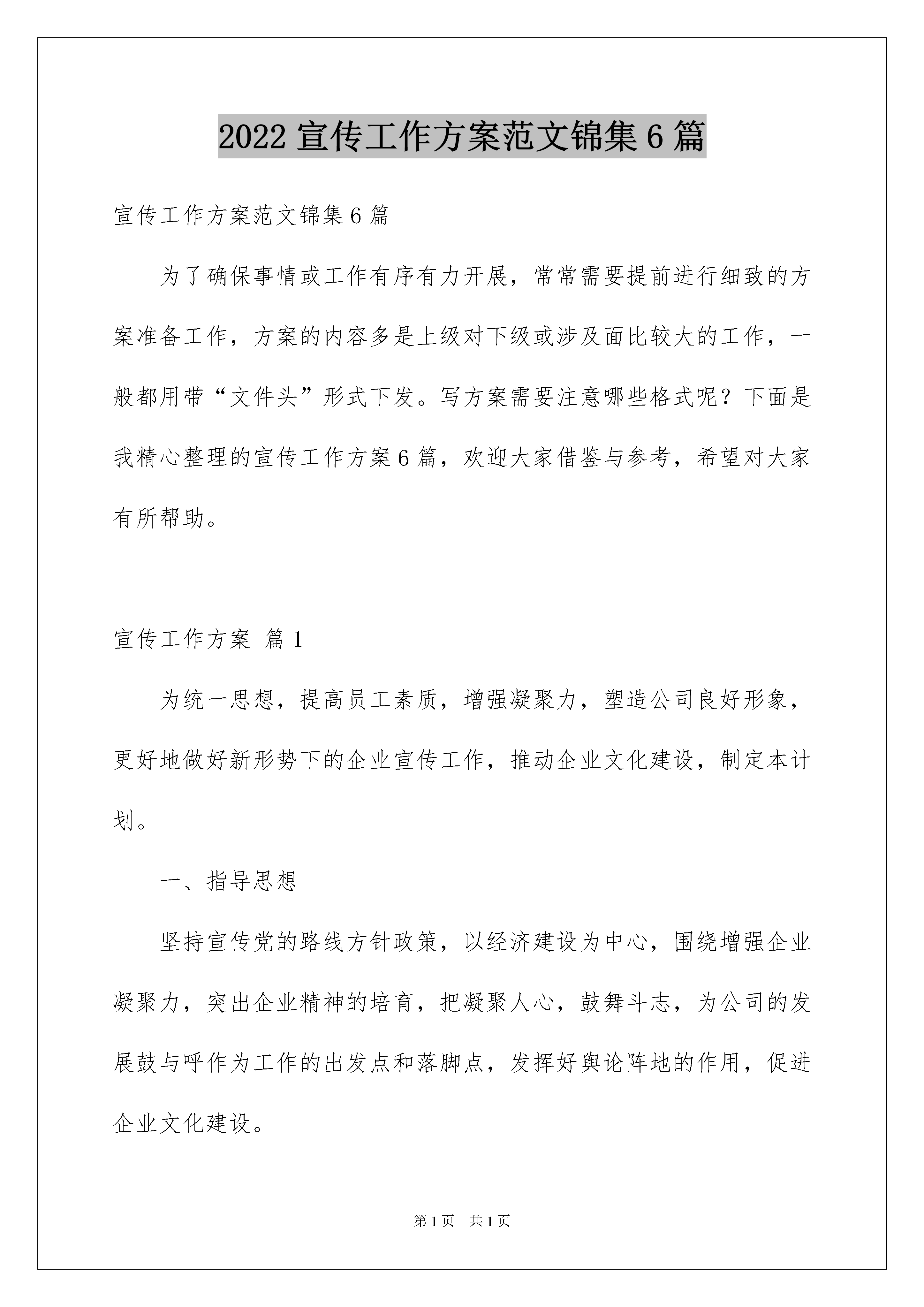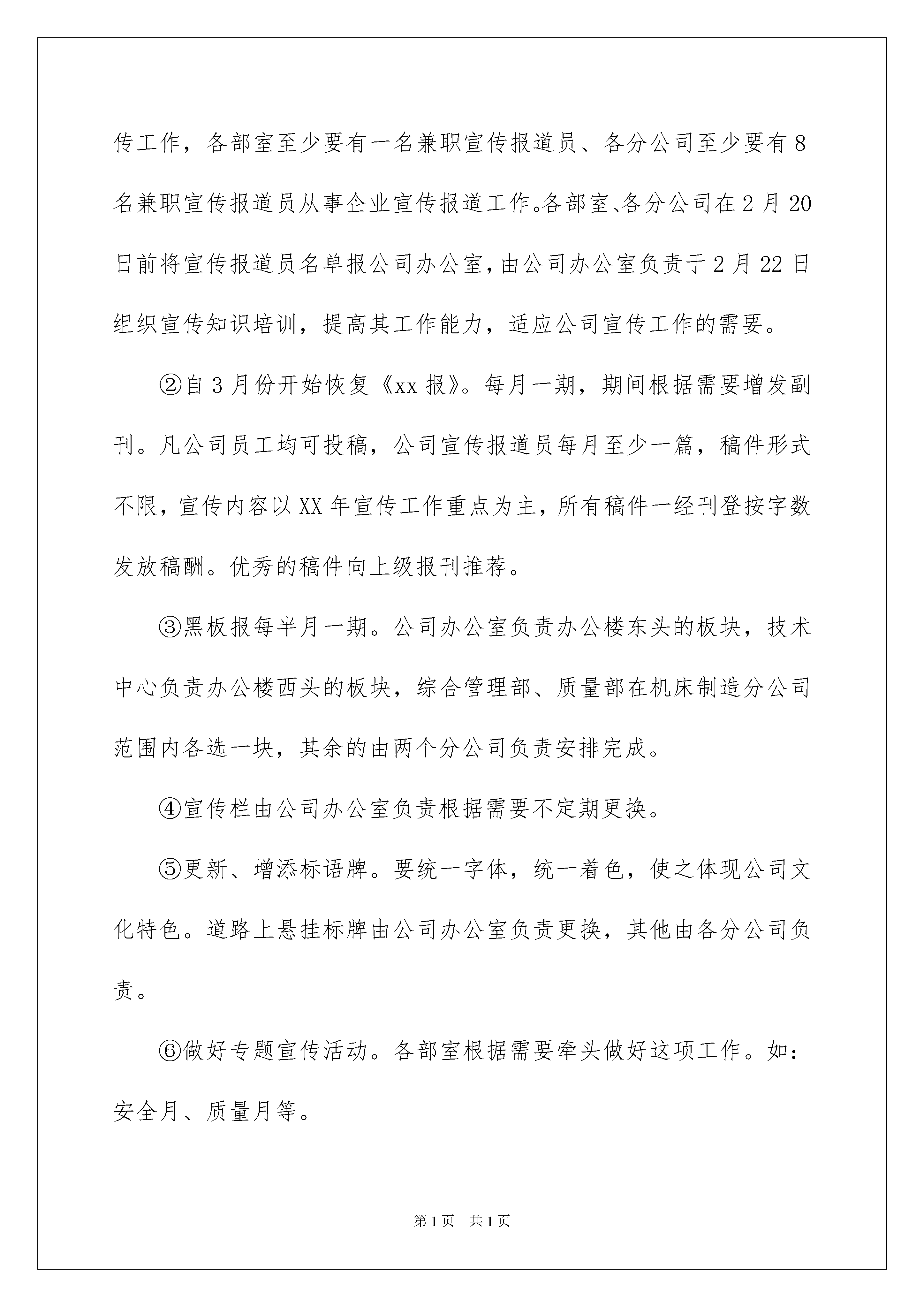 2022宣传工作方案范文锦集6篇宣传工作方案范文锦集6篇为了确保事情或工作有序有力开展,常常需要提前进行细致的方案准备工作,方案的内容多是上级对下级或涉及面比较大的工作,一般都用带“文件头”形式下发。写方案需要注意哪些格式呢?下面是我精心整理的宣传工作方案6篇,欢迎大家借鉴与参考,希望对大家有所帮助。宣传工作方案篇1为统一思想,提高员工素质,增强凝聚力,塑造公司良好形象,更好地做好新形势下的企业宣传工作,推动企业文化建设,制定本计划。一、指导思想坚持宣传党的路线方针政策,以经济建设为中心,围绕增强企业凝聚力,突出企业精神的培育,把凝聚人心,鼓舞斗志,为公司的发展鼓与呼作为工作的出发点和落脚点,发挥好舆论阵地的作用,促进企业文化建设。二、宣传重点1、公司重大经营决策、发展大计、工作举措、新规定、新政策等;2、党的方针政策、国家法律法规;3、先进事迹、典型报道、工作创新、工作经验;4、员工思想动态;5、公司管理上的薄弱环节,存在的问题;6、企业文化宣传。三、具体措施1、端正认识,宣传工作与经济工作并重。宣传工作是教育、激励员工的一种方式,是企业不可缺少的一项工作。“企业要发展、要实现奋斗目标,离不开全体员工的不懈努力,只有进一步加强宣传工作,才能激发起员工的斗志,形成向心力,各项工作才能战无不胜,才能建立起公司特有的企业文化”。因此,要端正认识,把宣传工作作为一件大事来抓好、做好。2、强化措施,把宣传工作落到实处。①建立公司宣传网络,组建一支有战斗力的宣传队伍。公司办公室负责整个公司的宣传工作,各分公司设立一人兼职负责分公司的宣传工作,各部室至少要有一名兼职宣传报道员、各分公司至少要有8名兼职宣传报道员从事企业宣传报道工作。各部室、各分公司在2月20日前将宣传报道员名单报公司办公室,由公司办公室负责于2月22日组织宣传知识培训,提高其工作能力,适应公司宣传工作的需要。②自3月份开始恢复《xx报》。每月一期,期间根据需要增发副刊。凡公司员工均可投稿,公司宣传报道员每月至少一篇,稿件形式不限,宣传内容以XX年宣传工作重点为主,所有稿件一经刊登按字数发放稿酬。优秀的稿件向上级报刊推荐。③黑板报每半月一期。公司办公室负责办公楼东头的板块,技术中心负责办公楼西头的板块,综合管理部、质量部在机床制造分公司范围内各选一块,其余的由两个分公司负责安排完成。④宣传栏由公司办公室负责根据需要不定期更换。⑤更新、增添标语牌。要统一字体,统一着色,使之体现公司文化特色。道路上悬挂标牌由公司办公室负责更换,其他由各分公司负责。⑥做好专题宣传活动。各部室根据需要牵头做好这项工作。如:安全月、质量月等。⑦开展评优树先工作,体现人本精神。开展评选质量标兵、技术能手、劳动竞赛等活动,激发员工的劳动热情,增强员工的团队精神。⑧、群团组织要广泛开展文体娱乐活动,既要轰轰烈烈、扎扎实实,有要讲究实效。⑨、各分公司、部室要开好班前班后会,`⑩加强对外宣传力度,主要是公司形象宣传和产品广告宣传等。人们都说“三分治疗,七分护理”,句话虽然并不十分准确,但却反映了护理工作的重要作用和地位。护士对人民的健康做出了积极贡献,从而受到了社会的尊敬,被誉为“白衣天使”.20xx年这新的一年,我们的护理工作也应该走上新的台阶,一、加强护士在职教育,提高护理人员的综合素质(一)、按护士规范化培训及护士在职继续教育实施方案抓好护士的“三基”及专科技能训练与考核工作1、重点加强对新入院护士、聘用护士、低年资护士的考核,强化她们的学习意识,护理部计划上半年以强化基础护理知识为主,增加考核次数,直至达标。2、加强专科技能的培训:各科制定出周期内专科理论与技能的培训与考核计划,每年组织考试、考核2—3次,理论考试要有试卷并由护士长组织进行闭卷考试,要求讲究实效,不流于形式,为培养专科护士打下扎实的基础。3、基本技能考核:属于规范化培训对象的护士,在年内16项基本技能必须全部达标,考核要求在实际工作中抽考。其他层次的护士计划安排操作考试一次,理论考试二次。4、强化相关知识的学习掌握,组织进行一次规章制度的实际考核,理论考试与临床应用相结合,检查遵章守规的执行情况。(二)、加强人文知识的学习,提高护士的整体素养1、组织学习医院服务礼仪文化,强化护士的现代护理文化意识,先在护士长层次内进行讨论,达成共识后在全院范围内开展提升素养活动,制定训练方案及具体的实施计划。安排全院性的讲座和争取派出去、请进来的方式学习护士社交礼仪及职业服务礼仪。开展护士礼仪竞赛活动,利用“5.12”护士节期间掀起学礼仪、讲素养的活动月,组织寓教寓乐的节日晚会。(三)、更新专业