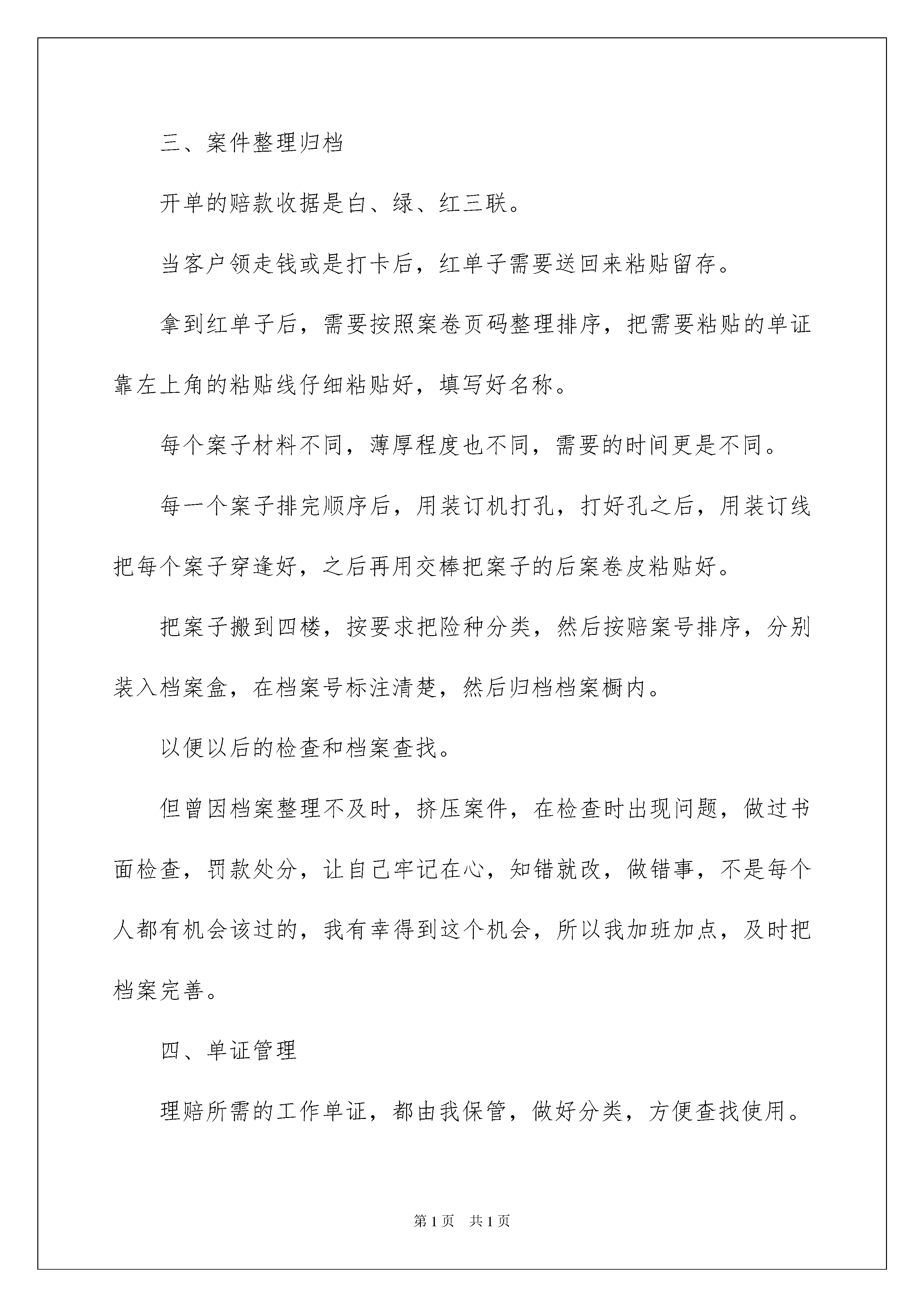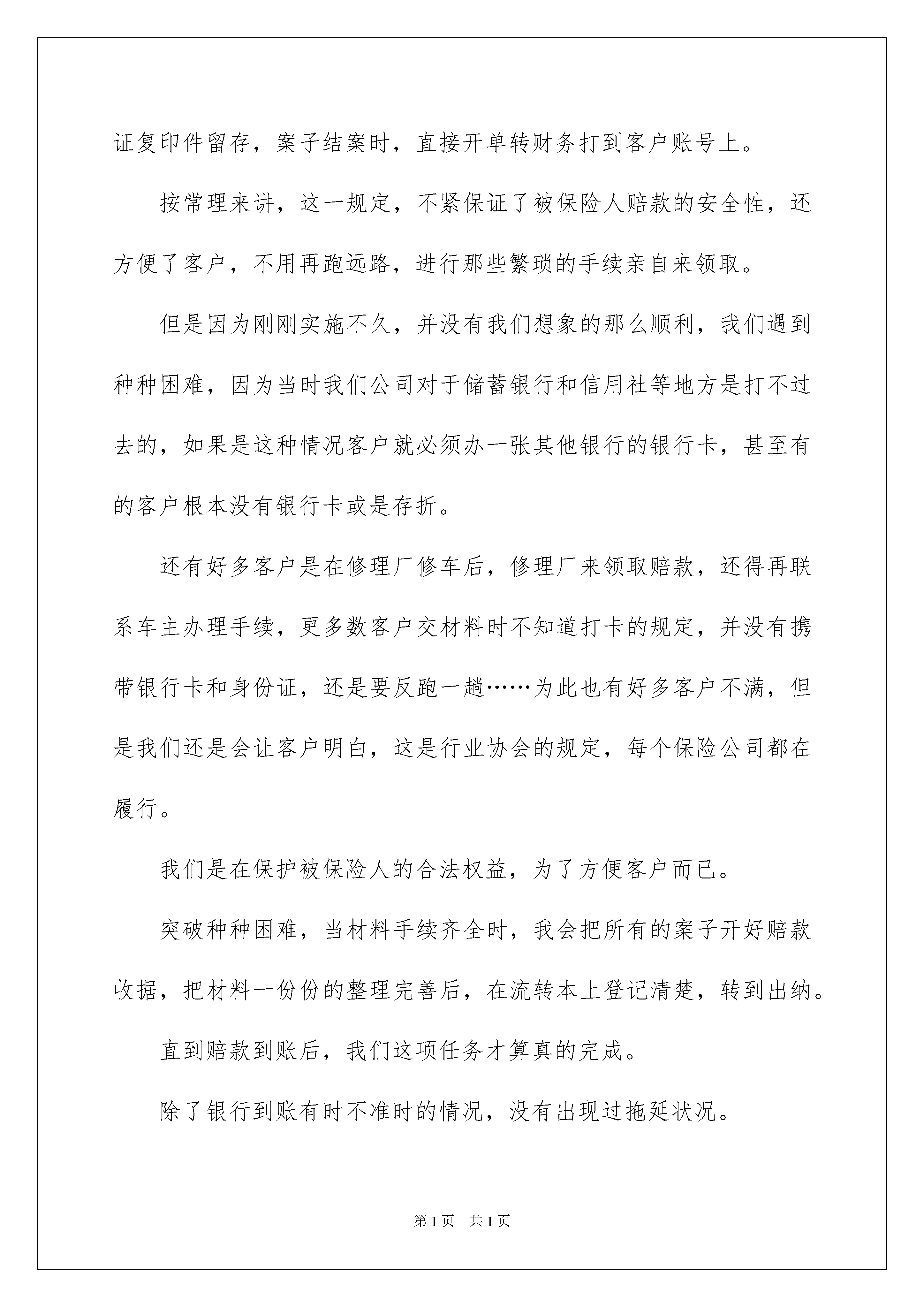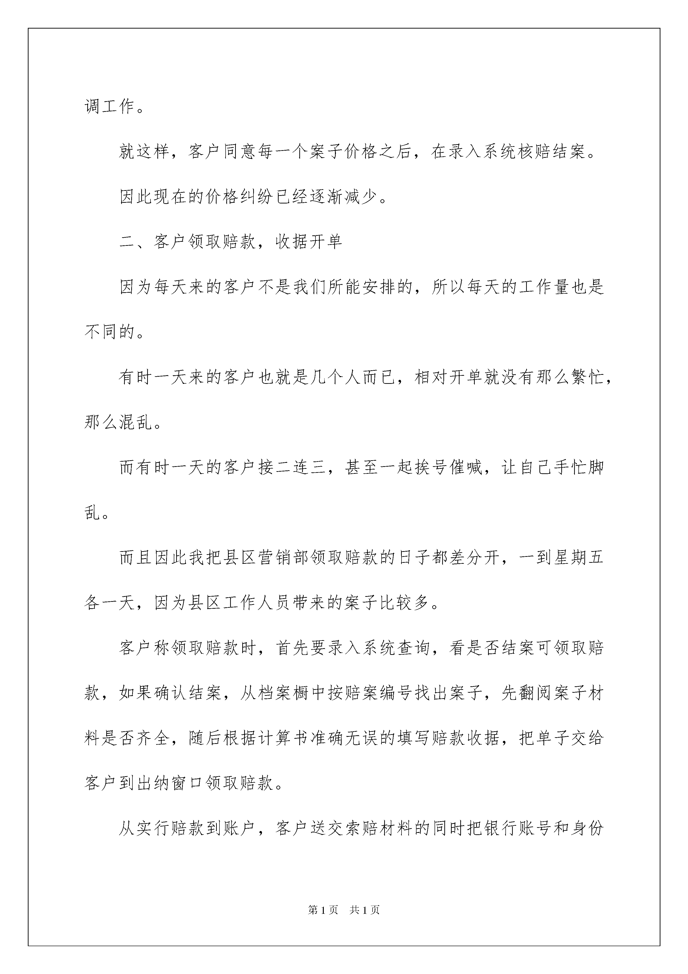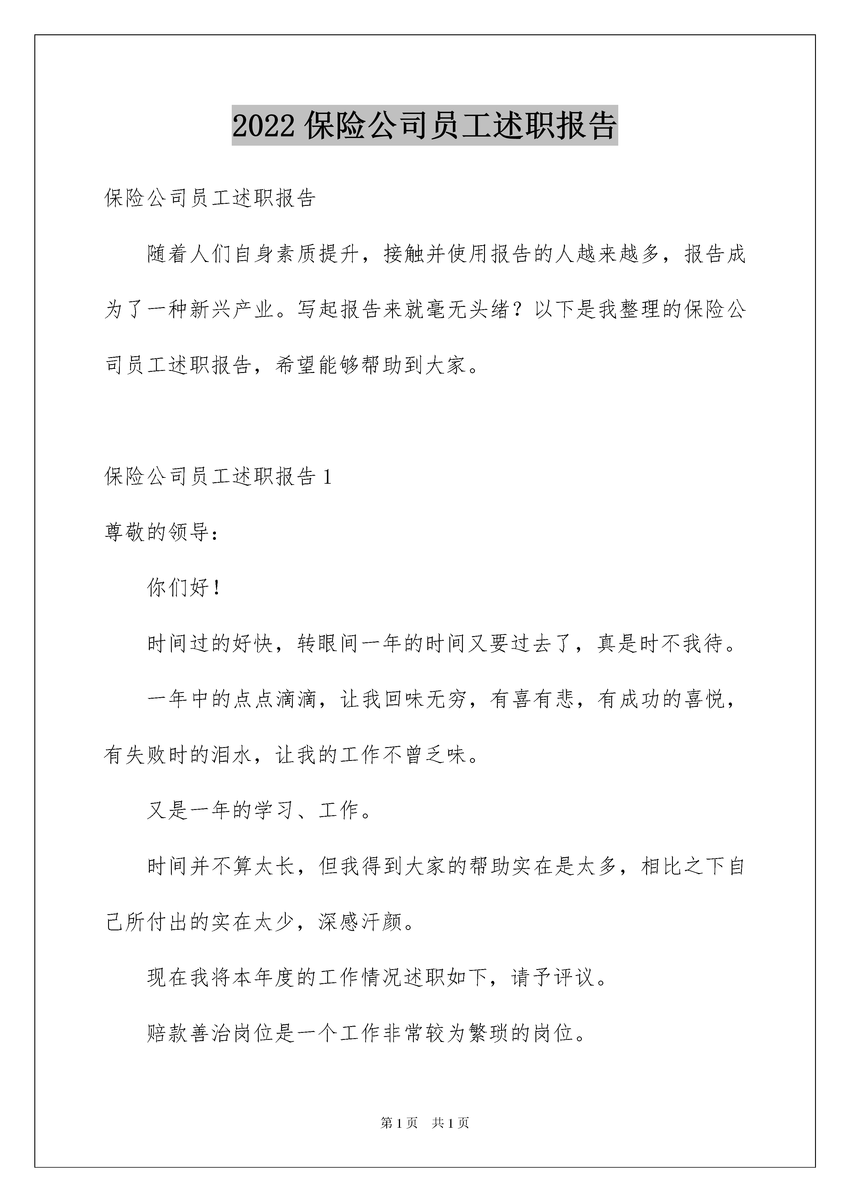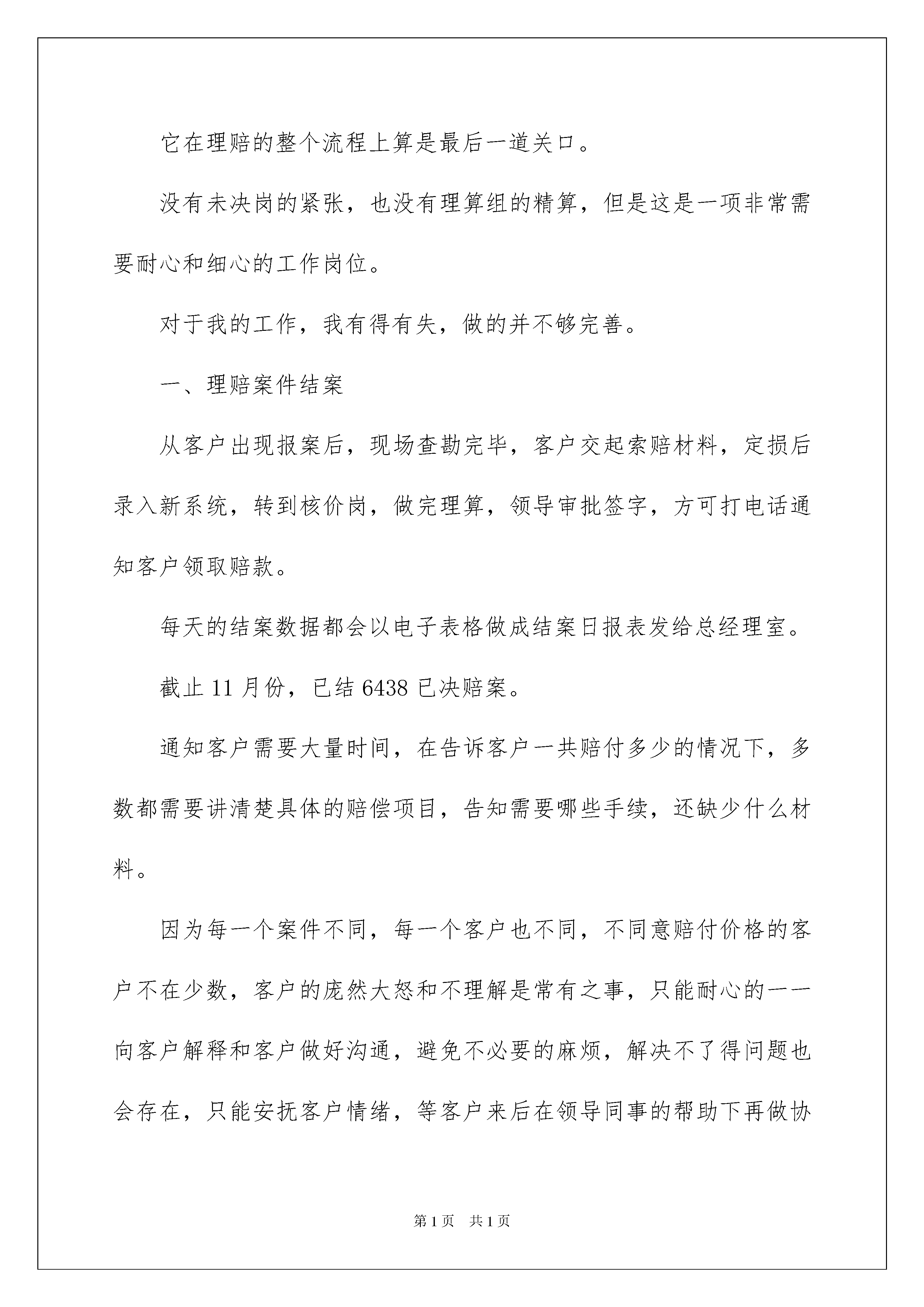 2022保险公司员工述职报告保险公司员工述职报告随着人们自身素质提升,接触并使用报告的人越来越多,报告成为了一种新兴产业。写起报告来就毫无头绪?以下是我整理的保险公司员工述职报告,希望能够帮助到大家。保险公司员工述职报告1尊敬的领导:你们好!时间过的好快,转眼间一年的时间又要过去了,真是时不我待。一年中的点点滴滴,让我回味无穷,有喜有悲,有成功的喜悦,有失败时的泪水,让我的工作不曾乏味。又是一年的学习、工作。时间并不算太长,但我得到大家的帮助实在是太多,相比之下自己所付出的实在太少,深感汗颜。现在我将本年度的工作情况述职如下,请予评议。赔款善治岗位是一个工作非常较为繁琐的岗位。它在理赔的整个流程上算是最后一道关口。没有未决岗的紧张,也没有理算组的精算,但是这是一项非常需要耐心和细心的工作岗位。对于我的工作,我有得有失,做的并不够完善。一、理赔案件结案从客户出现报案后,现场查勘完毕,客户交起索赔材料,定损后录入新系统,转到核价岗,做完理算,领导审批签字,方可打电话通知客户领取赔款。每天的结案数据都会以电子表格做成结案日报表发给总经理室。截止11月份,已结6438已决赔案。通知客户需要大量时间,在告诉客户一共赔付多少的情况下,多数都需要讲清楚具体的赔偿项目,告知需要哪些手续,还缺少什么材料。因为每一个案件不同,每一个客户也不同,不同意赔付价格的客户不在少数,客户的庞然大怒和不理解是常有之事,只能耐心的一一向客户解释和客户做好沟通,避免不必要的麻烦,解决不了得问题也会存在,只能安抚客户情绪,等客户来后在领导同事的帮助下再做协调工作。就这样,客户同意每一个案子价格之后,在录入系统核赔结案。因此现在的价格纠纷已经逐渐减少。二、客户领取赔款,收据开单因为每天来的客户不是我们所能安排的,所以每天的工作量也是不同的。有时一天来的客户也就是几个人而已,相对开单就没有那么繁忙,那么混乱。而有时一天的客户接二连三,甚至一起挨号催喊,让自己手忙脚乱。而且因此我把县区营销部领取赔款的日子都差分开,一到星期五各一天,因为县区工作人员带来的案子比较多。客户称领取赔款时,首先要录入系统查询,看是否结案可领取赔款,如果确认结案,从档案橱中按赔案编号找出案子,先翻阅案子材料是否齐全,随后根据计算书准确无误的填写赔款收据,把单子交给客户到出纳窗口领取赔款。从实行赔款到账户,客户送交索赔材料的同时把银行账号和身份证复印件留存,案子结案时,直接开单转财务打到客户账号上。按常理来讲,这一规定,不紧保证了被保险人赔款的安全性,还方便了客户,不用再跑远路,进行那些繁琐的手续亲自来领取。但是因为刚刚实施不久,并没有我们想象的那么顺利,我们遇到种种困难,因为当时我们公司对于储蓄银行和信用社等地方是打不过去的,如果是这种情况客户就必须办一张其他银行的银行卡,甚至有的客户根本没有银行卡或是存折。还有好多客户是在修理厂修车后,修理厂来领取赔款,还得再联系车主办理手续,更多数客户交材料时不知道打卡的规定,并没有携带银行卡和身份证,还是要反跑一趟……为此也有好多客户不满,但是我们还是会让客户明白,这是行业协会的规定,每个保险公司都在履行。我们是在保护被保险人的合法权益,为了方便客户而已。突破种种困难,当材料手续齐全时,我会把所有的案子开好赔款收据,把材料一份份的整理完善后,在流转本上登记清楚,转到出纳。直到赔款到账后,我们这项任务才算真的完成。除了银行到账有时不准时的情况,没有出现过拖延状况。三、案件整理归档开单的赔款收据是白、绿、红三联。当客户领走钱或是打卡后,红单子需要送回来粘贴留存。拿到红单子后,需要按照案卷页码整理排序,把需要粘贴的单证靠左上角的粘贴线仔细粘贴好,填写好名称。每个案子材料不同,薄厚程度也不同,需要的时间更是不同。每一个案子排完顺序后,用装订机打孔,打好孔之后,用装订线把每个案子穿逢好,之后再用交棒把案子的后案卷皮粘贴好。把案子搬到四楼,按要求把险种分类,然后按赔案号排序,分别装入档案盒,在档案号标注清楚,然后归档档案橱内。以便以后的检查和档案查找。但曾因档案整理不及时,挤压案件,在检查时出现问题,做过书面检查,罚款处分,让自己牢记在心,知错就改,做错事,不是每个人都有机会该过的,我有幸得到这个机会,所以我加班加点,及时把档案完善。四、单证管理理赔所需的工作单证,都由我保管,做好分类,方便查找使用。做好登记工作,县区公司和定损中心领取时做好详细数据记录,没有出现过任何错误。每个人的工作都不会那么的单一,除了自己的本职工作外,物品申请和保管,理赔资产的登记和使用情况,都由我负责。简简单单的事情,也是锻炼我细心负责