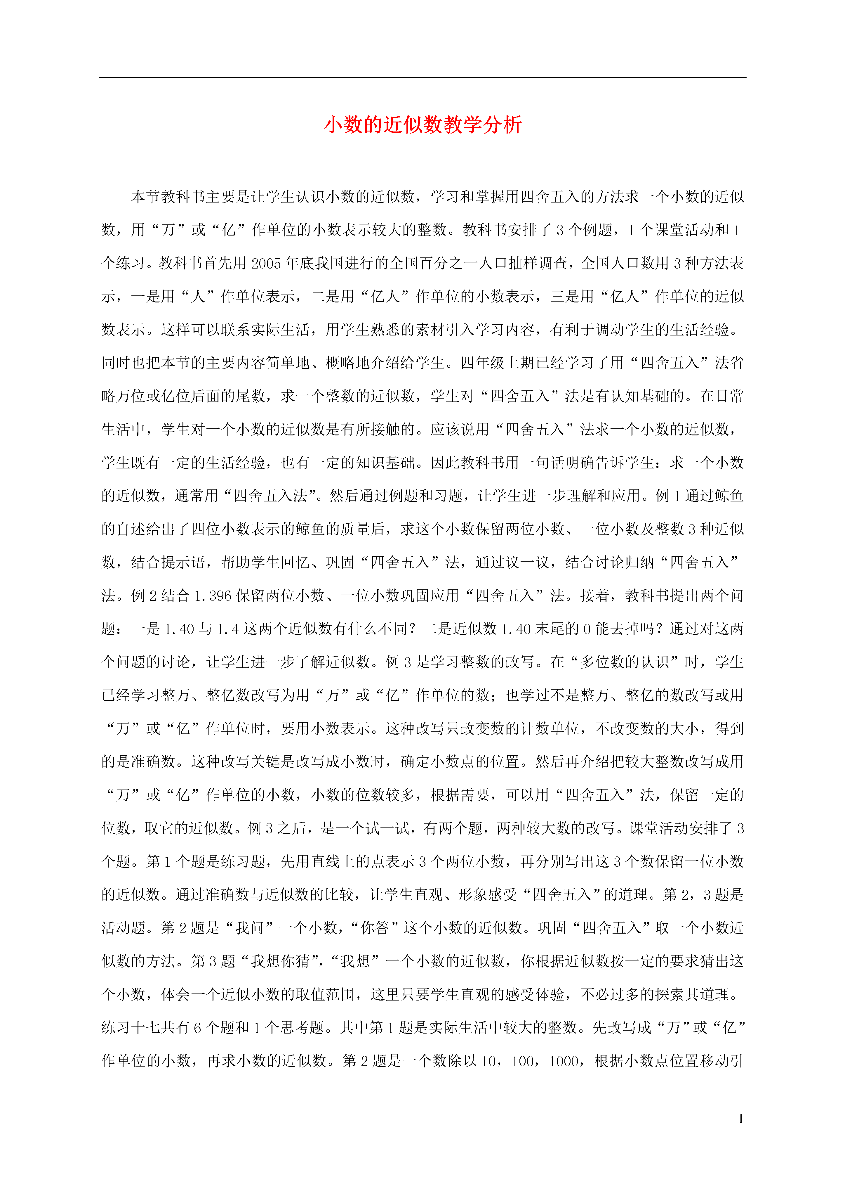 1小数的近似数教学分析本节教科书主要是让学生认识小数的近似数,学习和掌握用四舍五入的方法求一个小数的近似数,用“万”或“亿”作单位的小数表示较大的整数。教科书安排了3个例题,1个课堂活动和1个练习。教科书首先用2005年底我国进行的全国百分之一人口抽样调查,全国人口数用3种方法表示,一是用“人”作单位表示,二是用“亿人”作单位的小数表示,三是用“亿人”作单位的近似数表示。这样可以联系实际生活,用学生熟悉的素材引入学习内容,有利于调动学生的生活经验。同时也把本节的主要内容简单地、概略地介绍给学生。四年级上期已经学习了用“四舍五入”法省略万位或亿位后面的尾数,求一个整数的近似数,学生对“四舍五入”法是有认知基础的。在日常生活中,学生对一个小数的近似数是有所接触的。应该说用“四舍五入”法求一个小数的近似数,学生既有一定的生活经验,也有一定的知识基础。因此教科书用一句话明确告诉学生:求一个小数的近似数,通常用“四舍五入法”。然后通过例题和习题,让学生进一步理解和应用。例1通过鲸鱼的自述给出了四位小数表示的鲸鱼的质量后,求这个小数保留两位小数、一位小数及整数3种近似数,结合提示语,帮助学生回忆、巩固“四舍五入”法,通过议一议,结合讨论归纳“四舍五入”法。例2结合1.396保留两位小数、一位小数巩固应用“四舍五入”法。接着,教科书提出两个问题:一是1.40与1.4这两个近似数有什么不同?二是近似数1.40末尾的0能去掉吗?通过对这两个问题的讨论,让学生进一步了解近似数。例3是学习整数的改写。在“多位数的认识”时,学生已经学习整万、整亿数改写为用“万”或“亿”作单位的数;也学过不是整万、整亿的数改写或用“万”或“亿”作单位时,要用小数表示。这种改写只改变数的计数单位,不改变数的大小,得到的是准确数。这种改写关键是改写成小数时,确定小数点的位置。然后再介绍把较大整数改写成用“万”或“亿”作单位的小数,小数的位数较多,根据需要,可以用“四舍五入”法,保留一定的位数,取它的近似数。例3之后,是一个试一试,有两个题,两种较大数的改写。课堂活动安排了3个题。第1个题是练习题,先用直线上的点表示3个两位小数,再分别写出这3个数保留一位小数的近似数。通过准确数与近似数的比较,让学生直观、形象感受“四舍五入”的道理。第2,3题是活动题。第2题是“我问”一个小数,“你答”这个小数的近似数。巩固“四舍五入”取一个小数近似数的方法。第3题“我想你猜”,“我想”一个小数的近似数,你根据近似数按一定的要求猜出这个小数,体会一个近似小数的取值范围,这里只要学生直观的感受体验,不必过多的探索其道理。练习十七共有6个题和1个思考题。其中第1题是实际生活中较大的整数。先改写成“万”或“亿”作单位的小数,再求小数的近似数。第2题是一个数除以10,100,1000,根据小数点位置移动引起小数大小变化的知识,用小数表示各式的得数,再将每个得数保留一位小数。第3题是“数学医院”,通过判断并改错,巩固用“四舍五入”的方法,求一个小数的近似数。第4题是较大整数,先改写再求近似数。第5题有一定的思考性和灵活性,其中有4组题,每组题都有两个要求:一个要求是“□<3.17<□”填出与已知小数最接近的小于和大于已知小数的两个整数;另一个要求是3.17≈□保留整数的近似数。第6题是用“万亿元”作单位的数表示2006年的国民生产总值。由于这个数很大,超过“万亿”,故加一个星号。思考题是研究根据一个近似数求出符合要求的三位小数中最大的一个与最小的一个,近似数为4.30的三位小数中,“最大”的千分位要“四舍”,即4.304;最小要从“五入”方面思考,千分位为5,百分位为9,十分位为2,即4.295,由于此题有较大的难度,教学时要注意引导。