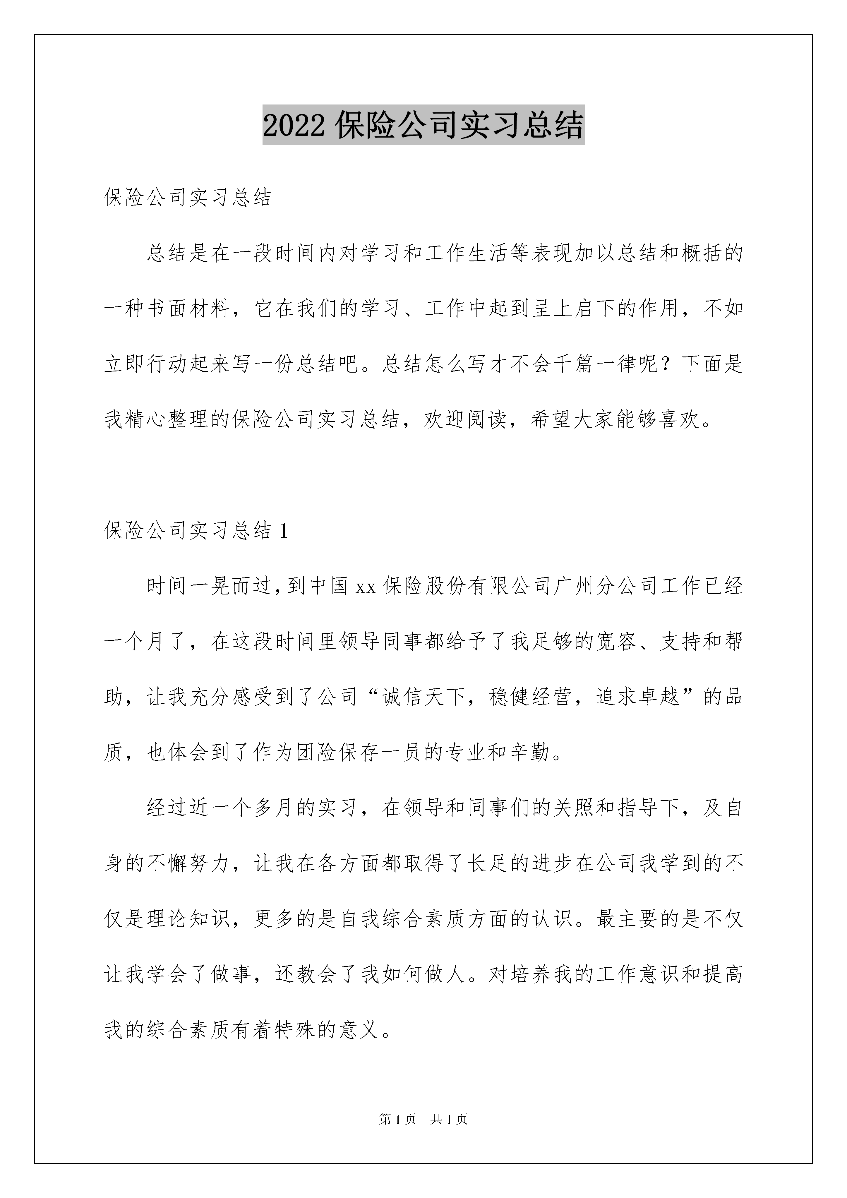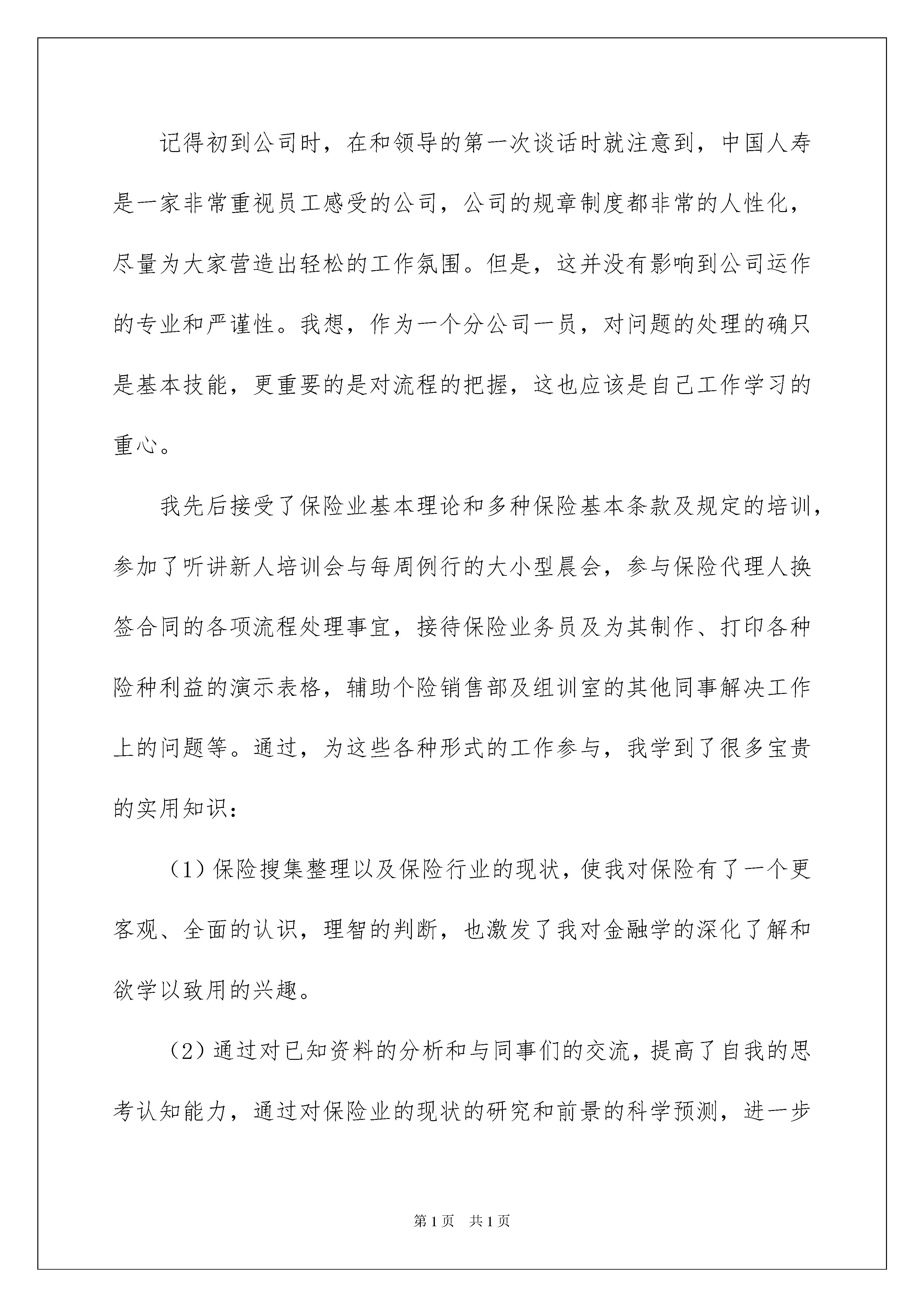 2022保险公司实习总结保险公司实习总结总结是在一段时间内对学习和工作生活等表现加以总结和概括的一种书面材料,它在我们的学习、工作中起到呈上启下的作用,不如立即行动起来写一份总结吧。总结怎么写才不会千篇一律呢?下面是我精心整理的保险公司实习总结,欢迎阅读,希望大家能够喜欢。保险公司实习总结1时间一晃而过,到中国xx保险股份有限公司广州分公司工作已经一个月了,在这段时间里领导同事都给予了我足够的宽容、支持和帮助,让我充分感受到了公司“诚信天下,稳健经营,追求卓越”的品质,也体会到了作为团险保存一员的专业和辛勤。经过近一个多月的实习,在领导和同事们的关照和指导下,及自身的不懈努力,让我在各方面都取得了长足的进步在公司我学到的不仅是理论知识,更多的是自我综合素质方面的认识。最主要的是不仅让我学会了做事,还教会了我如何做人。对培养我的工作意识和提高我的综合素质有着特殊的意义。记得初到公司时,在和领导的第一次谈话时就注意到,中国人寿是一家非常重视员工感受的公司,公司的规章制度都非常的人性化,尽量为大家营造出轻松的工作氛围。但是,这并没有影响到公司运作的专业和严谨性。我想,作为一个分公司一员,对问题的处理的确只是基本技能,更重要的是对流程的把握,这也应该是自己工作学习的重心。我先后接受了保险业基本理论和多种保险基本条款及规定的培训,参加了听讲新人培训会与每周例行的大小型晨会,参与保险代理人换签合同的各项流程处理事宜,接待保险业务员及为其制作、打印各种险种利益的演示表格,辅助个险销售部及组训室的其他同事解决工作上的问题等。通过,为这些各种形式的工作参与,我学到了很多宝贵的实用知识:(1)保险搜集整理以及保险行业的现状,使我对保险有了一个更客观、全面的认识,理智的判断,也激发了我对金融学的深化了解和欲学以致用的兴趣。(2)通过对已知资料的分析和与同事们的交流,提高了自我的思考认知能力,通过对保险业的现状的研究和前景的科学预测,进一步引发了我对职业取向的思虑。(3)对职场有了初步、真实、贴切的认识,明确了努力和改善,通过与同事们和众多的业务员的交往、接触,学到了珍贵的人际交往技巧和处世经验,交到了几位可以虚心请教的长辈朋友,感谢他们对我的指导、教育和思想启迪。(4)电脑办公的实用知识与软件应用技巧,以及处理问题的能力和经验,强化了我对知料搜集整理和提高能力的学习欲望。(5)勤奋、踏实、认真、负责任做事风格的重要性,只有这样,才能得到认可,才能真正有所收获。以上是我的个人实习报告,当然,以我个人之见也发现了一些小的问题,如保险代理人考核制度不够健全,保险业务员职业素质参差不齐,出勤制度不够完善,分工不定期不够明确等需要改善。这次实践教会了我许多,不仅让我扩展了知识视野,增长了社会见识,而且为我大学毕业后走向社会打下了坚实基础,是我青春时期的一笔重要财富,使我终生受益。最后由衷的感谢公司,给了我这么好的一次机会,感谢在我实习期间所有帮助过我、教导过我的人!保险公司实习总结2光阴似箭,一眨眼自己将要迈入大三了,在今年的暑假,为了检验自己的理论知识,找到自己在学习中的不足和缺陷,更为了能够锻炼一下自己,提前体验一下工作的艰辛,我去了中国人民财产保险股份有限公司余姚分公司实习在保险公司实习了一个月,实习的工作看似很简单,但却很辛苦,前半个月我的工作主要是在公司里负责整理文件和看一些历史合同以及流程,后半个月则是跟随指导老师出去跑业务学知识。在外面日晒雨淋的,每个潜在的客户都要去拉,很忙。甚至有的时候都顾不上吃饭和午休。虽然工作很辛苦很劳累,但是我学到了很多在学校里学不到的东西,学校能教你的只是书本的知识,但是具体应用到实践中还是有很多的区别,要把一个工作做好,仅仅只有知识并不足够,还需要耐力,毅力,信心,甚至微笑等等。一个月下来,我的感触很深,深深了解到了以下这些“生活知识”1。作为一个新人,手脚要勤快点,端茶倒水扫地拖地之类的活是少不了的。2。为尽快适应环境,要做到多思考多问,不懂就要问!"旧人"还是挺乐意回答的。3。不要骄傲自大,目中无人,一些事情即使你会也要低调点,不然会很难融进职场原有圈子的。4。证书只是进入职场的敲门砖,如果你拿到了某个证书但不会应用证书所包含某个学科的知识也是没用的。胸中还须有点"墨水",没有真才实学,做起本职工作来也会力不从心啊!像English,过了四六级不会就又能怎样,英语本来就是一门语言,你得会说,对外人也得敢说,不然人家还不是一样看不起你:还是大学生呢,口语都还说不出来!我在公司时就曾今遇到一个外国人来咨询,但是我的英语水平很差,所以基本上就不知道说什么。5。英