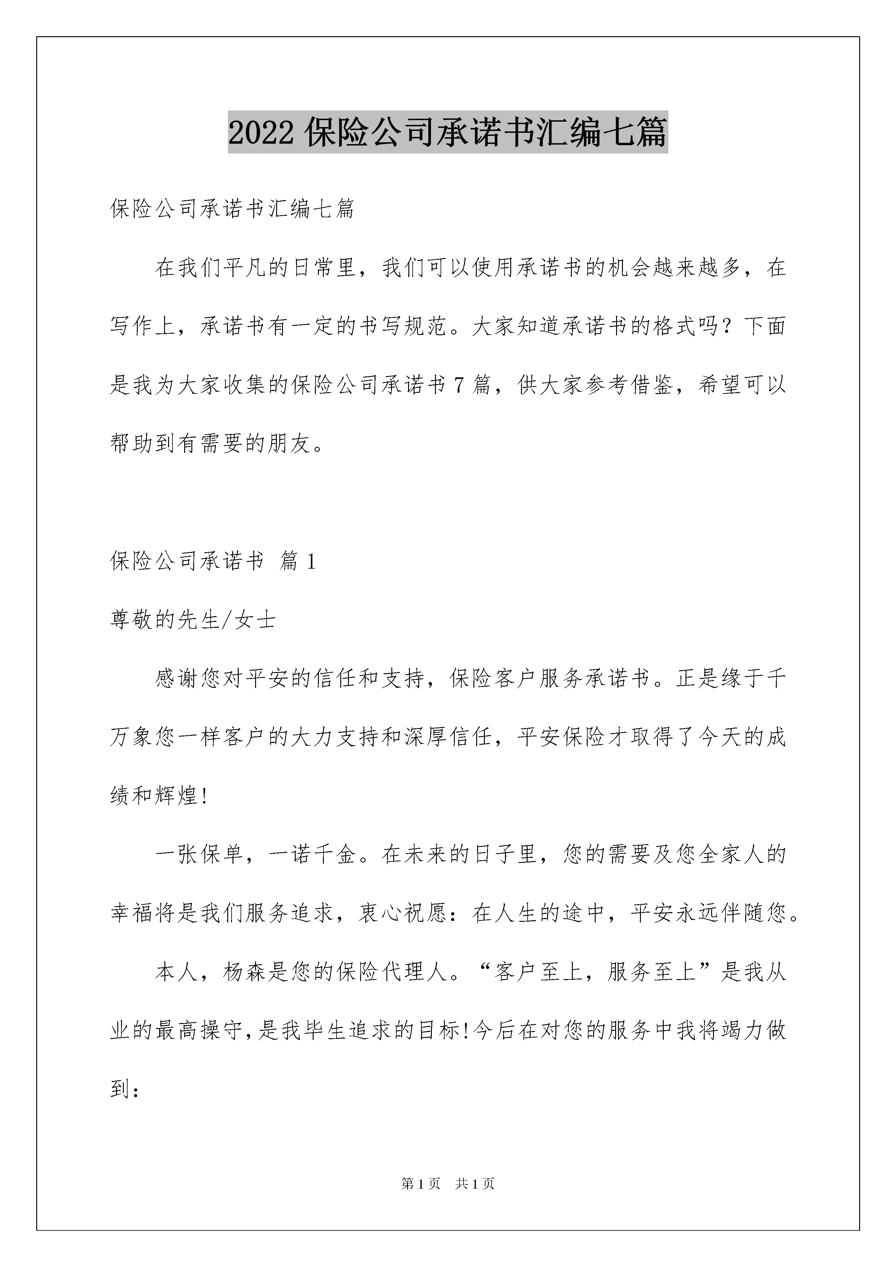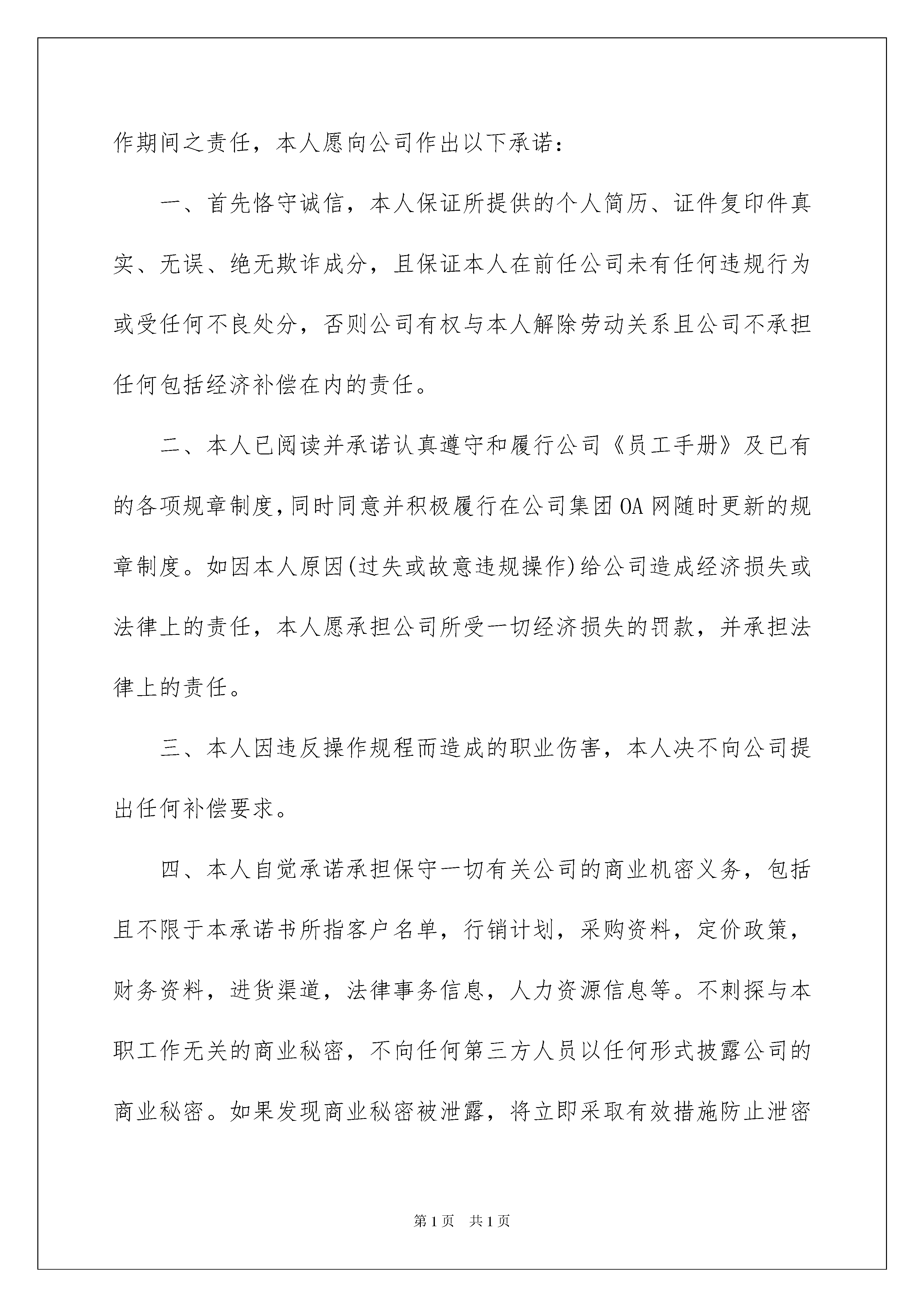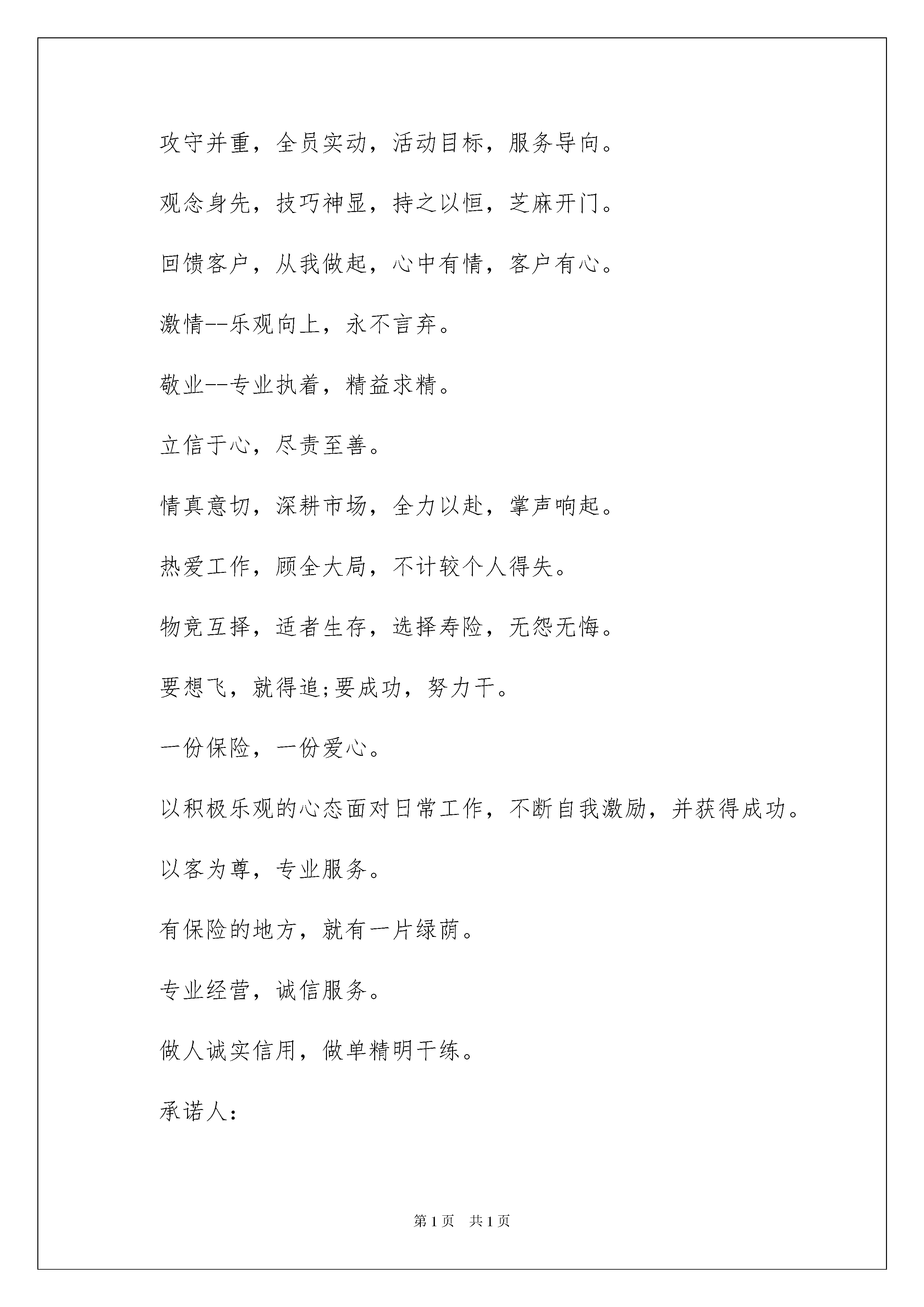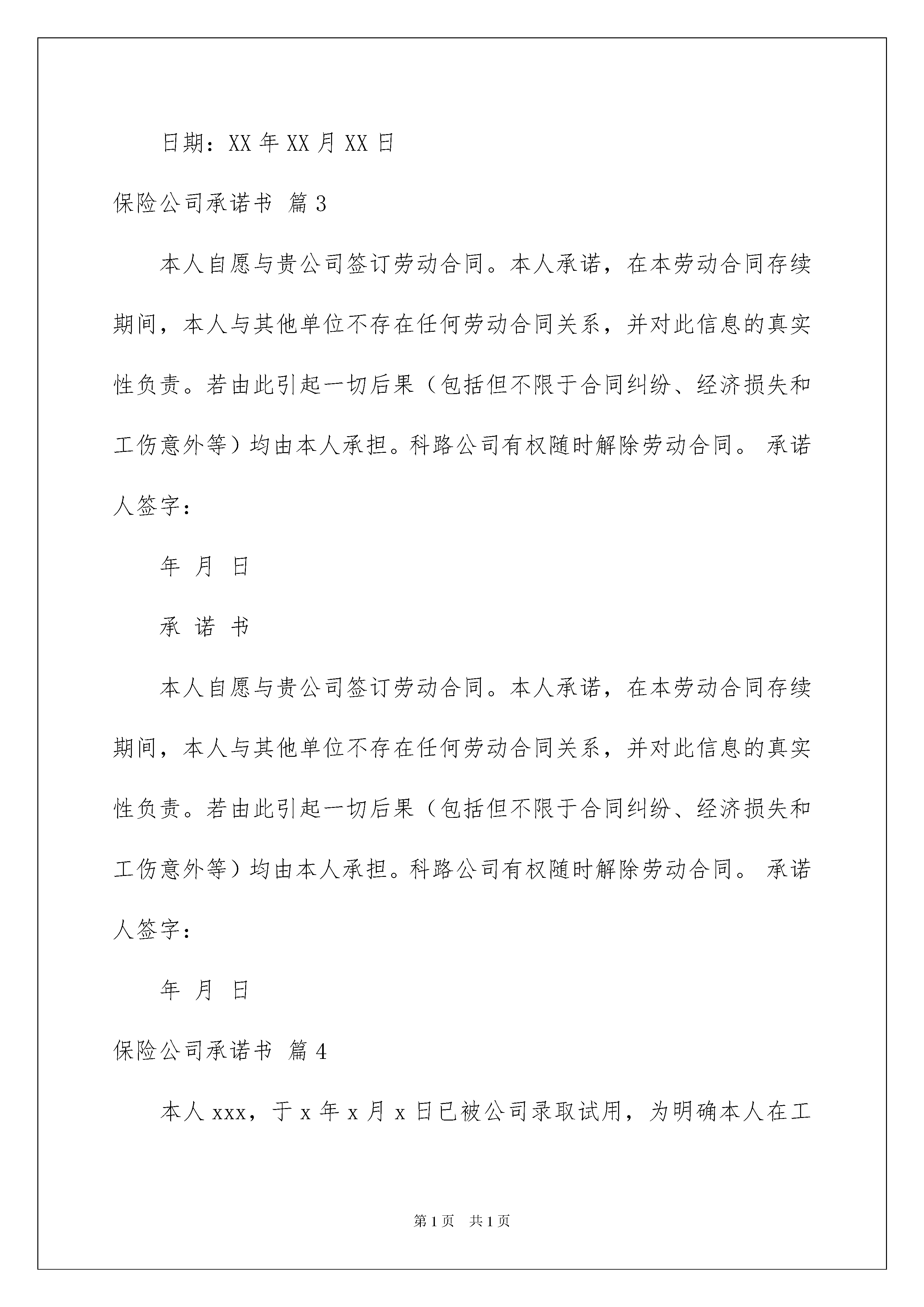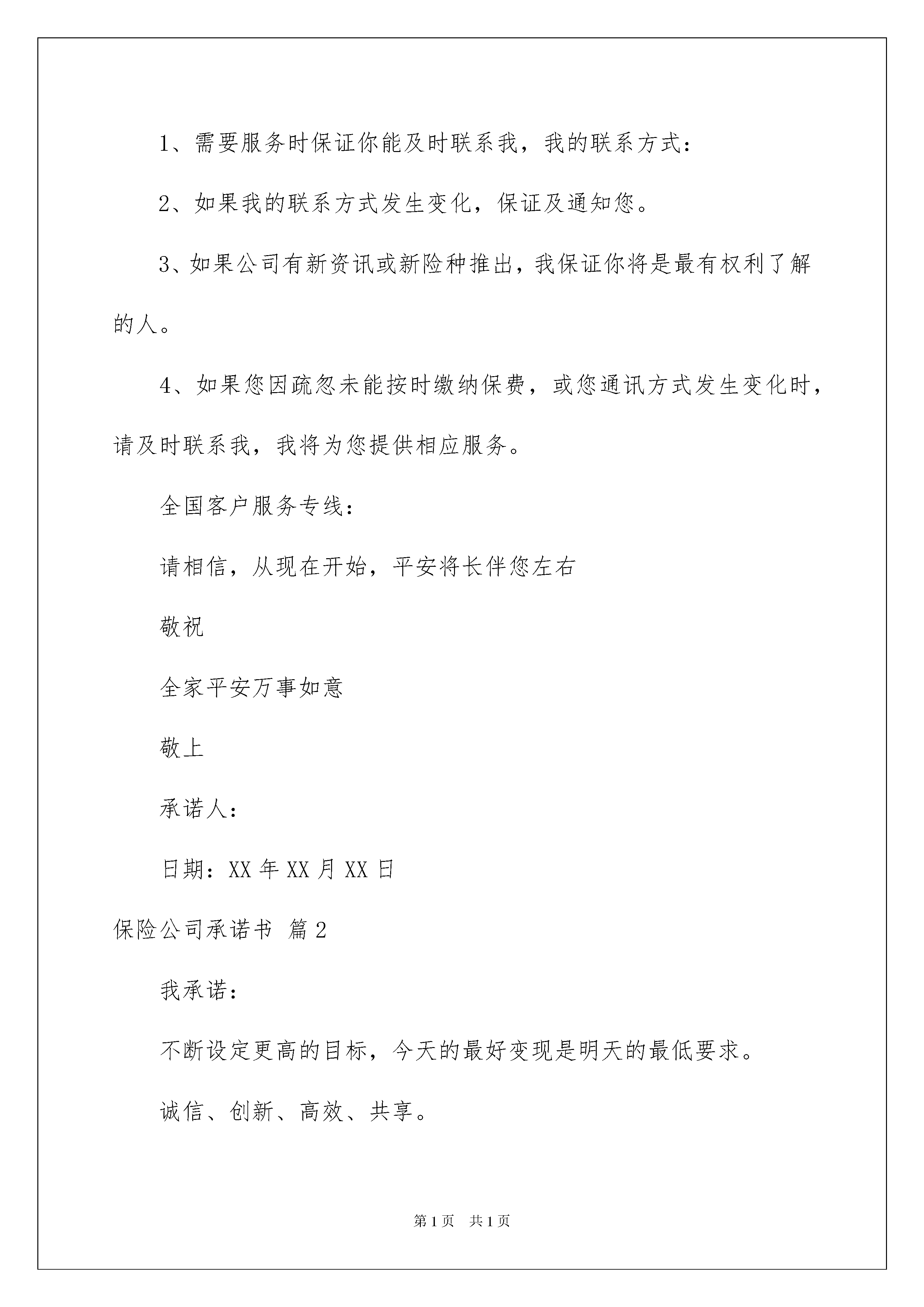 2022保险公司承诺书汇编七篇保险公司承诺书汇编七篇在我们平凡的日常里,我们可以使用承诺书的机会越来越多,在写作上,承诺书有一定的书写规范。大家知道承诺书的格式吗?下面是我为大家收集的保险公司承诺书7篇,供大家参考借鉴,希望可以帮助到有需要的朋友。保险公司承诺书篇1尊敬的先生/女士感谢您对平安的信任和支持,保险客户服务承诺书。正是缘于千万象您一样客户的大力支持和深厚信任,平安保险才取得了今天的成绩和辉煌!一张保单,一诺千金。在未来的日子里,您的需要及您全家人的幸福将是我们服务追求,衷心祝愿:在人生的途中,平安永远伴随您。本人,杨森是您的保险代理人。“客户至上,服务至上”是我从业的最高操守,是我毕生追求的目标!今后在对您的服务中我将竭力做到:1、需要服务时保证你能及时联系我,我的联系方式:2、如果我的联系方式发生变化,保证及通知您。3、如果公司有新资讯或新险种推出,我保证你将是最有权利了解的人。4、如果您因疏忽未能按时缴纳保费,或您通讯方式发生变化时,请及时联系我,我将为您提供相应服务。全国客户服务专线:请相信,从现在开始,平安将长伴您左右敬祝全家平安万事如意敬上承诺人:日期:XX年XX月XX日保险公司承诺书篇2我承诺:不断设定更高的目标,今天的最好变现是明天的最低要求。诚信、创新、高效、共享。攻守并重,全员实动,活动目标,服务导向。观念身先,技巧神显,持之以恒,芝麻开门。回馈客户,从我做起,心中有情,客户有心。激情--乐观向上,永不言弃。敬业--专业执着,精益求精。立信于心,尽责至善。情真意切,深耕市场,全力以赴,掌声响起。热爱工作,顾全大局,不计较个人得失。物竞互择,适者生存,选择寿险,无怨无悔。要想飞,就得追;要成功,努力干。一份保险,一份爱心。以积极乐观的心态面对日常工作,不断自我激励,并获得成功。以客为尊,专业服务。有保险的地方,就有一片绿荫。专业经营,诚信服务。做人诚实信用,做单精明干练。承诺人:日期:XX年XX月XX日保险公司承诺书篇3本人自愿与贵公司签订劳动合同。本人承诺,在本劳动合同存续期间,本人与其他单位不存在任何劳动合同关系,并对此信息的真实性负责。若由此引起一切后果(包括但不限于合同纠纷、经济损失和工伤意外等)均由本人承担。科路公司有权随时解除劳动合同。承诺人签字:年月日承诺书本人自愿与贵公司签订劳动合同。本人承诺,在本劳动合同存续期间,本人与其他单位不存在任何劳动合同关系,并对此信息的真实性负责。若由此引起一切后果(包括但不限于合同纠纷、经济损失和工伤意外等)均由本人承担。科路公司有权随时解除劳动合同。承诺人签字:年月日保险公司承诺书篇4本人xxx,于x年x月x日已被公司录取试用,为明确本人在工作期间之责任,本人愿向公司作出以下承诺:一、首先恪守诚信,本人保证所提供的个人简历、证件复印件真实、无误、绝无欺诈成分,且保证本人在前任公司未有任何违规行为或受任何不良处分,否则公司有权与本人解除劳动关系且公司不承担任何包括经济补偿在内的责任。二、本人已阅读并承诺认真遵守和履行公司《员工手册》及已有的各项规章制度,同时同意并积极履行在公司集团OA网随时更新的规章制度。如因本人原因(过失或故意违规操作)给公司造成经济损失或法律上的责任,本人愿承担公司所受一切经济损失的罚款,并承担法律上的责任。三、本人因违反操作规程而造成的职业伤害,本人决不向公司提出任何补偿要求。四、本人自觉承诺承担保守一切有关公司的商业机密义务,包括且不限于本承诺书所指客户名单,行销计划,采购资料,定价政策,财务资料,进货渠道,法律事务信息,人力资源信息等。不刺探与本职工作无关的商业秘密,不向任何第三方人员以任何形式披露公司的商业秘密。如果发现商业秘密被泄露,将立即采取有效措施防止泄密进一步扩大,并及时向贵公司报告真实情况;如果因本人故意和过失泄密,则本人愿意承当因泄密而导致的一切经济损失。五、未经公司同意,本人保证不在外单位兼任或任职,不设立含本人股份在内的公司,不直接、间接或变相经营与公司相同的业务,否则应赔偿给公司造成的损失,同时公司有权与本人解除劳动关系。六、本人保证不损害公司利益,不利用职务之便,不虚报报销费用。七、在职期间,若发生与本人业务相关的经济问题,本人愿接受公司财务部及综合办公室的调查。八、若因某种原因离开公司,本人保证提前一个月以书面形式通知公司,且在离职前将本职工作完整地交接清楚,退交领用物品、结清借支款等。若未经批准而擅自离职,公司可以要求本人按试用期工资三倍赔偿,并追究担保人的连带责任。九、若被公司证明或认为不符合用人条件,本人同意公司对我进行调岗、调薪直至解除劳