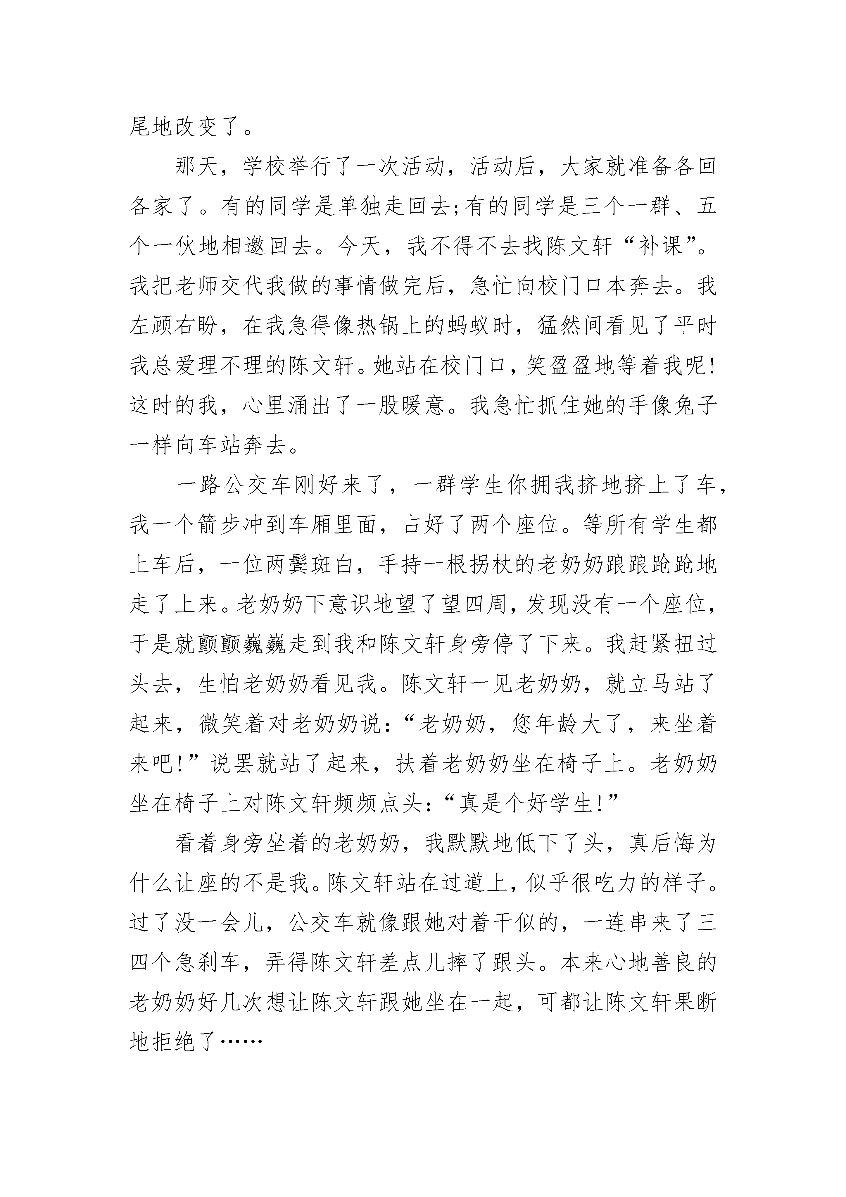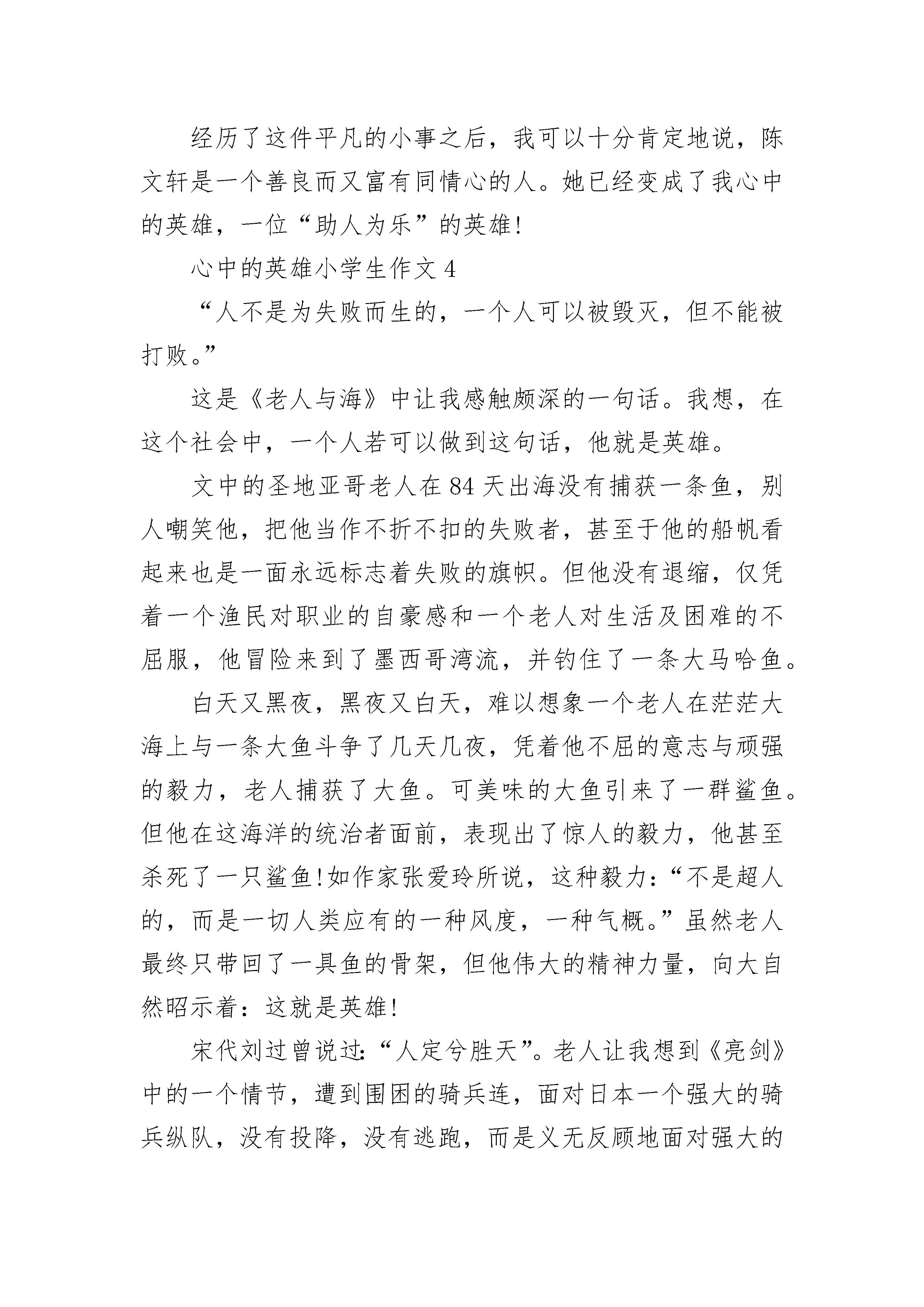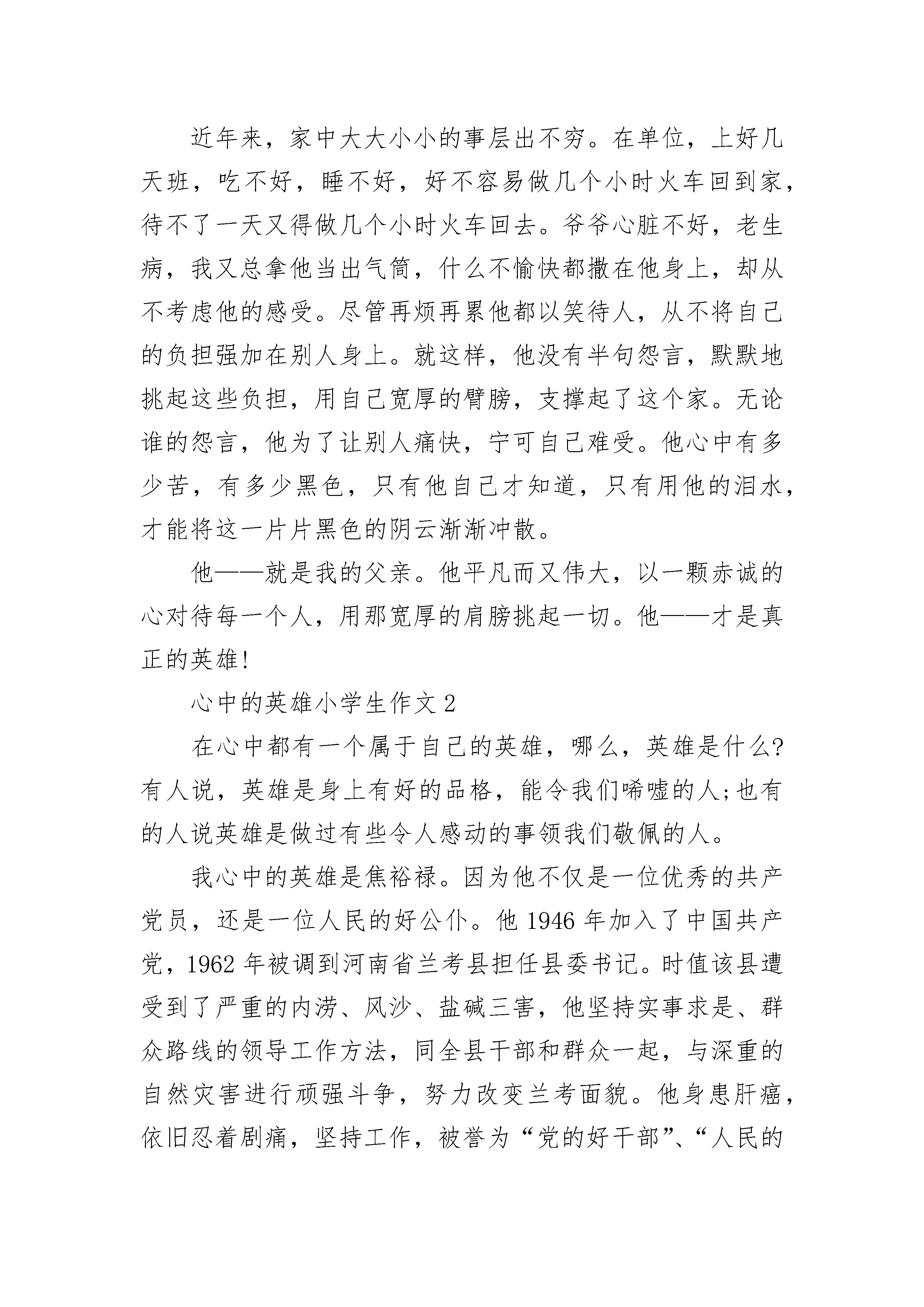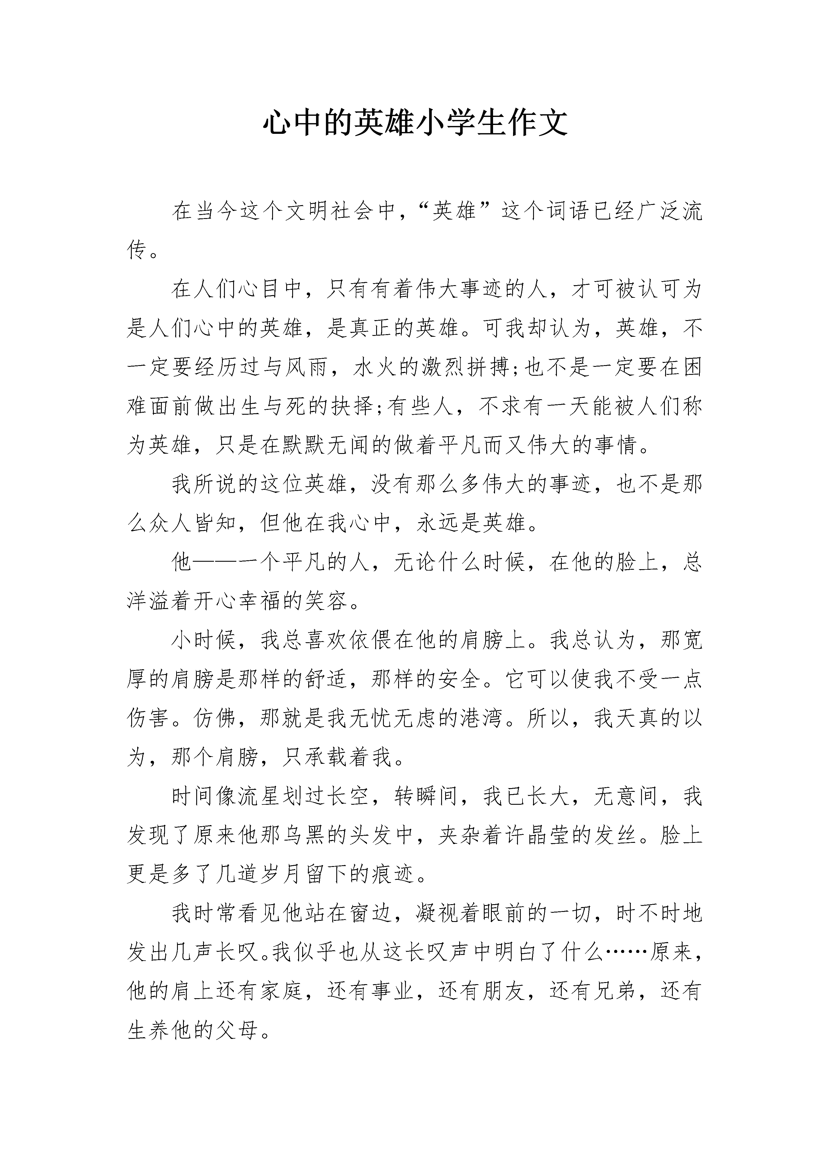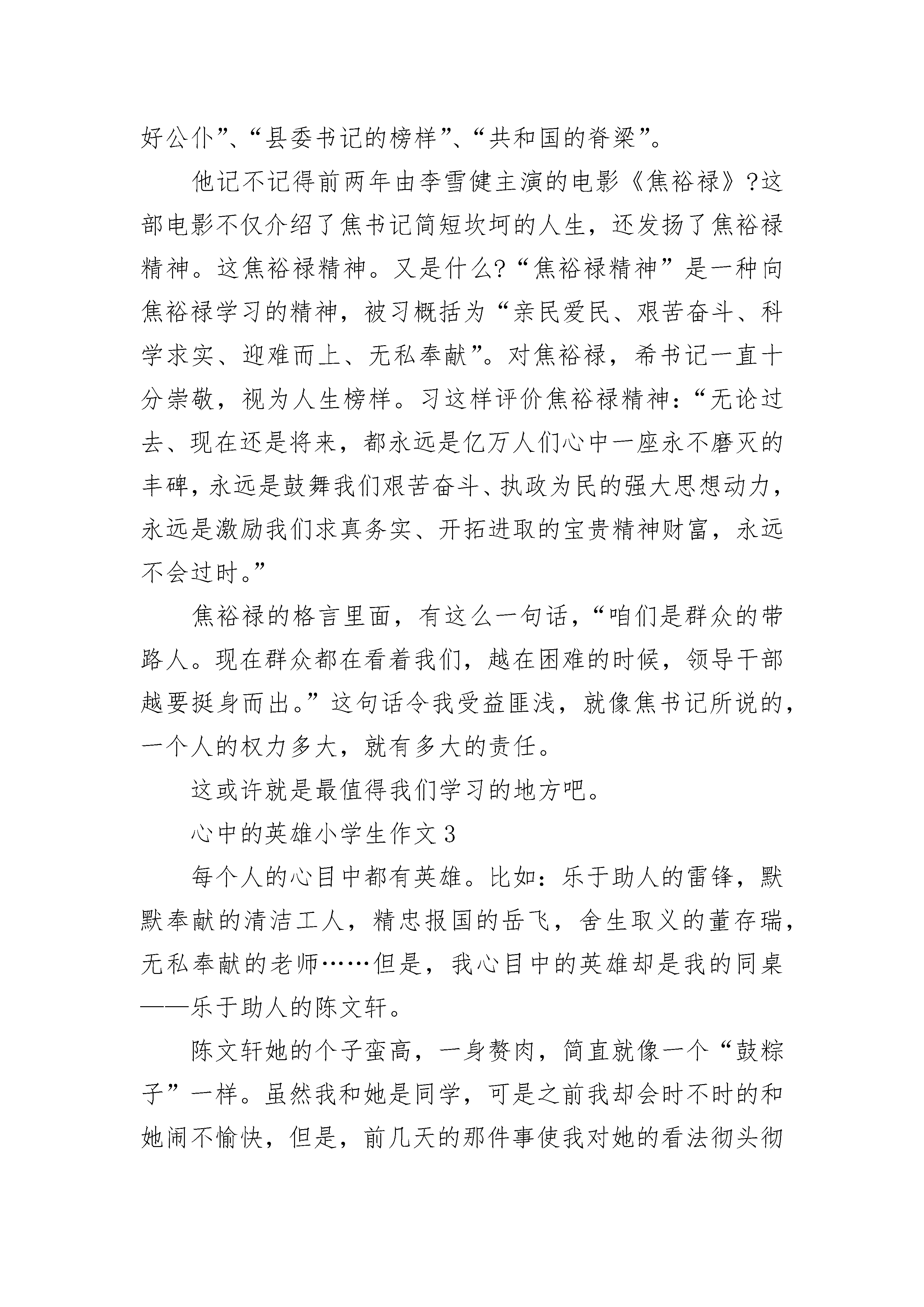 心中的英雄小学生作文在当今这个文明社会中,“英雄”这个词语已经广泛流传。在人们心目中,只有有着伟大事迹的人,才可被认可为是人们心中的英雄,是真正的英雄。可我却认为,英雄,不一定要经历过与风雨,水火的激烈拼搏;也不是一定要在困难面前做出生与死的抉择;有些人,不求有一天能被人们称为英雄,只是在默默无闻的做着平凡而又伟大的事情。我所说的这位英雄,没有那么多伟大的事迹,也不是那么众人皆知,但他在我心中,永远是英雄。他——一个平凡的人,无论什么时候,在他的脸上,总洋溢着开心幸福的笑容。小时候,我总喜欢依偎在他的肩膀上。我总认为,那宽厚的肩膀是那样的舒适,那样的安全。它可以使我不受一点伤害。仿佛,那就是我无忧无虑的港湾。所以,我天真的以为,那个肩膀,只承载着我。时间像流星划过长空,转瞬间,我已长大,无意间,我发现了原来他那乌黑的头发中,夹杂着许晶莹的发丝。脸上更是多了几道岁月留下的痕迹。我时常看见他站在窗边,凝视着眼前的一切,时不时地发出几声长叹。我似乎也从这长叹声中明白了什么……原来,他的肩上还有家庭,还有事业,还有朋友,还有兄弟,还有生养他的父母。近年来,家中大大小小的事层出不穷。在单位,上好几天班,吃不好,睡不好,好不容易做几个小时火车回到家,待不了一天又得做几个小时火车回去。爷爷心脏不好,老生病,我又总拿他当出气筒,什么不愉快都撒在他身上,却从不考虑他的感受。尽管再烦再累他都以笑待人,从不将自己的负担强加在别人身上。就这样,他没有半句怨言,默默地挑起这些负担,用自己宽厚的臂膀,支撑起了这个家。无论谁的怨言,他为了让别人痛快,宁可自己难受。他心中有多少苦,有多少黑色,只有他自己才知道,只有用他的泪水,才能将这一片片黑色的阴云渐渐冲散。他——就是我的父亲。他平凡而又伟大,以一颗赤诚的心对待每一个人,用那宽厚的肩膀挑起一切。他——才是真正的英雄!心中的英雄小学生作文2在心中都有一个属于自己的英雄,哪么,英雄是什么?有人说,英雄是身上有好的品格,能令我们唏嘘的人;也有的人说英雄是做过有些令人感动的事领我们敬佩的人。我心中的英雄是焦裕禄。因为他不仅是一位优秀的共产党员,还是一位人民的好公仆。他1946年加入了中国共产党,1962年被调到河南省兰考县担任县委书记。时值该县遭受到了严重的内涝、风沙、盐碱三害,他坚持实事求是、群众路线的领导工作方法,同全县干部和群众一起,与深重的自然灾害进行顽强斗争,努力改变兰考面貌。他身患肝癌,依旧忍着剧痛,坚持工作,被誉为“党的好干部”、“人民的好公仆”、“县委书记的榜样”、“共和国的脊梁”。他记不记得前两年由李雪健主演的电影《焦裕禄》?这部电影不仅介绍了焦书记简短坎坷的人生,还发扬了焦裕禄精神。这焦裕禄精神。又是什么?“焦裕禄精神”是一种向焦裕禄学习的精神,被习概括为“亲民爱民、艰苦奋斗、科学求实、迎难而上、无私奉献”。对焦裕禄,希书记一直十分崇敬,视为人生榜样。习这样评价焦裕禄精神:“无论过去、现在还是将来,都永远是亿万人们心中一座永不磨灭的丰碑,永远是鼓舞我们艰苦奋斗、执政为民的强大思想动力,永远是激励我们求真务实、开拓进取的宝贵精神财富,永远不会过时。”焦裕禄的格言里面,有这么一句话,“咱们是群众的带路人。现在群众都在看着我们,越在困难的时候,领导干部越要挺身而出。”这句话令我受益匪浅,就像焦书记所说的,一个人的权力多大,就有多大的责任。这或许就是最值得我们学习的地方吧。心中的英雄小学生作文3每个人的心目中都有英雄。比如:乐于助人的雷锋,默默奉献的清洁工人,精忠报国的岳飞,舍生取义的董存瑞,无私奉献的老师……但是,我心目中的英雄却是我的同桌——乐于助人的陈文轩。陈文轩她的个子蛮高,一身赘肉,简直就像一个“鼓粽子”一样。虽然我和她是同学,可是之前我却会时不时的和她闹不愉快,但是,前几天的那件事使我对她的看法彻头彻尾地改变了。那天,学校举行了一次活动,活动后,大家就准备各回各家了。有的同学是单独走回去;有的同学是三个一群、五个一伙地相邀回去。今天,我不得不去找陈文轩“补课”。我把老师交代我做的事情做完后,急忙向校门口本奔去。我左顾右盼,在我急得像热锅上的蚂蚁时,猛然间看见了平时我总爱理不理的陈文轩。她站在校门口,笑盈盈地等着我呢!这时的我,心里涌出了一股暖意。我急忙抓住她的手像兔子一样向车站奔去。一路公交车刚好来了,一群学生你拥我挤地挤上了车,我一个箭步冲到车厢里面,占好了两个座位。等所有学生都上车后,一位两鬓斑白,手持一根拐杖的老奶奶踉踉跄跄地走了上来。老奶奶下意识地望了望四周,发现没有一个座位,于是就颤颤巍巍走到我和陈文轩身旁停了下来。我赶紧扭过头去,生怕老奶奶看见我。陈文轩一见老奶奶,就立马站了起来,微笑着对老奶奶说:“老奶奶,您年龄大了,来坐着来吧!”说罢就站了起来,扶着老奶奶坐在椅子上。老奶