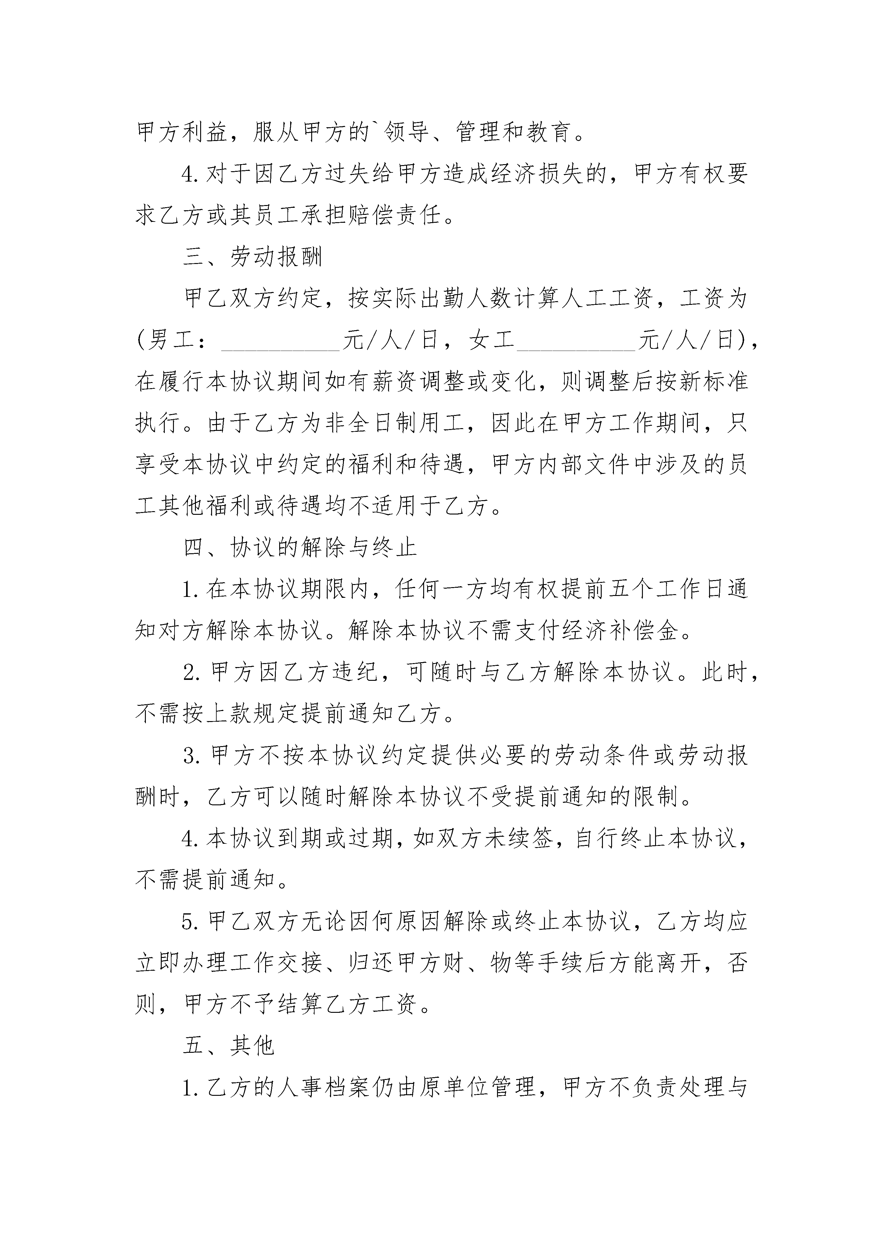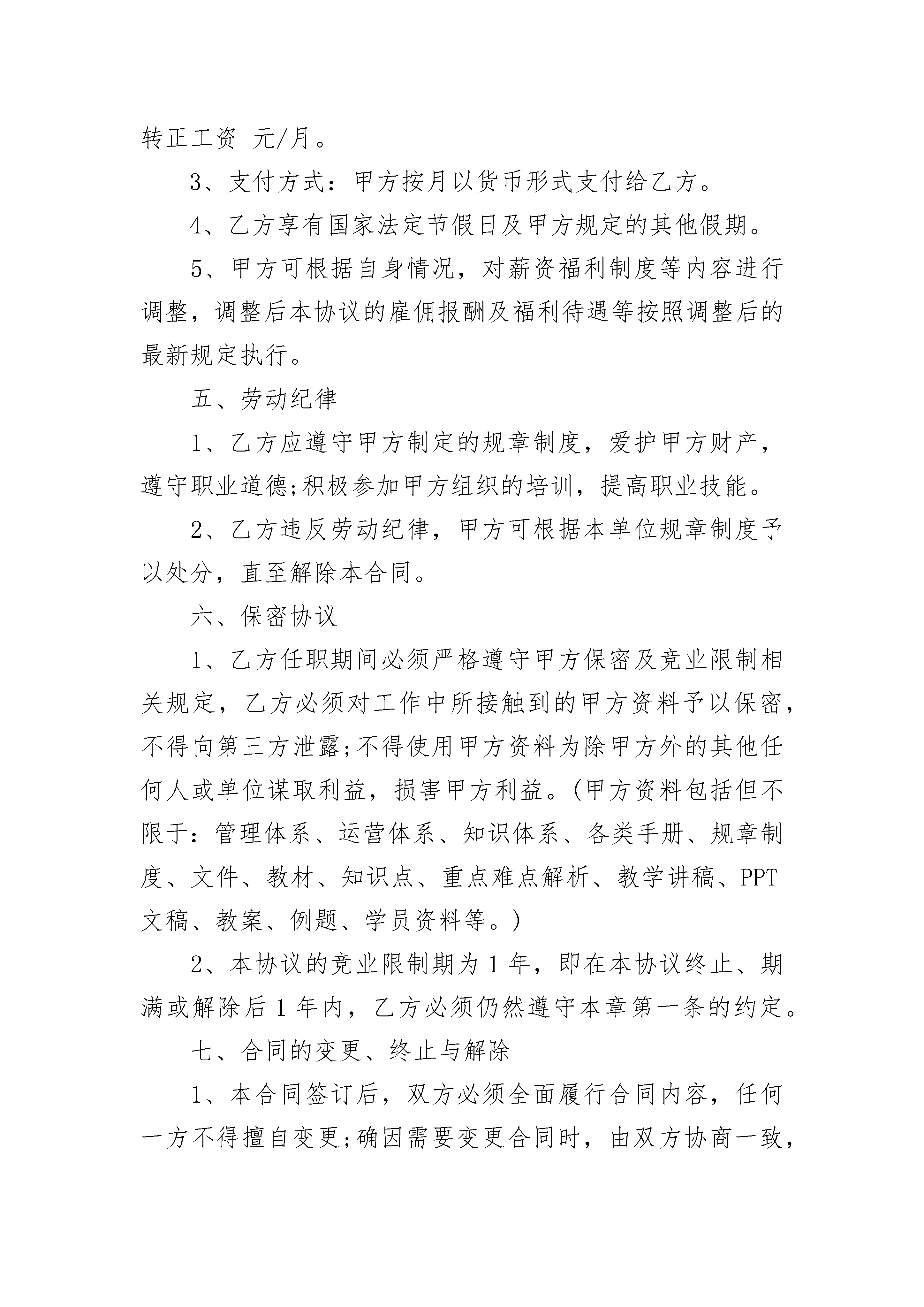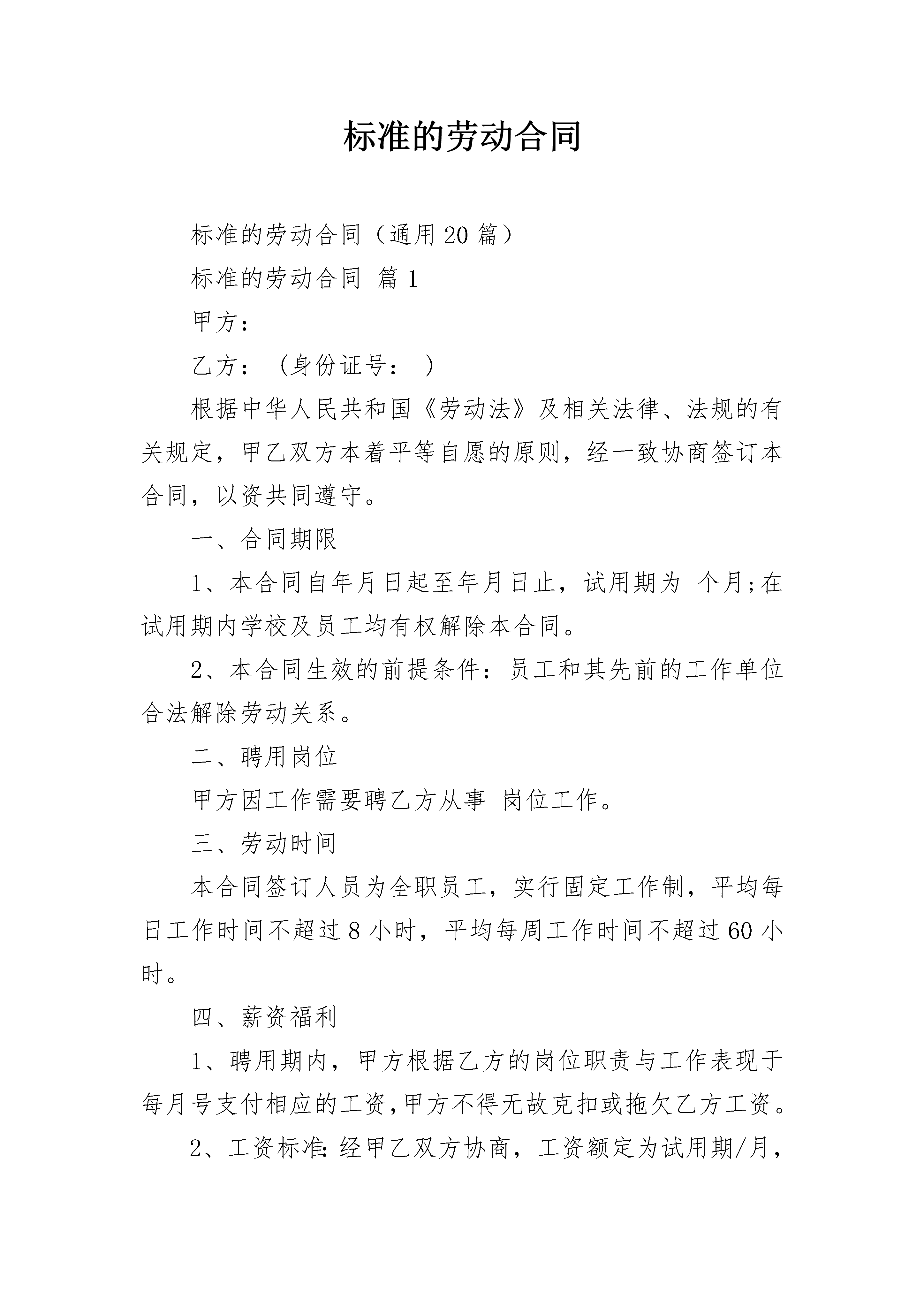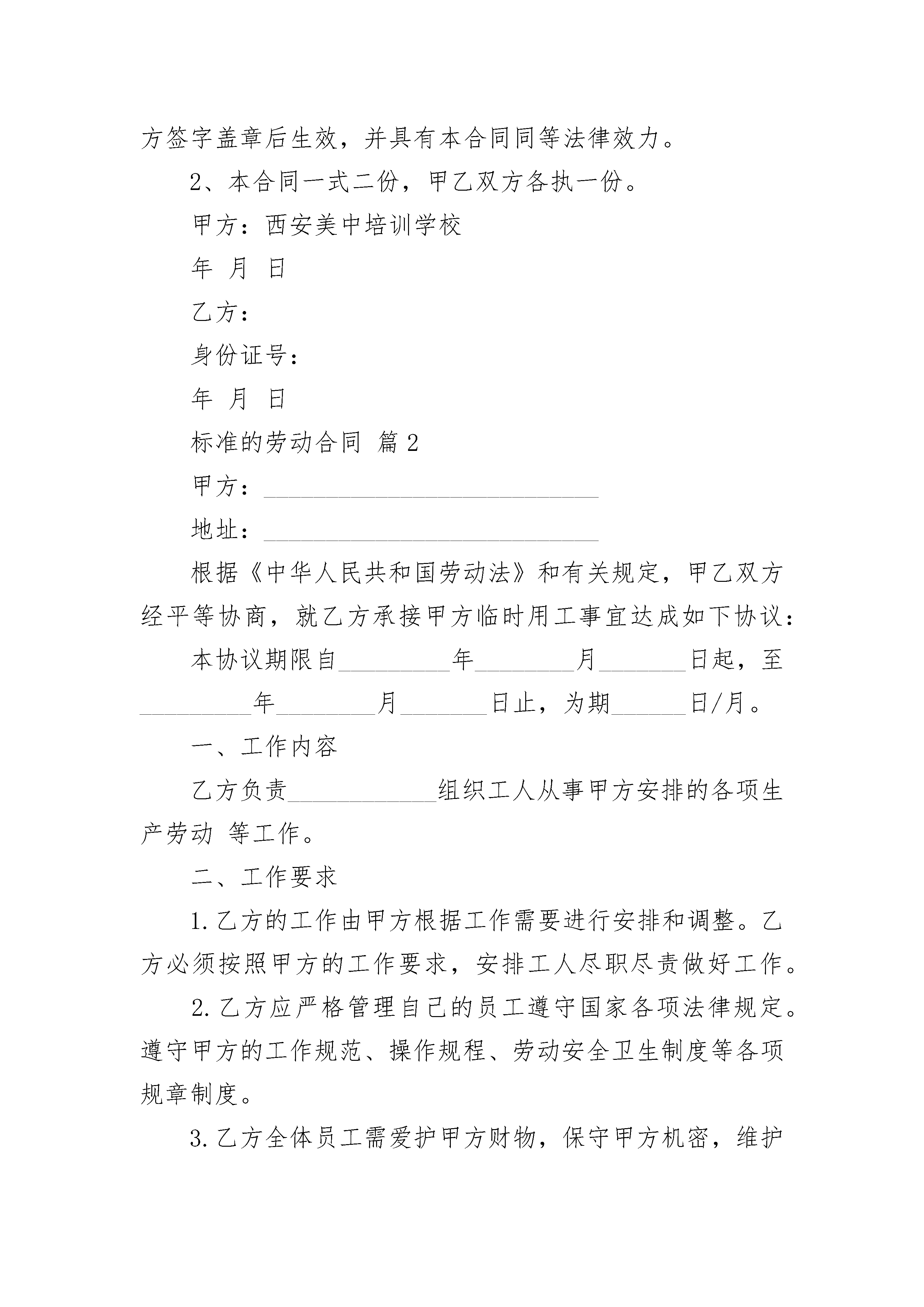 标准的劳动合同标准的劳动合同(通用20篇)标准的劳动合同篇1甲方:乙方:(身份证号:)根据中华人民共和国《劳动法》及相关法律、法规的有关规定,甲乙双方本着平等自愿的原则,经一致协商签订本合同,以资共同遵守。一、合同期限1、本合同自年月日起至年月日止,试用期为个月;在试用期内学校及员工均有权解除本合同。2、本合同生效的前提条件:员工和其先前的工作单位合法解除劳动关系。二、聘用岗位甲方因工作需要聘乙方从事岗位工作。三、劳动时间本合同签订人员为全职员工,实行固定工作制,平均每日工作时间不超过8小时,平均每周工作时间不超过60小时。四、薪资福利1、聘用期内,甲方根据乙方的岗位职责与工作表现于每月号支付相应的工资,甲方不得无故克扣或拖欠乙方工资。2、工资标准:经甲乙双方协商,工资额定为试用期/月,转正工资元/月。3、支付方式:甲方按月以货币形式支付给乙方。4、乙方享有国家法定节假日及甲方规定的其他假期。5、甲方可根据自身情况,对薪资福利制度等内容进行调整,调整后本协议的雇佣报酬及福利待遇等按照调整后的最新规定执行。五、劳动纪律1、乙方应遵守甲方制定的规章制度,爱护甲方财产,遵守职业道德;积极参加甲方组织的培训,提高职业技能。2、乙方违反劳动纪律,甲方可根据本单位规章制度予以处分,直至解除本合同。六、保密协议1、乙方任职期间必须严格遵守甲方保密及竞业限制相关规定,乙方必须对工作中所接触到的甲方资料予以保密,不得向第三方泄露;不得使用甲方资料为除甲方外的其他任何人或单位谋取利益,损害甲方利益。(甲方资料包括但不限于:管理体系、运营体系、知识体系、各类手册、规章制度、文件、教材、知识点、重点难点解析、教学讲稿、PPT文稿、教案、例题、学员资料等。)2、本协议的竞业限制期为1年,即在本协议终止、期满或解除后1年内,乙方必须仍然遵守本章第一条的约定。七、合同的变更、终止与解除1、本合同签订后,双方必须全面履行合同内容,任何一方不得擅自变更;确因需要变更合同时,由双方协商一致,并在原合同基础上签订变更协议,该协议作为附件,与合同具有同等效力;双方未达成一致意见的,原协议继续有效。2、有下列情况之一的,甲方可解除或终止本合同,甲方不负任何责任:①乙方试用期间被甲方认定不符合录用条件的,或乙方提供资料、证书等材料含有不真实信息的。②在合同有效期内,乙方执行甲方教学计划未能达到甲方要求的。③甲方规章制度中规定的应当予以解除或终止劳动合同的。④因本合同订立时所依据的客观情况发生重大变化,致使劳动合同无法履行的。⑤严重违反甲方制度、严重失职损害甲方利益的。⑥乙方患病或因工伤、医疗期满后,不能从事原工作,也不愿或不能从事甲方另行安排工作的。⑦不能胜任工作,经过培训或换岗,仍不能胜任工作的。3、乙方解除本合同,应提前30日以书面形式通知甲方,经甲方同意后方可离职,否则按自行离职处理。4、有下列情形的,双方可自行解除合同:①试用期内;②聘用合同期满或甲乙双方约定的聘用合同终止条件出现;八、其他1、本合同自签订之日起生效,其他未尽事宜,经甲乙双方协商一致后可对本合同进行修改或补充,补充协议经双方签字盖章后生效,并具有本合同同等法律效力。2、本合同一式二份,甲乙双方各执一份。甲方:西安美中培训学校年月日乙方:身份证号:年月日标准的劳动合同篇2甲方:___________________________地址:___________________________根据《中华人民共和国劳动法》和有关规定,甲乙双方经平等协商,就乙方承接甲方临时用工事宜达成如下协议:本协议期限自_________年________月_______日起,至_________年________月_______日止,为期______日/月。一、工作内容乙方负责____________组织工人从事甲方安排的各项生产劳动等工作。二、工作要求1.乙方的工作由甲方根据工作需要进行安排和调整。乙方必须按照甲方的工作要求,安排工人尽职尽责做好工作。2.乙方应严格管理自己的员工遵守国家各项法律规定。遵守甲方的工作规范、操作规程、劳动安全卫生制度等各项规章制度。3.乙方全体员工需爱护甲方财物,保守甲方机密,维护甲方利益,服从甲方的`领导、管理和教育。4.对于因乙方过失给甲方造成经济损失的,甲方有权要求乙方或其员工承担赔偿责任。三、劳动报酬甲乙双方约定,按实际出勤人数计算人工工资,工资为(男工:__________元/人/日,女工__________元/人/日),在履行本协议期间如有薪资调整或变化,则调整后按新标准执行。由于乙方为非全日制用工,因此在甲方工作期间,只享受本协议中约定的福利和待遇,甲方内部文件中涉及的员工其他福利或待遇均不适用于乙方。四、协议的解除与终止1.在本协议期限内,任何一方均有权提前五个工