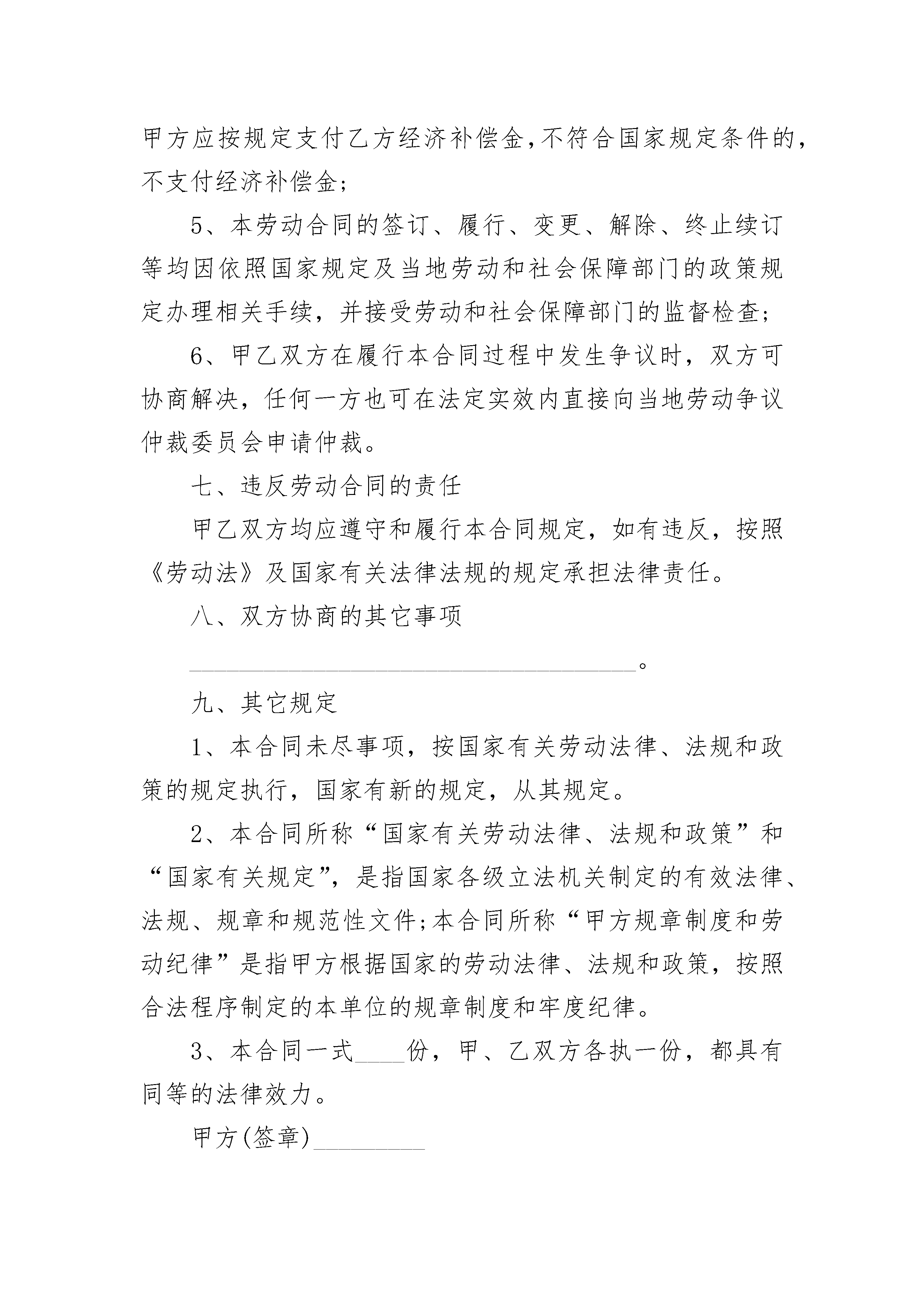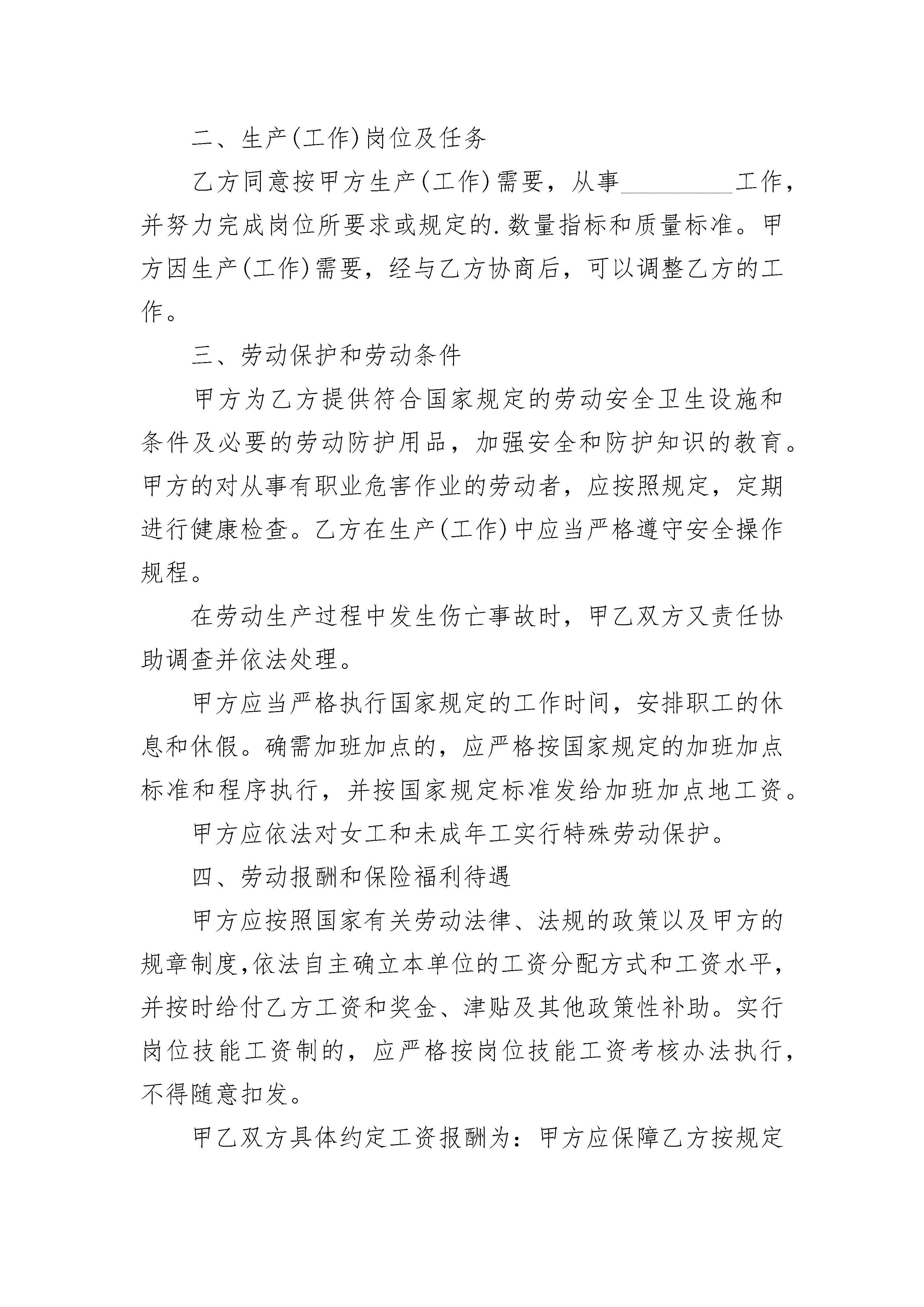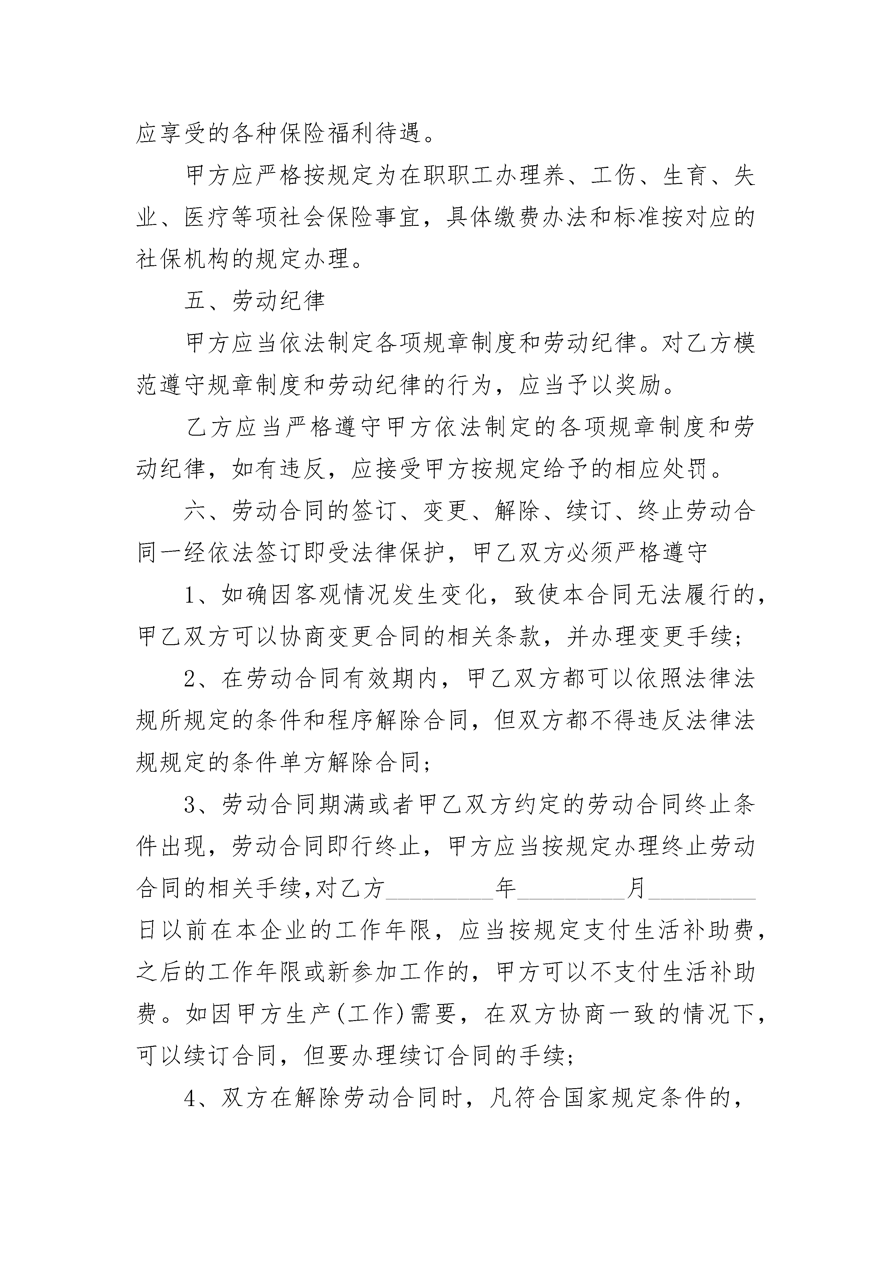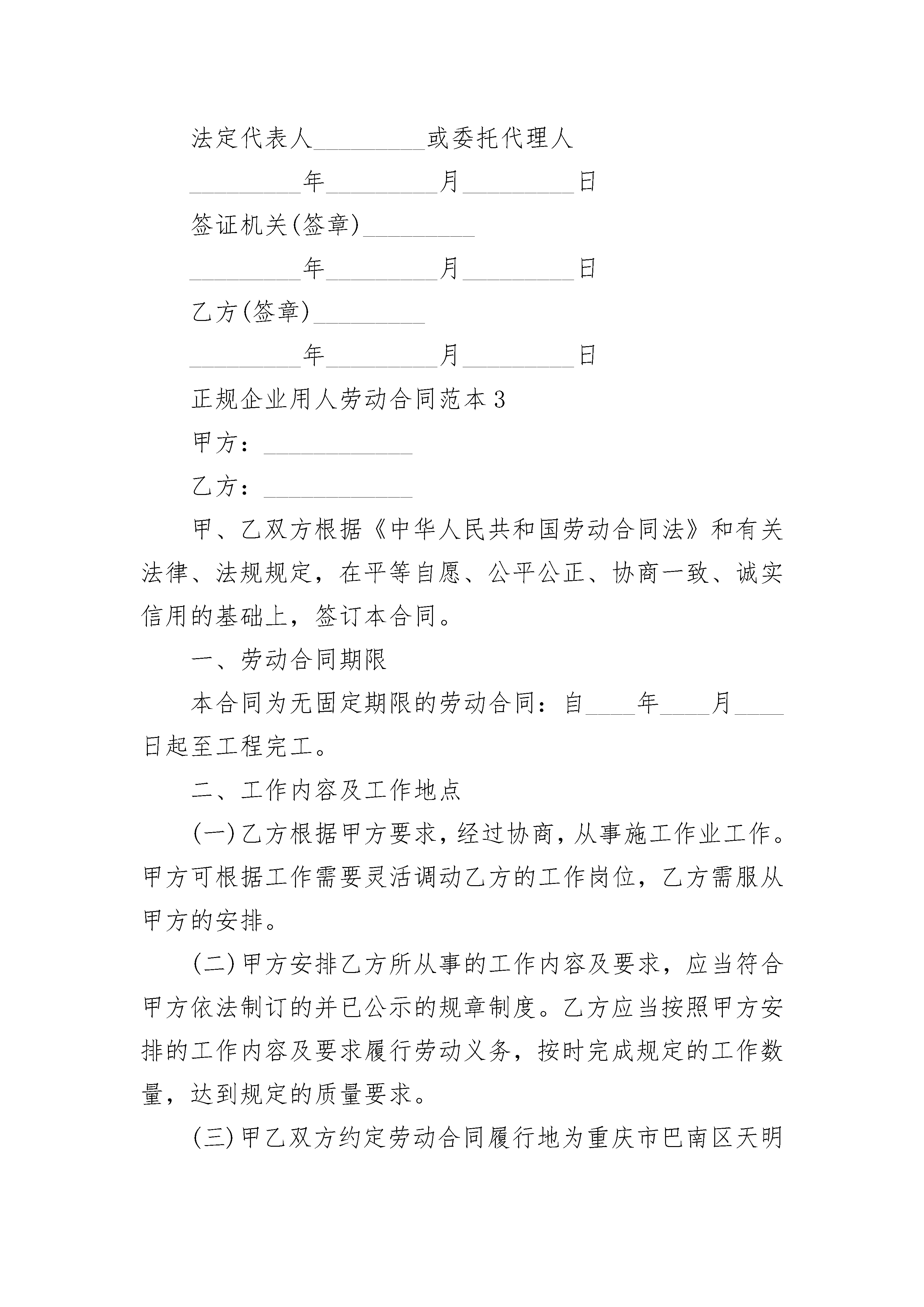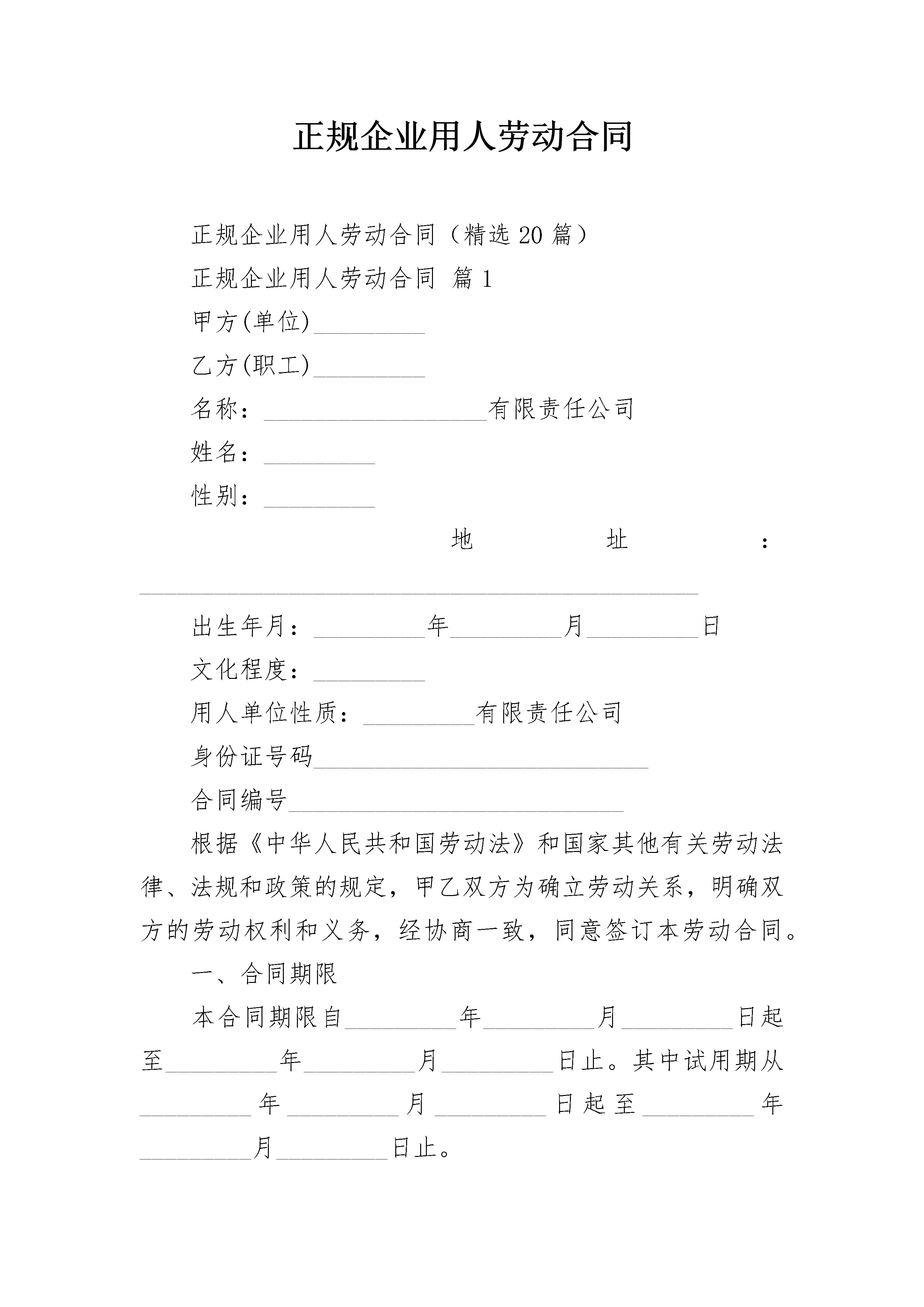 正规企业用人劳动合同正规企业用人劳动合同(精选20篇)正规企业用人劳动合同篇1甲方(单位)_________乙方(职工)_________名称:__________________有限责任公司姓名:_________性别:_________地址:_____________________________________________出生年月:_________年_________月_________日文化程度:_________用人单位性质:_________有限责任公司身份证号码___________________________合同编号___________________________根据《中华人民共和国劳动法》和国家其他有关劳动法律、法规和政策的规定,甲乙双方为确立劳动关系,明确双方的劳动权利和义务,经协商一致,同意签订本劳动合同。一、合同期限本合同期限自_________年_________月_________日起至_________年_________月_________日止。其中试用期从_________年_________月_________日起至_________年_________月_________日止。二、生产(工作)岗位及任务乙方同意按甲方生产(工作)需要,从事_________工作,并努力完成岗位所要求或规定的.数量指标和质量标准。甲方因生产(工作)需要,经与乙方协商后,可以调整乙方的工作。三、劳动保护和劳动条件甲方为乙方提供符合国家规定的劳动安全卫生设施和条件及必要的劳动防护用品,加强安全和防护知识的教育。甲方的对从事有职业危害作业的劳动者,应按照规定,定期进行健康检查。乙方在生产(工作)中应当严格遵守安全操作规程。在劳动生产过程中发生伤亡事故时,甲乙双方又责任协助调查并依法处理。甲方应当严格执行国家规定的工作时间,安排职工的休息和休假。确需加班加点的,应严格按国家规定的加班加点标准和程序执行,并按国家规定标准发给加班加点地工资。甲方应依法对女工和未成年工实行特殊劳动保护。四、劳动报酬和保险福利待遇甲方应按照国家有关劳动法律、法规的政策以及甲方的规章制度,依法自主确立本单位的工资分配方式和工资水平,并按时给付乙方工资和奖金、津贴及其他政策性补助。实行岗位技能工资制的,应严格按岗位技能工资考核办法执行,不得随意扣发。甲乙双方具体约定工资报酬为:甲方应保障乙方按规定应享受的各种保险福利待遇。甲方应严格按规定为在职职工办理养、工伤、生育、失业、医疗等项社会保险事宜,具体缴费办法和标准按对应的社保机构的规定办理。五、劳动纪律甲方应当依法制定各项规章制度和劳动纪律。对乙方模范遵守规章制度和劳动纪律的行为,应当予以奖励。乙方应当严格遵守甲方依法制定的各项规章制度和劳动纪律,如有违反,应接受甲方按规定给予的相应处罚。六、劳动合同的签订、变更、解除、续订、终止劳动合同一经依法签订即受法律保护,甲乙双方必须严格遵守1、如确因客观情况发生变化,致使本合同无法履行的,甲乙双方可以协商变更合同的相关条款,并办理变更手续;2、在劳动合同有效期内,甲乙双方都可以依照法律法规所规定的条件和程序解除合同,但双方都不得违反法律法规规定的条件单方解除合同;3、劳动合同期满或者甲乙双方约定的劳动合同终止条件出现,劳动合同即行终止,甲方应当按规定办理终止劳动合同的相关手续,对乙方_________年_________月_________日以前在本企业的工作年限,应当按规定支付生活补助费,之后的工作年限或新参加工作的,甲方可以不支付生活补助费。如因甲方生产(工作)需要,在双方协商一致的情况下,可以续订合同,但要办理续订合同的手续;4、双方在解除劳动合同时,凡符合国家规定条件的,甲方应按规定支付乙方经济补偿金,不符合国家规定条件的,不支付经济补偿金;5、本劳动合同的签订、履行、变更、解除、终止续订等均因依照国家规定及当地劳动和社会保障部门的政策规定办理相关手续,并接受劳动和社会保障部门的监督检查;6、甲乙双方在履行本合同过程中发生争议时,双方可协商解决,任何一方也可在法定实效内直接向当地劳动争议仲裁委员会申请仲裁。七、违反劳动合同的责任甲乙双方均应遵守和履行本合同规定,如有违反,按照《劳动法》及国家有关法律法规的规定承担法律责任。八、双方协商的其它事项____________________________________。九、其它规定1、本合同未尽事项,按国家有关劳动法律、法规和政策的规定执行,国家有新的规定,从其规定。2、本合同所称“国家有关劳动法律、法规和政策”和“国家有关规定”,是指国家各级立法机关制定的有效法律、法规、规章和规范性文件;本合同所称“甲方规章制度和劳动纪律”是指甲方根据国家的劳动法律、法规和政策,按照合法程