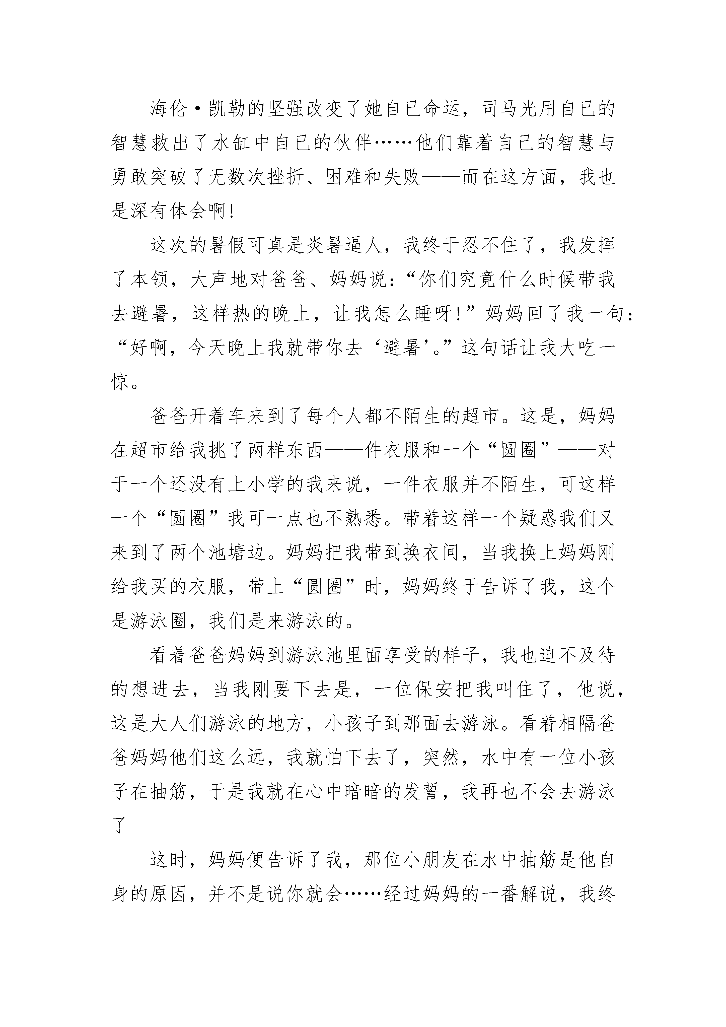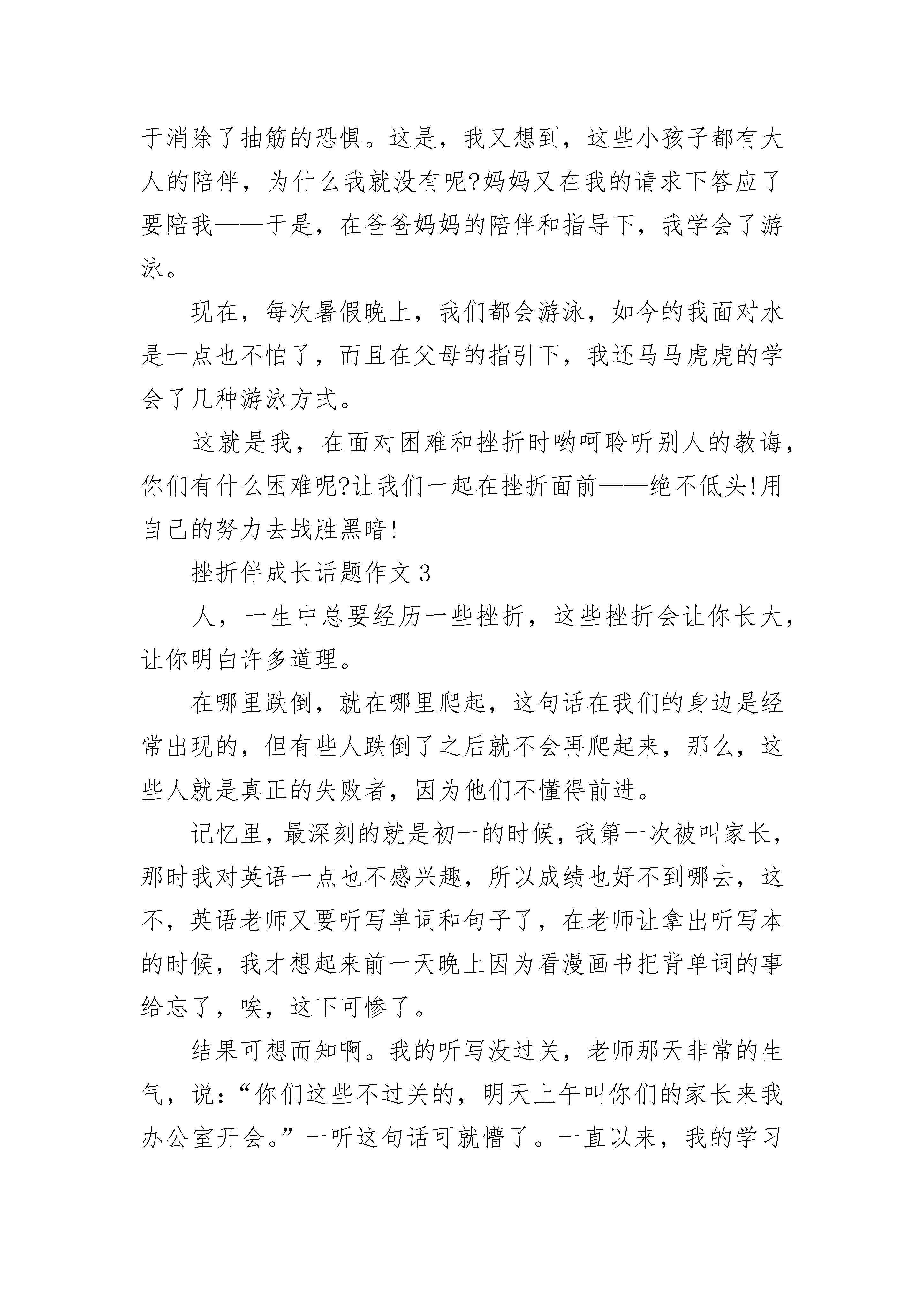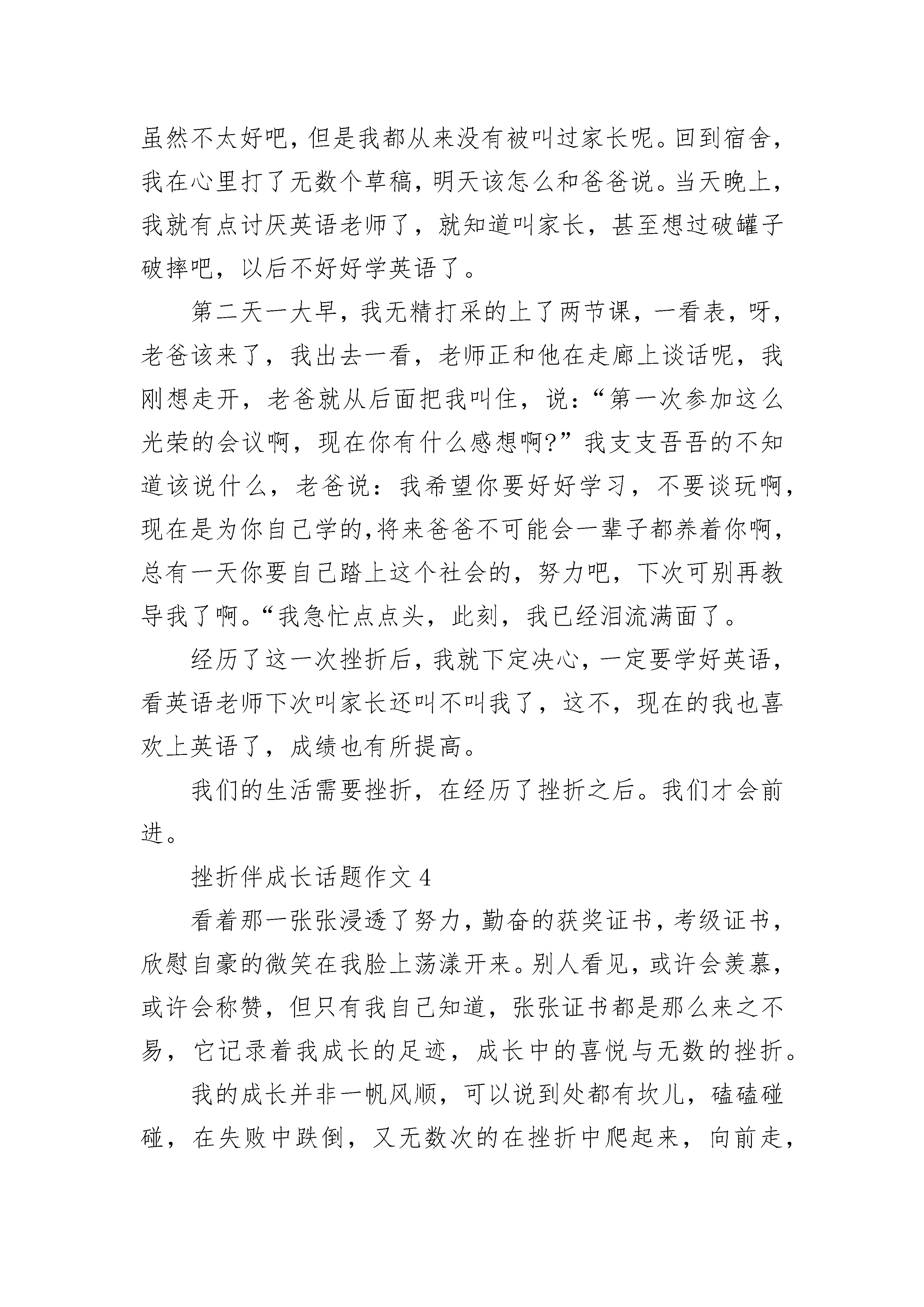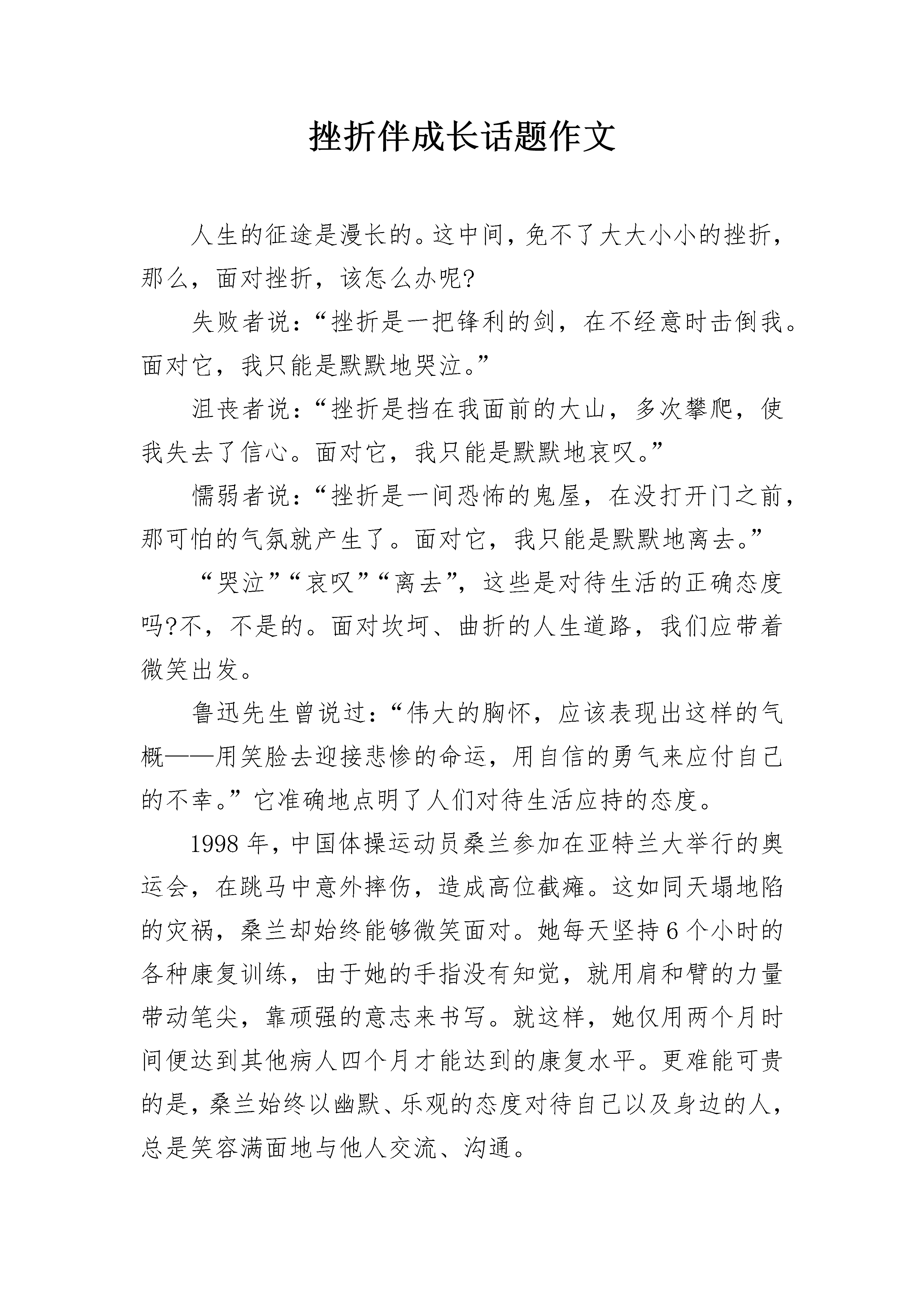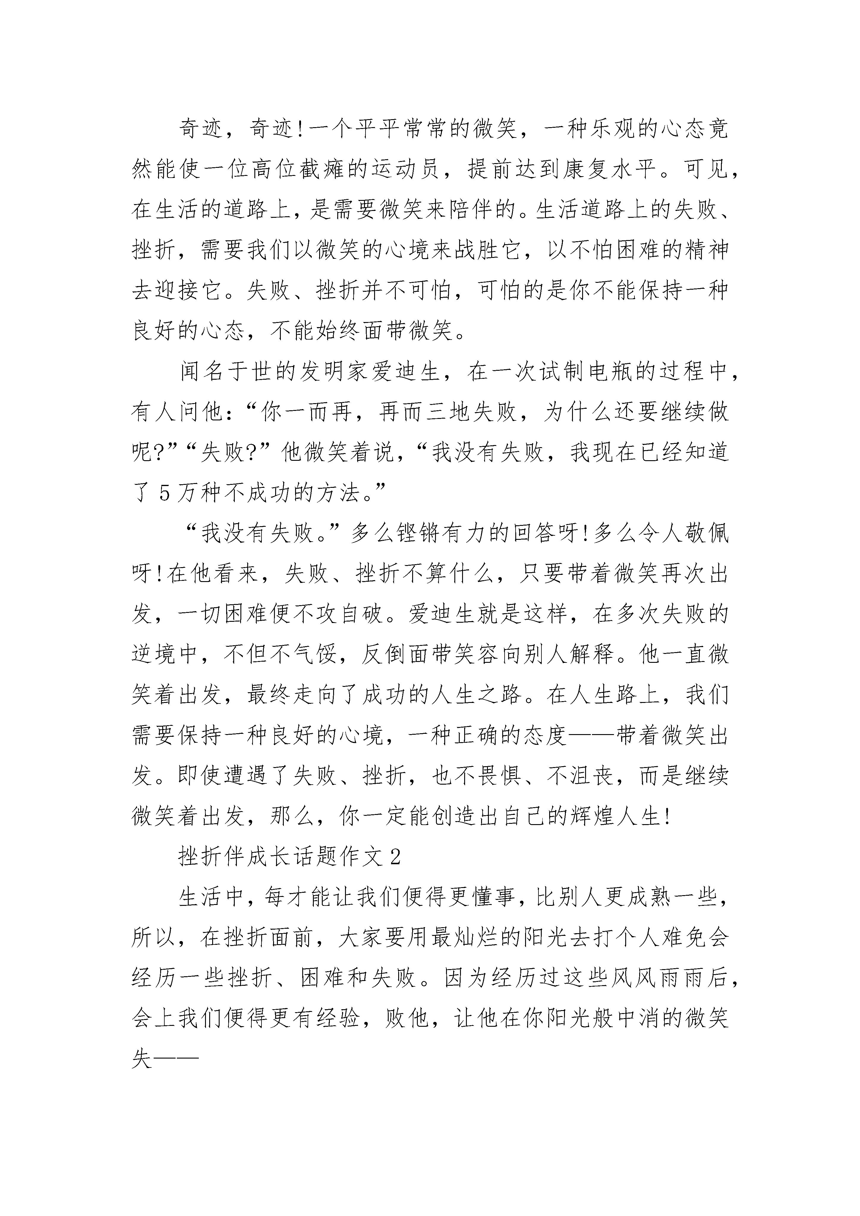 挫折伴成长话题作文人生的征途是漫长的。这中间,免不了大大小小的挫折,那么,面对挫折,该怎么办呢?失败者说:“挫折是一把锋利的剑,在不经意时击倒我。面对它,我只能是默默地哭泣。”沮丧者说:“挫折是挡在我面前的大山,多次攀爬,使我失去了信心。面对它,我只能是默默地哀叹。”懦弱者说:“挫折是一间恐怖的鬼屋,在没打开门之前,那可怕的气氛就产生了。面对它,我只能是默默地离去。”“哭泣”“哀叹”“离去”,这些是对待生活的正确态度吗?不,不是的。面对坎坷、曲折的人生道路,我们应带着微笑出发。鲁迅先生曾说过:“伟大的胸怀,应该表现出这样的气概——用笑脸去迎接悲惨的命运,用自信的勇气来应付自己的不幸。”它准确地点明了人们对待生活应持的态度。1998年,中国体操运动员桑兰参加在亚特兰大举行的奥运会,在跳马中意外摔伤,造成高位截瘫。这如同天塌地陷的灾祸,桑兰却始终能够微笑面对。她每天坚持6个小时的各种康复训练,由于她的手指没有知觉,就用肩和臂的力量带动笔尖,靠顽强的意志来书写。就这样,她仅用两个月时间便达到其他病人四个月才能达到的康复水平。更难能可贵的是,桑兰始终以幽默、乐观的态度对待自己以及身边的人,总是笑容满面地与他人交流、沟通。奇迹,奇迹!一个平平常常的微笑,一种乐观的心态竟然能使一位高位截瘫的运动员,提前达到康复水平。可见,在生活的道路上,是需要微笑来陪伴的。生活道路上的失败、挫折,需要我们以微笑的心境来战胜它,以不怕困难的精神去迎接它。失败、挫折并不可怕,可怕的是你不能保持一种良好的心态,不能始终面带微笑。闻名于世的发明家爱迪生,在一次试制电瓶的过程中,有人问他:“你一而再,再而三地失败,为什么还要继续做呢?”“失败?”他微笑着说,“我没有失败,我现在已经知道了5万种不成功的方法。”“我没有失败。”多么铿锵有力的回答呀!多么令人敬佩呀!在他看来,失败、挫折不算什么,只要带着微笑再次出发,一切困难便不攻自破。爱迪生就是这样,在多次失败的逆境中,不但不气馁,反倒面带笑容向别人解释。他一直微笑着出发,最终走向了成功的人生之路。在人生路上,我们需要保持一种良好的心境,一种正确的态度——带着微笑出发。即使遭遇了失败、挫折,也不畏惧、不沮丧,而是继续微笑着出发,那么,你一定能创造出自己的辉煌人生!挫折伴成长话题作文2生活中,每才能让我们便得更懂事,比别人更成熟一些,所以,在挫折面前,大家要用最灿烂的阳光去打个人难免会经历一些挫折、困难和失败。因为经历过这些风风雨雨后,会上我们便得更有经验,败他,让他在你阳光般中消的微笑失——海伦·凯勒的坚强改变了她自已命运,司马光用自已的智慧救出了水缸中自已的伙伴……他们靠着自己的智慧与勇敢突破了无数次挫折、困难和失败——而在这方面,我也是深有体会啊!这次的暑假可真是炎暑逼人,我终于忍不住了,我发挥了本领,大声地对爸爸、妈妈说:“你们究竟什么时候带我去避暑,这样热的晚上,让我怎么睡呀!”妈妈回了我一句:“好啊,今天晚上我就带你去‘避暑’。”这句话让我大吃一惊。爸爸开着车来到了每个人都不陌生的超市。这是,妈妈在超市给我挑了两样东西——件衣服和一个“圆圈”——对于一个还没有上小学的我来说,一件衣服并不陌生,可这样一个“圆圈”我可一点也不熟悉。带着这样一个疑惑我们又来到了两个池塘边。妈妈把我带到换衣间,当我换上妈妈刚给我买的衣服,带上“圆圈”时,妈妈终于告诉了我,这个是游泳圈,我们是来游泳的。看着爸爸妈妈到游泳池里面享受的样子,我也迫不及待的想进去,当我刚要下去是,一位保安把我叫住了,他说,这是大人们游泳的地方,小孩子到那面去游泳。看着相隔爸爸妈妈他们这么远,我就怕下去了,突然,水中有一位小孩子在抽筋,于是我就在心中暗暗的发誓,我再也不会去游泳了这时,妈妈便告诉了我,那位小朋友在水中抽筋是他自身的原因,并不是说你就会……经过妈妈的一番解说,我终于消除了抽筋的恐惧。这是,我又想到,这些小孩子都有大人的陪伴,为什么我就没有呢?妈妈又在我的请求下答应了要陪我——于是,在爸爸妈妈的陪伴和指导下,我学会了游泳。现在,每次暑假晚上,我们都会游泳,如今的我面对水是一点也不怕了,而且在父母的指引下,我还马马虎虎的学会了几种游泳方式。这就是我,在面对困难和挫折时哟呵聆听别人的教诲,你们有什么困难呢?让我们一起在挫折面前——绝不低头!用自己的努力去战胜黑暗!挫折伴成长话题作文3人,一生中总要经历一些挫折,这些挫折会让你长大,让你明白许多道理。在哪里跌倒,就在哪里爬起,这句话在我们的身边是经常出现的,但有些人跌倒了之后就不会再爬起来,那么,这些人就是真正的失败者,因为他们不懂得前进。记忆里,最深刻的就是初一的时候,我第一次被叫家长,那时我对英语一点也不感兴趣,所以成绩也好不到哪去,这不,英语老师又要听写单词和句子了,在老师让拿出听写本的时候
