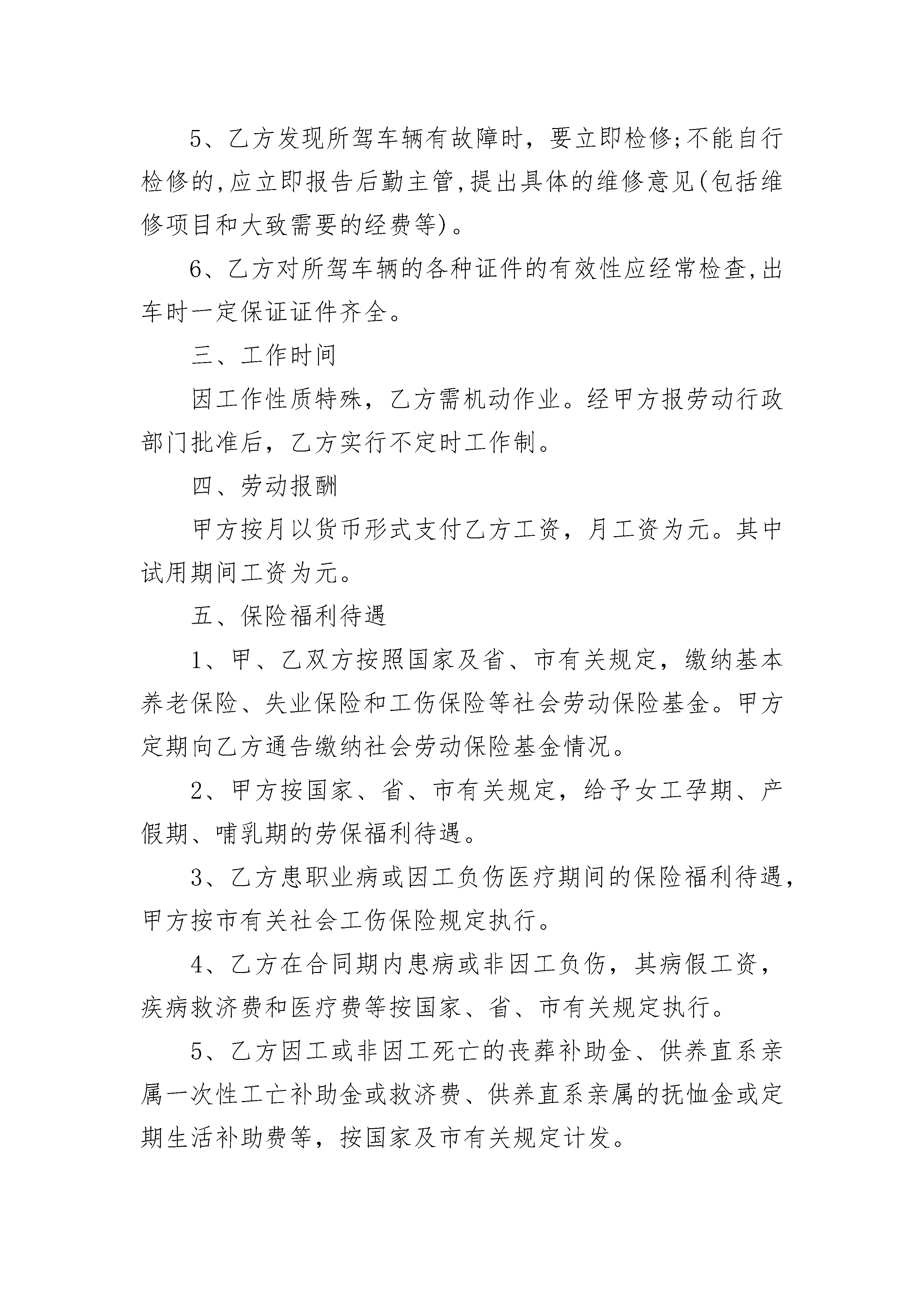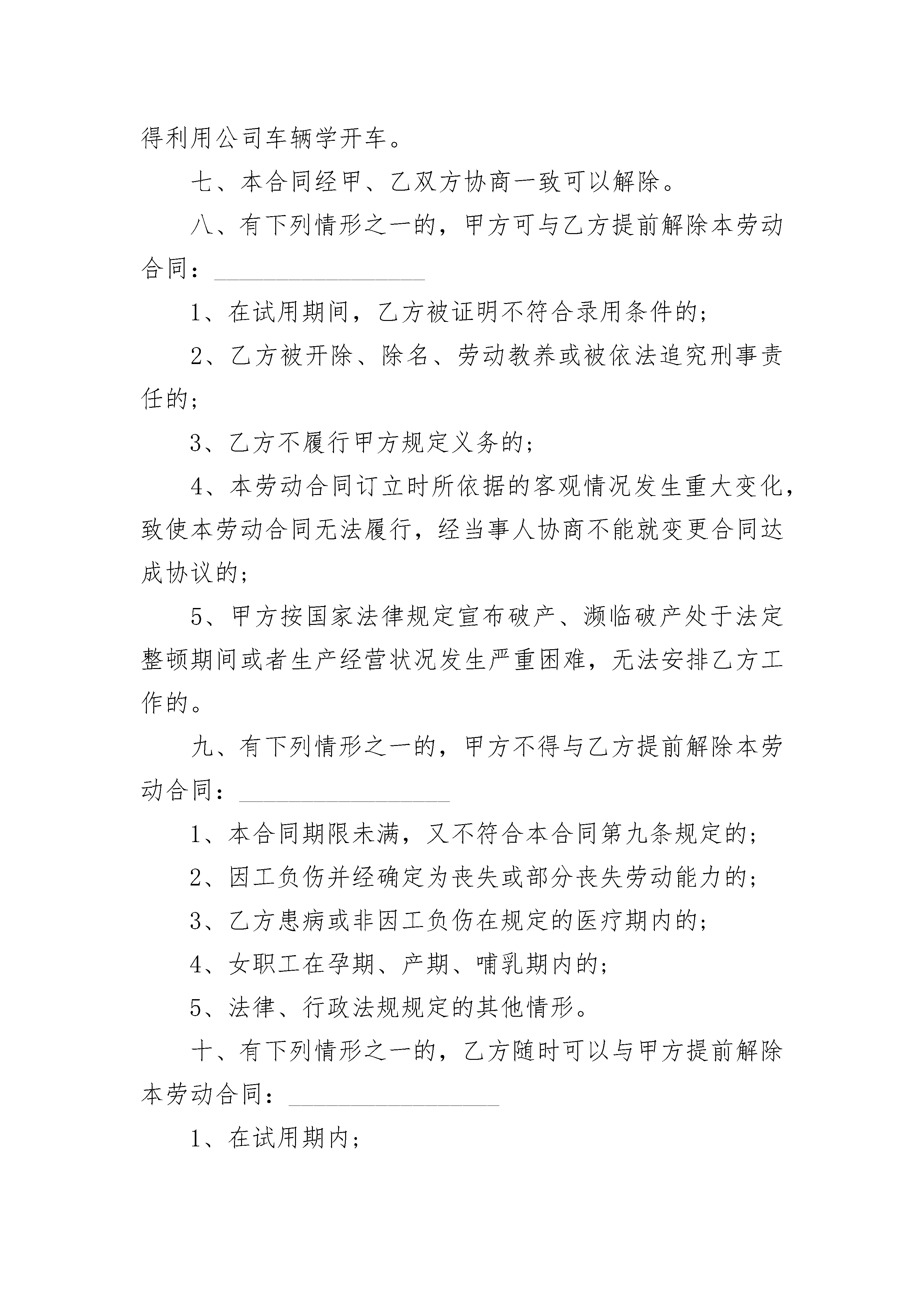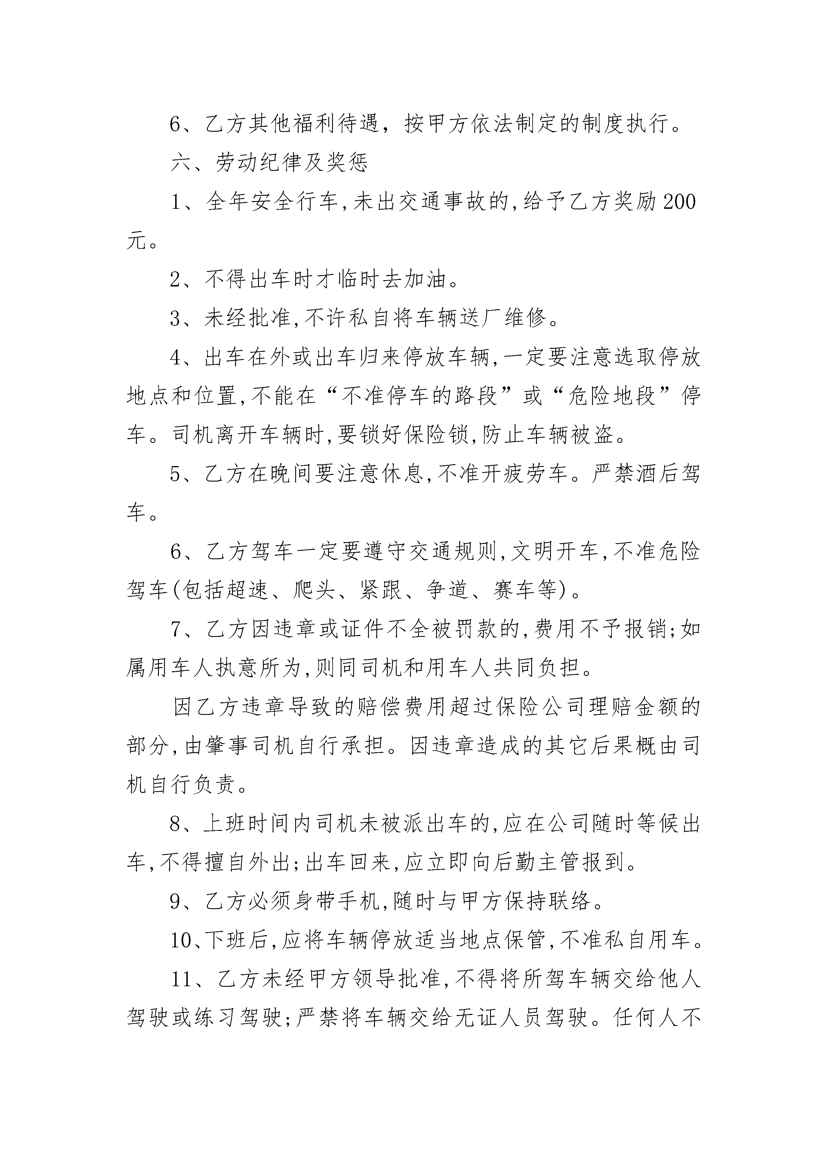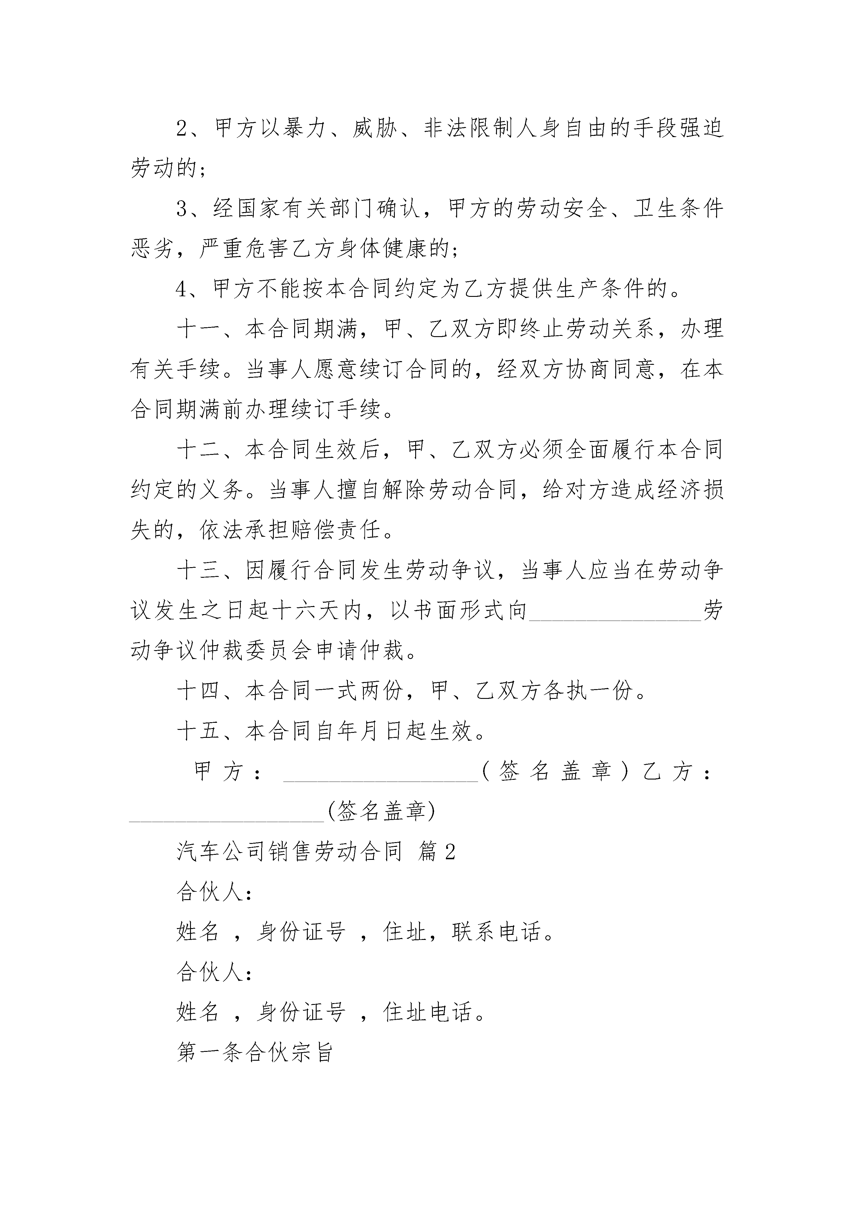 汽车公司销售劳动合同汽车公司销售劳动合同(精选3篇)汽车公司销售劳动合同篇1汽车销售公司劳动合同范本甲方:_________________乙方:_________________根据《中华人民共和国劳动法》和有关的劳动政策、法规、规章,以及甲方的规章、制度,经双方平等自愿,协商一致,签订本劳动合同。一、本劳动合同期限为年个月。自年月日起甲方招收乙方从事汽车驾驶员工作至年月日止;其中试用期个月。二、工作任务1、负责牌号为:_________________的汽车驾驶工作。2、乙方应爱惜公司的车辆,注意车辆的平时保养,经常检查车辆的主要机件。每周实施定期检查及保养,以维护机件的寿命,确保行车安全。3、乙方应每天清理所驾车辆,以保持车辆的清洁(包括车内、车外和引擎的清洁)。4、出车前,要例行检查车辆的水、电、油、车灯、刹车系统、轮胎及其它部件的性能是否正常;发现不正常时,要立即加补或维修。出车回来,要检查存油量,发现存油不足一格时,应立即加油。5、乙方发现所驾车辆有故障时,要立即检修;不能自行检修的,应立即报告后勤主管,提出具体的维修意见(包括维修项目和大致需要的经费等)。6、乙方对所驾车辆的各种证件的有效性应经常检查,出车时一定保证证件齐全。三、工作时间因工作性质特殊,乙方需机动作业。经甲方报劳动行政部门批准后,乙方实行不定时工作制。四、劳动报酬甲方按月以货币形式支付乙方工资,月工资为元。其中试用期间工资为元。五、保险福利待遇1、甲、乙双方按照国家及省、市有关规定,缴纳基本养老保险、失业保险和工伤保险等社会劳动保险基金。甲方定期向乙方通告缴纳社会劳动保险基金情况。2、甲方按国家、省、市有关规定,给予女工孕期、产假期、哺乳期的劳保福利待遇。3、乙方患职业病或因工负伤医疗期间的保险福利待遇,甲方按市有关社会工伤保险规定执行。4、乙方在合同期内患病或非因工负伤,其病假工资,疾病救济费和医疗费等按国家、省、市有关规定执行。5、乙方因工或非因工死亡的丧葬补助金、供养直系亲属一次性工亡补助金或救济费、供养直系亲属的抚恤金或定期生活补助费等,按国家及市有关规定计发。6、乙方其他福利待遇,按甲方依法制定的制度执行。六、劳动纪律及奖惩1、全年安全行车,未出交通事故的,给予乙方奖励200元。2、不得出车时才临时去加油。3、未经批准,不许私自将车辆送厂维修。4、出车在外或出车归来停放车辆,一定要注意选取停放地点和位置,不能在“不准停车的路段”或“危险地段”停车。司机离开车辆时,要锁好保险锁,防止车辆被盗。5、乙方在晚间要注意休息,不准开疲劳车。严禁酒后驾车。6、乙方驾车一定要遵守交通规则,文明开车,不准危险驾车(包括超速、爬头、紧跟、争道、赛车等)。7、乙方因违章或证件不全被罚款的,费用不予报销;如属用车人执意所为,则同司机和用车人共同负担。因乙方违章导致的赔偿费用超过保险公司理赔金额的部分,由肇事司机自行承担。因违章造成的其它后果概由司机自行负责。8、上班时间内司机未被派出车的,应在公司随时等候出车,不得擅自外出;出车回来,应立即向后勤主管报到。9、乙方必须身带手机,随时与甲方保持联络。10、下班后,应将车辆停放适当地点保管,不准私自用车。11、乙方未经甲方领导批准,不得将所驾车辆交给他人驾驶或练习驾驶;严禁将车辆交给无证人员驾驶。任何人不得利用公司车辆学开车。七、本合同经甲、乙双方协商一致可以解除。八、有下列情形之一的,甲方可与乙方提前解除本劳动合同:_________________1、在试用期间,乙方被证明不符合录用条件的;2、乙方被开除、除名、劳动教养或被依法追究刑事责任的;3、乙方不履行甲方规定义务的;4、本劳动合同订立时所依据的客观情况发生重大变化,致使本劳动合同无法履行,经当事人协商不能就变更合同达成协议的;5、甲方按国家法律规定宣布破产、濒临破产处于法定整顿期间或者生产经营状况发生严重困难,无法安排乙方工作的。九、有下列情形之一的,甲方不得与乙方提前解除本劳动合同:_________________1、本合同期限未满,又不符合本合同第九条规定的;2、因工负伤并经确定为丧失或部分丧失劳动能力的;3、乙方患病或非因工负伤在规定的医疗期内的;4、女职工在孕期、产期、哺乳期内的;5、法律、行政法规规定的其他情形。十、有下列情形之一的,乙方随时可以与甲方提前解除本劳动合同:_________________1、在试用期内;2、甲方以暴力、威胁、非法限制人身自由的手段强迫劳动的;3、经国家有关部门确认,甲方的劳动安全、卫生条件恶劣,严重危害乙方身体健康的;4、甲方不能按本合同约定为乙方提供生产条件的。十一、本合同期满,甲、乙双方即终止劳动关系,办理有关手续。当事人愿意续订合同的,经双方协商同意,在本合同期满前办理续订手续。十二、本合同生效后