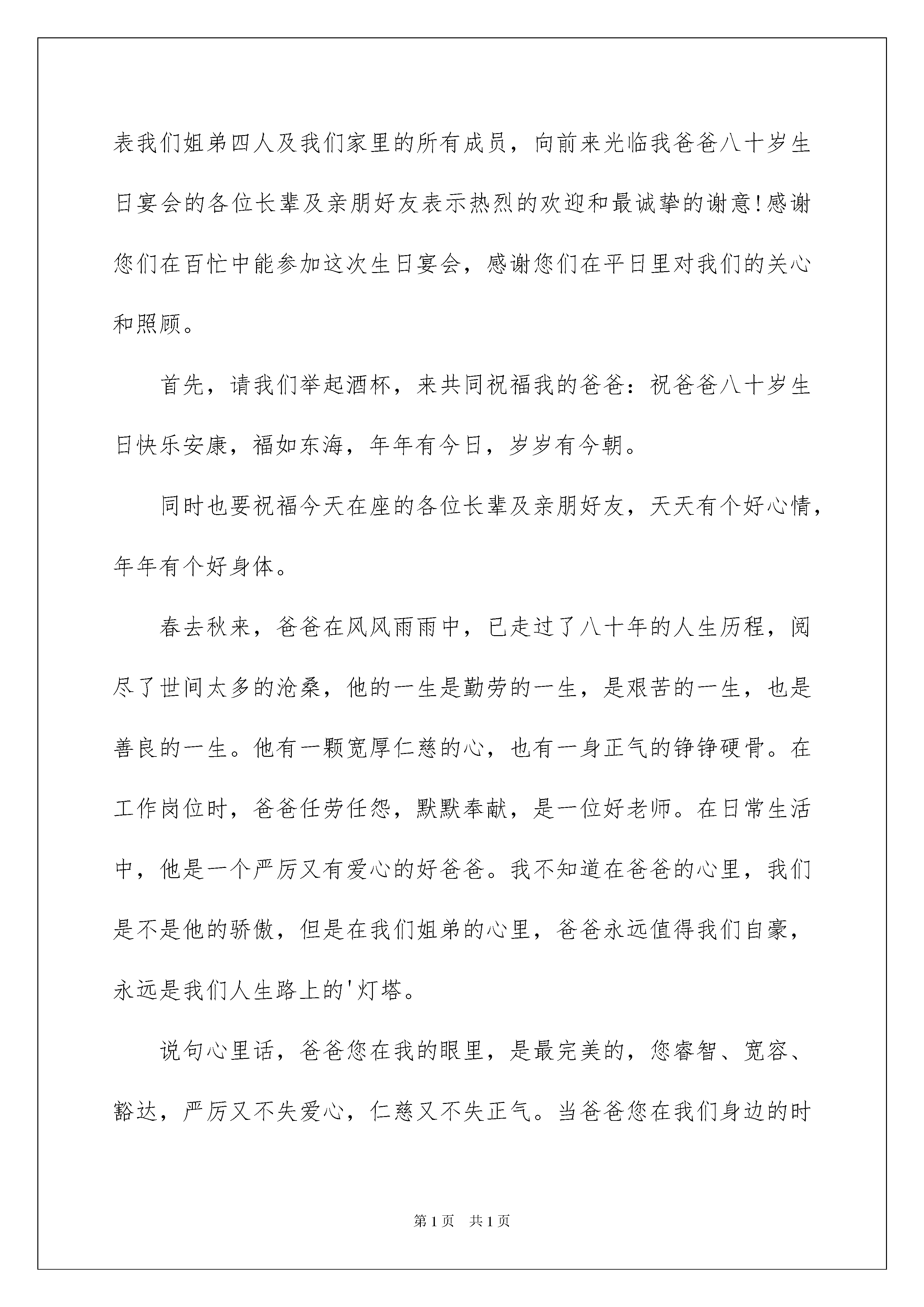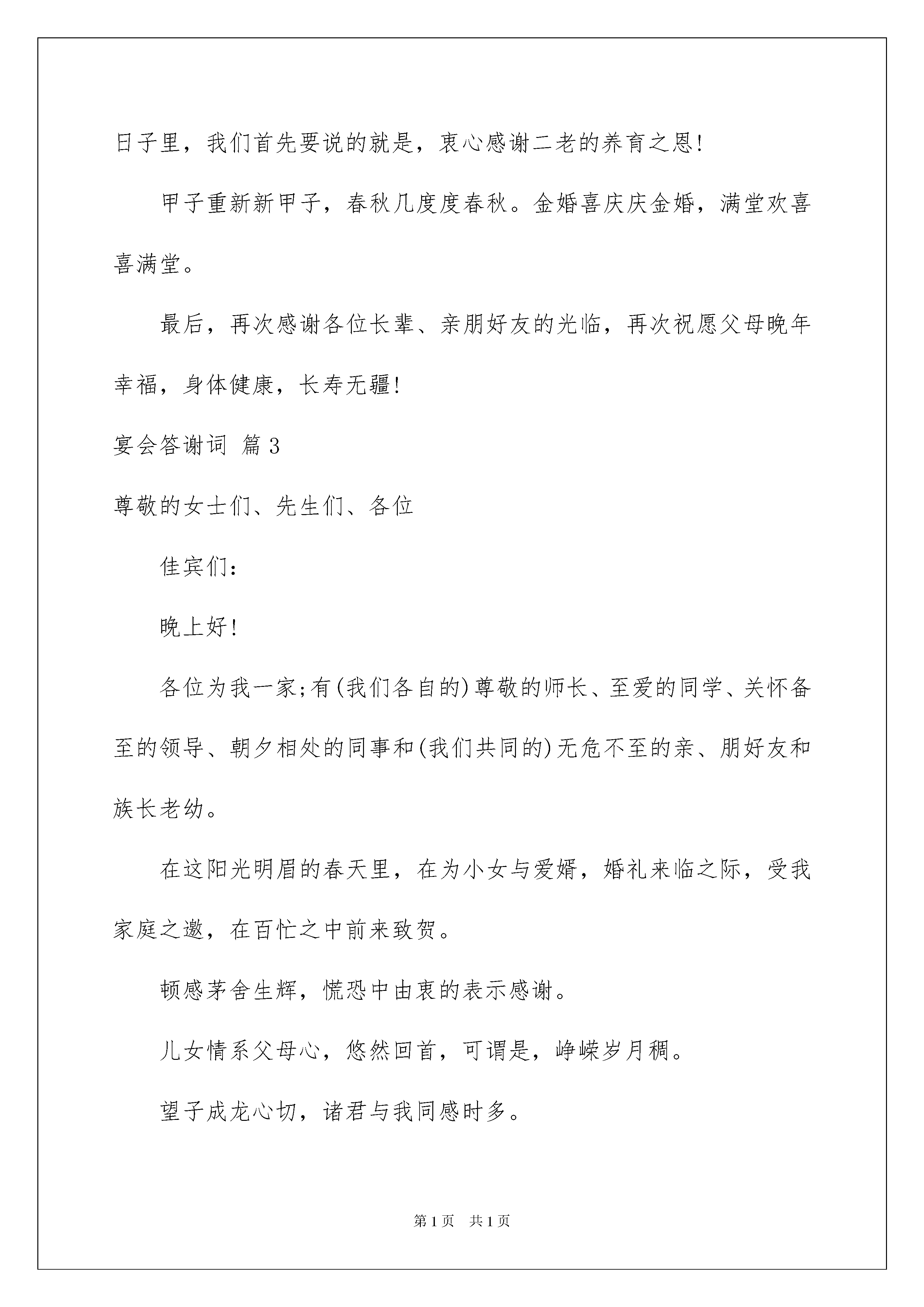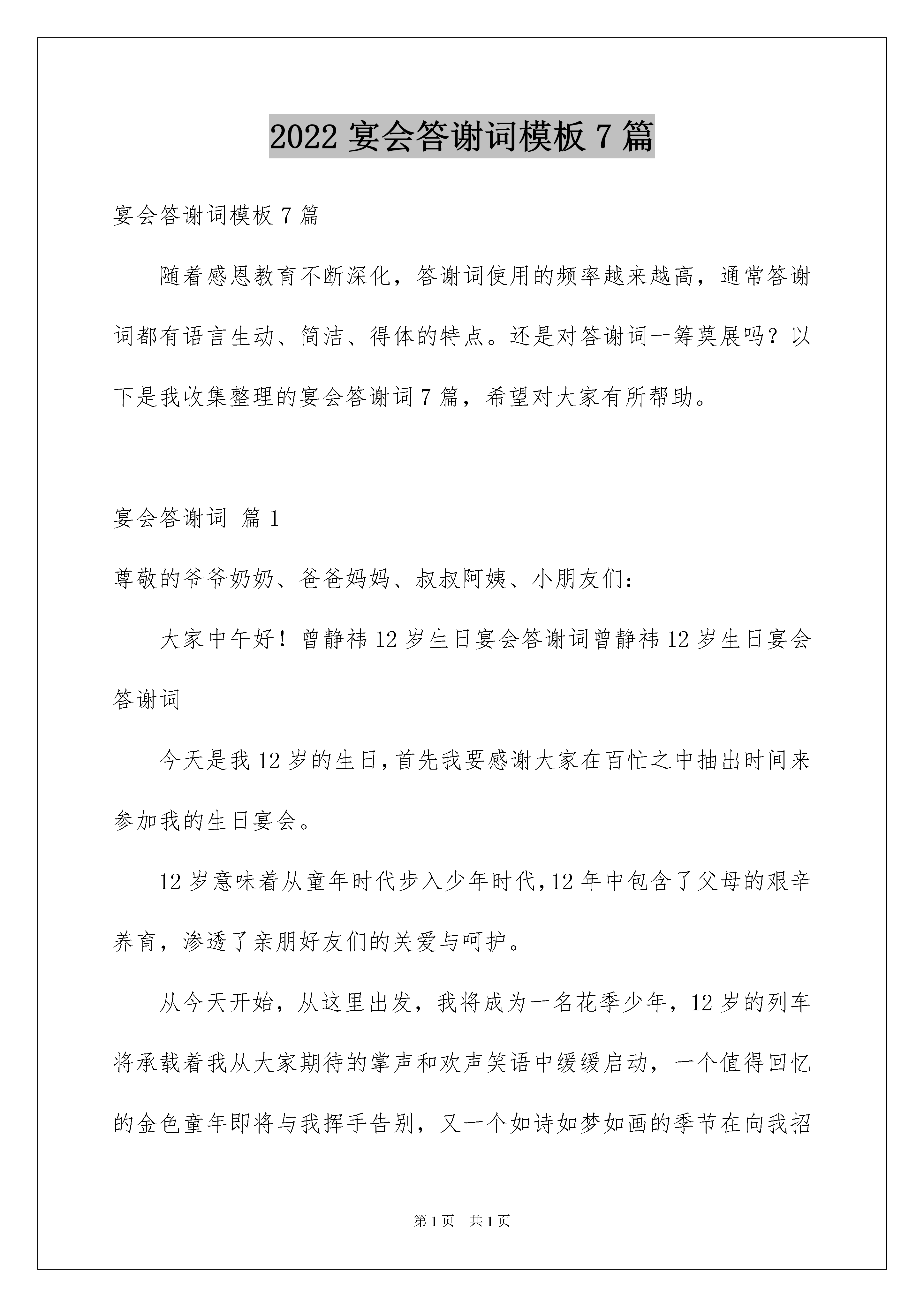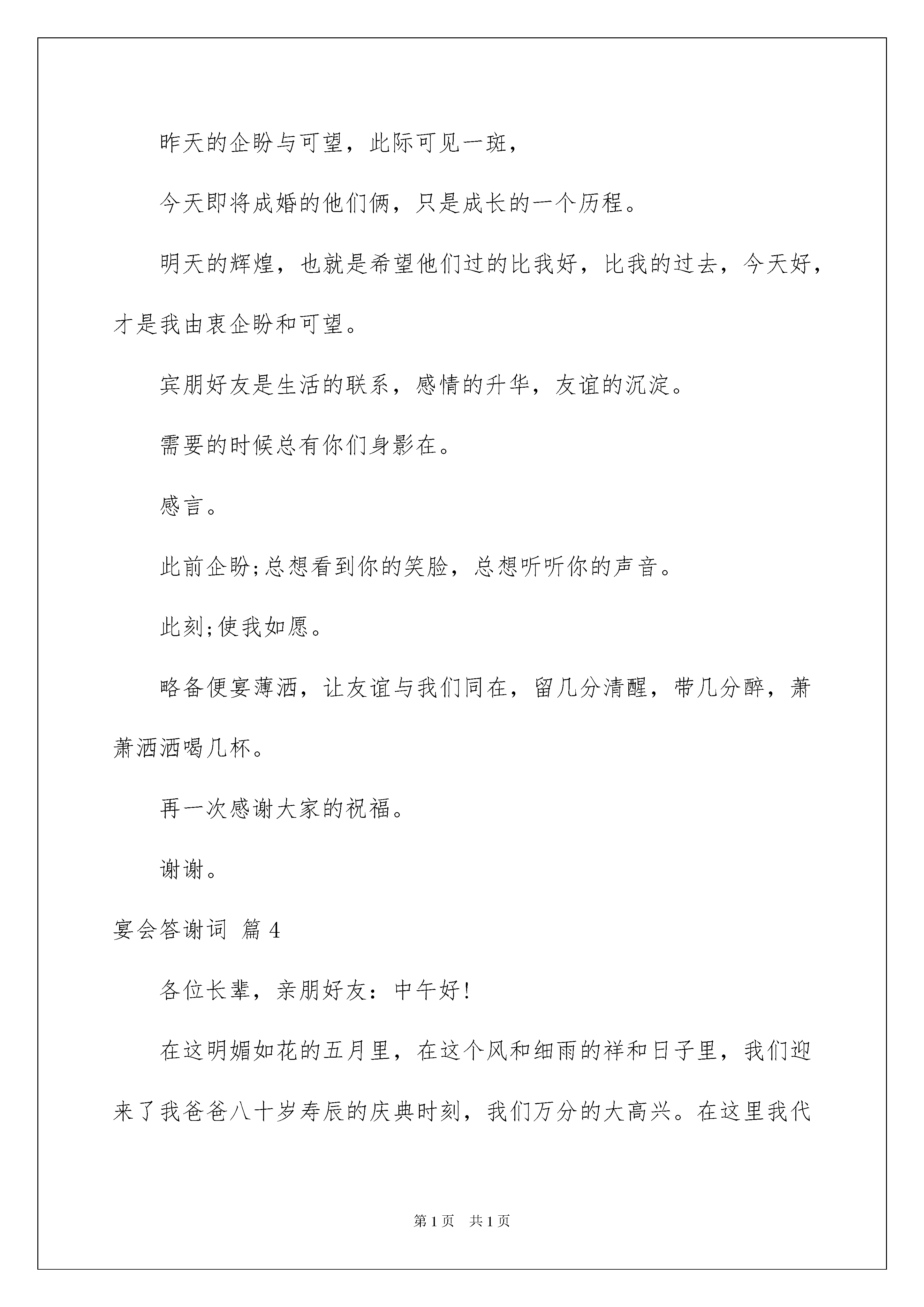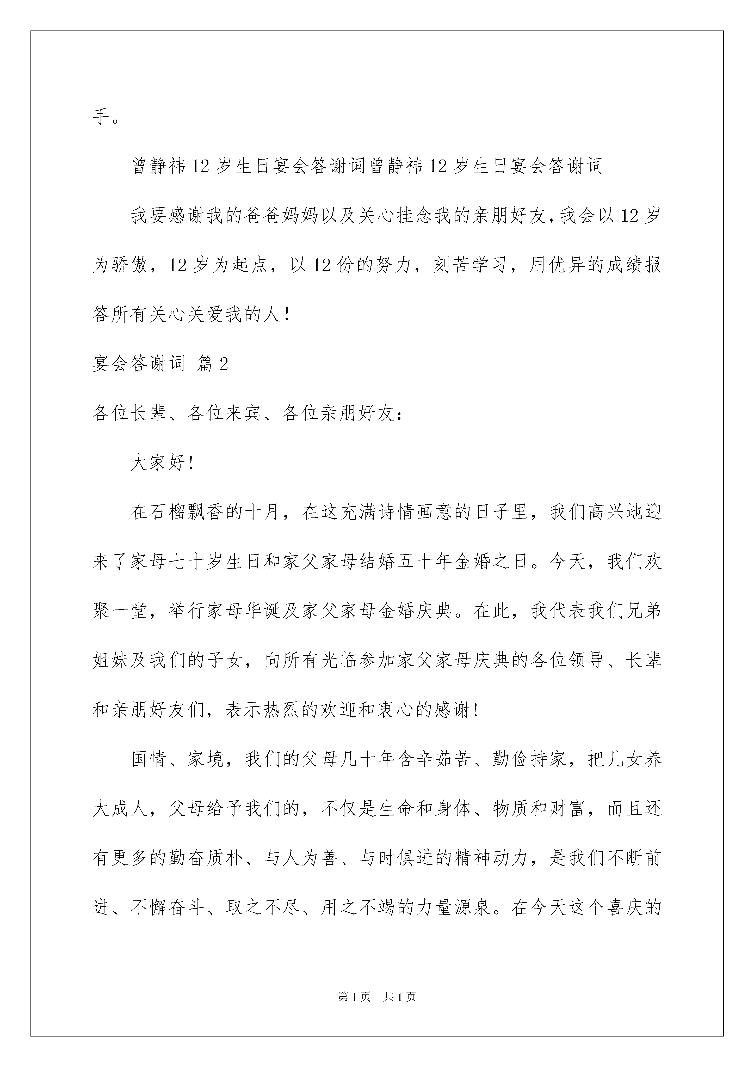2022宴会答谢词模板7篇宴会答谢词模板7篇随着感恩教育不断深化,答谢词使用的频率越来越高,通常答谢词都有语言生动、简洁、得体的特点。还是对答谢词一筹莫展吗?以下是我收集整理的宴会答谢词7篇,希望对大家有所帮助。宴会答谢词篇1尊敬的爷爷奶奶、爸爸妈妈、叔叔阿姨、小朋友们:大家中午好!曾静祎12岁生日宴会答谢词曾静祎12岁生日宴会答谢词今天是我12岁的生日,首先我要感谢大家在百忙之中抽出时间来参加我的生日宴会。12岁意味着从童年时代步入少年时代,12年中包含了父母的艰辛养育,渗透了亲朋好友们的关爱与呵护。从今天开始,从这里出发,我将成为一名花季少年,12岁的列车将承载着我从大家期待的掌声和欢声笑语中缓缓启动,一个值得回忆的金色童年即将与我挥手告别,又一个如诗如梦如画的季节在向我招手。曾静祎12岁生日宴会答谢词曾静祎12岁生日宴会答谢词我要感谢我的爸爸妈妈以及关心挂念我的亲朋好友,我会以12岁为骄傲,12岁为起点,以12份的努力,刻苦学习,用优异的成绩报答所有关心关爱我的人!宴会答谢词篇2各位长辈、各位来宾、各位亲朋好友:大家好!在石榴飘香的十月,在这充满诗情画意的日子里,我们高兴地迎来了家母七十岁生日和家父家母结婚五十年金婚之日。今天,我们欢聚一堂,举行家母华诞及家父家母金婚庆典。在此,我代表我们兄弟姐妹及我们的子女,向所有光临参加家父家母庆典的各位领导、长辈和亲朋好友们,表示热烈的欢迎和衷心的感谢!国情、家境,我们的父母几十年含辛茹苦、勤俭持家,把儿女养大成人,父母给予我们的,不仅是生命和身体、物质和财富,而且还有更多的勤奋质朴、与人为善、与时俱进的精神动力,是我们不断前进、不懈奋斗、取之不尽、用之不竭的力量源泉。在今天这个喜庆的日子里,我们首先要说的就是,衷心感谢二老的养育之恩!甲子重新新甲子,春秋几度度春秋。金婚喜庆庆金婚,满堂欢喜喜满堂。最后,再次感谢各位长辈、亲朋好友的光临,再次祝愿父母晚年幸福,身体健康,长寿无疆!宴会答谢词篇3尊敬的女士们、先生们、各位佳宾们:晚上好!各位为我一家;有(我们各自的)尊敬的师长、至爱的同学、关怀备至的领导、朝夕相处的同事和(我们共同的)无危不至的亲、朋好友和族长老幼。在这阳光明眉的春天里,在为小女与爱婿,婚礼来临之际,受我家庭之邀,在百忙之中前来致贺。顿感茅舍生辉,慌恐中由衷的表示感谢。儿女情系父母心,悠然回首,可谓是,峥嵘岁月稠。望子成龙心切,诸君与我同感时多。昨天的企盼与可望,此际可见一斑,今天即将成婚的他们俩,只是成长的一个历程。明天的辉煌,也就是希望他们过的比我好,比我的过去,今天好,才是我由衷企盼和可望。宾朋好友是生活的联系,感情的升华,友谊的沉淀。需要的时候总有你们身影在。感言。此前企盼;总想看到你的笑脸,总想听听你的声音。此刻;使我如愿。略备便宴薄洒,让友谊与我们同在,留几分清醒,带几分醉,萧萧洒洒喝几杯。再一次感谢大家的祝福。谢谢。宴会答谢词篇4各位长辈,亲朋好友:中午好!在这明媚如花的五月里,在这个风和细雨的祥和日子里,我们迎来了我爸爸八十岁寿辰的庆典时刻,我们万分的大高兴。在这里我代表我们姐弟四人及我们家里的所有成员,向前来光临我爸爸八十岁生日宴会的各位长辈及亲朋好友表示热烈的欢迎和最诚挚的谢意!感谢您们在百忙中能参加这次生日宴会,感谢您们在平日里对我们的关心和照顾。首先,请我们举起酒杯,来共同祝福我的爸爸:祝爸爸八十岁生日快乐安康,福如东海,年年有今日,岁岁有今朝。同时也要祝福今天在座的各位长辈及亲朋好友,天天有个好心情,年年有个好身体。春去秋来,爸爸在风风雨雨中,已走过了八十年的人生历程,阅尽了世间太多的沧桑,他的一生是勤劳的一生,是艰苦的一生,也是善良的一生。他有一颗宽厚仁慈的心,也有一身正气的铮铮硬骨。在工作岗位时,爸爸任劳任怨,默默奉献,是一位好老师。在日常生活中,他是一个严厉又有爱心的好爸爸。我不知道在爸爸的心里,我们是不是他的骄傲,但是在我们姐弟的心里,爸爸永远值得我们自豪,永远是我们人生路上的'灯塔。说句心里话,爸爸您在我的眼里,是最完美的,您睿智、宽容、豁达,严厉又不失爱心,仁慈又不失正气。当爸爸您在我们身边的时候,我们心里就觉得很踏实,很安全。爸爸您是我们全家的顶梁柱,是我们的主心骨,是我们最坚强的后盾,也是我们最安全的避风港湾。爸爸虽然我们已到了不惑之年,但在您的心里我们还是那样的无知,还经常惹您生气,让您操心,我想起来真的很惭愧。爸爸,您真是一位好爸爸,您永远是我们的依靠。爸爸一辈子勤俭持家,不会乱花一分钱,所以,八十年来从未有过像今天这样的生日庆典。我想对爸爸说:这只是孝敬您老人家的一