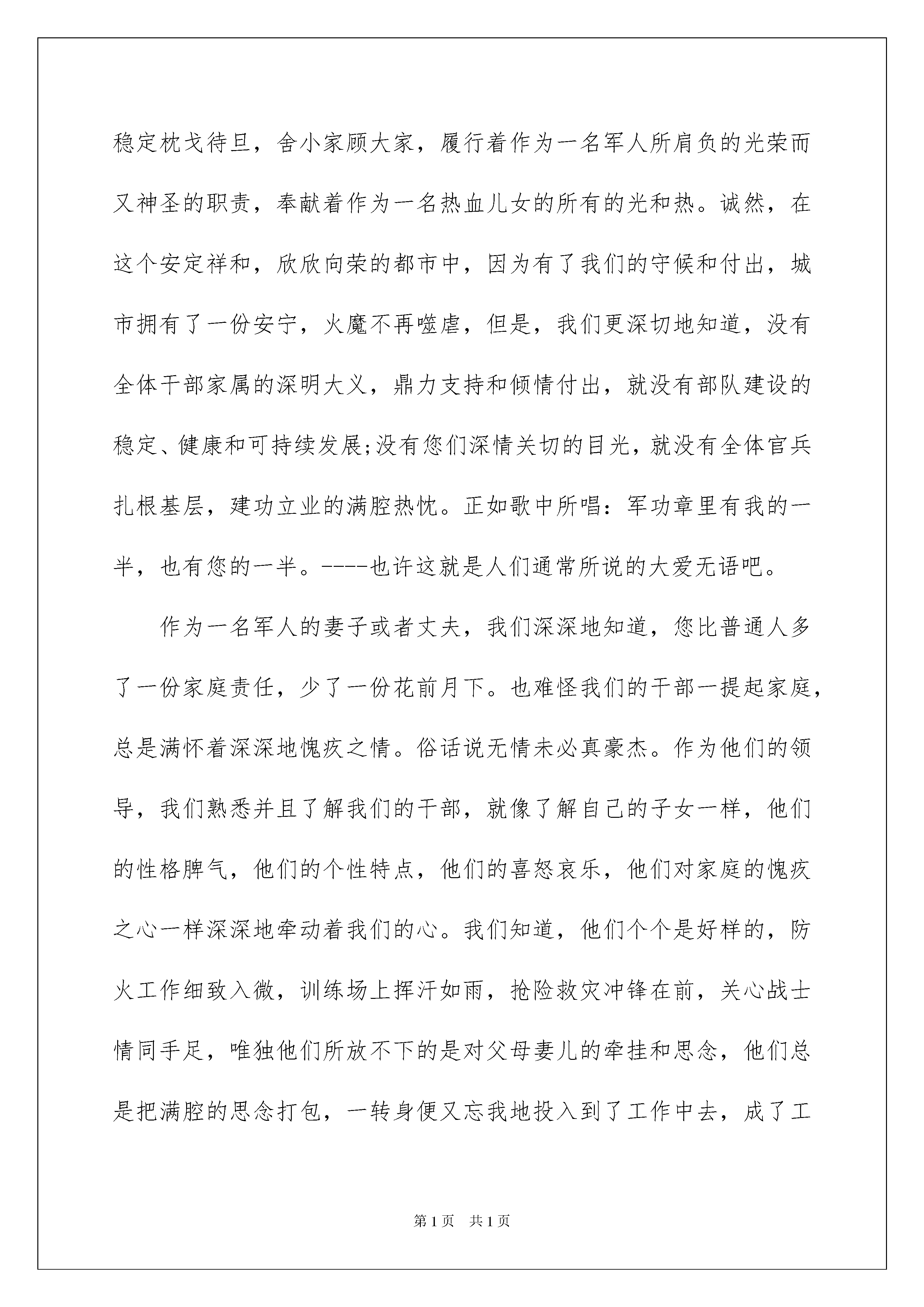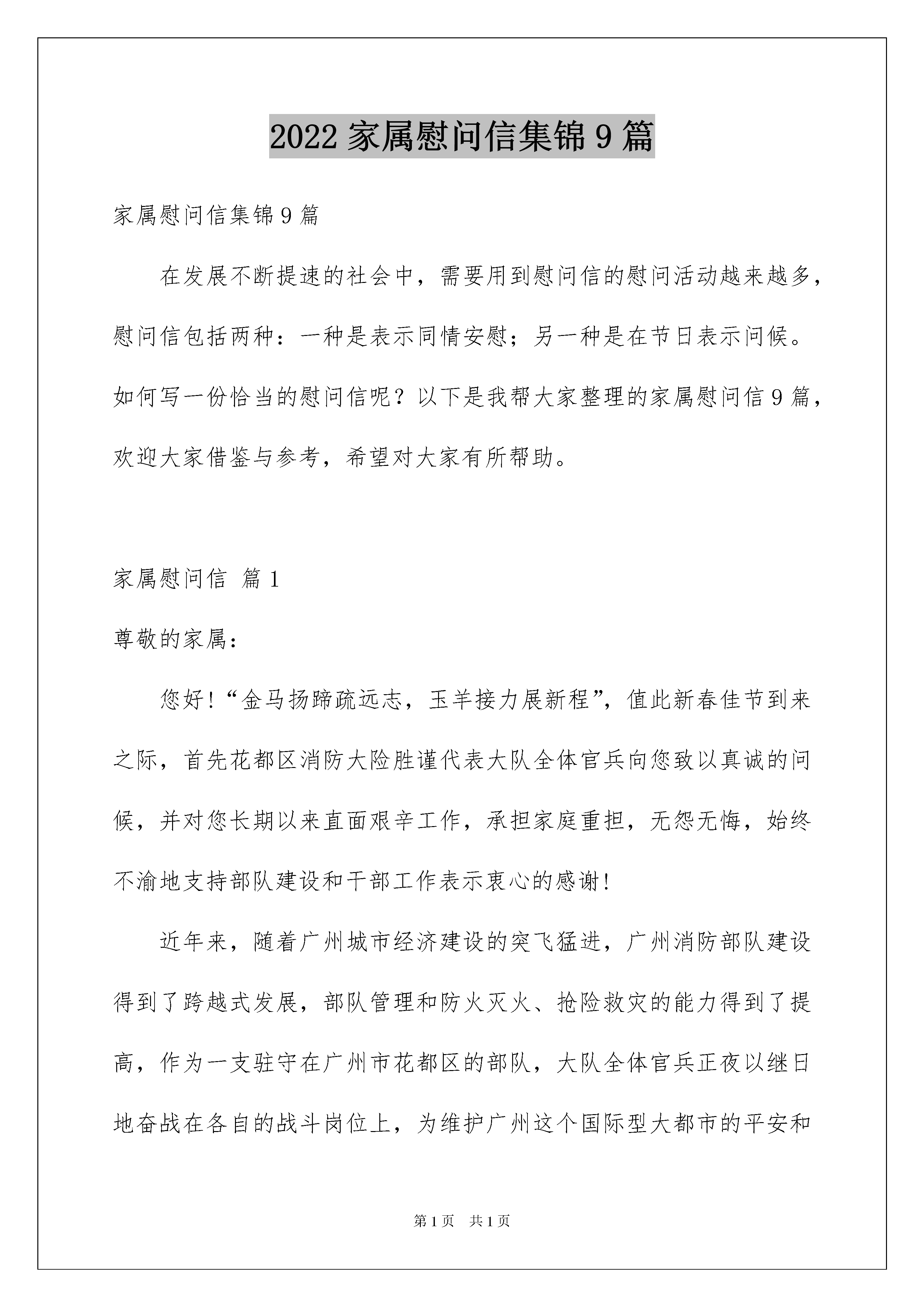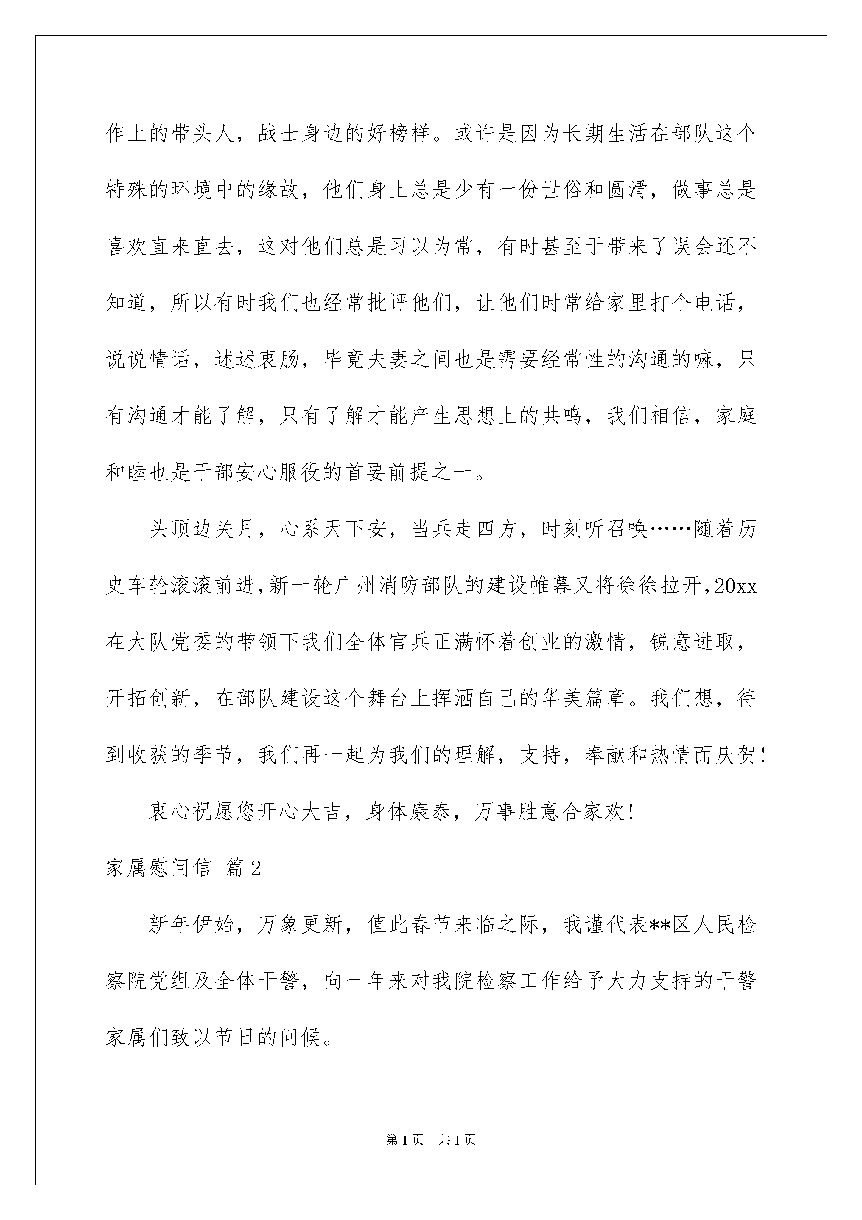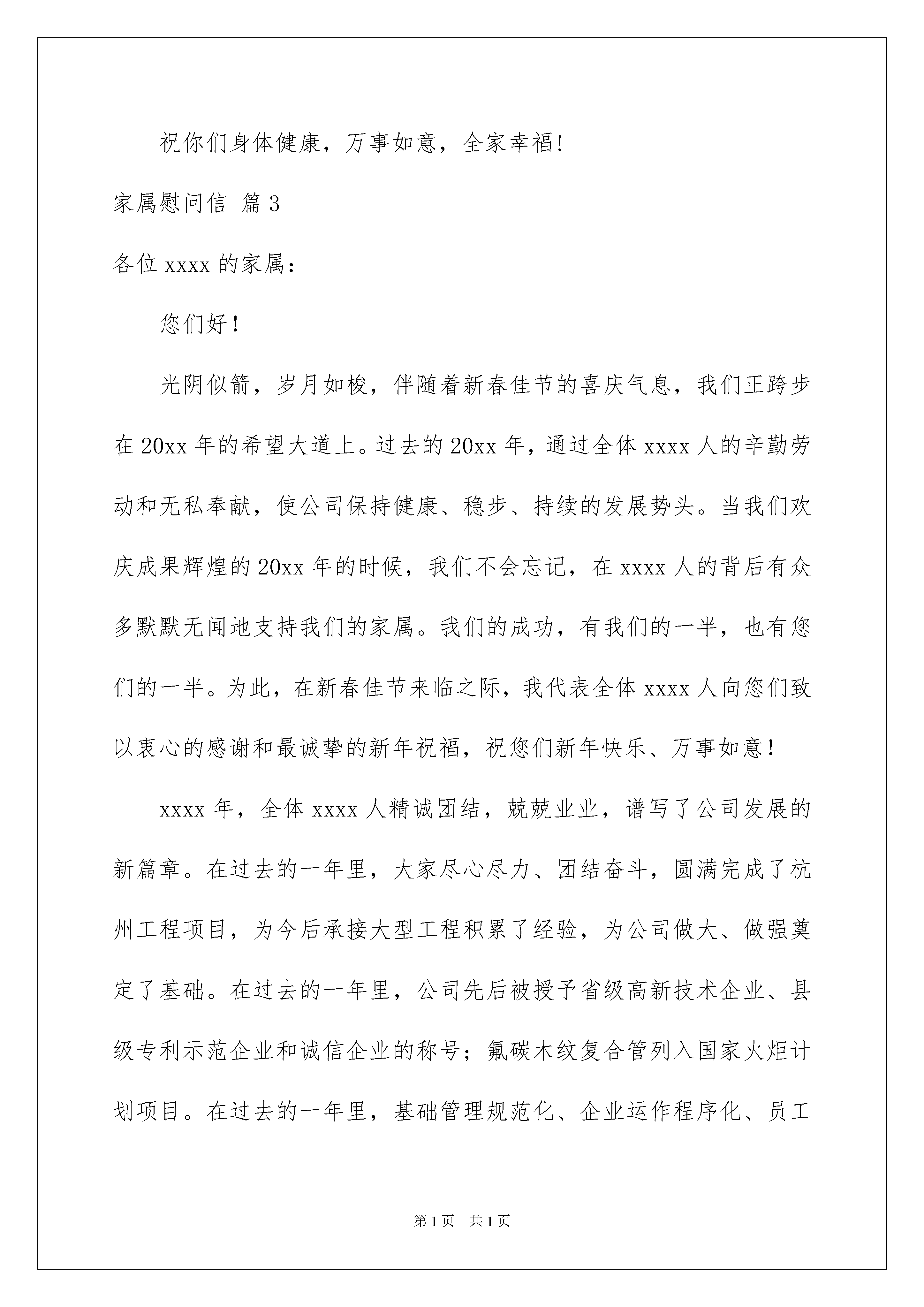 2022家属慰问信集锦9篇家属慰问信集锦9篇在发展不断提速的社会中,需要用到慰问信的慰问活动越来越多,慰问信包括两种:一种是表示同情安慰;另一种是在节日表示问候。如何写一份恰当的慰问信呢?以下是我帮大家整理的家属慰问信9篇,欢迎大家借鉴与参考,希望对大家有所帮助。家属慰问信篇1尊敬的家属:您好!“金马扬蹄疏远志,玉羊接力展新程”,值此新春佳节到来之际,首先花都区消防大险胜谨代表大队全体官兵向您致以真诚的问候,并对您长期以来直面艰辛工作,承担家庭重担,无怨无悔,始终不渝地支持部队建设和干部工作表示衷心的感谢!近年来,随着广州城市经济建设的突飞猛进,广州消防部队建设得到了跨越式发展,部队管理和防火灭火、抢险救灾的能力得到了提高,作为一支驻守在广州市花都区的部队,大队全体官兵正夜以继日地奋战在各自的战斗岗位上,为维护广州这个国际型大都市的平安和稳定枕戈待旦,舍小家顾大家,履行着作为一名军人所肩负的光荣而又神圣的职责,奉献着作为一名热血儿女的所有的光和热。诚然,在这个安定祥和,欣欣向荣的都市中,因为有了我们的守候和付出,城市拥有了一份安宁,火魔不再噬虐,但是,我们更深切地知道,没有全体干部家属的深明大义,鼎力支持和倾情付出,就没有部队建设的稳定、健康和可持续发展;没有您们深情关切的目光,就没有全体官兵扎根基层,建功立业的满腔热忱。正如歌中所唱:军功章里有我的一半,也有您的一半。----也许这就是人们通常所说的大爱无语吧。作为一名军人的妻子或者丈夫,我们深深地知道,您比普通人多了一份家庭责任,少了一份花前月下。也难怪我们的干部一提起家庭,总是满怀着深深地愧疚之情。俗话说无情未必真豪杰。作为他们的领导,我们熟悉并且了解我们的干部,就像了解自己的子女一样,他们的性格脾气,他们的个性特点,他们的喜怒哀乐,他们对家庭的愧疚之心一样深深地牵动着我们的心。我们知道,他们个个是好样的,防火工作细致入微,训练场上挥汗如雨,抢险救灾冲锋在前,关心战士情同手足,唯独他们所放不下的是对父母妻儿的牵挂和思念,他们总是把满腔的思念打包,一转身便又忘我地投入到了工作中去,成了工作上的带头人,战士身边的好榜样。或许是因为长期生活在部队这个特殊的环境中的缘故,他们身上总是少有一份世俗和圆滑,做事总是喜欢直来直去,这对他们总是习以为常,有时甚至于带来了误会还不知道,所以有时我们也经常批评他们,让他们时常给家里打个电话,说说情话,述述衷肠,毕竟夫妻之间也是需要经常性的沟通的嘛,只有沟通才能了解,只有了解才能产生思想上的共鸣,我们相信,家庭和睦也是干部安心服役的首要前提之一。头顶边关月,心系天下安,当兵走四方,时刻听召唤……随着历史车轮滚滚前进,新一轮广州消防部队的建设帷幕又将徐徐拉开,20xx在大队党委的带领下我们全体官兵正满怀着创业的激情,锐意进取,开拓创新,在部队建设这个舞台上挥洒自己的华美篇章。我们想,待到收获的季节,我们再一起为我们的理解,支持,奉献和热情而庆贺!衷心祝愿您开心大吉,身体康泰,万事胜意合家欢!家属慰问信篇2新年伊始,万象更新,值此春节来临之际,我谨代表**区人民检察院党组及全体干警,向一年来对我院检察工作给予大力支持的干警家属们致以节日的问候。20xx年,**区人民检察院在区委和市检察院的正确领导下,在全体干警家属大力支持下,通过全体干警的辛勤努力,**区人民检察院步入了加速前进的轨道,坚持素质兴检,业务立检,科技强检,严优治检,思想进一步统一,机制进一步完善,形象进一步提升,为贯彻落实科学发展观,建设“和谐社会”做出了一定贡献,各项工作受到上级院和各级党政领导的肯定和好评,涌现出许多亮点。在20xx年,我院被授予全省“青少年维权岗先进单位”、全省“文明接待室先进单位”荣誉称号;基础建设也有长足进步,我院办案、技侦大楼建设已封顶。所取得的成绩,都是区委和市检察院正确领导、社会各界大力支持、院党组一班人团结协作、全院干警奋力拼搏、家属们默契支持、无私奉献的结果。你们的支持是我们奋勇前进的动力,是我们迈向成功的基石,我代表**区人民检察院向你们致以崇高的敬意,**区人民检察院不会忘记你们——支持成就了**检察事业成功业绩的人们。回顾、展望,我们信心百倍,我们豪情满怀。站在新的'起点,我们每一个人将铭记时代赋予我们的使命,任重道远,须更加努力。让我们团结起来,开拓创新,励精图治,奋发有为,全面实现20xx年的奋斗目标,开创检察事业的新局面!祝你们身体健康,万事如意,全家幸福!家属慰问信篇3各位xxxx的家属:您们好!光阴似箭,岁月如梭,伴随着新春佳节的喜庆气息,我们正跨步在20xx年的希望大道上。过