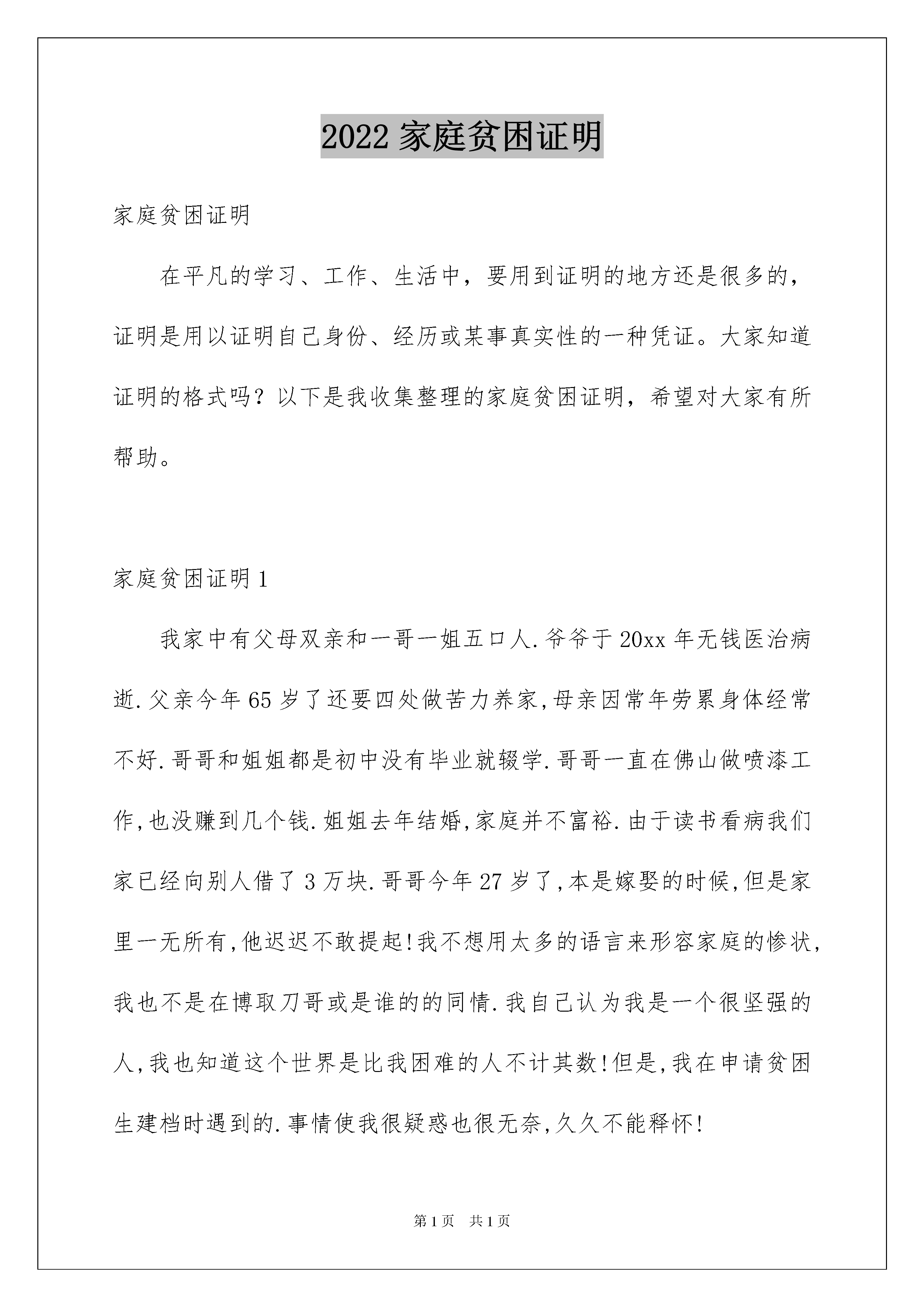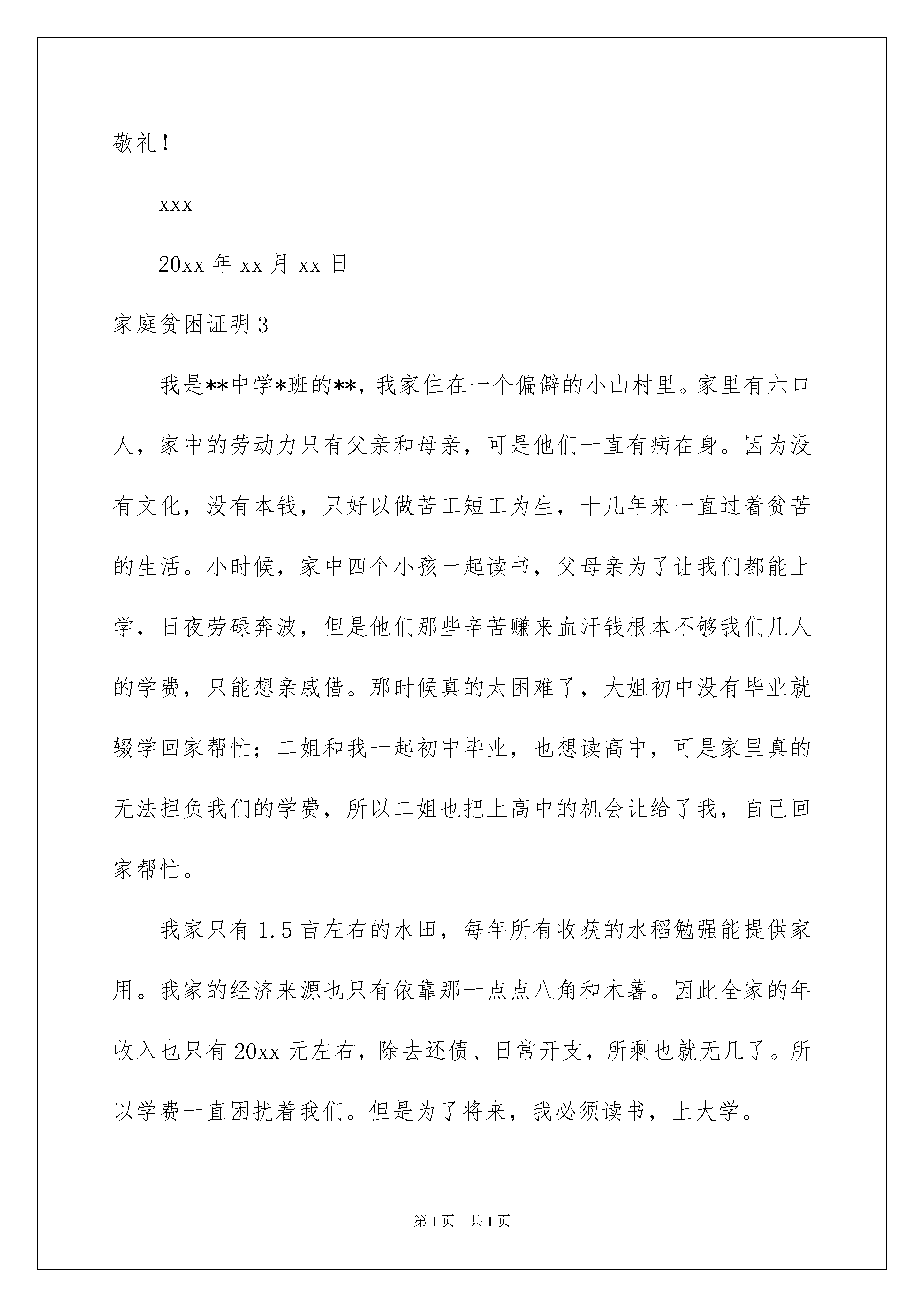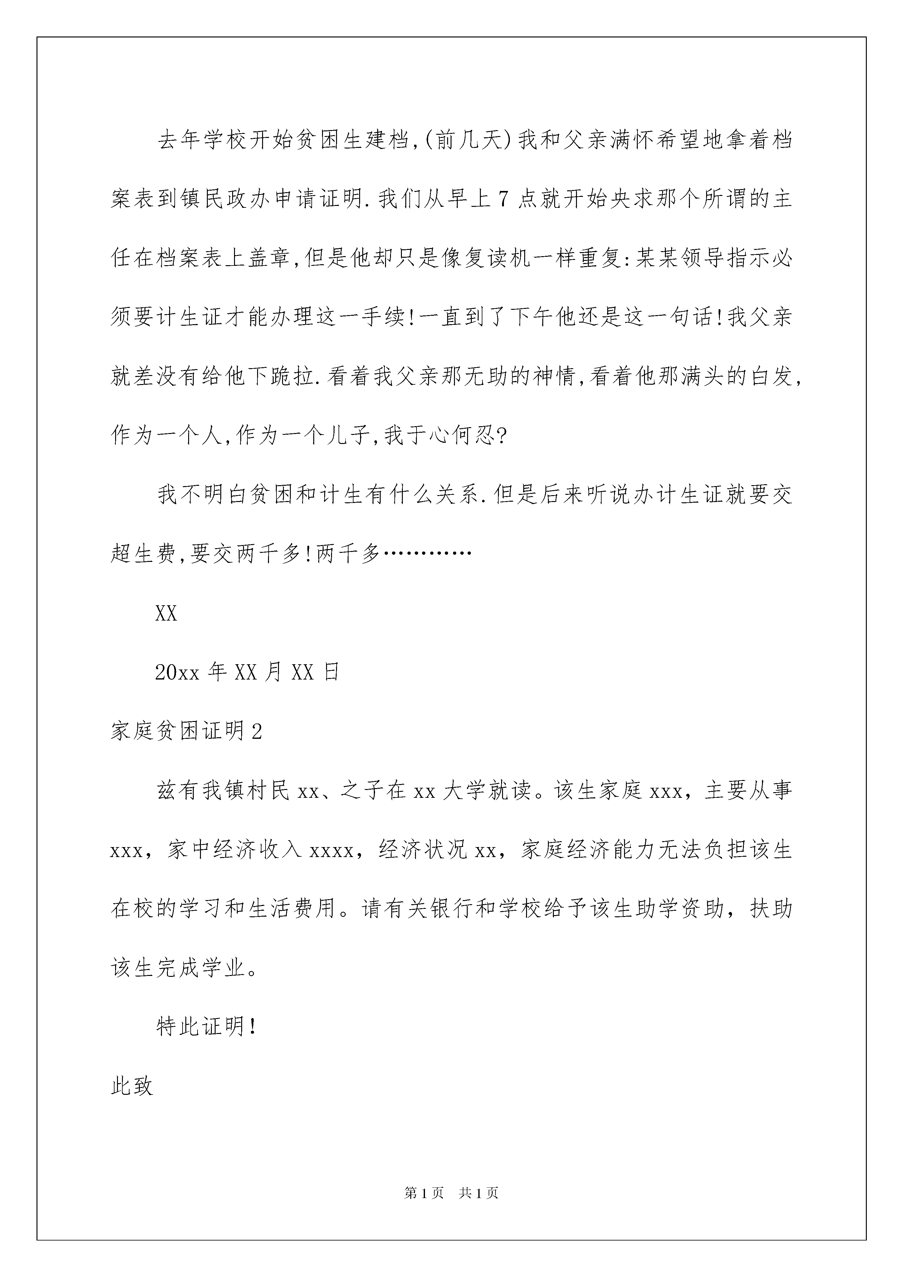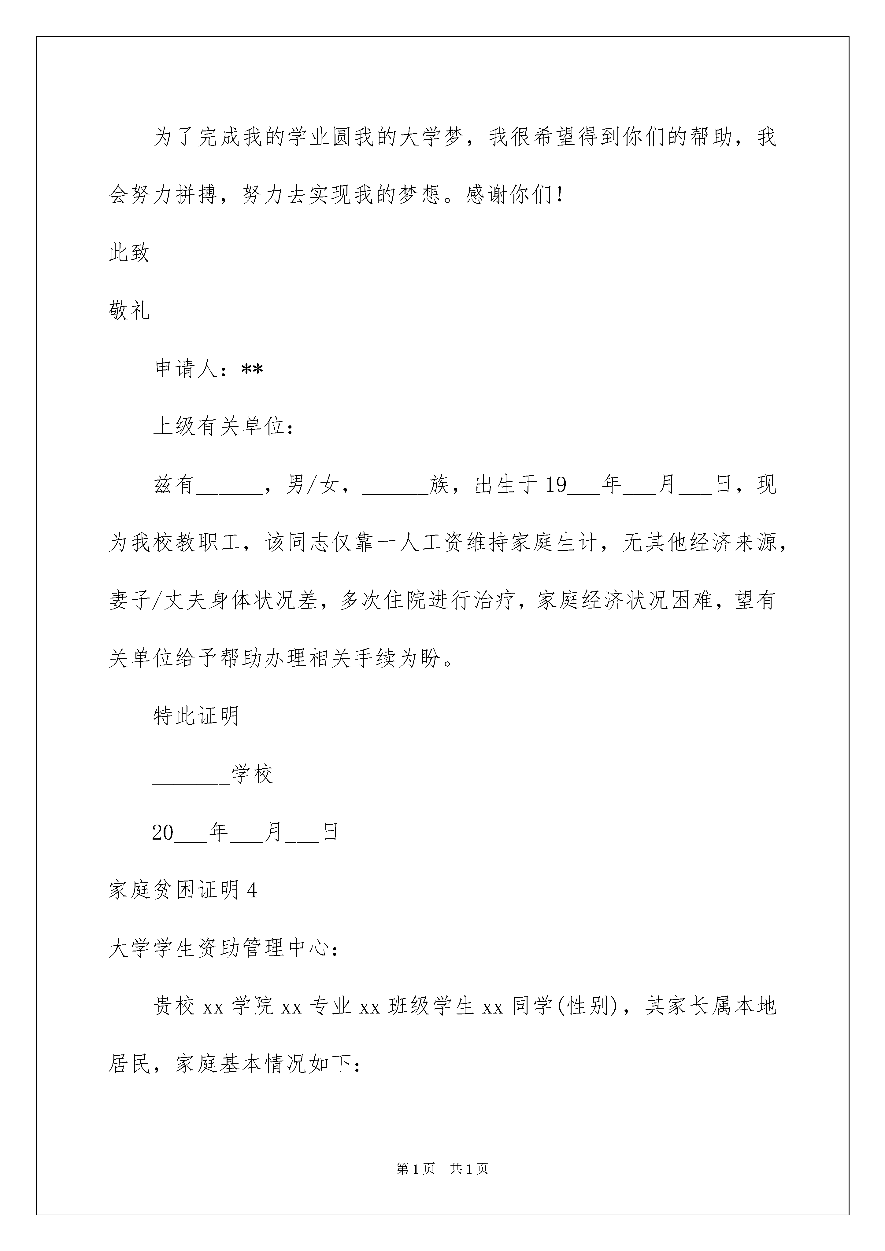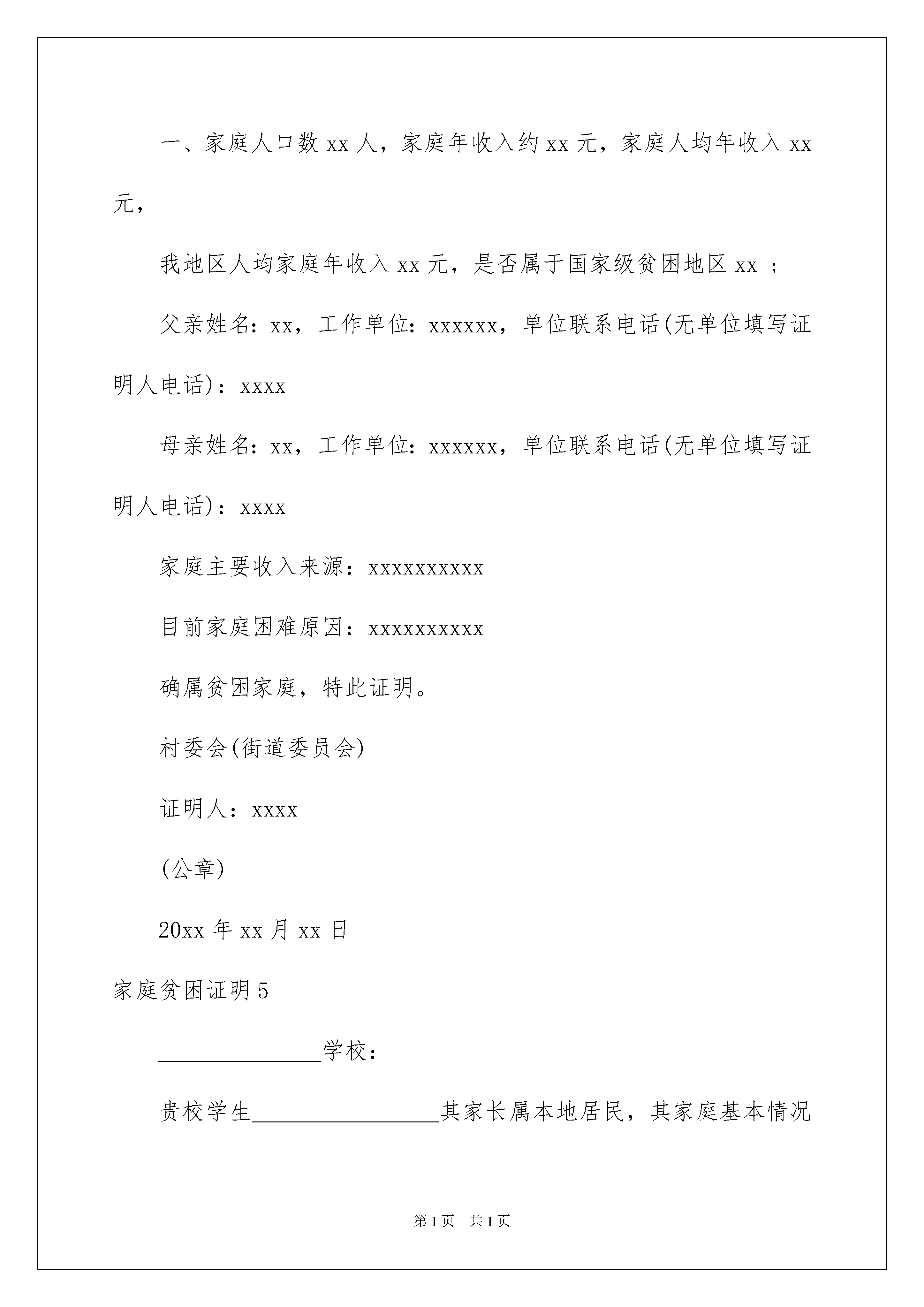 2022家庭贫困证明家庭贫困证明在平凡的学习、工作、生活中,要用到证明的地方还是很多的,证明是用以证明自己身份、经历或某事真实性的一种凭证。大家知道证明的格式吗?以下是我收集整理的家庭贫困证明,希望对大家有所帮助。家庭贫困证明1我家中有父母双亲和一哥一姐五口人.爷爷于20xx年无钱医治病逝.父亲今年65岁了还要四处做苦力养家,母亲因常年劳累身体经常不好.哥哥和姐姐都是初中没有毕业就辍学.哥哥一直在佛山做喷漆工作,也没赚到几个钱.姐姐去年结婚,家庭并不富裕.由于读书看病我们家已经向别人借了3万块.哥哥今年27岁了,本是嫁娶的时候,但是家里一无所有,他迟迟不敢提起!我不想用太多的语言来形容家庭的惨状,我也不是在博取刀哥或是谁的的同情.我自己认为我是一个很坚强的人,我也知道这个世界是比我困难的人不计其数!但是,我在申请贫困生建档时遇到的.事情使我很疑惑也很无奈,久久不能释怀!去年学校开始贫困生建档,(前几天)我和父亲满怀希望地拿着档案表到镇民政办申请证明.我们从早上7点就开始央求那个所谓的主任在档案表上盖章,但是他却只是像复读机一样重复:某某领导指示必须要计生证才能办理这一手续!一直到了下午他还是这一句话!我父亲就差没有给他下跪拉.看着我父亲那无助的神情,看着他那满头的白发,作为一个人,作为一个儿子,我于心何忍?我不明白贫困和计生有什么关系.但是后来听说办计生证就要交超生费,要交两千多!两千多…………XX20xx年XX月XX日家庭贫困证明2兹有我镇村民xx、之子在xx大学就读。该生家庭xxx,主要从事xxx,家中经济收入xxxx,经济状况xx,家庭经济能力无法负担该生在校的学习和生活费用。请有关银行和学校给予该生助学资助,扶助该生完成学业。特此证明!此致敬礼!xxx20xx年xx月xx日家庭贫困证明3我是**中学*班的**,我家住在一个偏僻的小山村里。家里有六口人,家中的劳动力只有父亲和母亲,可是他们一直有病在身。因为没有文化,没有本钱,只好以做苦工短工为生,十几年来一直过着贫苦的生活。小时候,家中四个小孩一起读书,父母亲为了让我们都能上学,日夜劳碌奔波,但是他们那些辛苦赚来血汗钱根本不够我们几人的学费,只能想亲戚借。那时候真的太困难了,大姐初中没有毕业就辍学回家帮忙;二姐和我一起初中毕业,也想读高中,可是家里真的无法担负我们的学费,所以二姐也把上高中的机会让给了我,自己回家帮忙。我家只有1.5亩左右的水田,每年所有收获的水稻勉强能提供家用。我家的经济来源也只有依靠那一点点八角和木薯。因此全家的年收入也只有20xx元左右,除去还债、日常开支,所剩也就无几了。所以学费一直困扰着我们。但是为了将来,我必须读书,上大学。为了完成我的学业圆我的大学梦,我很希望得到你们的帮助,我会努力拼搏,努力去实现我的梦想。感谢你们!此致敬礼申请人:**上级有关单位:兹有______,男/女,______族,出生于19___年___月___日,现为我校教职工,该同志仅靠一人工资维持家庭生计,无其他经济来源,妻子/丈夫身体状况差,多次住院进行治疗,家庭经济状况困难,望有关单位给予帮助办理相关手续为盼。特此证明_______学校20___年___月___日家庭贫困证明4大学学生资助管理中心:贵校xx学院xx专业xx班级学生xx同学(性别),其家长属本地居民,家庭基本情况如下:一、家庭人口数xx人,家庭年收入约xx元,家庭人均年收入xx元,我地区人均家庭年收入xx元,是否属于国家级贫困地区xx;父亲姓名:xx,工作单位:xxxxxx,单位联系电话(无单位填写证明人电话):xxxx母亲姓名:xx,工作单位:xxxxxx,单位联系电话(无单位填写证明人电话):xxxx家庭主要收入来源:xxxxxxxxxx目前家庭困难原因:xxxxxxxxxx确属贫困家庭,特此证明。村委会(街道委员会)证明人:xxxx(公章)20xx年xx月xx日家庭贫困证明5_______学校:贵校学生________其家长属本地居民,其家庭基本情况如下:一、家庭人口________元;二、主要收入来源:___________其家长属本地居民,其家庭基本情况如下_________________________(填写)三、目前家庭主要困难:□收入来源单一□劳动力较少□医疗支出较大□其它_______________(填写)加盖公章年月日盖章单位联系电话:____(区号)_________乡、镇或街道民政部门加盖公章年月日盖章单位联系电话:____(区号)________家庭贫困证明6上级有关单位:兹有______,男/女,______族,出生