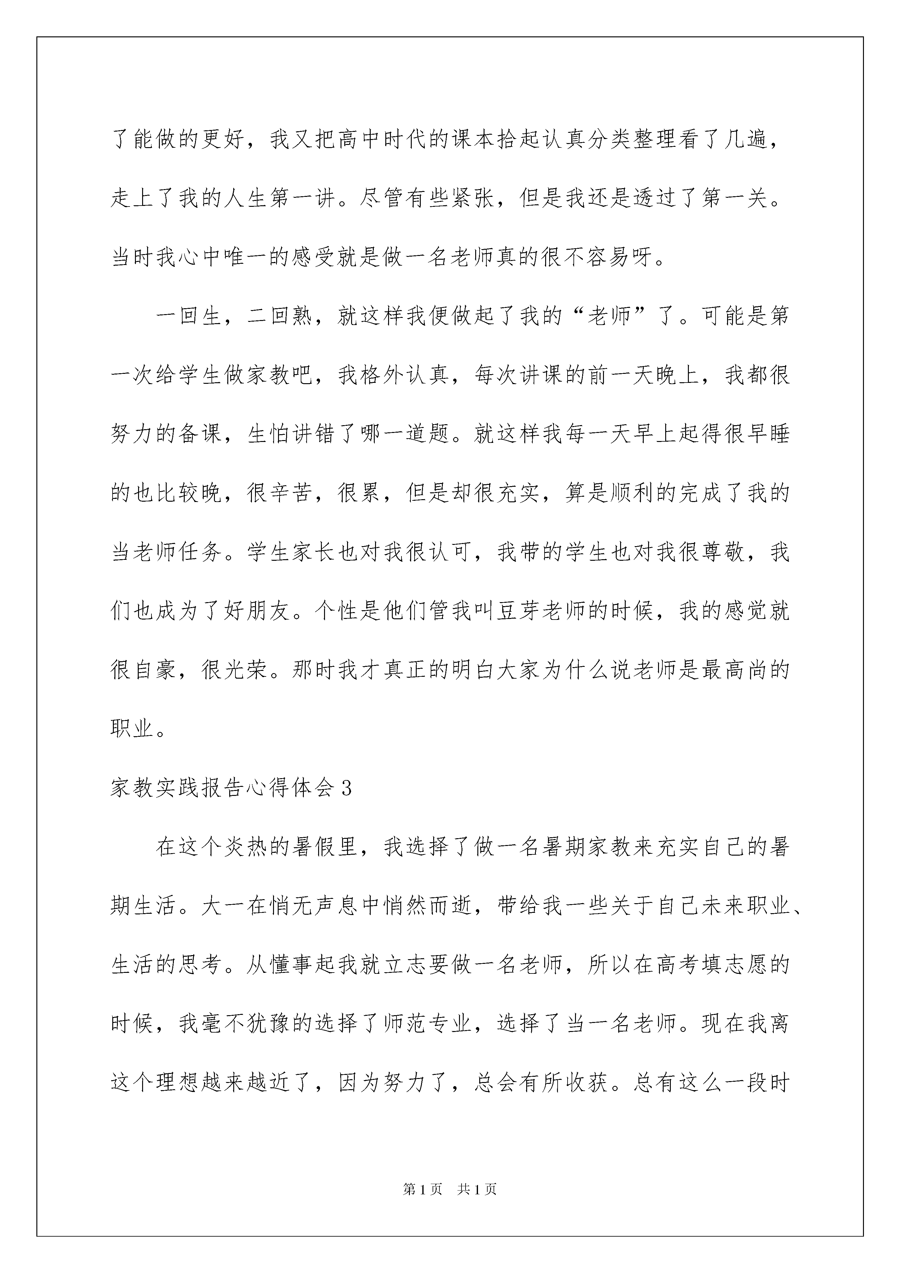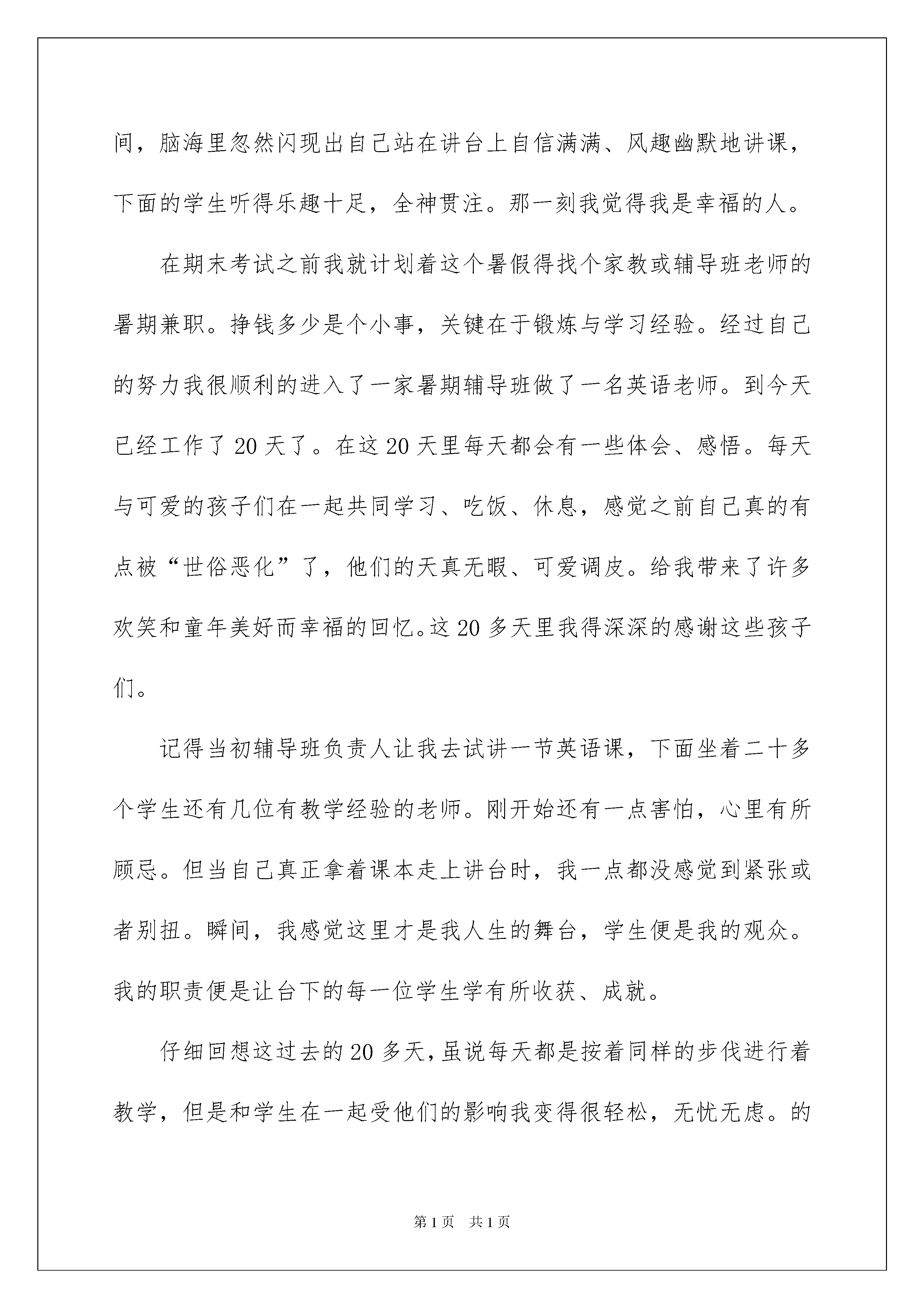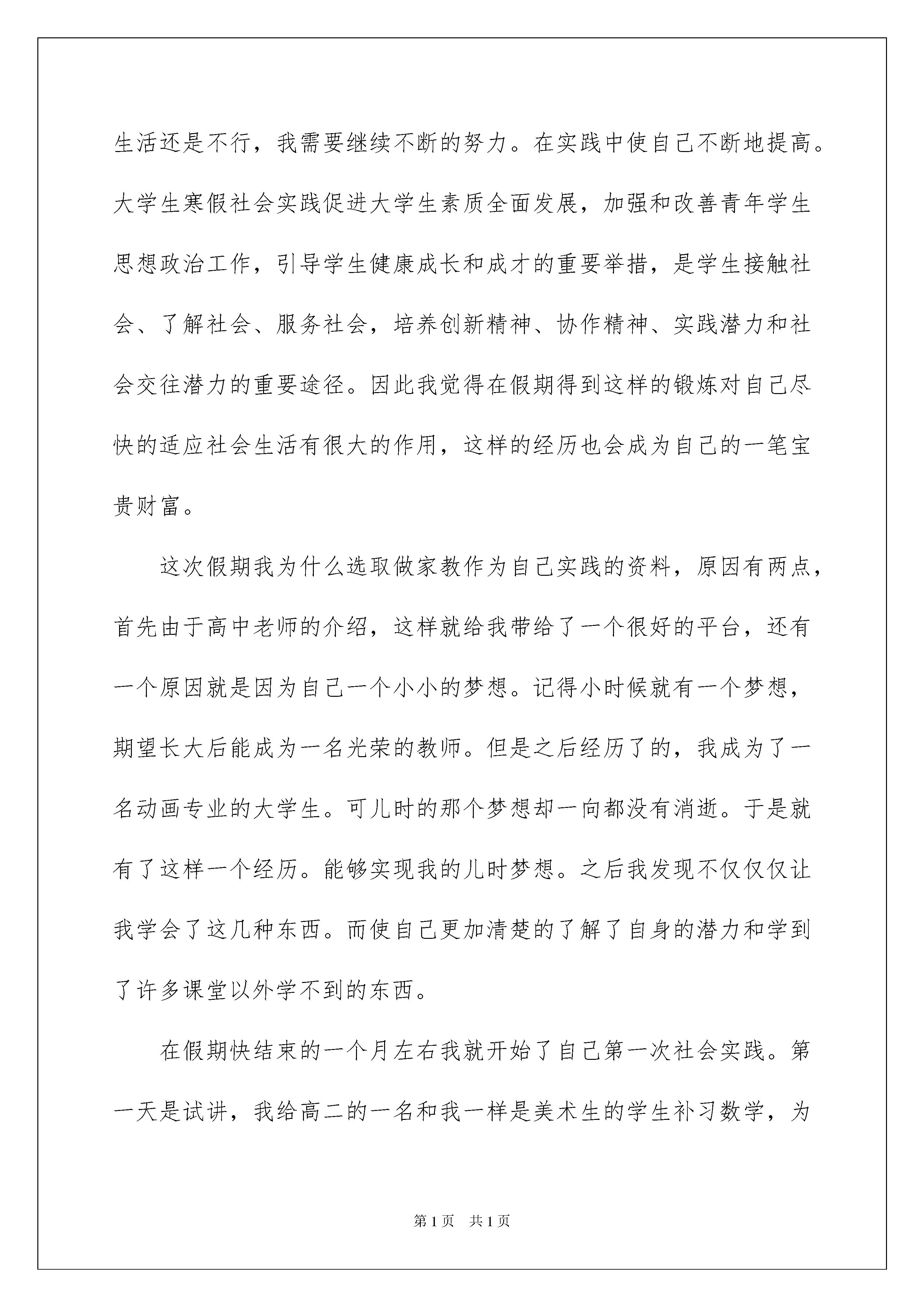 2022家教实践报告心得体会家教实践报告心得体会在当下社会,报告的适用范围越来越广泛,其在写作上有一定的技巧。其实写报告并没有想象中那么难,以下是我收集整理的家教实践报告心得体会,供大家参考借鉴,希望可以帮助到有需要的朋友。家教实践报告心得体会1转眼他就要开学了,我也完毕了家教生活。他的学习立场比以前正直了很多,学习也晓得用力了,以前的疑问问题基本获得调查决。这就是我家教的结果。他的爸爸妈妈很感谢我这段时间对他的协助,要我不按期地给他打电话来督促他。我会坚持这样做下去。家教生活让我想起了很多东四,获得了很多感受。我以为,城市与乡村是两个天壤之别的世界。发展在这两个世界的人们,在某些方面会有分歧的显示。乡村的孩子都要到地里去帮爸爸妈妈干些粗重的农活儿,他们可以领会到劳动的困难,深入懂得幸福生活的来之不易。因而,他们不会懒散。相反,会更加勤奋地工作和学习,为的是可以过上更加幸福的生活。但是,城市家庭普通生活很优裕,孩子发展在如此的情况里,单个甚至不会去喫苦。上学下学有人接送,提出的各种要求都邑获得知足,甚至连本人的房间都邑有人整治清扫。生活如此闲适,就很轻易养成懒散的习气。因而,从小培育孩子的喫苦才能很有需要。城市孩子短少像乡村孩子那样多的喫苦时机,我以为这是一种遗憾。以上就是我的收成和领会。同时,家教也让我认识到了本身的不足。这些收成和领会将影响我今后的学习生活,对今后的工作发生积极的影响。家教实践报告心得体会2时间飞逝,在大学的第一个假期很快就结束了,但是我还是沉醉在自己寒假社会实践的收获中。因此在大学的第一个假期,我有了一个充实的、难忘的社会实践经历。我度过了一段被人称为“老师”的难忘的,阳光的日子。我在当老师的这次实践中,我感受到了不一样的东西,是我之前没有接触到的东西,这对我来说,是一项很难得到更好的发挥的前提。在不断的发展中,我有了更多的进步,我明白自己需要更多的进步,此刻的我已经很好的适应了学校生活,但是社会生活还是不行,我需要继续不断的努力。在实践中使自己不断地提高。大学生寒假社会实践促进大学生素质全面发展,加强和改善青年学生思想政治工作,引导学生健康成长和成才的重要举措,是学生接触社会、了解社会、服务社会,培养创新精神、协作精神、实践潜力和社会交往潜力的重要途径。因此我觉得在假期得到这样的锻炼对自己尽快的适应社会生活有很大的作用,这样的经历也会成为自己的一笔宝贵财富。这次假期我为什么选取做家教作为自己实践的资料,原因有两点,首先由于高中老师的介绍,这样就给我带给了一个很好的平台,还有一个原因就是因为自己一个小小的梦想。记得小时候就有一个梦想,期望长大后能成为一名光荣的教师。但是之后经历了的,我成为了一名动画专业的大学生。可儿时的那个梦想却一向都没有消逝。于是就有了这样一个经历。能够实现我的儿时梦想。之后我发现不仅仅仅让我学会了这几种东西。而使自己更加清楚的了解了自身的潜力和学到了许多课堂以外学不到的东西。在假期快结束的一个月左右我就开始了自己第一次社会实践。第一天是试讲,我给高二的一名和我一样是美术生的学生补习数学,为了能做的更好,我又把高中时代的课本拾起认真分类整理看了几遍,走上了我的人生第一讲。尽管有些紧张,但是我还是透过了第一关。当时我心中唯一的感受就是做一名老师真的很不容易呀。一回生,二回熟,就这样我便做起了我的“老师”了。可能是第一次给学生做家教吧,我格外认真,每次讲课的前一天晚上,我都很努力的备课,生怕讲错了哪一道题。就这样我每一天早上起得很早睡的也比较晚,很辛苦,很累,但是却很充实,算是顺利的完成了我的当老师任务。学生家长也对我很认可,我带的学生也对我很尊敬,我们也成为了好朋友。个性是他们管我叫豆芽老师的时候,我的感觉就很自豪,很光荣。那时我才真正的明白大家为什么说老师是最高尚的职业。家教实践报告心得体会3在这个炎热的暑假里,我选择了做一名暑期家教来充实自己的暑期生活。大一在悄无声息中悄然而逝,带给我一些关于自己未来职业、生活的思考。从懂事起我就立志要做一名老师,所以在高考填志愿的时候,我毫不犹豫的选择了师范专业,选择了当一名老师。现在我离这个理想越来越近了,因为努力了,总会有所收获。总有这么一段时间,脑海里忽然闪现出自己站在讲台上自信满满、风趣幽默地讲课,下面的学生听得乐趣十足,全神贯注。那一刻我觉得我是幸福的人。在期末考试之前我就计划着这个暑假得找个家教或辅导班老师的暑期兼职。挣钱多少是个小事,关键在于锻炼与学习经验。经过自己的努力我很顺利的进入了一家暑期辅导班做了一名英语老师。到今天已经工作了20天了。在这20天里每天都会有一些体会、感悟