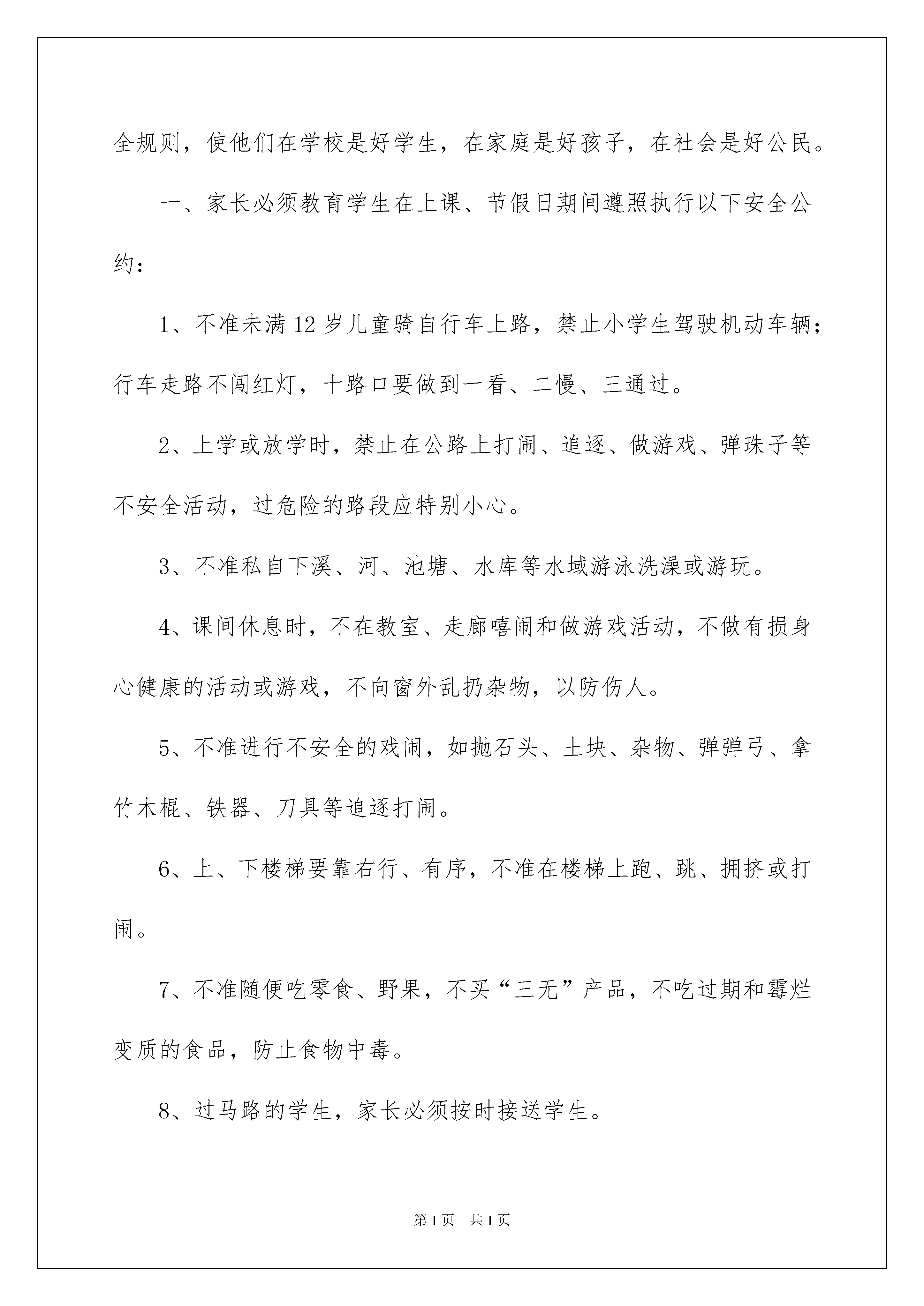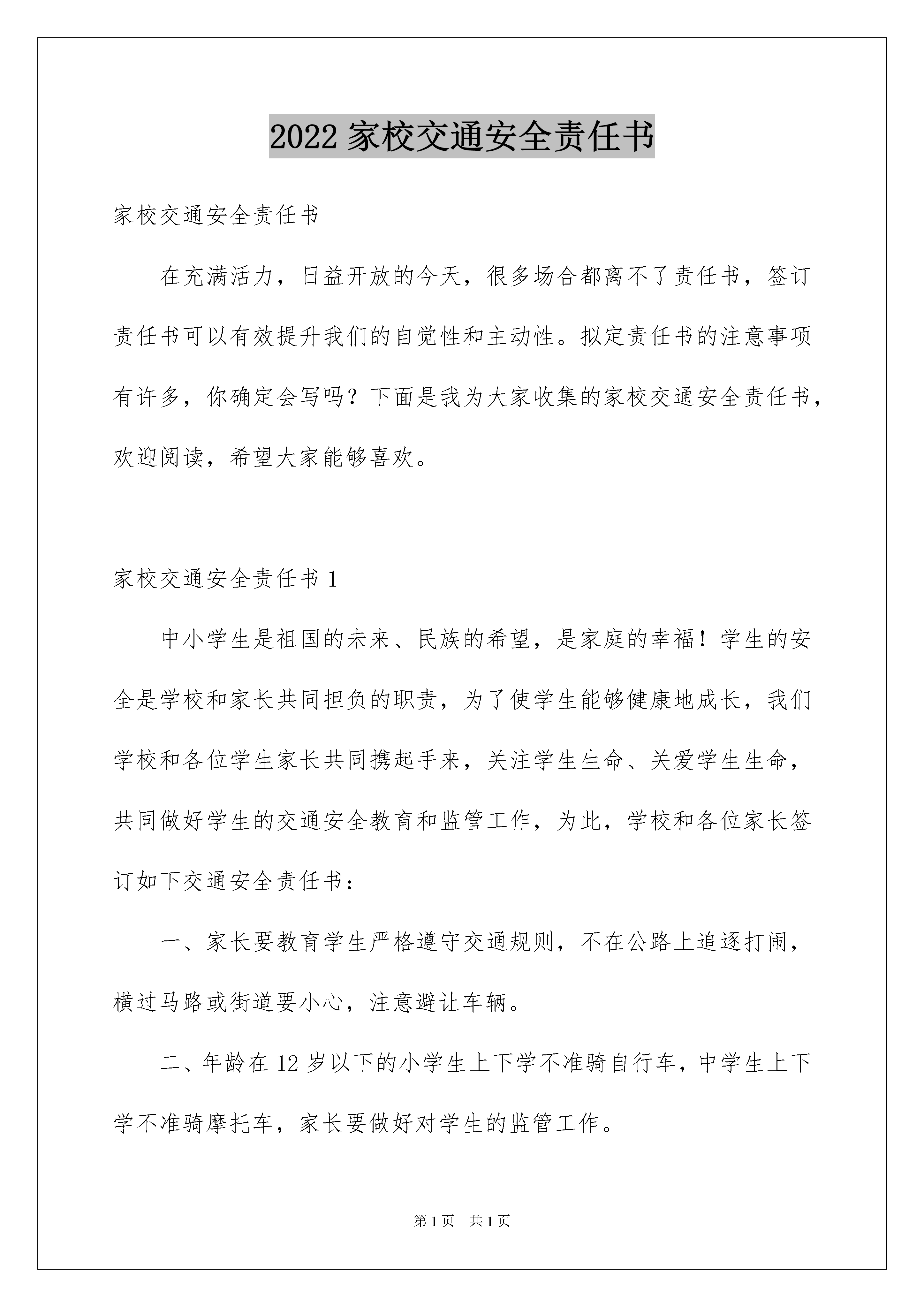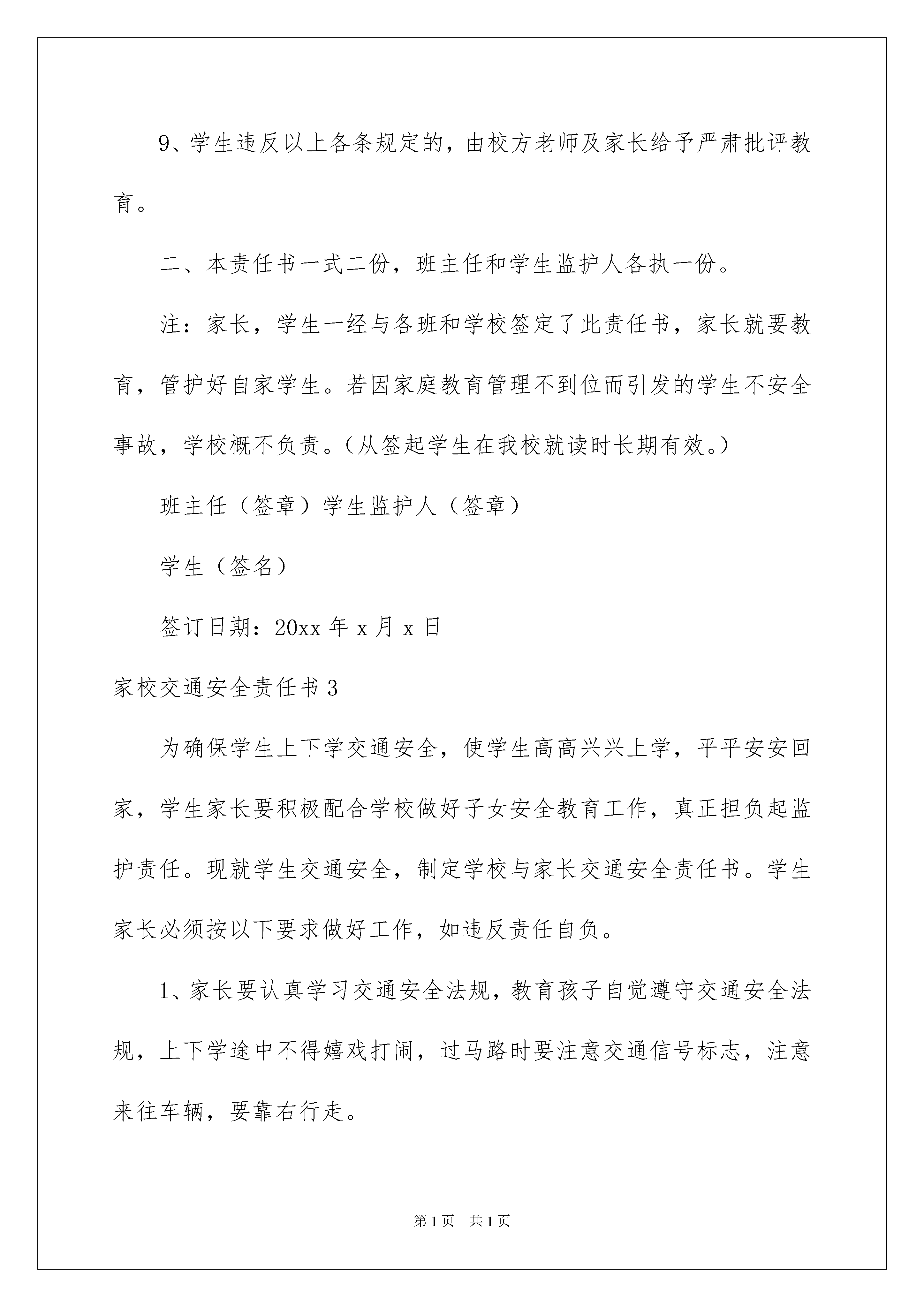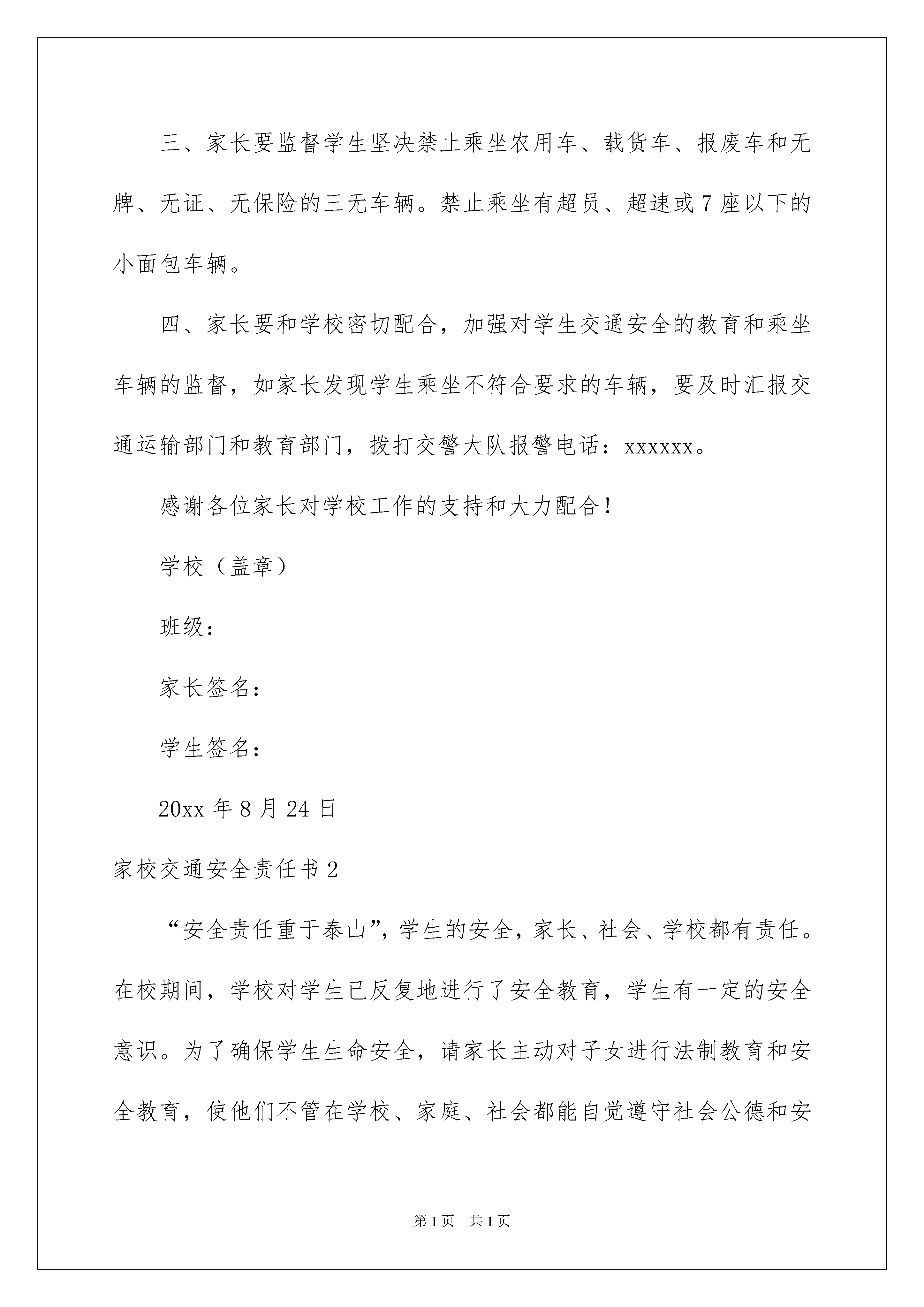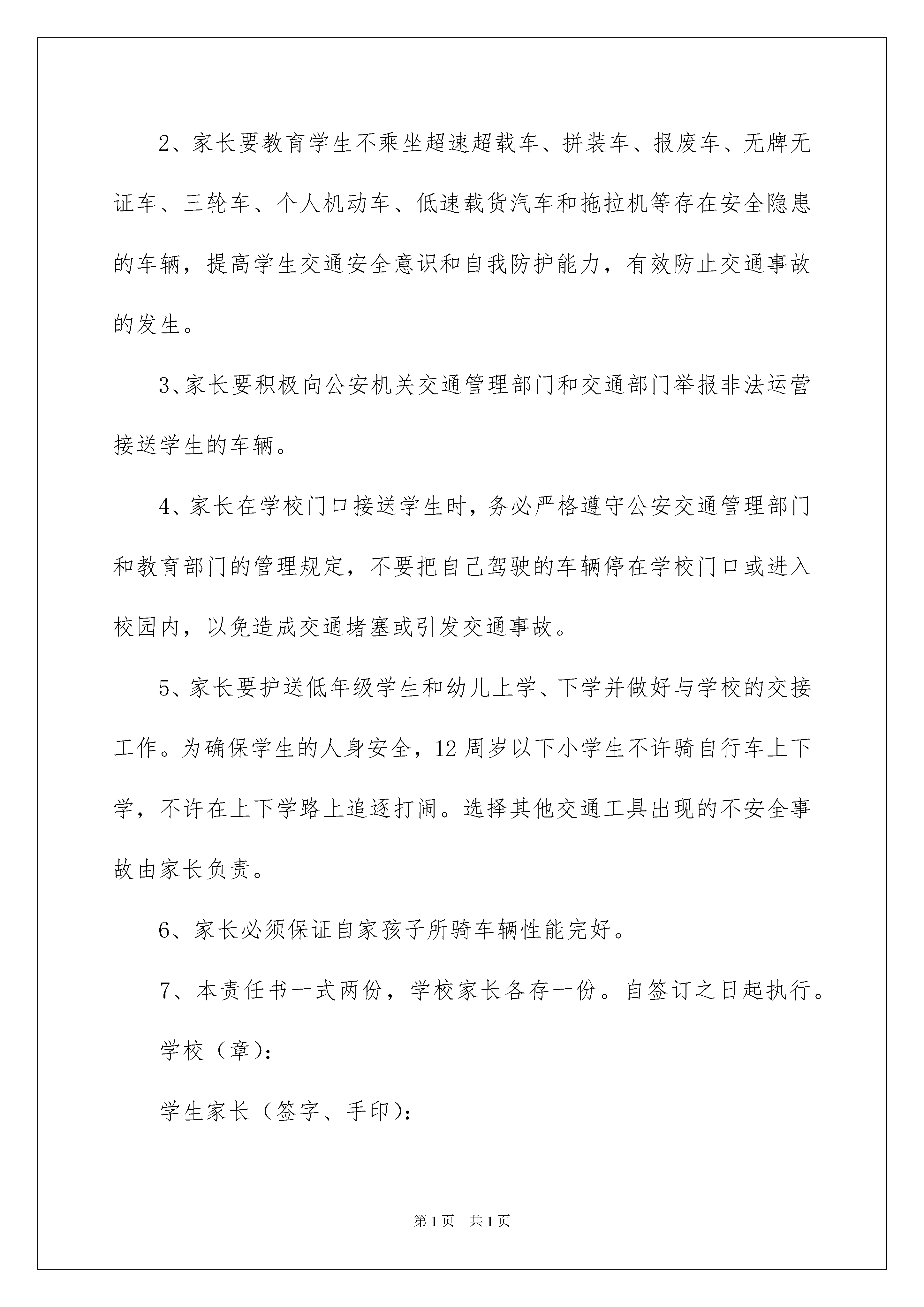 2022家校交通安全责任书家校交通安全责任书在充满活力,日益开放的今天,很多场合都离不了责任书,签订责任书可以有效提升我们的自觉性和主动性。拟定责任书的注意事项有许多,你确定会写吗?下面是我为大家收集的家校交通安全责任书,欢迎阅读,希望大家能够喜欢。家校交通安全责任书1中小学生是祖国的未来、民族的希望,是家庭的幸福!学生的安全是学校和家长共同担负的职责,为了使学生能够健康地成长,我们学校和各位学生家长共同携起手来,关注学生生命、关爱学生生命,共同做好学生的交通安全教育和监管工作,为此,学校和各位家长签订如下交通安全责任书:一、家长要教育学生严格遵守交通规则,不在公路上追逐打闹,横过马路或街道要小心,注意避让车辆。二、年龄在12岁以下的小学生上下学不准骑自行车,中学生上下学不准骑摩托车,家长要做好对学生的监管工作。三、家长要监督学生坚决禁止乘坐农用车、载货车、报废车和无牌、无证、无保险的三无车辆。禁止乘坐有超员、超速或7座以下的小面包车辆。四、家长要和学校密切配合,加强对学生交通安全的教育和乘坐车辆的监督,如家长发现学生乘坐不符合要求的车辆,要及时汇报交通运输部门和教育部门,拨打交警大队报警电话:xxxxxx。感谢各位家长对学校工作的支持和大力配合!学校(盖章)班级:家长签名:学生签名:20xx年8月24日家校交通安全责任书2“安全责任重于泰山”,学生的安全,家长、社会、学校都有责任。在校期间,学校对学生已反复地进行了安全教育,学生有一定的安全意识。为了确保学生生命安全,请家长主动对子女进行法制教育和安全教育,使他们不管在学校、家庭、社会都能自觉遵守社会公德和安全规则,使他们在学校是好学生,在家庭是好孩子,在社会是好公民。一、家长必须教育学生在上课、节假日期间遵照执行以下安全公约:1、不准未满12岁儿童骑自行车上路,禁止小学生驾驶机动车辆;行车走路不闯红灯,十路口要做到一看、二慢、三通过。2、上学或放学时,禁止在公路上打闹、追逐、做游戏、弹珠子等不安全活动,过危险的路段应特别小心。3、不准私自下溪、河、池塘、水库等水域游泳洗澡或游玩。4、课间休息时,不在教室、走廊嘻闹和做游戏活动,不做有损身心健康的活动或游戏,不向窗外乱扔杂物,以防伤人。5、不准进行不安全的戏闹,如抛石头、土块、杂物、弹弹弓、拿竹木棍、铁器、刀具等追逐打闹。6、上、下楼梯要靠右行、有序,不准在楼梯上跑、跳、拥挤或打闹。7、不准随便吃零食、野果,不买“三无”产品,不吃过期和霉烂变质的食品,防止食物中毒。8、过马路的学生,家长必须按时接送学生。9、学生违反以上各条规定的,由校方老师及家长给予严肃批评教育。二、本责任书一式二份,班主任和学生监护人各执一份。注:家长,学生一经与各班和学校签定了此责任书,家长就要教育,管护好自家学生。若因家庭教育管理不到位而引发的学生不安全事故,学校概不负责。(从签起学生在我校就读时长期有效。)班主任(签章)学生监护人(签章)学生(签名)签订日期:20xx年x月x日家校交通安全责任书3为确保学生上下学交通安全,使学生高高兴兴上学,平平安安回家,学生家长要积极配合学校做好子女安全教育工作,真正担负起监护责任。现就学生交通安全,制定学校与家长交通安全责任书。学生家长必须按以下要求做好工作,如违反责任自负。1、家长要认真学习交通安全法规,教育孩子自觉遵守交通安全法规,上下学途中不得嬉戏打闹,过马路时要注意交通信号标志,注意来往车辆,要靠右行走。2、家长要教育学生不乘坐超速超载车、拼装车、报废车、无牌无证车、三轮车、个人机动车、低速载货汽车和拖拉机等存在安全隐患的车辆,提高学生交通安全意识和自我防护能力,有效防止交通事故的发生。3、家长要积极向公安机关交通管理部门和交通部门举报非法运营接送学生的车辆。4、家长在学校门口接送学生时,务必严格遵守公安交通管理部门和教育部门的管理规定,不要把自己驾驶的车辆停在学校门口或进入校园内,以免造成交通堵塞或引发交通事故。5、家长要护送低年级学生和幼儿上学、下学并做好与学校的交接工作。为确保学生的人身安全,12周岁以下小学生不许骑自行车上下学,不许在上下学路上追逐打闹。选择其他交通工具出现的不安全事故由家长负责。6、家长必须保证自家孩子所骑车辆性能完好。7、本责任书一式两份,学校家长各存一份。自签订之日起执行。学校(章):学生家长(签字、手印):学生签字:20xx年xx月xx日家校交通安全责任书4尊敬的家长:根据区教育局《关于全区中小学元旦放假的通知》,下里小学放假的时间为20xx年1月1日(星期日)至1月3日(星期二),20xx年1月4日(星期三)正式开学
