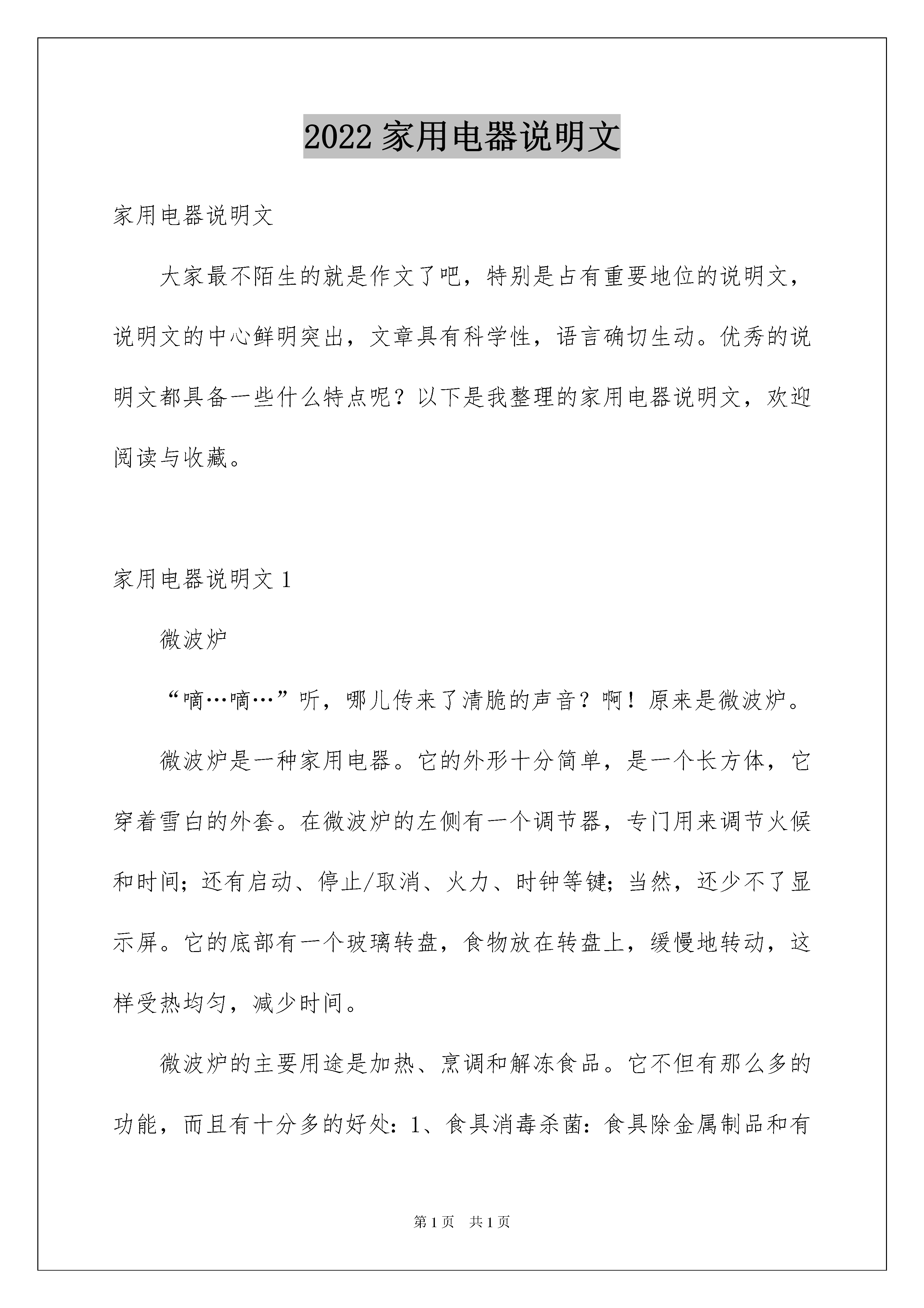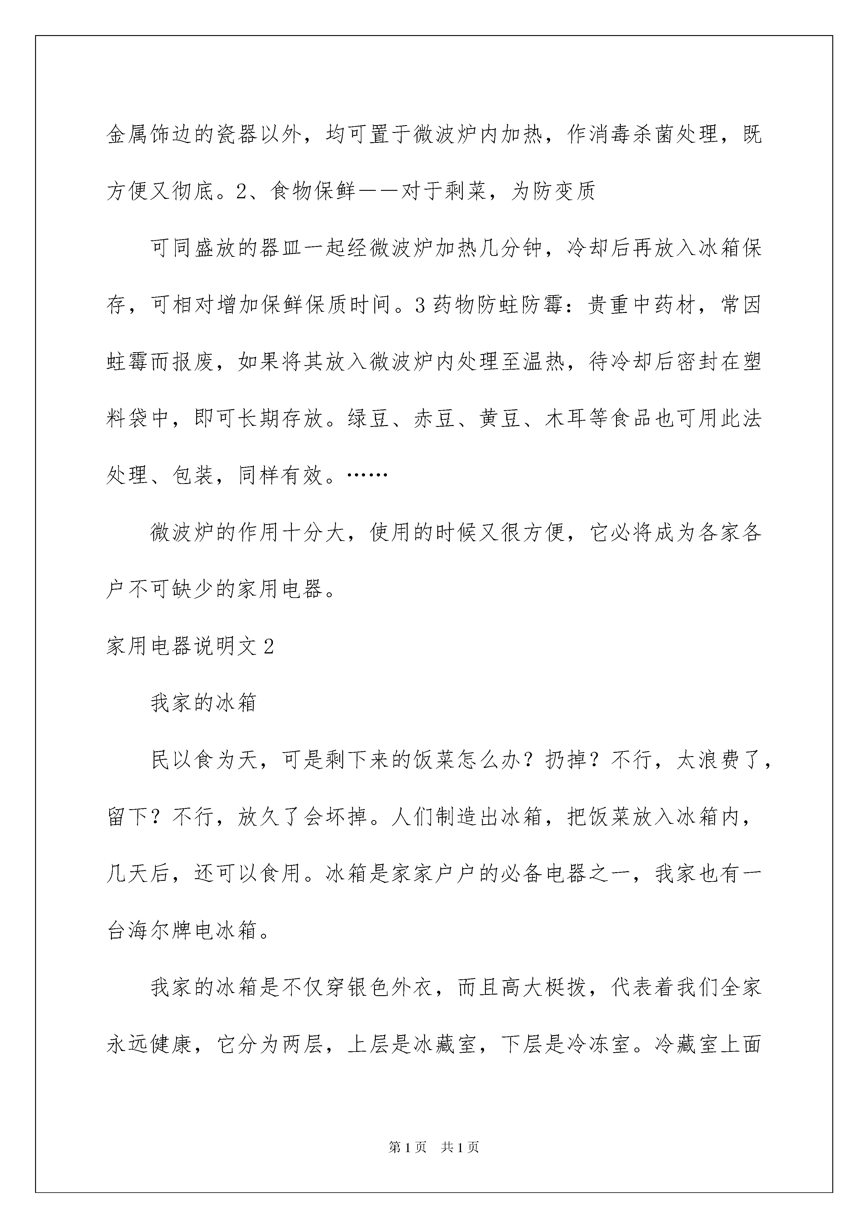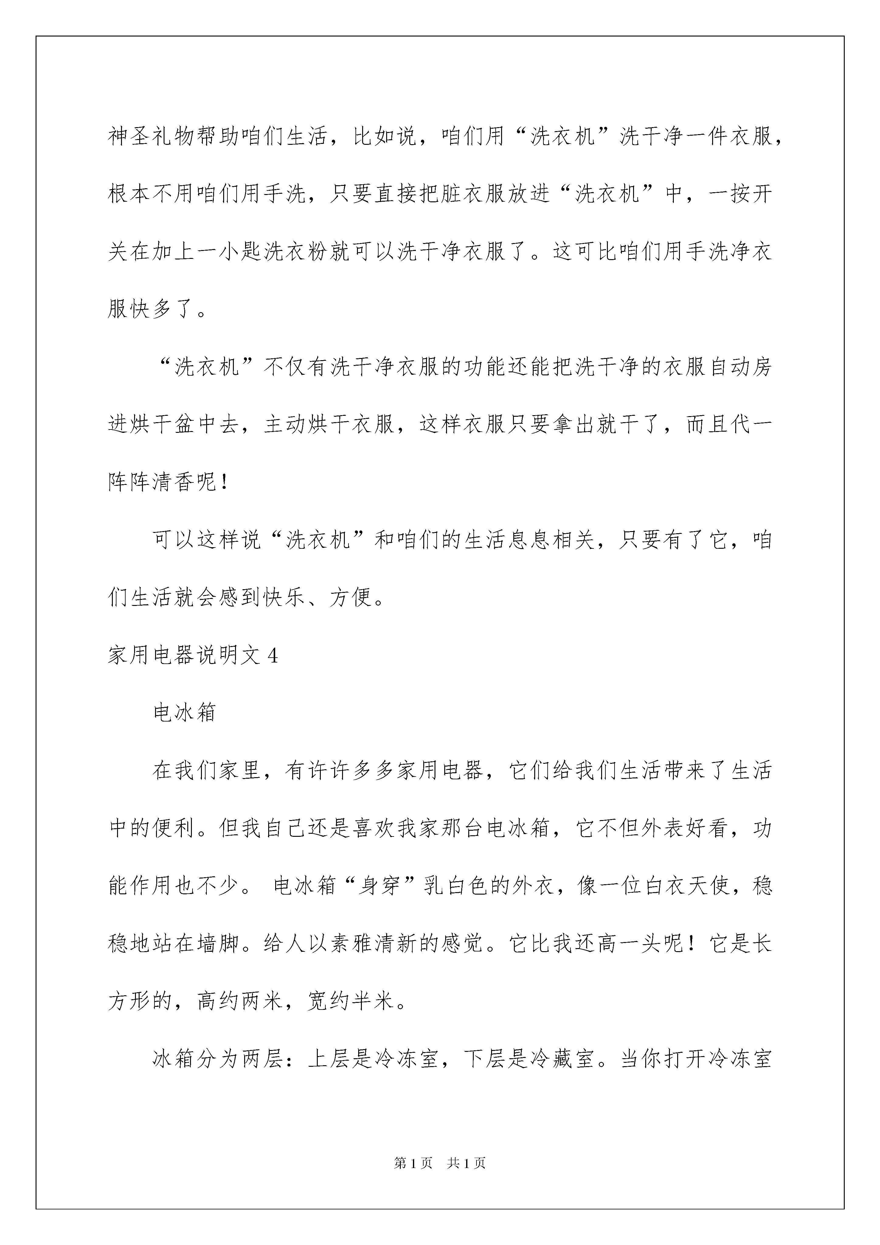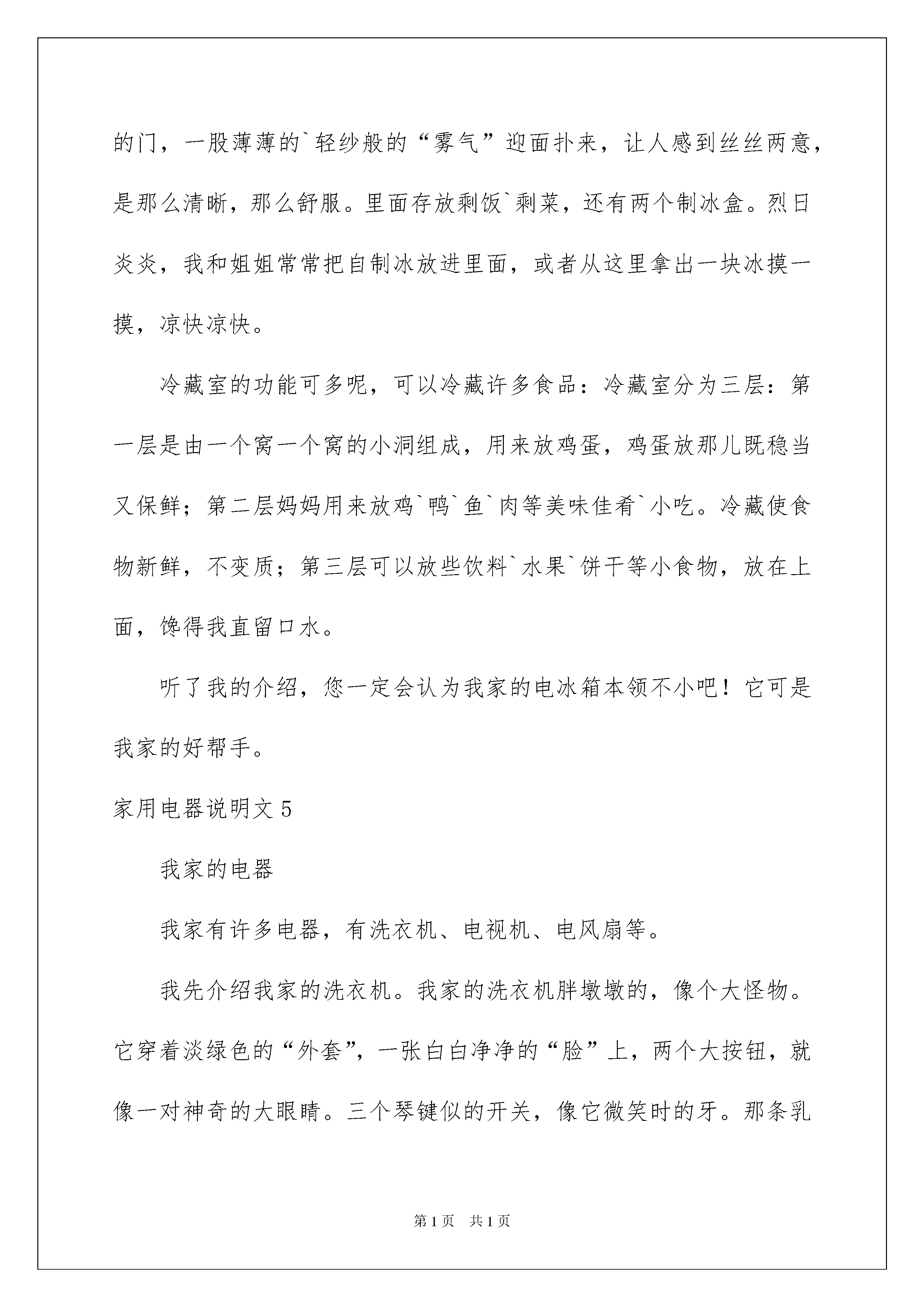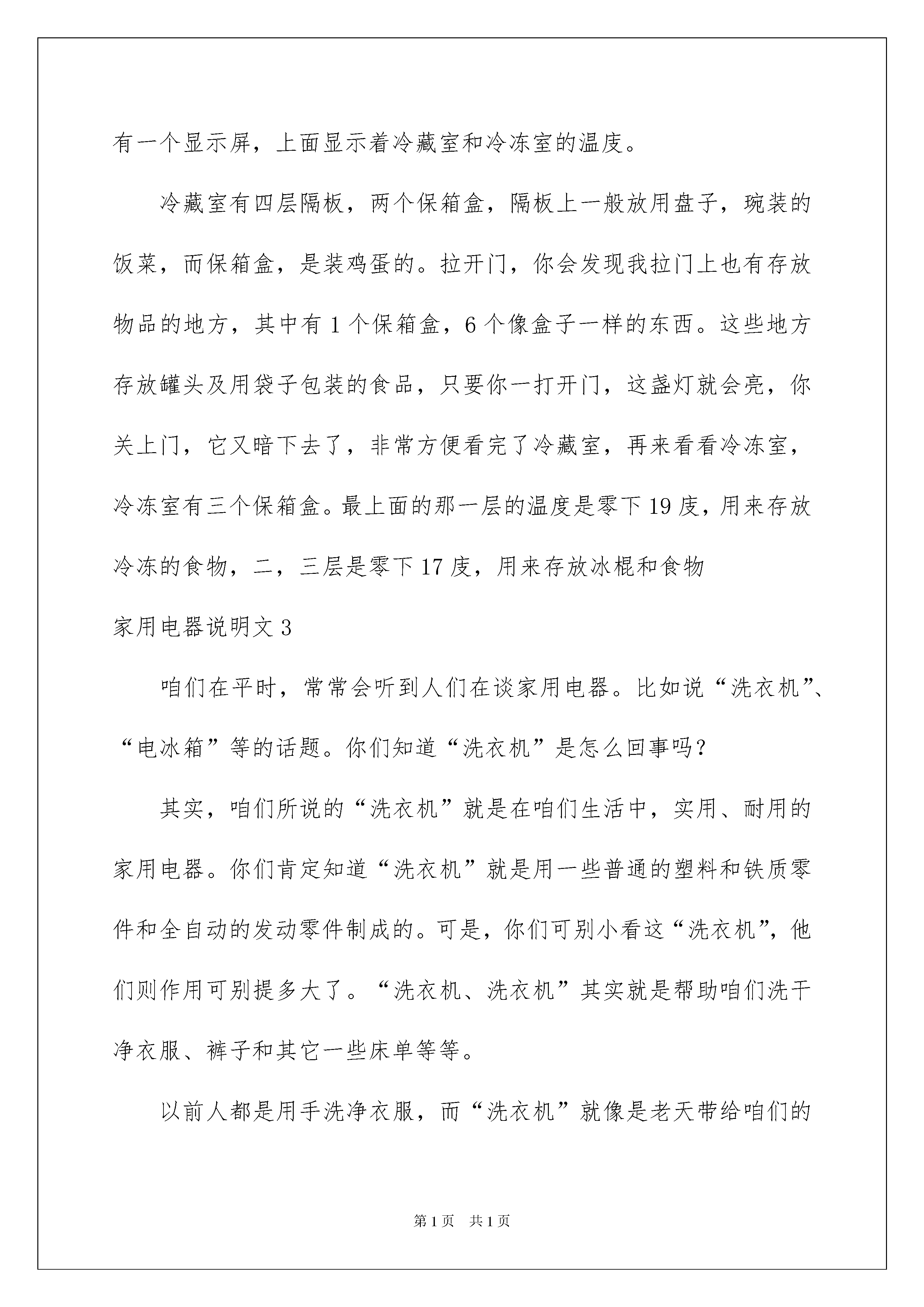 2022家用电器说明文家用电器说明文大家最不陌生的就是作文了吧,特别是占有重要地位的说明文,说明文的中心鲜明突出,文章具有科学性,语言确切生动。优秀的说明文都具备一些什么特点呢?以下是我整理的家用电器说明文,欢迎阅读与收藏。家用电器说明文1微波炉“嘀…嘀…”听,哪儿传来了清脆的声音?啊!原来是微波炉。微波炉是一种家用电器。它的外形十分简单,是一个长方体,它穿着雪白的外套。在微波炉的左侧有一个调节器,专门用来调节火候和时间;还有启动、停止/取消、火力、时钟等键;当然,还少不了显示屏。它的底部有一个玻璃转盘,食物放在转盘上,缓慢地转动,这样受热均匀,减少时间。微波炉的主要用途是加热、烹调和解冻食品。它不但有那么多的功能,而且有十分多的好处:1、食具消毒杀菌:食具除金属制品和有金属饰边的瓷器以外,均可置于微波炉内加热,作消毒杀菌处理,既方便又彻底。2、食物保鲜--对于剩菜,为防变质可同盛放的器皿一起经微波炉加热几分钟,冷却后再放入冰箱保存,可相对增加保鲜保质时间。3药物防蛀防霉:贵重中药材,常因蛀霉而报废,如果将其放入微波炉内处理至温热,待冷却后密封在塑料袋中,即可长期存放。绿豆、赤豆、黄豆、木耳等食品也可用此法处理、包装,同样有效。……微波炉的作用十分大,使用的时候又很方便,它必将成为各家各户不可缺少的家用电器。家用电器说明文2我家的冰箱民以食为天,可是剩下来的饭菜怎么办?扔掉?不行,太浪费了,留下?不行,放久了会坏掉。人们制造出冰箱,把饭菜放入冰箱内,几天后,还可以食用。冰箱是家家户户的必备电器之一,我家也有一台海尔牌电冰箱。我家的冰箱是不仅穿银色外衣,而且高大梃拨,代表着我们全家永远健康,它分为两层,上层是冰藏室,下层是冷冻室。冷藏室上面有一个显示屏,上面显示着冷藏室和冷冻室的温庋。冷藏室有四层隔板,两个保箱盒,隔板上一般放用盘子,琬装的饭菜,而保箱盒,是装鸡蛋的。拉开门,你会发现我拉门上也有存放物品的地方,其中有1个保箱盒,6个像盒子一样的东西。这些地方存放罐头及用袋子包装的食品,只要你一打开门,这盏灯就会亮,你关上门,它又暗下去了,非常方便看完了冷藏室,再来看看冷冻室,冷冻室有三个保箱盒。最上面的那一层的温度是零下19庋,用来存放冷冻的食物,二,三层是零下17庋,用来存放冰棍和食物家用电器说明文3咱们在平时,常常会听到人们在谈家用电器。比如说“洗衣机”、“电冰箱”等的话题。你们知道“洗衣机”是怎么回事吗?其实,咱们所说的“洗衣机”就是在咱们生活中,实用、耐用的家用电器。你们肯定知道“洗衣机”就是用一些普通的塑料和铁质零件和全自动的发动零件制成的。可是,你们可别小看这“洗衣机”,他们则作用可别提多大了。“洗衣机、洗衣机”其实就是帮助咱们洗干净衣服、裤子和其它一些床单等等。以前人都是用手洗净衣服,而“洗衣机”就像是老天带给咱们的神圣礼物帮助咱们生活,比如说,咱们用“洗衣机”洗干净一件衣服,根本不用咱们用手洗,只要直接把脏衣服放进“洗衣机”中,一按开关在加上一小匙洗衣粉就可以洗干净衣服了。这可比咱们用手洗净衣服快多了。“洗衣机”不仅有洗干净衣服的功能还能把洗干净的衣服自动房进烘干盆中去,主动烘干衣服,这样衣服只要拿出就干了,而且代一阵阵清香呢!可以这样说“洗衣机”和咱们的生活息息相关,只要有了它,咱们生活就会感到快乐、方便。家用电器说明文4电冰箱在我们家里,有许许多多家用电器,它们给我们生活带来了生活中的便利。但我自己还是喜欢我家那台电冰箱,它不但外表好看,功能作用也不少。电冰箱“身穿”乳白色的外衣,像一位白衣天使,稳稳地站在墙脚。给人以素雅清新的感觉。它比我还高一头呢!它是长方形的,高约两米,宽约半米。冰箱分为两层:上层是冷冻室,下层是冷藏室。当你打开冷冻室的门,一股薄薄的`轻纱般的“雾气”迎面扑来,让人感到丝丝两意,是那么清晰,那么舒服。里面存放剩饭`剩菜,还有两个制冰盒。烈日炎炎,我和姐姐常常把自制冰放进里面,或者从这里拿出一块冰摸一摸,凉快凉快。冷藏室的功能可多呢,可以冷藏许多食品:冷藏室分为三层:第一层是由一个窝一个窝的小洞组成,用来放鸡蛋,鸡蛋放那儿既稳当又保鲜;第二层妈妈用来放鸡`鸭`鱼`肉等美味佳肴`小吃。冷藏使食物新鲜,不变质;第三层可以放些饮料`水果`饼干等小食物,放在上面,馋得我直留口水。听了我的介绍,您一定会认为我家的电冰箱本领不小吧!它可是我家的好帮手。家用电器说明文5我家的电器我家有许多电器,有洗衣机、电视机、电风扇等。我先介绍我家的洗衣机。我家的洗衣机胖墩墩的,像个大怪物。它穿着淡绿色的“外套”,一张白白净净的“脸”上,两个大按钮,就像一对神奇