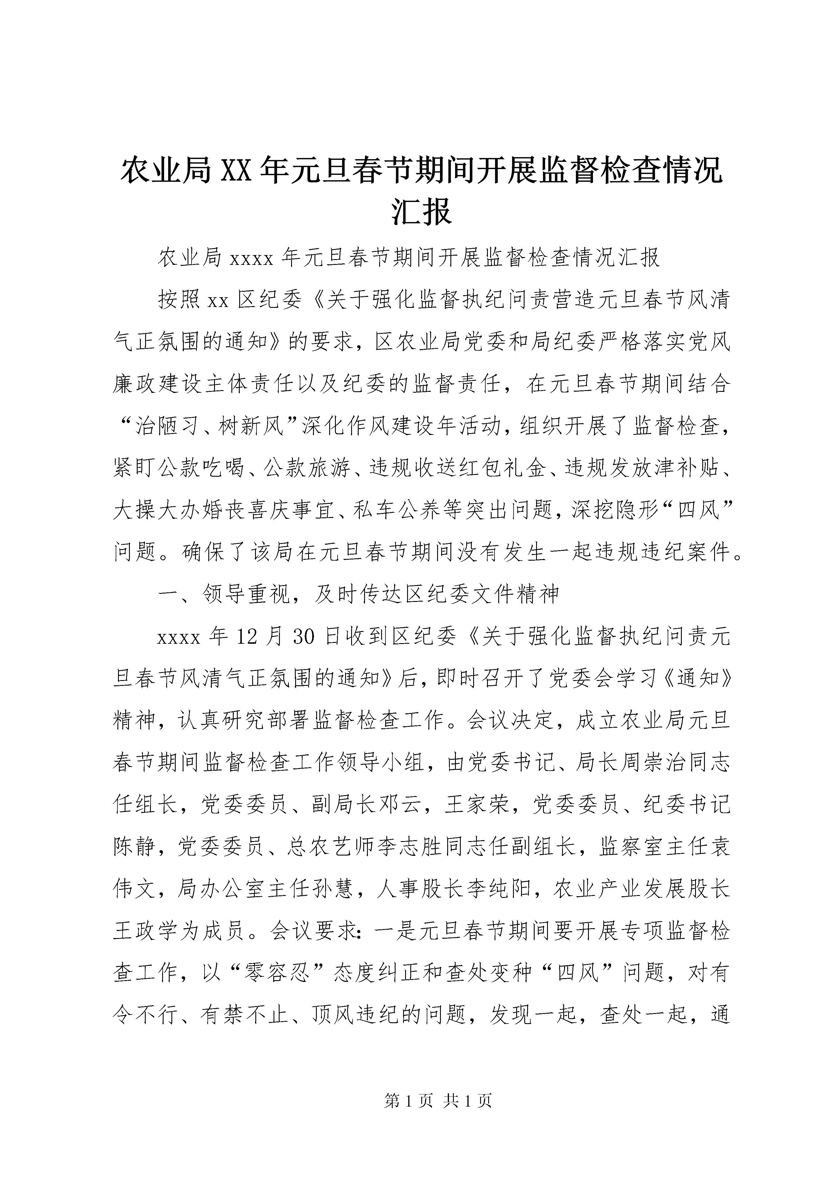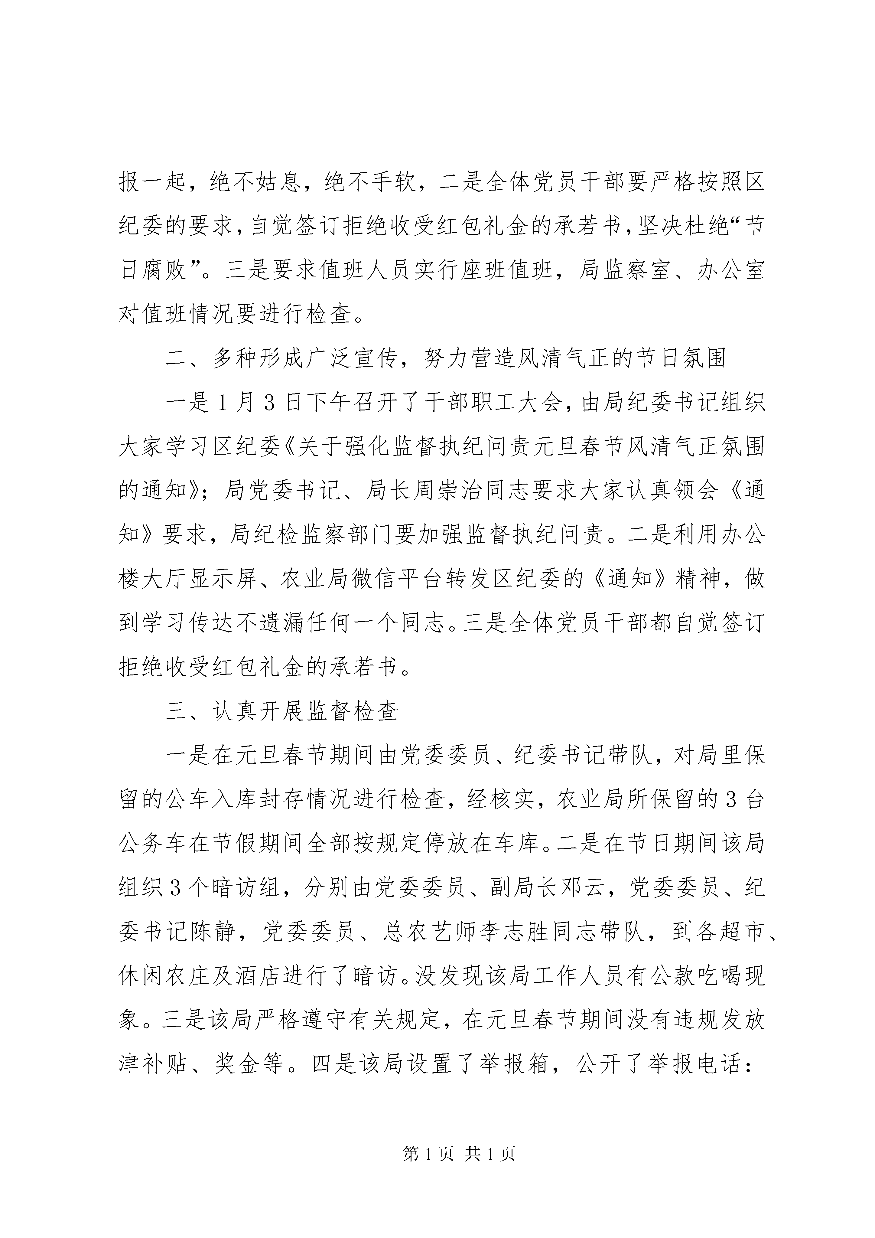 农业局XX年元旦春节期间开展监督检查情况汇报农业局xxxx年元旦春节期间开展监督检查情况汇报按照xx区纪委《关于强化监督执纪问责营造元旦春节风清气正氛围的通知》的要求,区农业局党委和局纪委严格落实党风廉政建设主体责任以及纪委的监督责任,在元旦春节期间结合“治陋习、树新风”深化作风建设年活动,组织开展了监督检查,紧盯公款吃喝、公款旅游、违规收送红包礼金、违规发放津补贴、大操大办婚丧喜庆事宜、私车公养等突出问题,深挖隐形“四风”问题。确保了该局在元旦春节期间没有发生一起违规违纪案件。一、领导重视,及时传达区纪委文件精神xxxx年12月30日收到区纪委《关于强化监督执纪问责元旦春节风清气正氛围的通知》后,即时召开了党委会学习《通知》精神,认真研究部署监督检查工作。会议决定,成立农业局元旦春节期间监督检查工作领导小组,由党委书记、局长周崇治同志任组长,党委委员、副局长邓云,王家荣,党委委员、纪委书记陈静,党委委员、总农艺师李志胜同志任副组长,监察室主任袁伟文,局办公室主任孙慧,人事股长李纯阳,农业产业发展股长王政学为成员。会议要求:一是元旦春节期间要开展专项监督检查工作,以“零容忍”态度纠正和查处变种“四风”问题,对有令不行、有禁不止、顶风违纪的问题,发现一起,查处一起,通报一起,绝不姑息,绝不手软,二是全体党员干部要严格按照区纪委的要求,自觉签订拒绝收受红包礼金的承若书,坚决杜绝“节日腐败”。三是要求值班人员实行座班值班,局监察室、办公室对值班情况要进行检查。二、多种形成广泛宣传,努力营造风清气正的节日氛围一是1月3日下午召开了干部职工大会,由局纪委书记组织大家学习区纪委《关于强化监督执纪问责元旦春节风清气正氛围的通知》;局党委书记、局长周崇治同志要求大家认真领会《通知》要求,局纪检监察部门要加强监督执纪问责。二是利用办公楼大厅显示屏、农业局微信平台转发区纪委的《通知》精神,做到学习传达不遗漏任何一个同志。三是全体党员干部都自觉签订拒绝收受红包礼金的承若书。三、认真开展监督检查一是在元旦春节期间由党委委员、纪委书记带队,对局里保留的公车入库封存情况进行检查,经核实,农业局所保留的3台公务车在节假期间全部按规定停放在车库。二是在节日期间该局组织3个暗访组,分别由党委委员、副局长邓云,党委委员、纪委书记陈静,党委委员、总农艺师李志胜同志带队,到各超市、休闲农庄及酒店进行了暗访。没发现该局工作人员有公款吃喝现象。三是该局严格遵守有关规定,在元旦春节期间没有违规发放津补贴、奖金等。四是该局设置了举报箱,公开了举报电话:xx。主动接受群众监督,在元旦春节期间没有收到任何有关该局工作人员违规收送红包礼金、违规大操大办婚丧喜庆事宜等违纪问题的举报。纪委书记,党委书记,办公室,津补贴,农业局