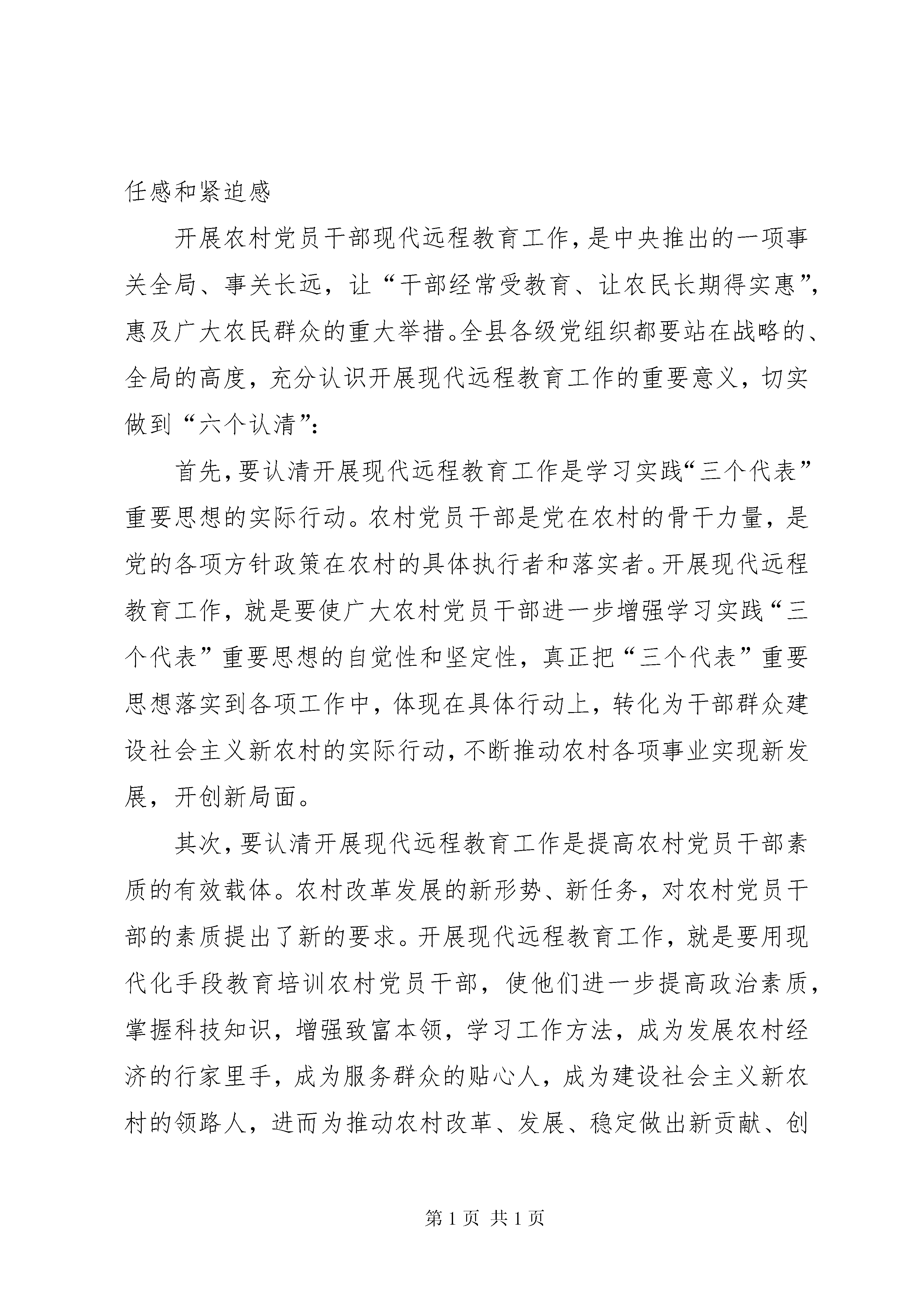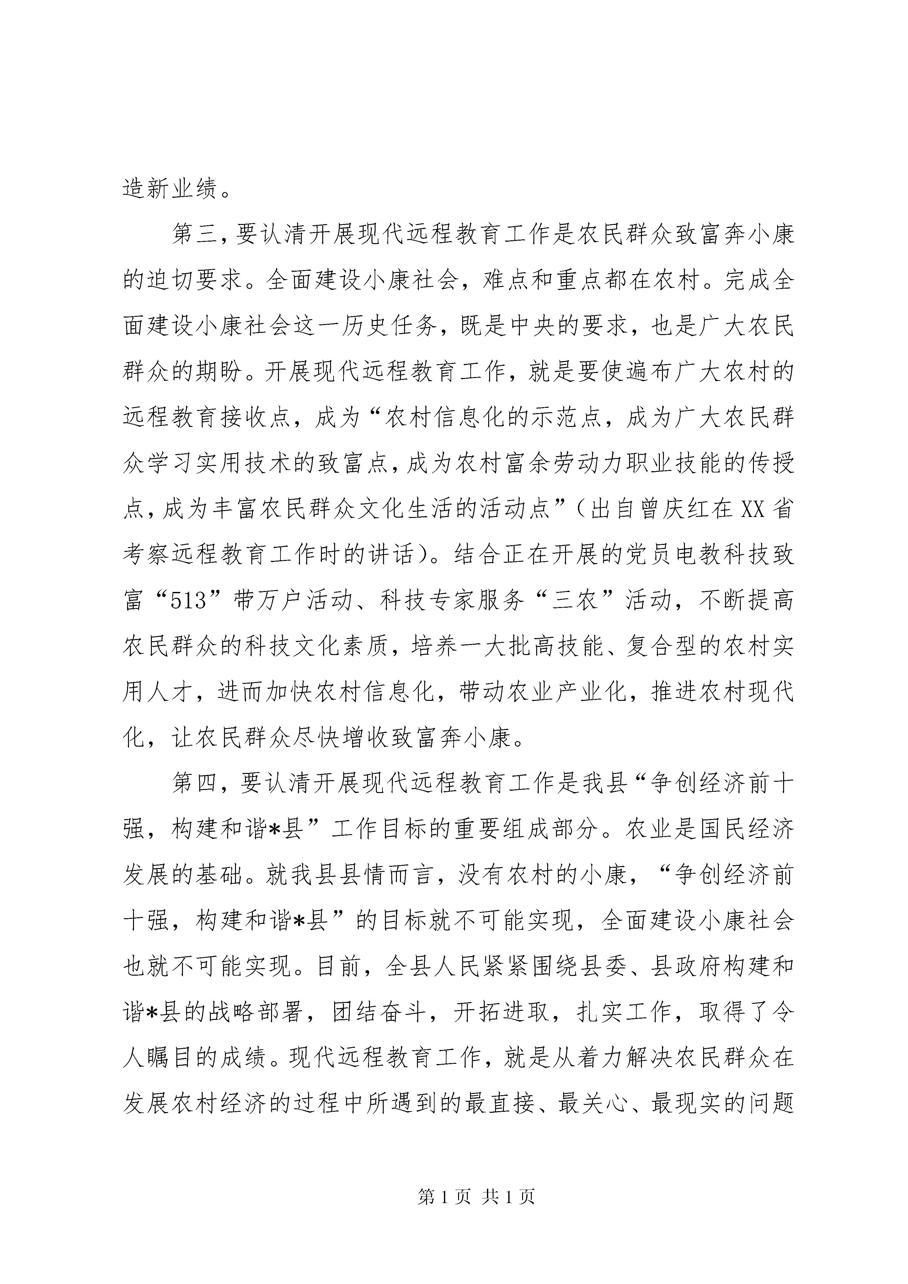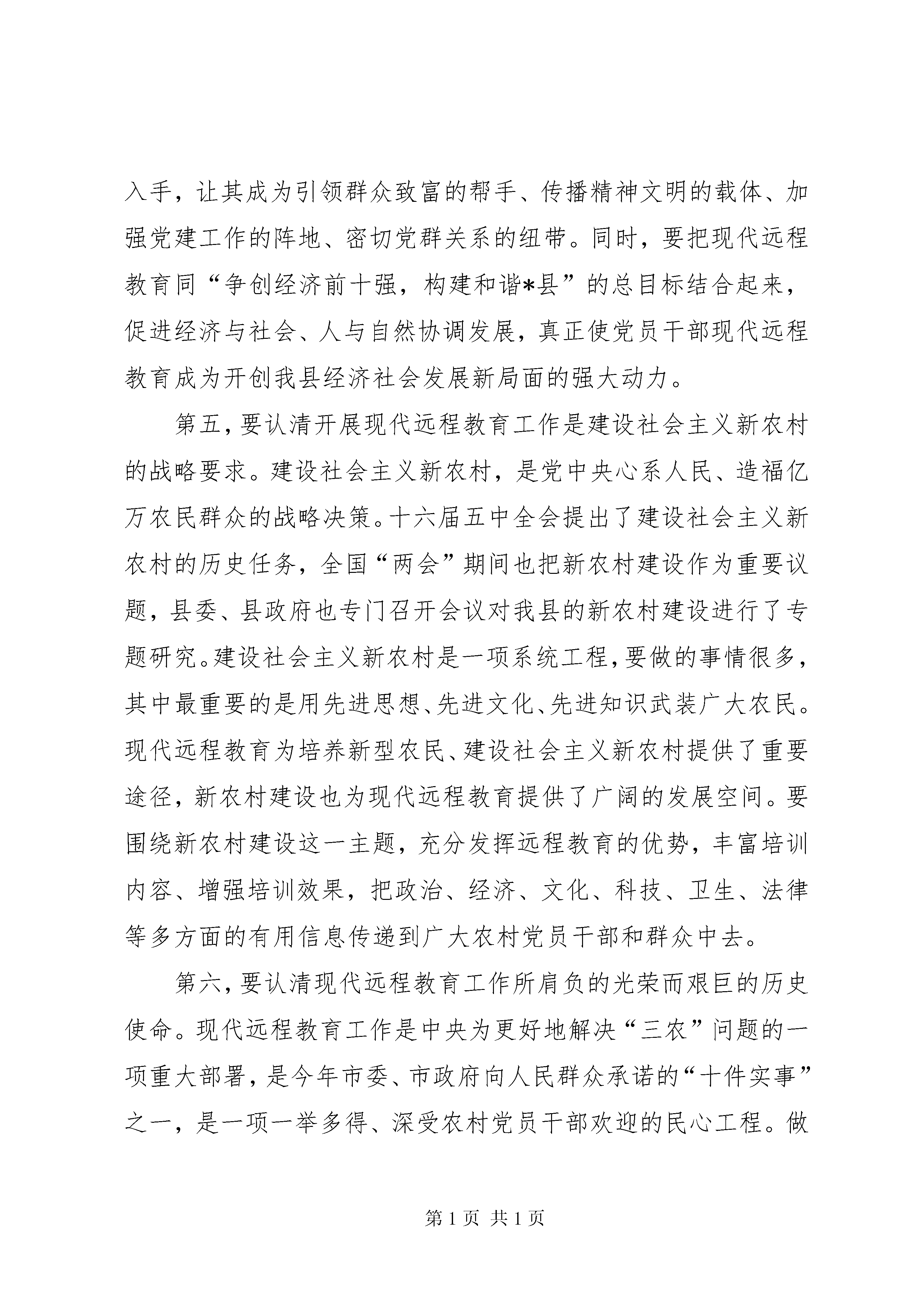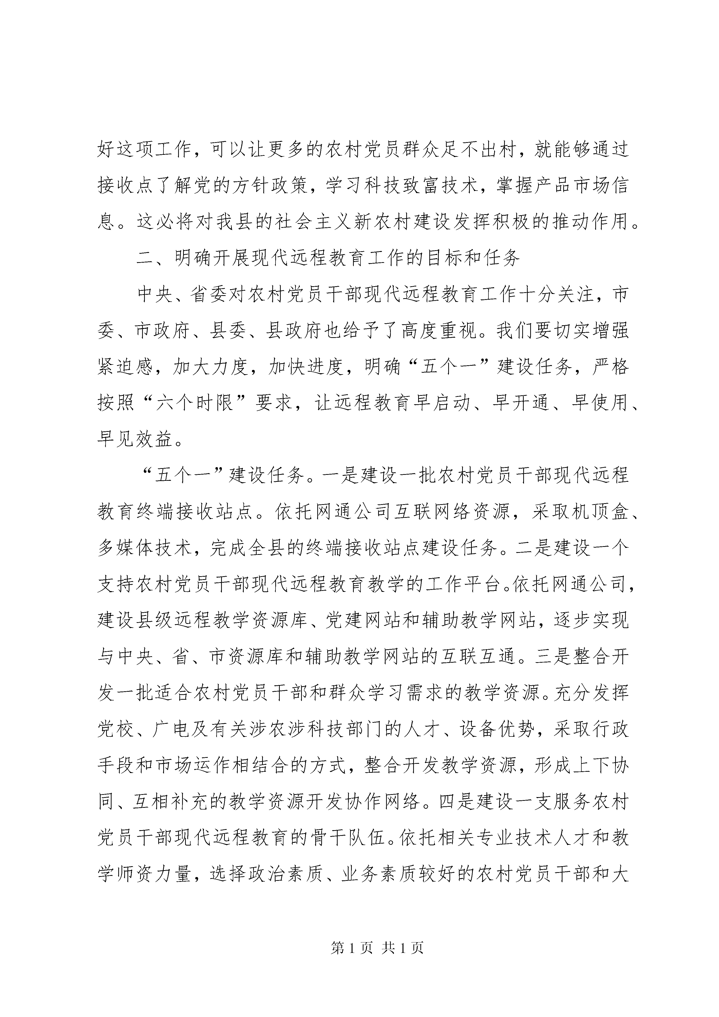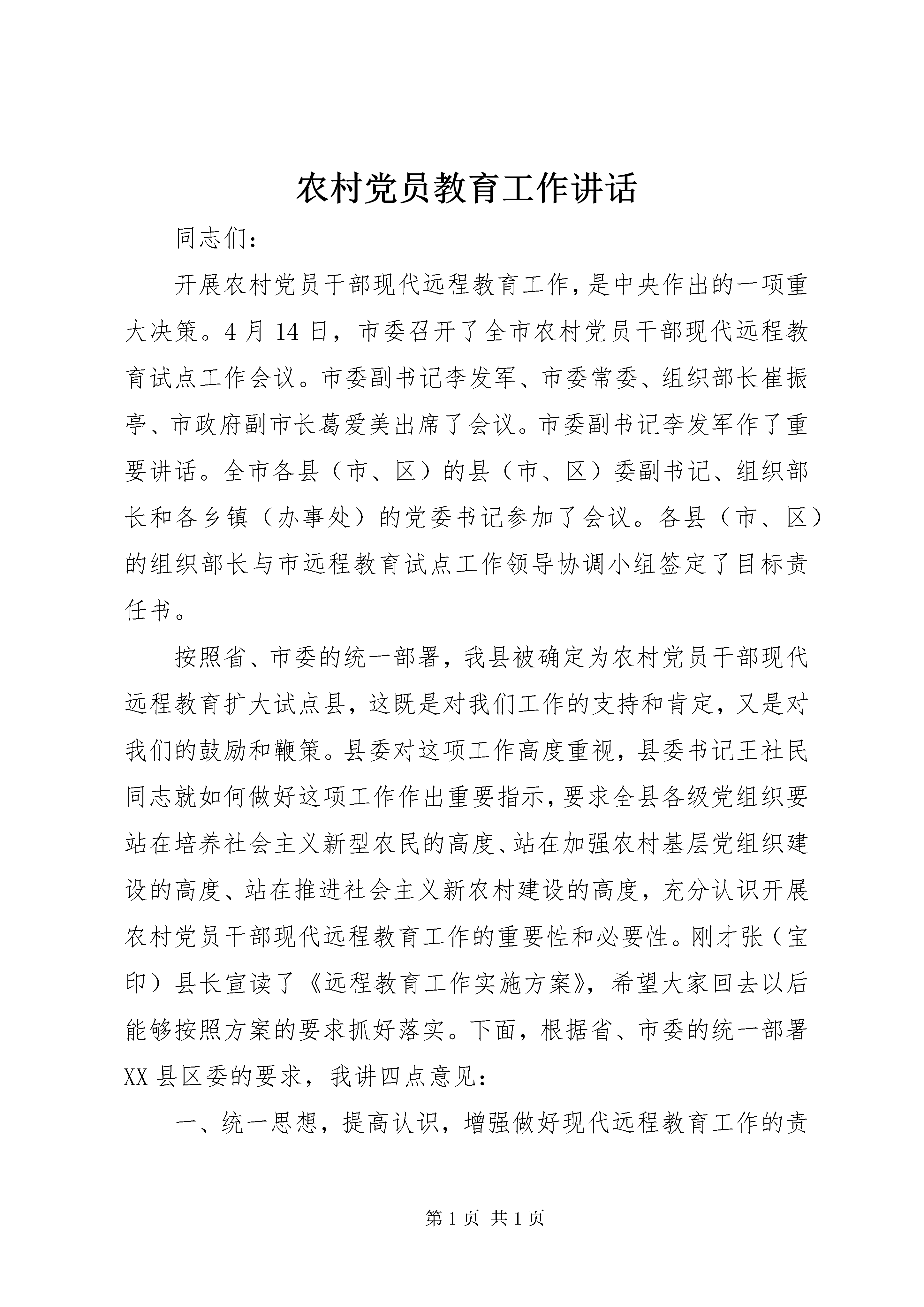 农村党员教育工作讲话同志们:开展农村党员干部现代远程教育工作,是中央作出的一项重大决策。4月14日,市委召开了全市农村党员干部现代远程教育试点工作会议。市委副书记李发军、市委常委、组织部长崔振亭、市政府副市长葛爱美出席了会议。市委副书记李发军作了重要讲话。全市各县(市、区)的县(市、区)委副书记、组织部长和各乡镇(办事处)的党委书记参加了会议。各县(市、区)的组织部长与市远程教育试点工作领导协调小组签定了目标责任书。按照省、市委的统一部署,我县被确定为农村党员干部现代远程教育扩大试点县,这既是对我们工作的支持和肯定,又是对我们的鼓励和鞭策。县委对这项工作高度重视,县委书记王社民同志就如何做好这项工作作出重要指示,要求全县各级党组织要站在培养社会主义新型农民的高度、站在加强农村基层党组织建设的高度、站在推进社会主义新农村建设的高度,充分认识开展农村党员干部现代远程教育工作的重要性和必要性。刚才张(宝印)县长宣读了《远程教育工作实施方案》,希望大家回去以后能够按照方案的要求抓好落实。下面,根据省、市委的统一部署XX县区委的要求,我讲四点意见:一、统一思想,提高认识,增强做好现代远程教育工作的责任感和紧迫感开展农村党员干部现代远程教育工作,是中央推出的一项事关全局、事关长远,让“干部经常受教育、让农民长期得实惠”,惠及广大农民群众的重大举措。全县各级党组织都要站在战略的、全局的高度,充分认识开展现代远程教育工作的重要意义,切实做到“六个认清”:首先,要认清开展现代远程教育工作是学习实践“三个代表”重要思想的实际行动。农村党员干部是党在农村的骨干力量,是党的各项方针政策在农村的具体执行者和落实者。开展现代远程教育工作,就是要使广大农村党员干部进一步增强学习实践“三个代表”重要思想的自觉性和坚定性,真正把“三个代表”重要思想落实到各项工作中,体现在具体行动上,转化为干部群众建设社会主义新农村的实际行动,不断推动农村各项事业实现新发展,开创新局面。其次,要认清开展现代远程教育工作是提高农村党员干部素质的有效载体。农村改革发展的新形势、新任务,对农村党员干部的素质提出了新的要求。开展现代远程教育工作,就是要用现代化手段教育培训农村党员干部,使他们进一步提高政治素质,掌握科技知识,增强致富本领,学习工作方法,成为发展农村经济的行家里手,成为服务群众的贴心人,成为建设社会主义新农村的领路人,进而为推动农村改革、发展、稳定做出新贡献、创造新业绩。第三,要认清开展现代远程教育工作是农民群众致富奔小康的迫切要求。全面建设小康社会,难点和重点都在农村。完成全面建设小康社会这一历史任务,既是中央的要求,也是广大农民群众的期盼。开展现代远程教育工作,就是要使遍布广大农村的远程教育接收点,成为“农村信息化的示范点,成为广大农民群众学习实用技术的致富点,成为农村富余劳动力职业技能的传授点,成为丰富农民群众文化生活的活动点”(出自曾庆红在XX省考察远程教育工作时的讲话)。结合正在开展的党员电教科技致富“513”带万户活动、科技专家服务“三农”活动,不断提高农民群众的科技文化素质,培养一大批高技能、复合型的农村实用人才,进而加快农村信息化,带动农业产业化,推进农村现代化,让农民群众尽快增收致富奔小康。第四,要认清开展现代远程教育工作是我县“争创经济前十强,构建和谐*县”工作目标的重要组成部分。农业是国民经济发展的基础。就我县县情而言,没有农村的小康,“争创经济前十强,构建和谐*县”的目标就不可能实现,全面建设小康社会也就不可能实现。目前,全县人民紧紧围绕县委、县政府构建和谐*县的战略部署,团结奋斗,开拓进取,扎实工作,取得了令人瞩目的成绩。现代远程教育工作,就是从着力解决农民群众在发展农村经济的过程中所遇到的最直接、最关心、最现实的问题入手,让其成为引领群众致富的帮手、传播精神文明的载体、加强党建工作的阵地、密切党群关系的纽带。同时,要把现代远程教育同“争创经济前十强,构建和谐*县”的总目标结合起来,促进经济与社会、人与自然协调发展,真正使党员干部现代远程教育成为开创我县经济社会发展新局面的强大动力。第五,要认清开展现代远程教育工作是建设社会主义新农村的战略要求。建设社会主义新农村,是党中央心系人民、造福亿万农民群众的战略决策。十六届五中全会提出了建设社会主义新农村的历史任务,全国“两会”期间也把新农村建设作为重要议题,县委、县政府也专门召开会议对我县的新农村建设进行了专题研究。建设社会主义新农村是一项系统工程,要做的事情很多,其中最重要的是用先进思想、先进文化、先进知识武装广大农民。现代远程教育为培养新型农民、建设社会主义新农村提供了重要途径,新农村建设也为现代远程教育提供了广阔的发展空间。要围绕新农村建设这一主题,充分发挥远程教育的优
