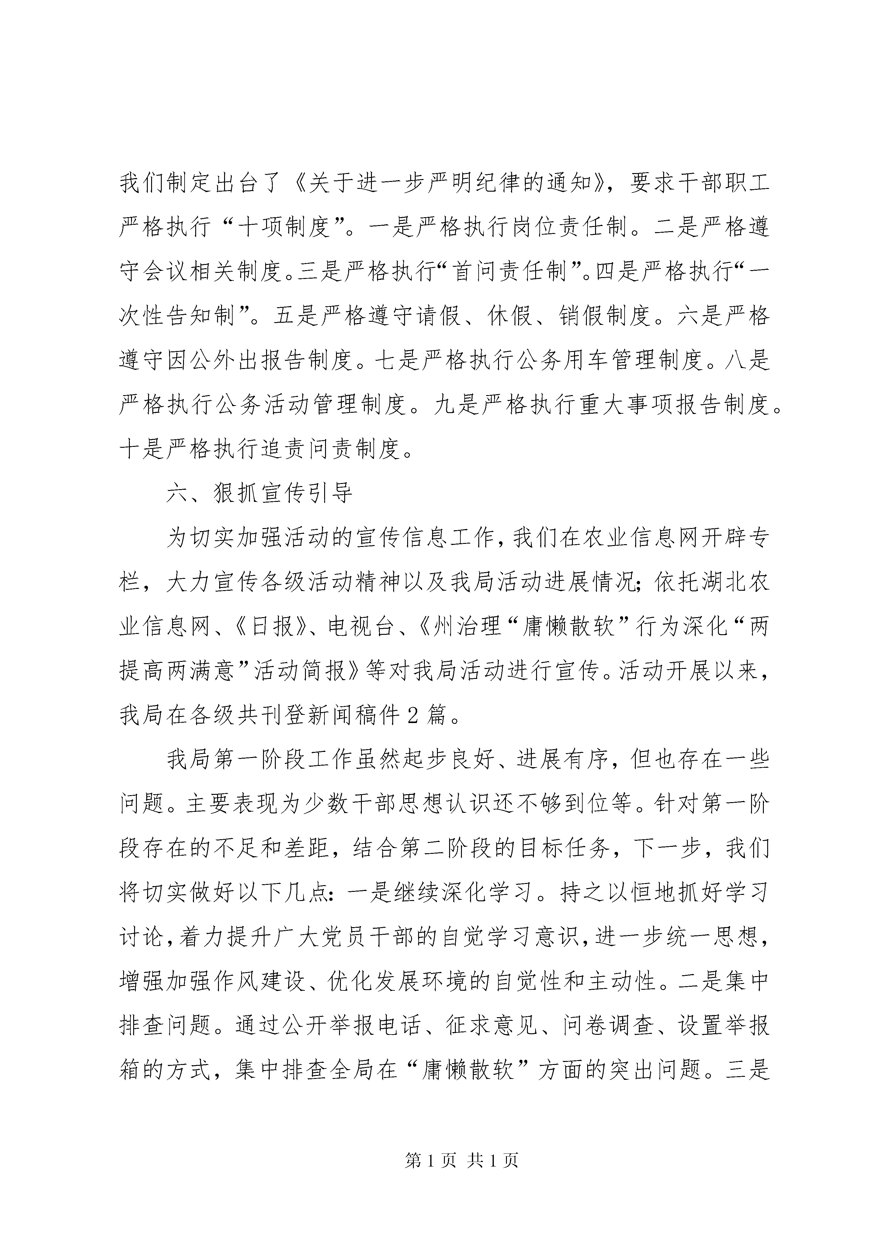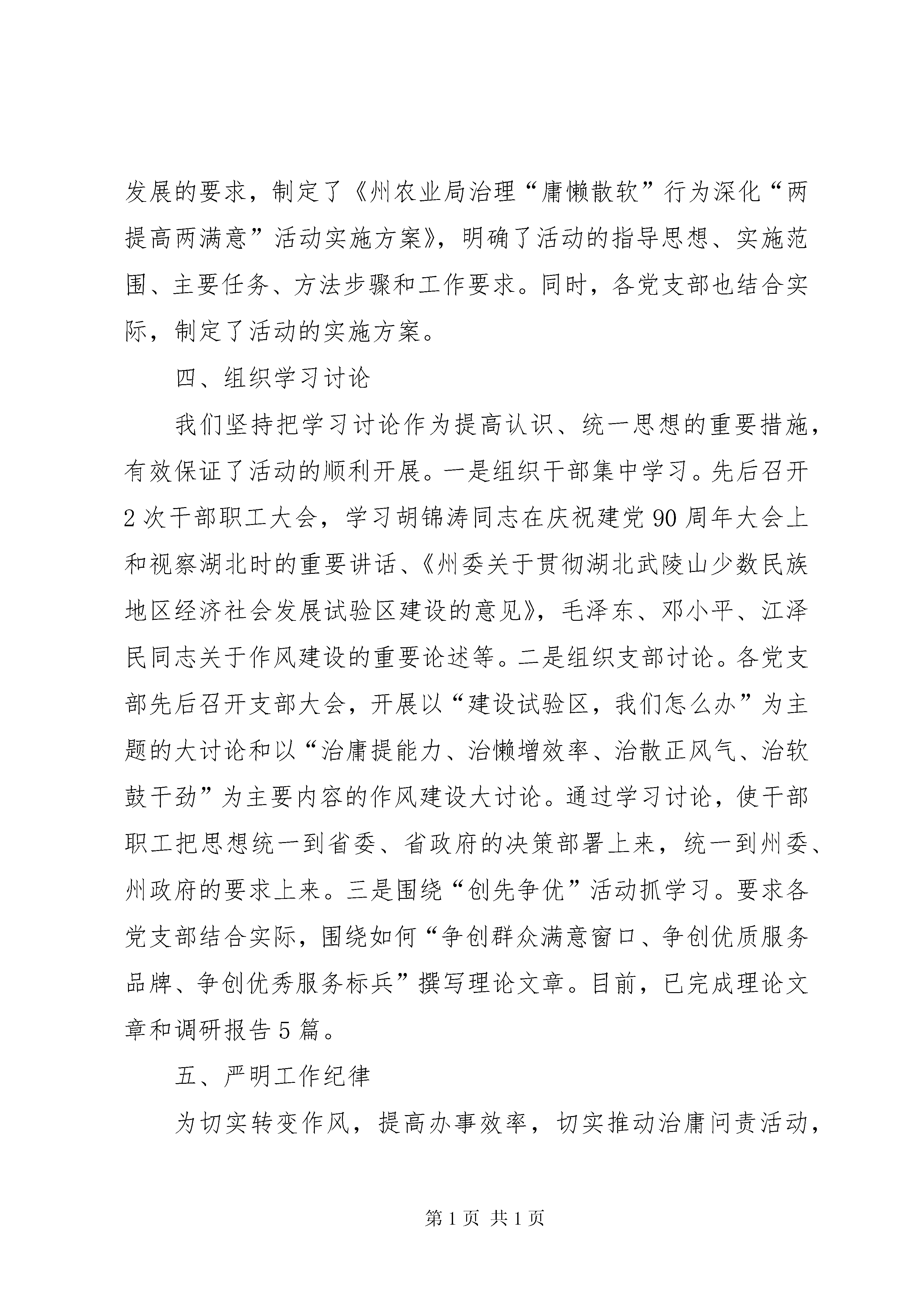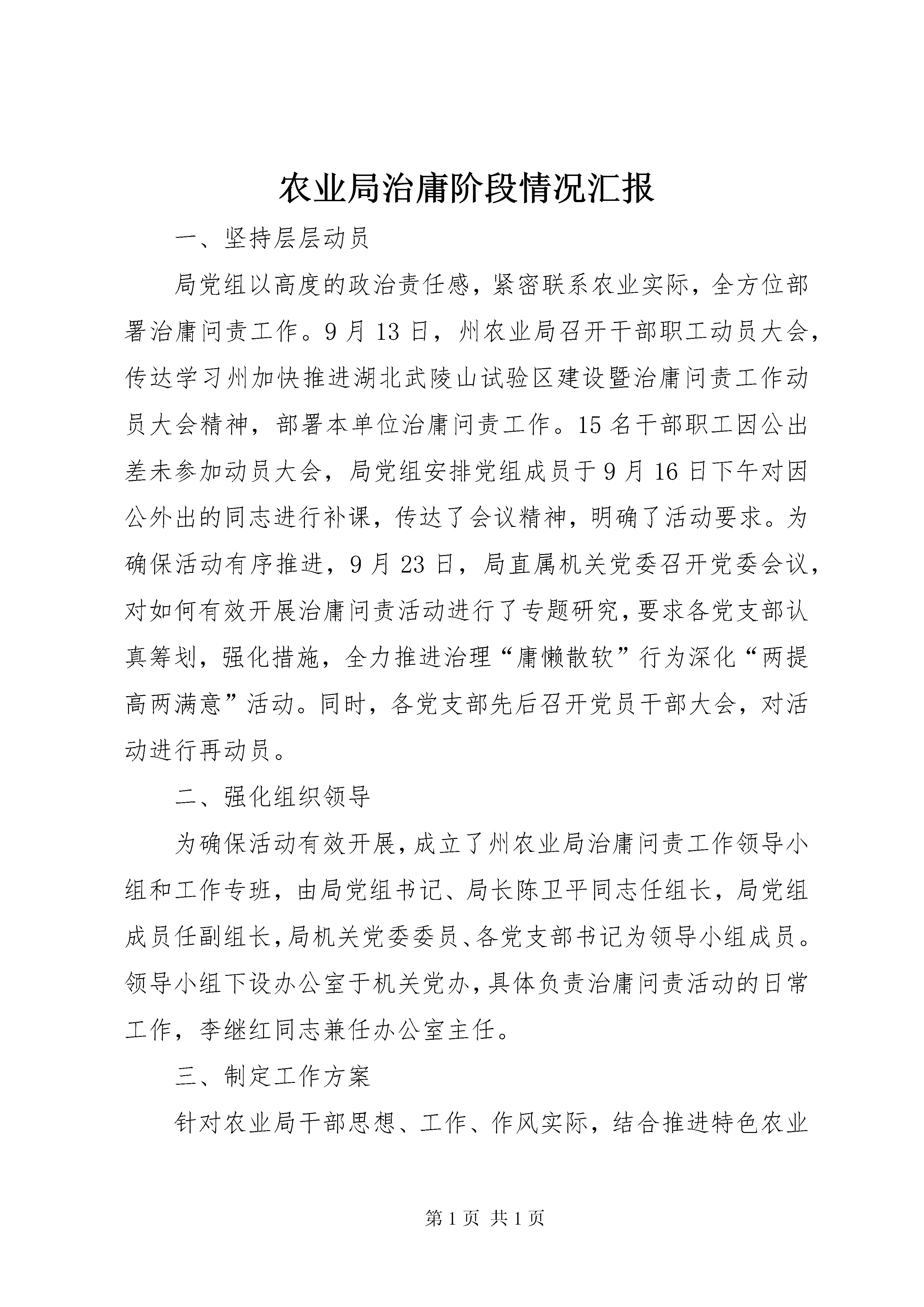农业局治庸阶段情况汇报一、坚持层层动员局党组以高度的政治责任感,紧密联系农业实际,全方位部署治庸问责工作。9月13日,州农业局召开干部职工动员大会,传达学习州加快推进湖北武陵山试验区建设暨治庸问责工作动员大会精神,部署本单位治庸问责工作。15名干部职工因公出差未参加动员大会,局党组安排党组成员于9月16日下午对因公外出的同志进行补课,传达了会议精神,明确了活动要求。为确保活动有序推进,9月23日,局直属机关党委召开党委会议,对如何有效开展治庸问责活动进行了专题研究,要求各党支部认真筹划,强化措施,全力推进治理“庸懒散软”行为深化“两提高两满意”活动。同时,各党支部先后召开党员干部大会,对活动进行再动员。二、强化组织领导为确保活动有效开展,成立了州农业局治庸问责工作领导小组和工作专班,由局党组书记、局长陈卫平同志任组长,局党组成员任副组长,局机关党委委员、各党支部书记为领导小组成员。领导小组下设办公室于机关党办,具体负责治庸问责活动的日常工作,李继红同志兼任办公室主任。三、制定工作方案针对农业局干部思想、工作、作风实际,结合推进特色农业发展的要求,制定了《州农业局治理“庸懒散软”行为深化“两提高两满意”活动实施方案》,明确了活动的指导思想、实施范围、主要任务、方法步骤和工作要求。同时,各党支部也结合实际,制定了活动的实施方案。四、组织学习讨论我们坚持把学习讨论作为提高认识、统一思想的重要措施,有效保证了活动的顺利开展。一是组织干部集中学习。先后召开2次干部职工大会,学习胡锦涛同志在庆祝建党90周年大会上和视察湖北时的重要讲话、《州委关于贯彻湖北武陵山少数民族地区经济社会发展试验区建设的意见》,毛泽东、邓小平、江泽民同志关于作风建设的重要论述等。二是组织支部讨论。各党支部先后召开支部大会,开展以“建设试验区,我们怎么办”为主题的大讨论和以“治庸提能力、治懒增效率、治散正风气、治软鼓干劲”为主要内容的作风建设大讨论。通过学习讨论,使干部职工把思想统一到省委、省政府的决策部署上来,统一到州委、州政府的要求上来。三是围绕“创先争优”活动抓学习。要求各党支部结合实际,围绕如何“争创群众满意窗口、争创优质服务品牌、争创优秀服务标兵”撰写理论文章。目前,已完成理论文章和调研报告5篇。五、严明工作纪律为切实转变作风,提高办事效率,切实推动治庸问责活动,我们制定出台了《关于进一步严明纪律的通知》,要求干部职工严格执行“十项制度”。一是严格执行岗位责任制。二是严格遵守会议相关制度。三是严格执行“首问责任制”。四是严格执行“一次性告知制”。五是严格遵守请假、休假、销假制度。六是严格遵守因公外出报告制度。七是严格执行公务用车管理制度。八是严格执行公务活动管理制度。九是严格执行重大事项报告制度。十是严格执行追责问责制度。六、狠抓宣传引导为切实加强活动的宣传信息工作,我们在农业信息网开辟专栏,大力宣传各级活动精神以及我局活动进展情况;依托湖北农业信息网、《日报》、电视台、《州治理“庸懒散软”行为深化“两提高两满意”活动简报》等对我局活动进行宣传。活动开展以来,我局在各级共刊登新闻稿件2篇。我局第一阶段工作虽然起步良好、进展有序,但也存在一些问题。主要表现为少数干部思想认识还不够到位等。针对第一阶段存在的不足和差距,结合第二阶段的目标任务,下一步,我们将切实做好以下几点:一是继续深化学习。持之以恒地抓好学习讨论,着力提升广大党员干部的自觉学习意识,进一步统一思想,增强加强作风建设、优化发展环境的自觉性和主动性。二是集中排查问题。通过公开举报电话、征求意见、问卷调查、设置举报箱的方式,集中排查全局在“庸懒散软”方面的突出问题。三是召开民主生活会。召开一次领导班子专题民主生活会,认真开展批评和自我批评,查找问题,剖析原因,明确责任,提出整改措施。四是边学边查边改。对集中排查、民主生活会查找出的突出问题,敢于揭短亮丑,直面问题,触及矛盾,深刻剖析问题形成的根源,分析其影响与危害,结合工作实际,提出切实可行的整改措施,做到边学边改,边查边改。