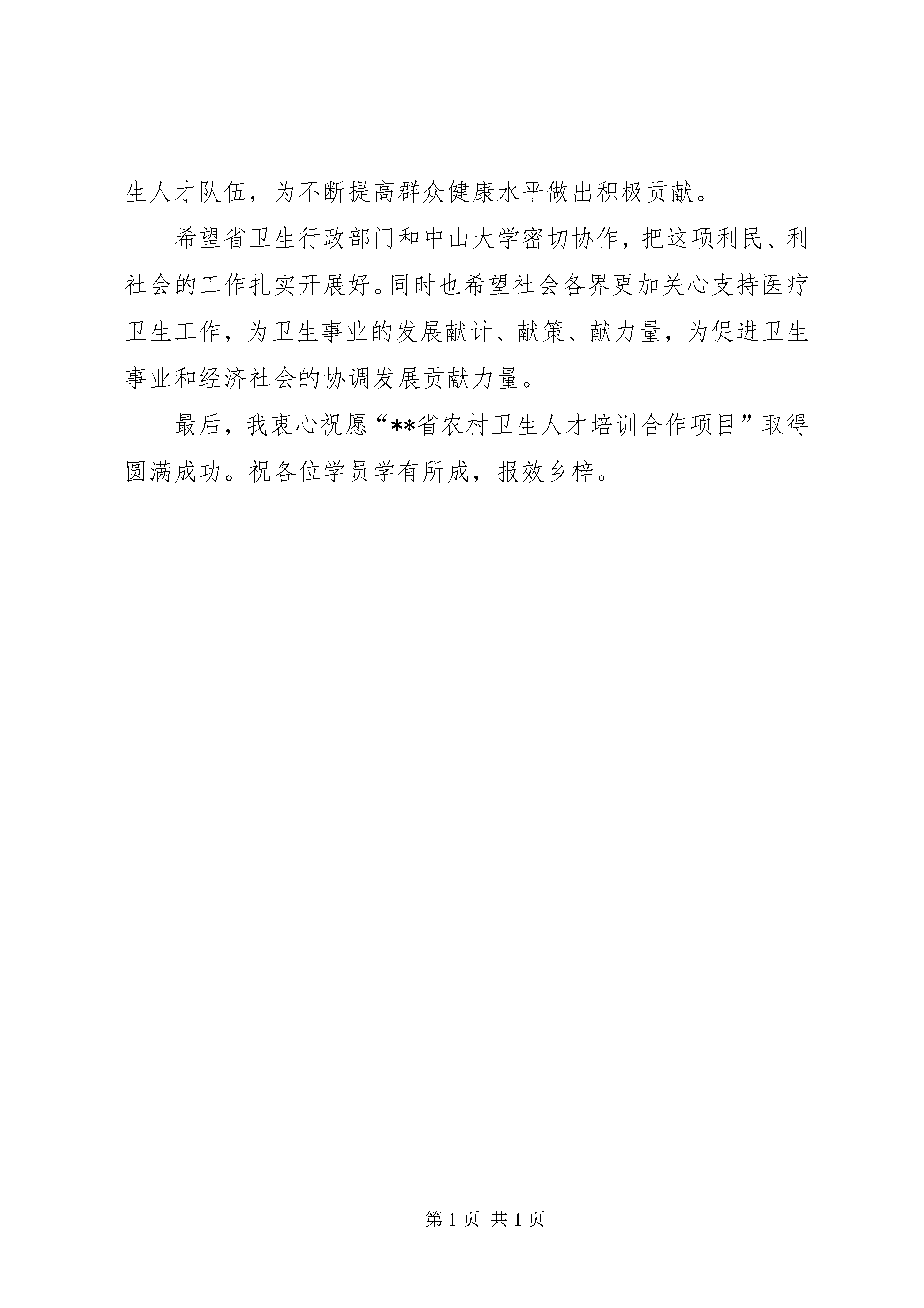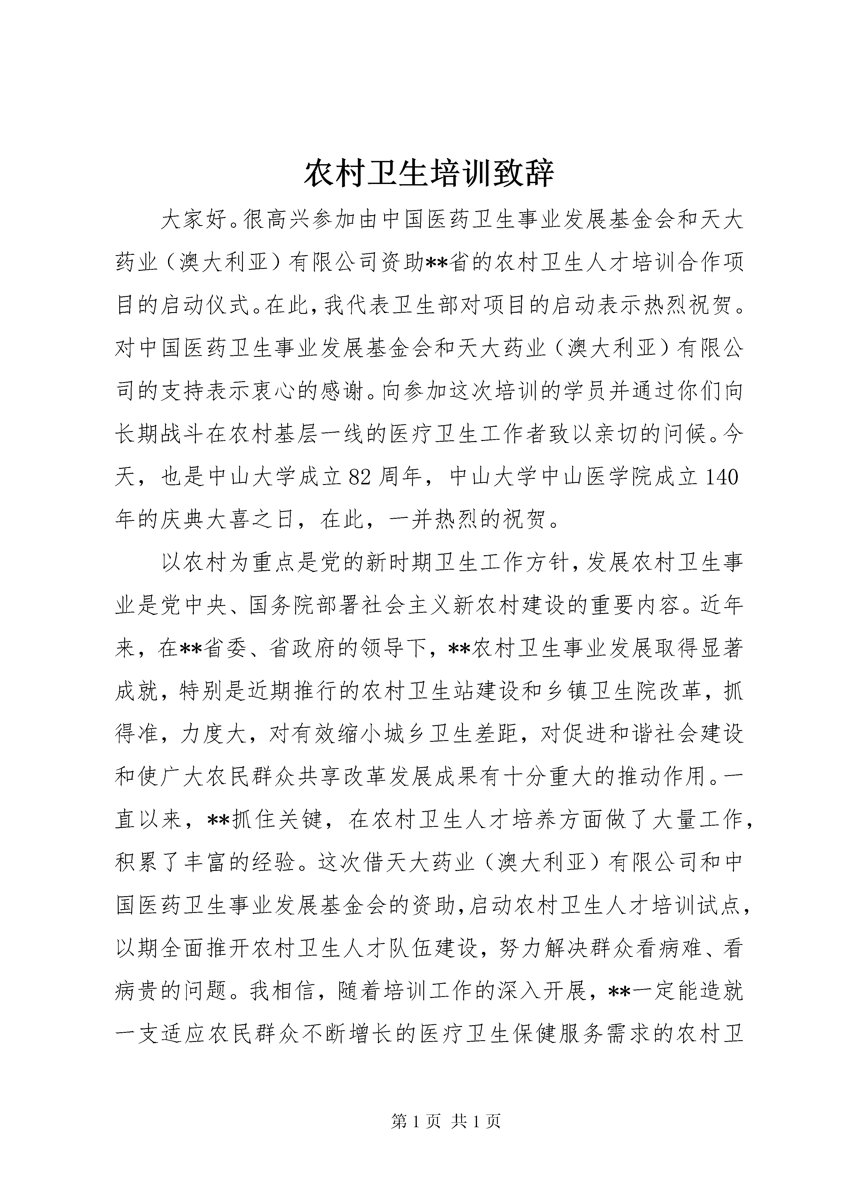 农村卫生培训致辞大家好。很高兴参加由中国医药卫生事业发展基金会和天大药业(澳大利亚)有限公司资助**省的农村卫生人才培训合作项目的启动仪式。在此,我代表卫生部对项目的启动表示热烈祝贺。对中国医药卫生事业发展基金会和天大药业(澳大利亚)有限公司的支持表示衷心的感谢。向参加这次培训的学员并通过你们向长期战斗在农村基层一线的医疗卫生工作者致以亲切的问候。今天,也是中山大学成立82周年,中山大学中山医学院成立140年的庆典大喜之日,在此,一并热烈的祝贺。以农村为重点是党的新时期卫生工作方针,发展农村卫生事业是党中央、国务院部署社会主义新农村建设的重要内容。近年来,在**省委、省政府的领导下,**农村卫生事业发展取得显著成就,特别是近期推行的农村卫生站建设和乡镇卫生院改革,抓得准,力度大,对有效缩小城乡卫生差距,对促进和谐社会建设和使广大农民群众共享改革发展成果有十分重大的推动作用。一直以来,**抓住关键,在农村卫生人才培养方面做了大量工作,积累了丰富的经验。这次借天大药业(澳大利亚)有限公司和中国医药卫生事业发展基金会的资助,启动农村卫生人才培训试点,以期全面推开农村卫生人才队伍建设,努力解决群众看病难、看病贵的问题。我相信,随着培训工作的深入开展,**一定能造就一支适应农民群众不断增长的医疗卫生保健服务需求的农村卫生人才队伍,为不断提高群众健康水平做出积极贡献。希望省卫生行政部门和中山大学密切协作,把这项利民、利社会的工作扎实开展好。同时也希望社会各界更加关心支持医疗卫生工作,为卫生事业的发展献计、献策、献力量,为促进卫生事业和经济社会的协调发展贡献力量。最后,我衷心祝愿“**省农村卫生人才培训合作项目”取得圆满成功。祝各位学员学有所成,报效乡梓。