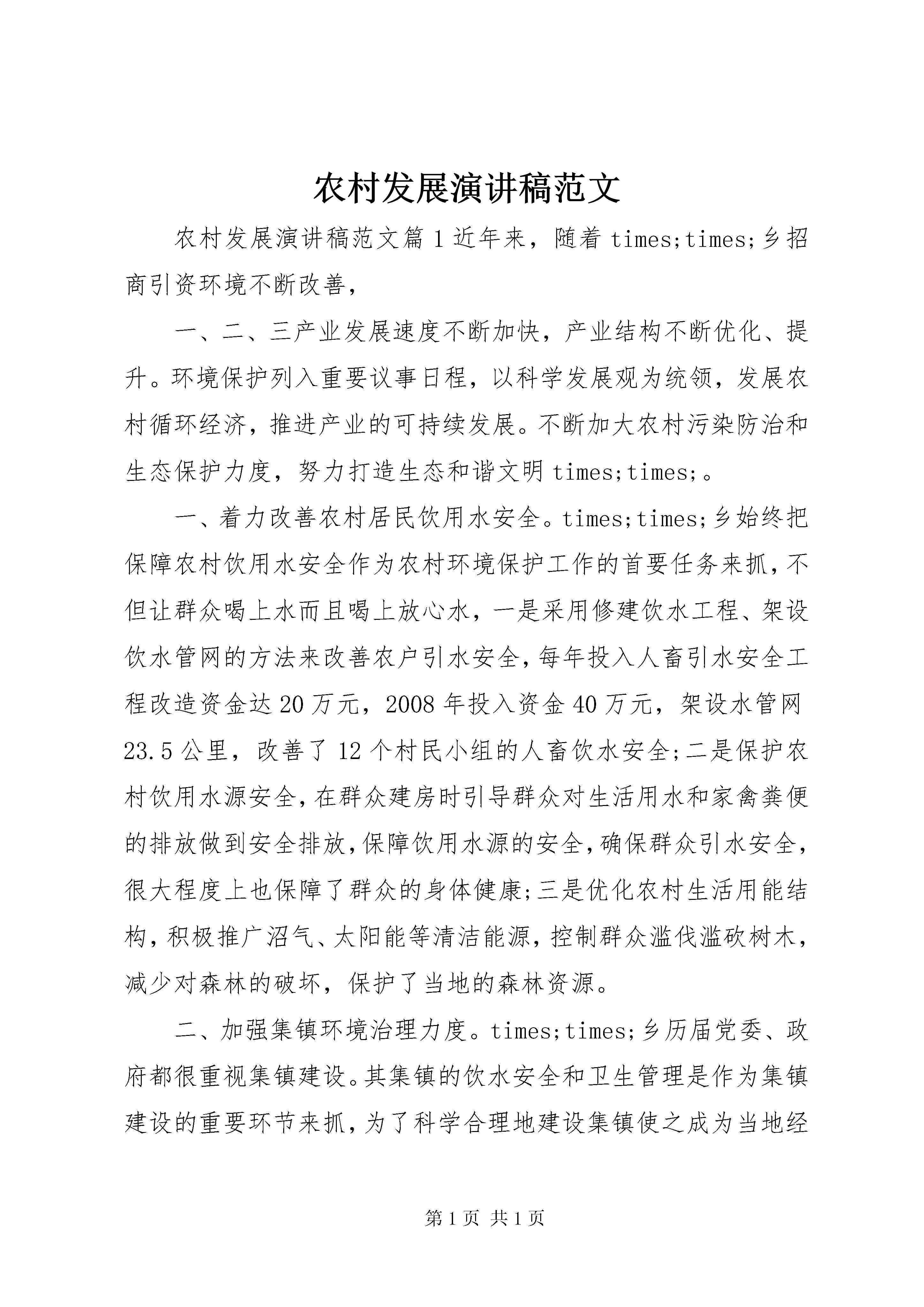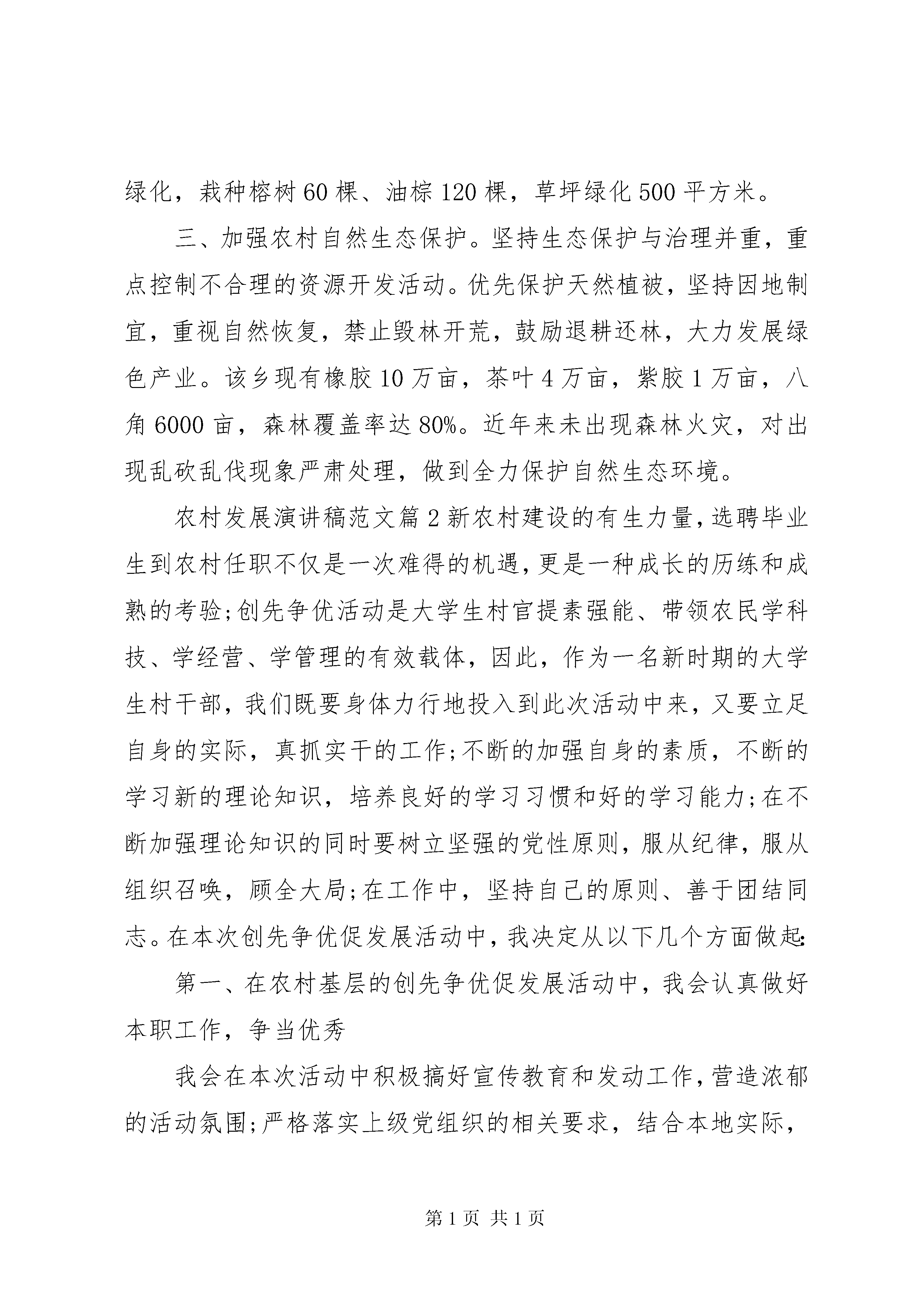 农村发展演讲稿范文农村发展演讲稿范文篇1近年来,随着times;times;乡招商引资环境不断改善,一、二、三产业发展速度不断加快,产业结构不断优化、提升。环境保护列入重要议事日程,以科学发展观为统领,发展农村循环经济,推进产业的可持续发展。不断加大农村污染防治和生态保护力度,努力打造生态和谐文明times;times;。一、着力改善农村居民饮用水安全。times;times;乡始终把保障农村饮用水安全作为农村环境保护工作的首要任务来抓,不但让群众喝上水而且喝上放心水,一是采用修建饮水工程、架设饮水管网的方法来改善农户引水安全,每年投入人畜引水安全工程改造资金达20万元,2008年投入资金40万元,架设水管网23.5公里,改善了12个村民小组的人畜饮水安全;二是保护农村饮用水源安全,在群众建房时引导群众对生活用水和家禽粪便的排放做到安全排放,保障饮用水源的安全,确保群众引水安全,很大程度上也保障了群众的身体健康;三是优化农村生活用能结构,积极推广沼气、太阳能等清洁能源,控制群众滥伐滥砍树木,减少对森林的破坏,保护了当地的森林资源。二、加强集镇环境治理力度。times;times;乡历届党委、政府都很重视集镇建设。其集镇的饮水安全和卫生管理是作为集镇建设的重要环节来抓,为了科学合理地建设集镇使之成为当地经济发展的中心,2006年该乡投入资金15万元启动了集镇建设规划,目前规划已完成,规划包括了总体规划、给水工程规划、排水工程规划、绿地规划、灯光工程规划等,对集镇的污水排放进行了科学的规划。一是注重改善集镇引水安全。该乡集镇饮用水存在用水紧张、管网老化等问题,为了解决群众饮水安全问题,2006年完成集镇规划后,该乡启动了集镇饮水管网建设,现已投入资金80余万元科学合理的对集镇水管网进行了改造,改善了群众用水质量。二是注重排水工程建设。2006年,该乡投入300万元,在集镇安装了4800米排水管网,彻底改善污水乱排的现象。三是注重集镇垃圾处理。该乡集镇人口约有5000人,每天都产生了大量的生活垃圾,而垃圾的堆放处理存在着很大的难度。2007年投资5万元新建一个小型垃圾处理场,减少了环境污染。四是注重集镇卫生管理。为了营造良好的卫生环境,首先,2008年成立街道管理委员会,对集镇的秩序及卫生进行监督。集镇内每50米摆放垃圾桶2个,聘请4名保洁员,对垃圾和街道每天都进行清扫;其次,街道管理委员会发挥其作用,每半月由乡政府牵头相关部门参与,对集镇内住户进行卫生检查,要求住户严格执行门前三包制度,对违反集镇卫生管理制度的第一、二次进行口头警告,严重违反的给予罚款;第三,每次赶集日严格督促商户保障集镇秩序及卫生,不允许出现垃圾乱堆放的现象。五是注重集镇绿化美化。2008年,投入6万元对集镇主街道进行了绿化,栽种榕树60棵、油棕120棵,草坪绿化500平方米。三、加强农村自然生态保护。坚持生态保护与治理并重,重点控制不合理的资源开发活动。优先保护天然植被,坚持因地制宜,重视自然恢复,禁止毁林开荒,鼓励退耕还林,大力发展绿色产业。该乡现有橡胶10万亩,茶叶4万亩,紫胶1万亩,八角6000亩,森林覆盖率达80%。近年来未出现森林火灾,对出现乱砍乱伐现象严肃处理,做到全力保护自然生态环境。农村发展演讲稿范文篇2新农村建设的有生力量,选聘毕业生到农村任职不仅是一次难得的机遇,更是一种成长的历练和成熟的考验;创先争优活动是大学生村官提素强能、带领农民学科技、学经营、学管理的有效载体,因此,作为一名新时期的大学生村干部,我们既要身体力行地投入到此次活动中来,又要立足自身的实际,真抓实干的工作;不断的加强自身的素质,不断的学习新的理论知识,培养良好的学习习惯和好的学习能力;在不断加强理论知识的同时要树立坚强的党性原则,服从纪律,服从组织召唤,顾全大局;在工作中,坚持自己的原则、善于团结同志。在本次创先争优促发展活动中,我决定从以下几个方面做起:第一、在农村基层的创先争优促发展活动中,我会认真做好本职工作,争当优秀我会在本次活动中积极搞好宣传教育和发动工作,营造浓郁的活动氛围;严格落实上级党组织的相关要求,结合本地实际,制定好创先争优活动的相关制度办法;抓好先进典型的挖掘培养和宣传,带动更多的党组织和党员参与到活动中来;作为大学生村干部,我首先会加强学习、勇于实践,不断提高自身素质,不断提高为群众服务的水平和能力,以带领和带动群众致富、服务农民群众、维护农村稳定、促进本村经济发展的实绩,争当优秀,为创建先进党组织和新农村建设做出自己的贡献。第二、扎根基层,立足实际,充分发挥自身的作用我们虽说都接受了高等教育,但是对农村问题往往认识不深,很容易从书本出发,从书本中找答案,这就使农民群众关心的问题依旧得不到解决。因此,在创先争优活动中,应