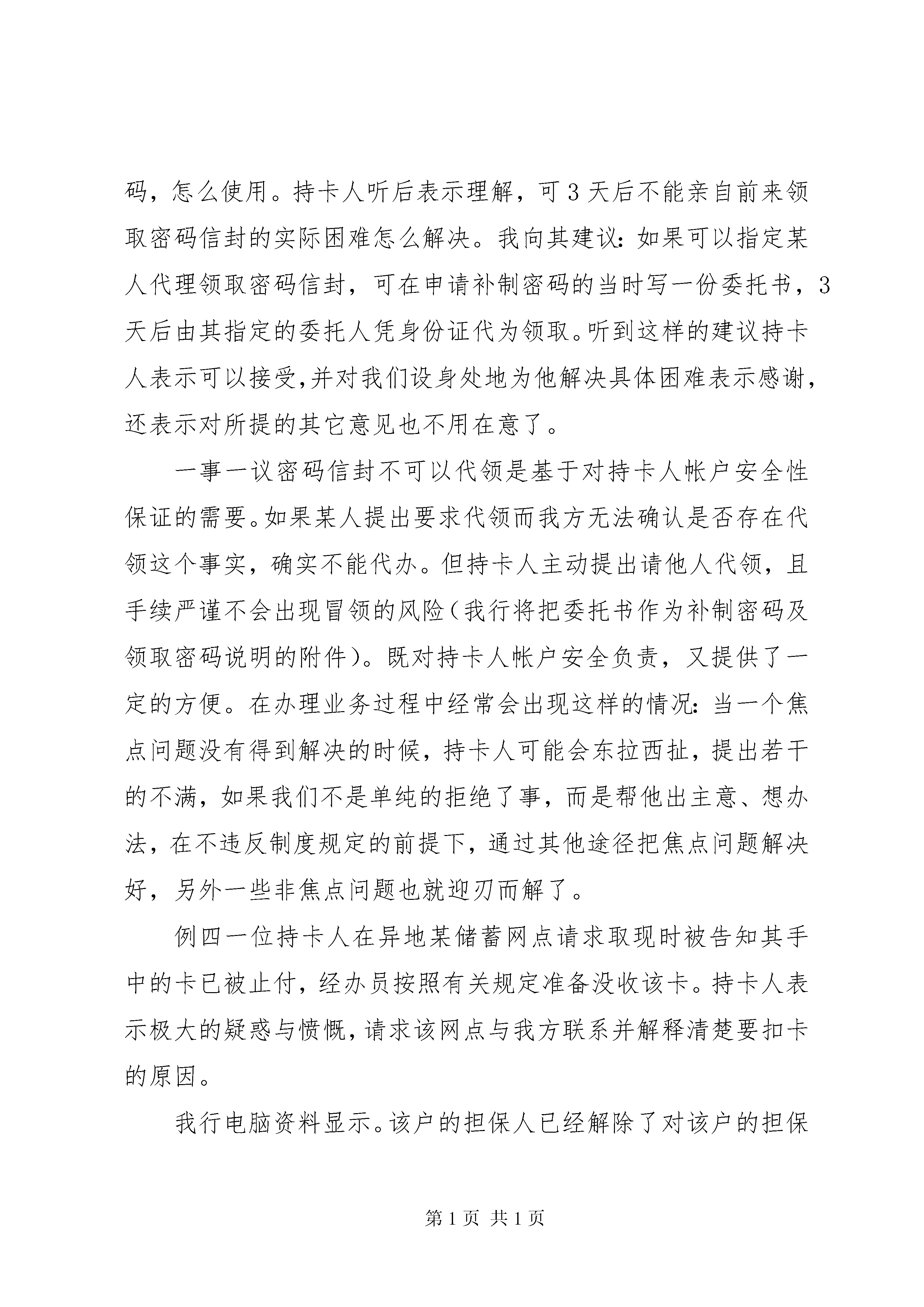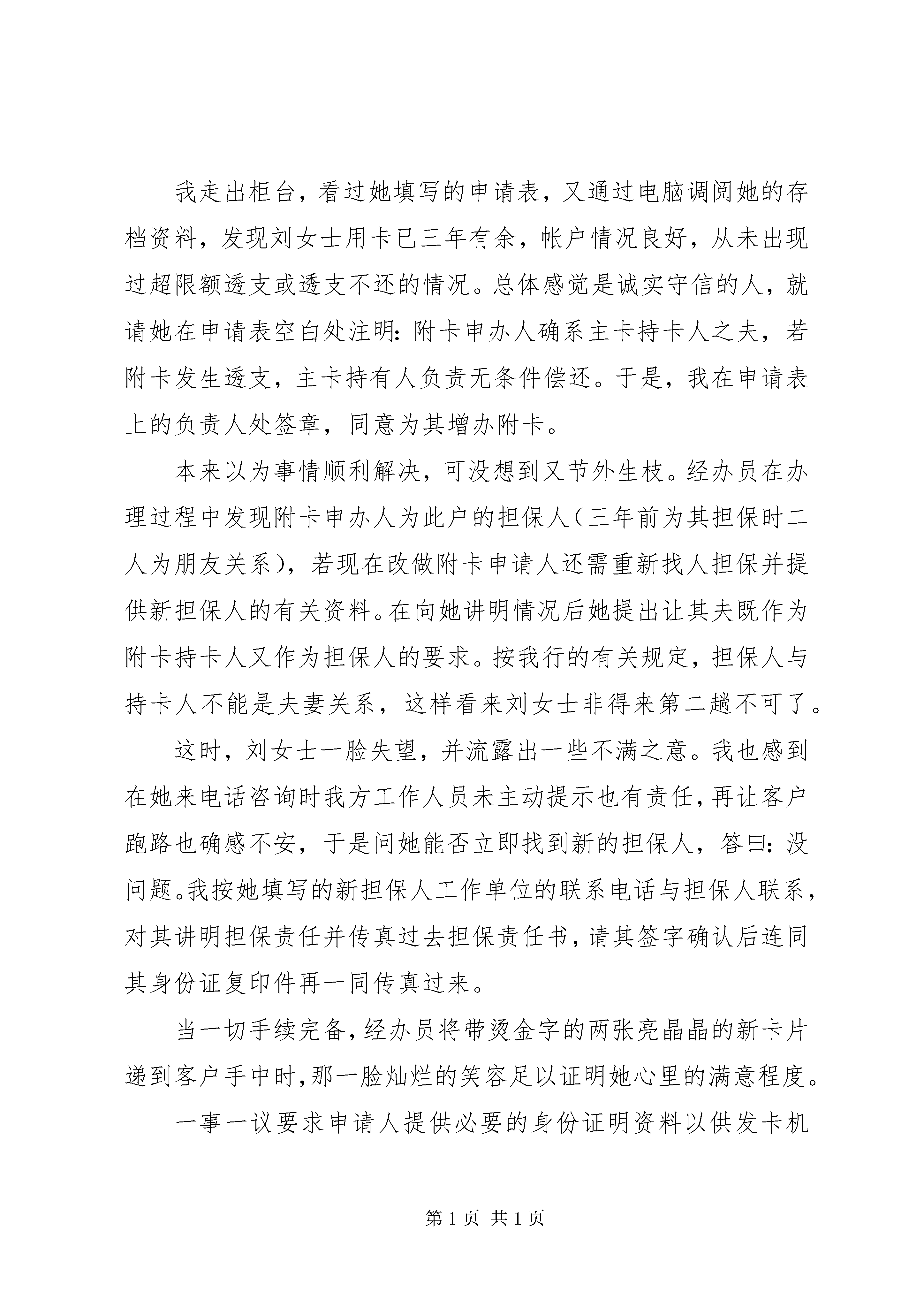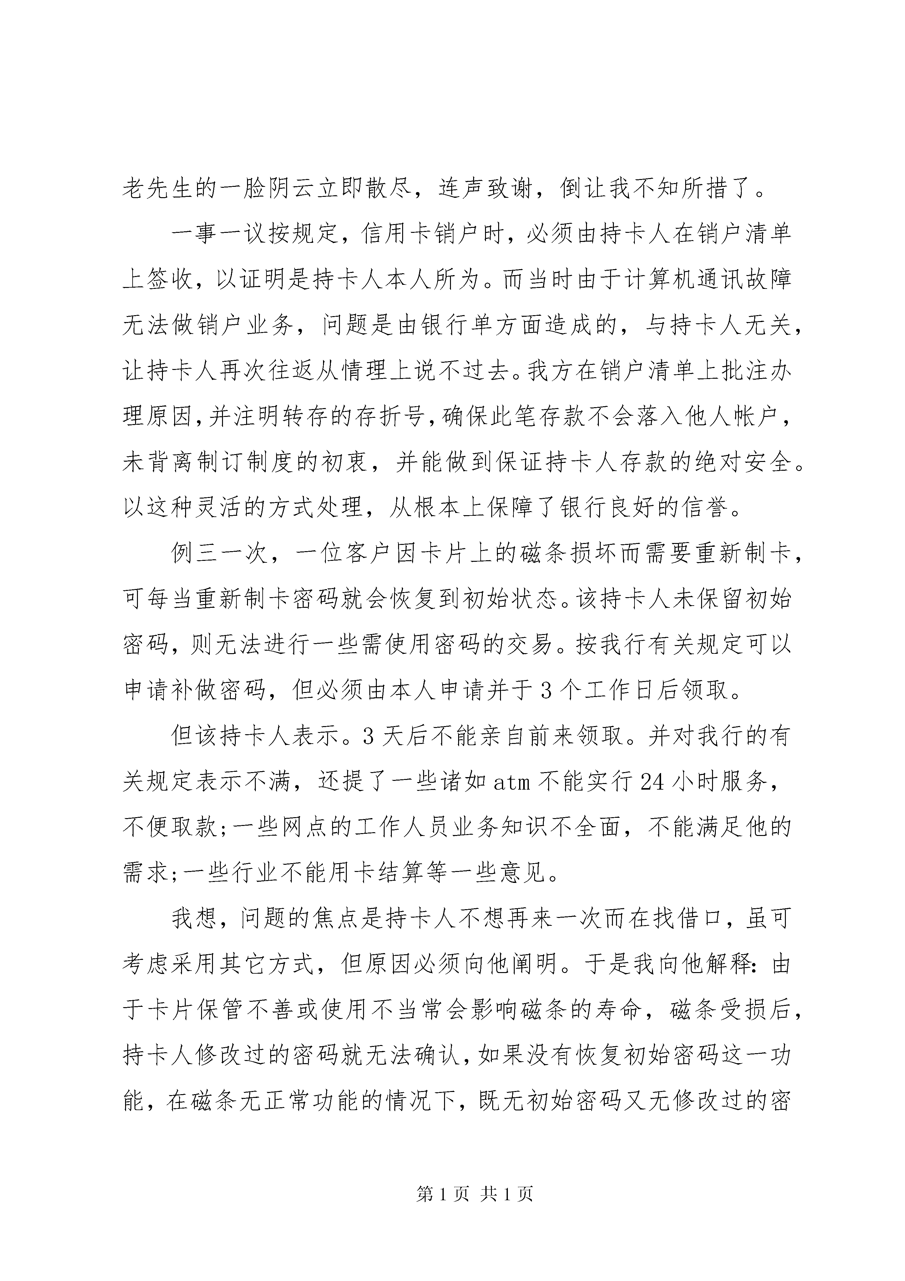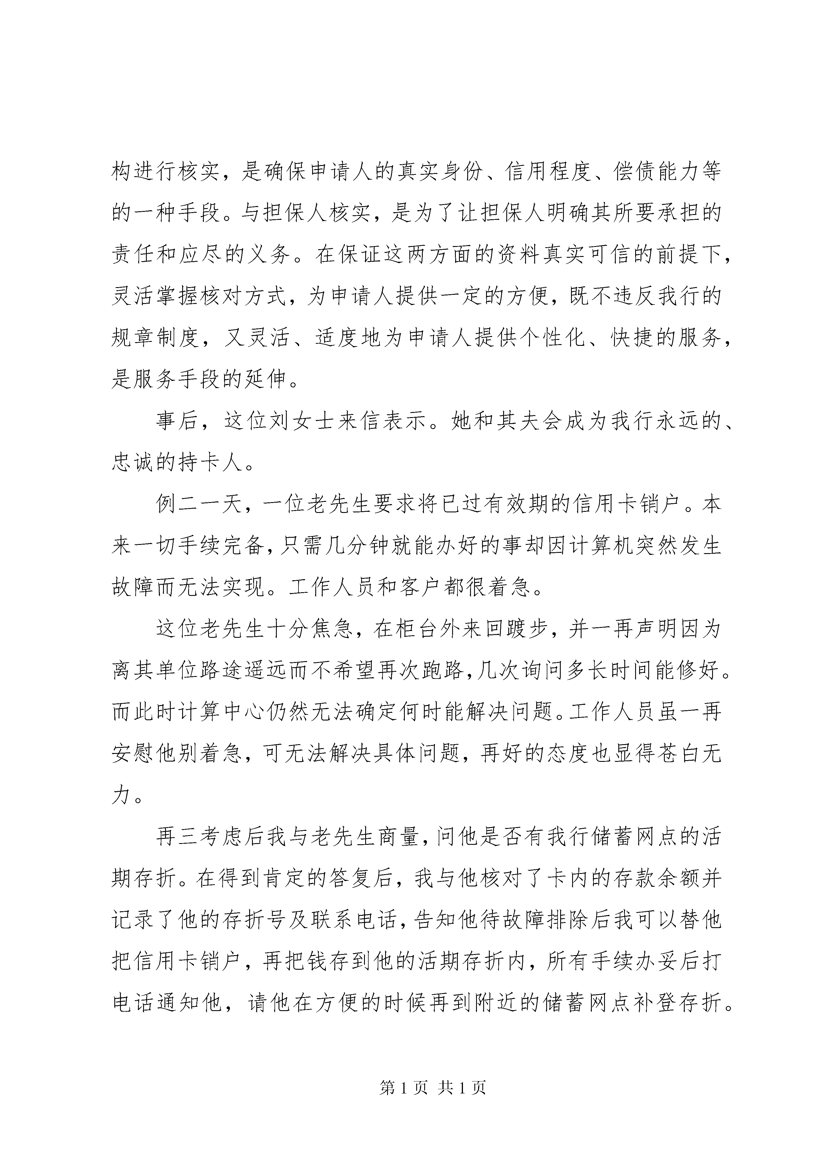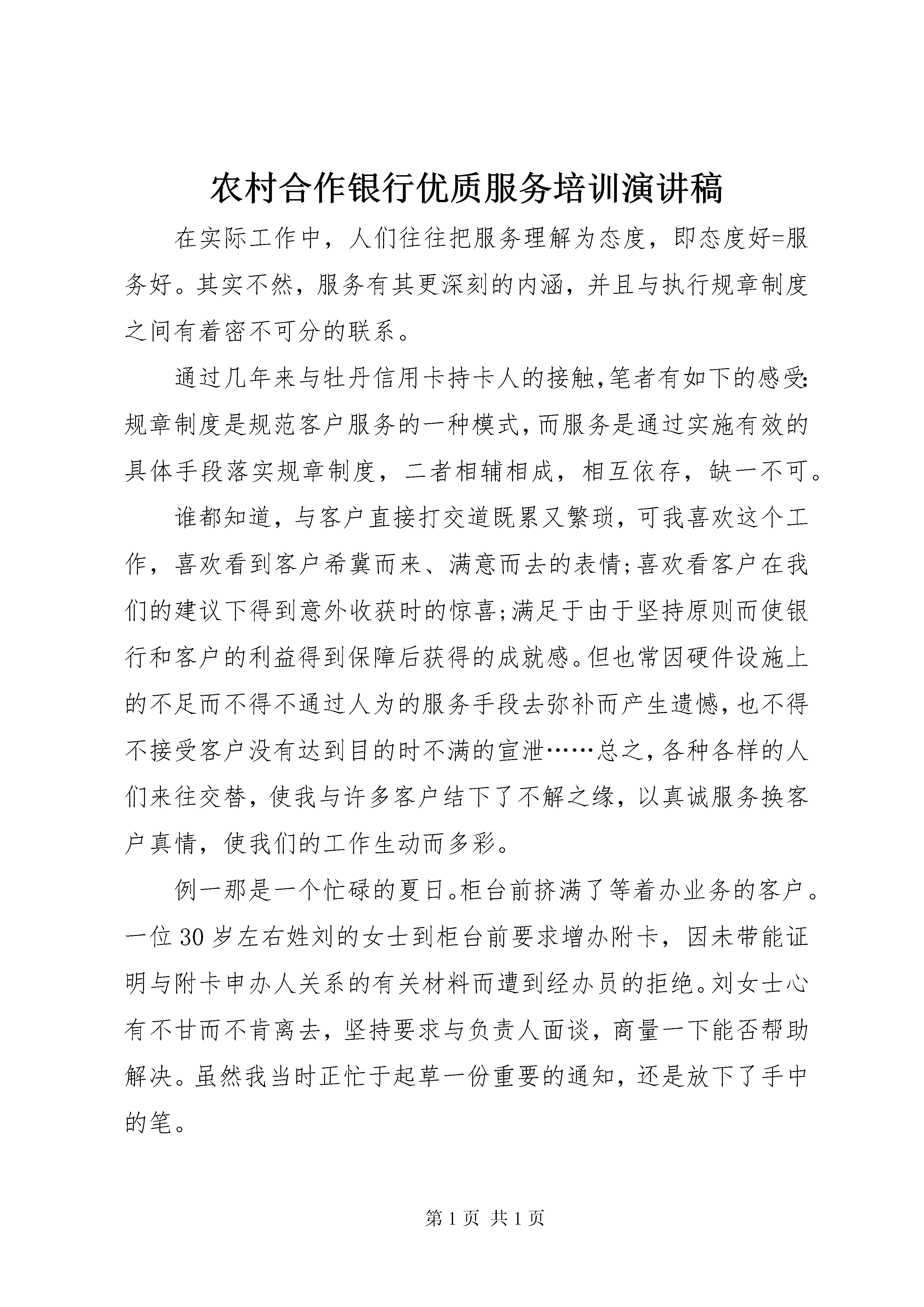 农村合作银行优质服务培训演讲稿在实际工作中,人们往往把服务理解为态度,即态度好=服务好。其实不然,服务有其更深刻的内涵,并且与执行规章制度之间有着密不可分的联系。通过几年来与牡丹信用卡持卡人的接触,笔者有如下的感受:规章制度是规范客户服务的一种模式,而服务是通过实施有效的具体手段落实规章制度,二者相辅相成,相互依存,缺一不可。谁都知道,与客户直接打交道既累又繁琐,可我喜欢这个工作,喜欢看到客户希冀而来、满意而去的表情;喜欢看客户在我们的建议下得到意外收获时的惊喜;满足于由于坚持原则而使银行和客户的利益得到保障后获得的成就感。但也常因硬件设施上的不足而不得不通过人为的服务手段去弥补而产生遗憾,也不得不接受客户没有达到目的时不满的宣泄……总之,各种各样的人们来往交替,使我与许多客户结下了不解之缘,以真诚服务换客户真情,使我们的工作生动而多彩。例一那是一个忙碌的夏日。柜台前挤满了等着办业务的客户。一位30岁左右姓刘的女士到柜台前要求增办附卡,因未带能证明与附卡申办人关系的有关材料而遭到经办员的拒绝。刘女士心有不甘而不肯离去,坚持要求与负责人面谈,商量一下能否帮助解决。虽然我当时正忙于起草一份重要的通知,还是放下了手中的笔。我走出柜台,看过她填写的申请表,又通过电脑调阅她的存档资料,发现刘女士用卡已三年有余,帐户情况良好,从未出现过超限额透支或透支不还的情况。总体感觉是诚实守信的人,就请她在申请表空白处注明:附卡申办人确系主卡持卡人之夫,若附卡发生透支,主卡持有人负责无条件偿还。于是,我在申请表上的负责人处签章,同意为其增办附卡。本来以为事情顺利解决,可没想到又节外生枝。经办员在办理过程中发现附卡申办人为此户的担保人(三年前为其担保时二人为朋友关系),若现在改做附卡申请人还需重新找人担保并提供新担保人的有关资料。在向她讲明情况后她提出让其夫既作为附卡持卡人又作为担保人的要求。按我行的有关规定,担保人与持卡人不能是夫妻关系,这样看来刘女士非得来第二趟不可了。这时,刘女士一脸失望,并流露出一些不满之意。我也感到在她来电话咨询时我方工作人员未主动提示也有责任,再让客户跑路也确感不安,于是问她能否立即找到新的担保人,答曰:没问题。我按她填写的新担保人工作单位的联系电话与担保人联系,对其讲明担保责任并传真过去担保责任书,请其签字确认后连同其身份证复印件再一同传真过来。当一切手续完备,经办员将带烫金字的两张亮晶晶的新卡片递到客户手中时,那一脸灿烂的笑容足以证明她心里的满意程度。一事一议要求申请人提供必要的身份证明资料以供发卡机构进行核实,是确保申请人的真实身份、信用程度、偿债能力等的一种手段。与担保人核实,是为了让担保人明确其所要承担的责任和应尽的义务。在保证这两方面的资料真实可信的前提下,灵活掌握核对方式,为申请人提供一定的方便,既不违反我行的规章制度,又灵活、适度地为申请人提供个性化、快捷的服务,是服务手段的延伸。事后,这位刘女士来信表示。她和其夫会成为我行永远的、忠诚的持卡人。例二一天,一位老先生要求将已过有效期的信用卡销户。本来一切手续完备,只需几分钟就能办好的事却因计算机突然发生故障而无法实现。工作人员和客户都很着急。这位老先生十分焦急,在柜台外来回踱步,并一再声明因为离其单位路途遥远而不希望再次跑路,几次询问多长时间能修好。而此时计算中心仍然无法确定何时能解决问题。工作人员虽一再安慰他别着急,可无法解决具体问题,再好的态度也显得苍白无力。再三考虑后我与老先生商量,问他是否有我行储蓄网点的活期存折。在得到肯定的答复后,我与他核对了卡内的存款余额并记录了他的存折号及联系电话,告知他待故障排除后我可以替他把信用卡销户,再把钱存到他的活期存折内,所有手续办妥后打电话通知他,请他在方便的时候再到附近的储蓄网点补登存折。老先生的一脸阴云立即散尽,连声致谢,倒让我不知所措了。一事一议按规定,信用卡销户时,必须由持卡人在销户清单上签收,以证明是持卡人本人所为。而当时由于计算机通讯故障无法做销户业务,问题是由银行单方面造成的,与持卡人无关,让持卡人再次往返从情理上说不过去。我方在销户清单上批注办理原因,并注明转存的存折号,确保此笔存款不会落入他人帐户,未背离制订制度的初衷,并能做到保证持卡人存款的绝对安全。以这种灵活的方式处理,从根本上保障了银行良好的信誉。例三一次,一位客户因卡片上的磁条损坏而需要重新制卡,可每当重新制卡密码就会恢复到初始状态。该持卡人未保留初始密码,则无法进行一些需使用密码的交易。按我行有关规定可以申请补做密码,但必须由本人申请并于3个工作日后领取。但该持卡人表示。3天后不能亲自前来领取。并对我行的有关规定表示不满,还提了一些诸如atm不能实行24小时服务,不便取款;一些网点的工作人员业务知识不全面,不能满