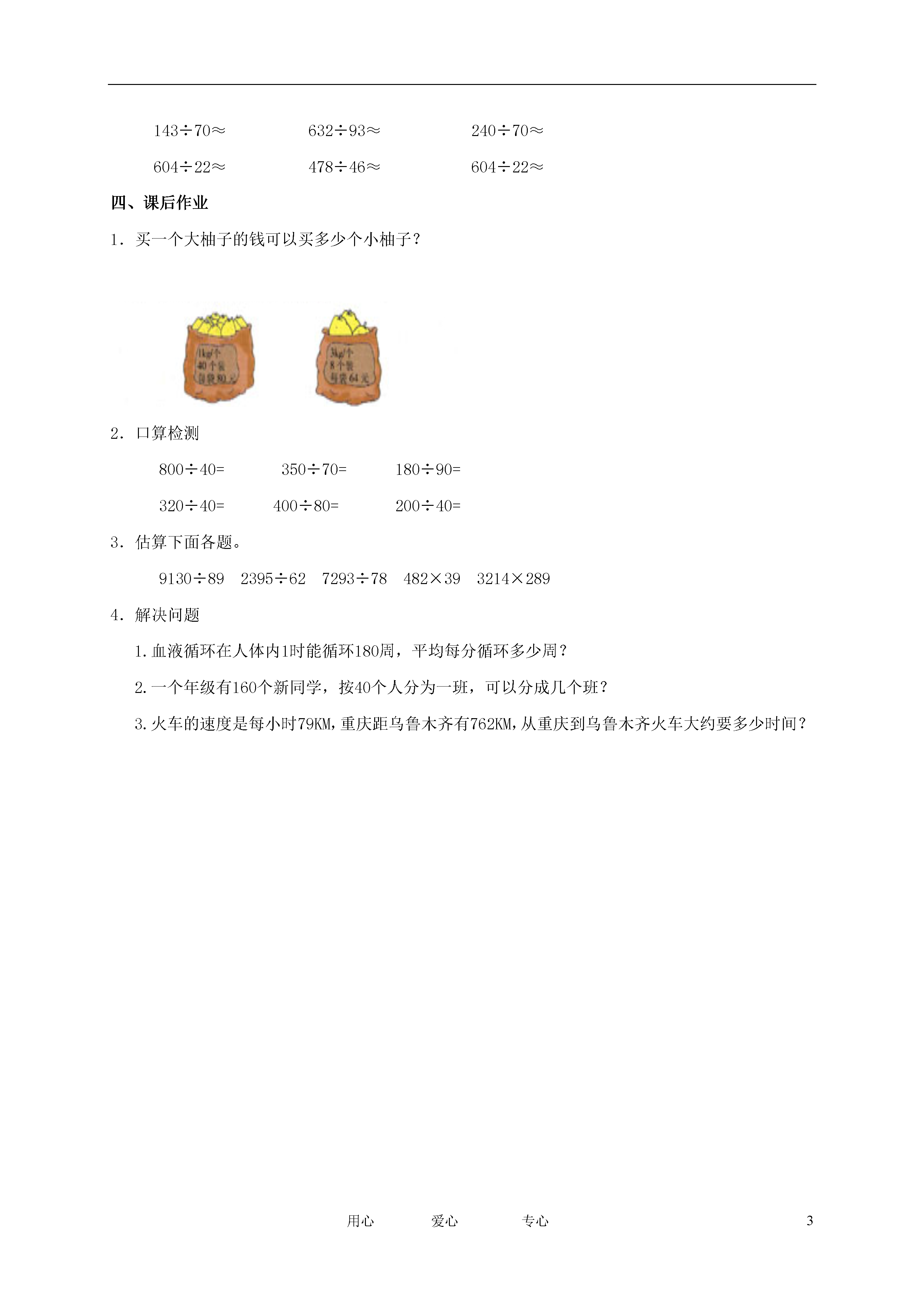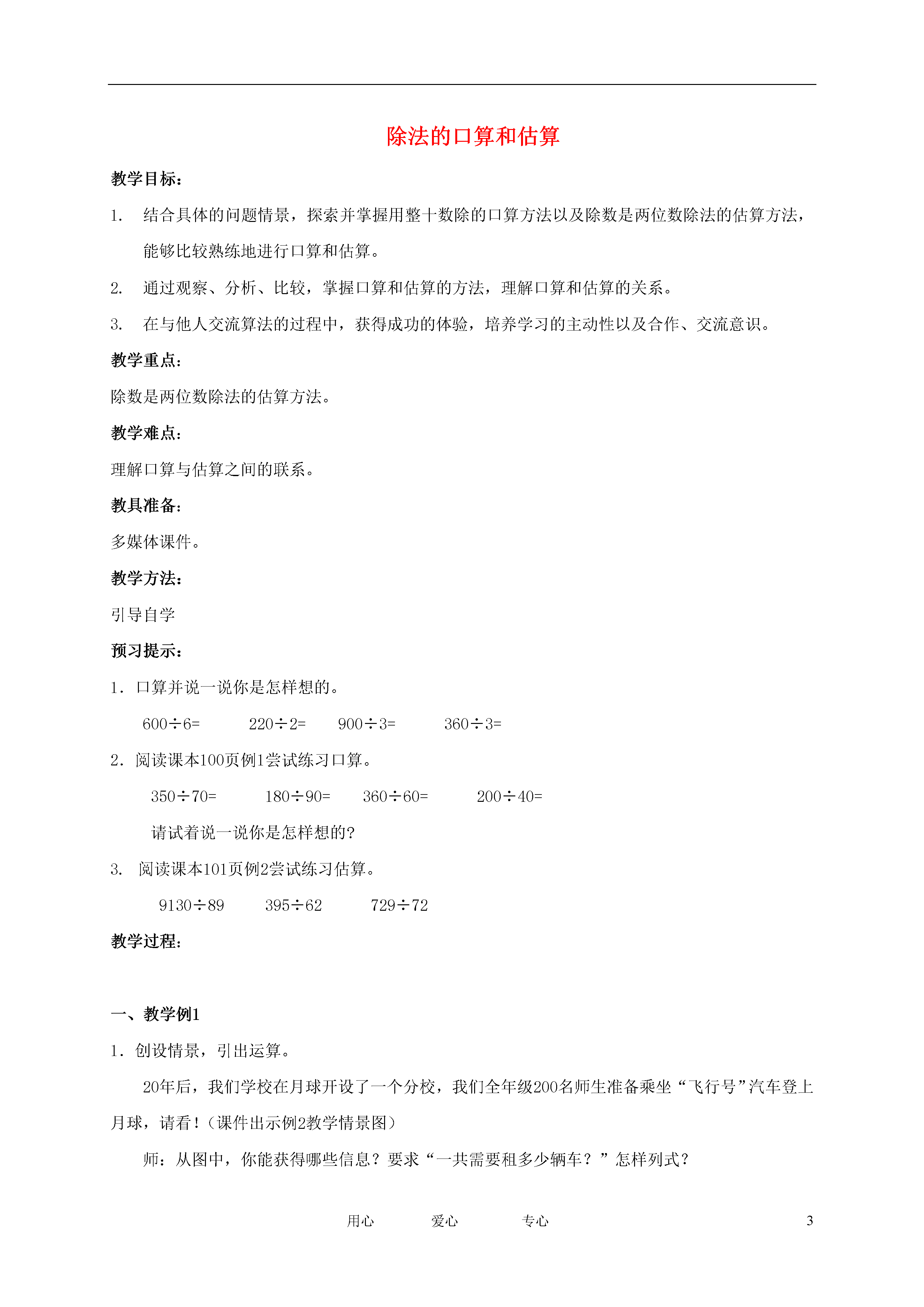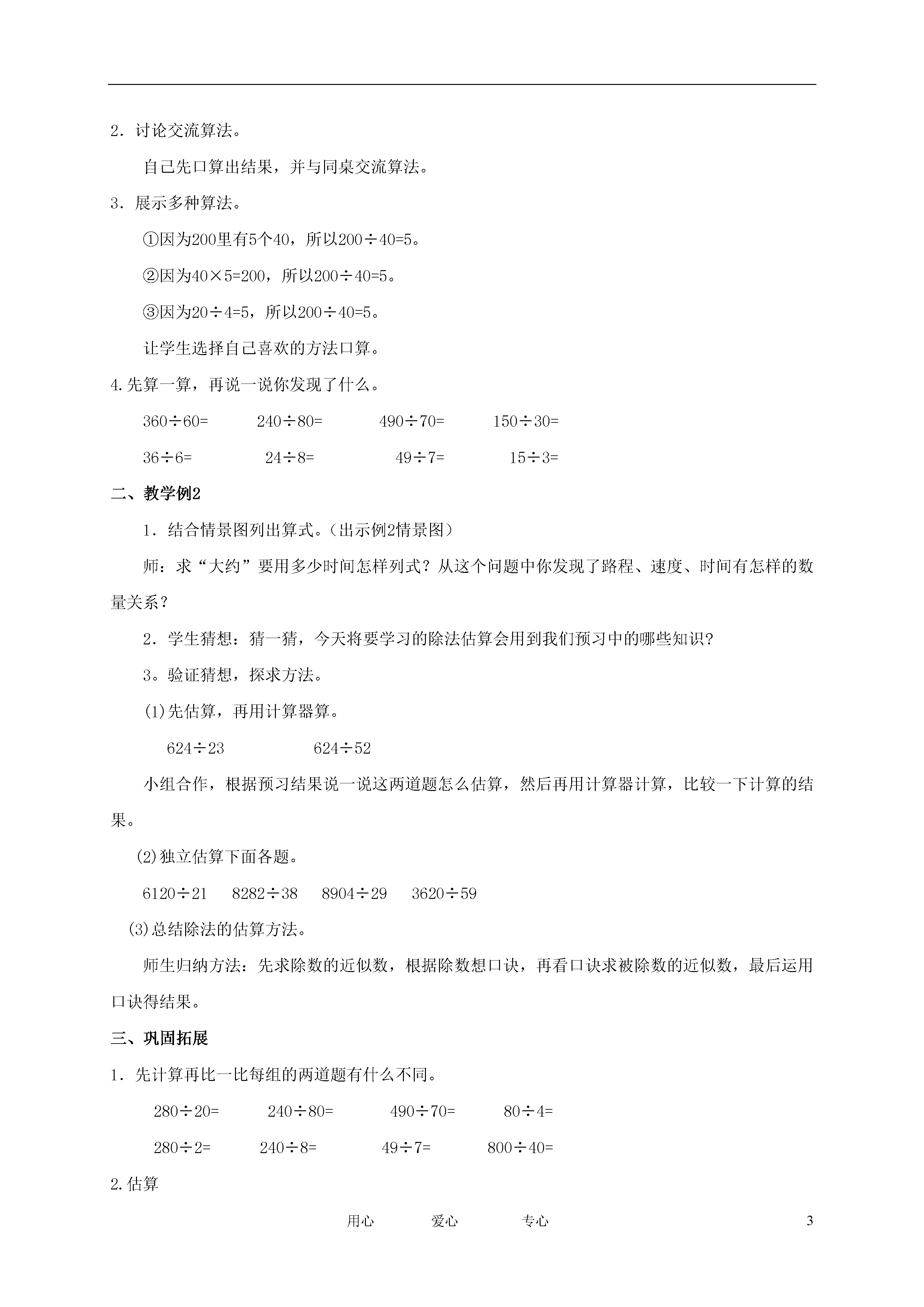 3用心爱心专心除法的口算和估算教学目标:结合具体的问题情景,探索并掌握用整十数除的口算方法以及除数是两位数除法的估算方法,能够比较熟练地进行口算和估算。通过观察、分析、比较,掌握口算和估算的方法,理解口算和估算的关系。在与他人交流算法的过程中,获得成功的体验,培养学习的主动性以及合作、交流意识。教学重点:除数是两位数除法的估算方法。教学难点:理解口算与估算之间的联系。教具准备:多媒体课件。教学方法:引导自学预习提示:1.口算并说一说你是怎样想的。600÷6=220÷2=900÷3=360÷3=2.阅读课本100页例1尝试练习口算。350÷70=180÷90=360÷60=200÷40=请试着说一说你是怎样想的?阅读课本101页例2尝试练习估算。9130÷89395÷62729÷72教学过程:一、教学例11.创设情景,引出运算。20年后,我们学校在月球开设了一个分校,我们全年级200名师生准备乘坐“飞行号”汽车登上月球,请看!(课件出示例2教学情景图)师:从图中,你能获得哪些信息?要求“一共需要租多少辆车?”怎样列式?2.讨论交流算法。自己先口算出结果,并与同桌交流算法。3.展示多种算法。①因为200里有5个40,所以200÷40=5。②因为40×5=200,所以200÷40=5。③因为20÷4=5,所以200÷40=5。让学生选择自己喜欢的方法口算。4.先算一算,再说一说你发现了什么。360÷60=240÷80=490÷70=150÷30=36÷6=24÷8=49÷7=15÷3=二、教学例21.结合情景图列出算式。(出示例2情景图)师:求“大约”要用多少时间怎样列式?从这个问题中你发现了路程、速度、时间有怎样的数量关系?2.学生猜想:猜一猜,今天将要学习的除法估算会用到我们预习中的哪些知识?3。验证猜想,探求方法。(1)先估算,再用计算器算。624÷23624÷52小组合作,根据预习结果说一说这两道题怎么估算,然后再用计算器计算,比较一下计算的结果。(2)独立估算下面各题。6120÷218282÷388904÷293620÷59(3)总结除法的估算方法。师生归纳方法:先求除数的近似数,根据除数想口诀,再看口诀求被除数的近似数,最后运用口诀得结果。三、巩固拓展1.先计算再比一比每组的两道题有什么不同。280÷20=240÷80=490÷70=80÷4=280÷2=240÷8=49÷7=800÷40=2.估算143÷70≈632÷93≈240÷70≈604÷22≈478÷46≈604÷22≈四、课后作业1.买一个大柚子的钱可以买多少个小柚子?2.口算检测800÷40=350÷70=180÷90=320÷40=400÷80=200÷40=3.估算下面各题。9130÷892395÷627293÷78482×393214×2894.解决问题1.血液循环在人体内1时能循环180周,平均每分循环多少周?2.一个年级有160个新同学,按40个人分为一班,可以分成几个班?3.火车的速度是每小时79KM,重庆距乌鲁木齐有762KM,从重庆到乌鲁木齐火车大约要多少时间?