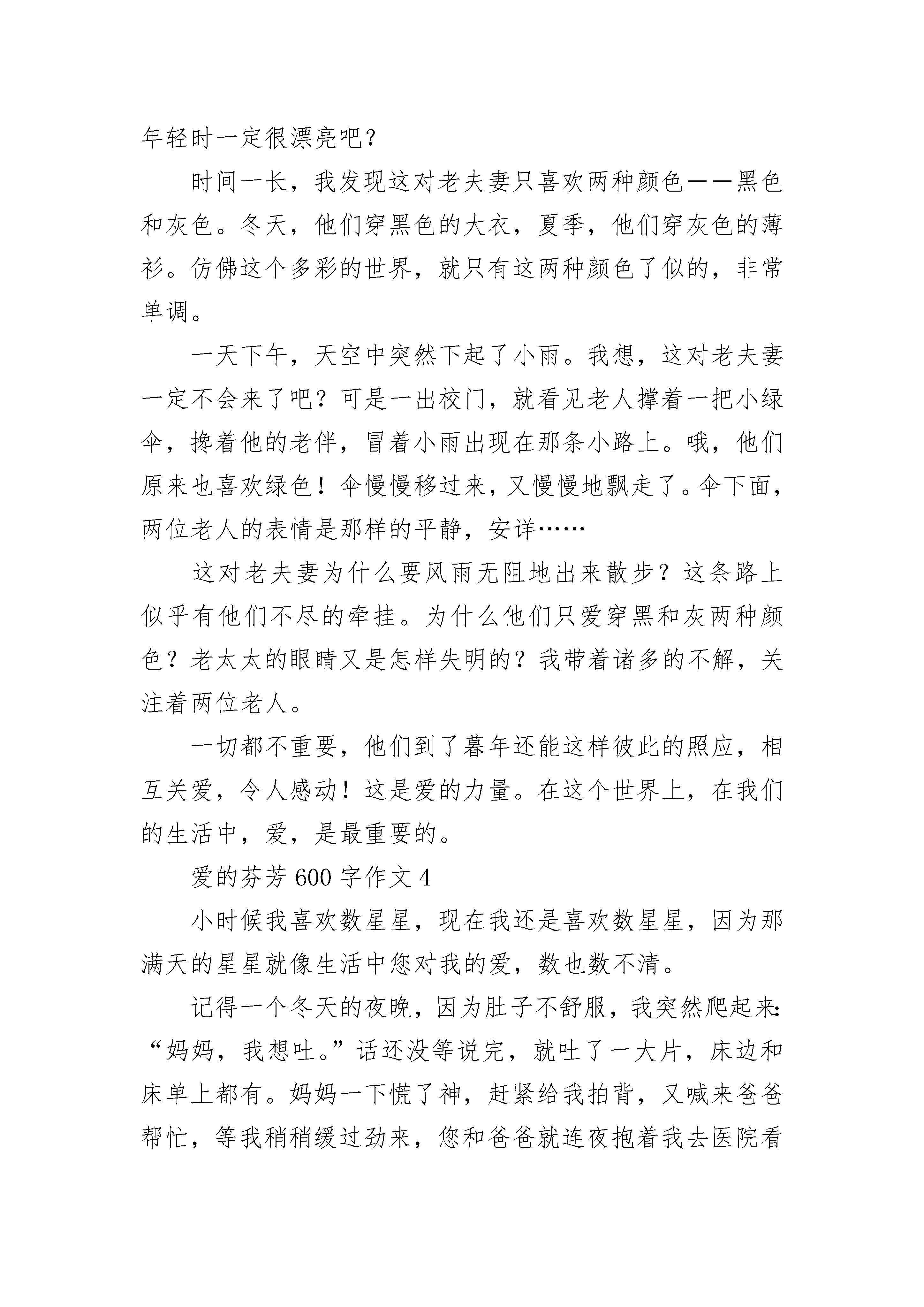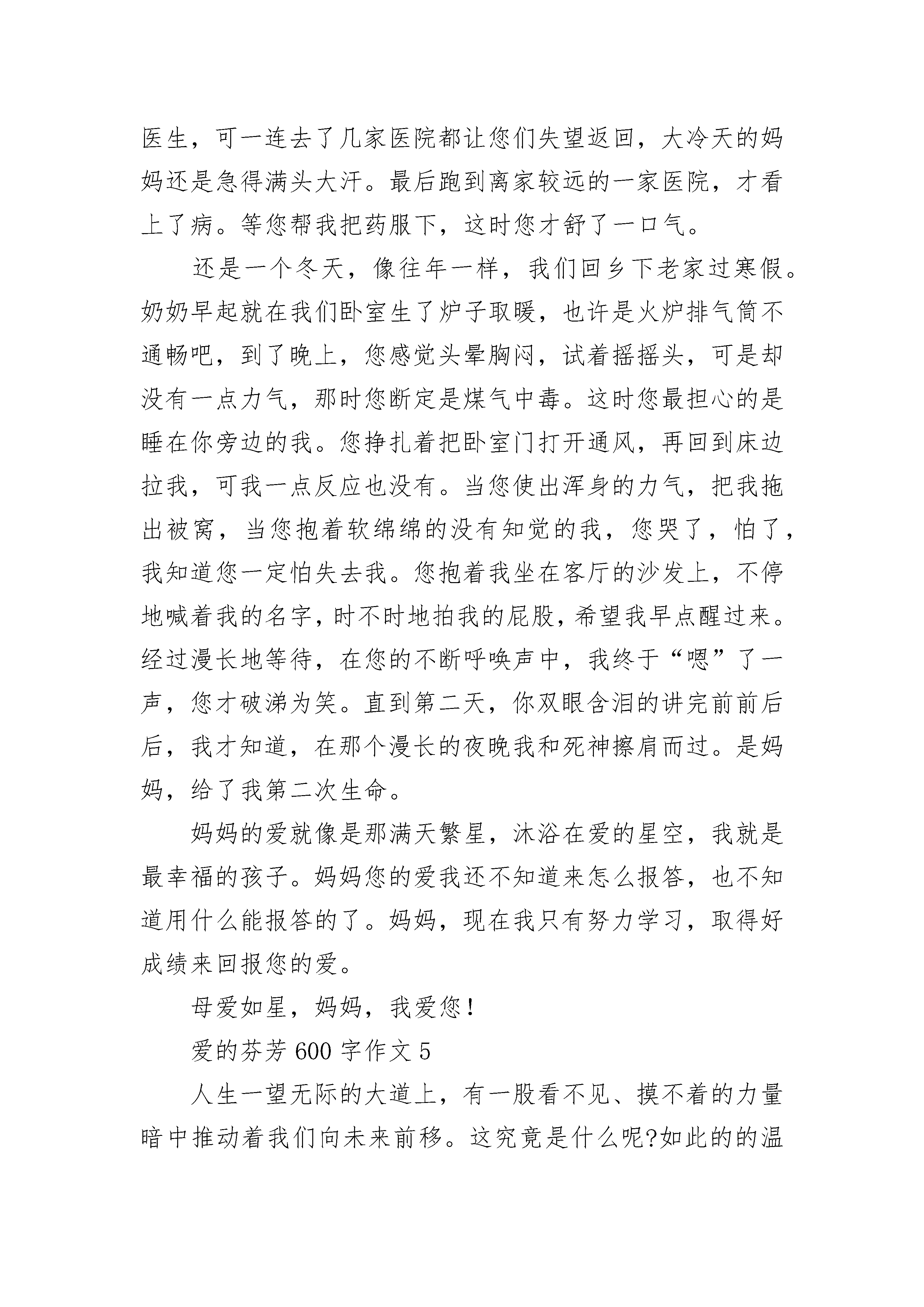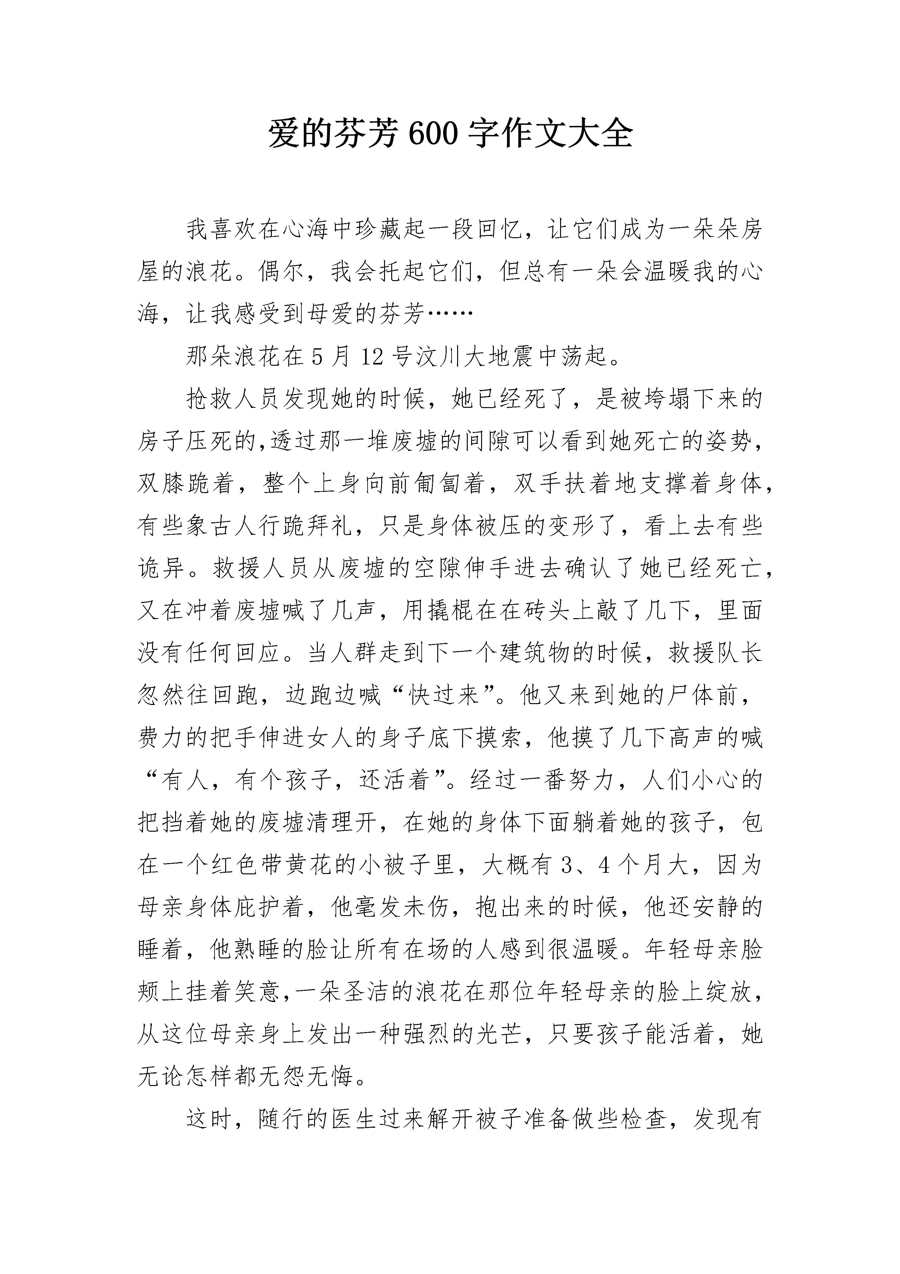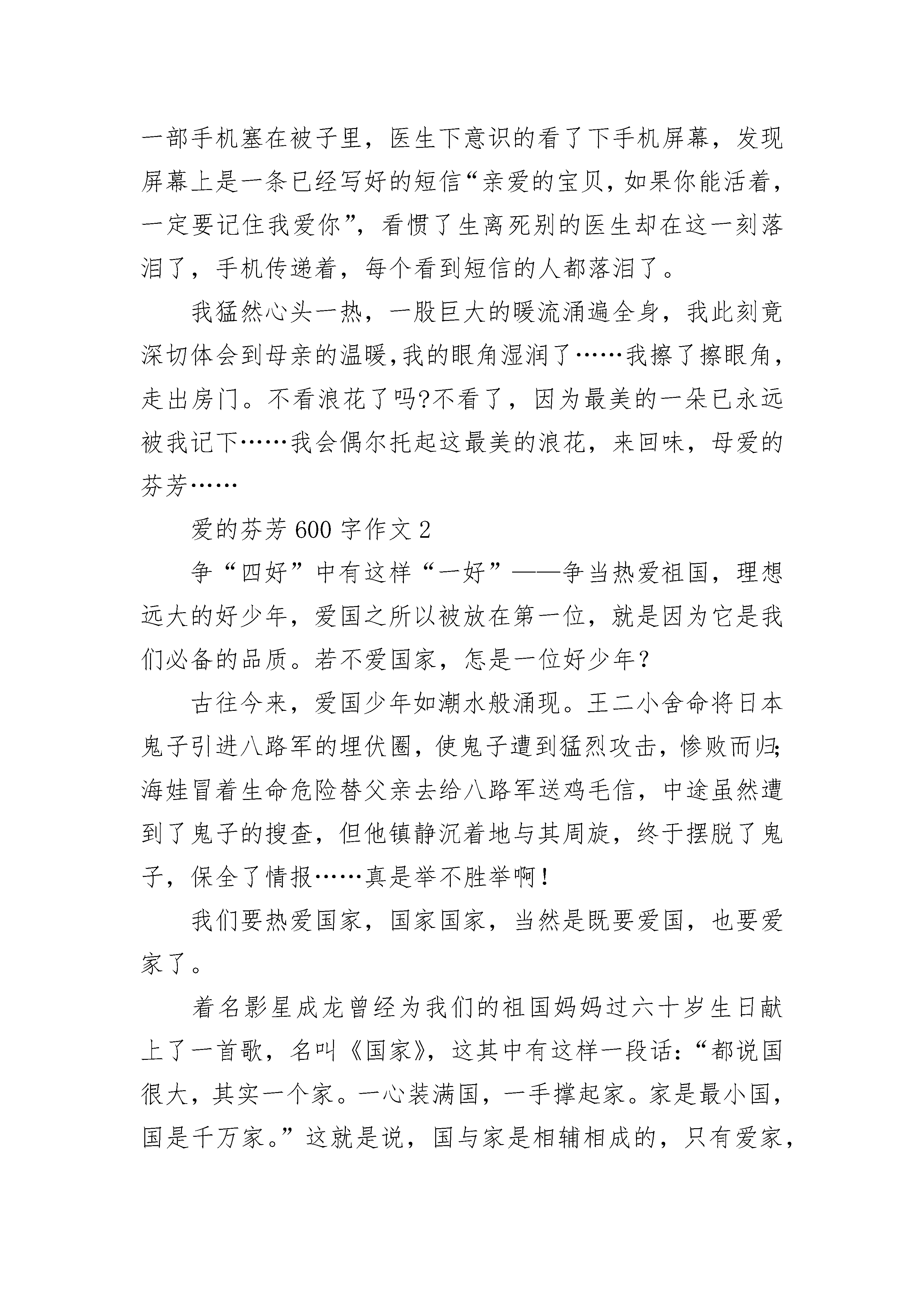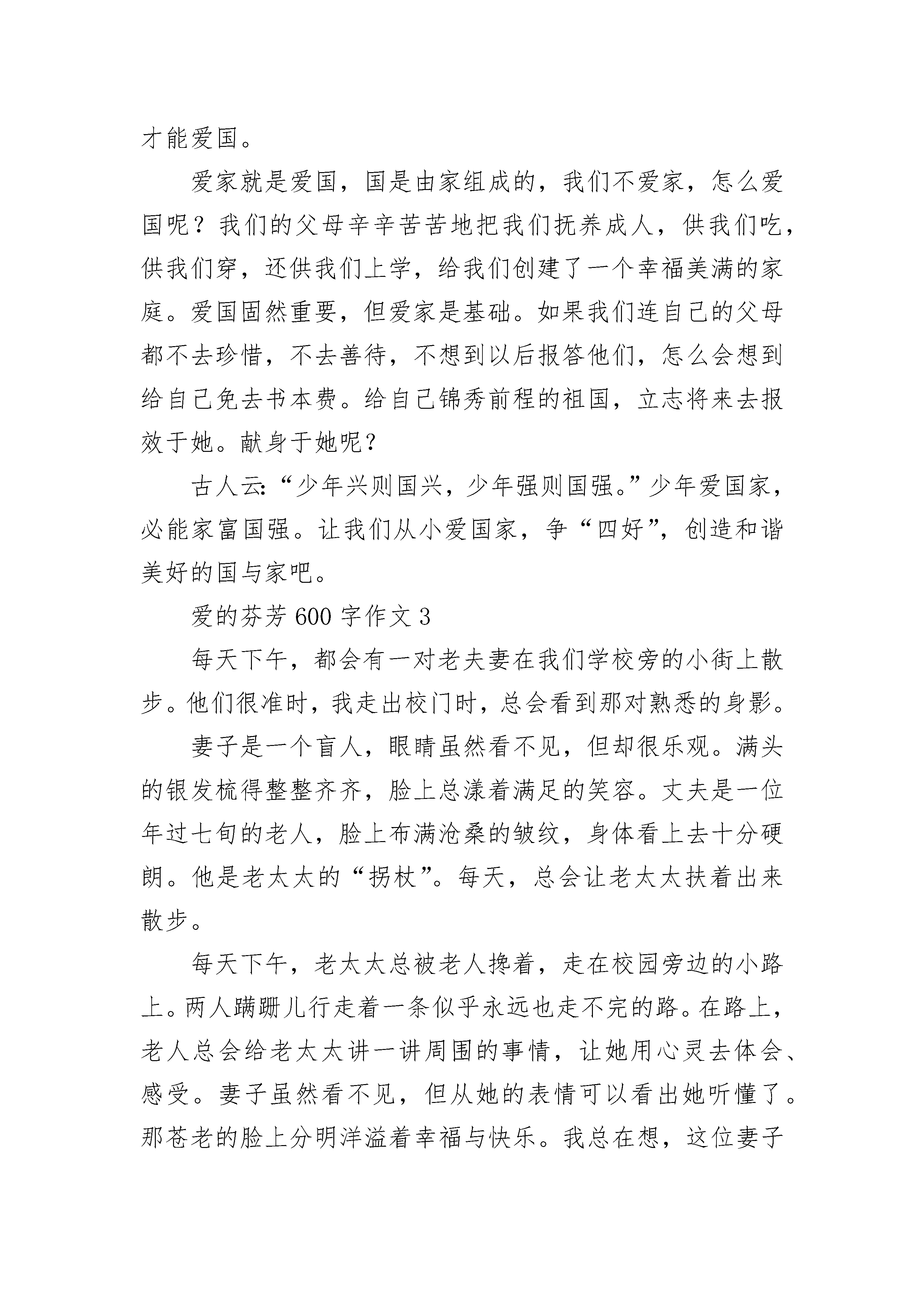 爱的芬芳600字作文大全我喜欢在心海中珍藏起一段回忆,让它们成为一朵朵房屋的浪花。偶尔,我会托起它们,但总有一朵会温暖我的心海,让我感受到母爱的芬芳……那朵浪花在5月12号汶川大地震中荡起。抢救人员发现她的时候,她已经死了,是被垮塌下来的房子压死的,透过那一堆废墟的间隙可以看到她死亡的姿势,双膝跪着,整个上身向前匍匐着,双手扶着地支撑着身体,有些象古人行跪拜礼,只是身体被压的变形了,看上去有些诡异。救援人员从废墟的空隙伸手进去确认了她已经死亡,又在冲着废墟喊了几声,用撬棍在在砖头上敲了几下,里面没有任何回应。当人群走到下一个建筑物的时候,救援队长忽然往回跑,边跑边喊“快过来”。他又来到她的尸体前,费力的把手伸进女人的身子底下摸索,他摸了几下高声的喊“有人,有个孩子,还活着”。经过一番努力,人们小心的把挡着她的废墟清理开,在她的身体下面躺着她的孩子,包在一个红色带黄花的小被子里,大概有3、4个月大,因为母亲身体庇护着,他毫发未伤,抱出来的时候,他还安静的睡着,他熟睡的脸让所有在场的人感到很温暖。年轻母亲脸颊上挂着笑意,一朵圣洁的浪花在那位年轻母亲的脸上绽放,从这位母亲身上发出一种强烈的光芒,只要孩子能活着,她无论怎样都无怨无悔。这时,随行的医生过来解开被子准备做些检查,发现有一部手机塞在被子里,医生下意识的看了下手机屏幕,发现屏幕上是一条已经写好的短信“亲爱的宝贝,如果你能活着,一定要记住我爱你”,看惯了生离死别的医生却在这一刻落泪了,手机传递着,每个看到短信的人都落泪了。我猛然心头一热,一股巨大的暖流涌遍全身,我此刻竟深切体会到母亲的温暖,我的眼角湿润了……我擦了擦眼角,走出房门。不看浪花了吗?不看了,因为最美的一朵已永远被我记下……我会偶尔托起这最美的浪花,来回味,母爱的芬芳……爱的芬芳600字作文2争“四好”中有这样“一好”——争当热爱祖国,理想远大的好少年,爱国之所以被放在第一位,就是因为它是我们必备的品质。若不爱国家,怎是一位好少年?古往今来,爱国少年如潮水般涌现。王二小舍命将日本鬼子引进八路军的埋伏圈,使鬼子遭到猛烈攻击,惨败而归;海娃冒着生命危险替父亲去给八路军送鸡毛信,中途虽然遭到了鬼子的搜查,但他镇静沉着地与其周旋,终于摆脱了鬼子,保全了情报……真是举不胜举啊!我们要热爱国家,国家国家,当然是既要爱国,也要爱家了。着名影星成龙曾经为我们的祖国妈妈过六十岁生日献上了一首歌,名叫《国家》,这其中有这样一段话:“都说国很大,其实一个家。一心装满国,一手撑起家。家是最小国,国是千万家。”这就是说,国与家是相辅相成的,只有爱家,才能爱国。爱家就是爱国,国是由家组成的,我们不爱家,怎么爱国呢?我们的父母辛辛苦苦地把我们抚养成人,供我们吃,供我们穿,还供我们上学,给我们创建了一个幸福美满的家庭。爱国固然重要,但爱家是基础。如果我们连自己的父母都不去珍惜,不去善待,不想到以后报答他们,怎么会想到给自己免去书本费。给自己锦秀前程的祖国,立志将来去报效于她。献身于她呢?古人云:“少年兴则国兴,少年强则国强。”少年爱国家,必能家富国强。让我们从小爱国家,争“四好”,创造和谐美好的国与家吧。爱的芬芳600字作文3每天下午,都会有一对老夫妻在我们学校旁的小街上散步。他们很准时,我走出校门时,总会看到那对熟悉的身影。妻子是一个盲人,眼睛虽然看不见,但却很乐观。满头的银发梳得整整齐齐,脸上总漾着满足的笑容。丈夫是一位年过七旬的老人,脸上布满沧桑的皱纹,身体看上去十分硬朗。他是老太太的“拐杖”。每天,总会让老太太扶着出来散步。每天下午,老太太总被老人搀着,走在校园旁边的小路上。两人蹒跚儿行走着一条似乎永远也走不完的路。在路上,老人总会给老太太讲一讲周围的事情,让她用心灵去体会、感受。妻子虽然看不见,但从她的表情可以看出她听懂了。那苍老的脸上分明洋溢着幸福与快乐。我总在想,这位妻子年轻时一定很漂亮吧?时间一长,我发现这对老夫妻只喜欢两种颜色――黑色和灰色。冬天,他们穿黑色的大衣,夏季,他们穿灰色的薄衫。仿佛这个多彩的世界,就只有这两种颜色了似的,非常单调。一天下午,天空中突然下起了小雨。我想,这对老夫妻一定不会来了吧?可是一出校门,就看见老人撑着一把小绿伞,搀着他的老伴,冒着小雨出现在那条小路上。哦,他们原来也喜欢绿色!伞慢慢移过来,又慢慢地飘走了。伞下面,两位老人的表情是那样的平静,安详……这对老夫妻为什么要风雨无阻地出来散步?这条路上似乎有他们不尽的牵挂。为什么他们只爱穿黑和灰两种颜色?老太太的眼睛又是怎样失明的?我带着诸多的不解,关注着两位老人。一切都不重要,他们到了暮年还能这样彼此的照应,相互关爱,令人感动!这是爱的力量。在这个世界上,在我们的生活中,爱,是最重要的。爱的芬芳600字作文4小时候我喜欢数星星,现在我还是喜欢数星星,因