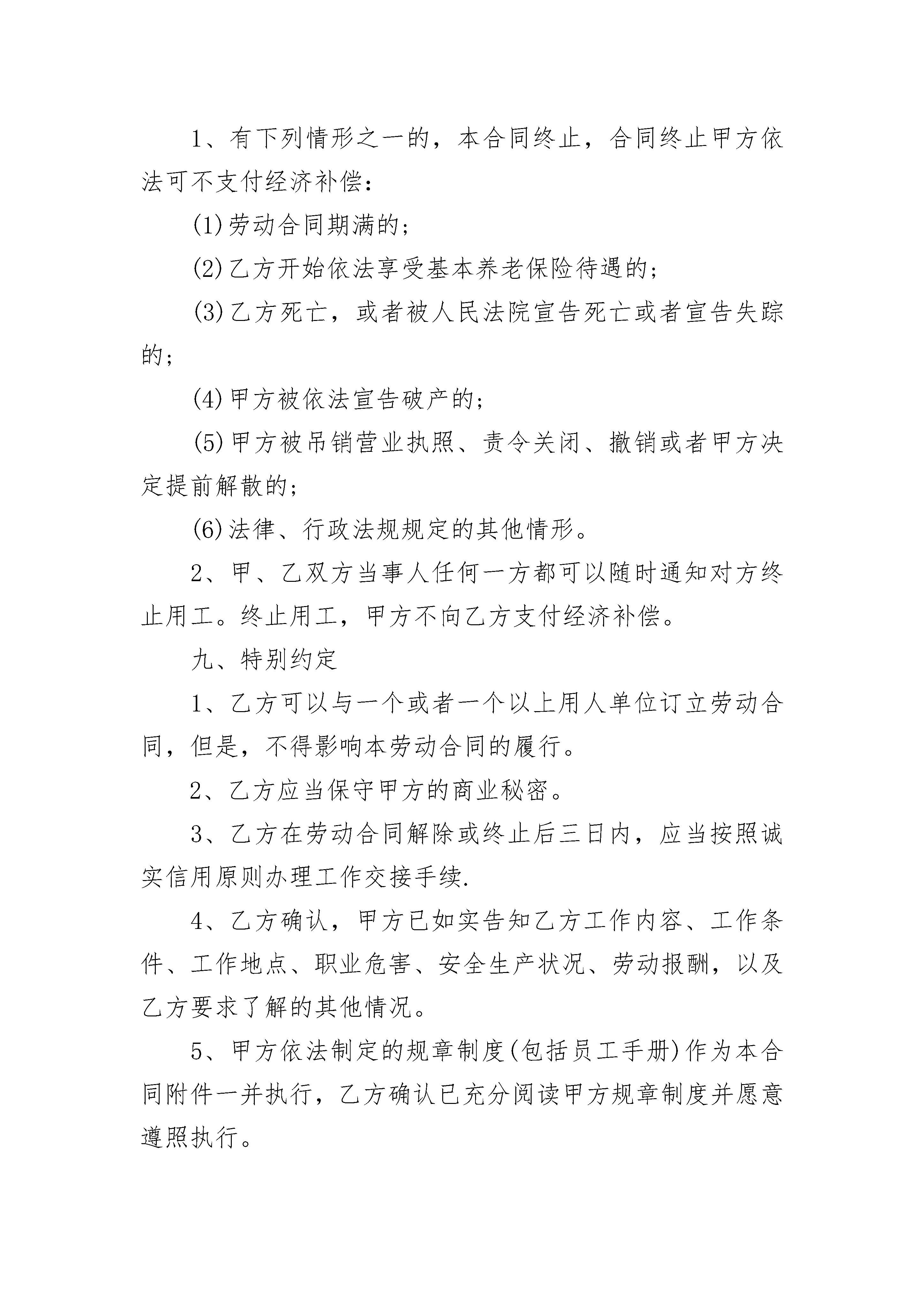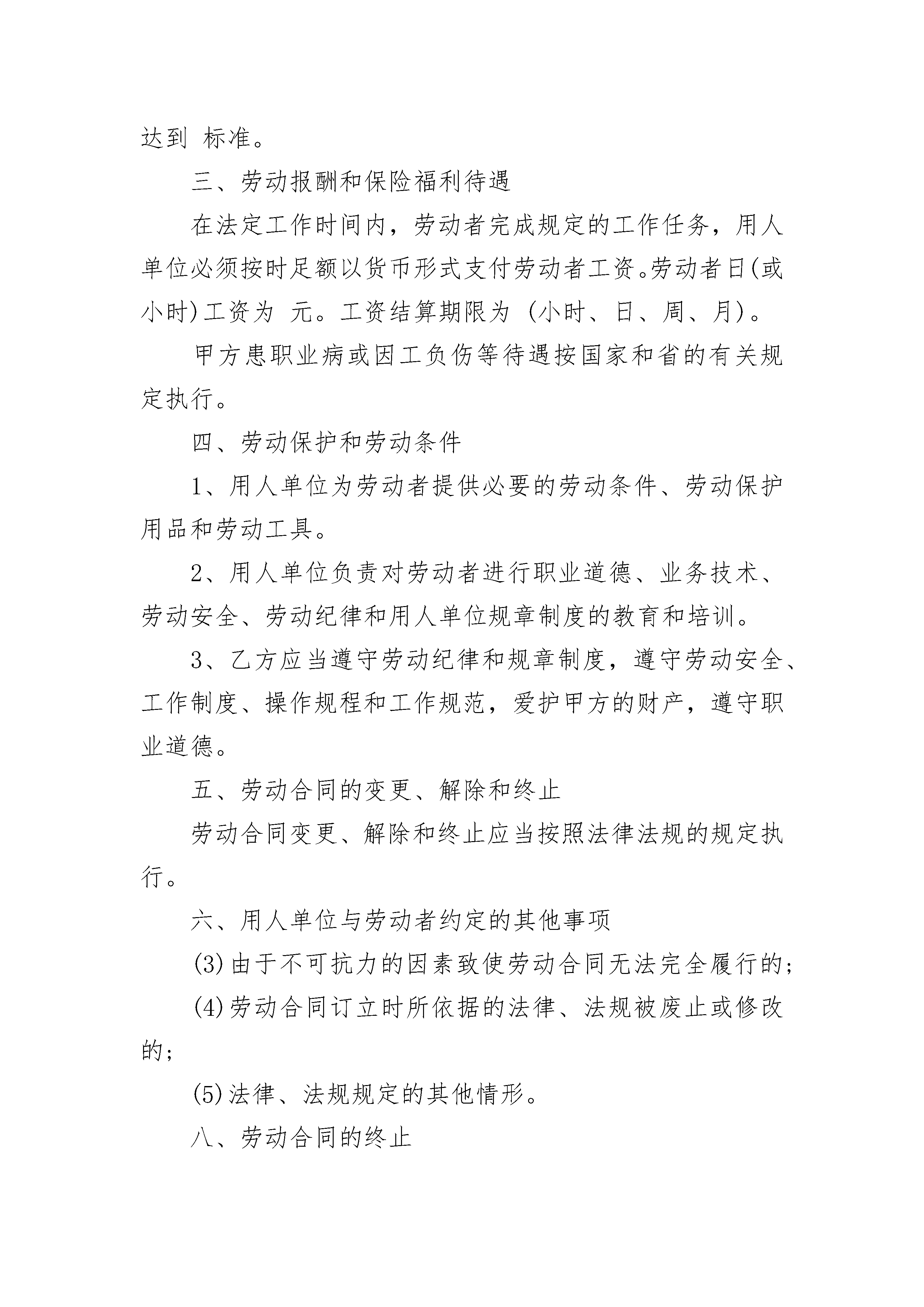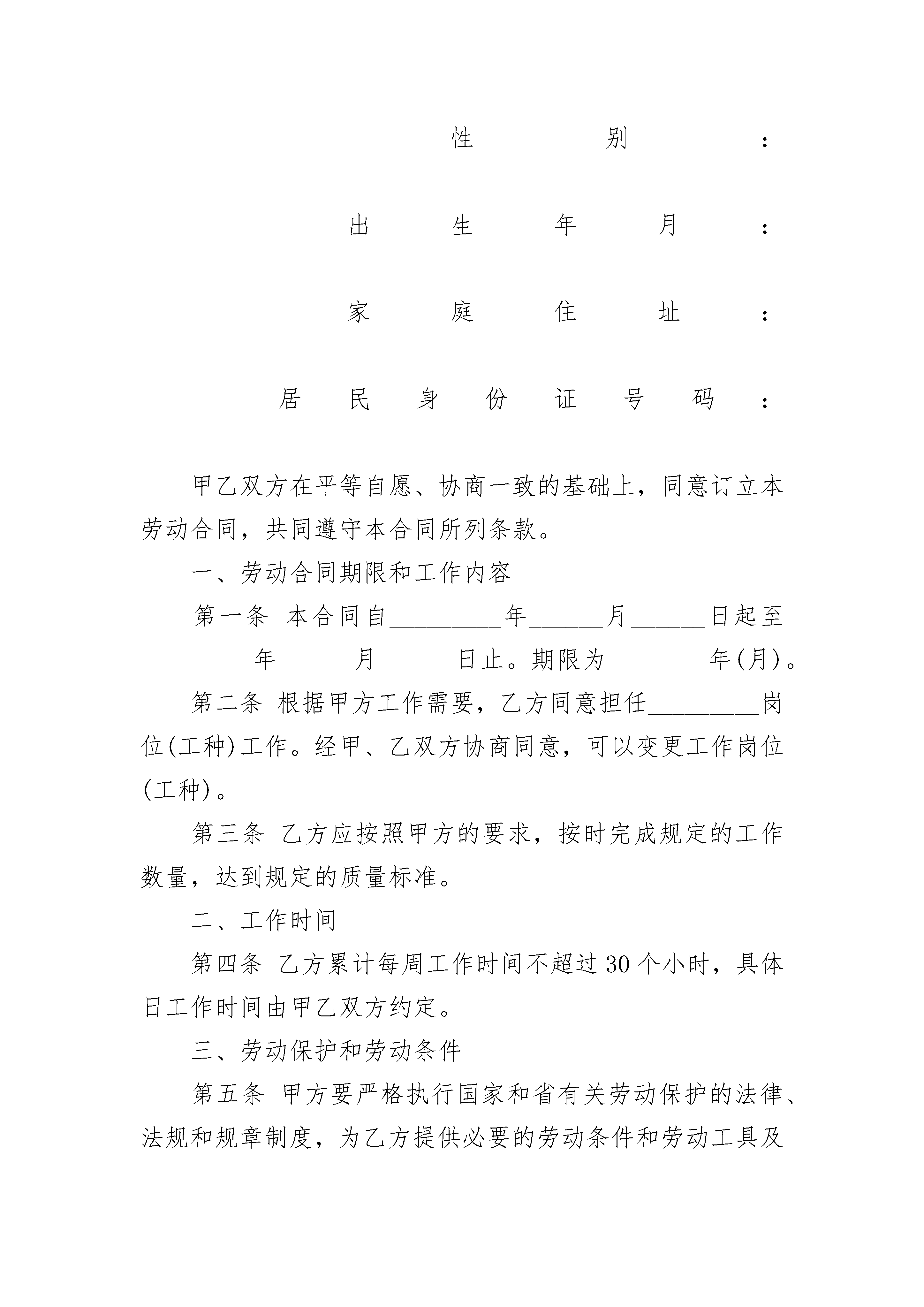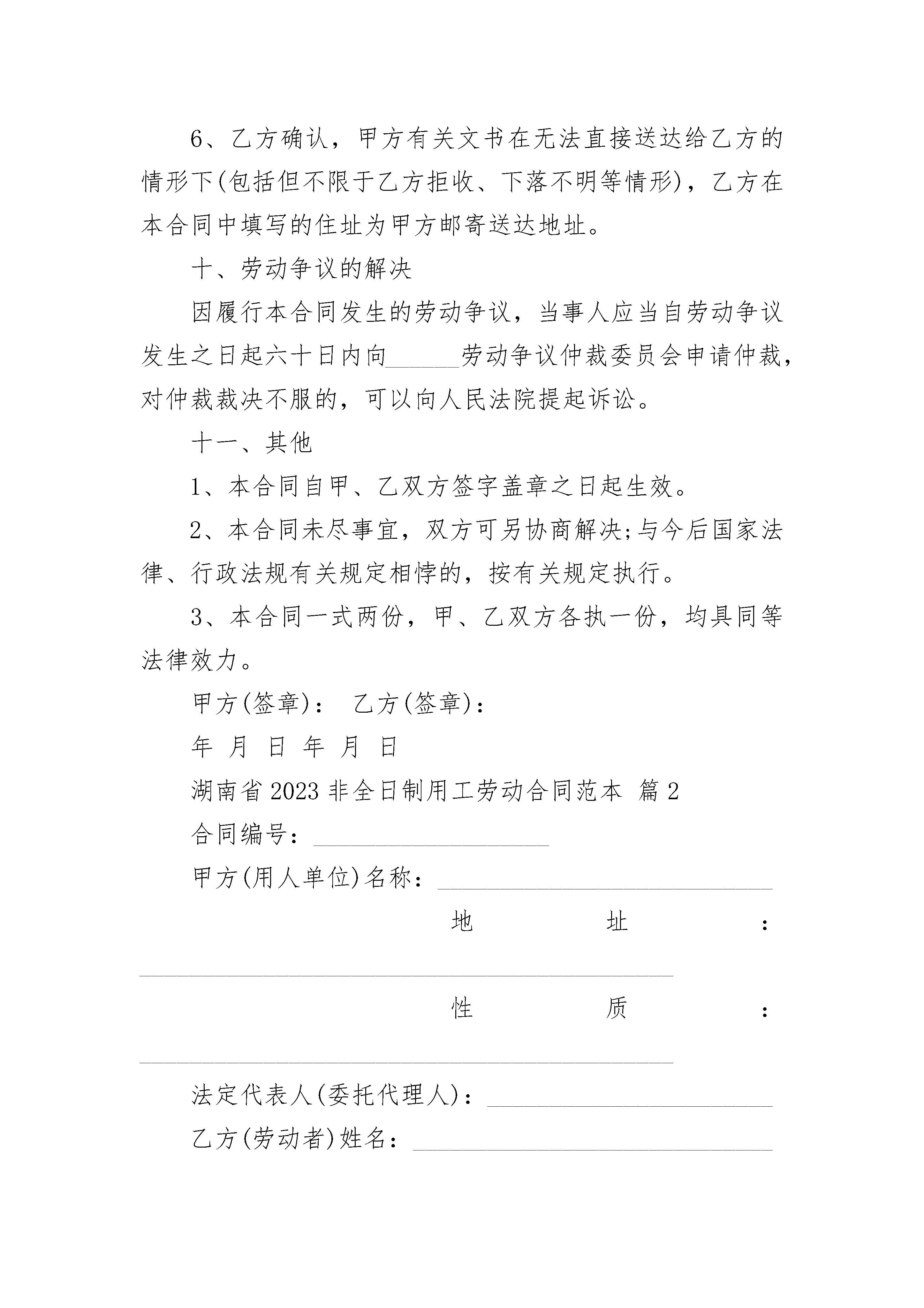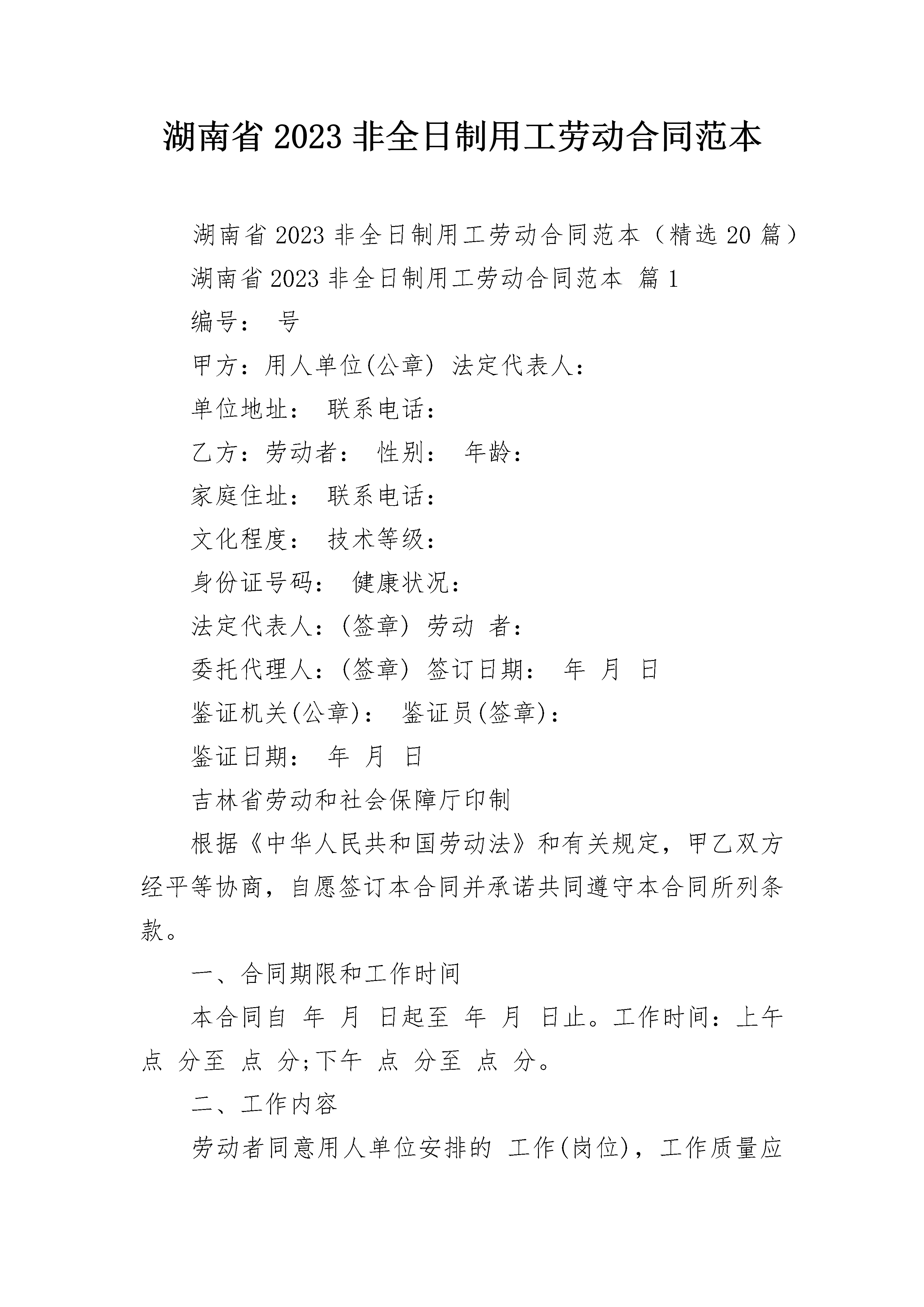 湖南省2023非全日制用工劳动合同范本湖南省2023非全日制用工劳动合同范本(精选20篇)湖南省2023非全日制用工劳动合同范本篇1编号:号甲方:用人单位(公章)法定代表人:单位地址:联系电话:乙方:劳动者:性别:年龄:家庭住址:联系电话:文化程度:技术等级:身份证号码:健康状况:法定代表人:(签章)劳动者:委托代理人:(签章)签订日期:年月日鉴证机关(公章):鉴证员(签章):鉴证日期:年月日吉林省劳动和社会保障厅印制根据《中华人民共和国劳动法》和有关规定,甲乙双方经平等协商,自愿签订本合同并承诺共同遵守本合同所列条款。一、合同期限和工作时间本合同自年月日起至年月日止。工作时间:上午点分至点分;下午点分至点分。二、工作内容劳动者同意用人单位安排的工作(岗位),工作质量应达到标准。三、劳动报酬和保险福利待遇在法定工作时间内,劳动者完成规定的工作任务,用人单位必须按时足额以货币形式支付劳动者工资。劳动者日(或小时)工资为元。工资结算期限为(小时、日、周、月)。甲方患职业病或因工负伤等待遇按国家和省的有关规定执行。四、劳动保护和劳动条件1、用人单位为劳动者提供必要的劳动条件、劳动保护用品和劳动工具。2、用人单位负责对劳动者进行职业道德、业务技术、劳动安全、劳动纪律和用人单位规章制度的教育和培训。3、乙方应当遵守劳动纪律和规章制度,遵守劳动安全、工作制度、操作规程和工作规范,爱护甲方的财产,遵守职业道德。五、劳动合同的变更、解除和终止劳动合同变更、解除和终止应当按照法律法规的规定执行。六、用人单位与劳动者约定的其他事项(3)由于不可抗力的因素致使劳动合同无法完全履行的;(4)劳动合同订立时所依据的法律、法规被废止或修改的;(5)法律、法规规定的其他情形。八、劳动合同的终止1、有下列情形之一的,本合同终止,合同终止甲方依法可不支付经济补偿:(1)劳动合同期满的;(2)乙方开始依法享受基本养老保险待遇的;(3)乙方死亡,或者被人民法院宣告死亡或者宣告失踪的;(4)甲方被依法宣告破产的;(5)甲方被吊销营业执照、责令关闭、撤销或者甲方决定提前解散的;(6)法律、行政法规规定的其他情形。2、甲、乙双方当事人任何一方都可以随时通知对方终止用工。终止用工,甲方不向乙方支付经济补偿。九、特别约定1、乙方可以与一个或者一个以上用人单位订立劳动合同,但是,不得影响本劳动合同的履行。2、乙方应当保守甲方的商业秘密。3、乙方在劳动合同解除或终止后三日内,应当按照诚实信用原则办理工作交接手续.4、乙方确认,甲方已如实告知乙方工作内容、工作条件、工作地点、职业危害、安全生产状况、劳动报酬,以及乙方要求了解的其他情况。5、甲方依法制定的规章制度(包括员工手册)作为本合同附件一并执行,乙方确认已充分阅读甲方规章制度并愿意遵照执行。6、乙方确认,甲方有关文书在无法直接送达给乙方的情形下(包括但不限于乙方拒收、下落不明等情形),乙方在本合同中填写的住址为甲方邮寄送达地址。十、劳动争议的解决因履行本合同发生的劳动争议,当事人应当自劳动争议发生之日起六十日内向______劳动争议仲裁委员会申请仲裁,对仲裁裁决不服的,可以向人民法院提起诉讼。十一、其他1、本合同自甲、乙双方签字盖章之日起生效。2、本合同未尽事宜,双方可另协商解决;与今后国家法律、行政法规有关规定相悖的,按有关规定执行。3、本合同一式两份,甲、乙双方各执一份,均具同等法律效力。甲方(签章):乙方(签章):年月日年月日湖南省2023非全日制用工劳动合同范本篇2合同编号:___________________甲方(用人单位)名称:___________________________地址:___________________________________________性质:___________________________________________法定代表人(委托代理人):_______________________乙方(劳动者)姓名:_____________________________性别:___________________________________________出生年月:_______________________________________家庭住址:_______________________________________居民身份证号码:_________________________________甲乙双方在平等自愿、协商一致的基础上,同意订立本劳动合同,共同遵守本合同所列条款。一、劳动合同期限和工作内容第一条本合同自_________年______月______日起至_________年______月______日止。期限为________年(月)。第