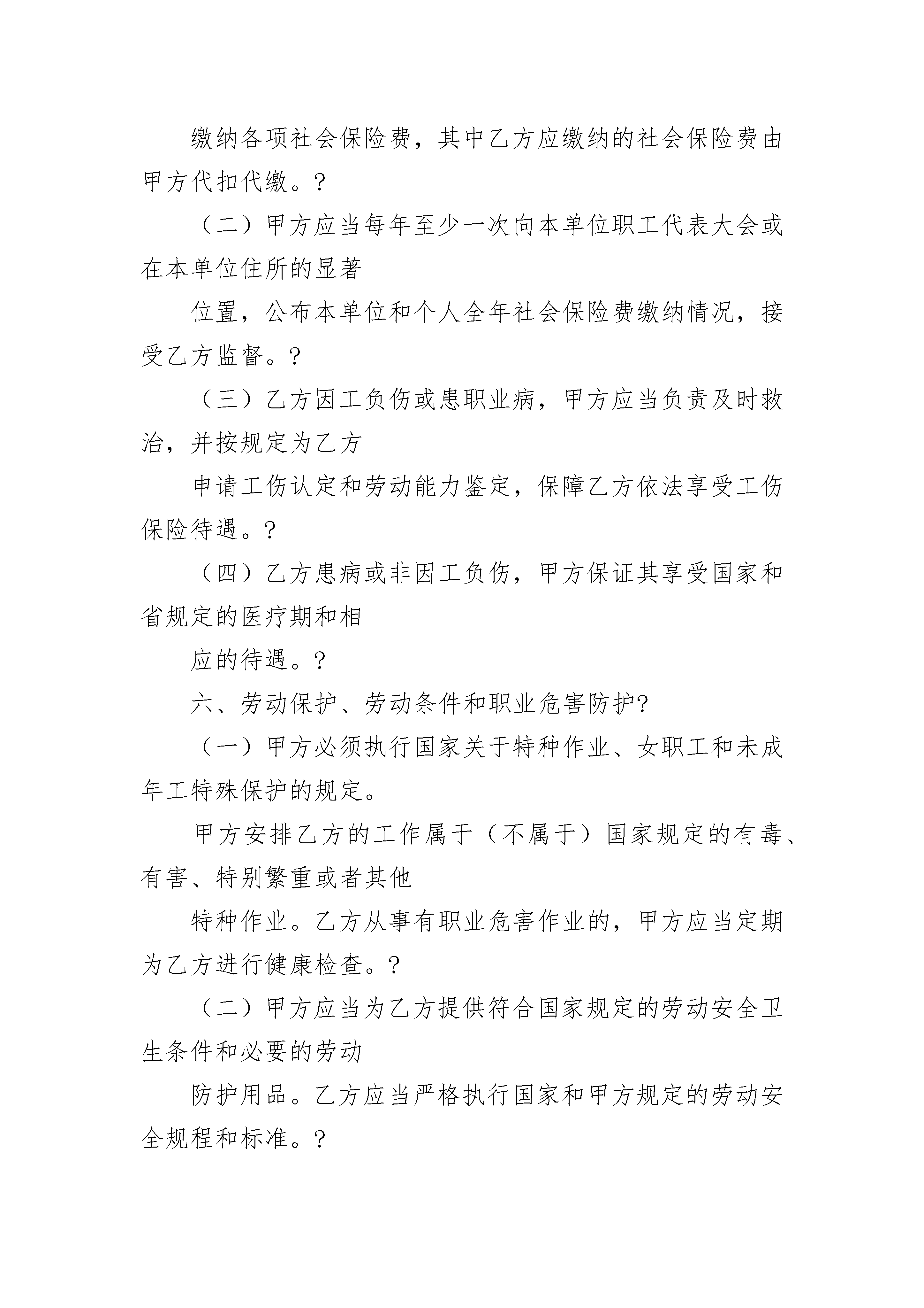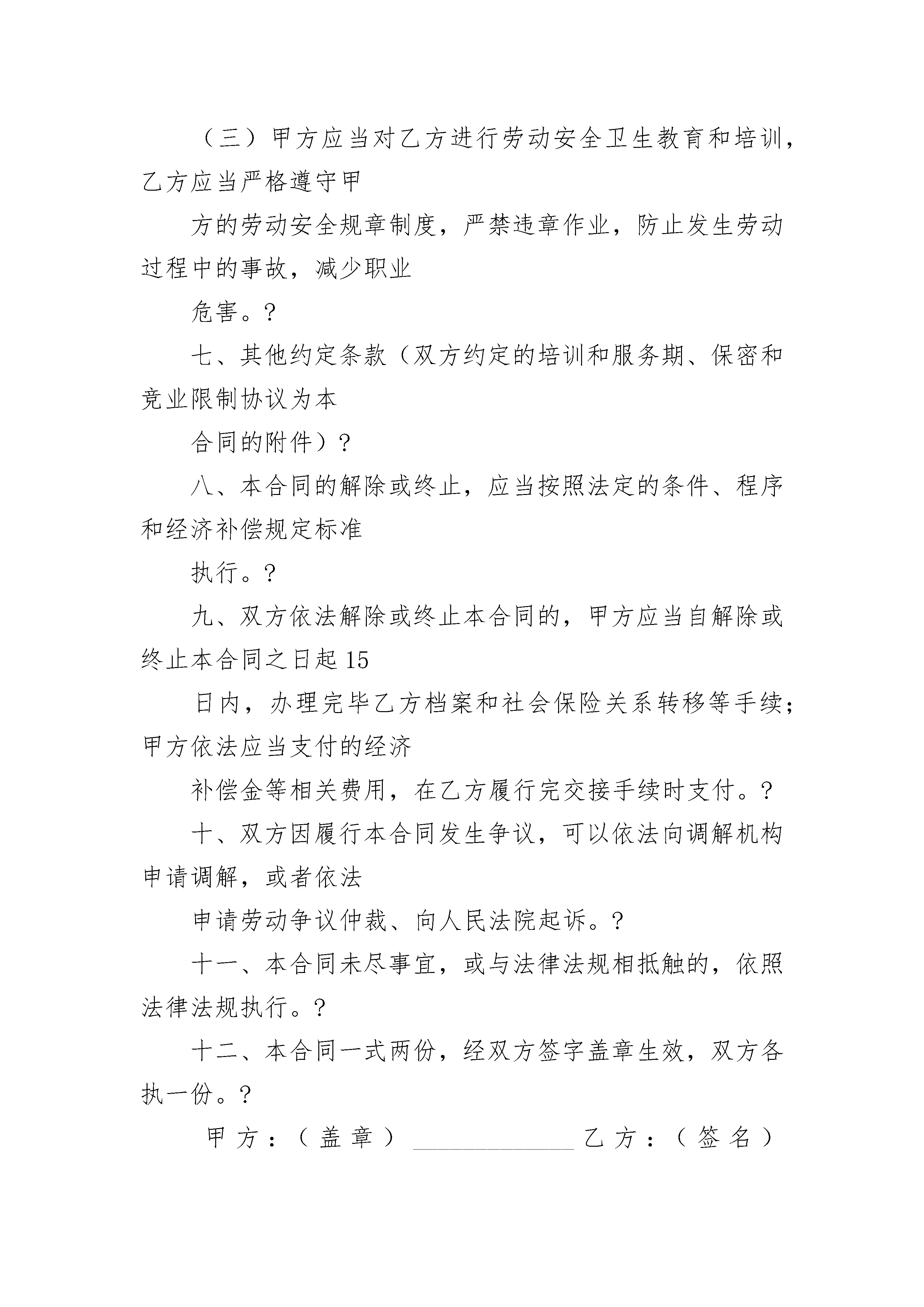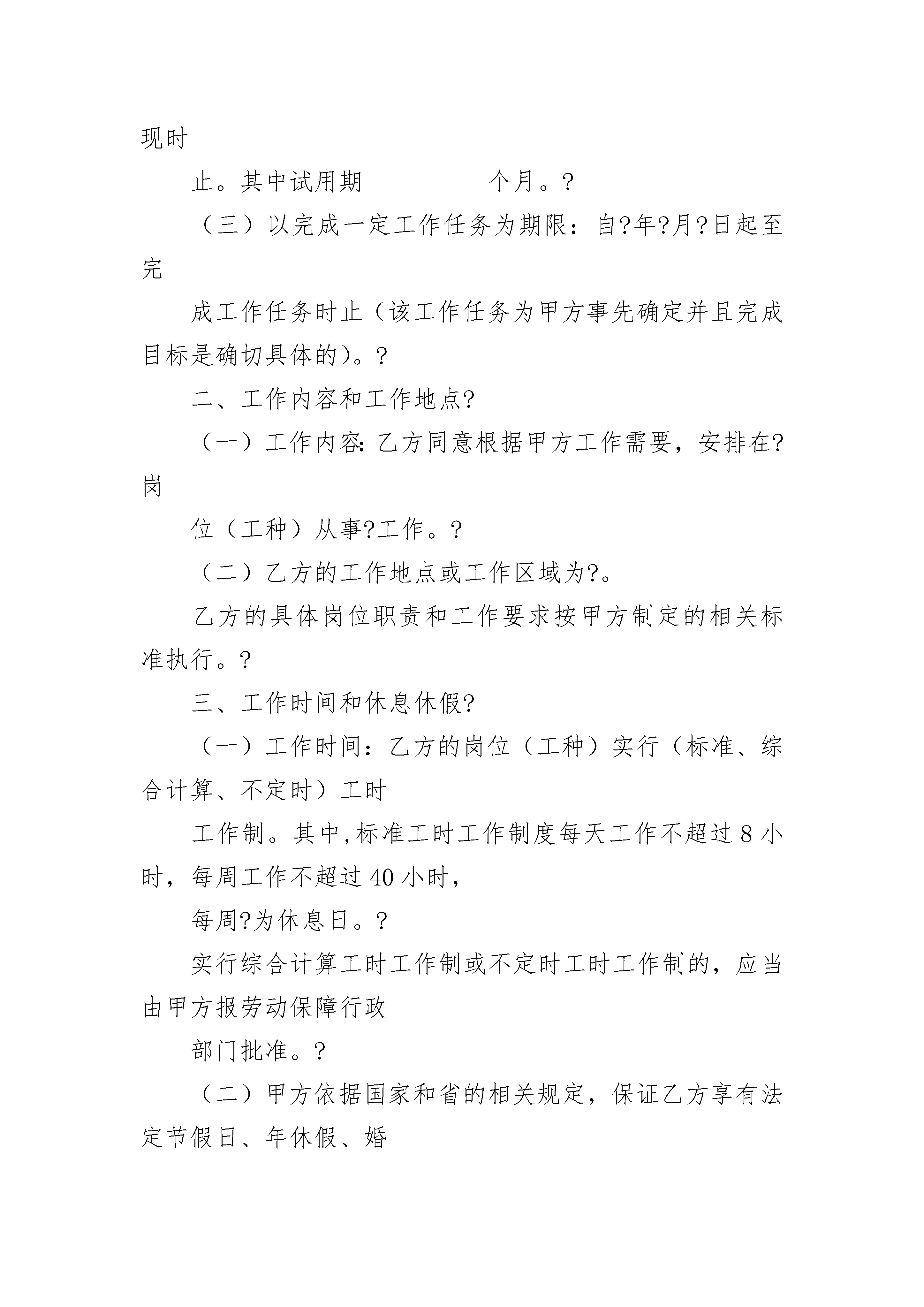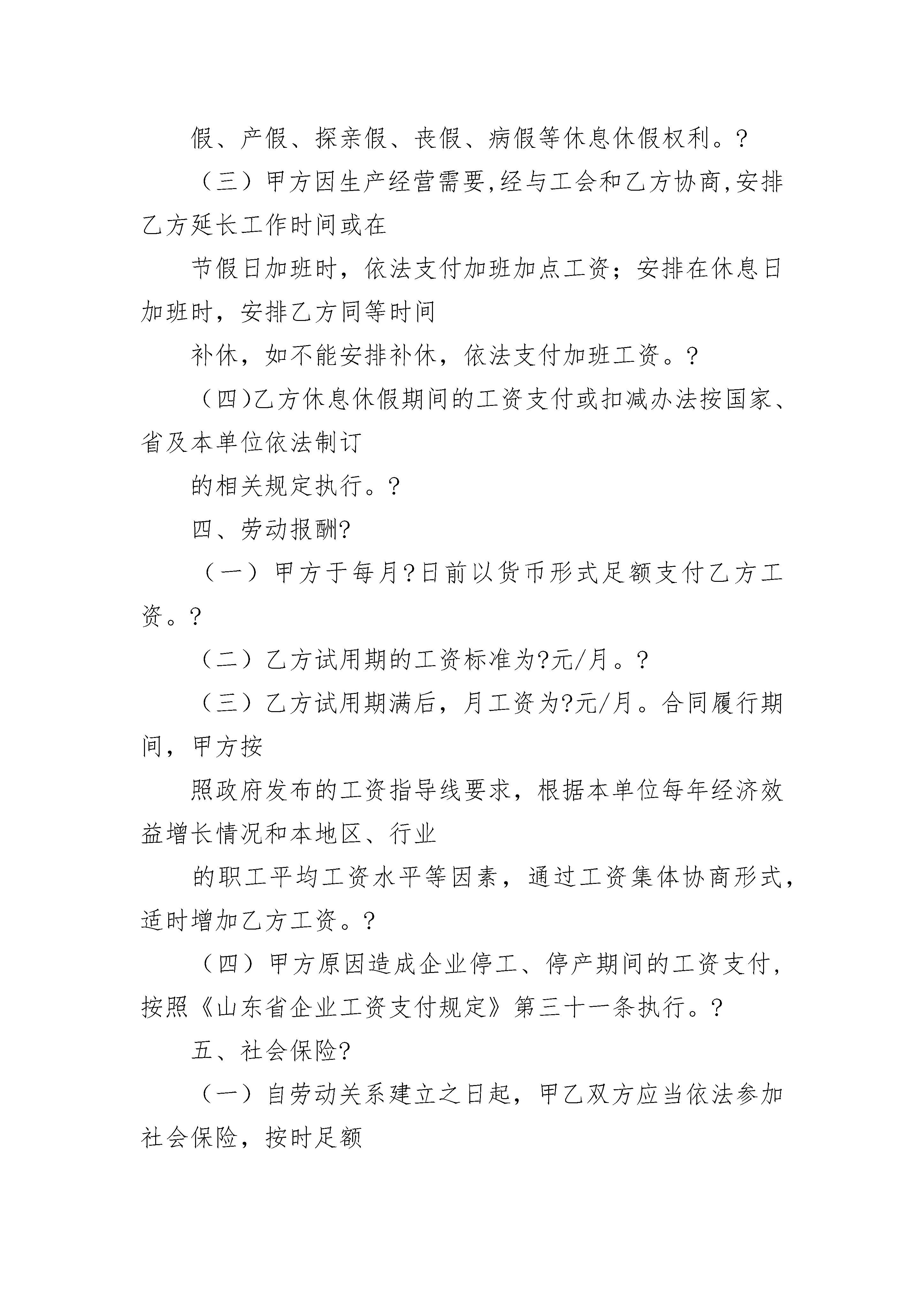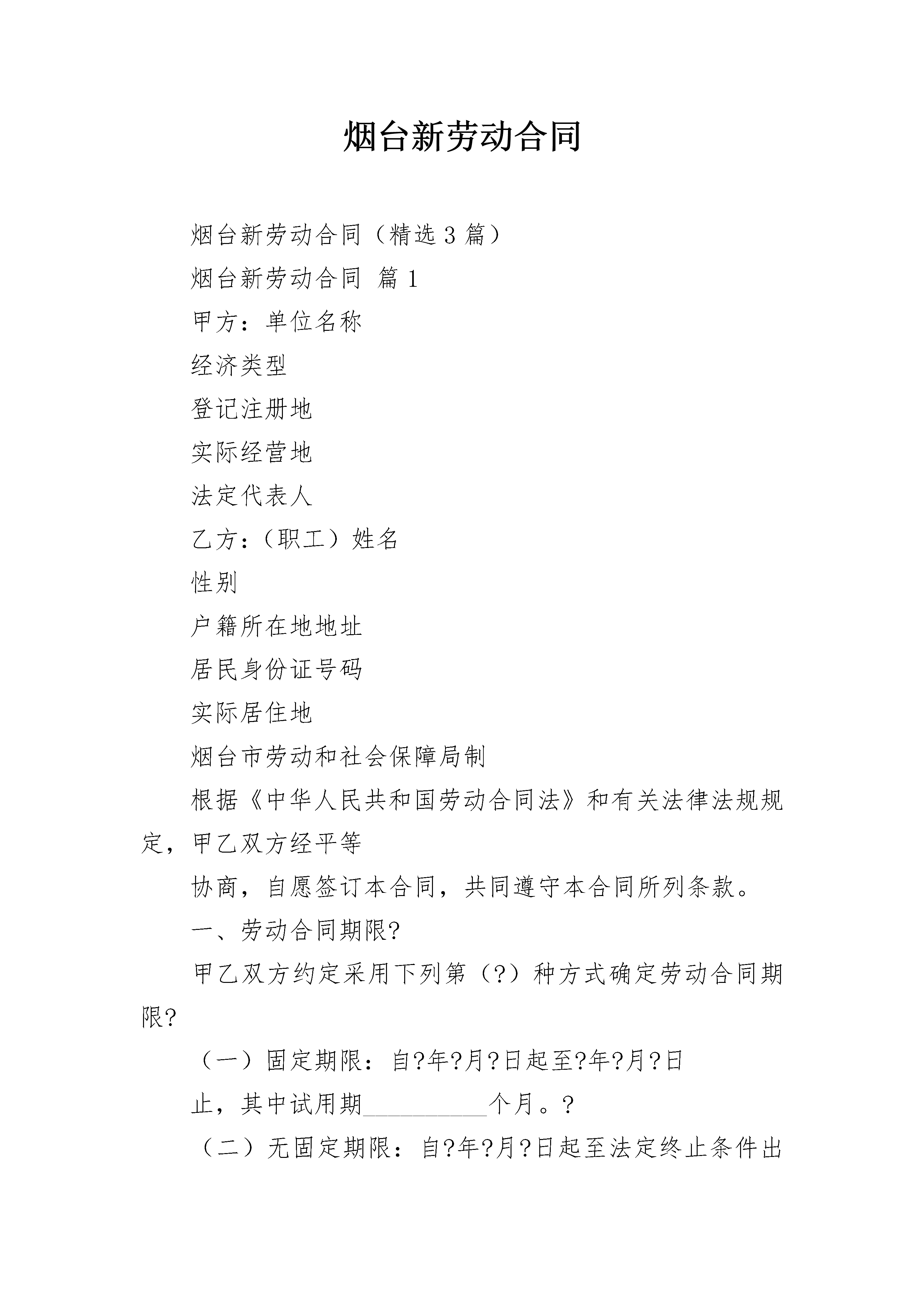 烟台新劳动合同烟台新劳动合同(精选3篇)烟台新劳动合同篇1甲方:单位名称经济类型登记注册地实际经营地法定代表人乙方:(职工)姓名性别户籍所在地地址居民身份证号码实际居住地烟台市劳动和社会保障局制根据《中华人民共和国劳动合同法》和有关法律法规规定,甲乙双方经平等协商,自愿签订本合同,共同遵守本合同所列条款。一、劳动合同期限?甲乙双方约定采用下列第(?)种方式确定劳动合同期限?(一)固定期限:自?年?月?日起至?年?月?日止,其中试用期__________个月。?(二)无固定期限:自?年?月?日起至法定终止条件出现时止。其中试用期__________个月。?(三)以完成一定工作任务为期限:自?年?月?日起至完成工作任务时止(该工作任务为甲方事先确定并且完成目标是确切具体的)。?二、工作内容和工作地点?(一)工作内容:乙方同意根据甲方工作需要,安排在?岗位(工种)从事?工作。?(二)乙方的工作地点或工作区域为?。乙方的具体岗位职责和工作要求按甲方制定的相关标准执行。?三、工作时间和休息休假?(一)工作时间:乙方的岗位(工种)实行(标准、综合计算、不定时)工时工作制。其中,标准工时工作制度每天工作不超过8小时,每周工作不超过40小时,每周?为休息日。?实行综合计算工时工作制或不定时工时工作制的,应当由甲方报劳动保障行政部门批准。?(二)甲方依据国家和省的相关规定,保证乙方享有法定节假日、年休假、婚假、产假、探亲假、丧假、病假等休息休假权利。?(三)甲方因生产经营需要,经与工会和乙方协商,安排乙方延长工作时间或在节假日加班时,依法支付加班加点工资;安排在休息日加班时,安排乙方同等时间补休,如不能安排补休,依法支付加班工资。?(四)乙方休息休假期间的工资支付或扣减办法按国家、省及本单位依法制订的相关规定执行。?四、劳动报酬?(一)甲方于每月?日前以货币形式足额支付乙方工资。?(二)乙方试用期的工资标准为?元/月。?(三)乙方试用期满后,月工资为?元/月。合同履行期间,甲方按照政府发布的工资指导线要求,根据本单位每年经济效益增长情况和本地区、行业的职工平均工资水平等因素,通过工资集体协商形式,适时增加乙方工资。?(四)甲方原因造成企业停工、停产期间的工资支付,按照《山东省企业工资支付规定》第三十一条执行。?五、社会保险?(一)自劳动关系建立之日起,甲乙双方应当依法参加社会保险,按时足额缴纳各项社会保险费,其中乙方应缴纳的社会保险费由甲方代扣代缴。?(二)甲方应当每年至少一次向本单位职工代表大会或在本单位住所的显著位置,公布本单位和个人全年社会保险费缴纳情况,接受乙方监督。?(三)乙方因工负伤或患职业病,甲方应当负责及时救治,并按规定为乙方申请工伤认定和劳动能力鉴定,保障乙方依法享受工伤保险待遇。?(四)乙方患病或非因工负伤,甲方保证其享受国家和省规定的医疗期和相应的待遇。?六、劳动保护、劳动条件和职业危害防护?(一)甲方必须执行国家关于特种作业、女职工和未成年工特殊保护的规定。甲方安排乙方的工作属于(不属于)国家规定的有毒、有害、特别繁重或者其他特种作业。乙方从事有职业危害作业的,甲方应当定期为乙方进行健康检查。?(二)甲方应当为乙方提供符合国家规定的劳动安全卫生条件和必要的劳动防护用品。乙方应当严格执行国家和甲方规定的劳动安全规程和标准。?(三)甲方应当对乙方进行劳动安全卫生教育和培训,乙方应当严格遵守甲方的劳动安全规章制度,严禁违章作业,防止发生劳动过程中的事故,减少职业危害。?七、其他约定条款(双方约定的培训和服务期、保密和竞业限制协议为本合同的附件)?八、本合同的解除或终止,应当按照法定的条件、程序和经济补偿规定标准执行。?九、双方依法解除或终止本合同的,甲方应当自解除或终止本合同之日起15日内,办理完毕乙方档案和社会保险关系转移等手续;甲方依法应当支付的经济补偿金等相关费用,在乙方履行完交接手续时支付。?十、双方因履行本合同发生争议,可以依法向调解机构申请调解,或者依法申请劳动争议仲裁、向人民法院起诉。?十一、本合同未尽事宜,或与法律法规相抵触的,依照法律法规执行。?十二、本合同一式两份,经双方签字盖章生效,双方各执一份。?甲方:(盖章)_____________乙方:(签名)_____________法定代表人、负责人_____________或委托代理人:(签名)_________________年____?月____日____年____?月____?日劳动合同续订书本次续订劳动合同期限类型为____?期限合同,自____?年____月____?日起至____?终止。甲方:(盖章)_____________________?乙方:(签名)?_____________________法定代表人、负责人____________