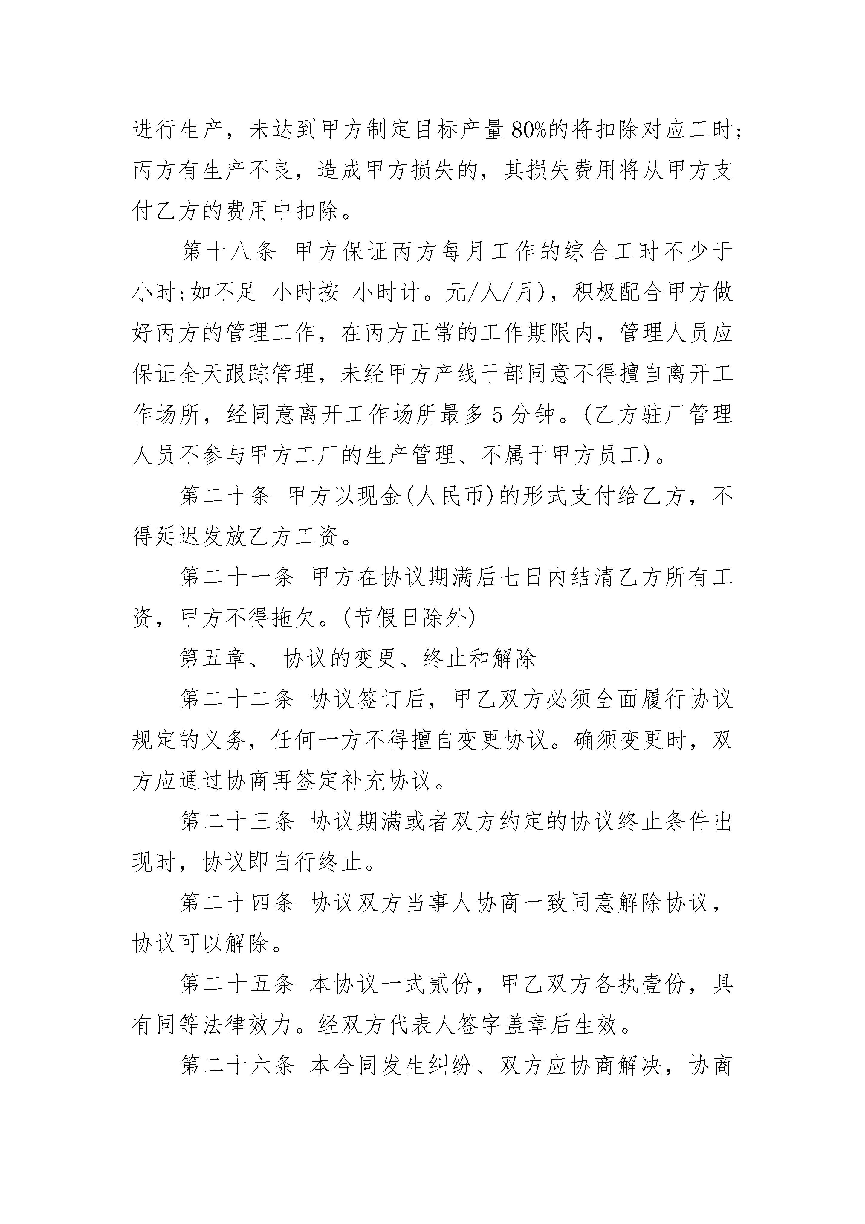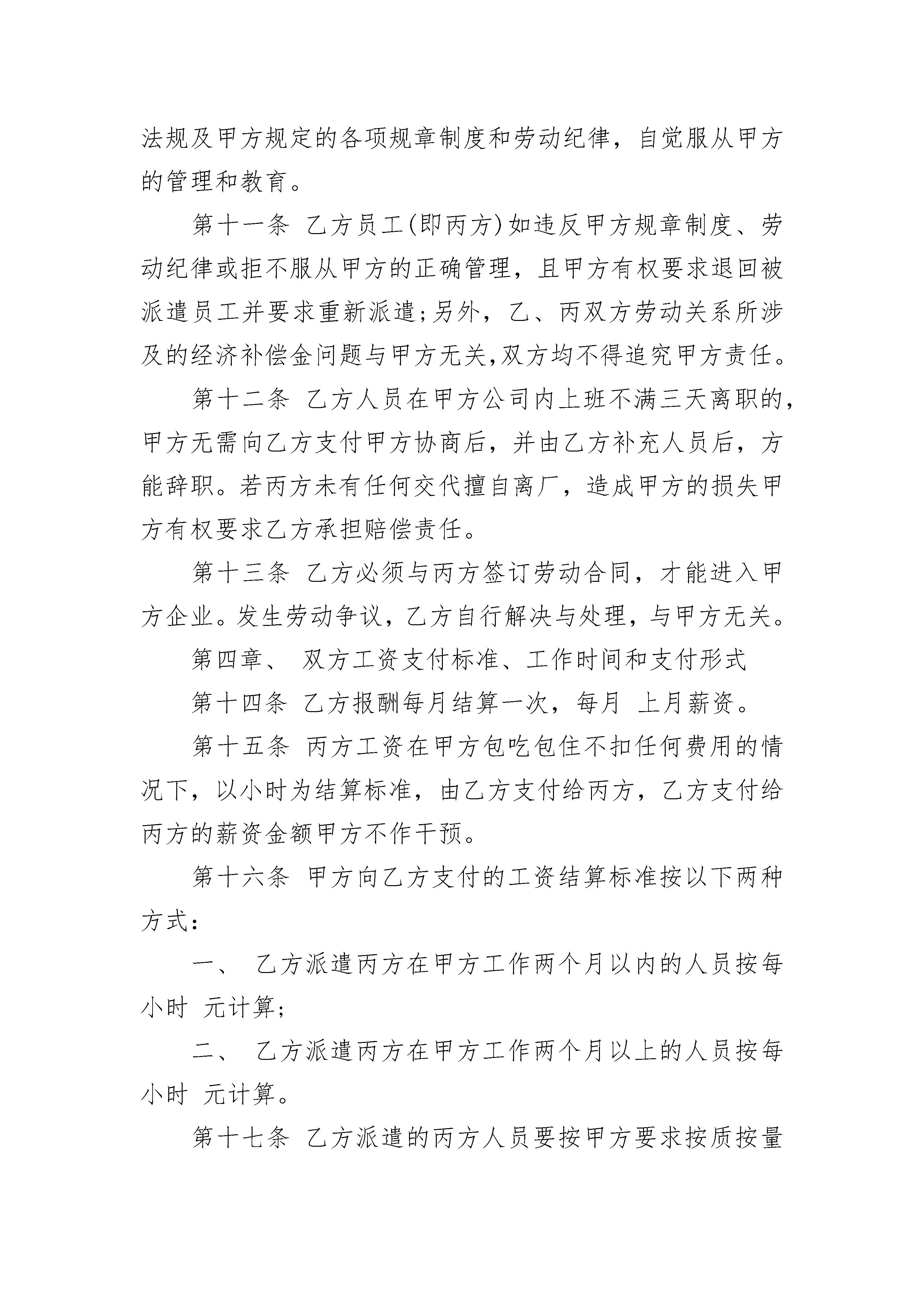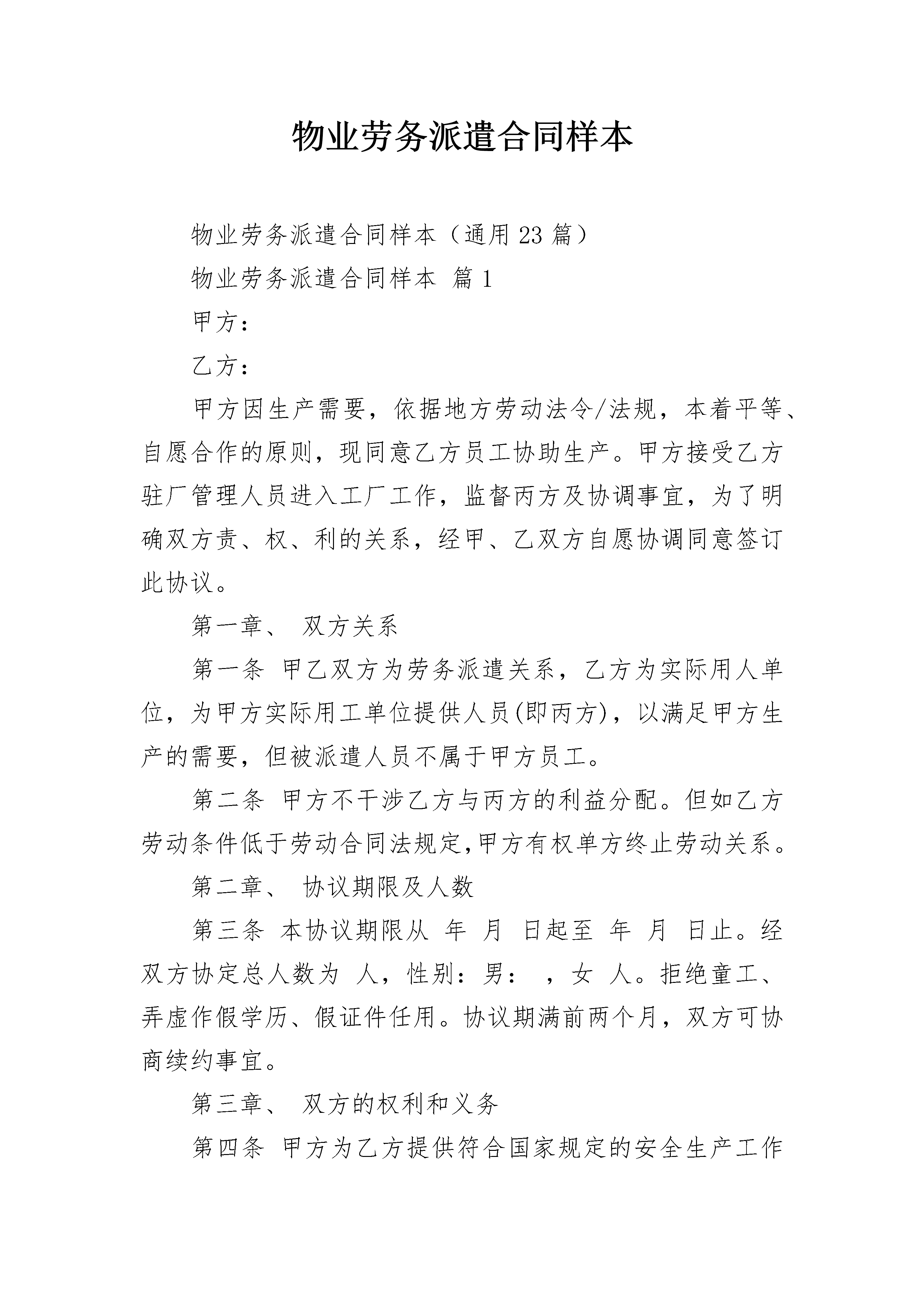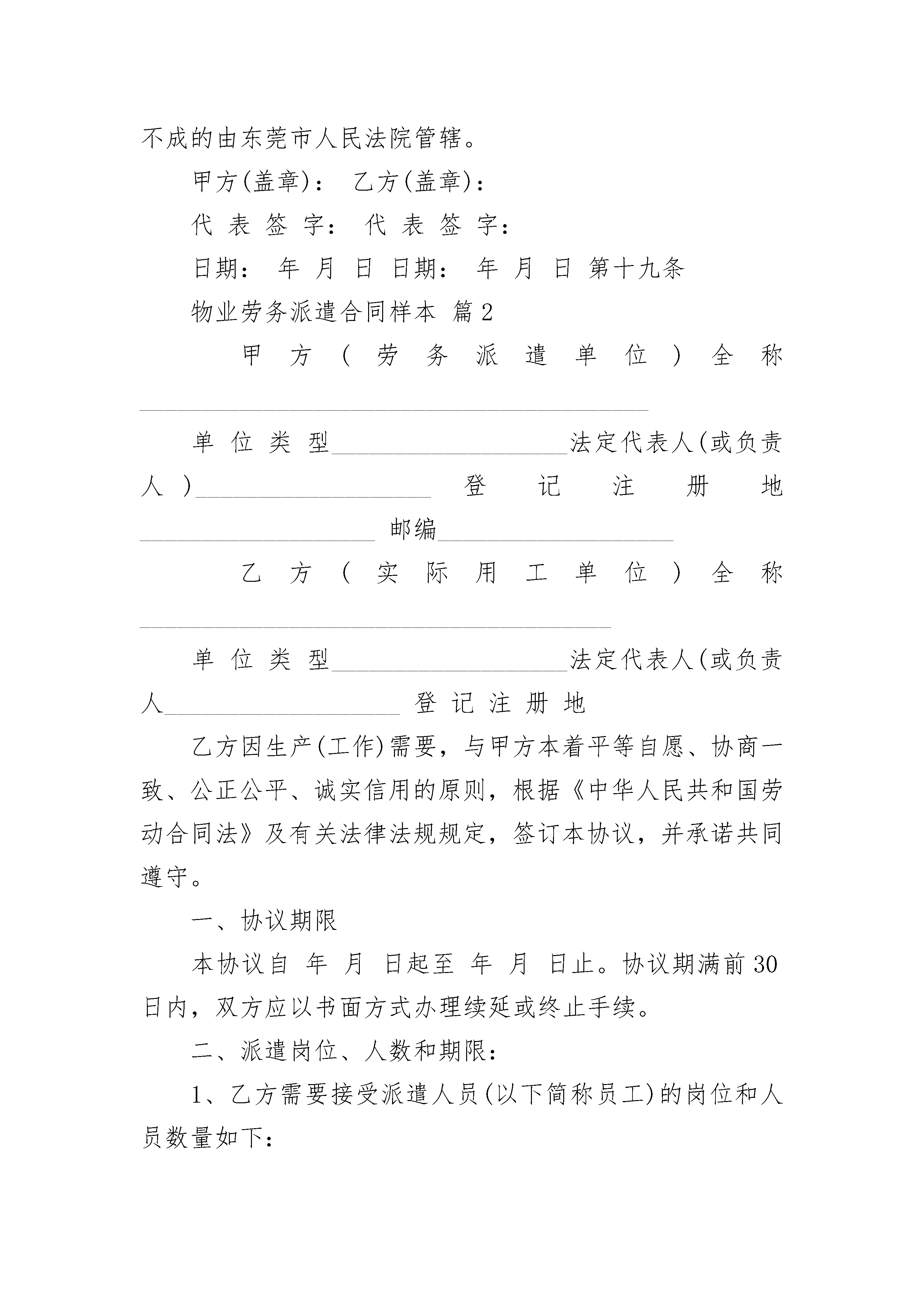 物业劳务派遣合同样本物业劳务派遣合同样本(通用23篇)物业劳务派遣合同样本篇1甲方:乙方:甲方因生产需要,依据地方劳动法令/法规,本着平等、自愿合作的原则,现同意乙方员工协助生产。甲方接受乙方驻厂管理人员进入工厂工作,监督丙方及协调事宜,为了明确双方责、权、利的关系,经甲、乙双方自愿协调同意签订此协议。第一章、双方关系第一条甲乙双方为劳务派遣关系,乙方为实际用人单位,为甲方实际用工单位提供人员(即丙方),以满足甲方生产的需要,但被派遣人员不属于甲方员工。第二条甲方不干涉乙方与丙方的利益分配。但如乙方劳动条件低于劳动合同法规定,甲方有权单方终止劳动关系。第二章、协议期限及人数第三条本协议期限从年月日起至年月日止。经双方协定总人数为人,性别:男:,女人。拒绝童工、弄虚作假学历、假证件任用。协议期满前两个月,双方可协商续约事宜。第三章、双方的权利和义务第四条甲方为乙方提供符合国家规定的安全生产工作环境;乙方应至少为员工(即丙方)购买工伤保险。丙方如出现工伤及在生产工作以外或厂外发生的一切事故由乙方,与甲方无关,其一切经济、法律责任均由乙方承担。第五条甲方为丙方免费提供食宿,不扣除丙方任何费用。(因甲方生活标准为9元/天/人,即为270元/月/人,离职人员必须将饭卡交回人事课,否则费用从乙方薪资中扣出)。第六条甲方应按照本协议规定按时足额向乙方支付全额的相关劳务费用,双方需对丙方绝对保密。甲方有权预先告之员工(即丙方)何时支付乙方工资,避免不将工资支付员工。第七条甲方不得将合同的内容向甲乙双方以外的任何一方透露,也不得泄露任何一方的商业秘密。第八条每月支付工资时,甲方须付清丙方应得工资并交给乙方签约人,乙方签约人必须在甲方监督下,在甲方工厂内将丙方应得工资发放给丙方并清点完毕后,乙方签约人方可离厂;乙方人员因工资问题引起的劳动纠纷由乙方公司负责解决,与甲方公司无关。第九条乙方员工(即丙方)享有探亲假、病假等权利;为保证甲方生产顺利,乙方应控制探亲假和病假人数,丙方在请假期间,甲方不需按保底工时支付乙方工资。遇到丙方请假人数超过1%且每人请假5天以上,如甲方生产需要,乙方需无条件补足合约第三条规定的人数。第十条乙方员工(即丙方)应遵守国家及地方性的法律、法规及甲方规定的各项规章制度和劳动纪律,自觉服从甲方的管理和教育。第十一条乙方员工(即丙方)如违反甲方规章制度、劳动纪律或拒不服从甲方的正确管理,且甲方有权要求退回被派遣员工并要求重新派遣;另外,乙、丙双方劳动关系所涉及的经济补偿金问题与甲方无关,双方均不得追究甲方责任。第十二条乙方人员在甲方公司内上班不满三天离职的,甲方无需向乙方支付甲方协商后,并由乙方补充人员后,方能辞职。若丙方未有任何交代擅自离厂,造成甲方的损失甲方有权要求乙方承担赔偿责任。第十三条乙方必须与丙方签订劳动合同,才能进入甲方企业。发生劳动争议,乙方自行解决与处理,与甲方无关。第四章、双方工资支付标准、工作时间和支付形式第十四条乙方报酬每月结算一次,每月上月薪资。第十五条丙方工资在甲方包吃包住不扣任何费用的情况下,以小时为结算标准,由乙方支付给丙方,乙方支付给丙方的薪资金额甲方不作干预。第十六条甲方向乙方支付的工资结算标准按以下两种方式:一、乙方派遣丙方在甲方工作两个月以内的人员按每小时元计算;二、乙方派遣丙方在甲方工作两个月以上的人员按每小时元计算。第十七条乙方派遣的丙方人员要按甲方要求按质按量进行生产,未达到甲方制定目标产量80%的将扣除对应工时;丙方有生产不良,造成甲方损失的,其损失费用将从甲方支付乙方的费用中扣除。第十八条甲方保证丙方每月工作的综合工时不少于小时;如不足小时按小时计。元/人/月),积极配合甲方做好丙方的管理工作,在丙方正常的工作期限内,管理人员应保证全天跟踪管理,未经甲方产线干部同意不得擅自离开工作场所,经同意离开工作场所最多5分钟。(乙方驻厂管理人员不参与甲方工厂的生产管理、不属于甲方员工)。第二十条甲方以现金(人民币)的形式支付给乙方,不得延迟发放乙方工资。第二十一条甲方在协议期满后七日内结清乙方所有工资,甲方不得拖欠。(节假日除外)第五章、协议的变更、终止和解除第二十二条协议签订后,甲乙双方必须全面履行协议规定的义务,任何一方不得擅自变更协议。确须变更时,双方应通过协商再签定补充协议。第二十三条协议期满或者双方约定的协议终止条件出现时,协议即自行终止。第二十四条协议双方当事人协商一致同意解除协议,协议可以解除。第二十五条本协议一式贰份,甲乙双方各执壹份,具有同等法律效力。经双方代表人签字盖章后生效。第二十六条本合同发生纠纷、双方应协商解决,协商不成的由东莞市人民法院管辖。甲方(盖章):乙方(盖章):代表签字:代表签字:日期:年月日日期:年月日第十九条物业劳务派遣合同样本篇2甲方(劳务派
