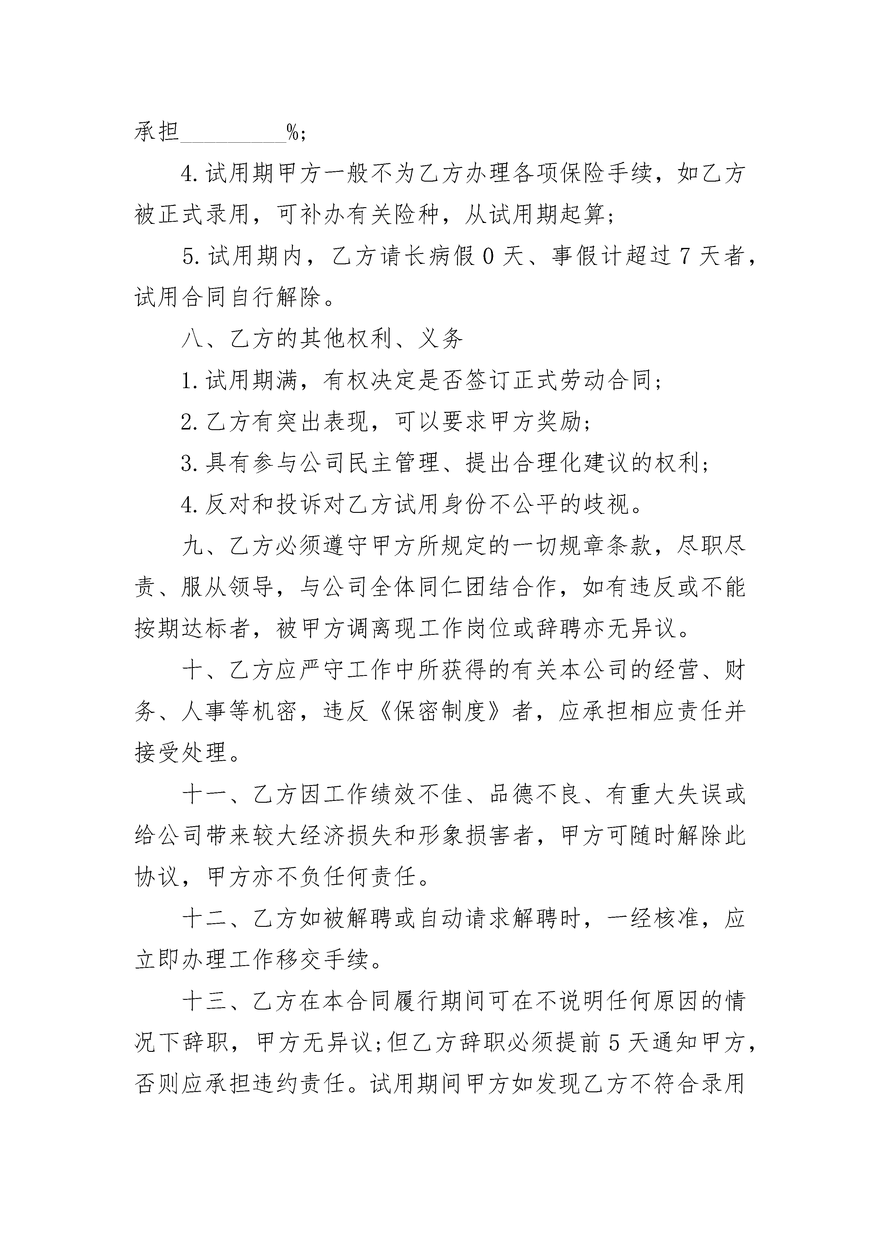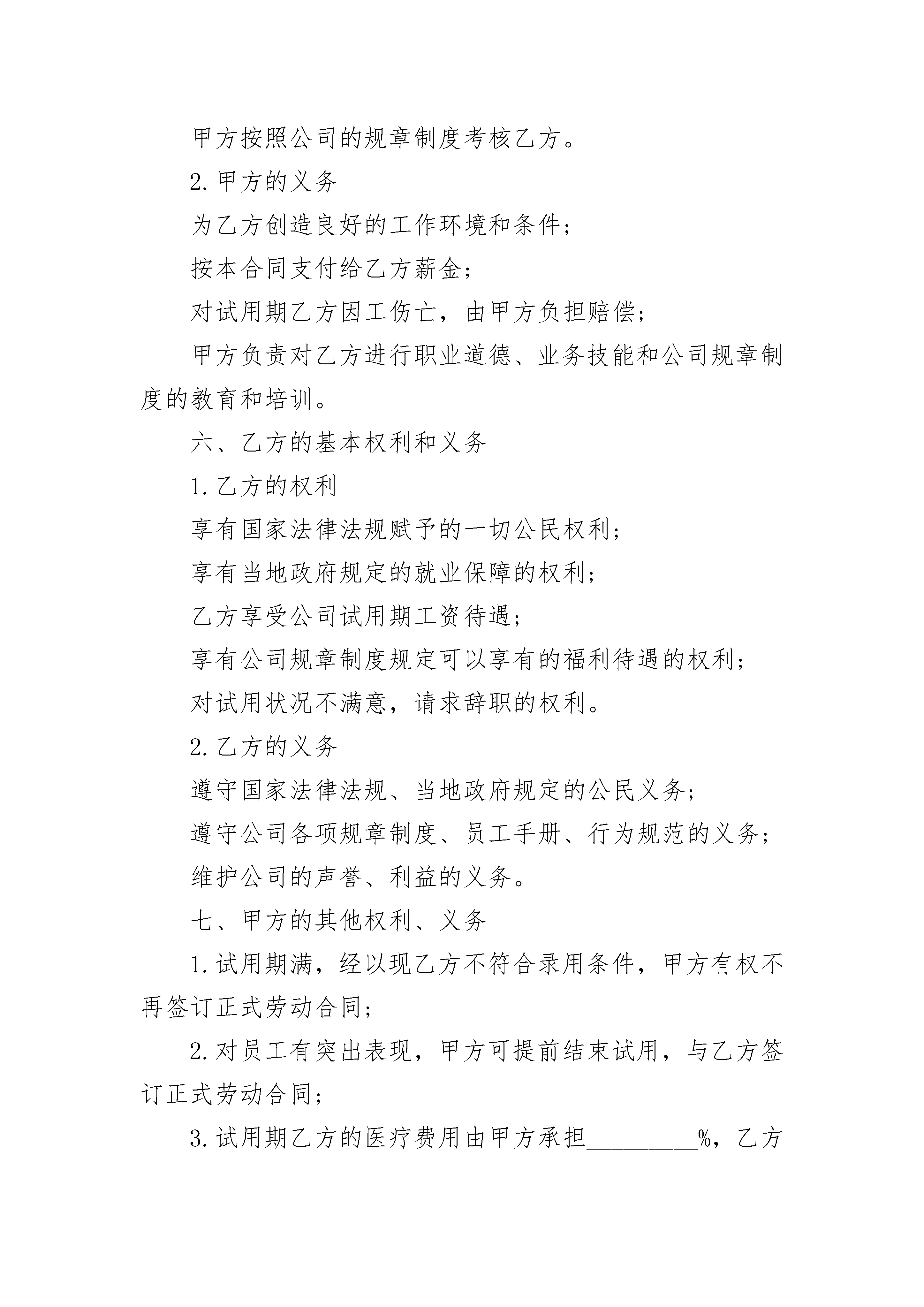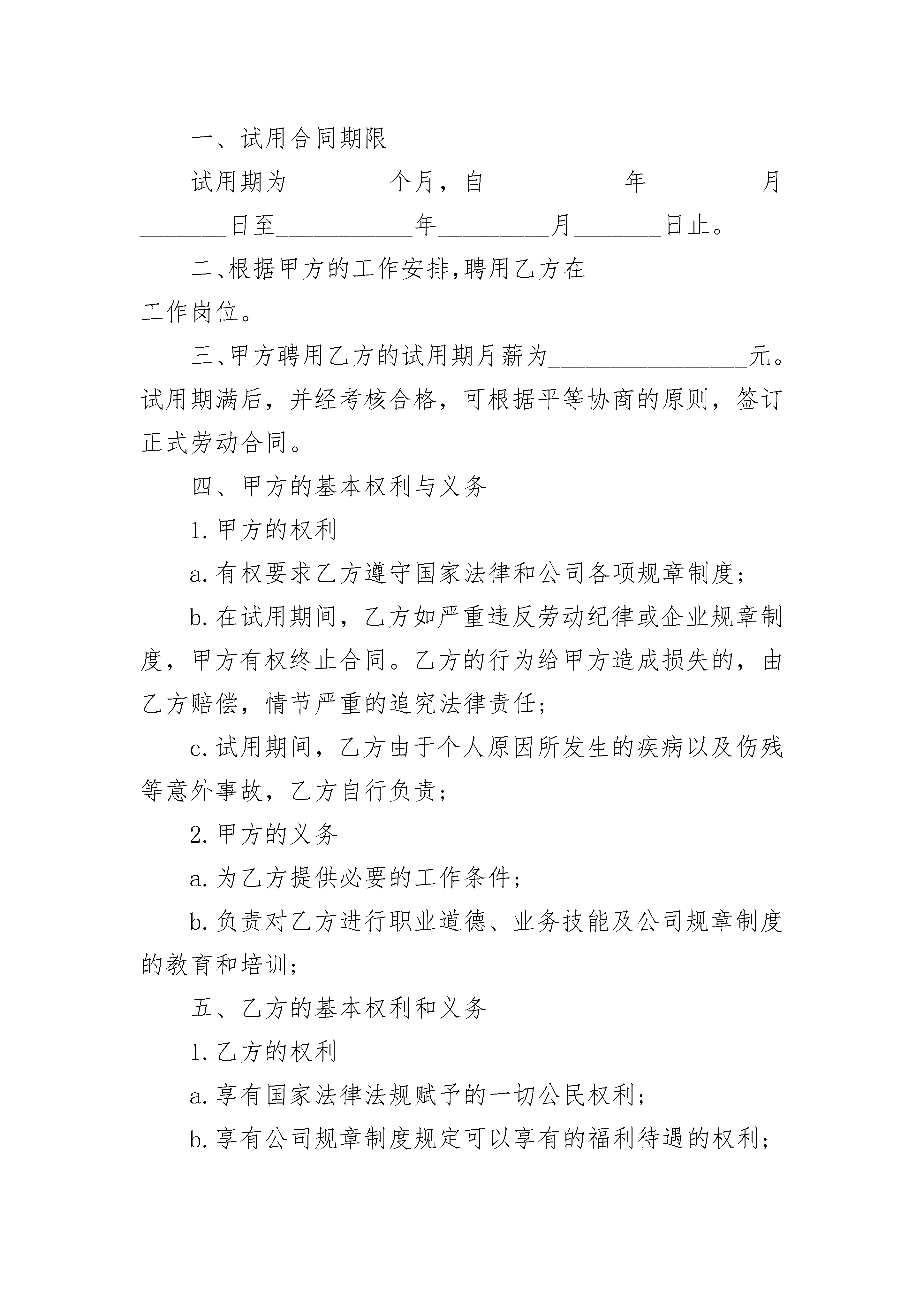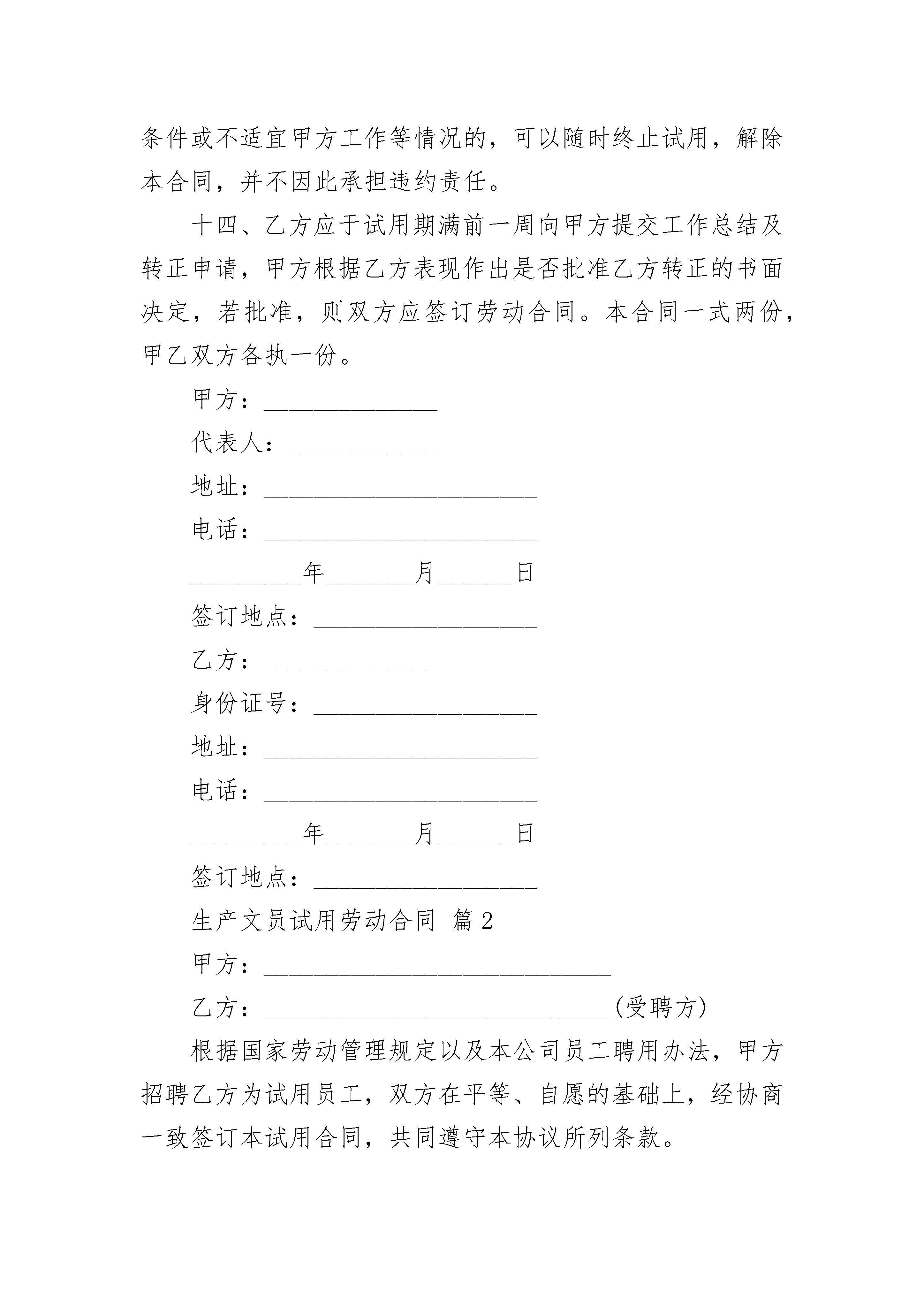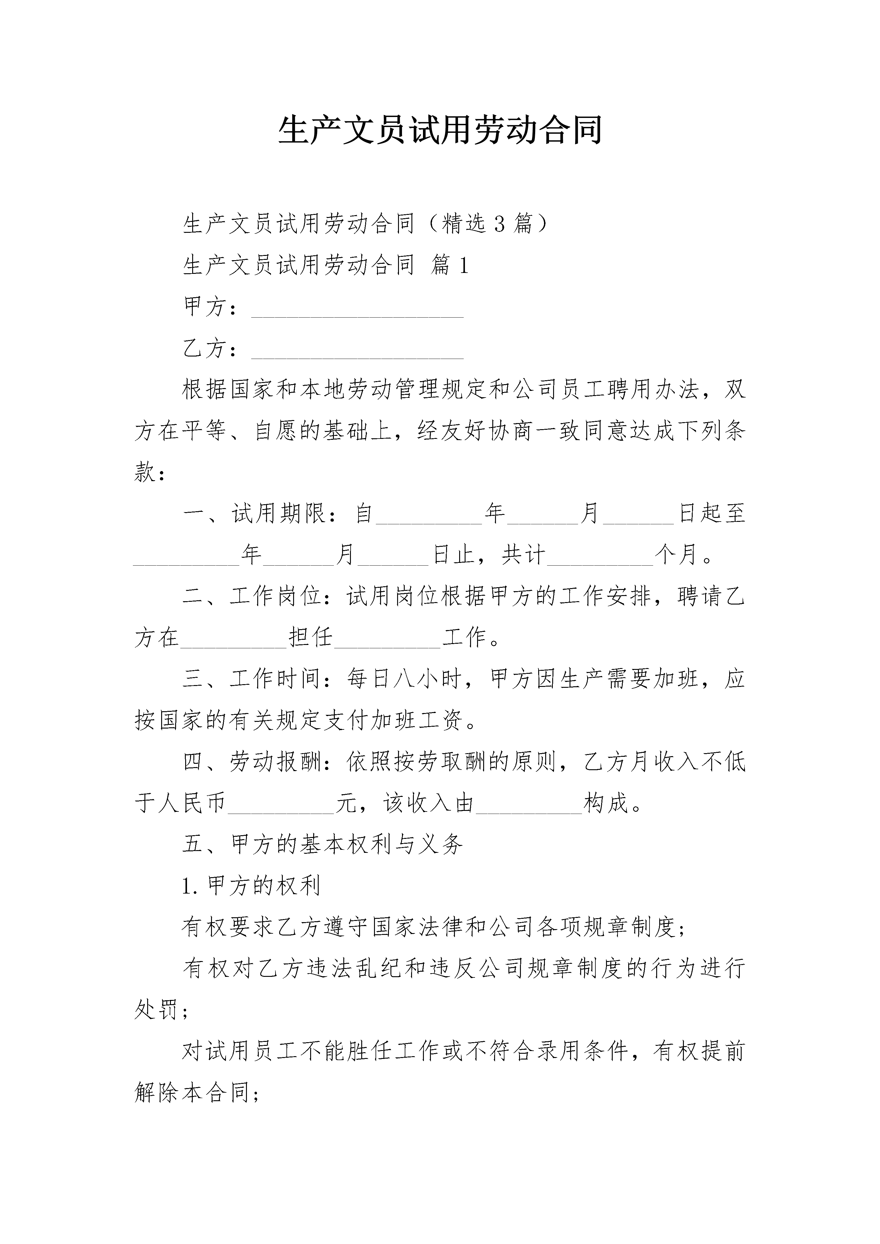 生产文员试用劳动合同生产文员试用劳动合同(精选3篇)生产文员试用劳动合同篇1甲方:__________________乙方:__________________根据国家和本地劳动管理规定和公司员工聘用办法,双方在平等、自愿的基础上,经友好协商一致同意达成下列条款:一、试用期限:自_________年______月______日起至_________年______月______日止,共计_________个月。二、工作岗位:试用岗位根据甲方的工作安排,聘请乙方在_________担任_________工作。三、工作时间:每日八小时,甲方因生产需要加班,应按国家的有关规定支付加班工资。四、劳动报酬:依照按劳取酬的原则,乙方月收入不低于人民币_________元,该收入由_________构成。五、甲方的基本权利与义务1.甲方的权利有权要求乙方遵守国家法律和公司各项规章制度;有权对乙方违法乱纪和违反公司规章制度的行为进行处罚;对试用员工不能胜任工作或不符合录用条件,有权提前解除本合同;甲方按照公司的规章制度考核乙方。2.甲方的义务为乙方创造良好的工作环境和条件;按本合同支付给乙方薪金;对试用期乙方因工伤亡,由甲方负担赔偿;甲方负责对乙方进行职业道德、业务技能和公司规章制度的教育和培训。六、乙方的基本权利和义务1.乙方的权利享有国家法律法规赋予的一切公民权利;享有当地政府规定的就业保障的权利;乙方享受公司试用期工资待遇;享有公司规章制度规定可以享有的福利待遇的权利;对试用状况不满意,请求辞职的权利。2.乙方的义务遵守国家法律法规、当地政府规定的公民义务;遵守公司各项规章制度、员工手册、行为规范的义务;维护公司的声誉、利益的义务。七、甲方的其他权利、义务1.试用期满,经以现乙方不符合录用条件,甲方有权不再签订正式劳动合同;2.对员工有突出表现,甲方可提前结束试用,与乙方签订正式劳动合同;3.试用期乙方的医疗费用由甲方承担_________%,乙方承担_________%;4.试用期甲方一般不为乙方办理各项保险手续,如乙方被正式录用,可补办有关险种,从试用期起算;5.试用期内,乙方请长病假0天、事假计超过7天者,试用合同自行解除。八、乙方的其他权利、义务1.试用期满,有权决定是否签订正式劳动合同;2.乙方有突出表现,可以要求甲方奖励;3.具有参与公司民主管理、提出合理化建议的权利;4.反对和投诉对乙方试用身份不公平的歧视。九、乙方必须遵守甲方所规定的一切规章条款,尽职尽责、服从领导,与公司全体同仁团结合作,如有违反或不能按期达标者,被甲方调离现工作岗位或辞聘亦无异议。十、乙方应严守工作中所获得的有关本公司的经营、财务、人事等机密,违反《保密制度》者,应承担相应责任并接受处理。十一、乙方因工作绩效不佳、品德不良、有重大失误或给公司带来较大经济损失和形象损害者,甲方可随时解除此协议,甲方亦不负任何责任。十二、乙方如被解聘或自动请求解聘时,一经核准,应立即办理工作移交手续。十三、乙方在本合同履行期间可在不说明任何原因的情况下辞职,甲方无异议;但乙方辞职必须提前5天通知甲方,否则应承担违约责任。试用期间甲方如发现乙方不符合录用条件或不适宜甲方工作等情况的,可以随时终止试用,解除本合同,并不因此承担违约责任。十四、乙方应于试用期满前一周向甲方提交工作总结及转正申请,甲方根据乙方表现作出是否批准乙方转正的书面决定,若批准,则双方应签订劳动合同。本合同一式两份,甲乙双方各执一份。甲方:______________代表人:____________地址:______________________电话:_______________________________年_______月______日签订地点:__________________乙方:______________身份证号:__________________地址:______________________电话:_______________________________年_______月______日签订地点:__________________生产文员试用劳动合同篇2甲方:____________________________乙方:____________________________(受聘方)根据国家劳动管理规定以及本公司员工聘用办法,甲方招聘乙方为试用员工,双方在平等、自愿的基础上,经协商一致签订本试用合同,共同遵守本协议所列条款。一、试用合同期限试用期为________个月,自___________年_________月_______日至___________年_________月_______日止。二、根据甲方的工作安排,聘用乙方在________________工作岗位。