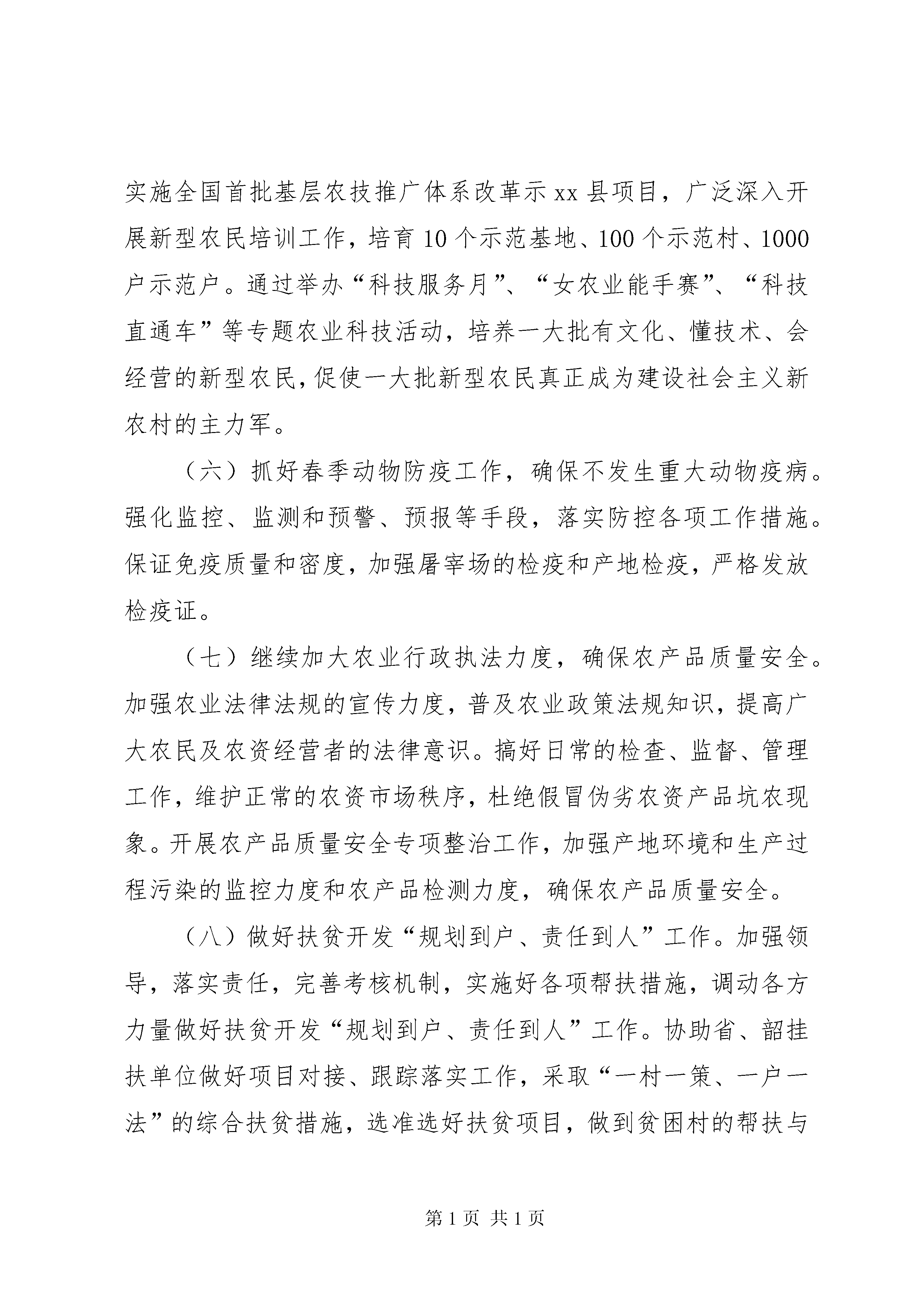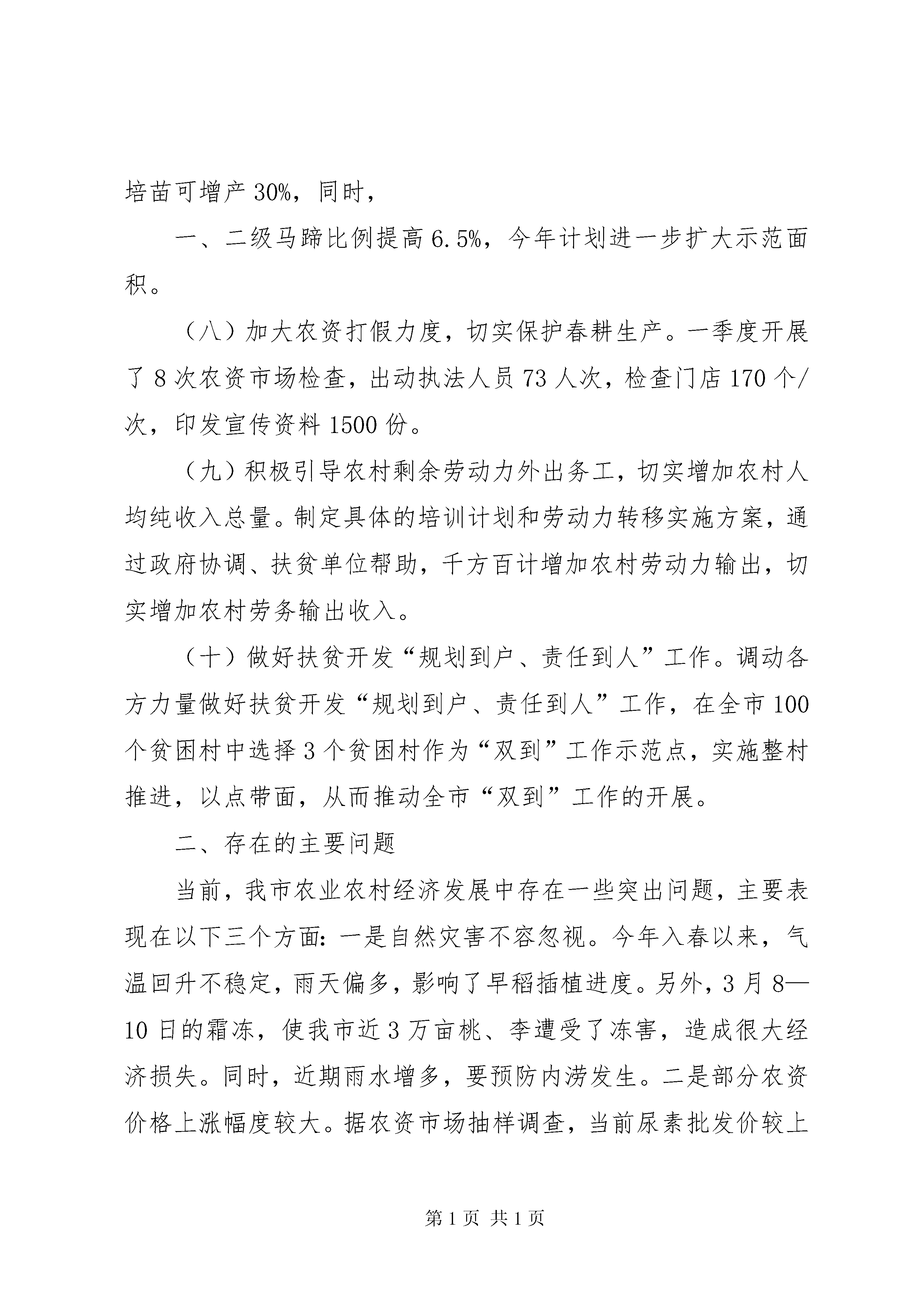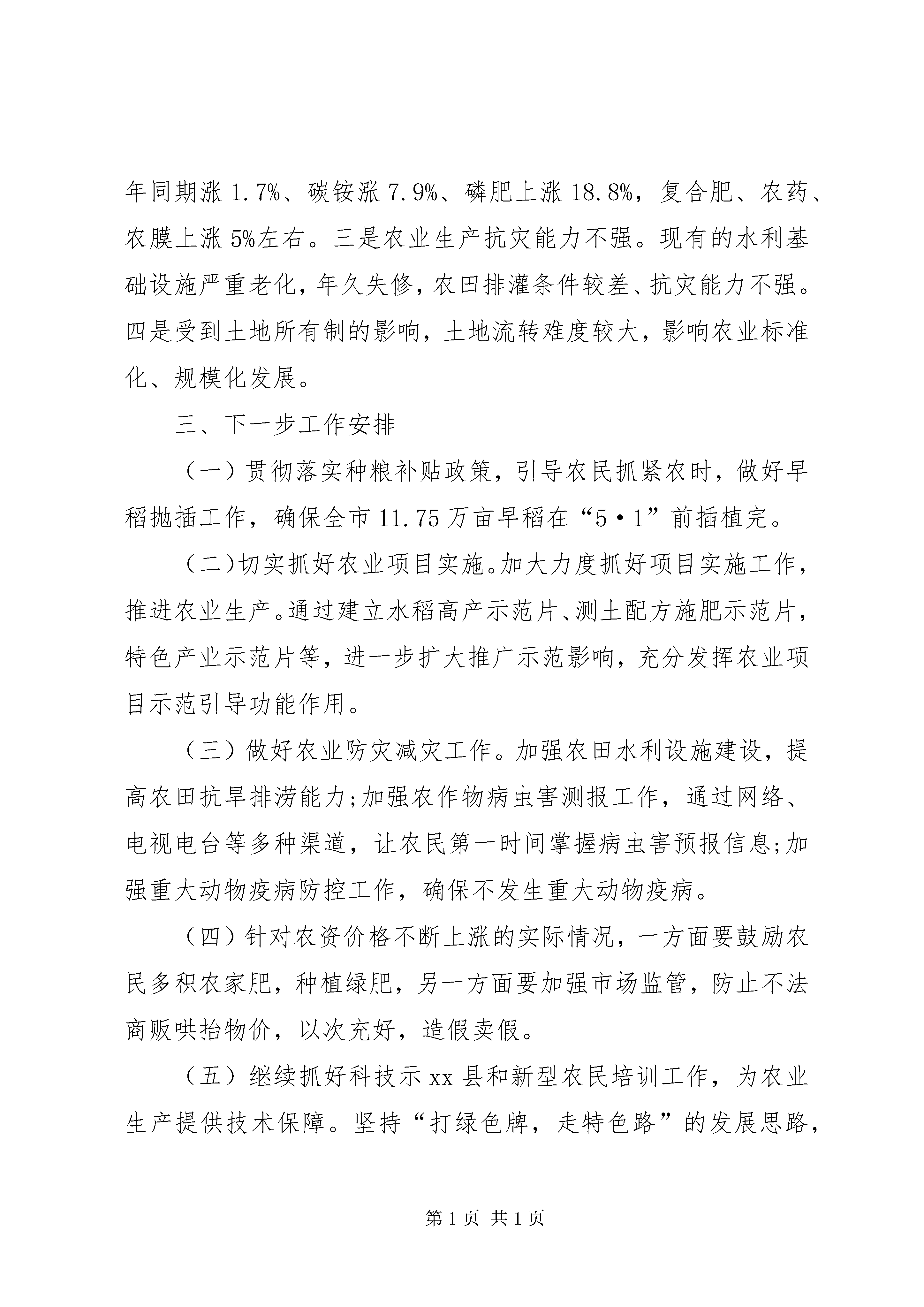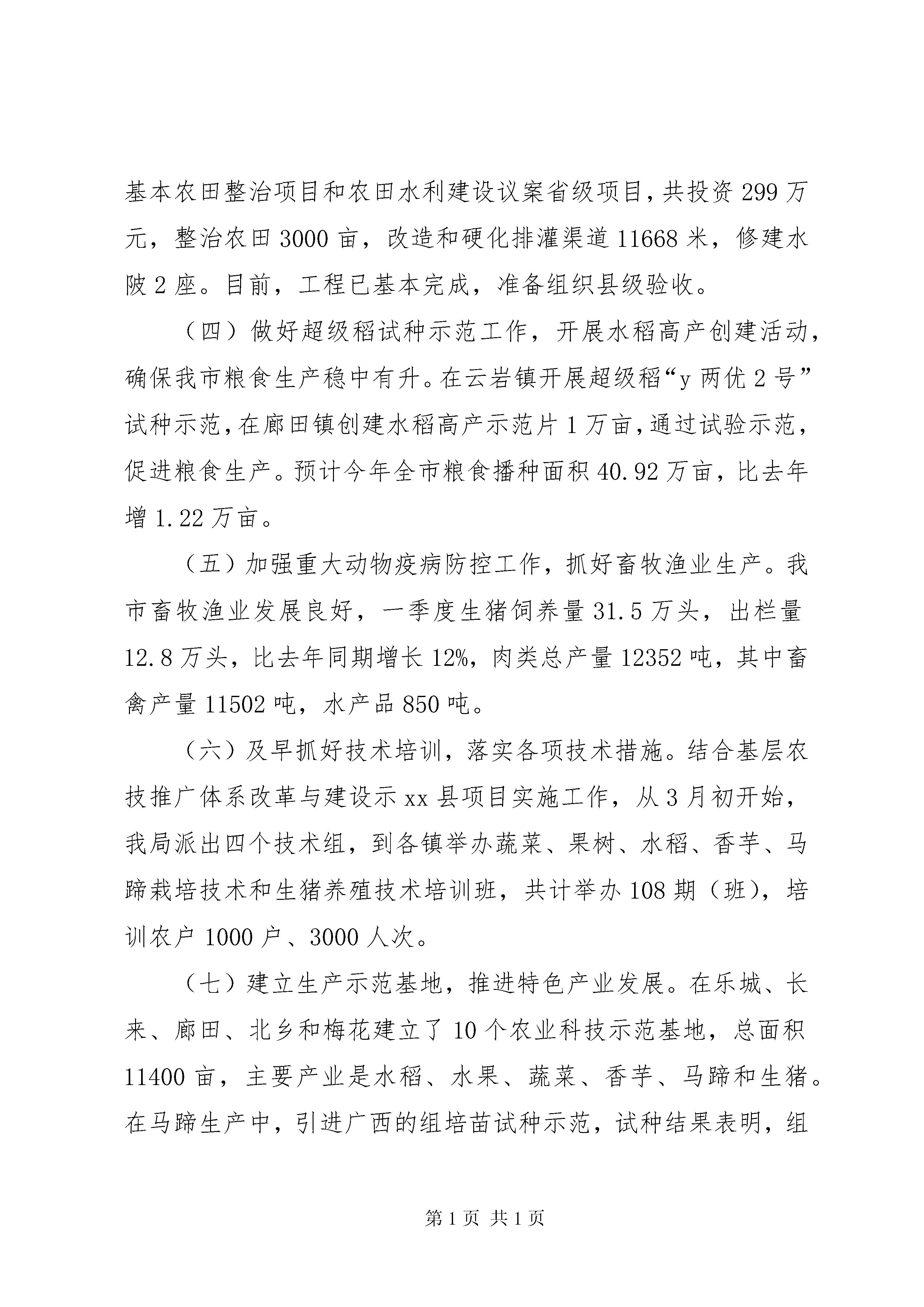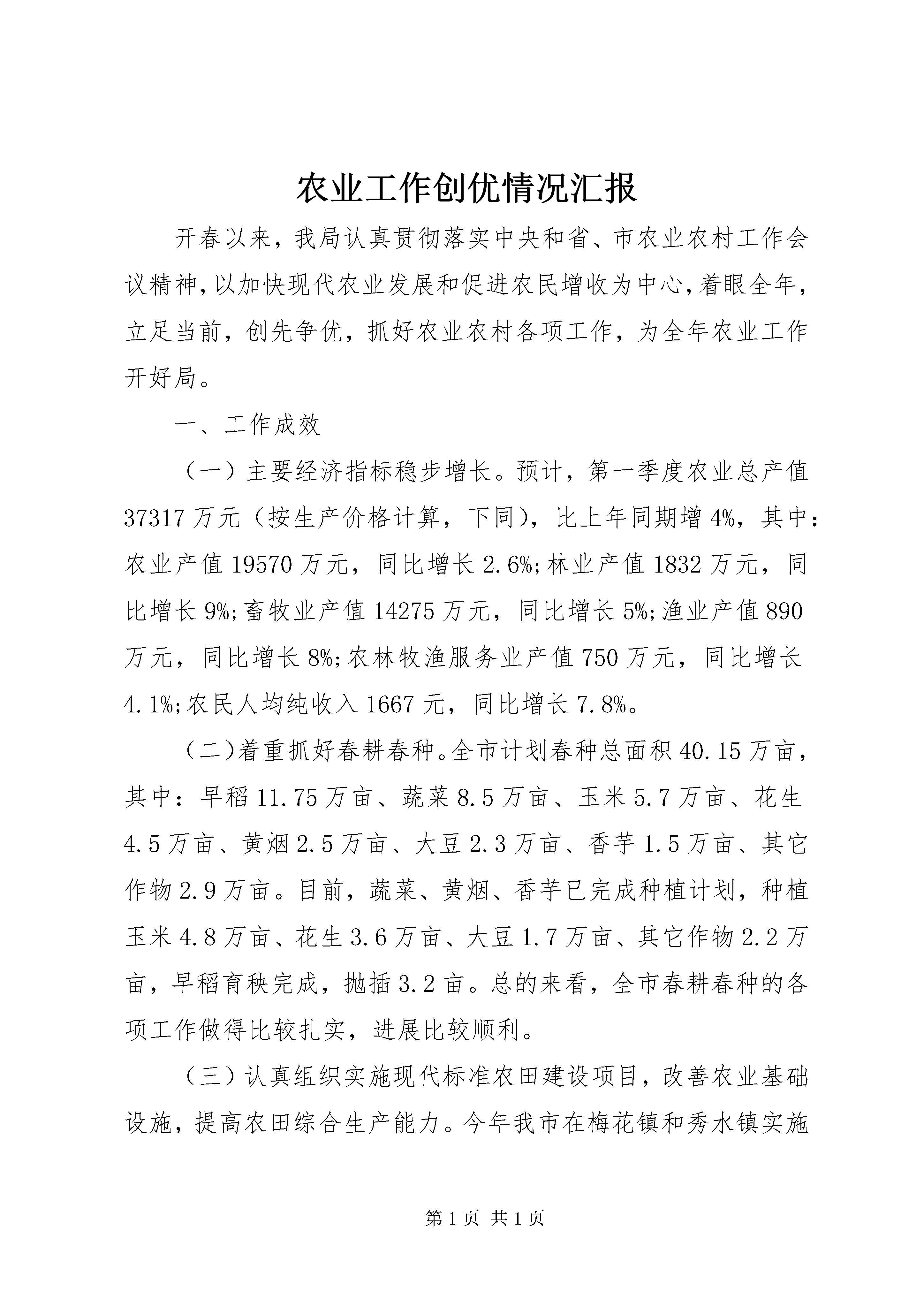 农业工作创优情况汇报开春以来,我局认真贯彻落实中央和省、市农业农村工作会议精神,以加快现代农业发展和促进农民增收为中心,着眼全年,立足当前,创先争优,抓好农业农村各项工作,为全年农业工作开好局。一、工作成效(一)主要经济指标稳步增长。预计,第一季度农业总产值37317万元(按生产价格计算,下同),比上年同期增4%,其中:农业产值19570万元,同比增长2.6%;林业产值1832万元,同比增长9%;畜牧业产值14275万元,同比增长5%;渔业产值890万元,同比增长8%;农林牧渔服务业产值750万元,同比增长4.1%;农民人均纯收入1667元,同比增长7.8%。(二)着重抓好春耕春种。全市计划春种总面积40.15万亩,其中:早稻11.75万亩、蔬菜8.5万亩、玉米5.7万亩、花生4.5万亩、黄烟2.5万亩、大豆2.3万亩、香芋1.5万亩、其它作物2.9万亩。目前,蔬菜、黄烟、香芋已完成种植计划,种植玉米4.8万亩、花生3.6万亩、大豆1.7万亩、其它作物2.2万亩,早稻育秧完成,抛插3.2亩。总的来看,全市春耕春种的各项工作做得比较扎实,进展比较顺利。(三)认真组织实施现代标准农田建设项目,改善农业基础设施,提高农田综合生产能力。今年我市在梅花镇和秀水镇实施基本农田整治项目和农田水利建设议案省级项目,共投资299万元,整治农田3000亩,改造和硬化排灌渠道11668米,修建水陂2座。目前,工程已基本完成,准备组织县级验收。(四)做好超级稻试种示范工作,开展水稻高产创建活动,确保我市粮食生产稳中有升。在云岩镇开展超级稻“y两优2号”试种示范,在廊田镇创建水稻高产示范片1万亩,通过试验示范,促进粮食生产。预计今年全市粮食播种面积40.92万亩,比去年增1.22万亩。(五)加强重大动物疫病防控工作,抓好畜牧渔业生产。我市畜牧渔业发展良好,一季度生猪饲养量31.5万头,出栏量12.8万头,比去年同期增长12%,肉类总产量12352吨,其中畜禽产量11502吨,水产品850吨。(六)及早抓好技术培训,落实各项技术措施。结合基层农技推广体系改革与建设示xx县项目实施工作,从3月初开始,我局派出四个技术组,到各镇举办蔬菜、果树、水稻、香芋、马蹄栽培技术和生猪养殖技术培训班,共计举办108期(班),培训农户1000户、3000人次。(七)建立生产示范基地,推进特色产业发展。在乐城、长来、廊田、北乡和梅花建立了10个农业科技示范基地,总面积11400亩,主要产业是水稻、水果、蔬菜、香芋、马蹄和生猪。在马蹄生产中,引进广西的组培苗试种示范,试种结果表明,组培苗可增产30%,同时,一、二级马蹄比例提高6.5%,今年计划进一步扩大示范面积。(八)加大农资打假力度,切实保护春耕生产。一季度开展了8次农资市场检查,出动执法人员73人次,检查门店170个/次,印发宣传资料1500份。(九)积极引导农村剩余劳动力外出务工,切实增加农村人均纯收入总量。制定具体的培训计划和劳动力转移实施方案,通过政府协调、扶贫单位帮助,千方百计增加农村劳动力输出,切实增加农村劳务输出收入。(十)做好扶贫开发“规划到户、责任到人”工作。调动各方力量做好扶贫开发“规划到户、责任到人”工作,在全市100个贫困村中选择3个贫困村作为“双到”工作示范点,实施整村推进,以点带面,从而推动全市“双到”工作的开展。二、存在的主要问题当前,我市农业农村经济发展中存在一些突出问题,主要表现在以下三个方面:一是自然灾害不容忽视。今年入春以来,气温回升不稳定,雨天偏多,影响了早稻插植进度。另外,3月8—10日的霜冻,使我市近3万亩桃、李遭受了冻害,造成很大经济损失。同时,近期雨水增多,要预防内涝发生。二是部分农资价格上涨幅度较大。据农资市场抽样调查,当前尿素批发价较上年同期涨1.7%、碳铵涨7.9%、磷肥上涨18.8%,复合肥、农药、农膜上涨5%左右。三是农业生产抗灾能力不强。现有的水利基础设施严重老化,年久失修,农田排灌条件较差、抗灾能力不强。四是受到土地所有制的影响,土地流转难度较大,影响农业标准化、规模化发展。三、下一步工作安排(一)贯彻落实种粮补贴政策,引导农民抓紧农时,做好早稻抛插工作,确保全市11.75万亩早稻在“5·1”前插植完。(二)切实抓好农业项目实施。加大力度抓好项目实施工作,推进农业生产。通过建立水稻高产示范片、测土配方施肥示范片,特色产业示范片等,进一步扩大推广示范影响,充分发挥农业项目示范引导功能作用。(三)做好农业防灾减灾工作。加强农田水利设施建设,提高农田抗旱排涝能力;加强农作物病虫害测报工作,通过网络、电视电台等多种渠道,让农民第一时间掌握病虫害预报信息;加强重大动物疫病防控工作,确保不发生重大动物疫病。(四)针对农资价格不断上涨的实际情况,一方