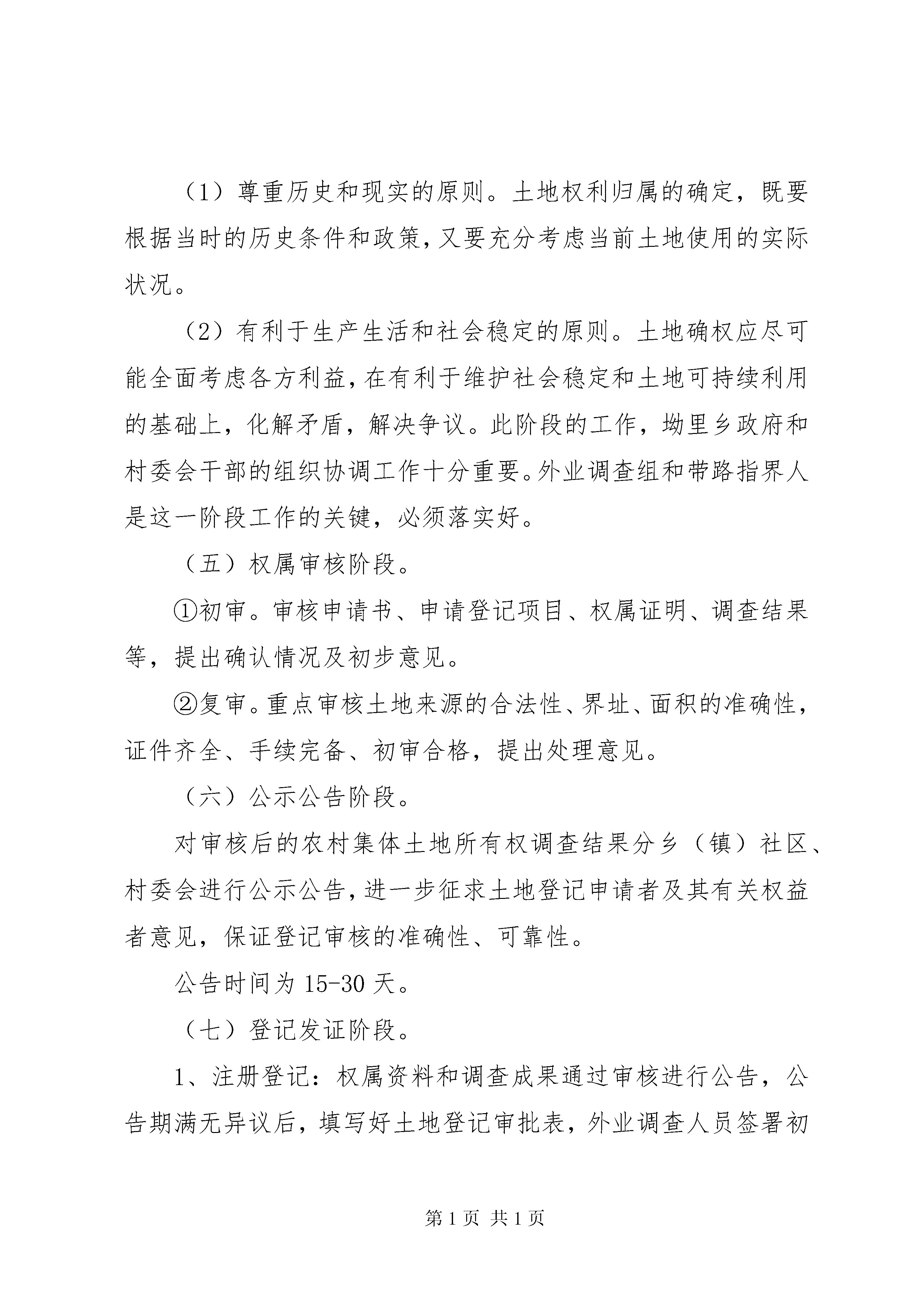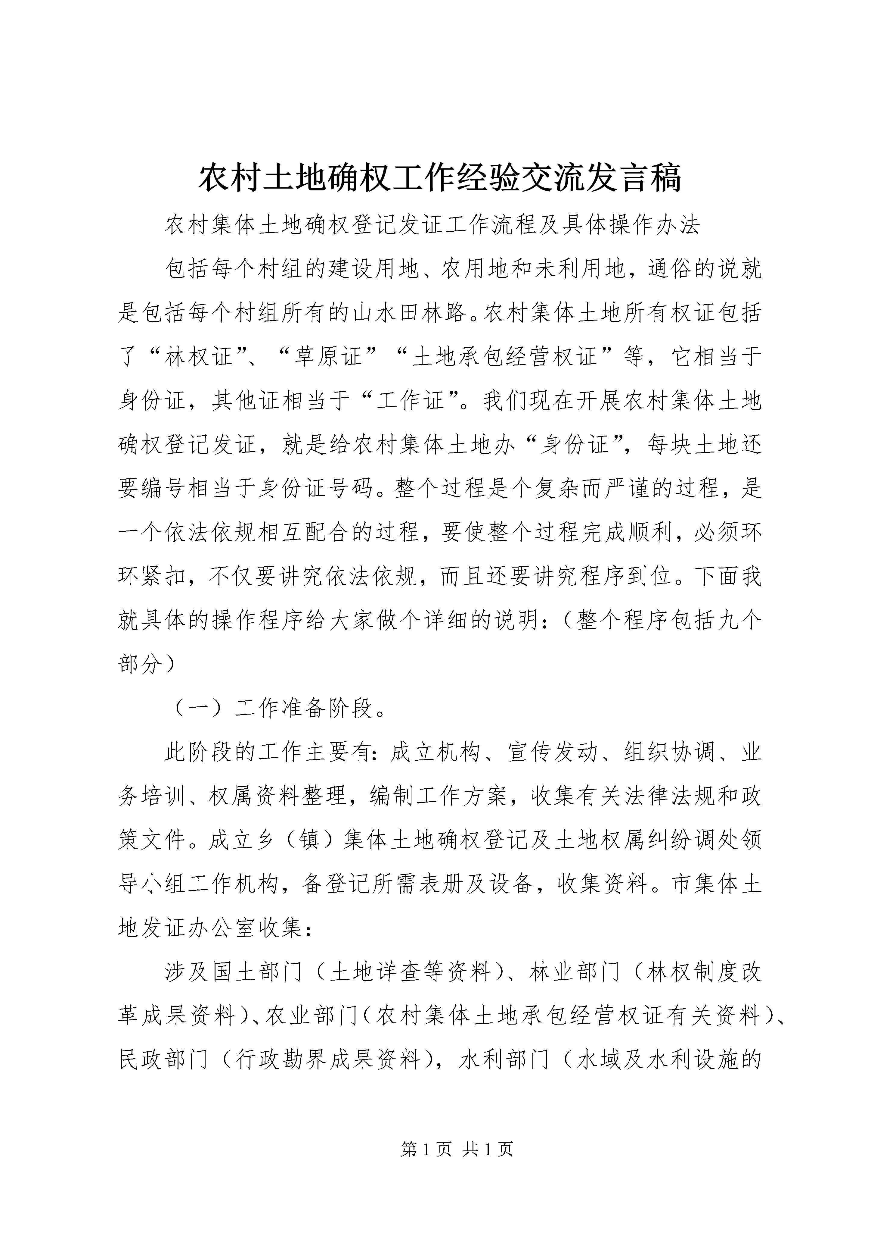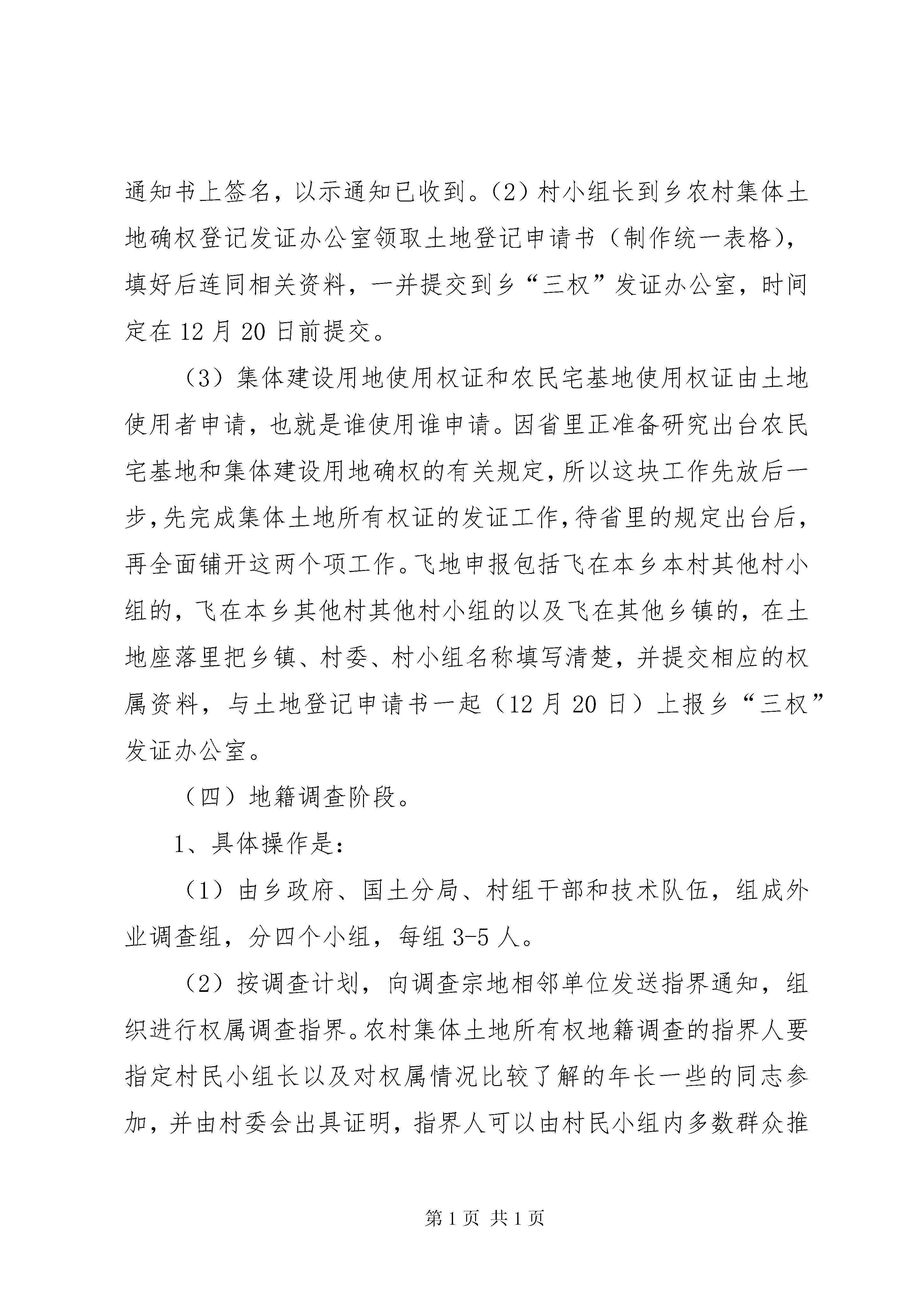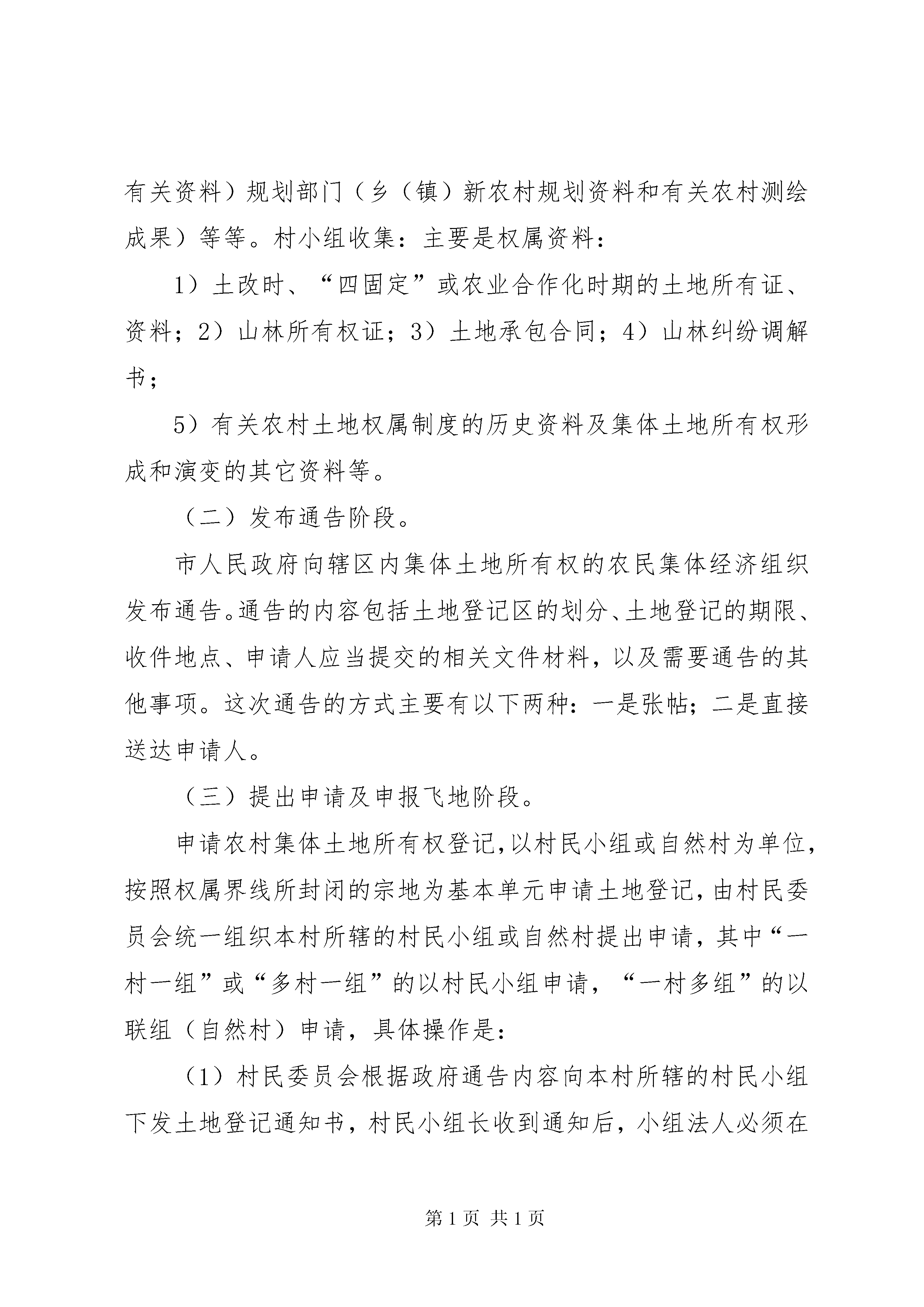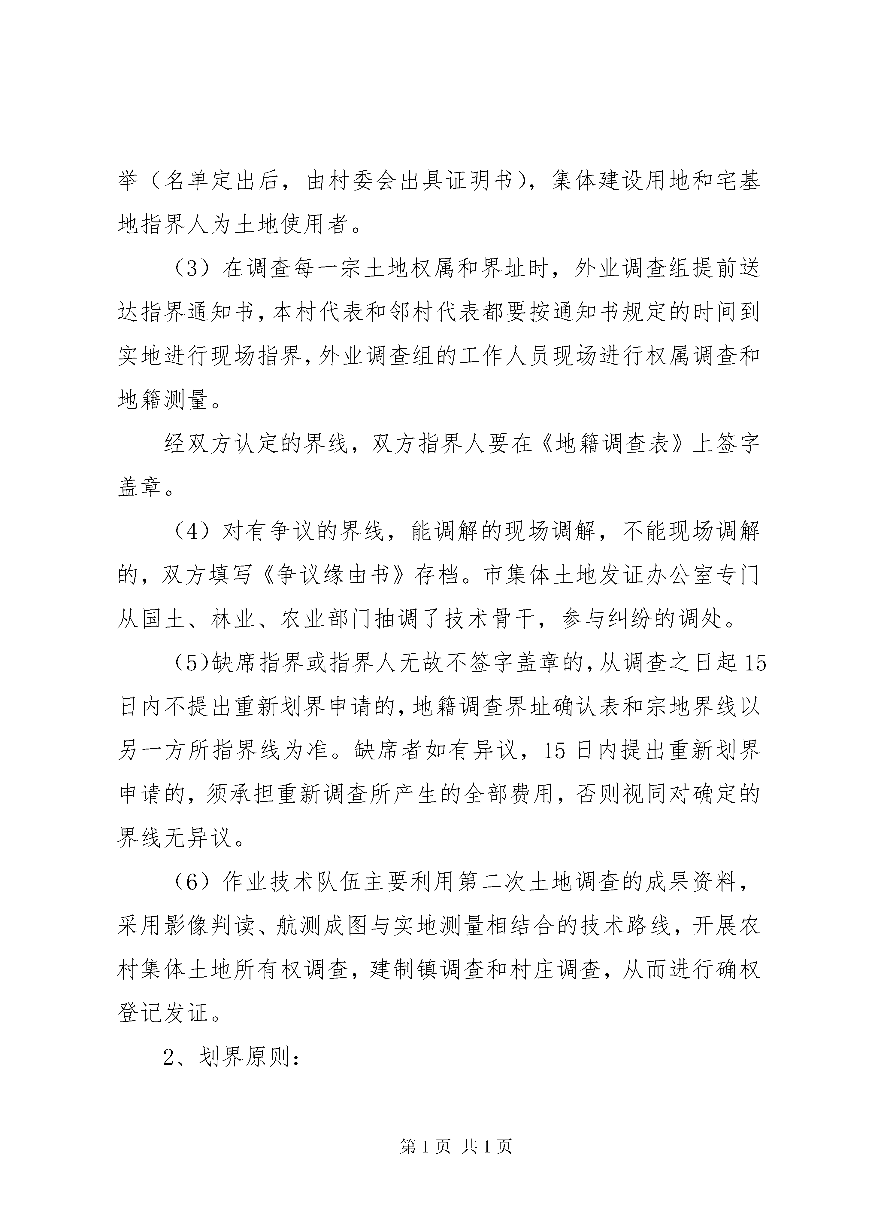 农村土地确权工作经验交流发言稿农村集体土地确权登记发证工作流程及具体操作办法包括每个村组的建设用地、农用地和未利用地,通俗的说就是包括每个村组所有的山水田林路。农村集体土地所有权证包括了“林权证”、“草原证”“土地承包经营权证”等,它相当于身份证,其他证相当于“工作证”。我们现在开展农村集体土地确权登记发证,就是给农村集体土地办“身份证”,每块土地还要编号相当于身份证号码。整个过程是个复杂而严谨的过程,是一个依法依规相互配合的过程,要使整个过程完成顺利,必须环环紧扣,不仅要讲究依法依规,而且还要讲究程序到位。下面我就具体的操作程序给大家做个详细的说明:(整个程序包括九个部分)(一)工作准备阶段。此阶段的工作主要有:成立机构、宣传发动、组织协调、业务培训、权属资料整理,编制工作方案,收集有关法律法规和政策文件。成立乡(镇)集体土地确权登记及土地权属纠纷调处领导小组工作机构,备登记所需表册及设备,收集资料。市集体土地发证办公室收集:涉及国土部门(土地详查等资料)、林业部门(林权制度改革成果资料)、农业部门(农村集体土地承包经营权证有关资料)、民政部门(行政勘界成果资料),水利部门(水域及水利设施的有关资料)规划部门(乡(镇)新农村规划资料和有关农村测绘成果)等等。村小组收集:主要是权属资料:1)土改时、“四固定”或农业合作化时期的土地所有证、资料;2)山林所有权证;3)土地承包合同;4)山林纠纷调解书;5)有关农村土地权属制度的历史资料及集体土地所有权形成和演变的其它资料等。(二)发布通告阶段。市人民政府向辖区内集体土地所有权的农民集体经济组织发布通告。通告的内容包括土地登记区的划分、土地登记的期限、收件地点、申请人应当提交的相关文件材料,以及需要通告的其他事项。这次通告的方式主要有以下两种:一是张帖;二是直接送达申请人。(三)提出申请及申报飞地阶段。申请农村集体土地所有权登记,以村民小组或自然村为单位,按照权属界线所封闭的宗地为基本单元申请土地登记,由村民委员会统一组织本村所辖的村民小组或自然村提出申请,其中“一村一组”或“多村一组”的以村民小组申请,“一村多组”的以联组(自然村)申请,具体操作是:(1)村民委员会根据政府通告内容向本村所辖的村民小组下发土地登记通知书,村民小组长收到通知后,小组法人必须在通知书上签名,以示通知已收到。(2)村小组长到乡农村集体土地确权登记发证办公室领取土地登记申请书(制作统一表格),填好后连同相关资料,一并提交到乡“三权”发证办公室,时间定在12月20日前提交。(3)集体建设用地使用权证和农民宅基地使用权证由土地使用者申请,也就是谁使用谁申请。因省里正准备研究出台农民宅基地和集体建设用地确权的有关规定,所以这块工作先放后一步,先完成集体土地所有权证的发证工作,待省里的规定出台后,再全面铺开这两个项工作。飞地申报包括飞在本乡本村其他村小组的,飞在本乡其他村其他村小组的以及飞在其他乡镇的,在土地座落里把乡镇、村委、村小组名称填写清楚,并提交相应的权属资料,与土地登记申请书一起(12月20日)上报乡“三权”发证办公室。(四)地籍调查阶段。1、具体操作是:(1)由乡政府、国土分局、村组干部和技术队伍,组成外业调查组,分四个小组,每组3-5人。(2)按调查计划,向调查宗地相邻单位发送指界通知,组织进行权属调查指界。农村集体土地所有权地籍调查的指界人要指定村民小组长以及对权属情况比较了解的年长一些的同志参加,并由村委会出具证明,指界人可以由村民小组内多数群众推举(名单定出后,由村委会出具证明书),集体建设用地和宅基地指界人为土地使用者。(3)在调查每一宗土地权属和界址时,外业调查组提前送达指界通知书,本村代表和邻村代表都要按通知书规定的时间到实地进行现场指界,外业调查组的工作人员现场进行权属调查和地籍测量。经双方认定的界线,双方指界人要在《地籍调查表》上签字盖章。(4)对有争议的界线,能调解的现场调解,不能现场调解的,双方填写《争议缘由书》存档。市集体土地发证办公室专门从国土、林业、农业部门抽调了技术骨干,参与纠纷的调处。(5)缺席指界或指界人无故不签字盖章的,从调查之日起15日内不提出重新划界申请的,地籍调查界址确认表和宗地界线以另一方所指界线为准。缺席者如有异议,15日内提出重新划界申请的,须承担重新调查所产生的全部费用,否则视同对确定的界线无异议。(6)作业技术队伍主要利用第二次土地调查的成果资料,采用影像判读、航测成图与实地测量相结合的技术路线,开展农村集体土地所有权调查,建制镇调查和村庄调查,从而进行确权登记发证。2、划界原则:(1)尊重历史和现实的原则。土地权利归属的确定,既要根据当时的历史条件和政策,又要充分考虑当前土地使用的实际状况。(2)有利于生产生活和社会稳定的