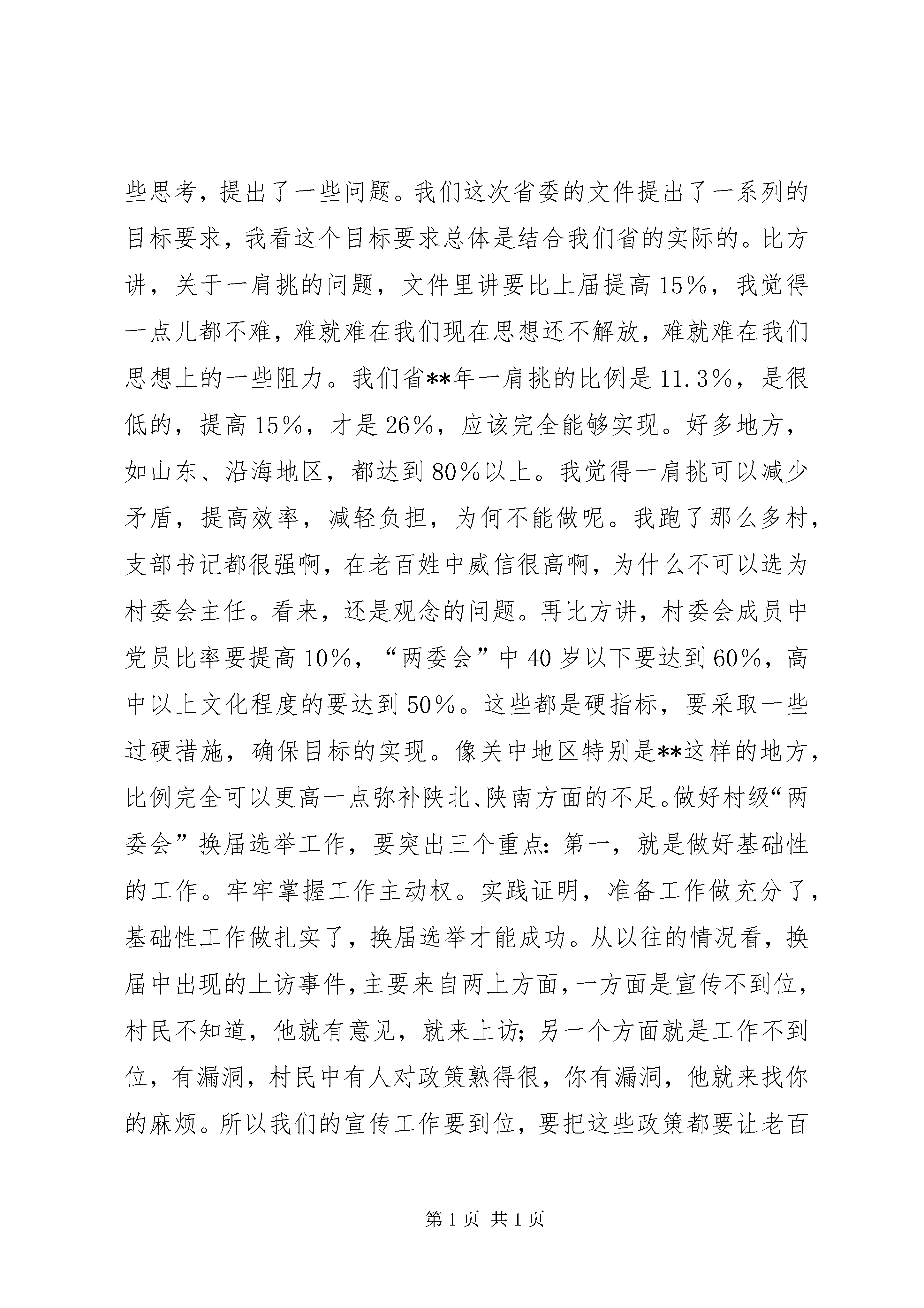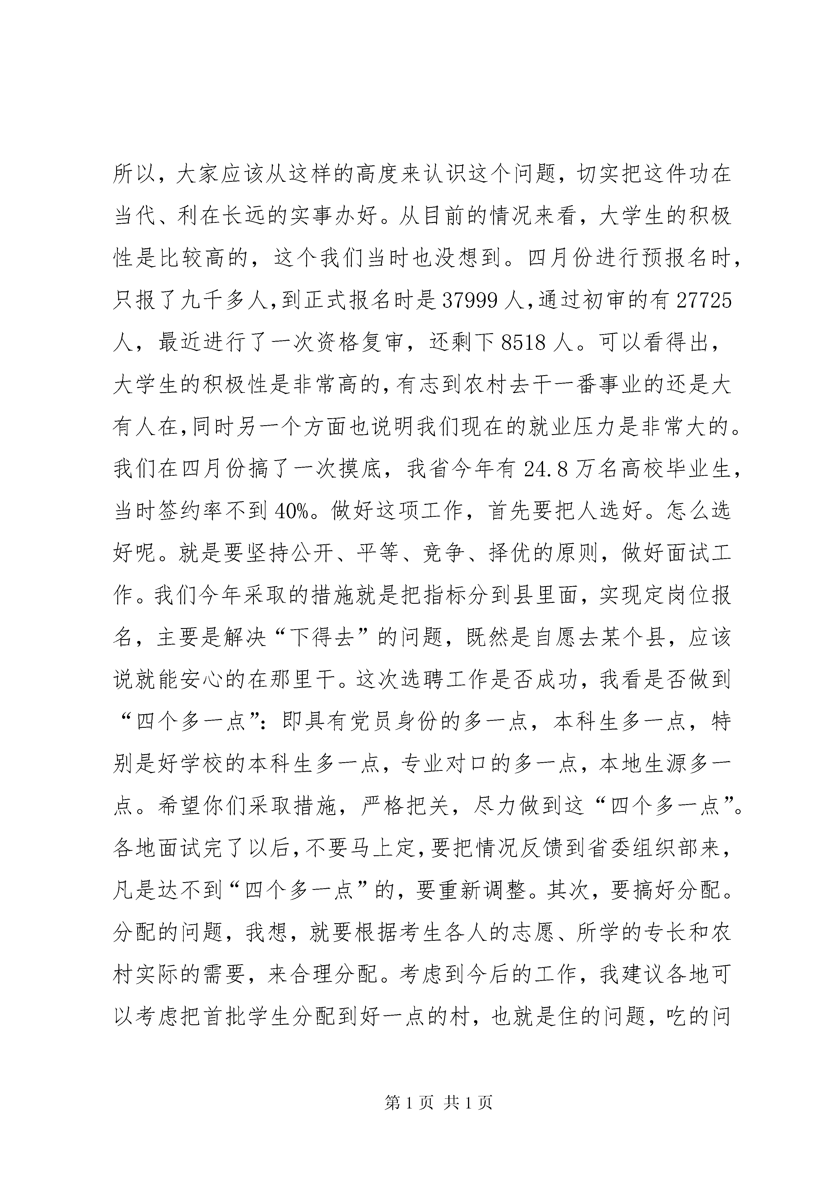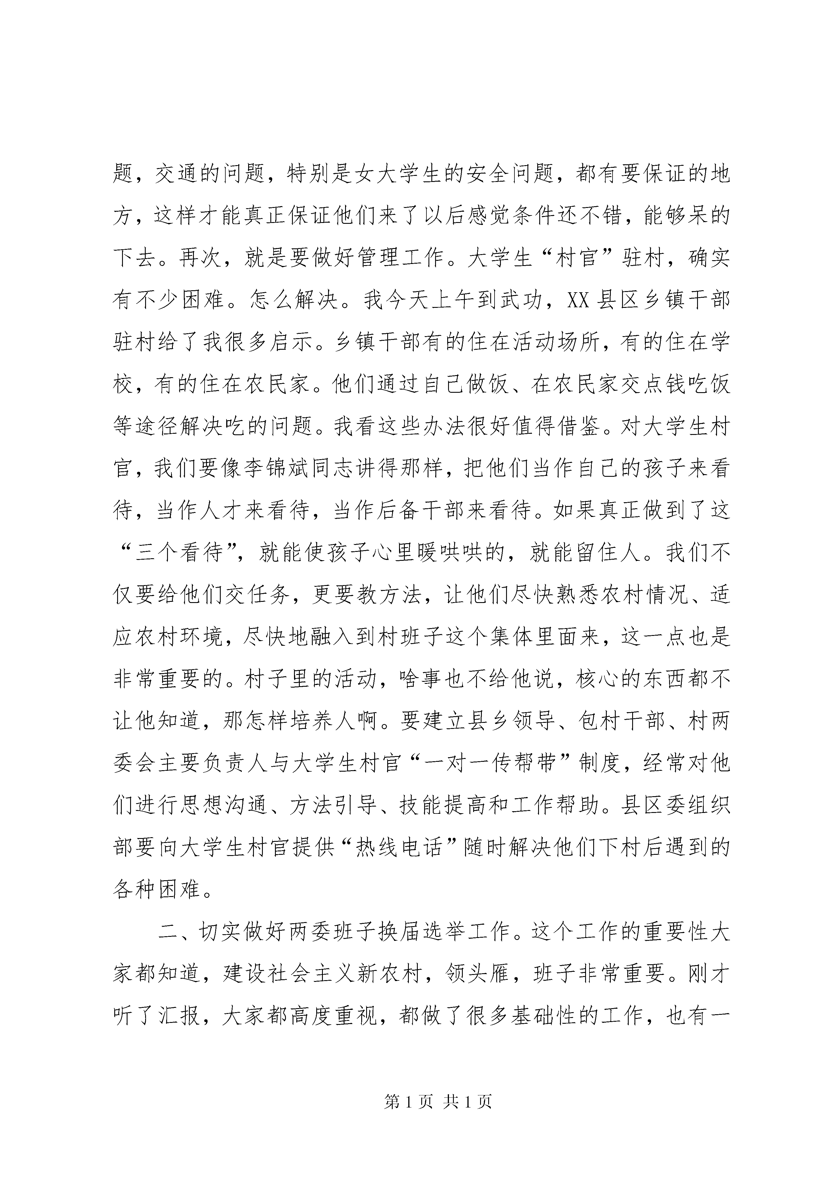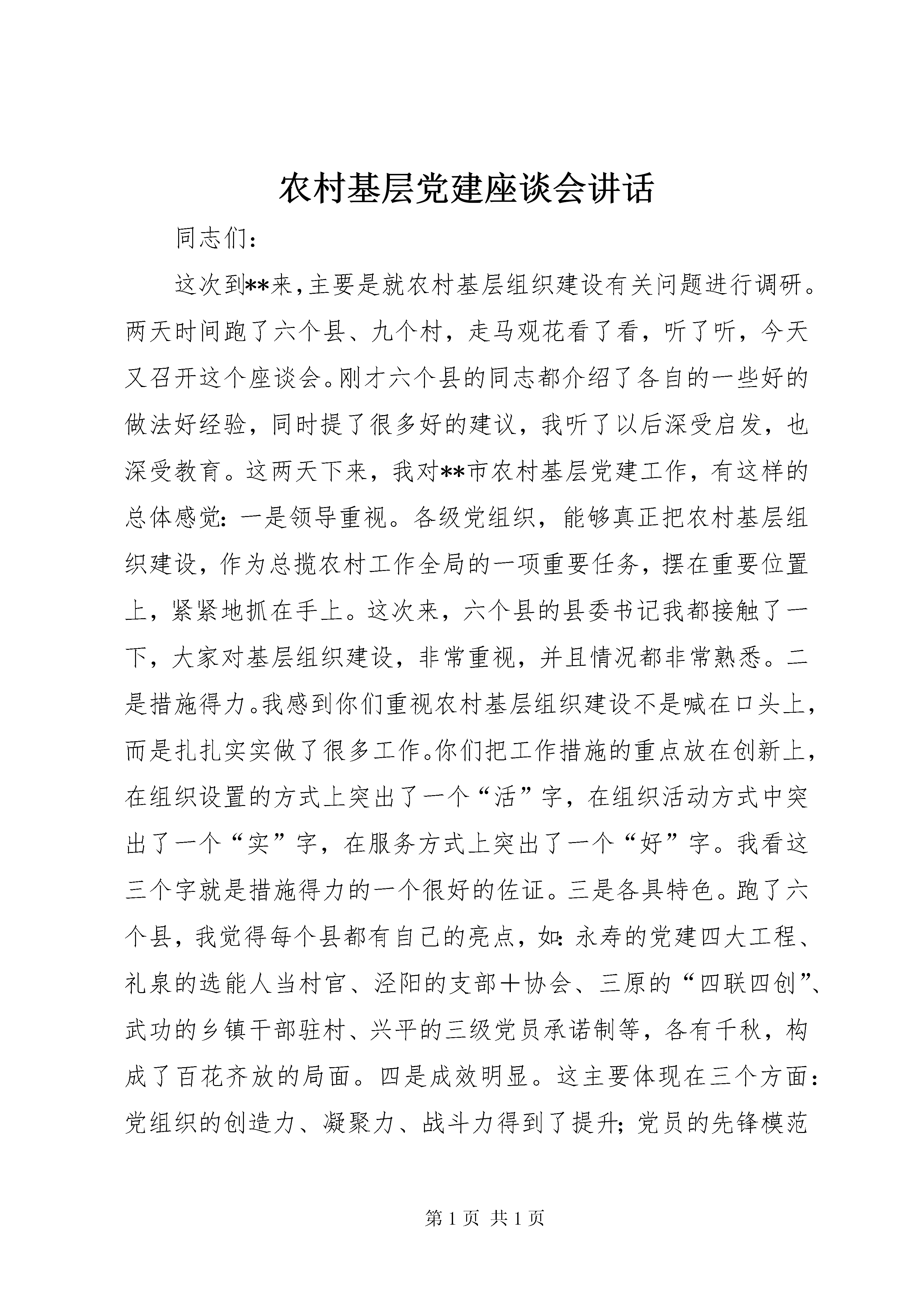 农村基层党建座谈会讲话同志们:这次到**来,主要是就农村基层组织建设有关问题进行调研。两天时间跑了六个县、九个村,走马观花看了看,听了听,今天又召开这个座谈会。刚才六个县的同志都介绍了各自的一些好的做法好经验,同时提了很多好的建议,我听了以后深受启发,也深受教育。这两天下来,我对**市农村基层党建工作,有这样的总体感觉:一是领导重视。各级党组织,能够真正把农村基层组织建设,作为总揽农村工作全局的一项重要任务,摆在重要位置上,紧紧地抓在手上。这次来,六个县的县委书记我都接触了一下,大家对基层组织建设,非常重视,并且情况都非常熟悉。二是措施得力。我感到你们重视农村基层组织建设不是喊在口头上,而是扎扎实实做了很多工作。你们把工作措施的重点放在创新上,在组织设置的方式上突出了一个“活”字,在组织活动方式中突出了一个“实”字,在服务方式上突出了一个“好”字。我看这三个字就是措施得力的一个很好的佐证。三是各具特色。跑了六个县,我觉得每个县都有自己的亮点,如:永寿的党建四大工程、礼泉的选能人当村官、泾阳的支部+协会、三原的“四联四创”、武功的乡镇干部驻村、兴平的三级党员承诺制等,各有千秋,构成了百花齐放的局面。四是成效明显。这主要体现在三个方面:党组织的创造力、凝聚力、战斗力得到了提升;党员的先锋模范作用得到了充分的发挥;经济社会的发展得到促进。希望**的同志们再接再厉,把农村基层党建工作推上一个新台阶。下一步,我们农村基层组织建设有六项重点工作,希望同志们认真地抓好,大胆地探索。一、认真做好选聘高校毕业生到村任职这项工作。胡锦涛同志说,这项工作“具有长远战略意义”。我理解,这个长远战略意义体现在三个方面:一是为农村输送培养新农村建设带头人的战略举措。我们现在农村支部班子、支部书记总体上讲是很不错的,但是我们也面临一些问题,比如年龄偏大、文化偏低。把大学生放到农村来,是为了改善这种结构,培养有知识、有文化新农村建设的带头人。二是培养造就有基层经验、对人民群众有深厚感情的党政后备干部人才的长远大计。过去不少干部是从农民成长起来,像习近平、李克强等同志都是当过知青,当过农民。现在的干部,基本上是从学校门到机关门,从农民中成长起来的越来越少。我理解,选聘高校毕业生到村任职,是中央的一种战略思考,是为了形成来自基层和生产一线的党政干部培养链。三是引导大学生转变就业观念,面向基层就业创业、施展才华的重要途径。我们现在是个啥情况呢。许多大学生眼高手低,一味地目光盯在城市、盯在经济发达地区,总想到好地方去,在激烈的竞争中难以充分就业。而广阔的农村又缺乏有知识有文化的人。中央这个政策就是一种导向,鼓励大学生到基层去,到农村去。所以,大家应该从这样的高度来认识这个问题,切实把这件功在当代、利在长远的实事办好。从目前的情况来看,大学生的积极性是比较高的,这个我们当时也没想到。四月份进行预报名时,只报了九千多人,到正式报名时是37999人,通过初审的有27725人,最近进行了一次资格复审,还剩下8518人。可以看得出,大学生的积极性是非常高的,有志到农村去干一番事业的还是大有人在,同时另一个方面也说明我们现在的就业压力是非常大的。我们在四月份搞了一次摸底,我省今年有24.8万名高校毕业生,当时签约率不到40%。做好这项工作,首先要把人选好。怎么选好呢。就是要坚持公开、平等、竞争、择优的原则,做好面试工作。我们今年采取的措施就是把指标分到县里面,实现定岗位报名,主要是解决“下得去”的问题,既然是自愿去某个县,应该说就能安心的在那里干。这次选聘工作是否成功,我看是否做到“四个多一点”:即具有党员身份的多一点,本科生多一点,特别是好学校的本科生多一点,专业对口的多一点,本地生源多一点。希望你们采取措施,严格把关,尽力做到这“四个多一点”。各地面试完了以后,不要马上定,要把情况反馈到省委组织部来,凡是达不到“四个多一点”的,要重新调整。其次,要搞好分配。分配的问题,我想,就要根据考生各人的志愿、所学的专长和农村实际的需要,来合理分配。考虑到今后的工作,我建议各地可以考虑把首批学生分配到好一点的村,也就是住的问题,吃的问题,交通的问题,特别是女大学生的安全问题,都有要保证的地方,这样才能真正保证他们来了以后感觉条件还不错,能够呆的下去。再次,就是要做好管理工作。大学生“村官”驻村,确实有不少困难。怎么解决。我今天上午到武功,XX县区乡镇干部驻村给了我很多启示。乡镇干部有的住在活动场所,有的住在学校,有的住在农民家。他们通过自己做饭、在农民家交点钱吃饭等途径解决吃的问题。我看这些办法很好值得借鉴。对大学生村官,我们要像李锦斌同志讲得那样,把他们当作自己的孩子来看待,当作人才来看待,当作后备干部来看待。如果真正做到了这“三个看待”,就能使孩子心里暖哄