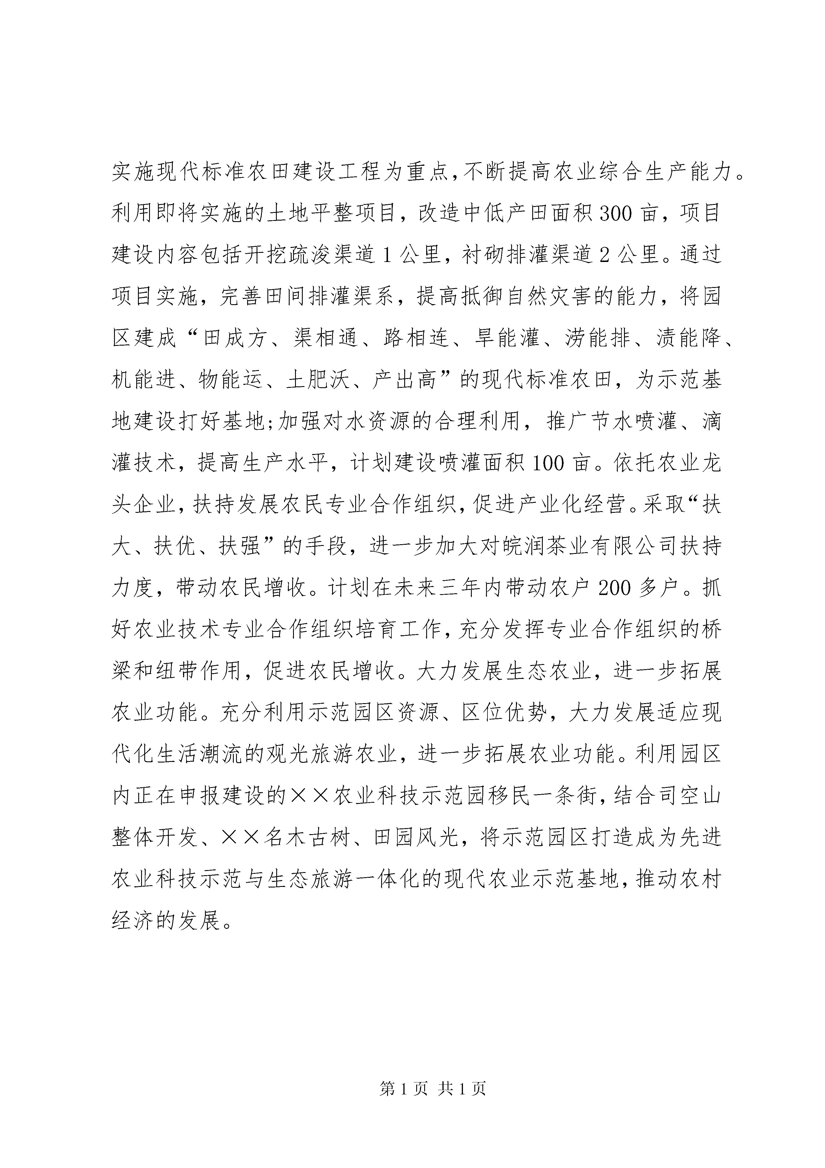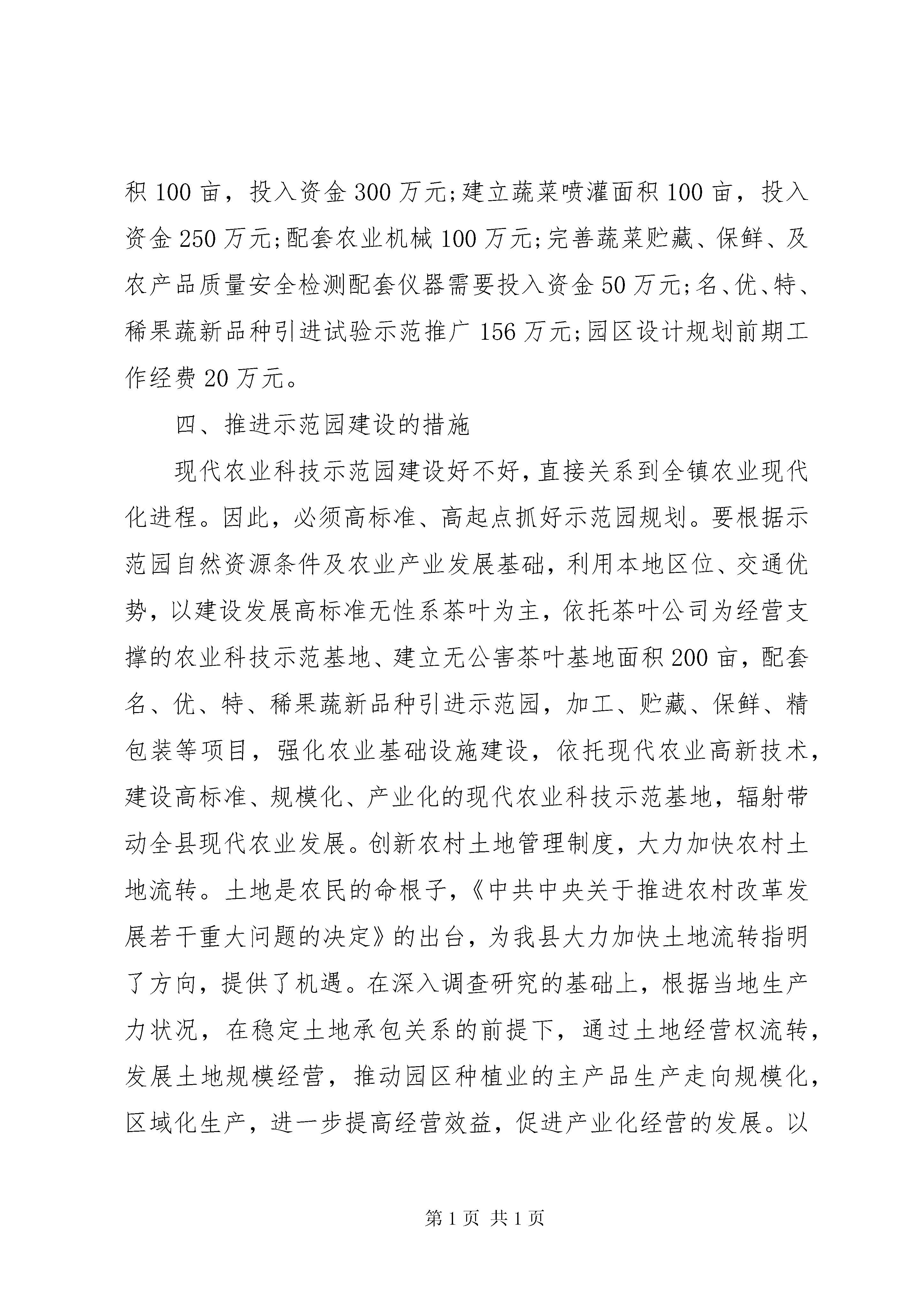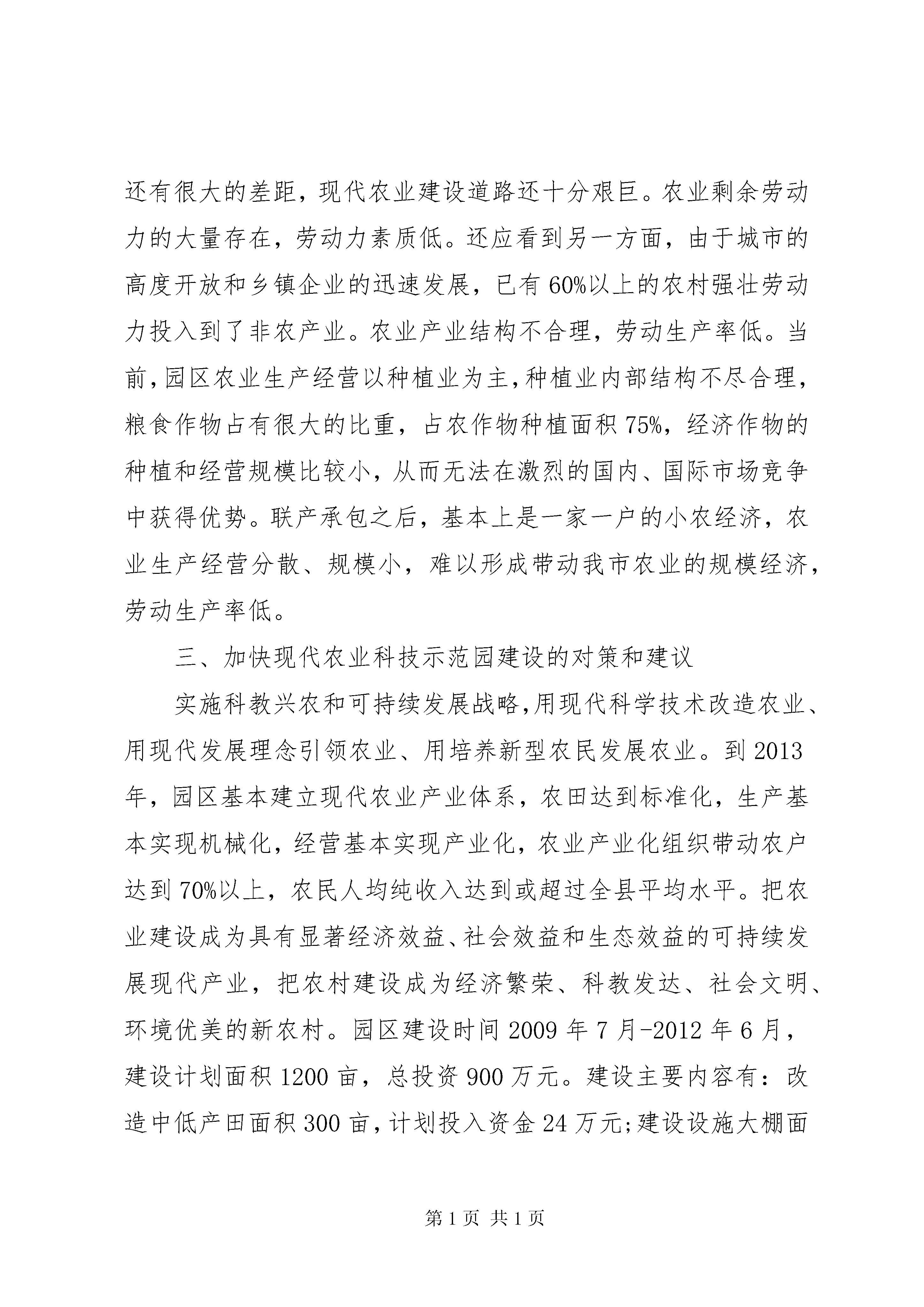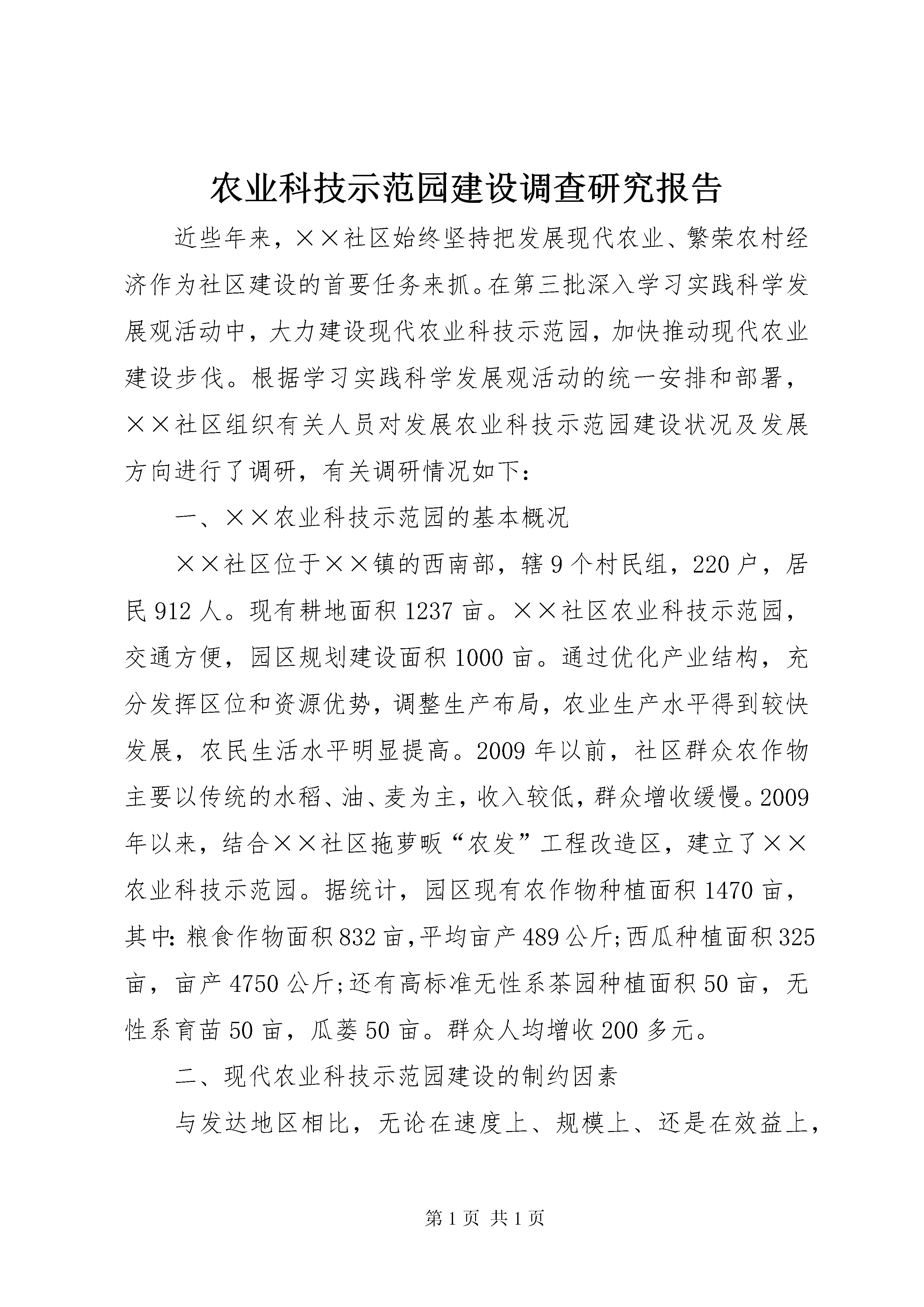 农业科技示范园建设调查研究报告近些年来,××社区始终坚持把发展现代农业、繁荣农村经济作为社区建设的首要任务来抓。在第三批深入学习实践科学发展观活动中,大力建设现代农业科技示范园,加快推动现代农业建设步伐。根据学习实践科学发展观活动的统一安排和部署,××社区组织有关人员对发展农业科技示范园建设状况及发展方向进行了调研,有关调研情况如下:一、××农业科技示范园的基本概况××社区位于××镇的西南部,辖9个村民组,220户,居民912人。现有耕地面积1237亩。××社区农业科技示范园,交通方便,园区规划建设面积1000亩。通过优化产业结构,充分发挥区位和资源优势,调整生产布局,农业生产水平得到较快发展,农民生活水平明显提高。2009年以前,社区群众农作物主要以传统的水稻、油、麦为主,收入较低,群众增收缓慢。2009年以来,结合××社区拖萝畈“农发”工程改造区,建立了××农业科技示范园。据统计,园区现有农作物种植面积1470亩,其中:粮食作物面积832亩,平均亩产489公斤;西瓜种植面积325亩,亩产4750公斤;还有高标准无性系茶园种植面积50亩,无性系育苗50亩,瓜蒌50亩。群众人均增收200多元。二、现代农业科技示范园建设的制约因素与发达地区相比,无论在速度上、规模上、还是在效益上,还有很大的差距,现代农业建设道路还十分艰巨。农业剩余劳动力的大量存在,劳动力素质低。还应看到另一方面,由于城市的高度开放和乡镇企业的迅速发展,已有60%以上的农村强壮劳动力投入到了非农产业。农业产业结构不合理,劳动生产率低。当前,园区农业生产经营以种植业为主,种植业内部结构不尽合理,粮食作物占有很大的比重,占农作物种植面积75%,经济作物的种植和经营规模比较小,从而无法在激烈的国内、国际市场竞争中获得优势。联产承包之后,基本上是一家一户的小农经济,农业生产经营分散、规模小,难以形成带动我市农业的规模经济,劳动生产率低。三、加快现代农业科技示范园建设的对策和建议实施科教兴农和可持续发展战略,用现代科学技术改造农业、用现代发展理念引领农业、用培养新型农民发展农业。到2013年,园区基本建立现代农业产业体系,农田达到标准化,生产基本实现机械化,经营基本实现产业化,农业产业化组织带动农户达到70%以上,农民人均纯收入达到或超过全县平均水平。把农业建设成为具有显著经济效益、社会效益和生态效益的可持续发展现代产业,把农村建设成为经济繁荣、科教发达、社会文明、环境优美的新农村。园区建设时间2009年7月-2012年6月,建设计划面积1200亩,总投资900万元。建设主要内容有:改造中低产田面积300亩,计划投入资金24万元;建设设施大棚面积100亩,投入资金300万元;建立蔬菜喷灌面积100亩,投入资金250万元;配套农业机械100万元;完善蔬菜贮藏、保鲜、及农产品质量安全检测配套仪器需要投入资金50万元;名、优、特、稀果蔬新品种引进试验示范推广156万元;园区设计规划前期工作经费20万元。四、推进示范园建设的措施现代农业科技示范园建设好不好,直接关系到全镇农业现代化进程。因此,必须高标准、高起点抓好示范园规划。要根据示范园自然资源条件及农业产业发展基础,利用本地区位、交通优势,以建设发展高标准无性系茶叶为主,依托茶叶公司为经营支撑的农业科技示范基地、建立无公害茶叶基地面积200亩,配套名、优、特、稀果蔬新品种引进示范园,加工、贮藏、保鲜、精包装等项目,强化农业基础设施建设,依托现代农业高新技术,建设高标准、规模化、产业化的现代农业科技示范基地,辐射带动全县现代农业发展。创新农村土地管理制度,大力加快农村土地流转。土地是农民的命根子,《中共中央关于推进农村改革发展若干重大问题的决定》的出台,为我县大力加快土地流转指明了方向,提供了机遇。在深入调查研究的基础上,根据当地生产力状况,在稳定土地承包关系的前提下,通过土地经营权流转,发展土地规模经营,推动园区种植业的主产品生产走向规模化,区域化生产,进一步提高经营效益,促进产业化经营的发展。以实施现代标准农田建设工程为重点,不断提高农业综合生产能力。利用即将实施的土地平整项目,改造中低产田面积300亩,项目建设内容包括开挖疏浚渠道1公里,衬砌排灌渠道2公里。通过项目实施,完善田间排灌渠系,提高抵御自然灾害的能力,将园区建成“田成方、渠相通、路相连、旱能灌、涝能排、渍能降、机能进、物能运、土肥沃、产出高”的现代标准农田,为示范基地建设打好基地;加强对水资源的合理利用,推广节水喷灌、滴灌技术,提高生产水平,计划建设喷灌面积100亩。依托农业龙头企业,扶持发展农民专业合作组织,促进产业化经营。采取“扶大、扶优、扶强”的手段,进一步加大对皖润茶业有限公司扶持力度,带动农民增收。计划在未来三年内带动农户20